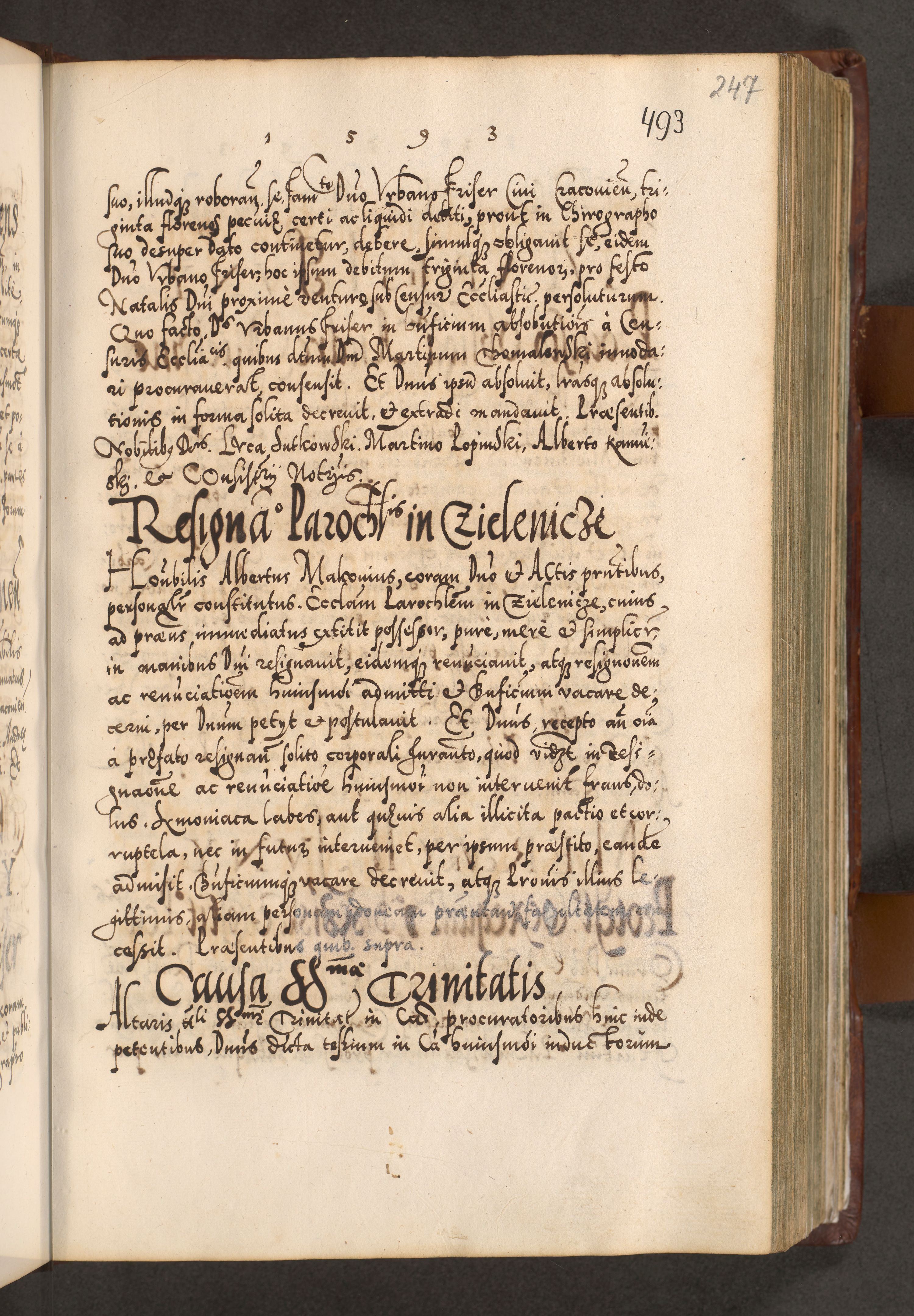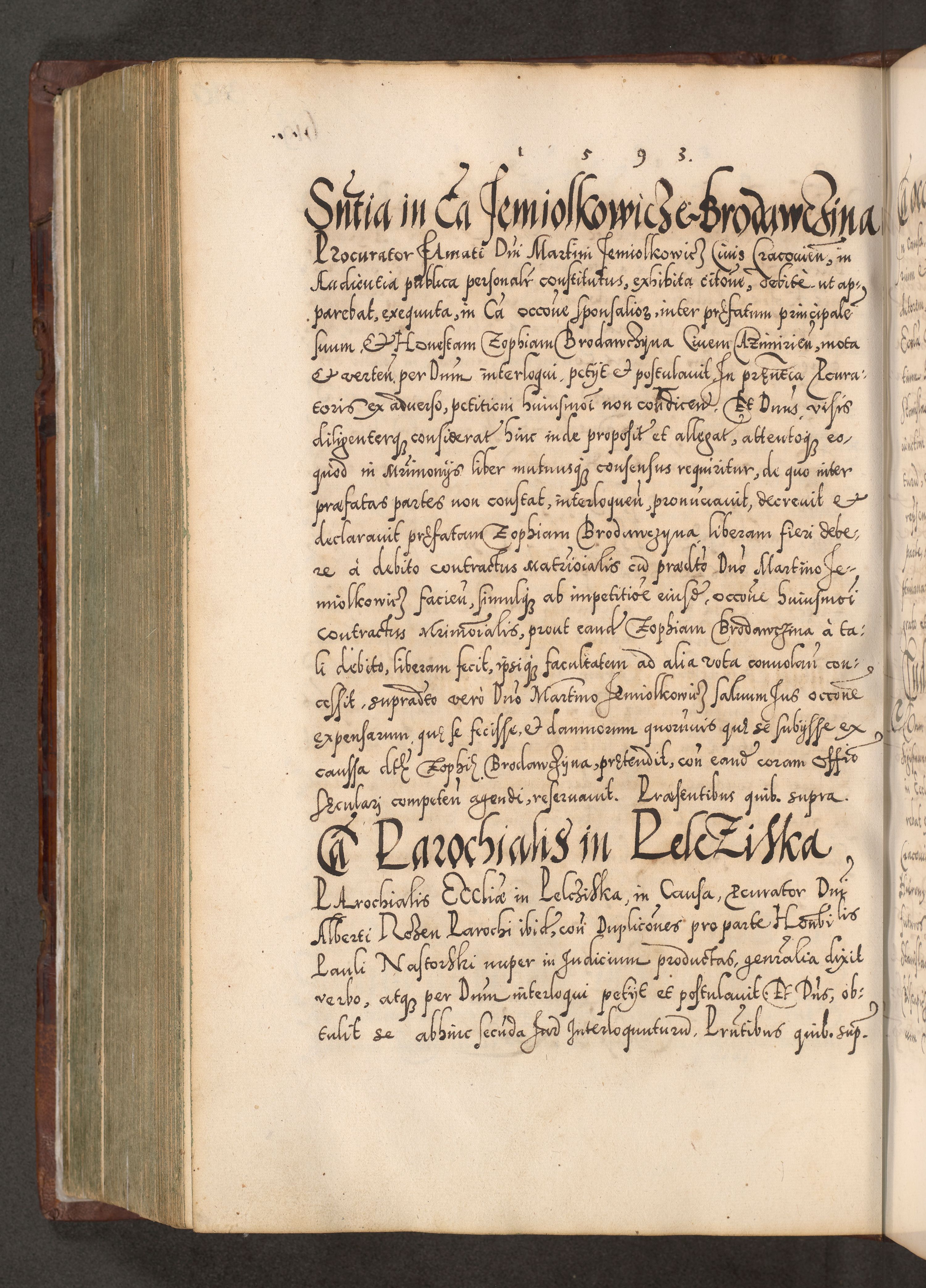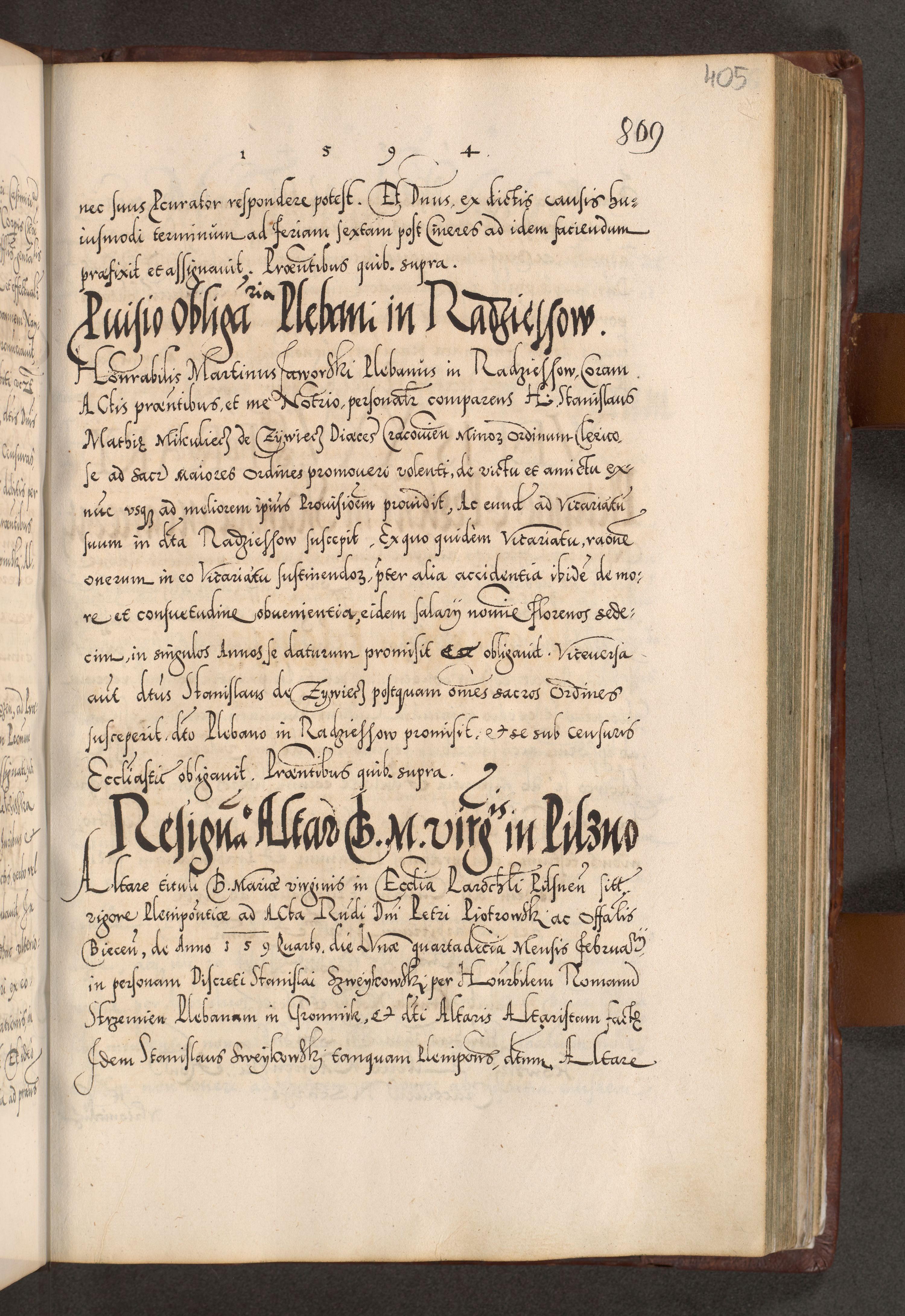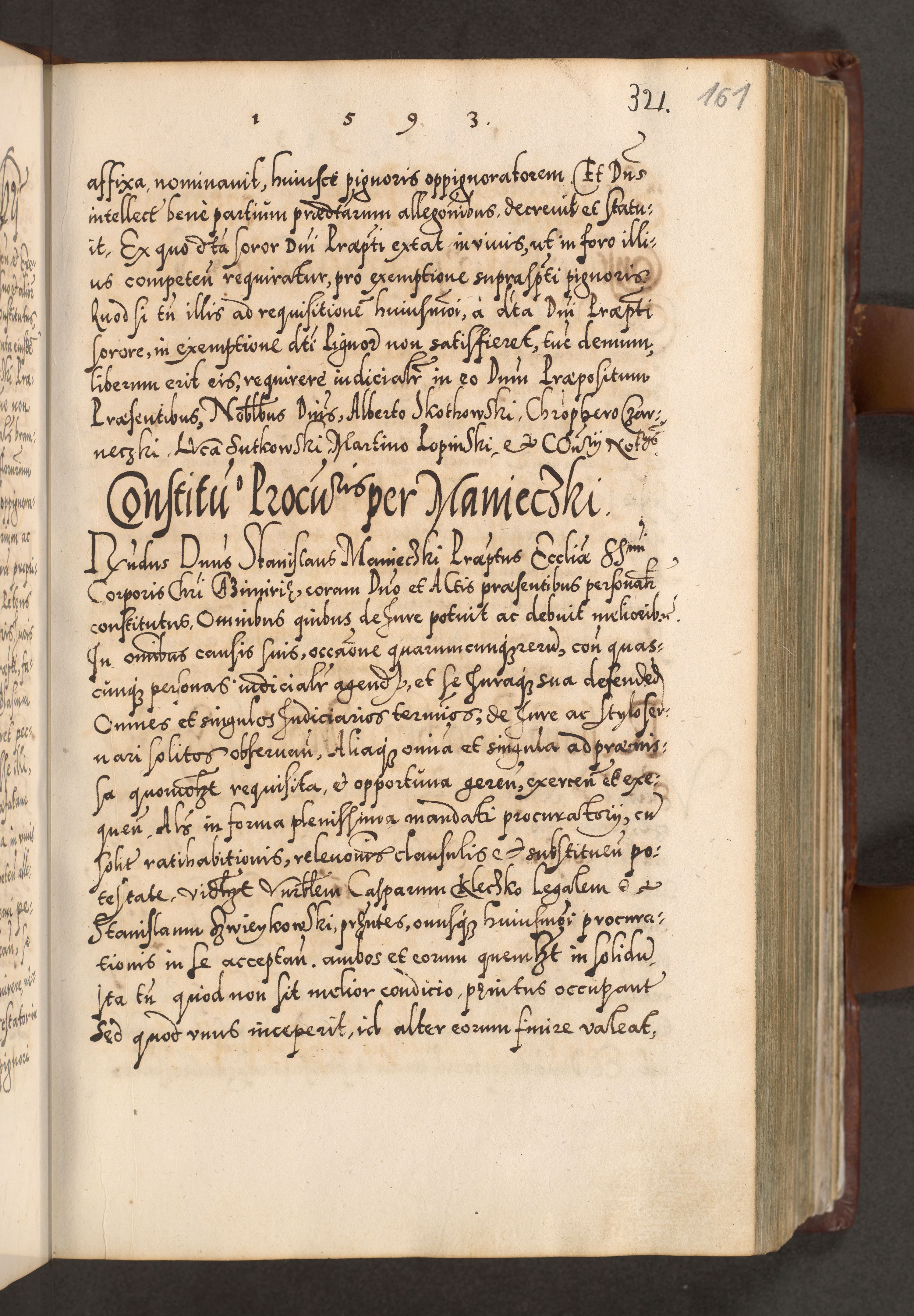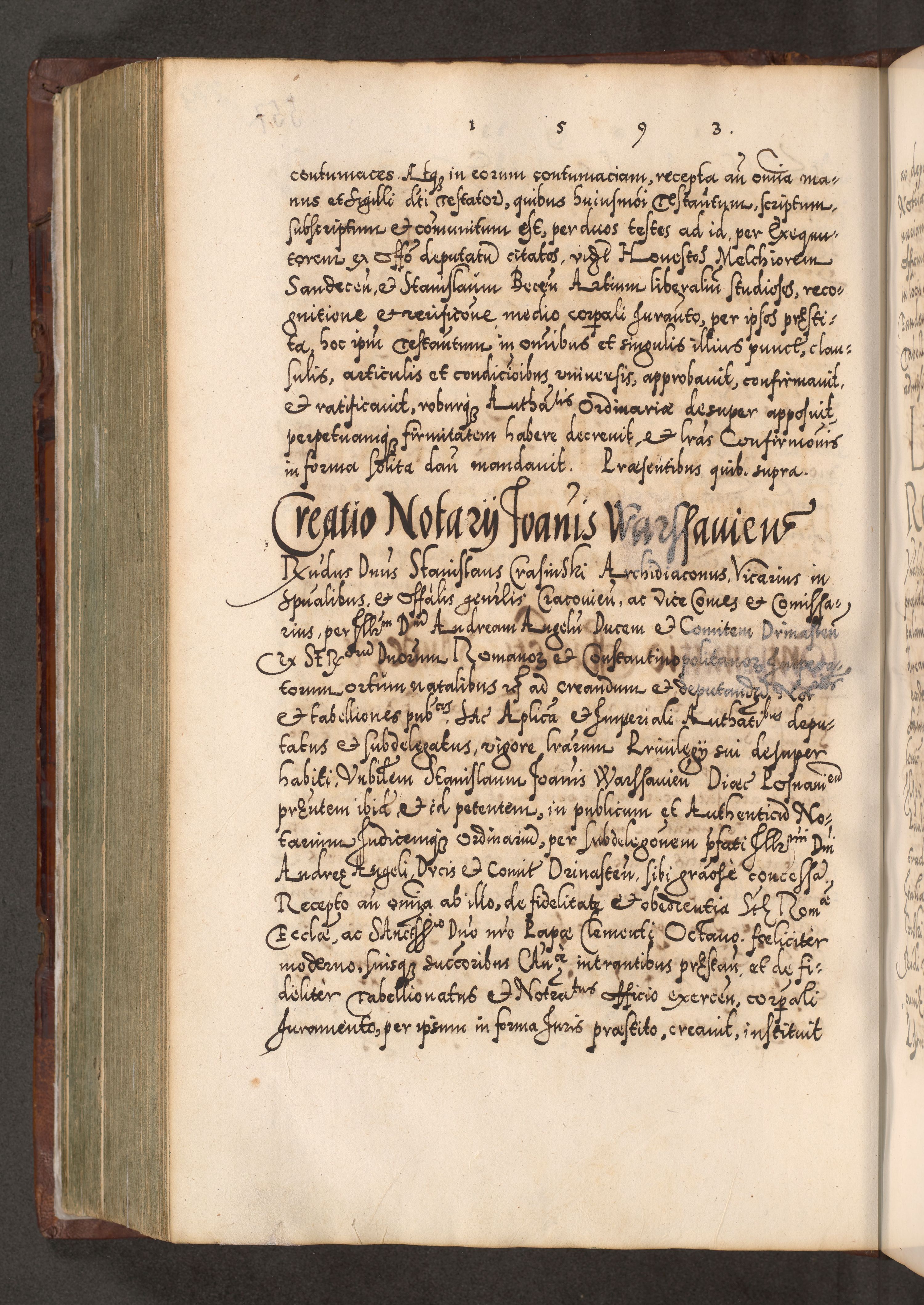 Illistrissimo et revedissimo in Christo Patre Domino Domino Georgio Rzadziwił Miserone Divina Sacrostae R. E. Tituli S. Sixti Presbitero Cardinali Duce in Olyka et Niesswiesz ad Gubernacula Ecclessiae Cracoviensis cuius administratorialem a Sancta Sede Apostolica obtinverat feliciter sedente. Acta actorum, causarum, sententiarum tam deffinitivarum quam interloquutoriarum decretorum, obligationum, quietationum, recognitionum, constitutionum procuratorum etc. coram Reverendo Domino Stanislao Crassinskz de Crasne Archidiacono Cracoviensis, Scholastico Gnesnesis, Custode Plocensis etc. Vicario et Officiali Generali Cracoviensi in Ano Domini Millesimo Quingentesimo Nonagesimo Primo cuius indictio quarta pontificatus SS. Domini Nostri Gregorii XIIII Anno I psius prio feliciter incipiut