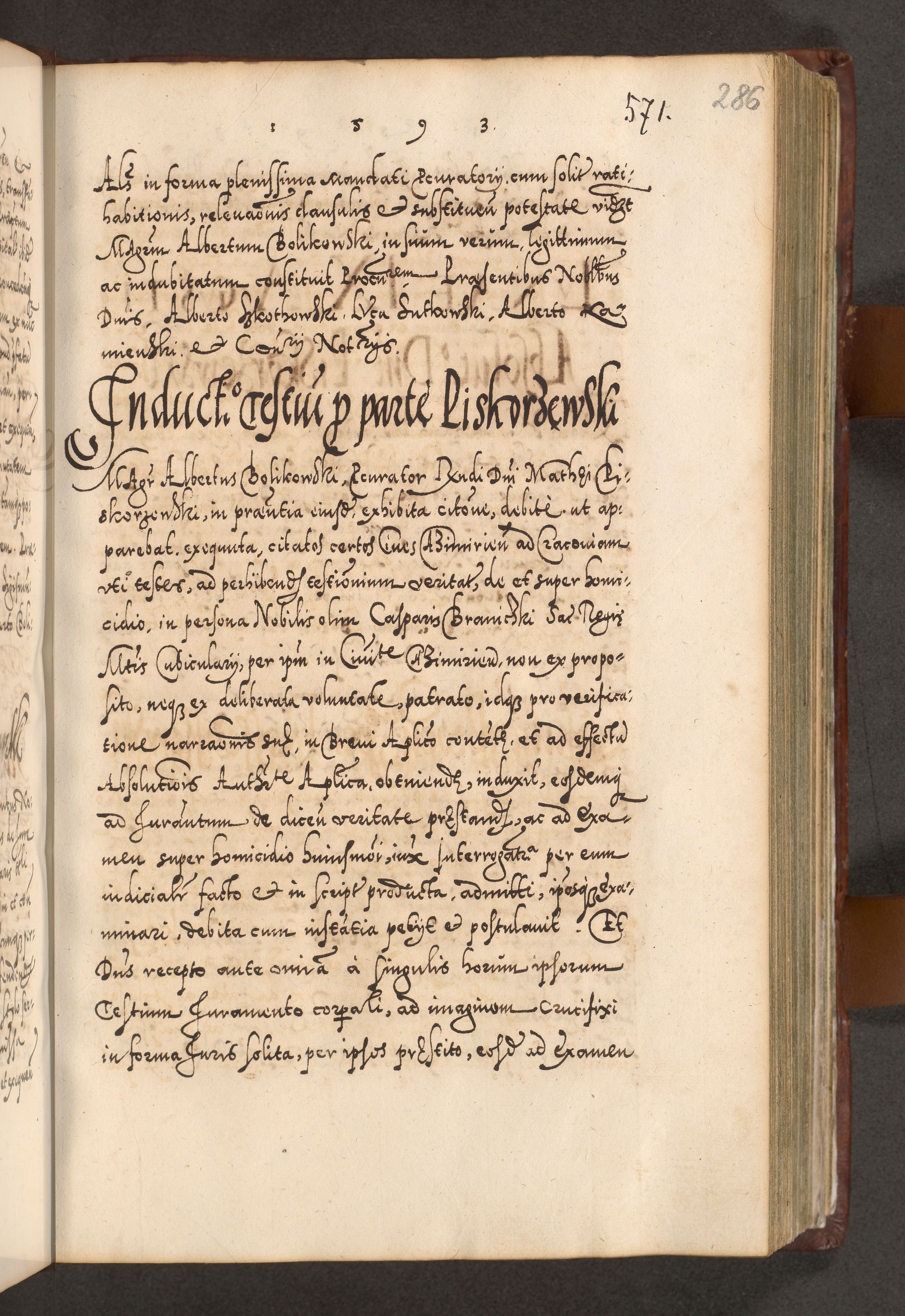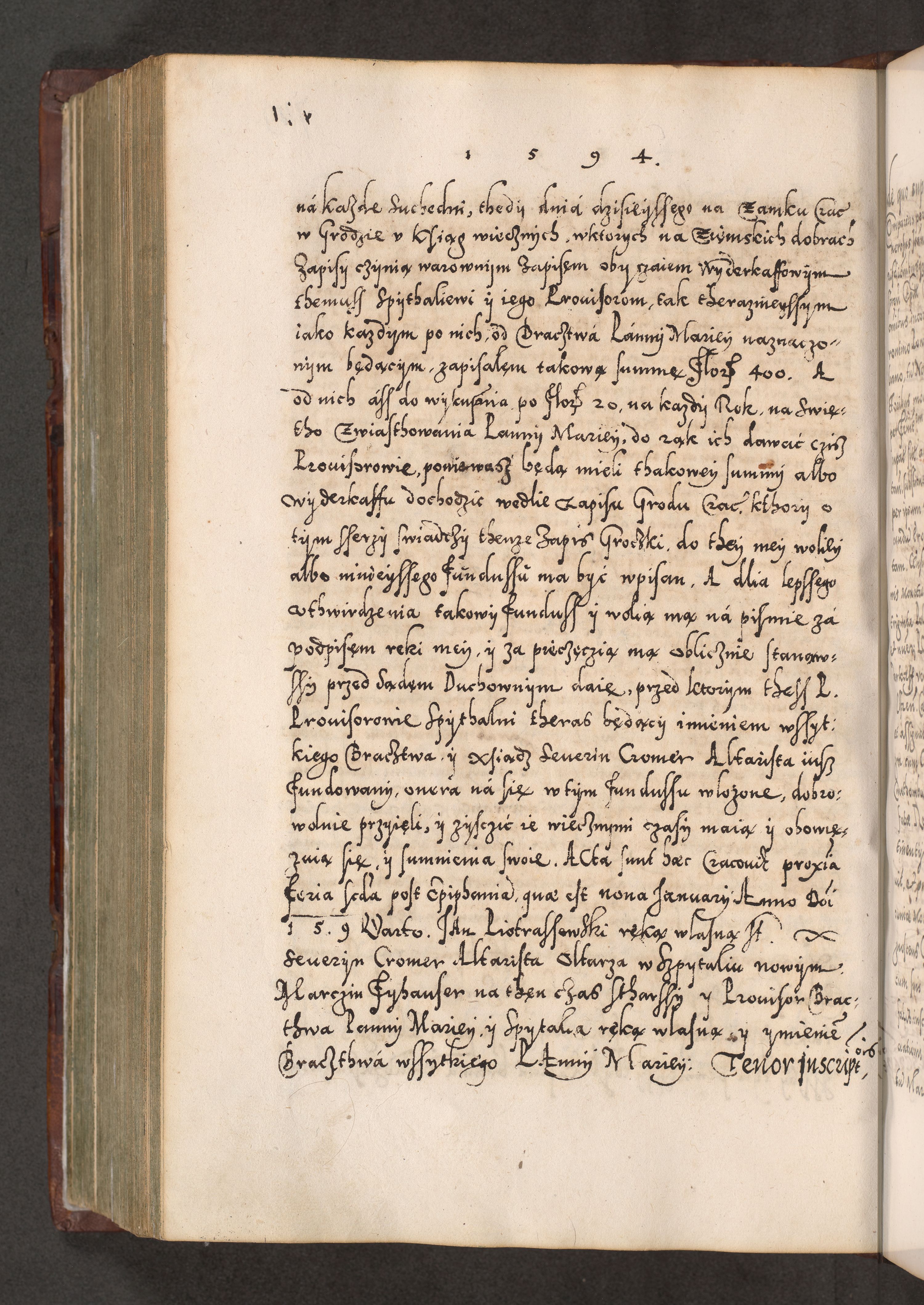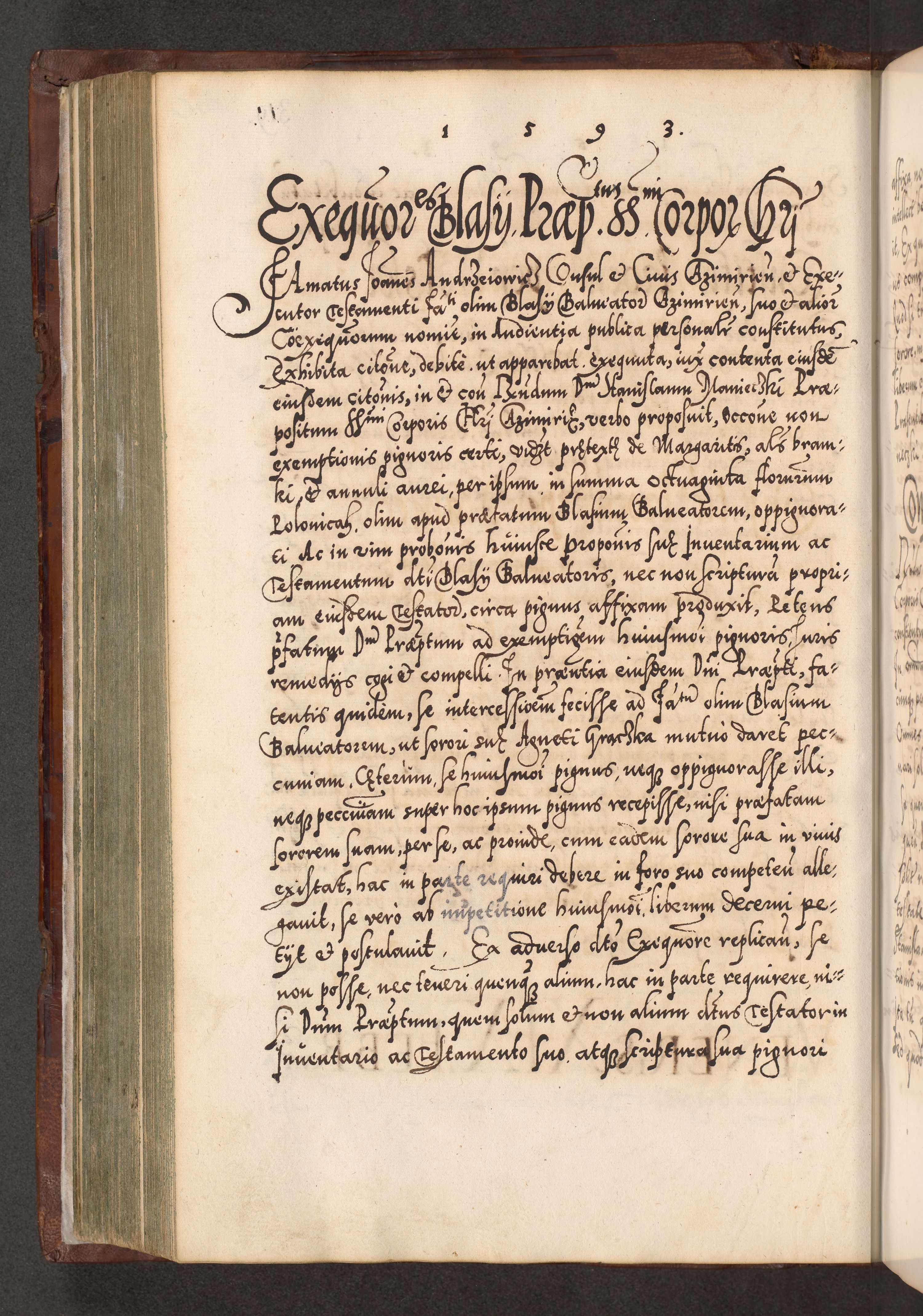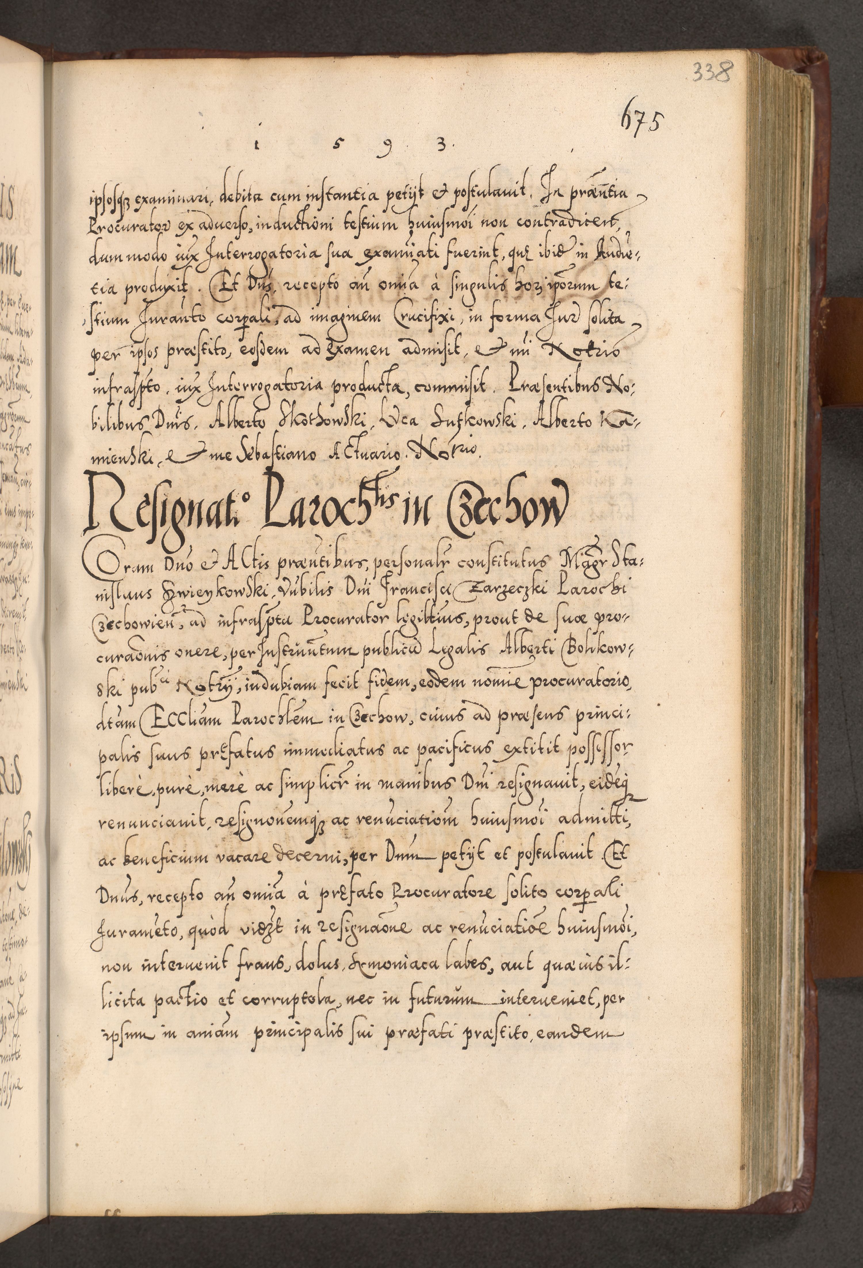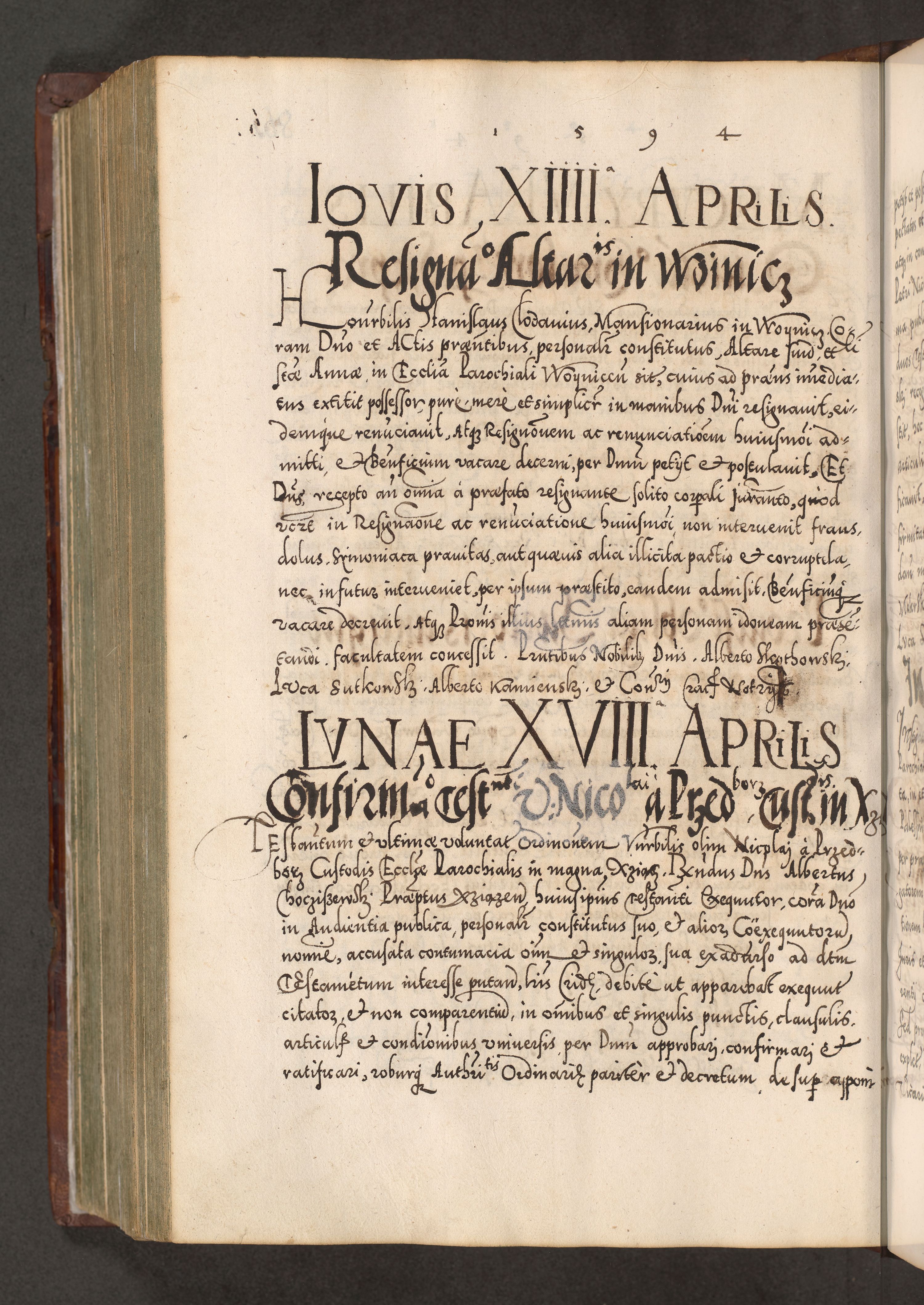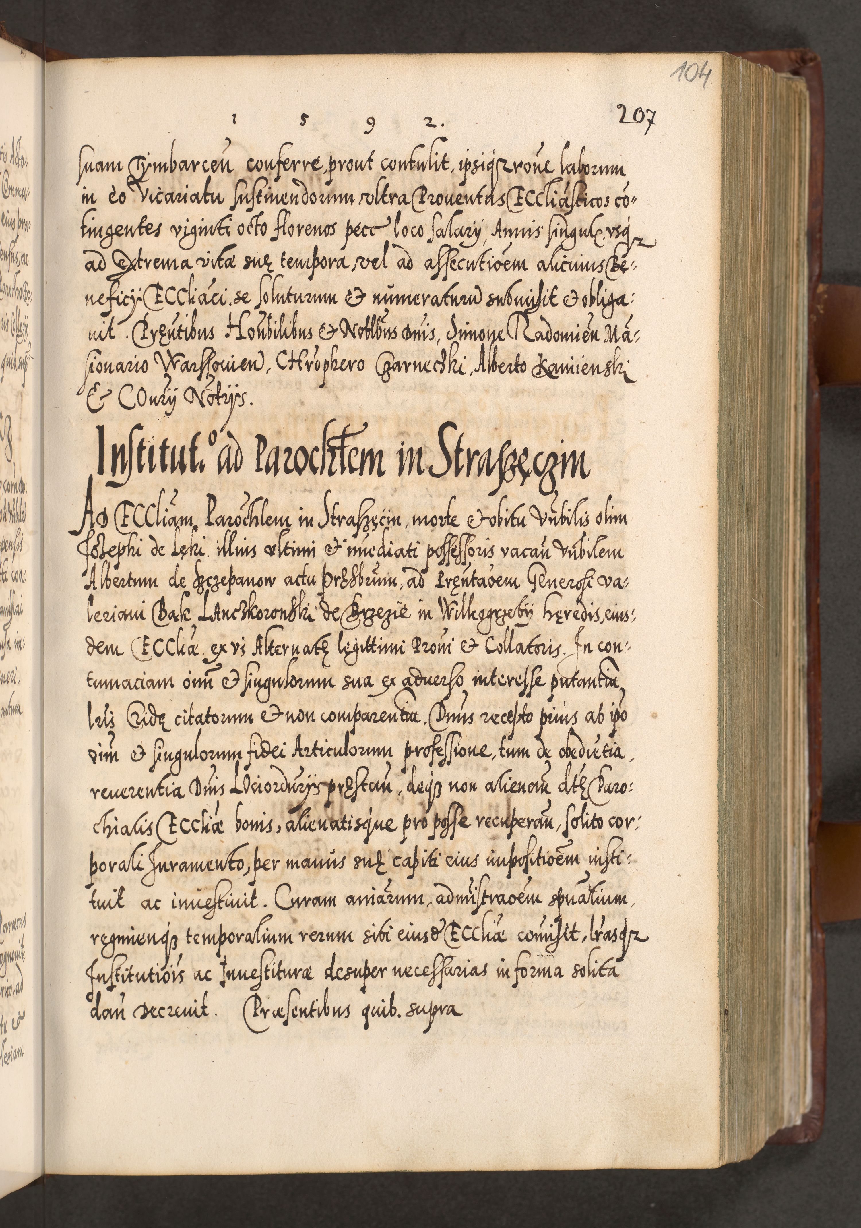 Illistrissimo et revedissimo in Christo Patre Domino Domino Georgio Rzadziwił Miserone Divina Sacrostae R. E. Tituli S. Sixti Presbitero Cardinali Duce in Olyka et Niesswiesz ad Gubernacula Ecclessiae Cracoviensis cuius administratorialem a Sancta Sede Apostolica obtinverat feliciter sedente. Acta actorum, causarum, sententiarum tam deffinitivarum quam interloquutoriarum decretorum, obligationum, quietationum, recognitionum, constitutionum procuratorum etc. coram Reverendo Domino Stanislao Crassinskz de Crasne Archidiacono Cracoviensis, Scholastico Gnesnesis, Custode Plocensis etc. Vicario et Officiali Generali Cracoviensi in Ano Domini Millesimo Quingentesimo Nonagesimo Primo cuius indictio quarta pontificatus SS. Domini Nostri Gregorii XIIII Anno I psius prio feliciter incipiut