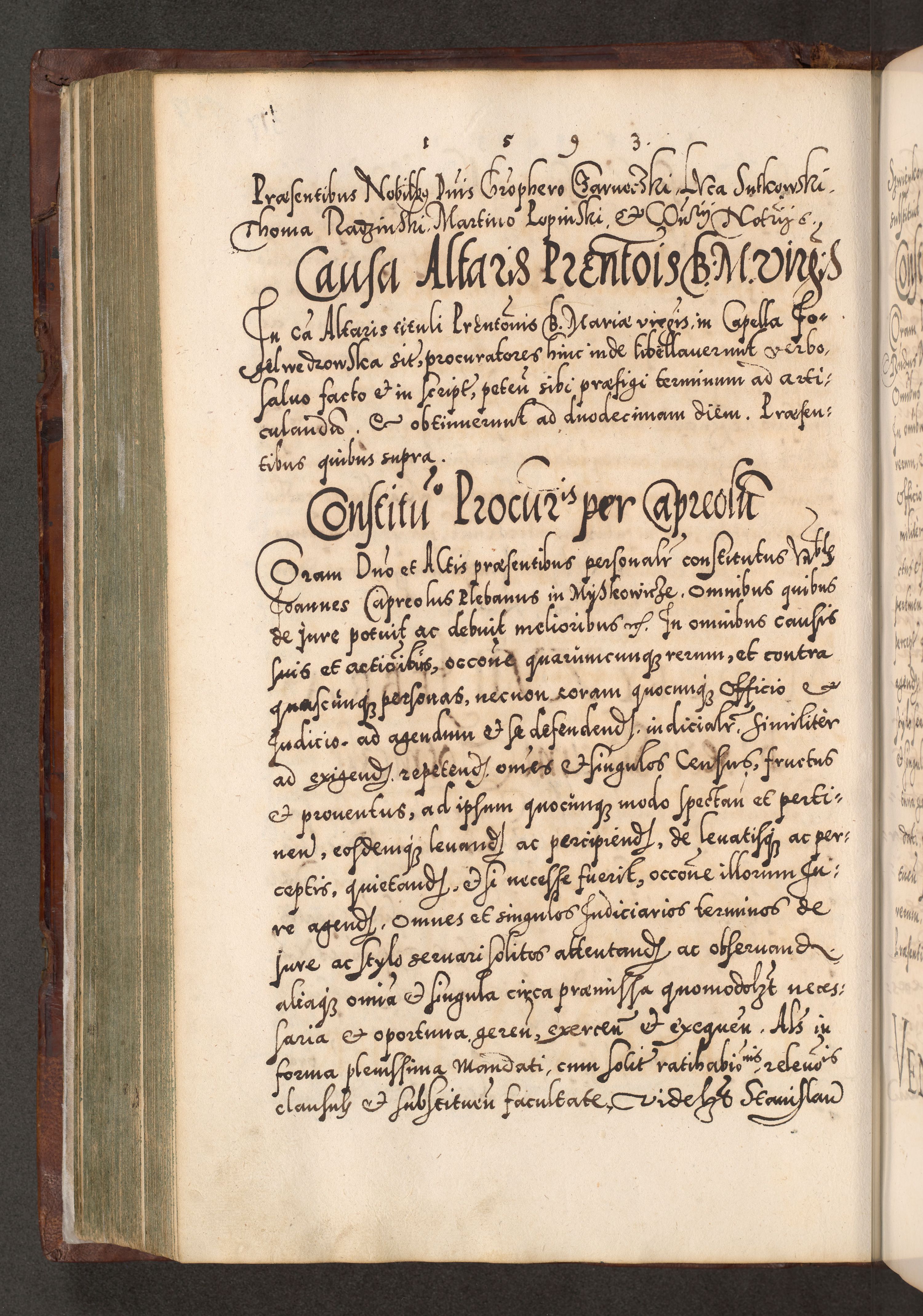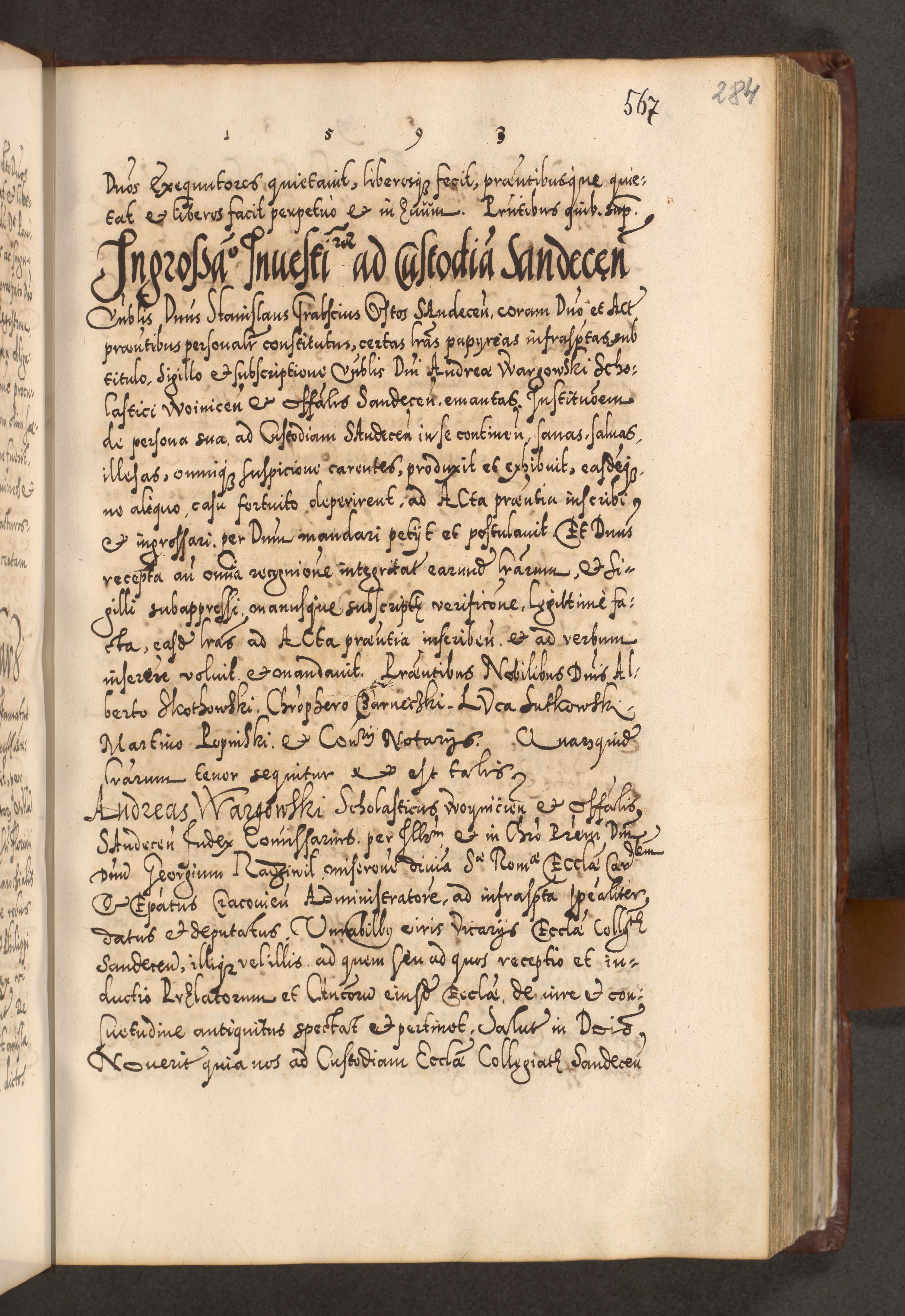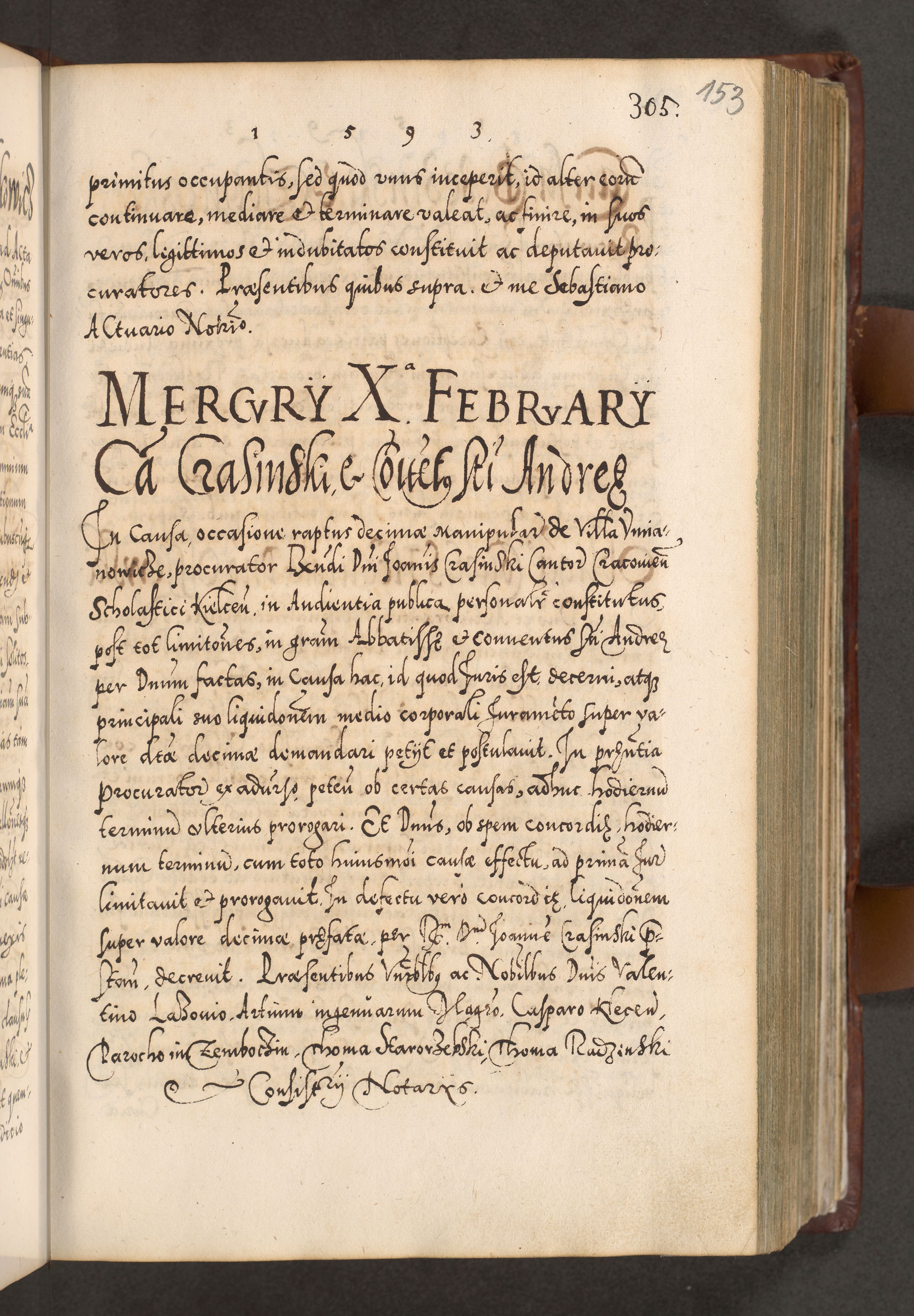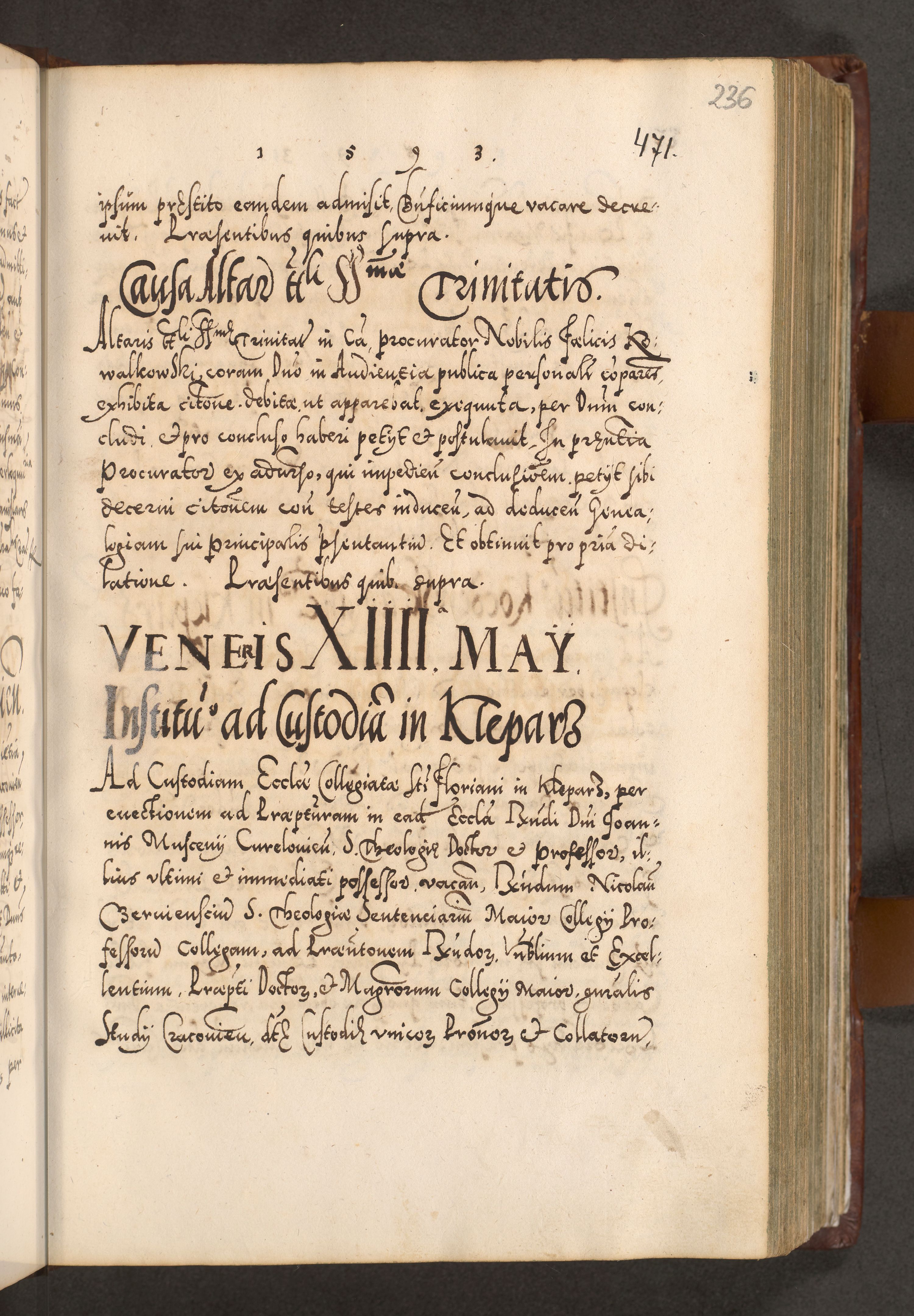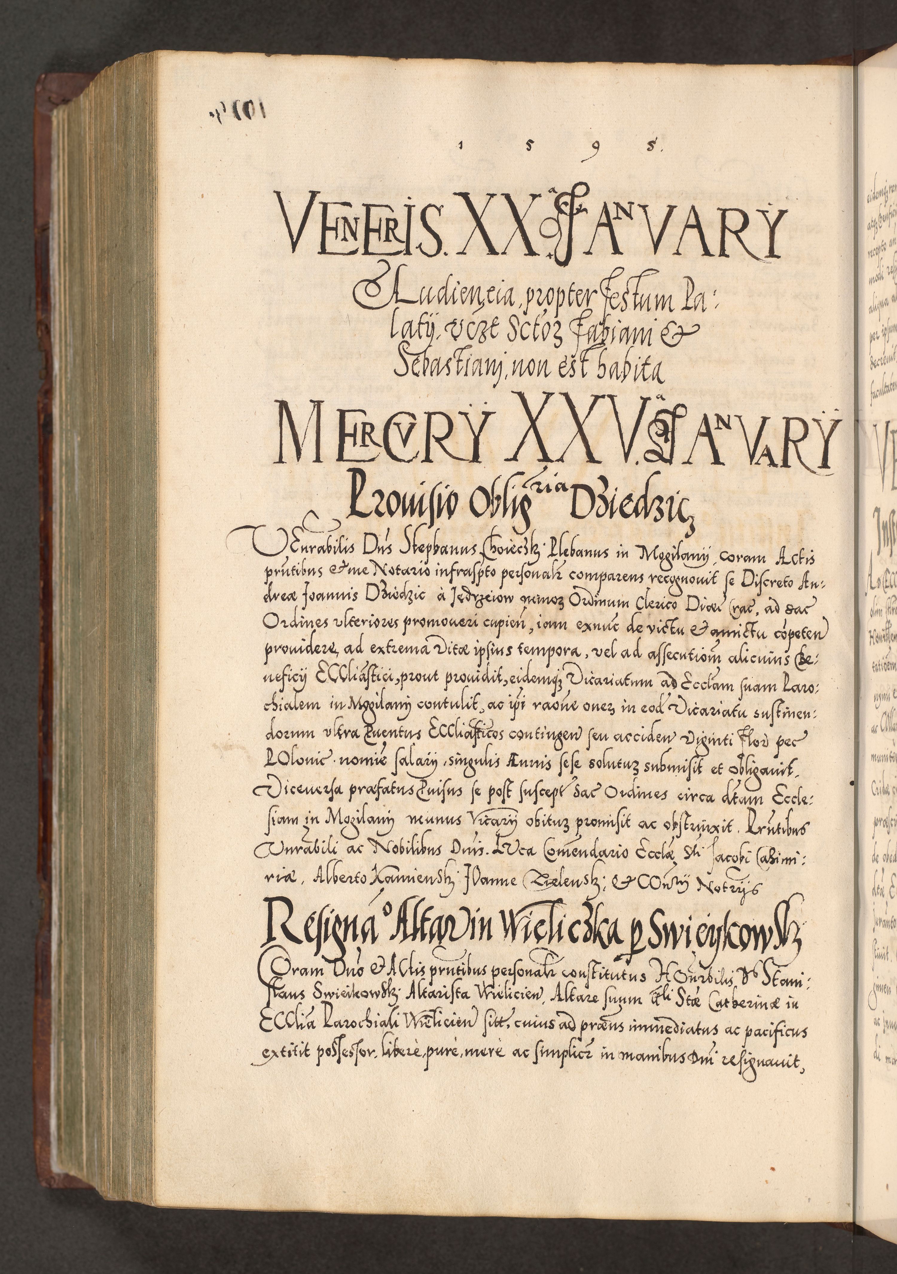 Illistrissimo et revedissimo in Christo Patre Domino Domino Georgio Rzadziwił Miserone Divina Sacrostae R. E. Tituli S. Sixti Presbitero Cardinali Duce in Olyka et Niesswiesz ad Gubernacula Ecclessiae Cracoviensis cuius administratorialem a Sancta Sede Apostolica obtinverat feliciter sedente. Acta actorum, causarum, sententiarum tam deffinitivarum quam interloquutoriarum decretorum, obligationum, quietationum, recognitionum, constitutionum procuratorum etc. coram Reverendo Domino Stanislao Crassinskz de Crasne Archidiacono Cracoviensis, Scholastico Gnesnesis, Custode Plocensis etc. Vicario et Officiali Generali Cracoviensi in Ano Domini Millesimo Quingentesimo Nonagesimo Primo cuius indictio quarta pontificatus SS. Domini Nostri Gregorii XIIII Anno I psius prio feliciter incipiut