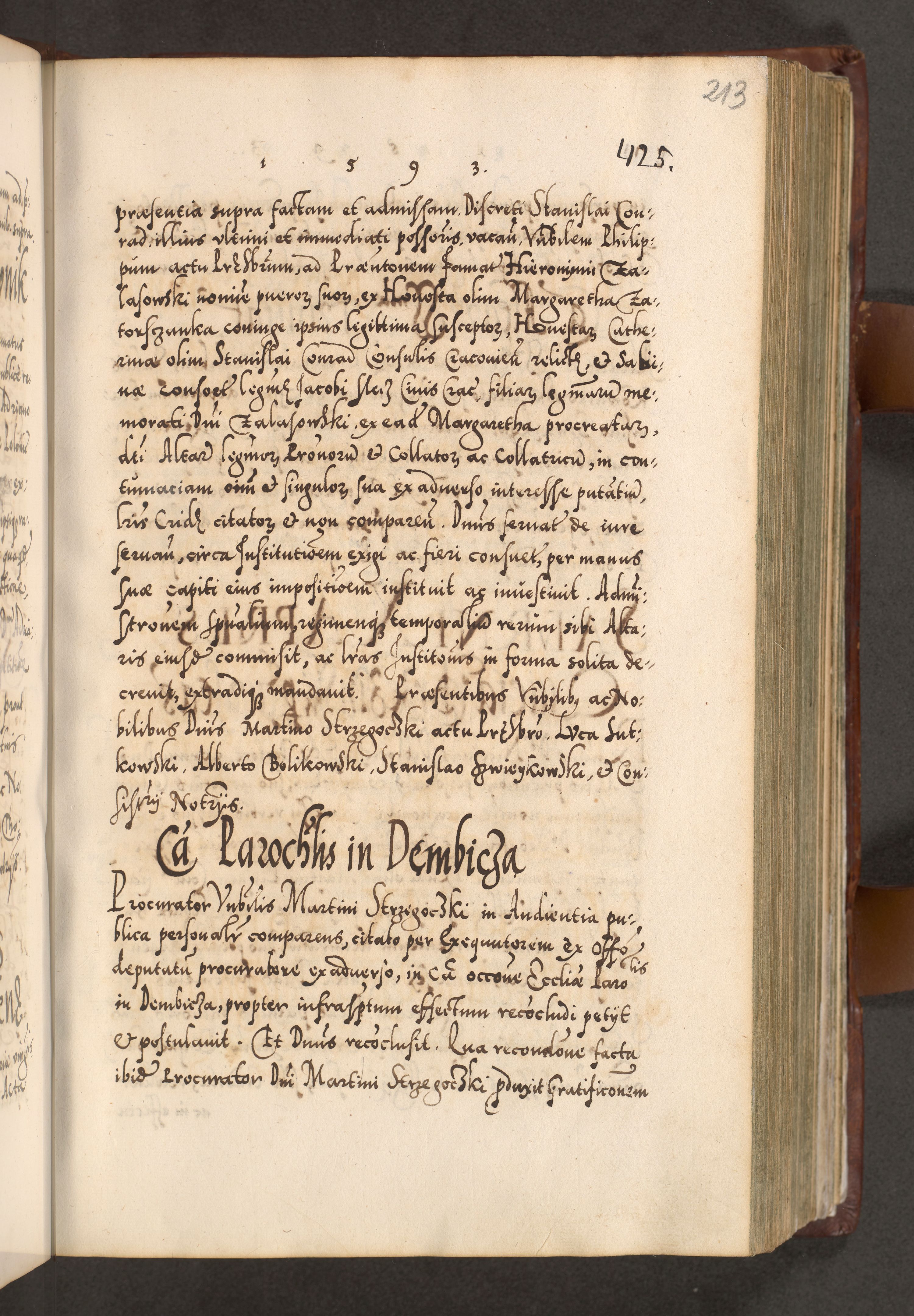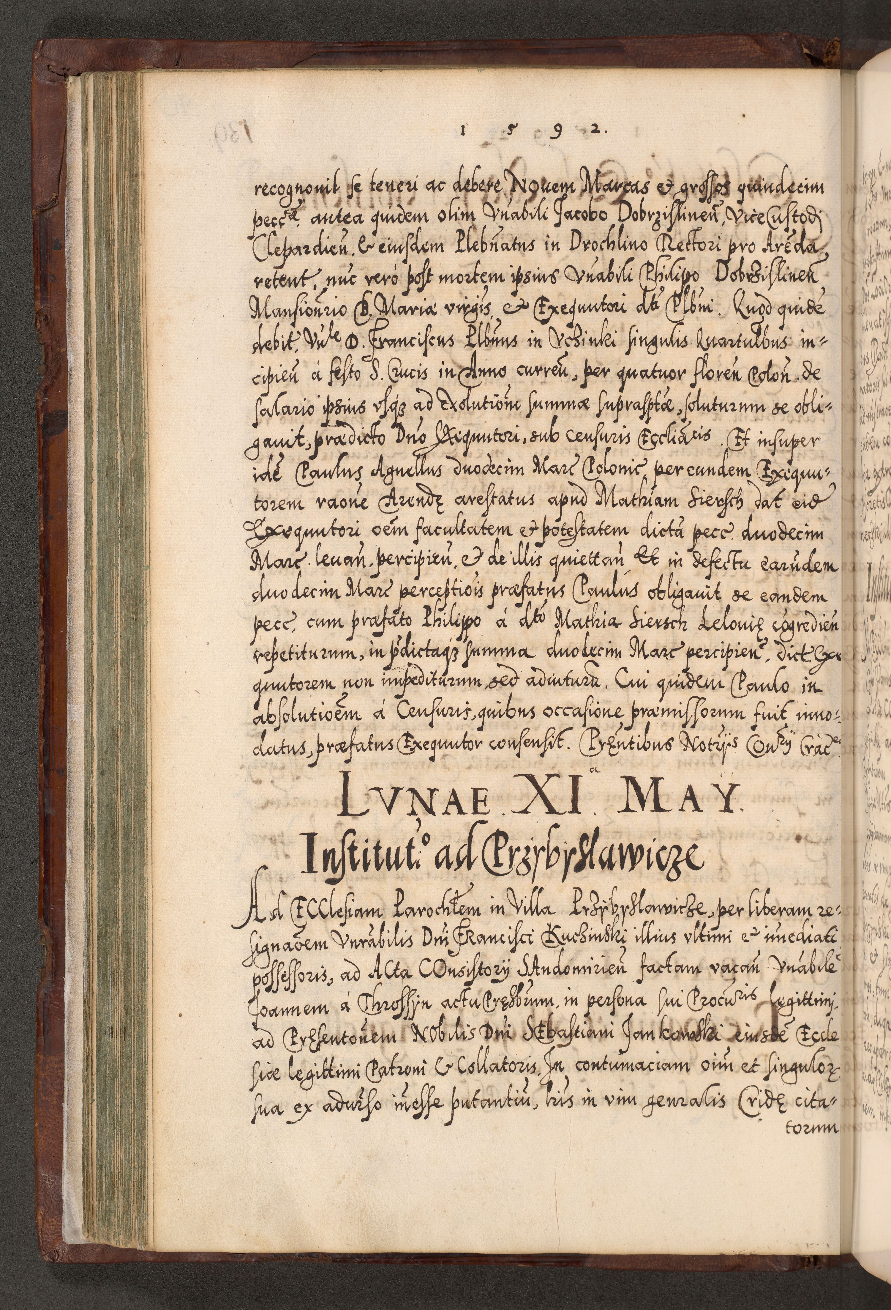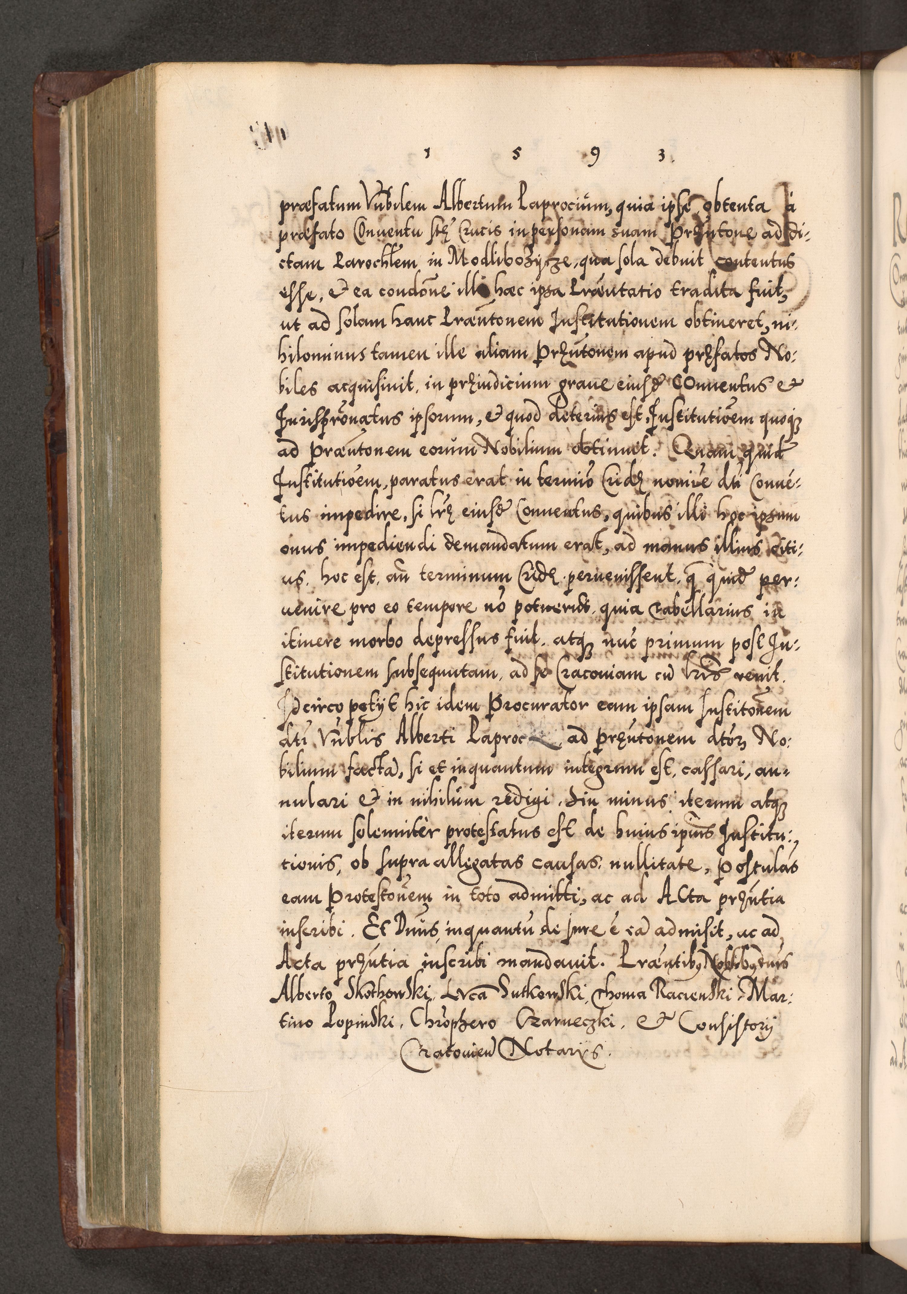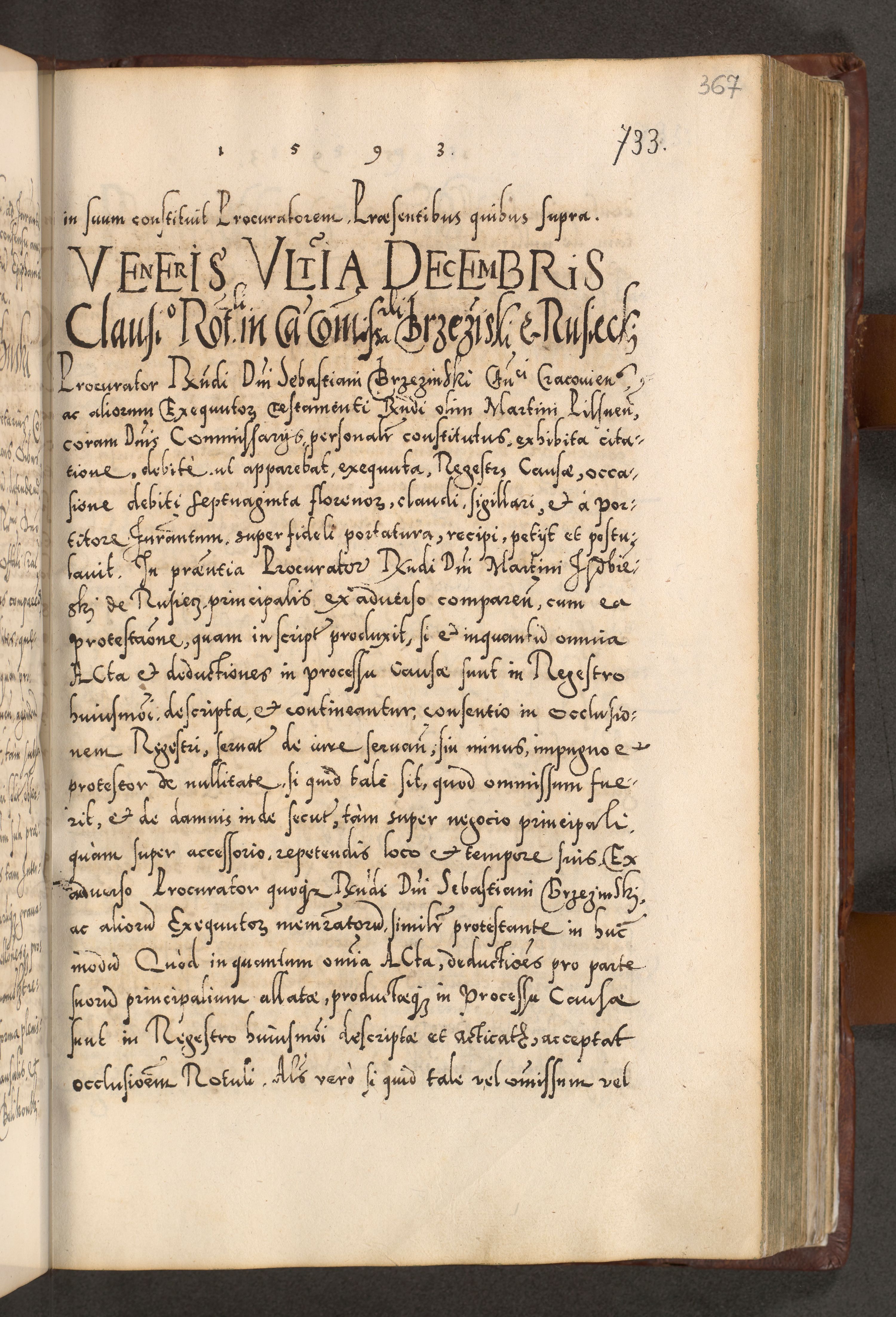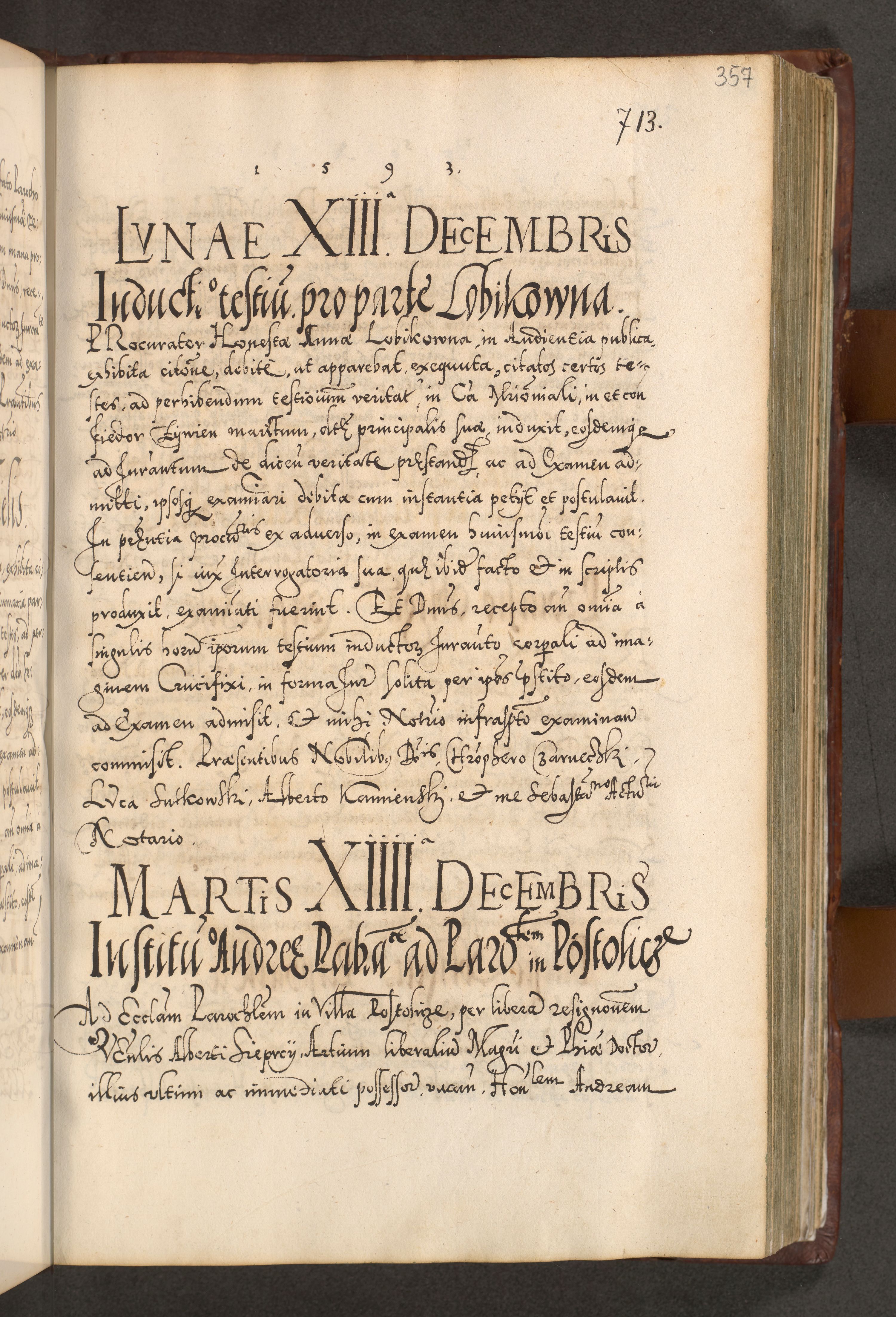Illistrissimo et revedissimo in Christo Patre Domino Domino Georgio Rzadziwił Miserone Divina Sacrostae R. E. Tituli S. Sixti Presbitero Cardinali Duce in Olyka et Niesswiesz ad Gubernacula Ecclessiae Cracoviensis cuius administratorialem a Sancta Sede Apostolica obtinverat feliciter sedente. Acta actorum, causarum, sententiarum tam deffinitivarum quam interloquutoriarum decretorum, obligationum, quietationum, recognitionum, constitutionum procuratorum etc. coram Reverendo Domino Stanislao Crassinskz de Crasne Archidiacono Cracoviensis, Scholastico Gnesnesis, Custode Plocensis etc. Vicario et Officiali Generali Cracoviensi in Ano Domini Millesimo Quingentesimo Nonagesimo Primo cuius indictio quarta pontificatus SS. Domini Nostri Gregorii XIIII Anno I psius prio feliciter incipiut
