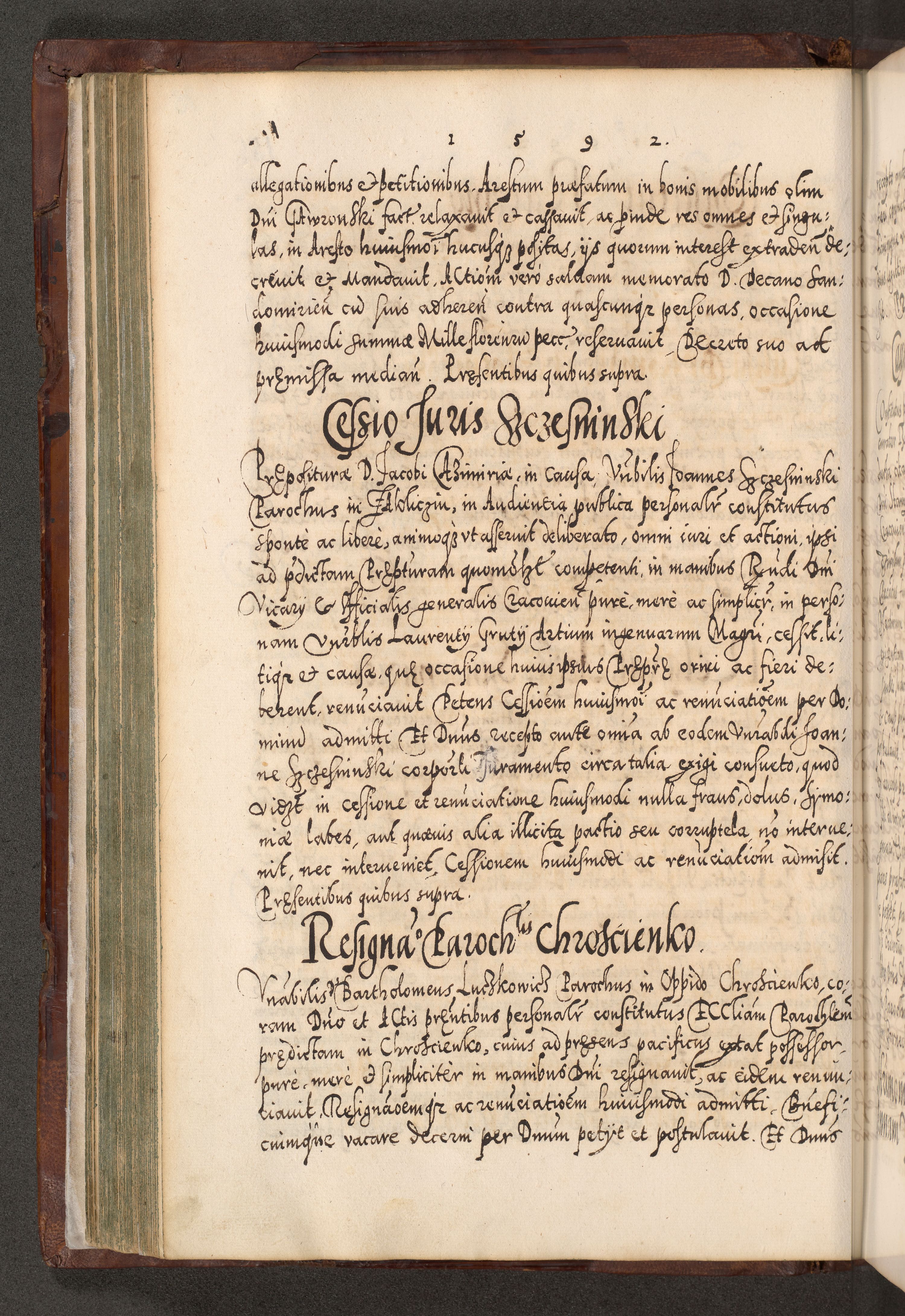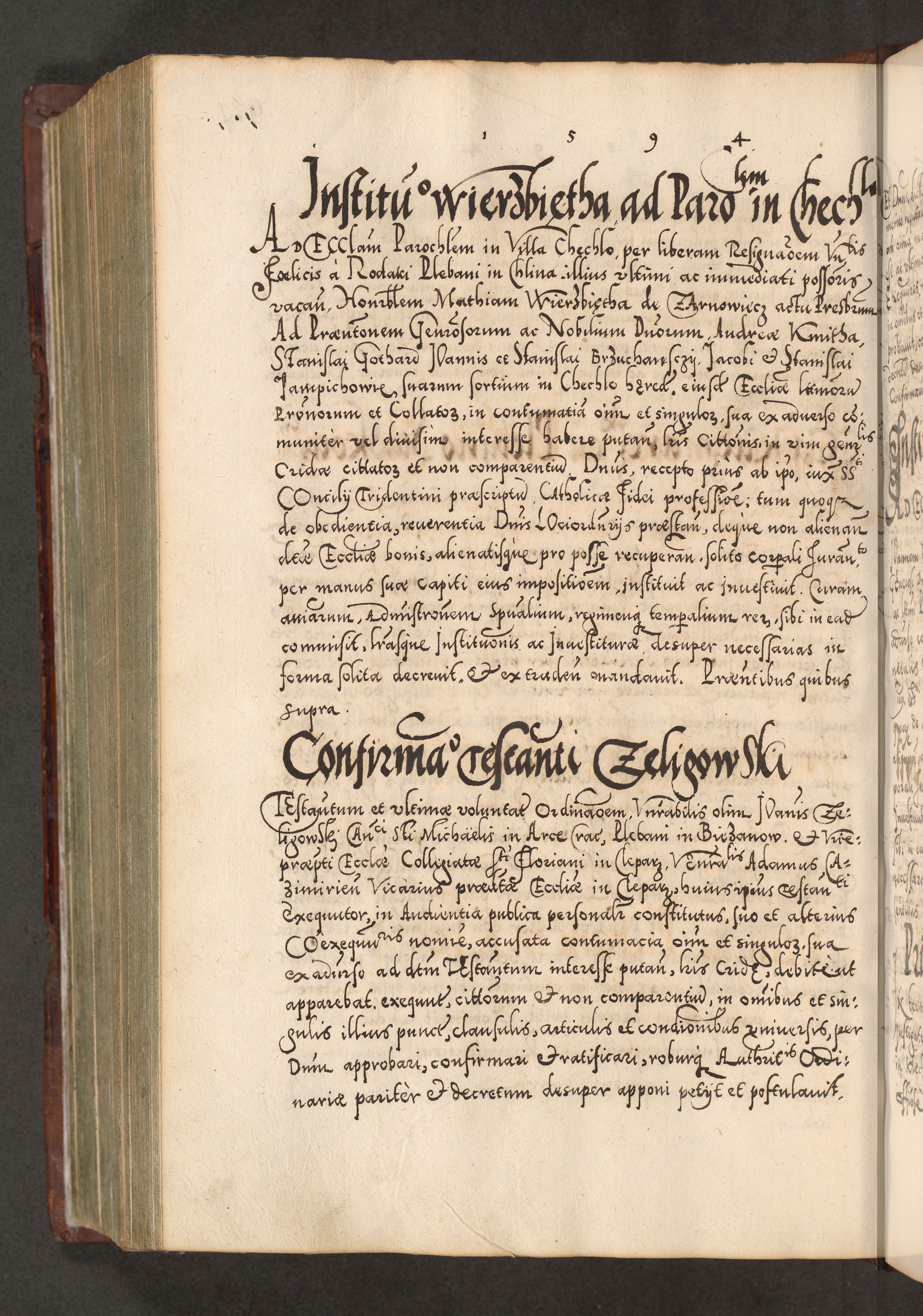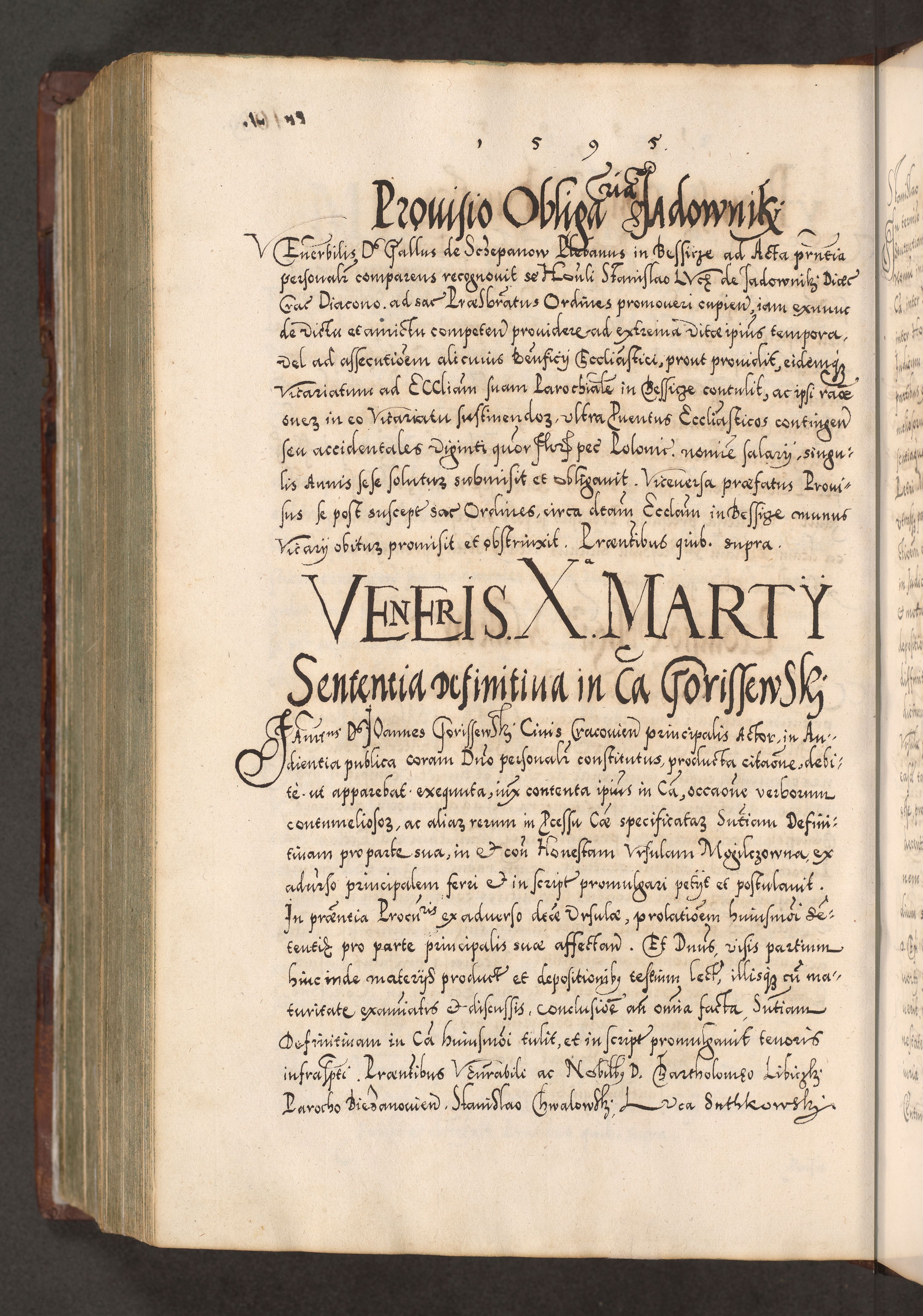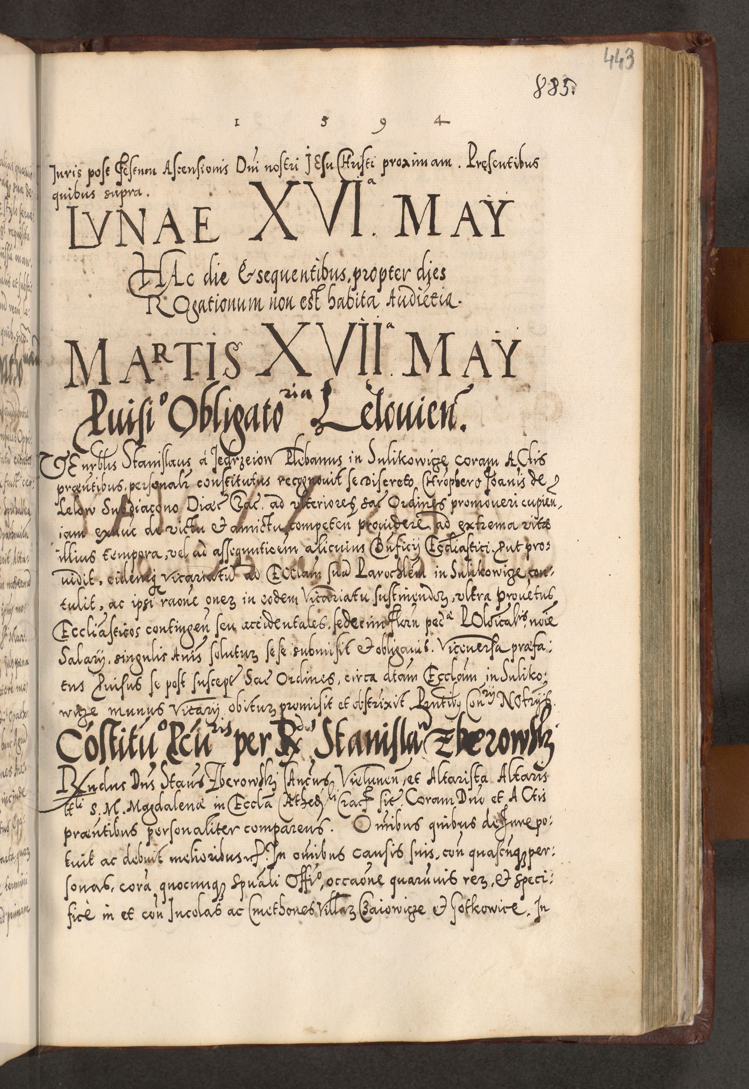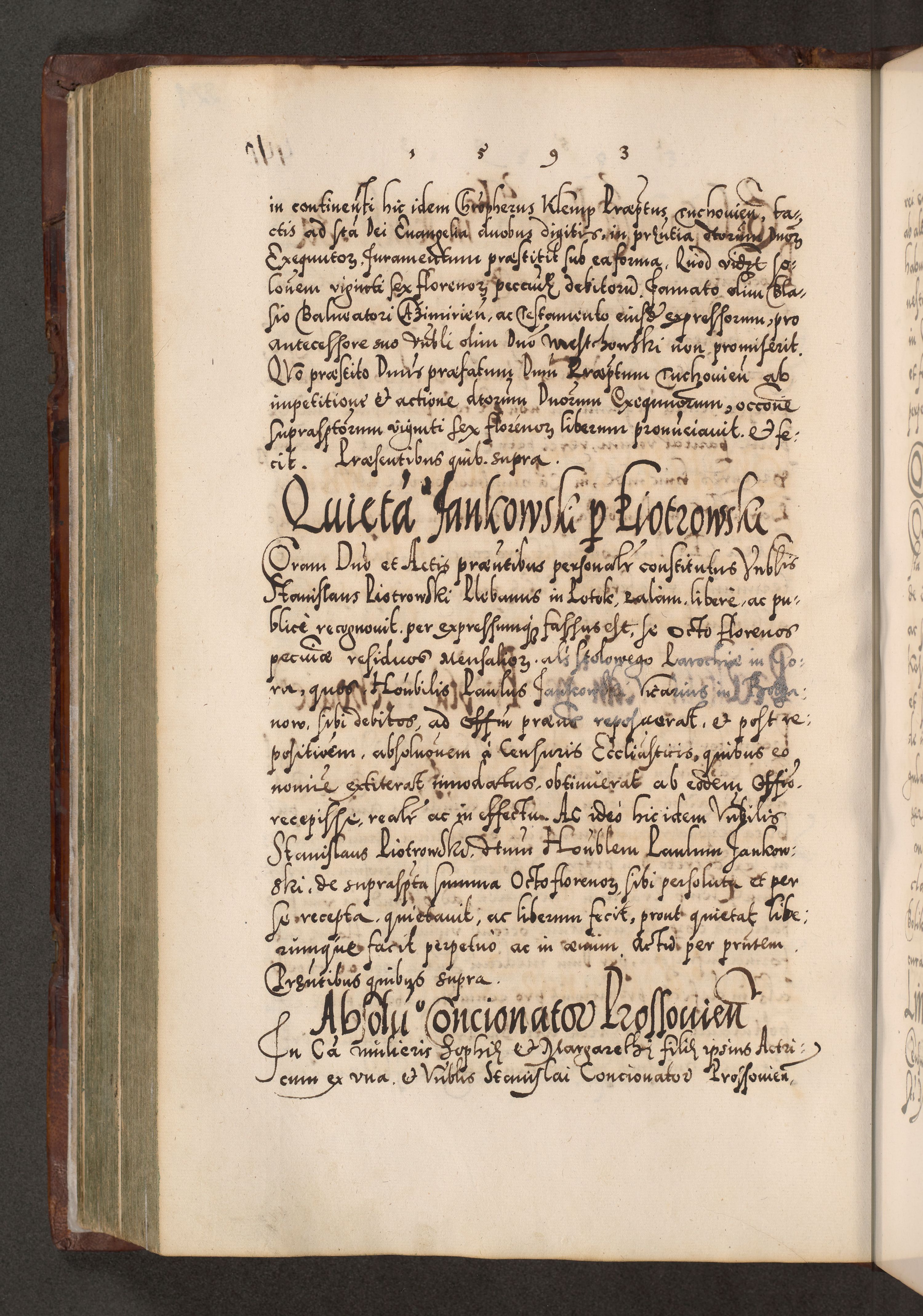 Illistrissimo et revedissimo in Christo Patre Domino Domino Georgio Rzadziwił Miserone Divina Sacrostae R. E. Tituli S. Sixti Presbitero Cardinali Duce in Olyka et Niesswiesz ad Gubernacula Ecclessiae Cracoviensis cuius administratorialem a Sancta Sede Apostolica obtinverat feliciter sedente. Acta actorum, causarum, sententiarum tam deffinitivarum quam interloquutoriarum decretorum, obligationum, quietationum, recognitionum, constitutionum procuratorum etc. coram Reverendo Domino Stanislao Crassinskz de Crasne Archidiacono Cracoviensis, Scholastico Gnesnesis, Custode Plocensis etc. Vicario et Officiali Generali Cracoviensi in Ano Domini Millesimo Quingentesimo Nonagesimo Primo cuius indictio quarta pontificatus SS. Domini Nostri Gregorii XIIII Anno I psius prio feliciter incipiut