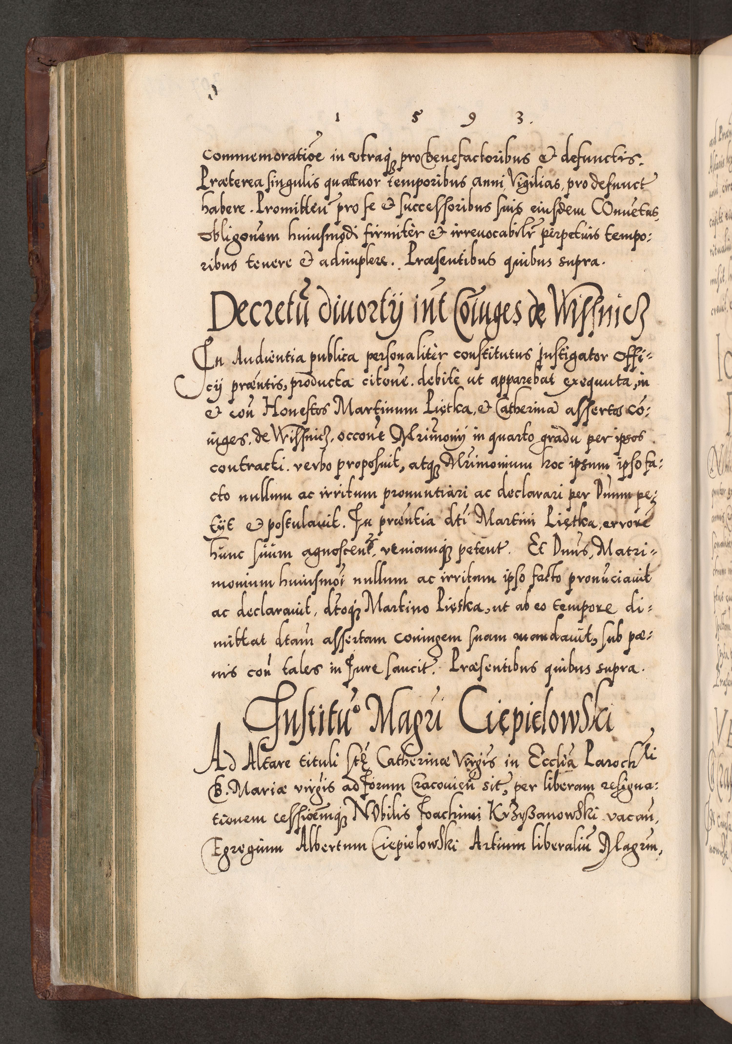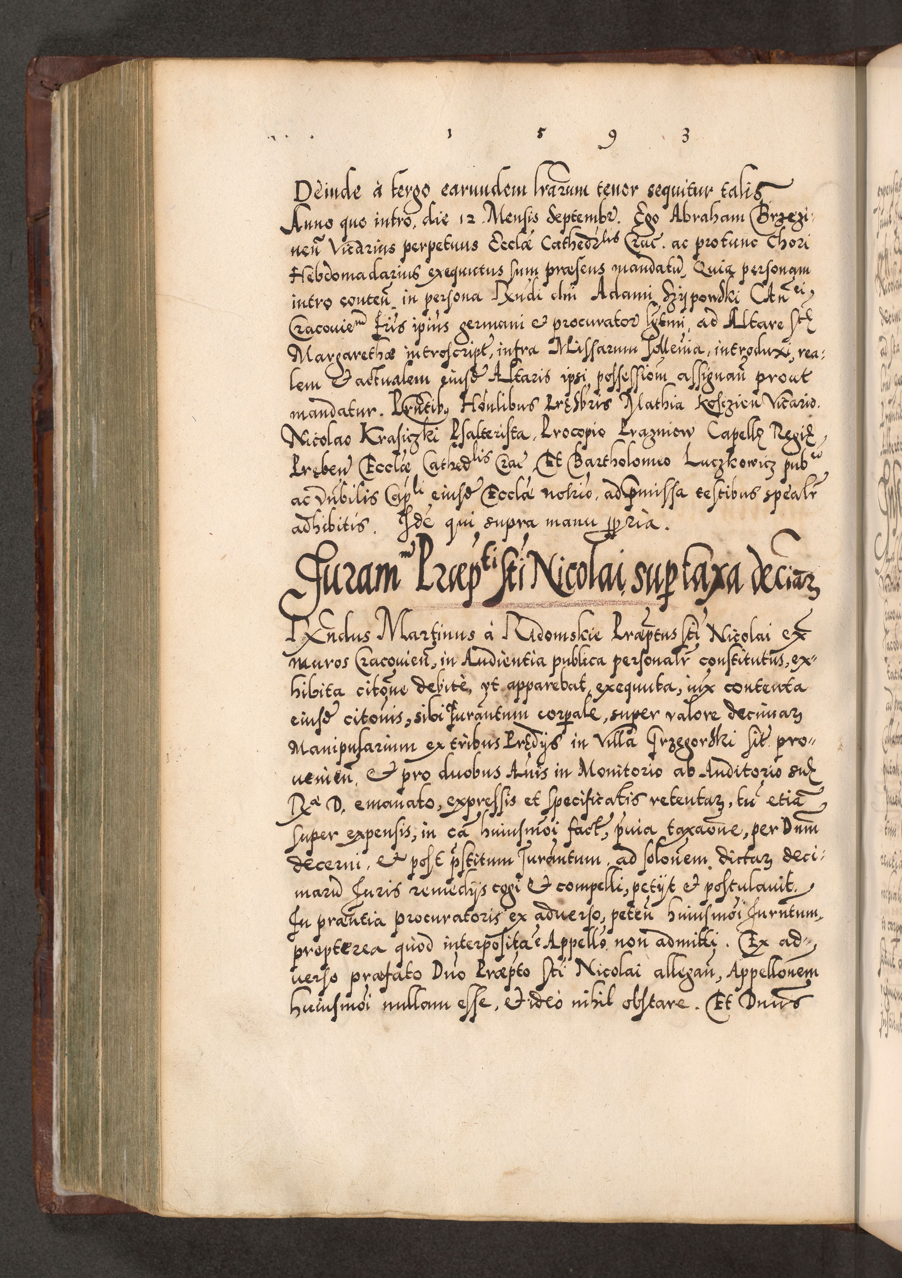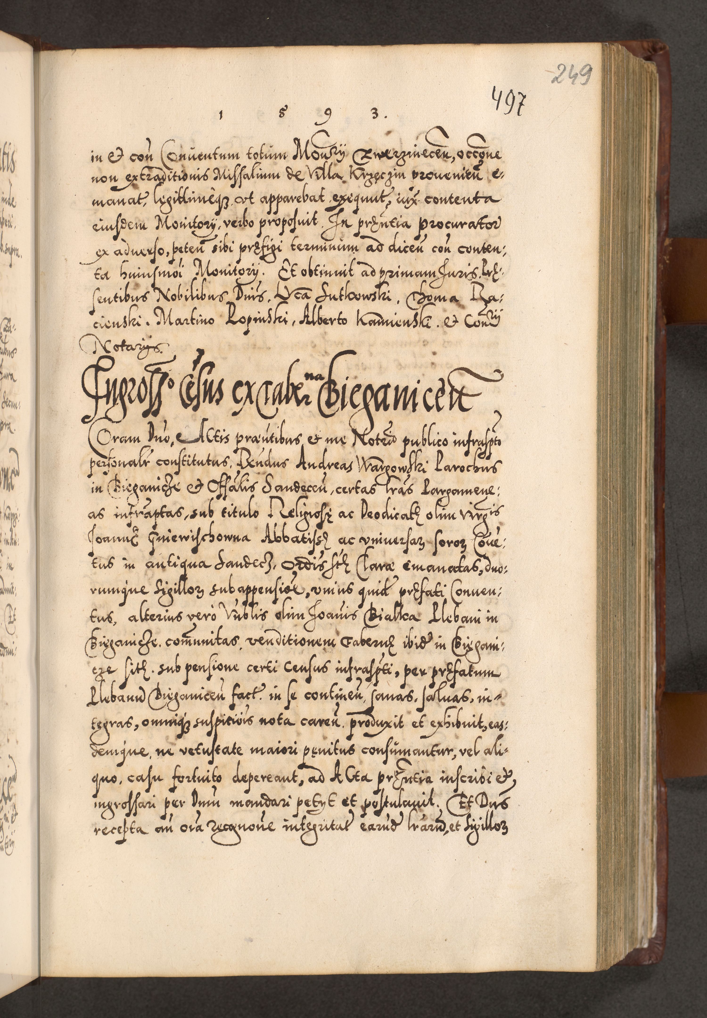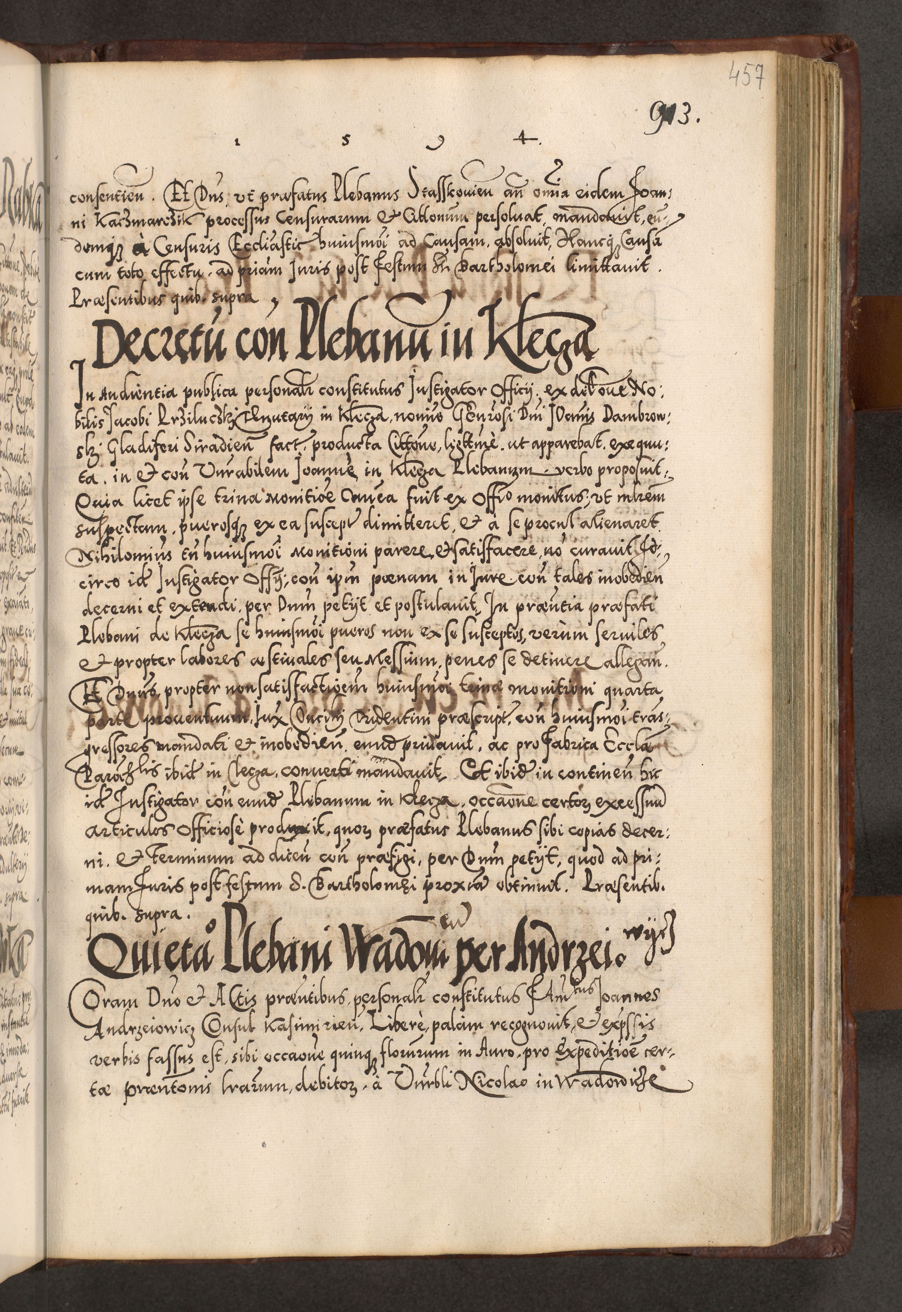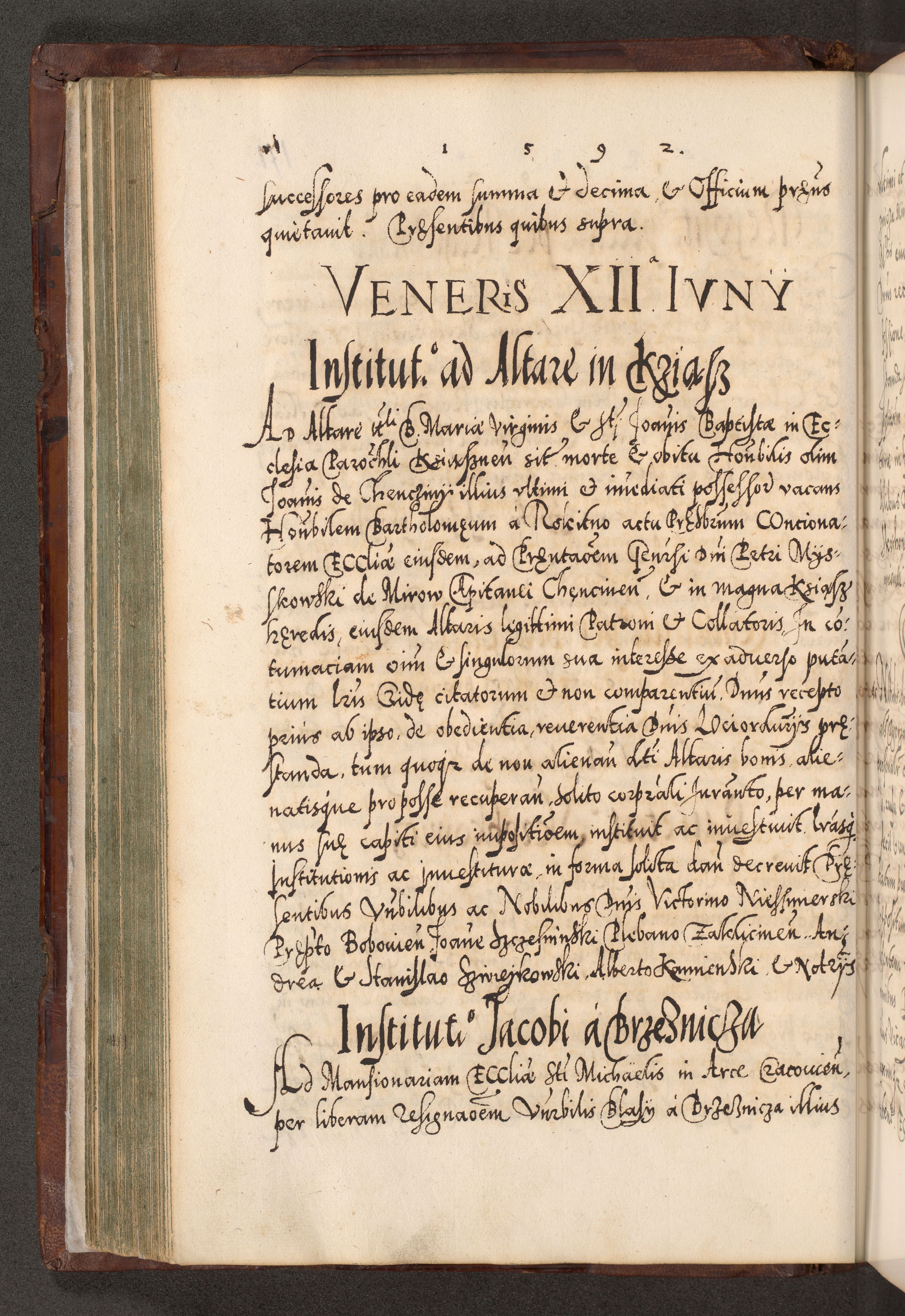 Illistrissimo et revedissimo in Christo Patre Domino Domino Georgio Rzadziwił Miserone Divina Sacrostae R. E. Tituli S. Sixti Presbitero Cardinali Duce in Olyka et Niesswiesz ad Gubernacula Ecclessiae Cracoviensis cuius administratorialem a Sancta Sede Apostolica obtinverat feliciter sedente. Acta actorum, causarum, sententiarum tam deffinitivarum quam interloquutoriarum decretorum, obligationum, quietationum, recognitionum, constitutionum procuratorum etc. coram Reverendo Domino Stanislao Crassinskz de Crasne Archidiacono Cracoviensis, Scholastico Gnesnesis, Custode Plocensis etc. Vicario et Officiali Generali Cracoviensi in Ano Domini Millesimo Quingentesimo Nonagesimo Primo cuius indictio quarta pontificatus SS. Domini Nostri Gregorii XIIII Anno I psius prio feliciter incipiut