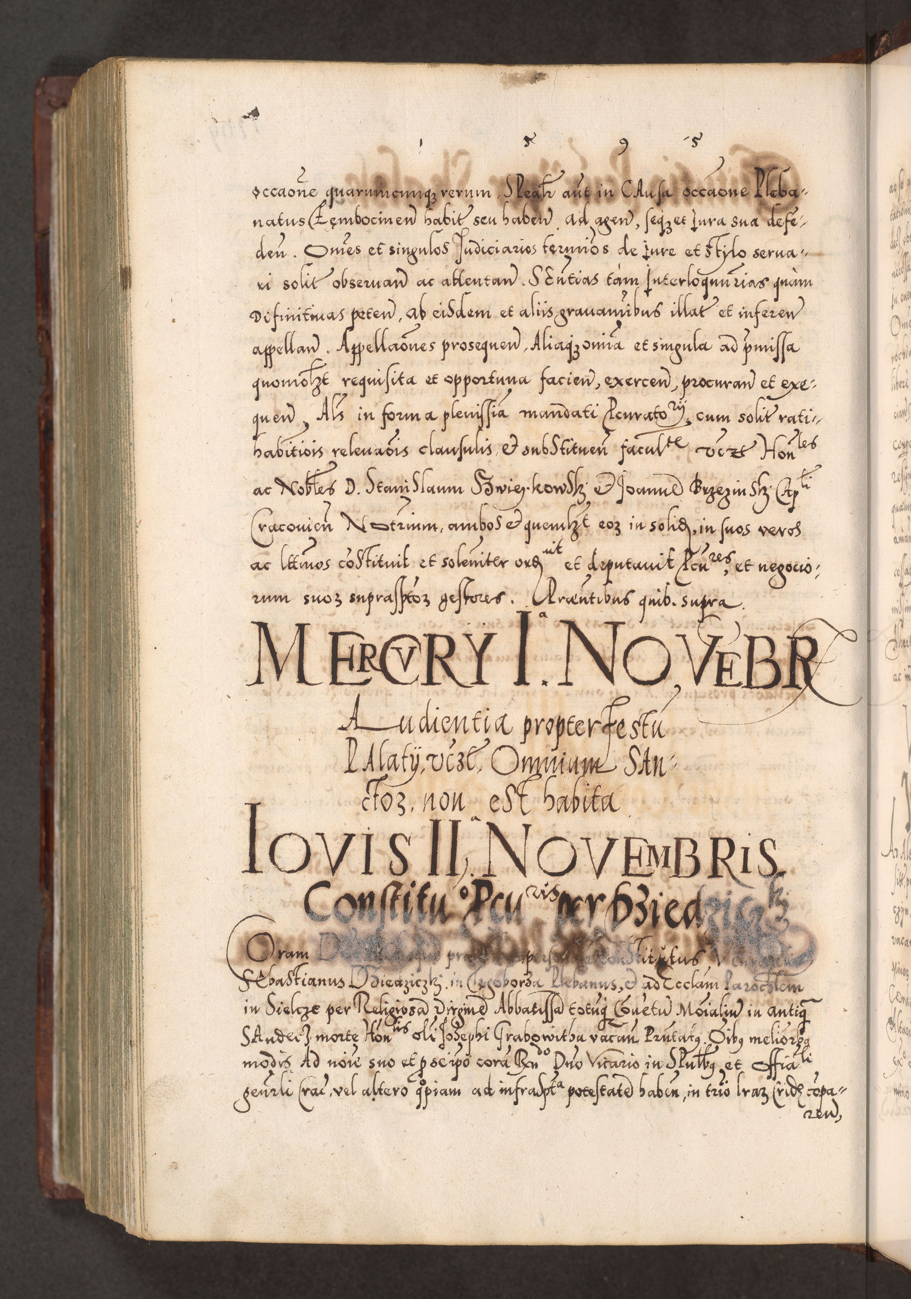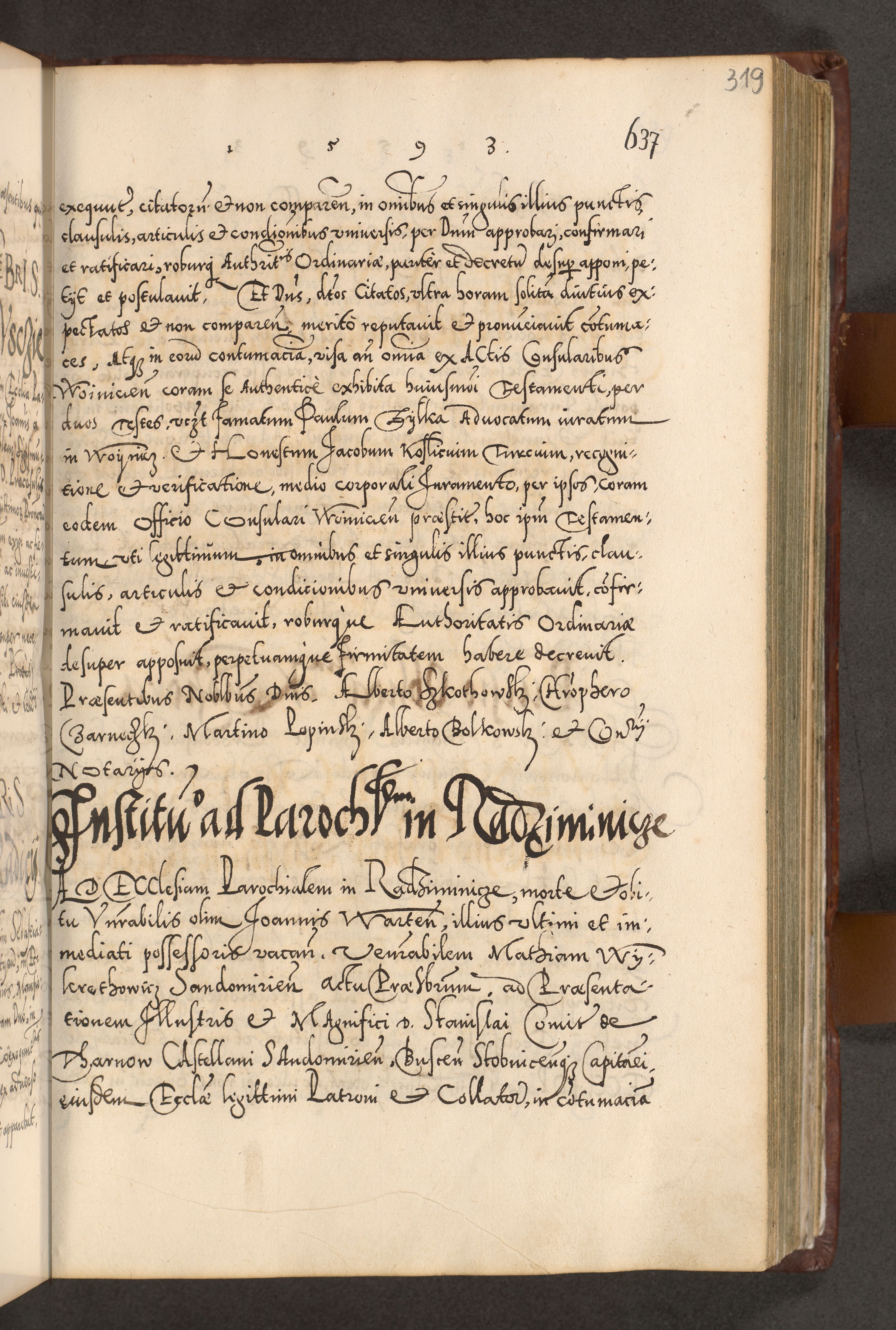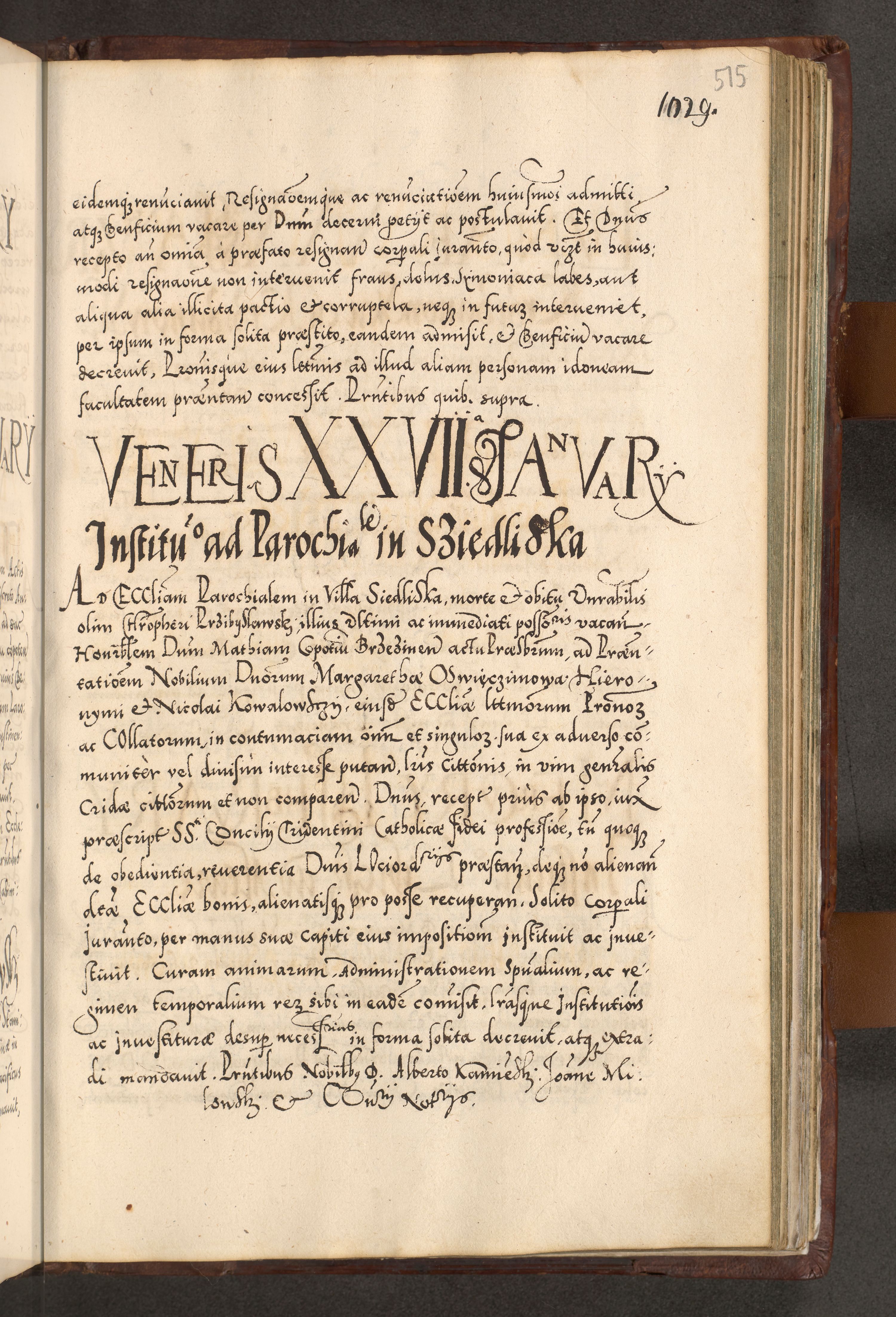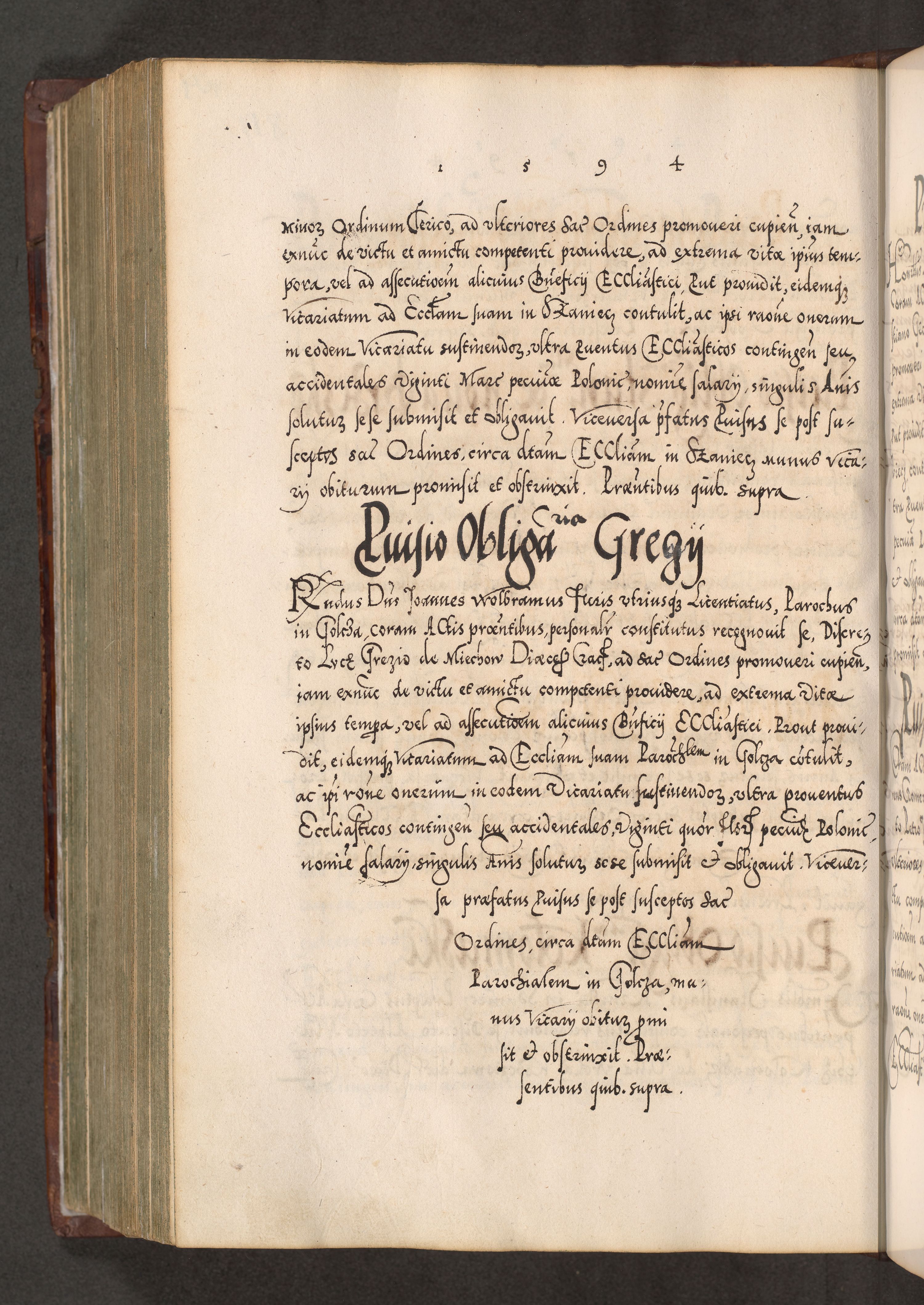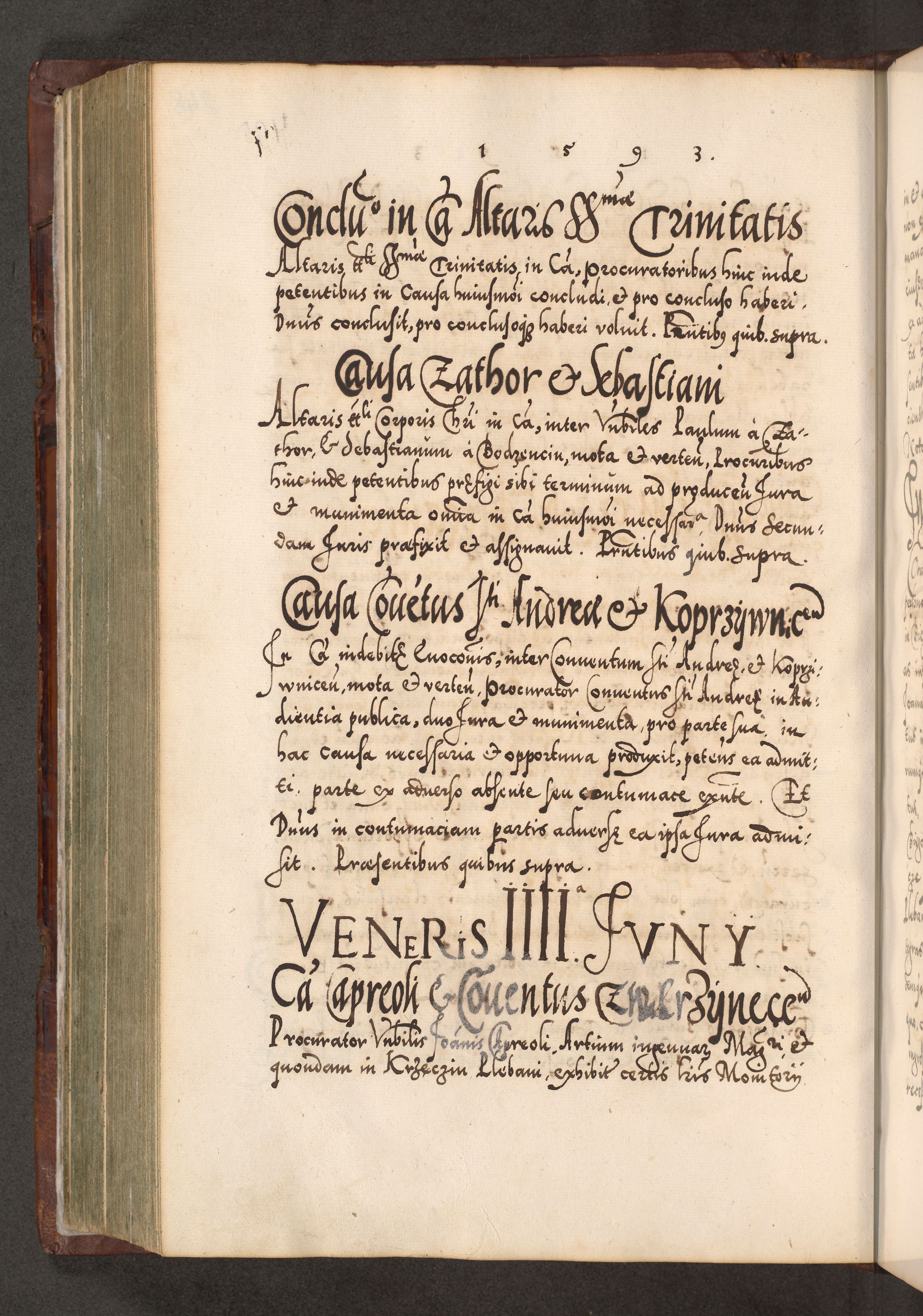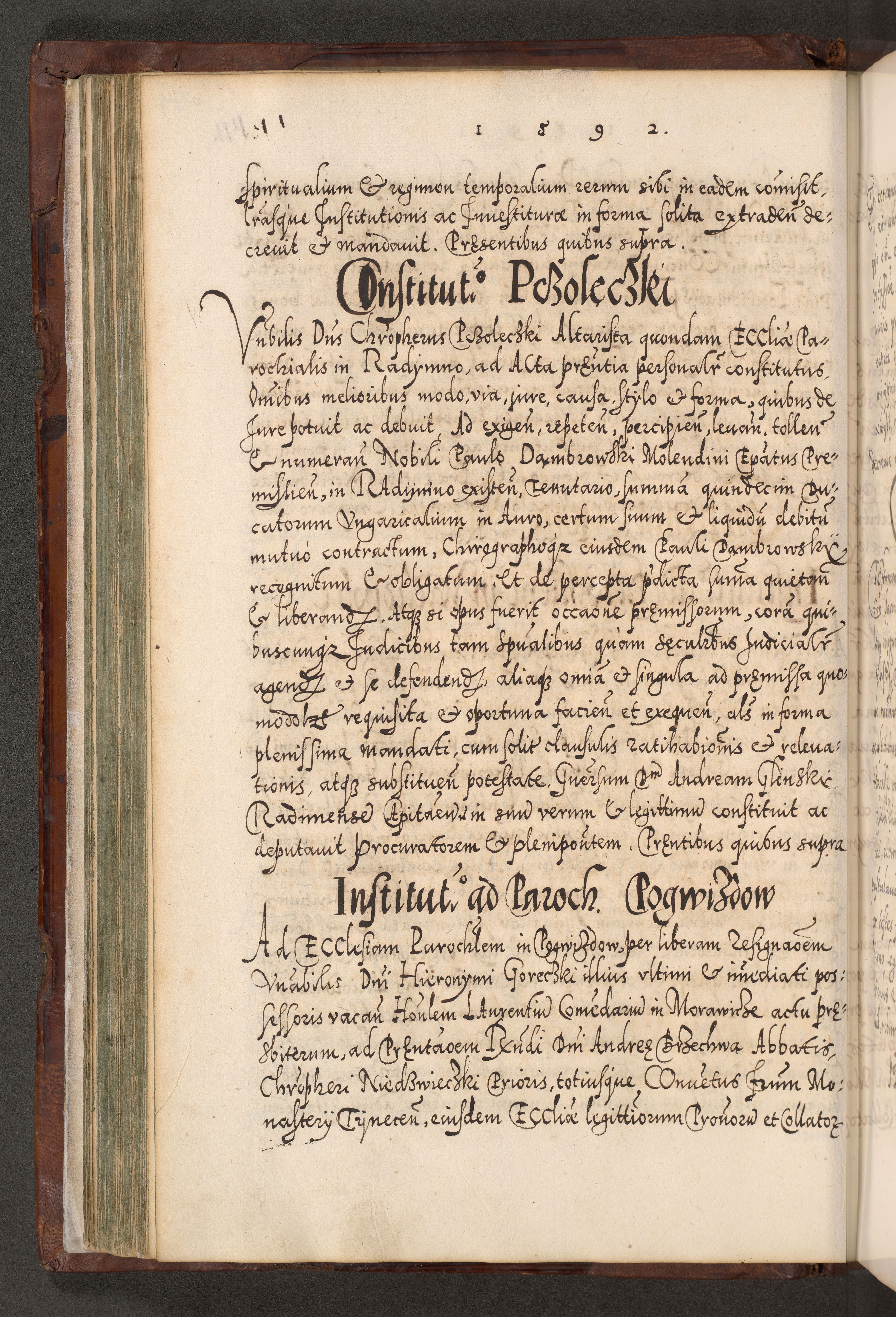 Illistrissimo et revedissimo in Christo Patre Domino Domino Georgio Rzadziwił Miserone Divina Sacrostae R. E. Tituli S. Sixti Presbitero Cardinali Duce in Olyka et Niesswiesz ad Gubernacula Ecclessiae Cracoviensis cuius administratorialem a Sancta Sede Apostolica obtinverat feliciter sedente. Acta actorum, causarum, sententiarum tam deffinitivarum quam interloquutoriarum decretorum, obligationum, quietationum, recognitionum, constitutionum procuratorum etc. coram Reverendo Domino Stanislao Crassinskz de Crasne Archidiacono Cracoviensis, Scholastico Gnesnesis, Custode Plocensis etc. Vicario et Officiali Generali Cracoviensi in Ano Domini Millesimo Quingentesimo Nonagesimo Primo cuius indictio quarta pontificatus SS. Domini Nostri Gregorii XIIII Anno I psius prio feliciter incipiut