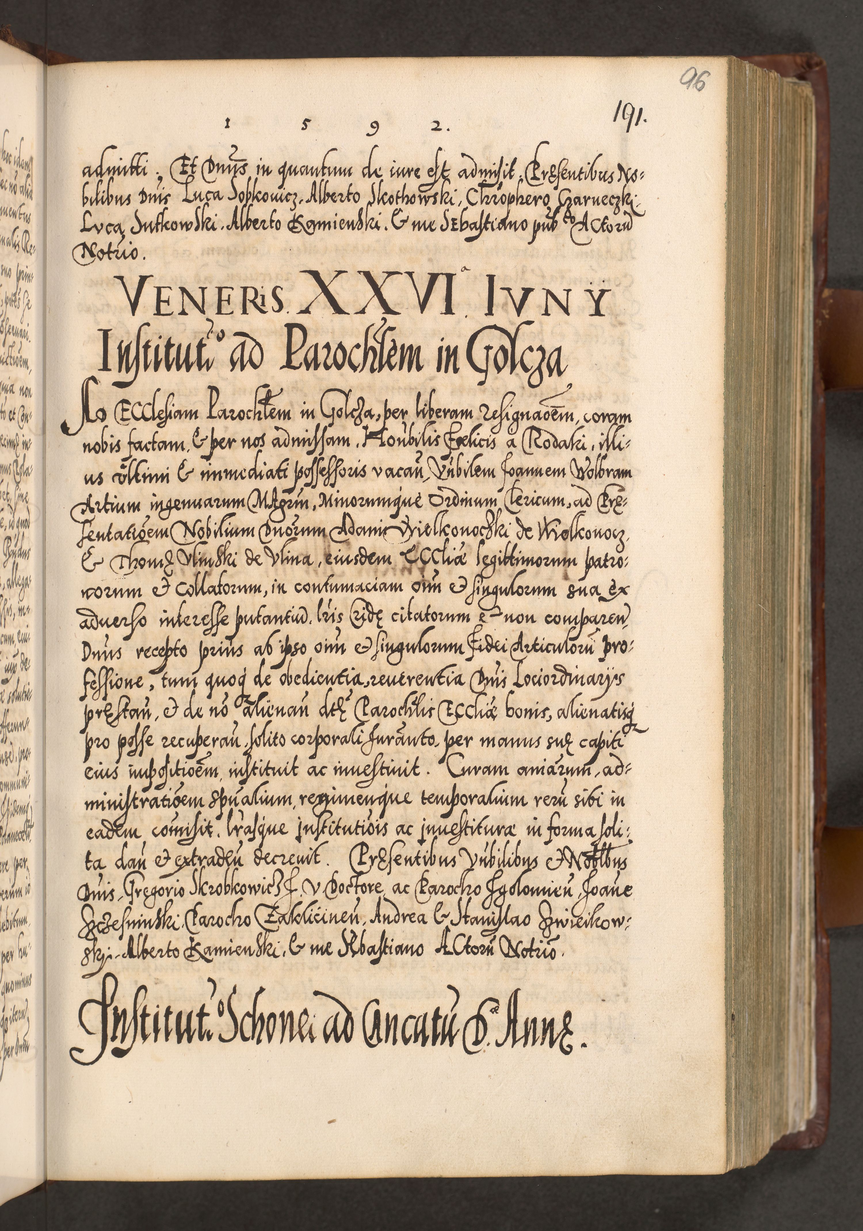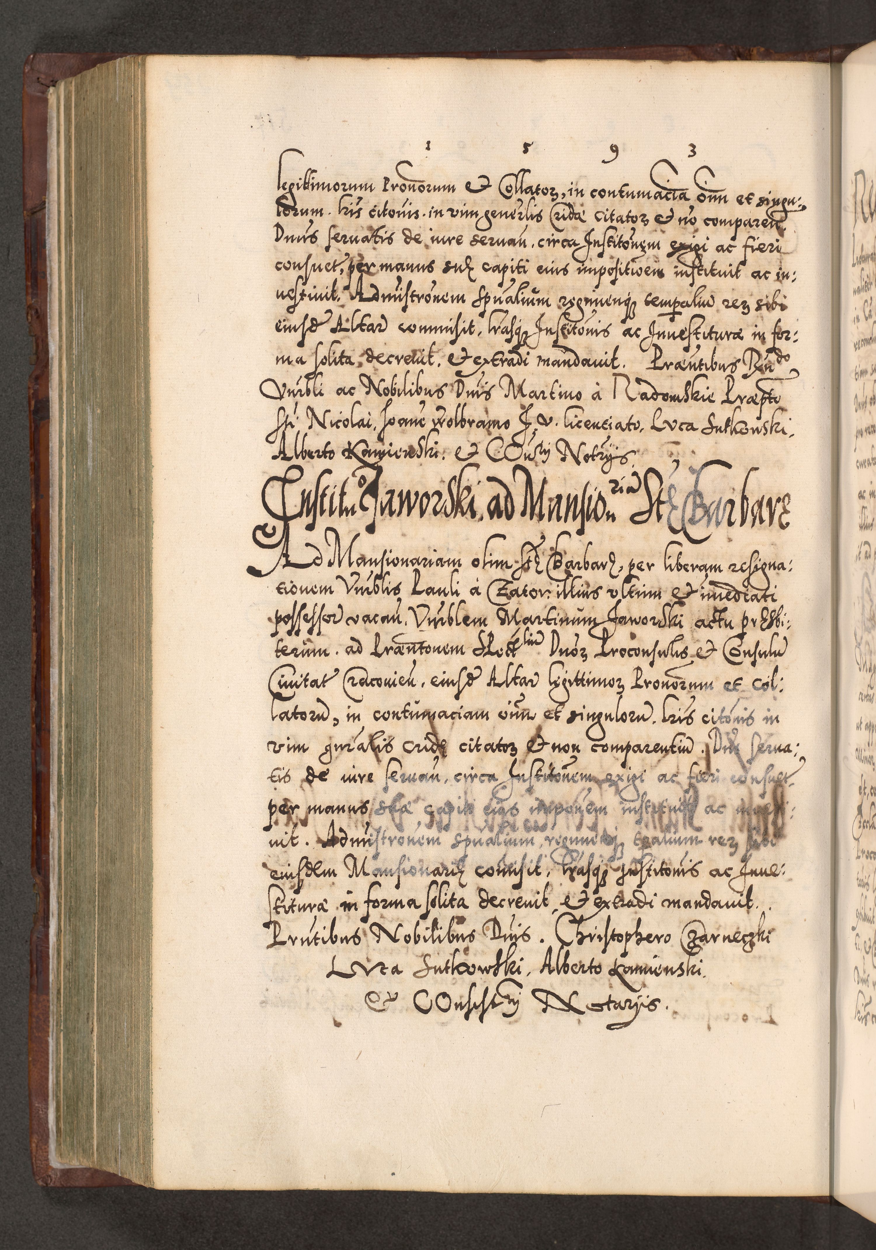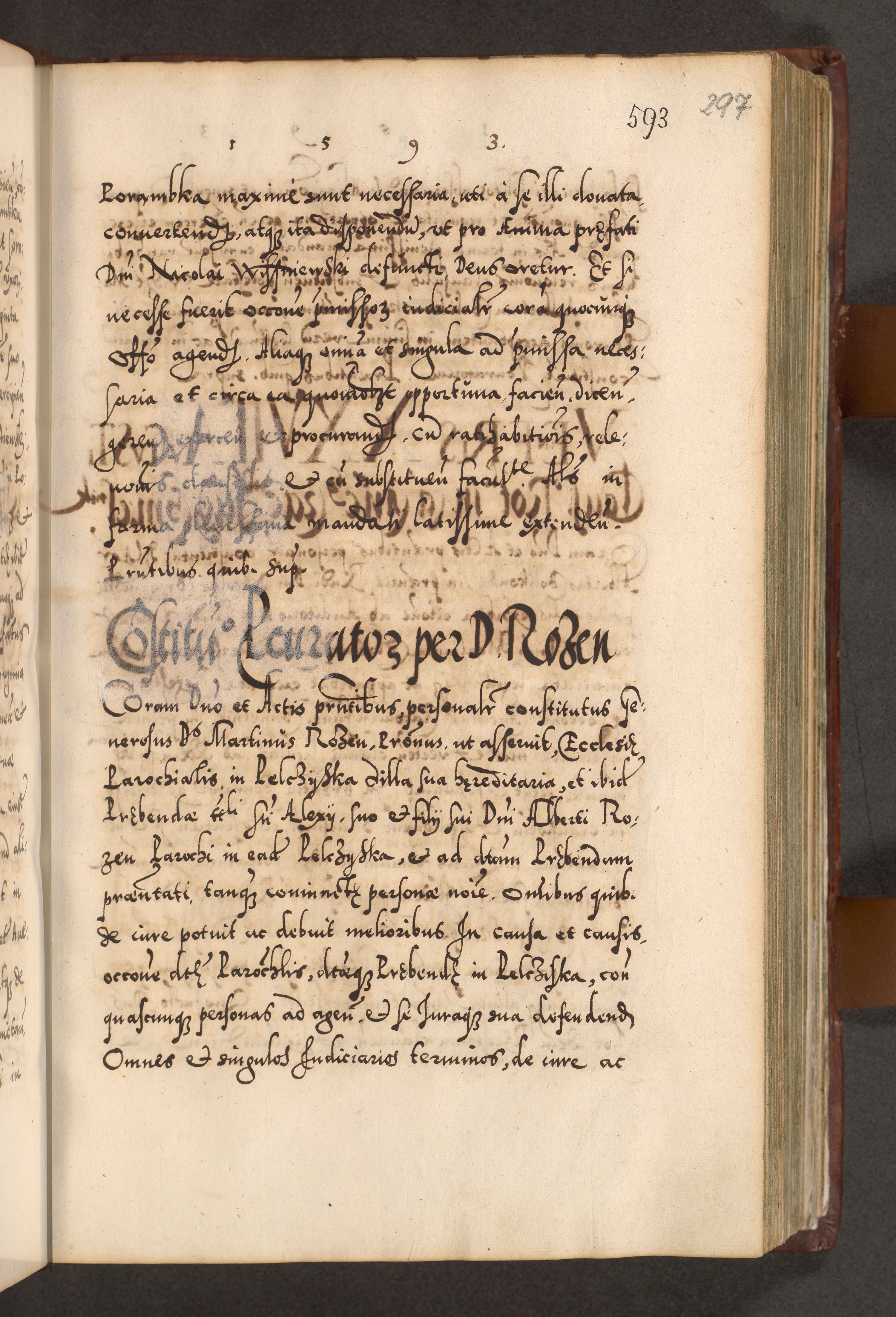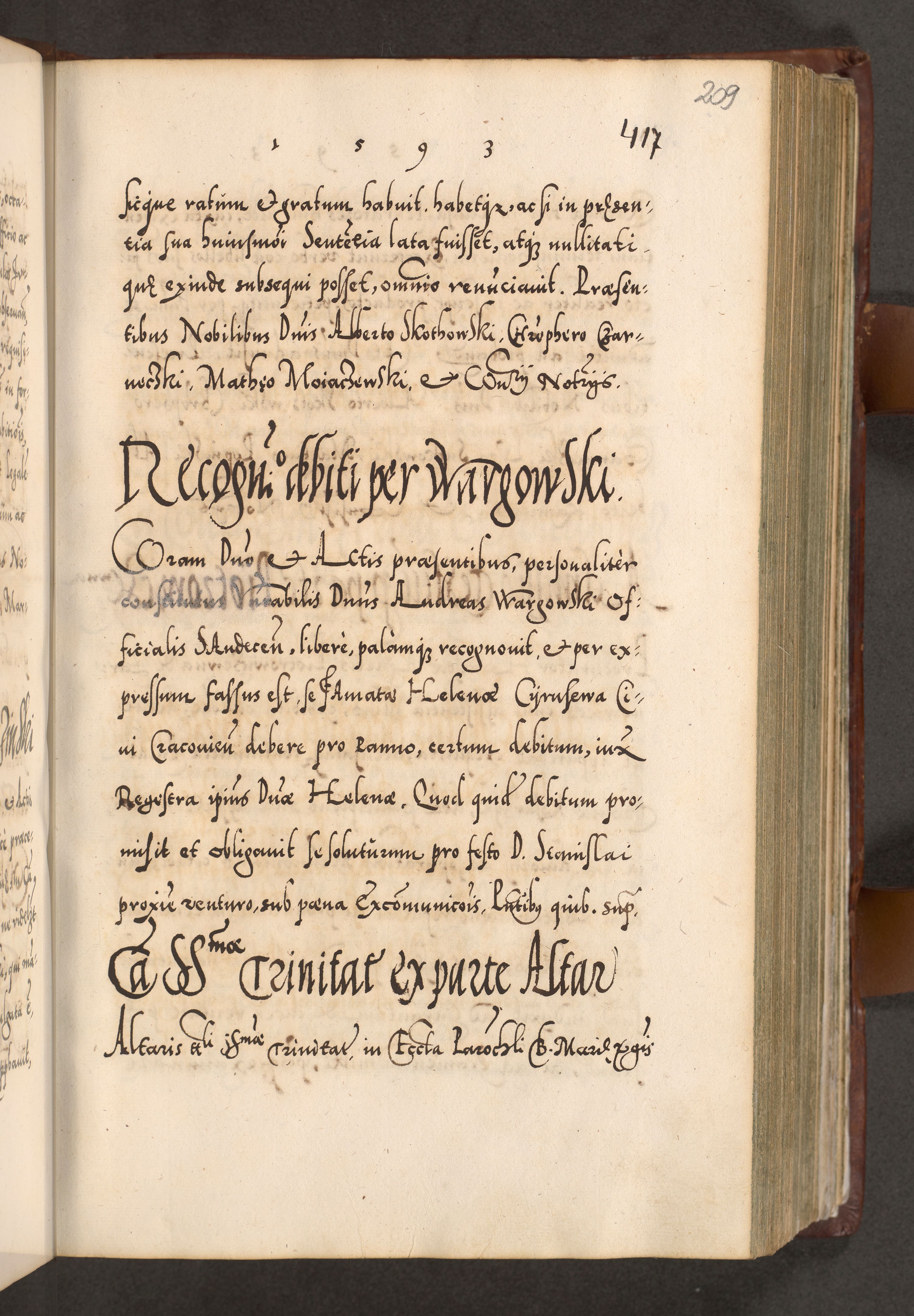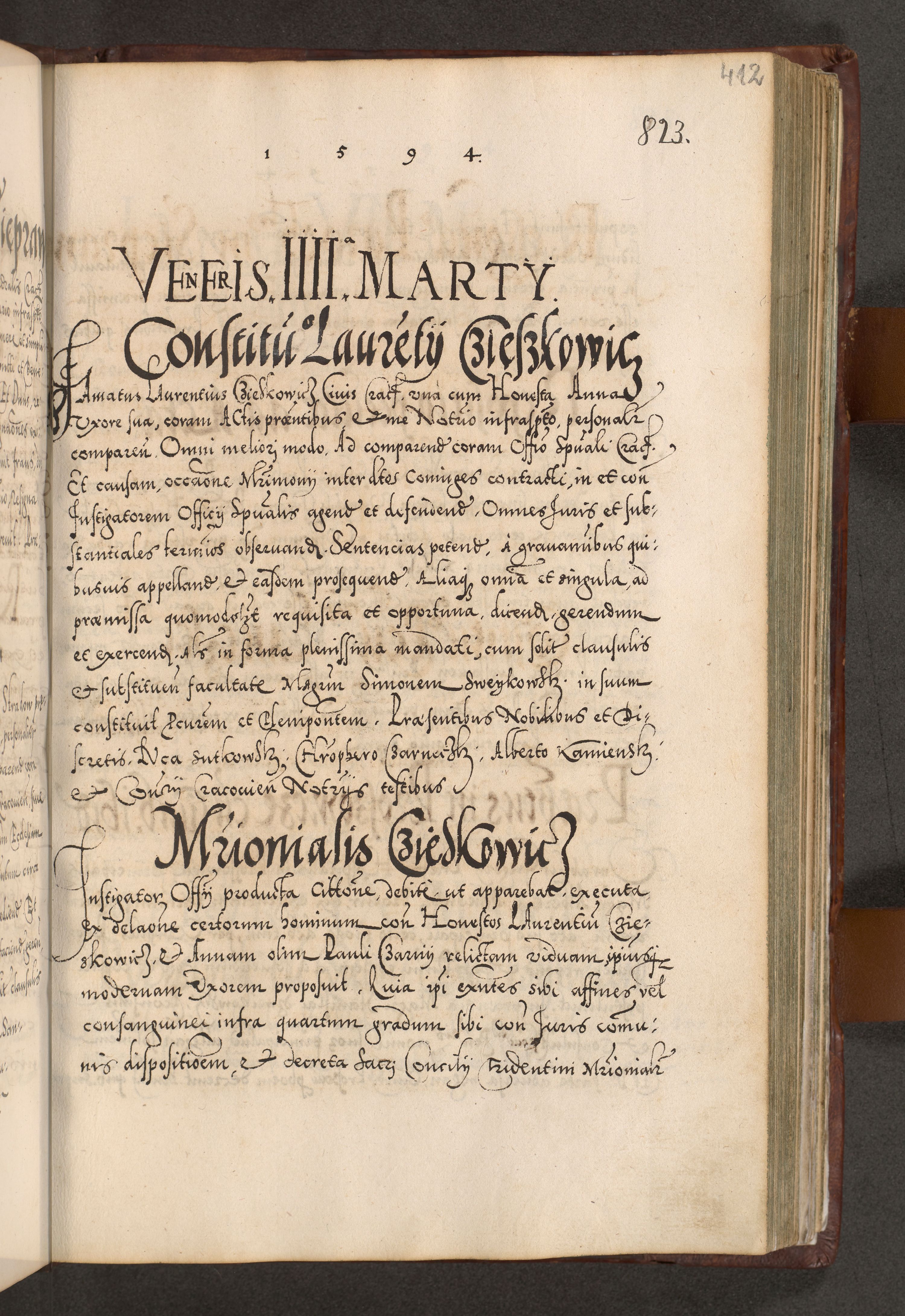 Illistrissimo et revedissimo in Christo Patre Domino Domino Georgio Rzadziwił Miserone Divina Sacrostae R. E. Tituli S. Sixti Presbitero Cardinali Duce in Olyka et Niesswiesz ad Gubernacula Ecclessiae Cracoviensis cuius administratorialem a Sancta Sede Apostolica obtinverat feliciter sedente. Acta actorum, causarum, sententiarum tam deffinitivarum quam interloquutoriarum decretorum, obligationum, quietationum, recognitionum, constitutionum procuratorum etc. coram Reverendo Domino Stanislao Crassinskz de Crasne Archidiacono Cracoviensis, Scholastico Gnesnesis, Custode Plocensis etc. Vicario et Officiali Generali Cracoviensi in Ano Domini Millesimo Quingentesimo Nonagesimo Primo cuius indictio quarta pontificatus SS. Domini Nostri Gregorii XIIII Anno I psius prio feliciter incipiut