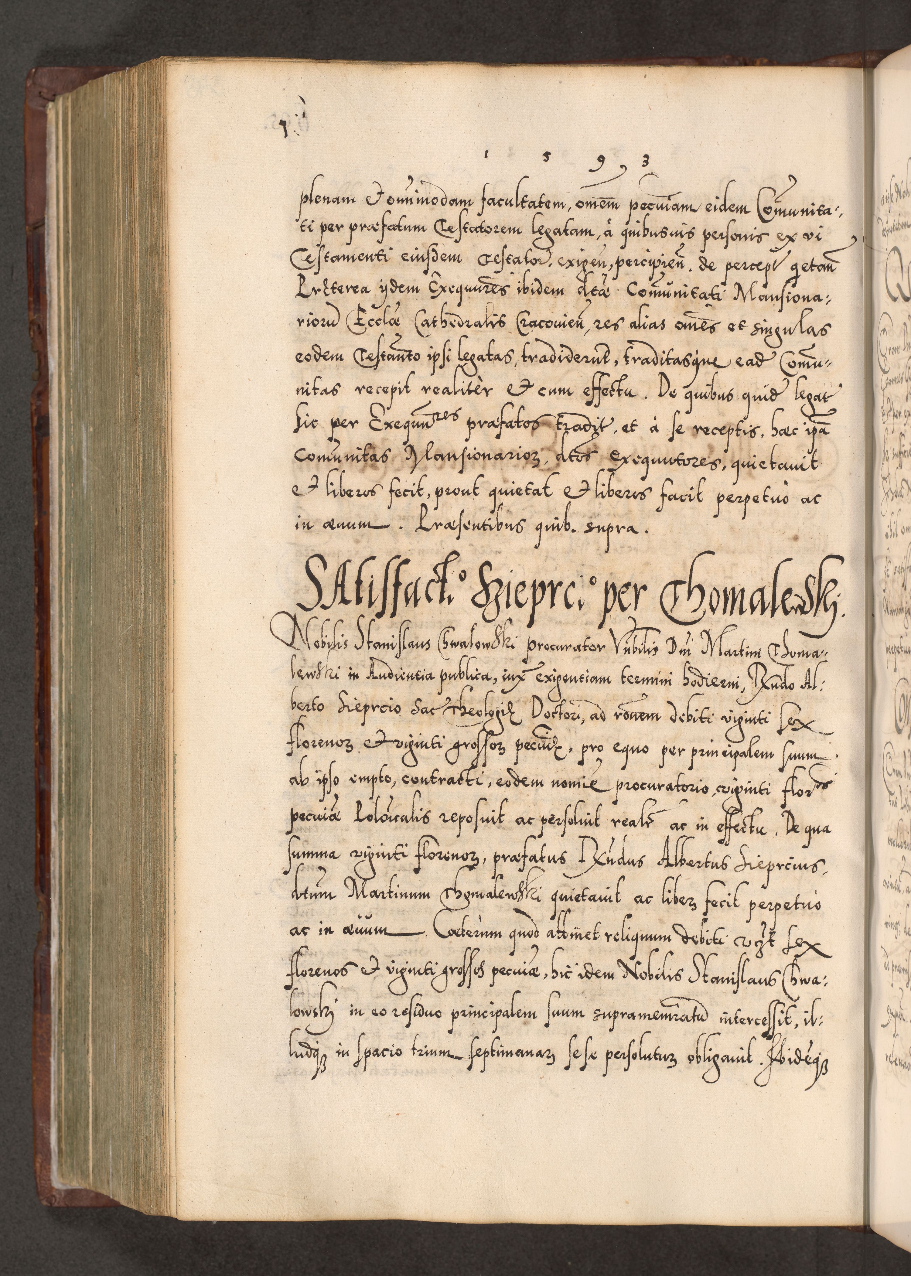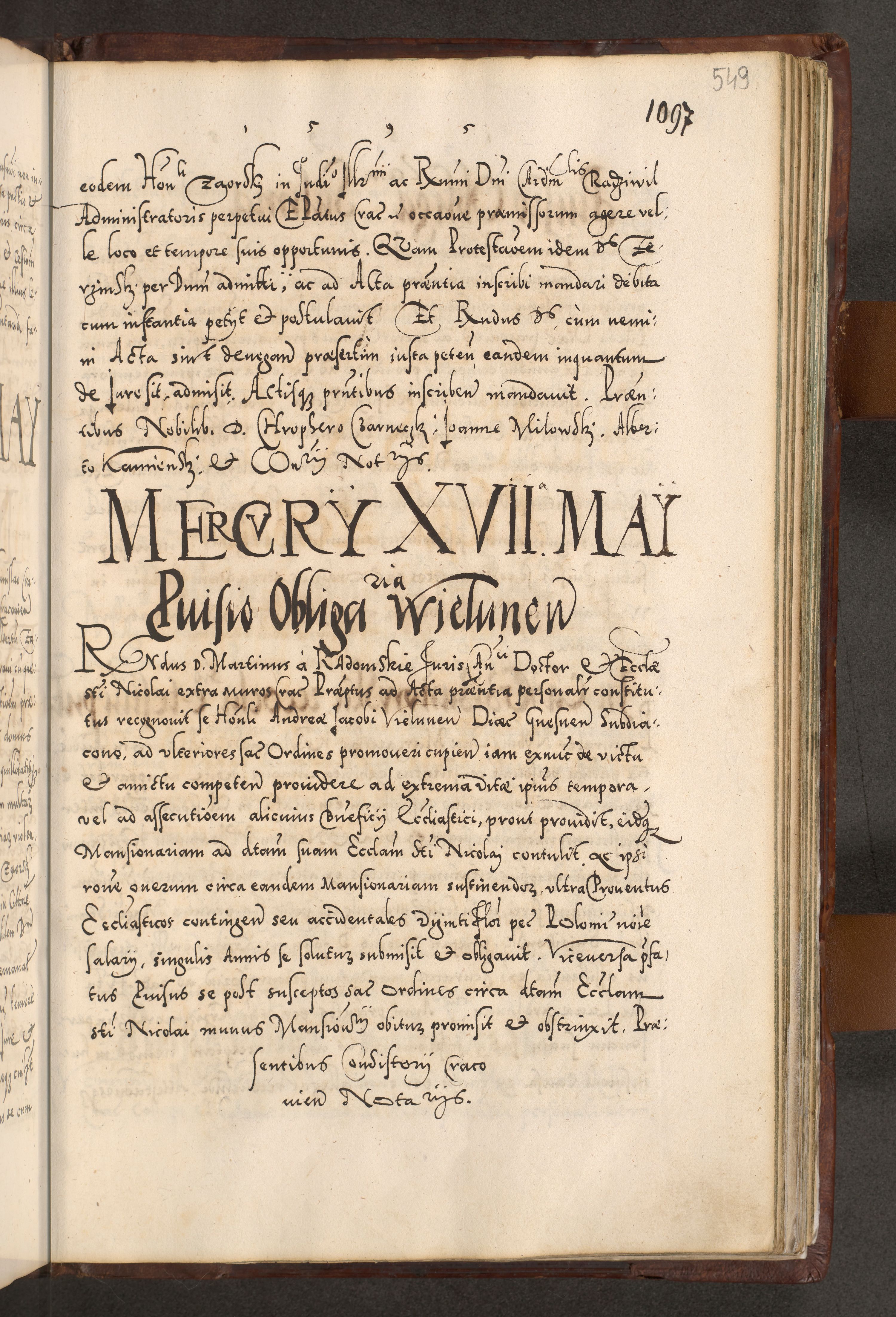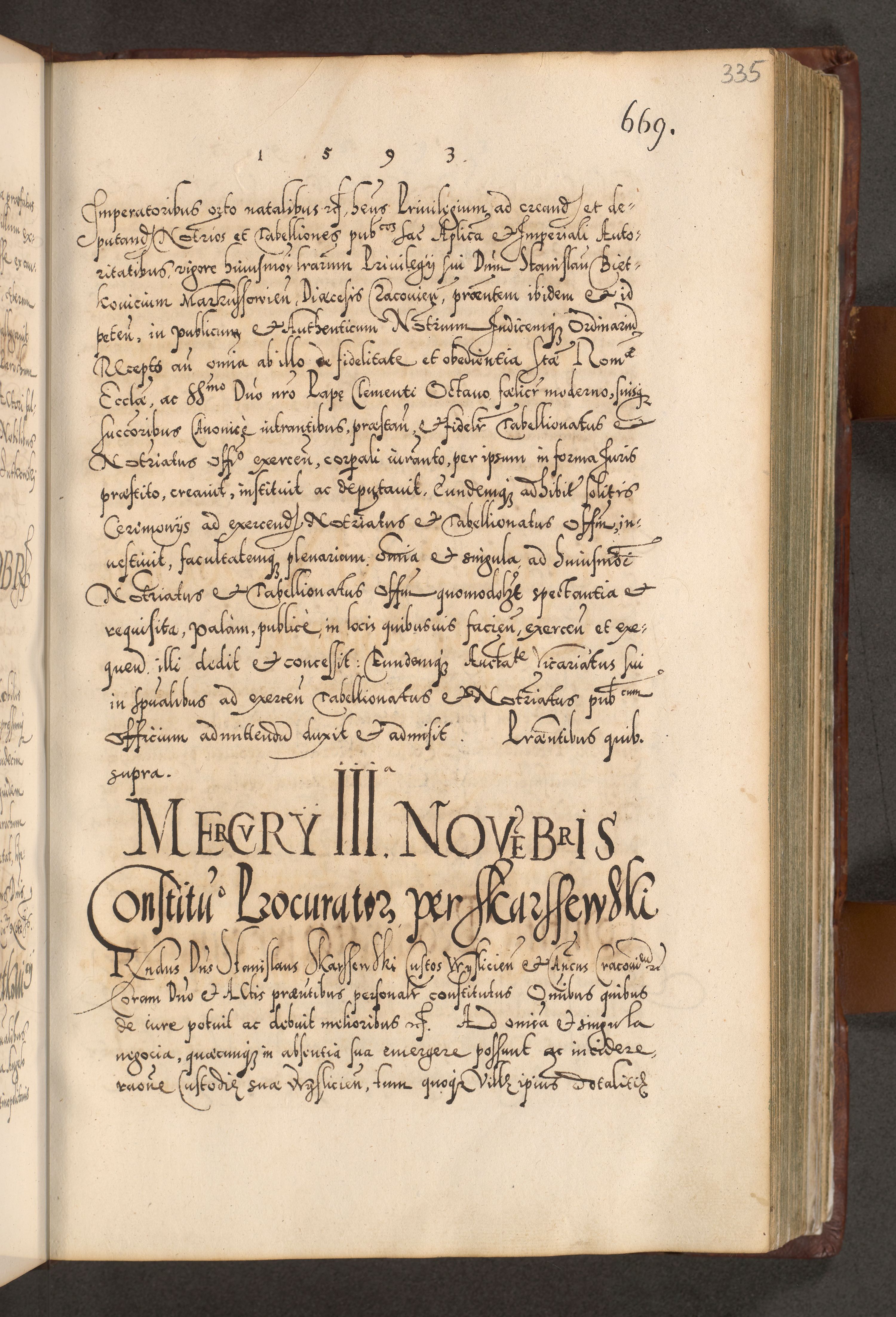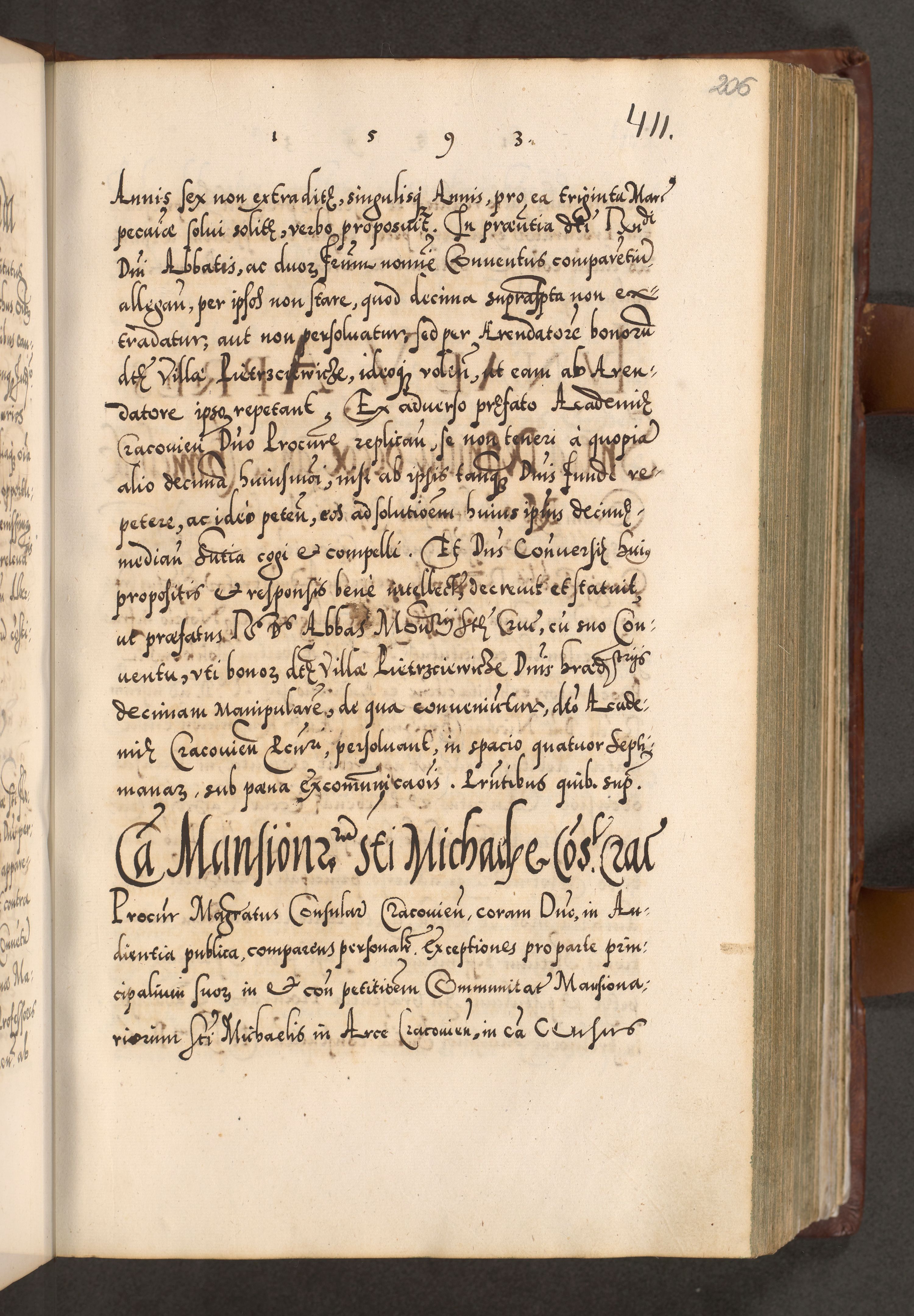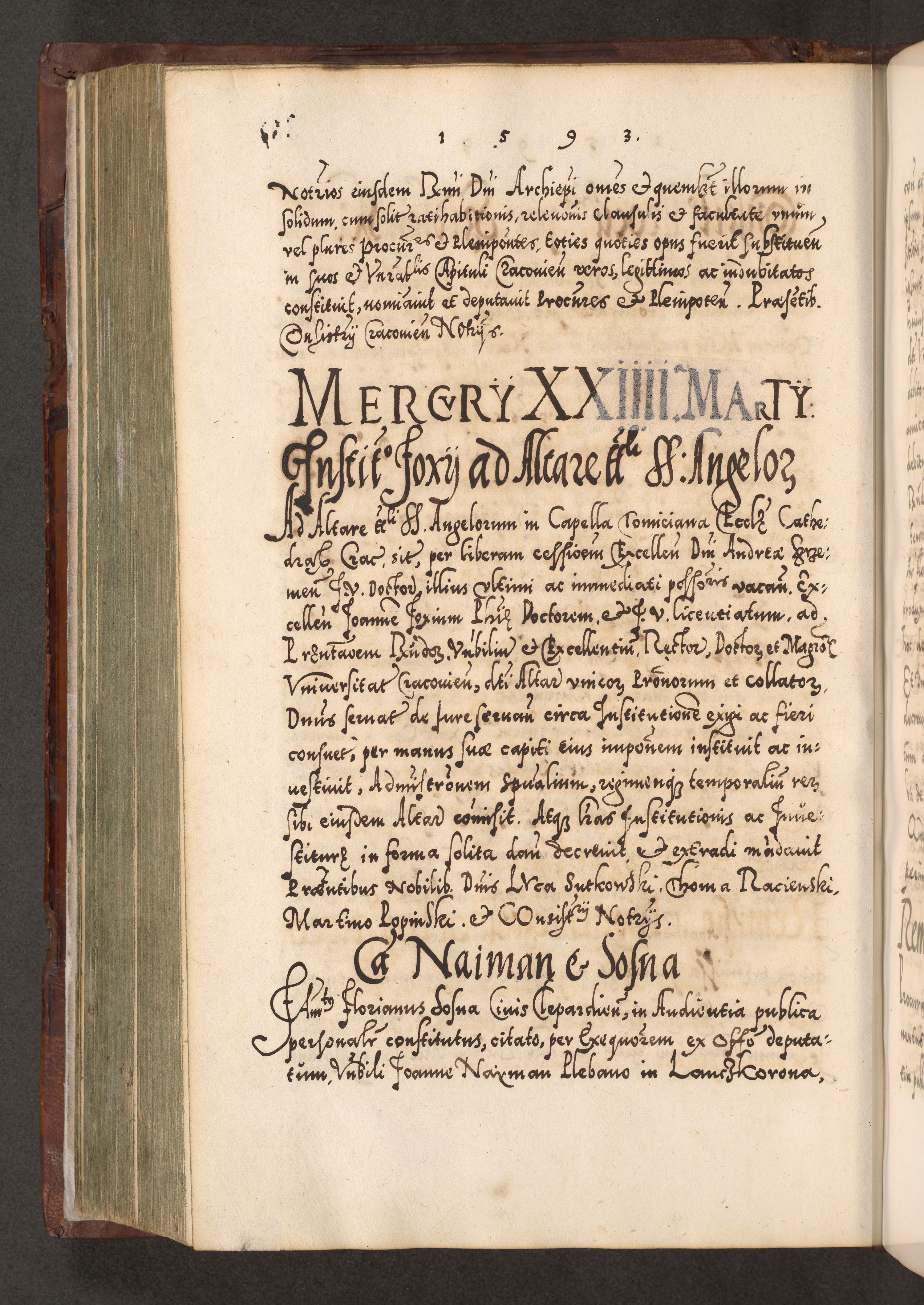 Illistrissimo et revedissimo in Christo Patre Domino Domino Georgio Rzadziwił Miserone Divina Sacrostae R. E. Tituli S. Sixti Presbitero Cardinali Duce in Olyka et Niesswiesz ad Gubernacula Ecclessiae Cracoviensis cuius administratorialem a Sancta Sede Apostolica obtinverat feliciter sedente. Acta actorum, causarum, sententiarum tam deffinitivarum quam interloquutoriarum decretorum, obligationum, quietationum, recognitionum, constitutionum procuratorum etc. coram Reverendo Domino Stanislao Crassinskz de Crasne Archidiacono Cracoviensis, Scholastico Gnesnesis, Custode Plocensis etc. Vicario et Officiali Generali Cracoviensi in Ano Domini Millesimo Quingentesimo Nonagesimo Primo cuius indictio quarta pontificatus SS. Domini Nostri Gregorii XIIII Anno I psius prio feliciter incipiut