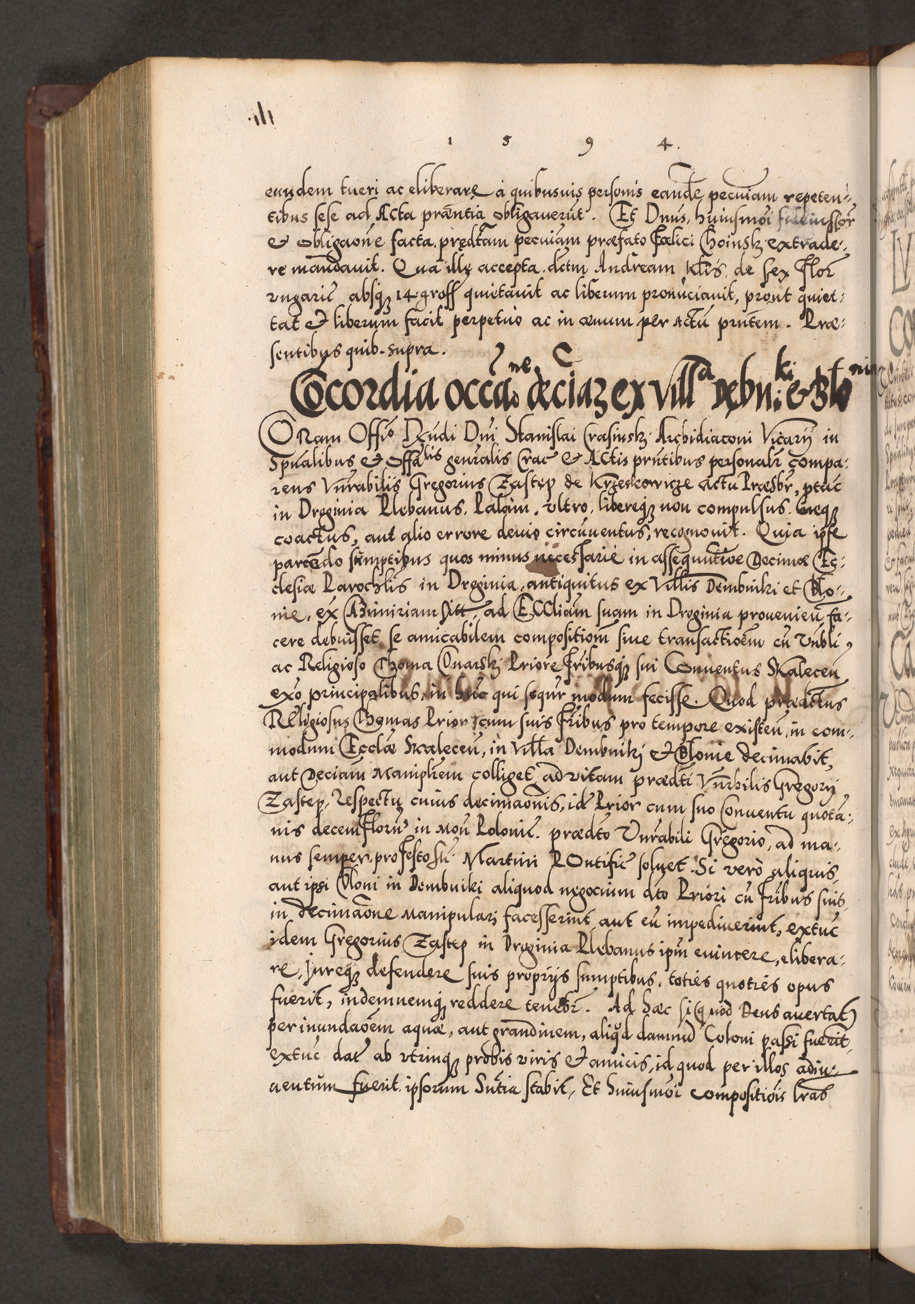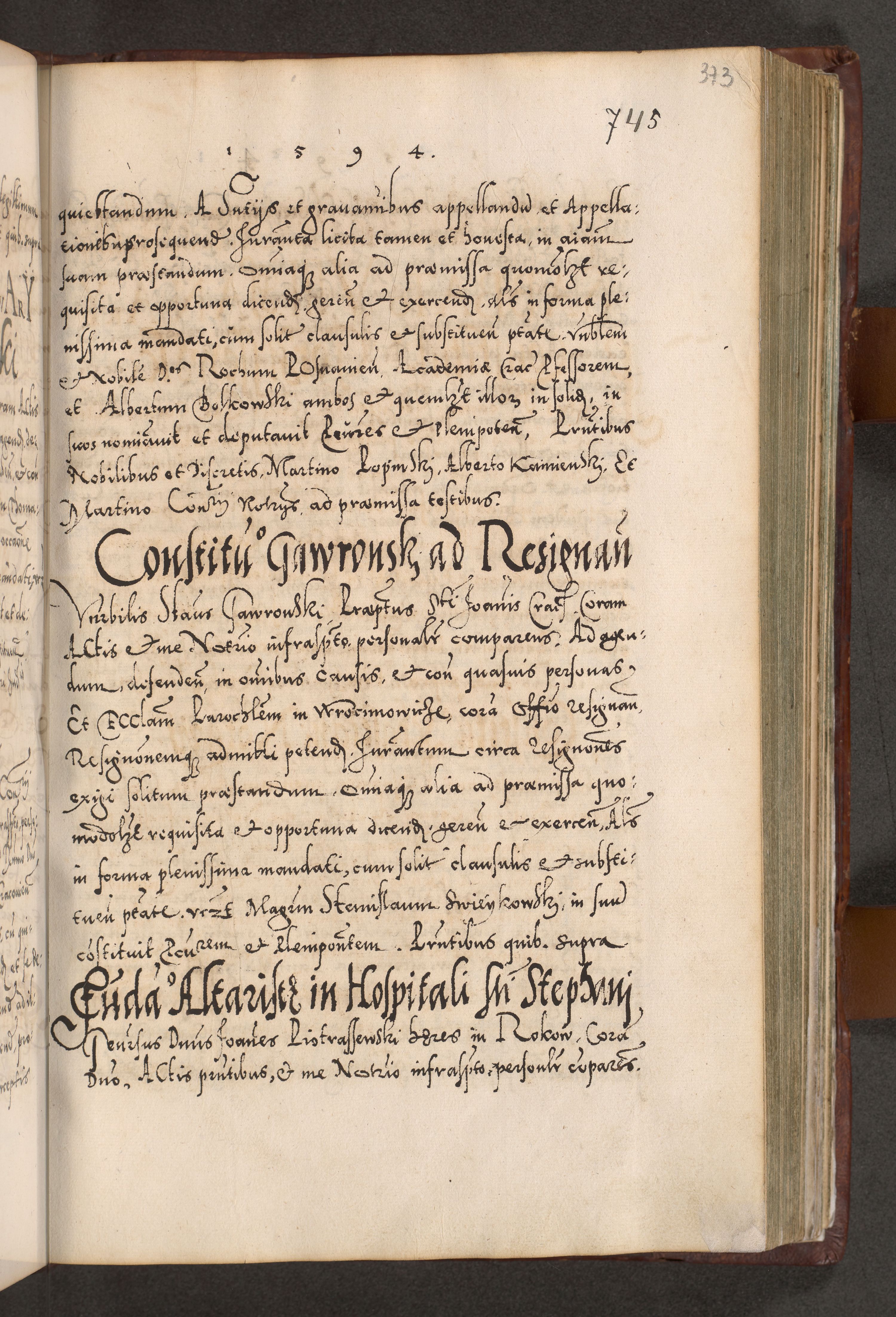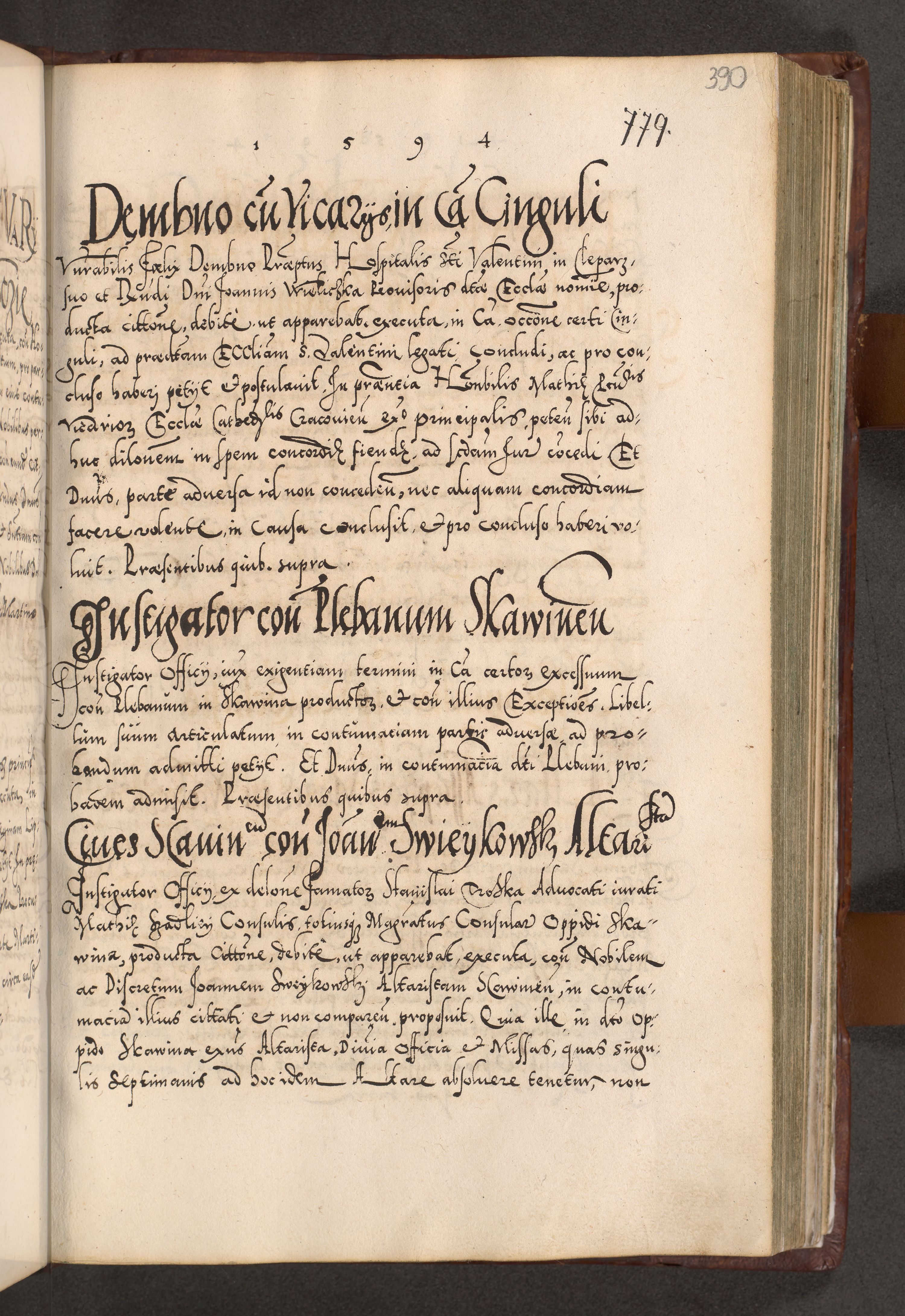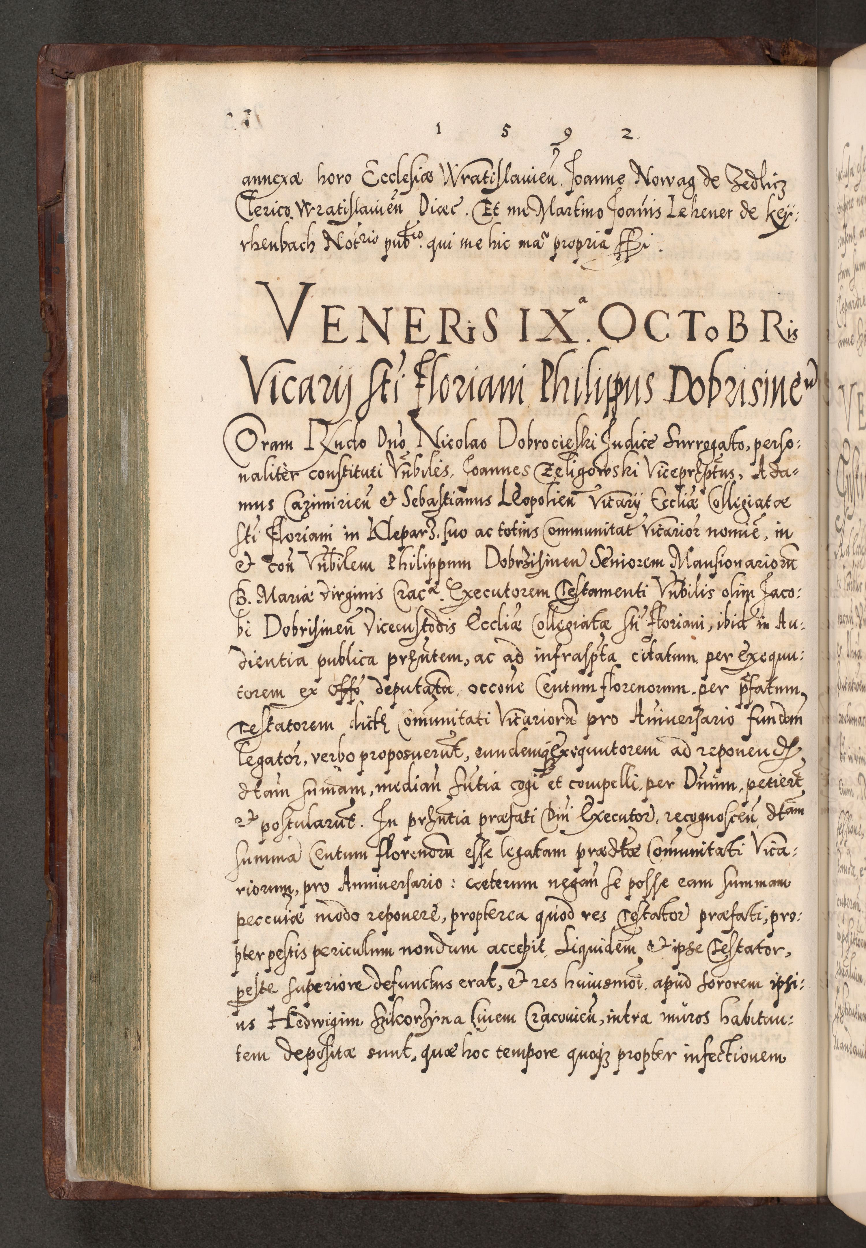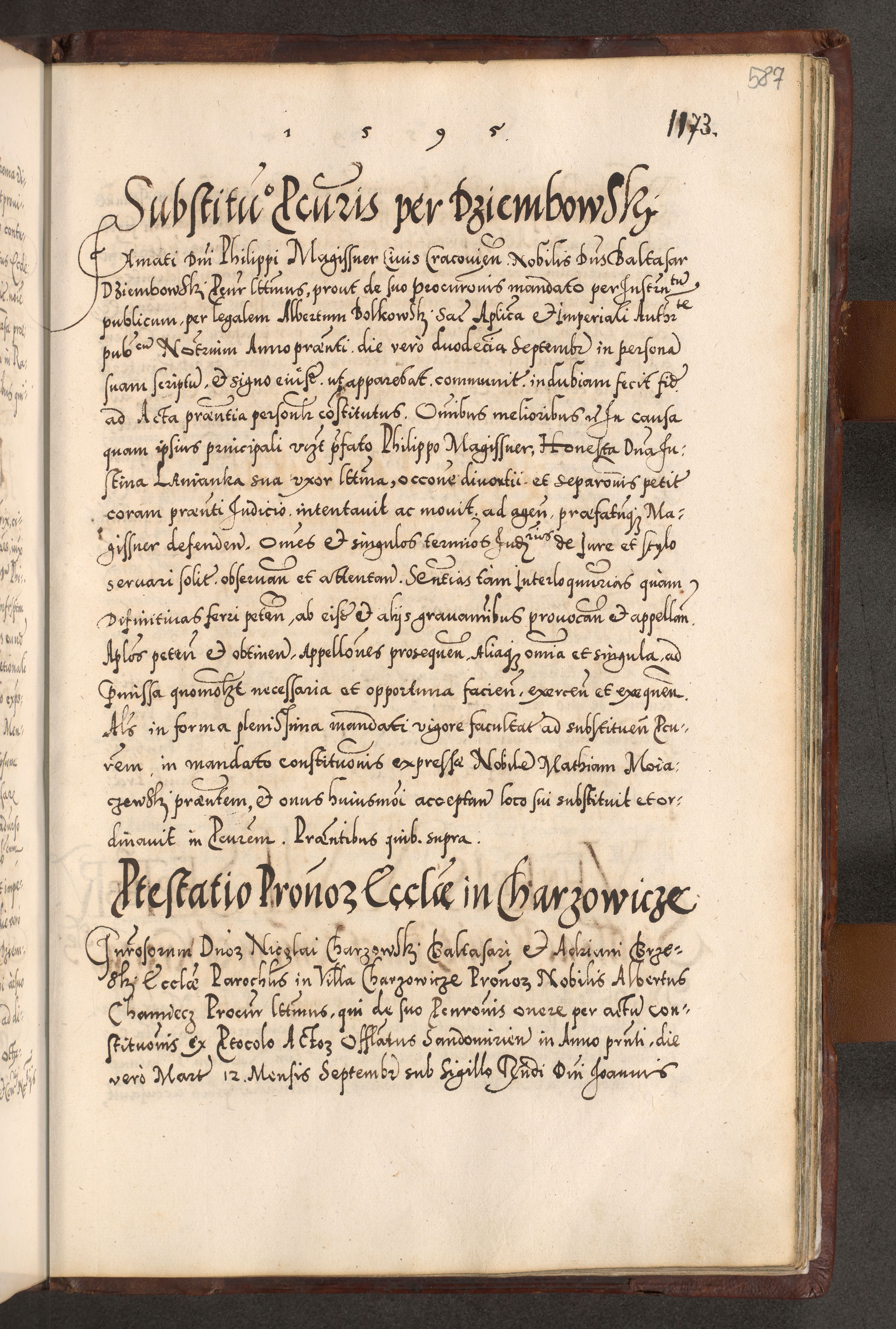 Illistrissimo et revedissimo in Christo Patre Domino Domino Georgio Rzadziwił Miserone Divina Sacrostae R. E. Tituli S. Sixti Presbitero Cardinali Duce in Olyka et Niesswiesz ad Gubernacula Ecclessiae Cracoviensis cuius administratorialem a Sancta Sede Apostolica obtinverat feliciter sedente. Acta actorum, causarum, sententiarum tam deffinitivarum quam interloquutoriarum decretorum, obligationum, quietationum, recognitionum, constitutionum procuratorum etc. coram Reverendo Domino Stanislao Crassinskz de Crasne Archidiacono Cracoviensis, Scholastico Gnesnesis, Custode Plocensis etc. Vicario et Officiali Generali Cracoviensi in Ano Domini Millesimo Quingentesimo Nonagesimo Primo cuius indictio quarta pontificatus SS. Domini Nostri Gregorii XIIII Anno I psius prio feliciter incipiut