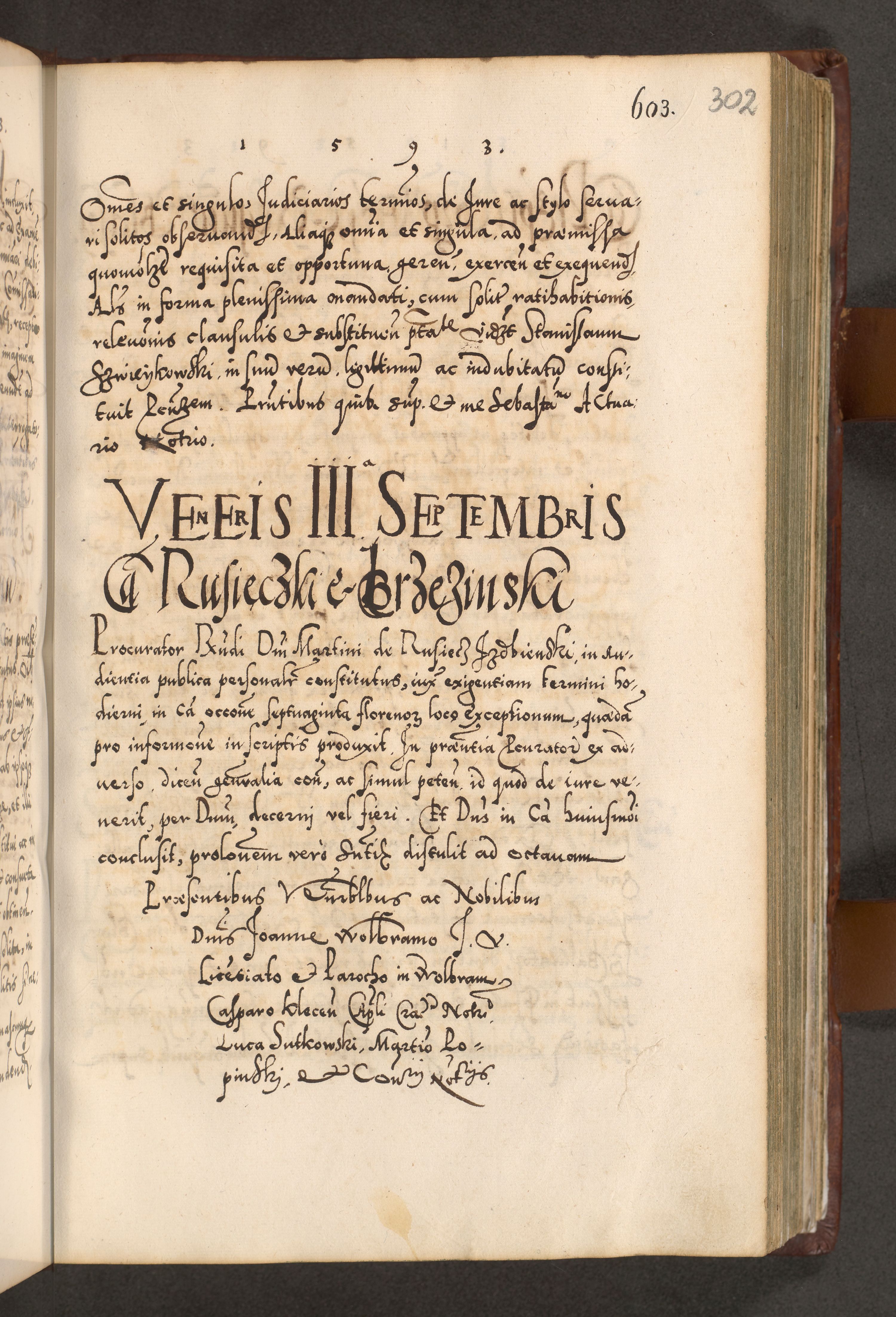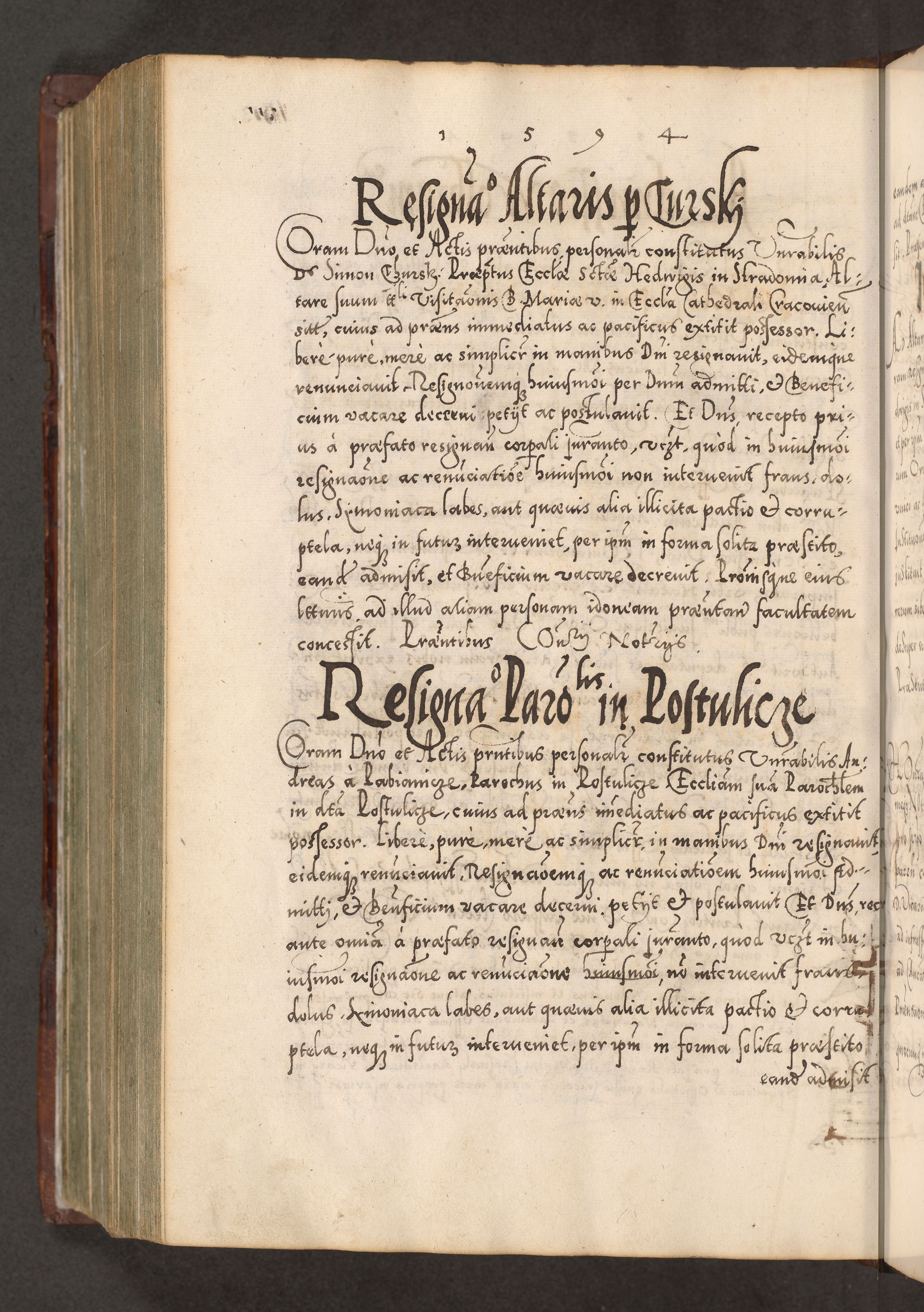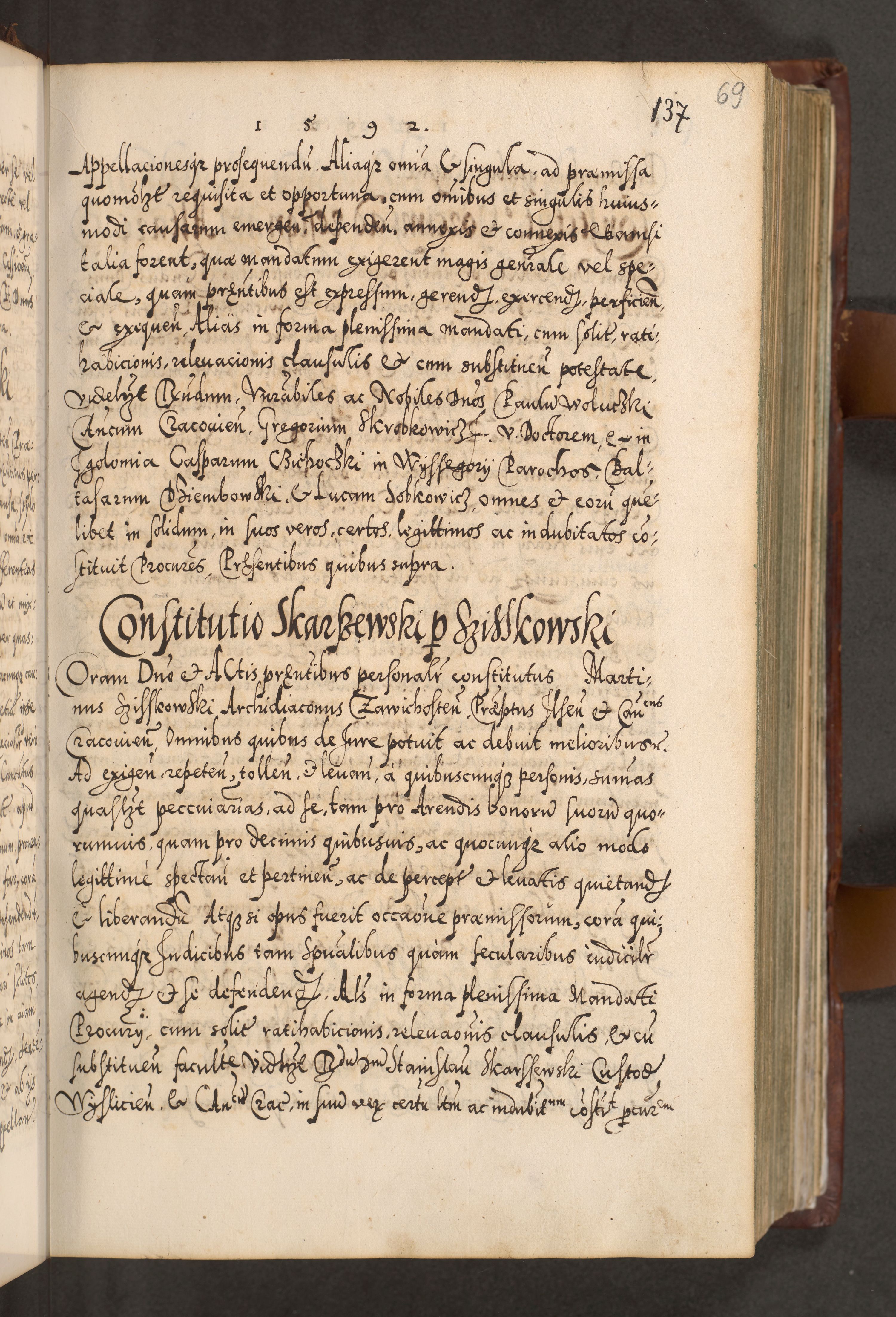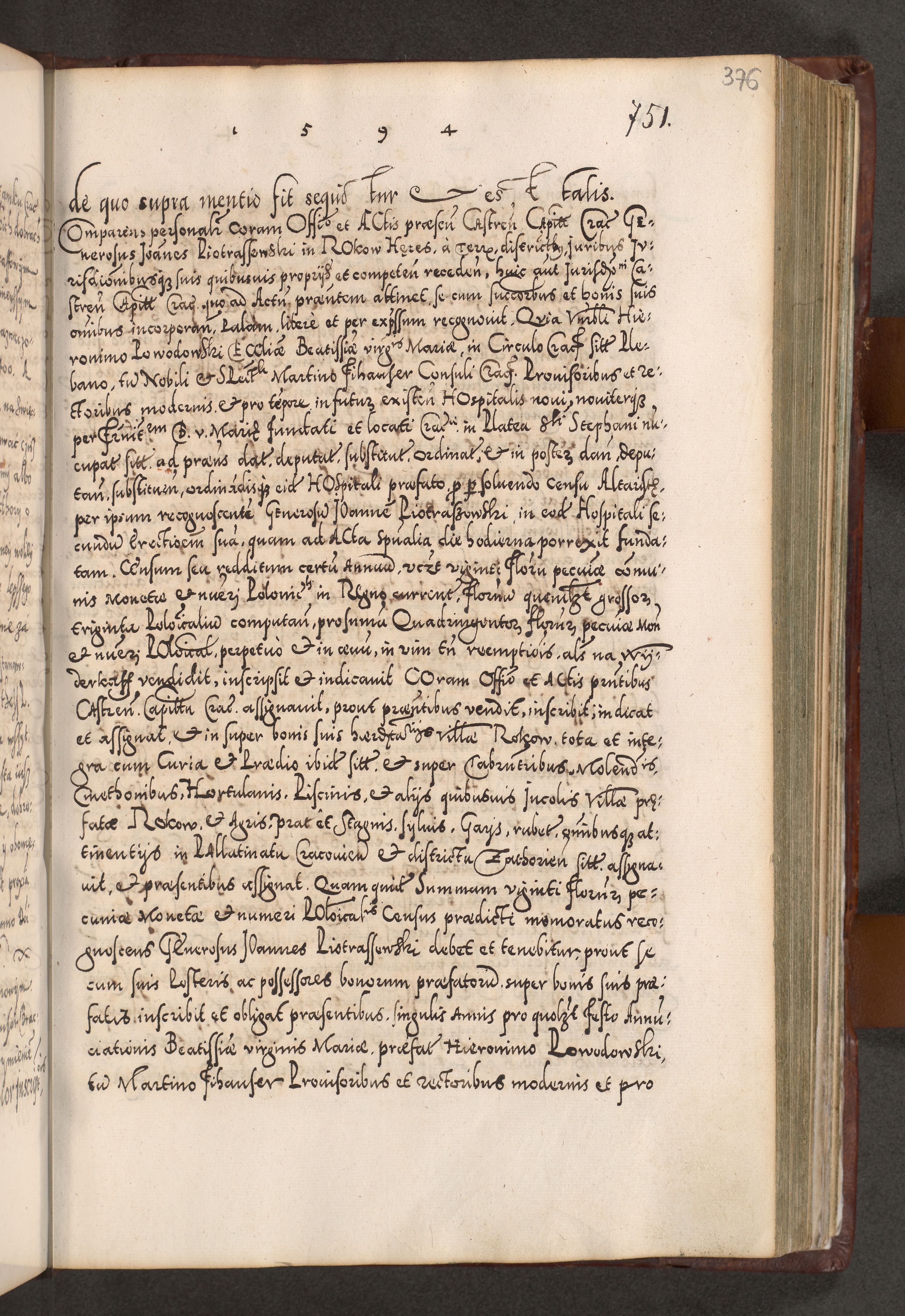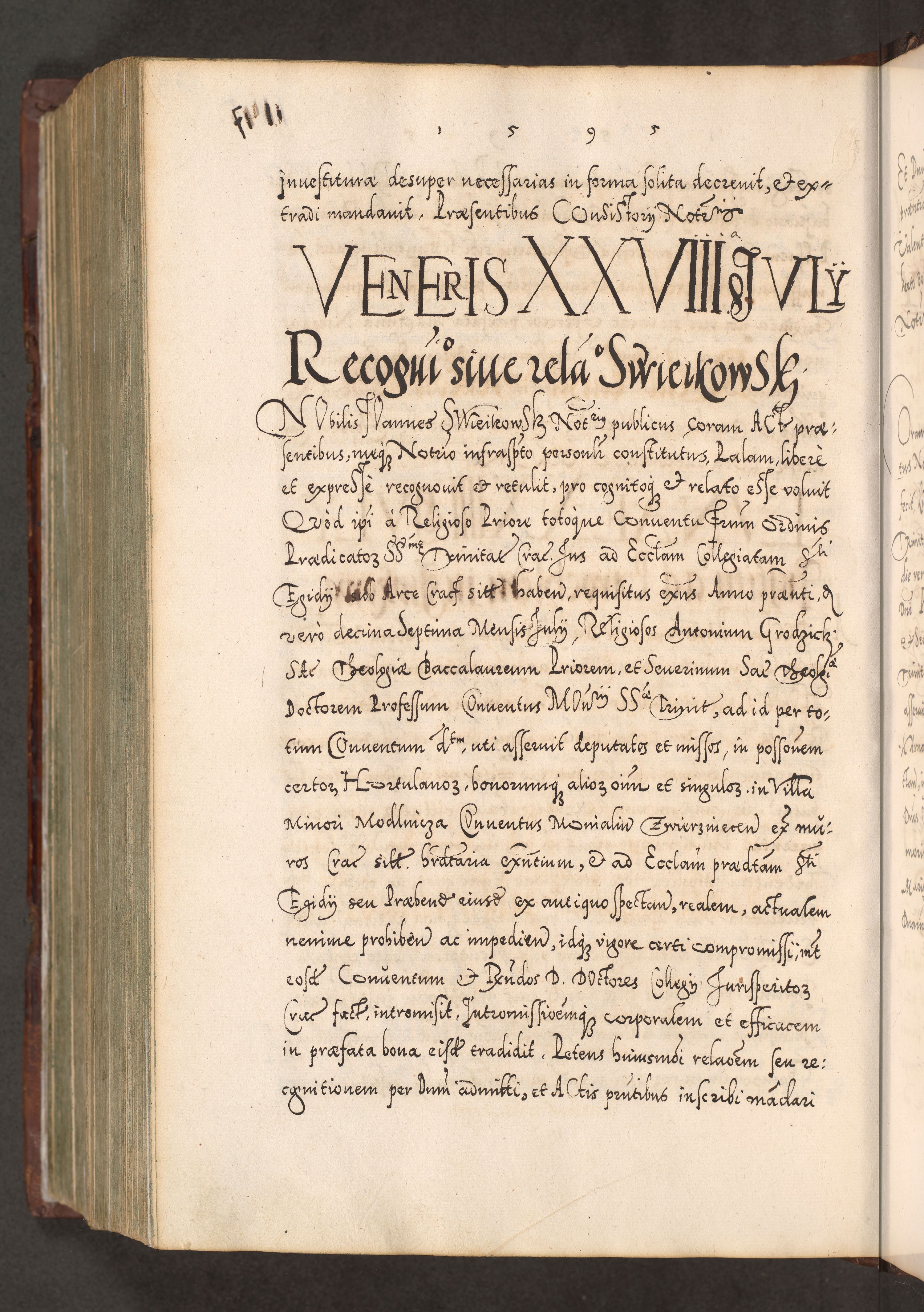 Illistrissimo et revedissimo in Christo Patre Domino Domino Georgio Rzadziwił Miserone Divina Sacrostae R. E. Tituli S. Sixti Presbitero Cardinali Duce in Olyka et Niesswiesz ad Gubernacula Ecclessiae Cracoviensis cuius administratorialem a Sancta Sede Apostolica obtinverat feliciter sedente. Acta actorum, causarum, sententiarum tam deffinitivarum quam interloquutoriarum decretorum, obligationum, quietationum, recognitionum, constitutionum procuratorum etc. coram Reverendo Domino Stanislao Crassinskz de Crasne Archidiacono Cracoviensis, Scholastico Gnesnesis, Custode Plocensis etc. Vicario et Officiali Generali Cracoviensi in Ano Domini Millesimo Quingentesimo Nonagesimo Primo cuius indictio quarta pontificatus SS. Domini Nostri Gregorii XIIII Anno I psius prio feliciter incipiut