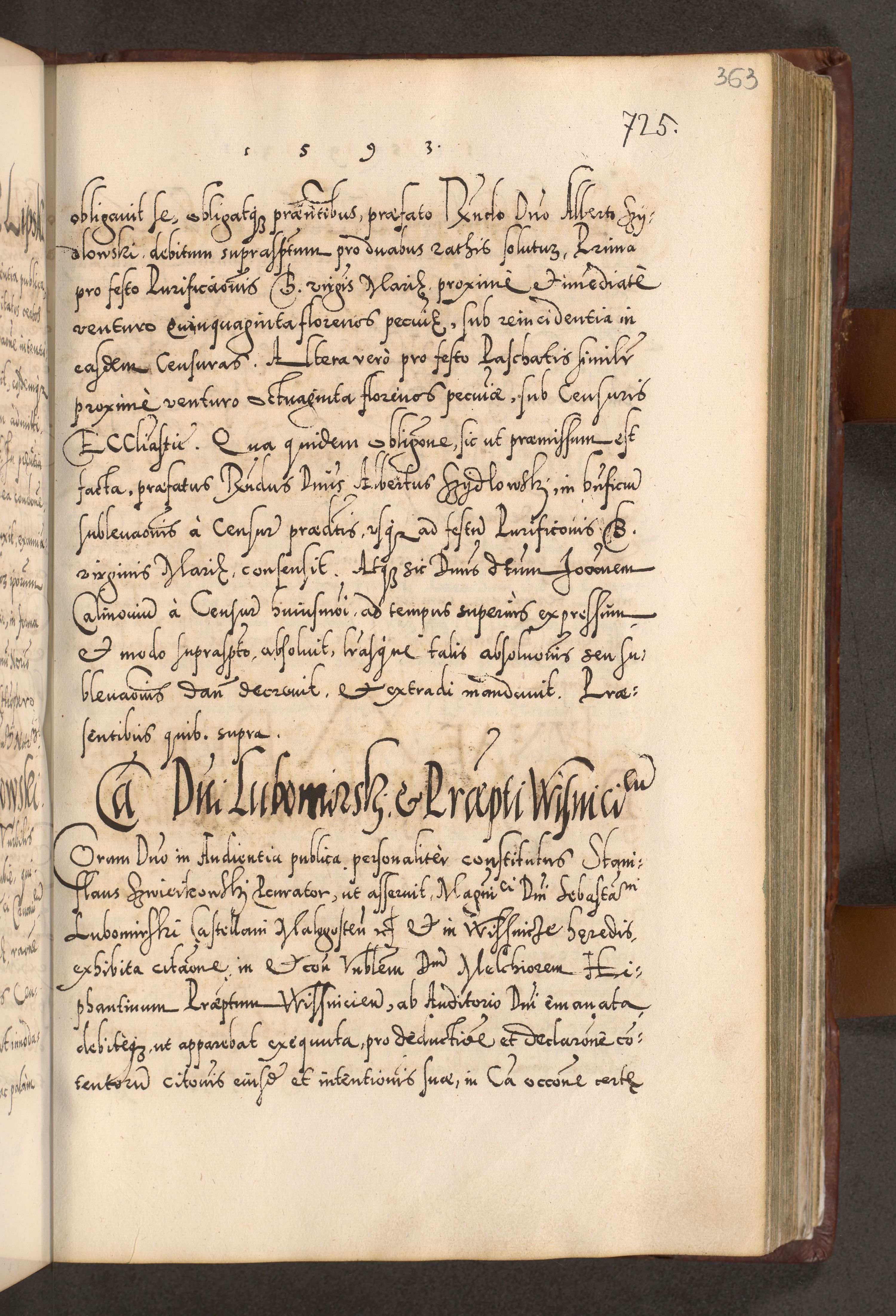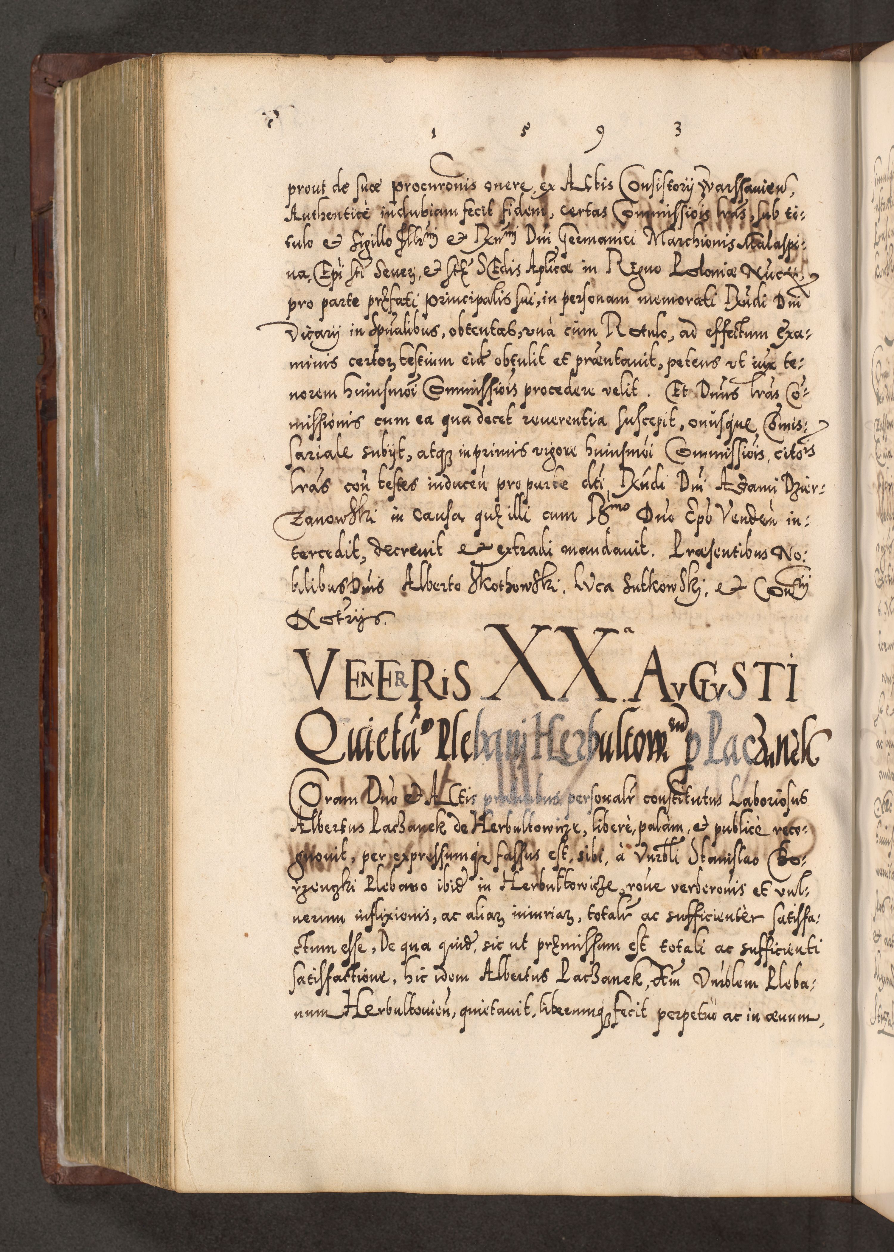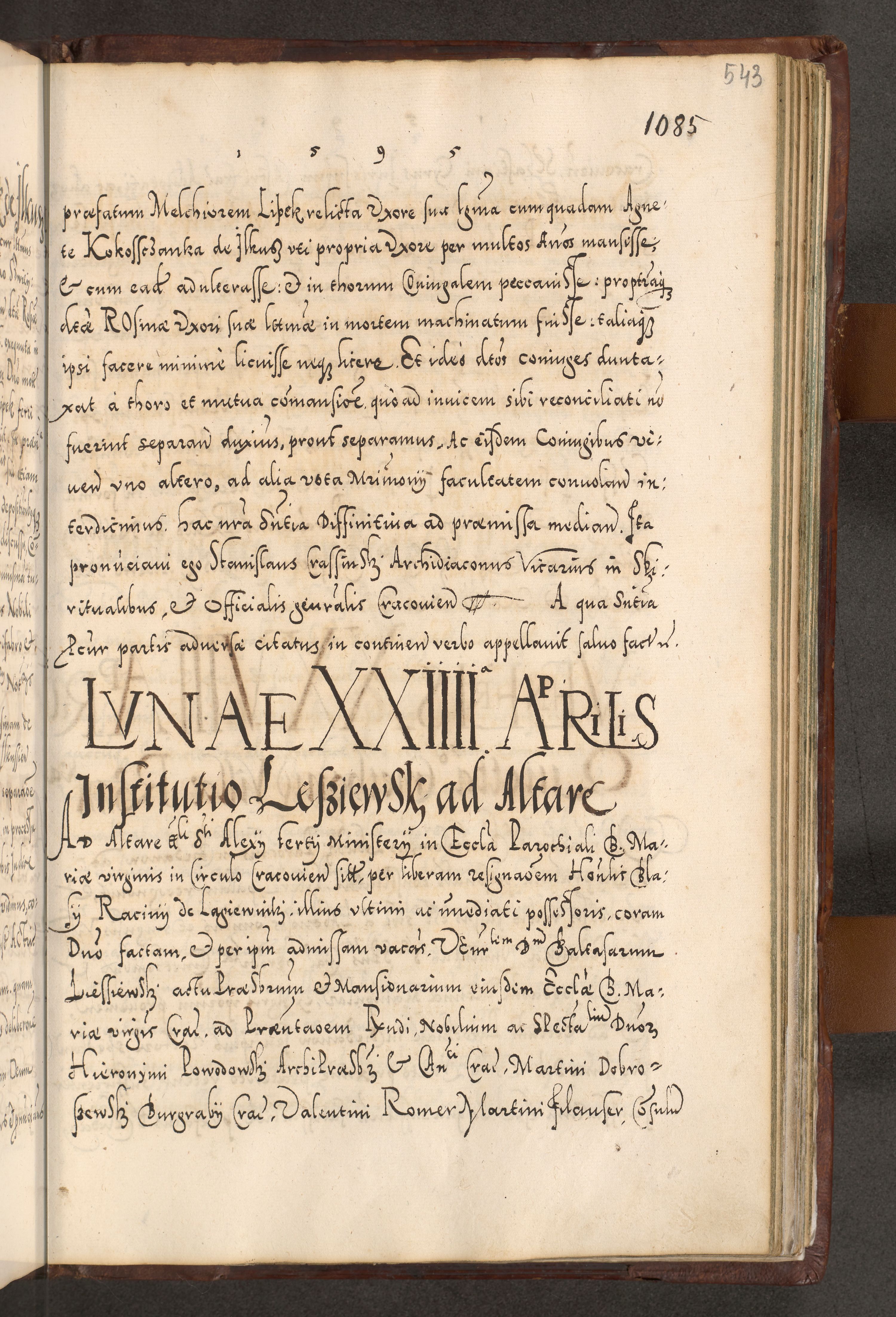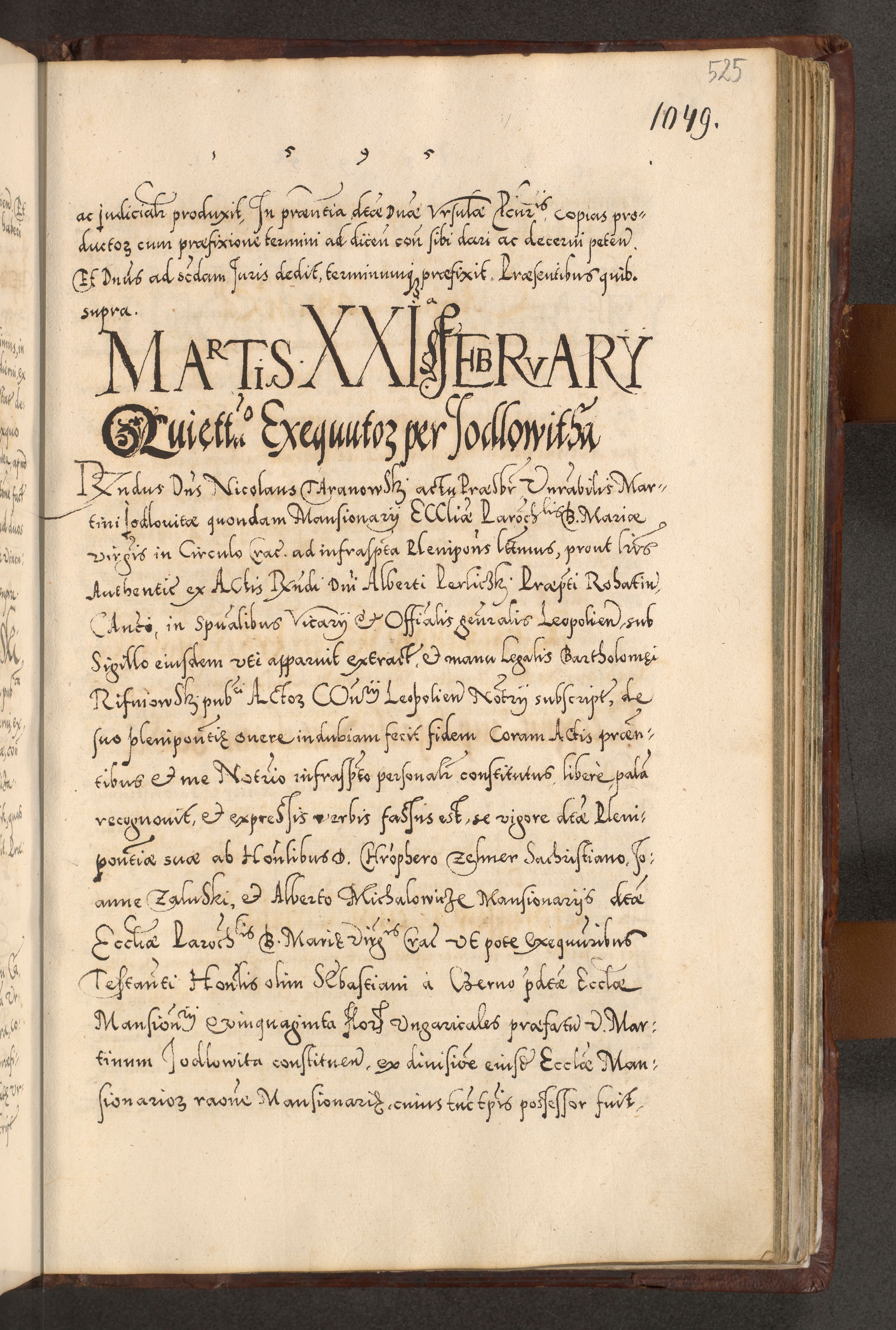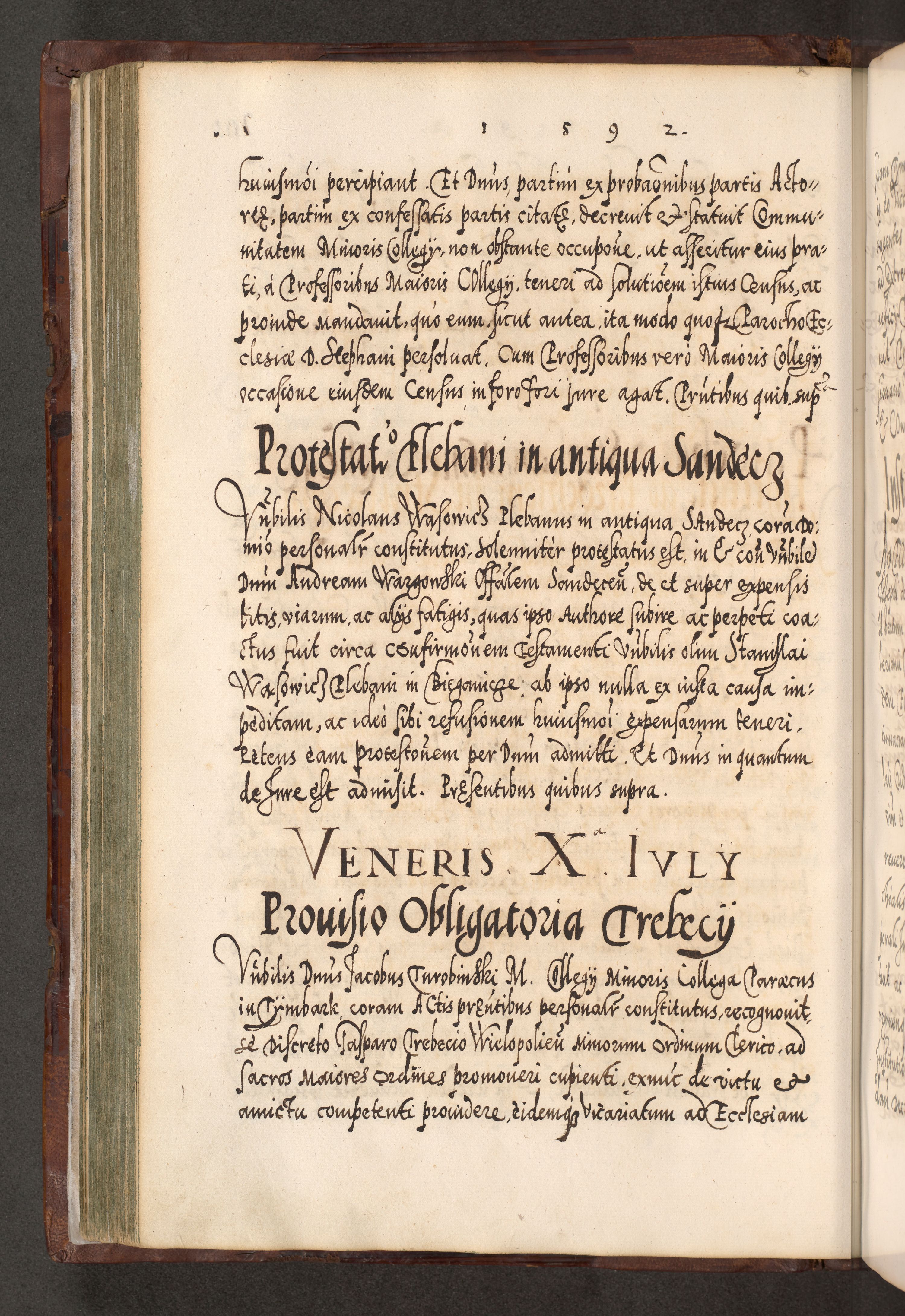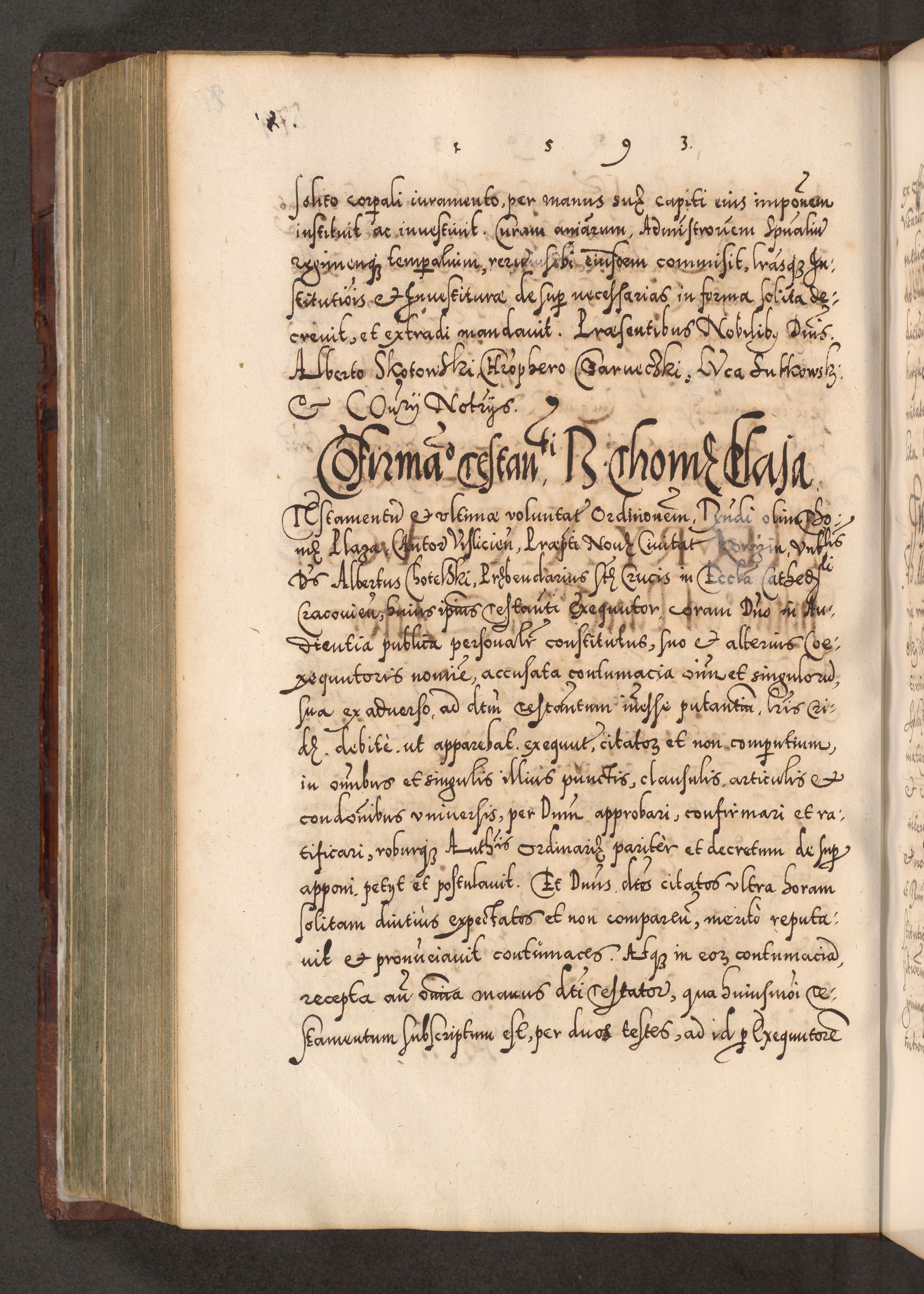 Illistrissimo et revedissimo in Christo Patre Domino Domino Georgio Rzadziwił Miserone Divina Sacrostae R. E. Tituli S. Sixti Presbitero Cardinali Duce in Olyka et Niesswiesz ad Gubernacula Ecclessiae Cracoviensis cuius administratorialem a Sancta Sede Apostolica obtinverat feliciter sedente. Acta actorum, causarum, sententiarum tam deffinitivarum quam interloquutoriarum decretorum, obligationum, quietationum, recognitionum, constitutionum procuratorum etc. coram Reverendo Domino Stanislao Crassinskz de Crasne Archidiacono Cracoviensis, Scholastico Gnesnesis, Custode Plocensis etc. Vicario et Officiali Generali Cracoviensi in Ano Domini Millesimo Quingentesimo Nonagesimo Primo cuius indictio quarta pontificatus SS. Domini Nostri Gregorii XIIII Anno I psius prio feliciter incipiut