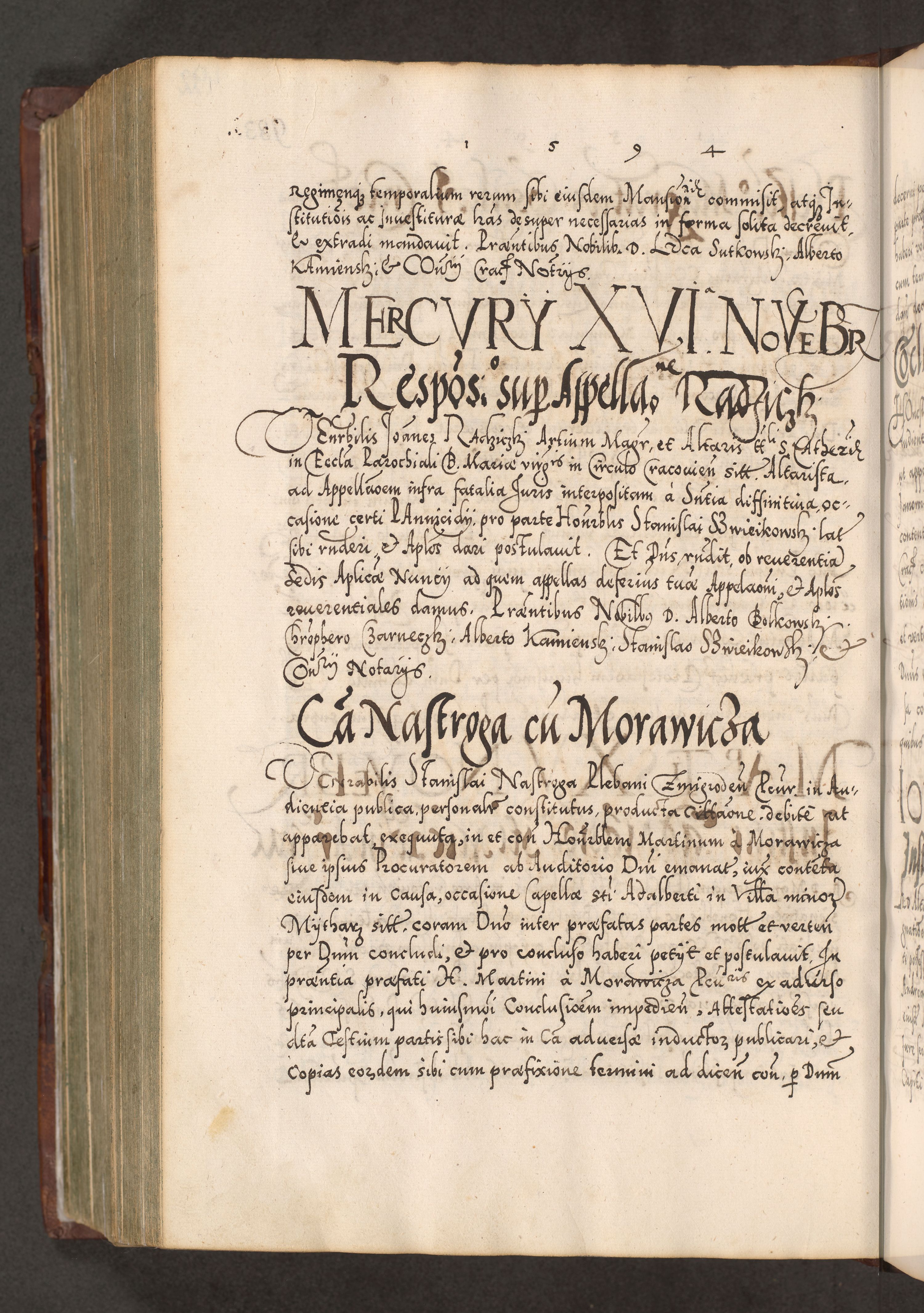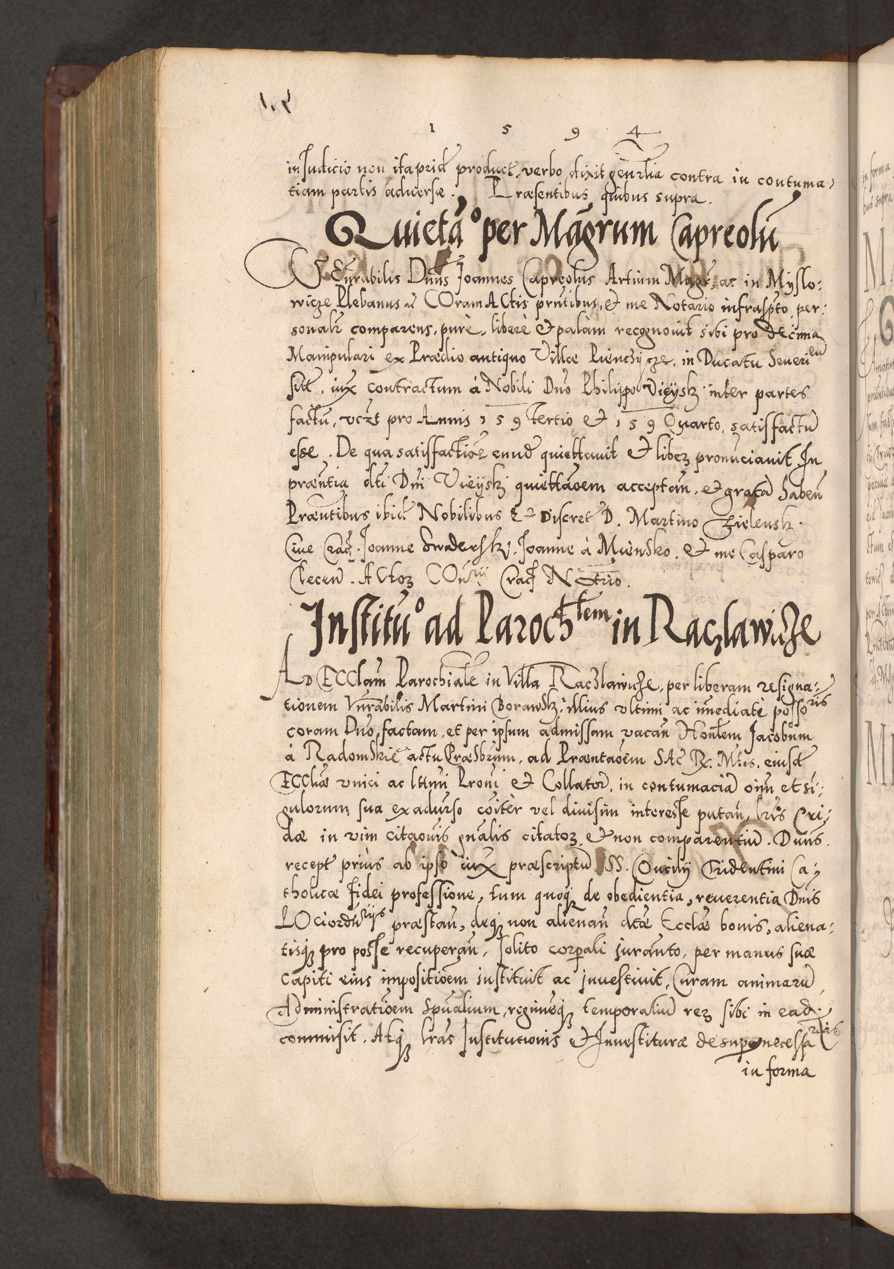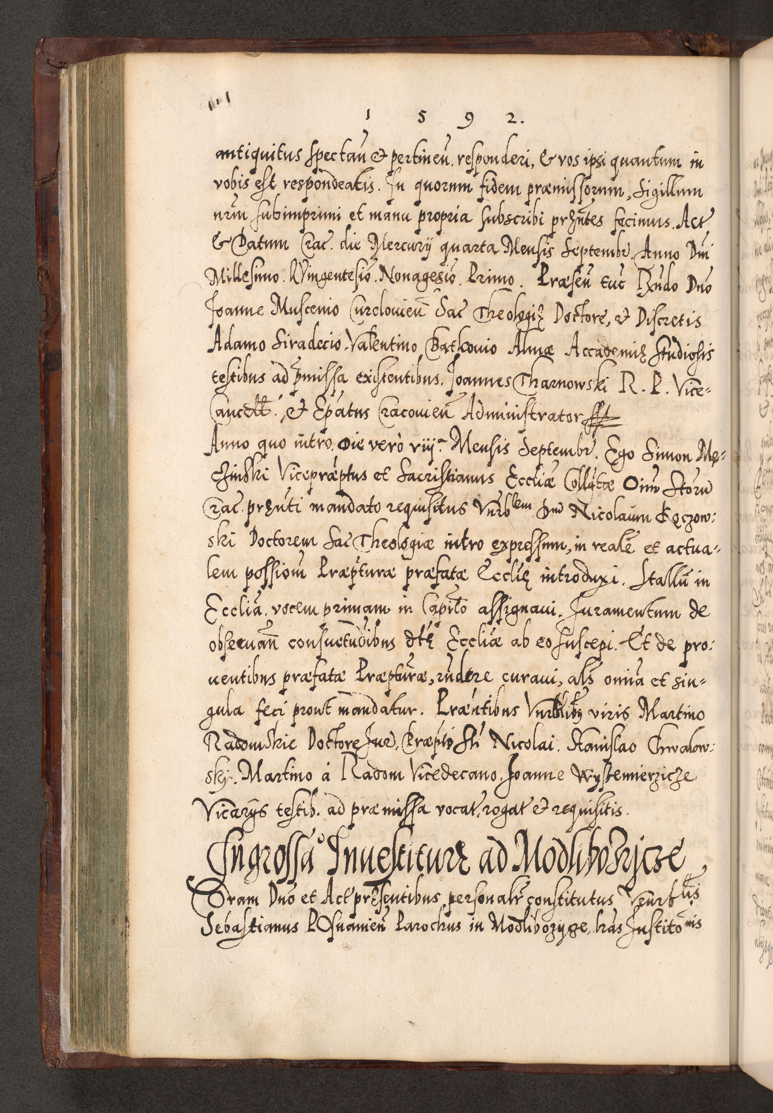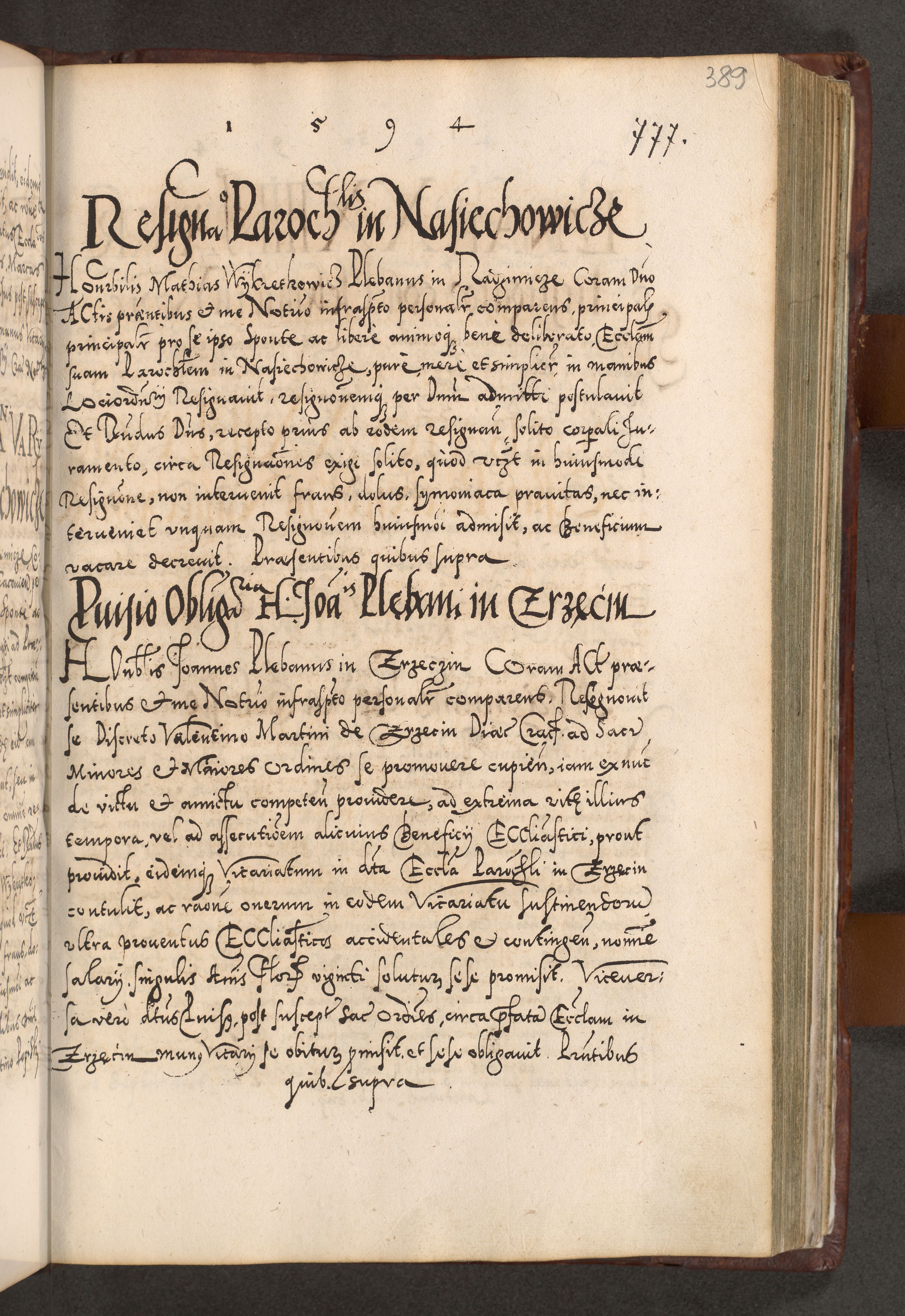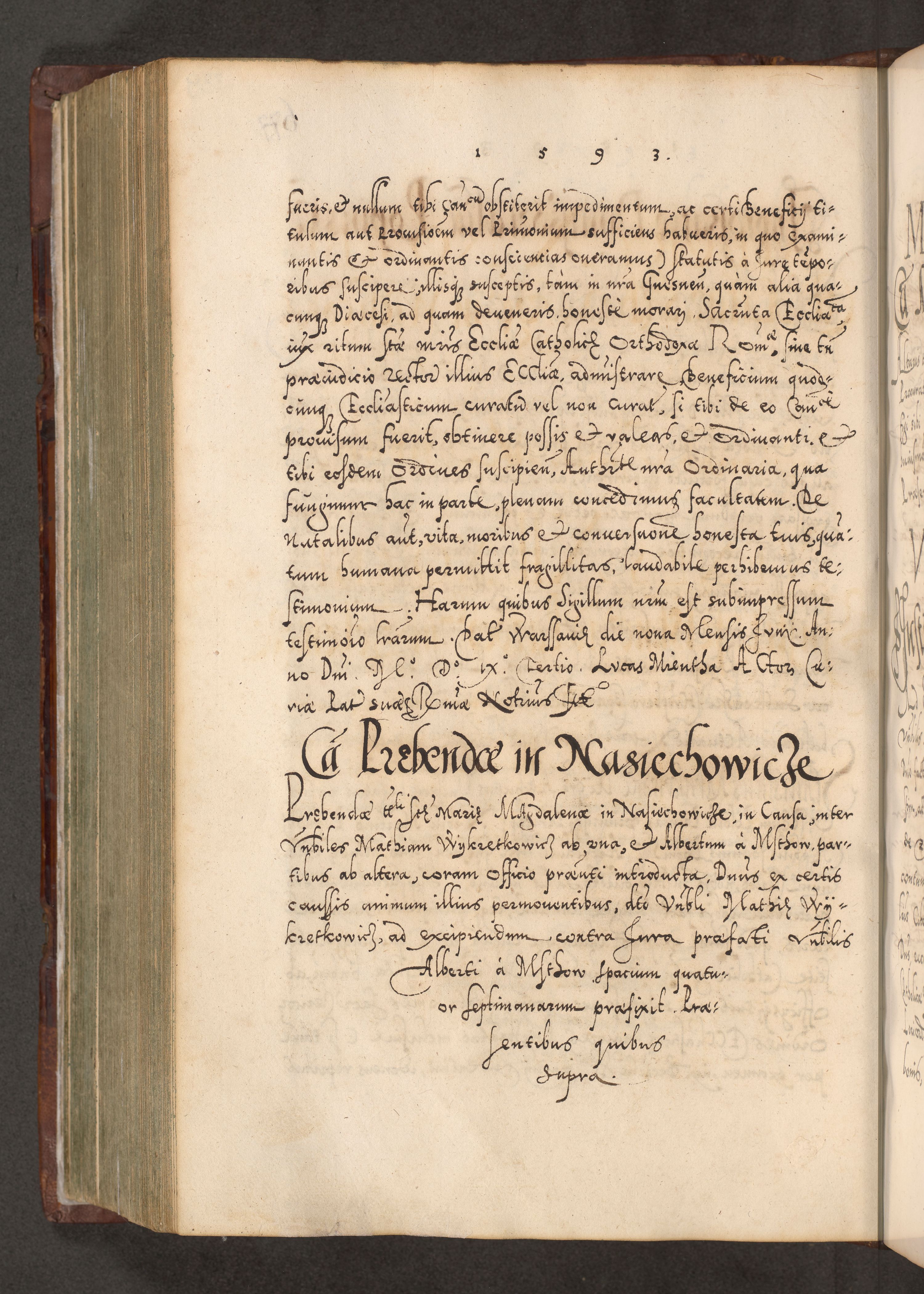Illistrissimo et revedissimo in Christo Patre Domino Domino Georgio Rzadziwił Miserone Divina Sacrostae R. E. Tituli S. Sixti Presbitero Cardinali Duce in Olyka et Niesswiesz ad Gubernacula Ecclessiae Cracoviensis cuius administratorialem a Sancta Sede Apostolica obtinverat feliciter sedente. Acta actorum, causarum, sententiarum tam deffinitivarum quam interloquutoriarum decretorum, obligationum, quietationum, recognitionum, constitutionum procuratorum etc. coram Reverendo Domino Stanislao Crassinskz de Crasne Archidiacono Cracoviensis, Scholastico Gnesnesis, Custode Plocensis etc. Vicario et Officiali Generali Cracoviensi in Ano Domini Millesimo Quingentesimo Nonagesimo Primo cuius indictio quarta pontificatus SS. Domini Nostri Gregorii XIIII Anno I psius prio feliciter incipiut