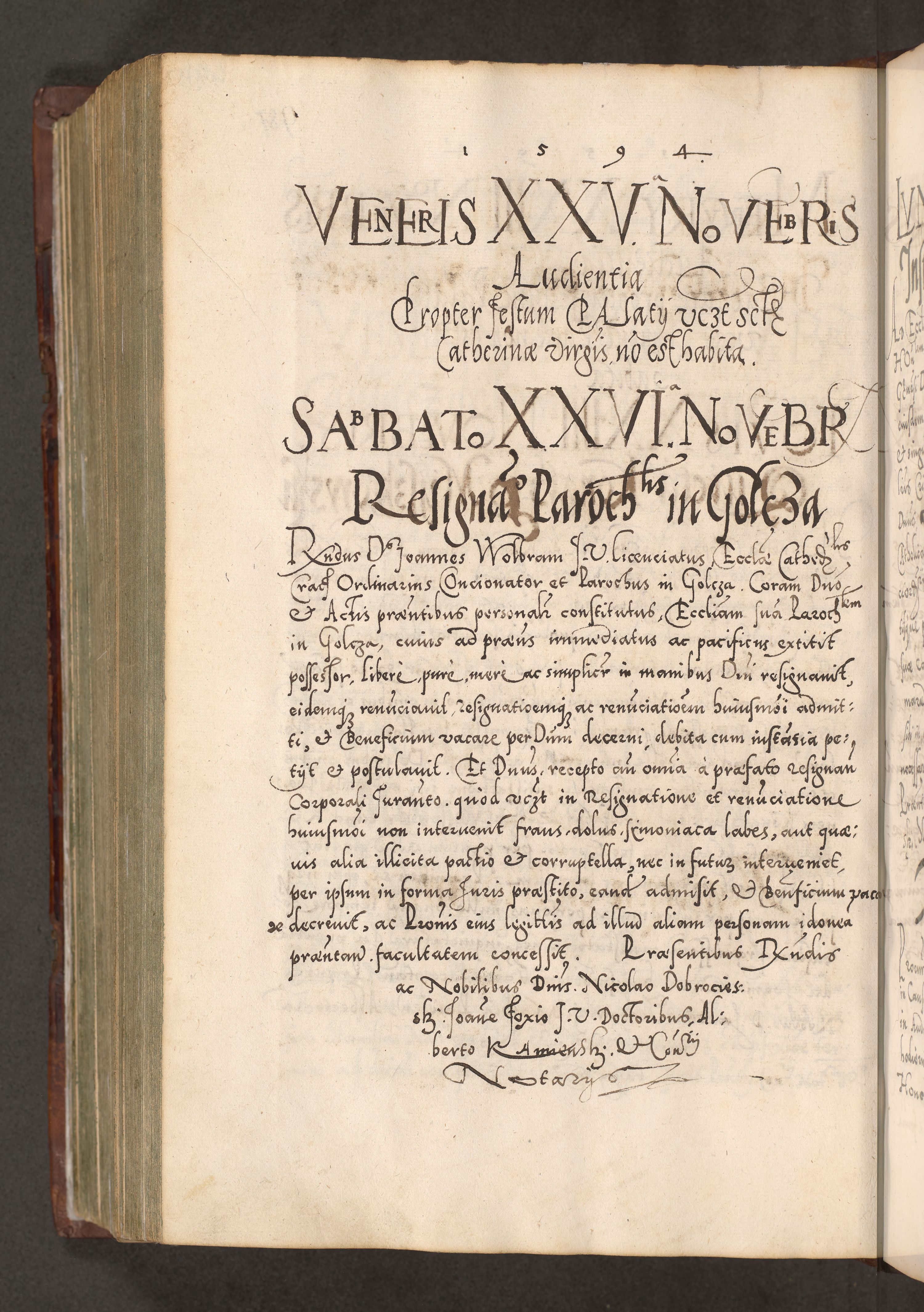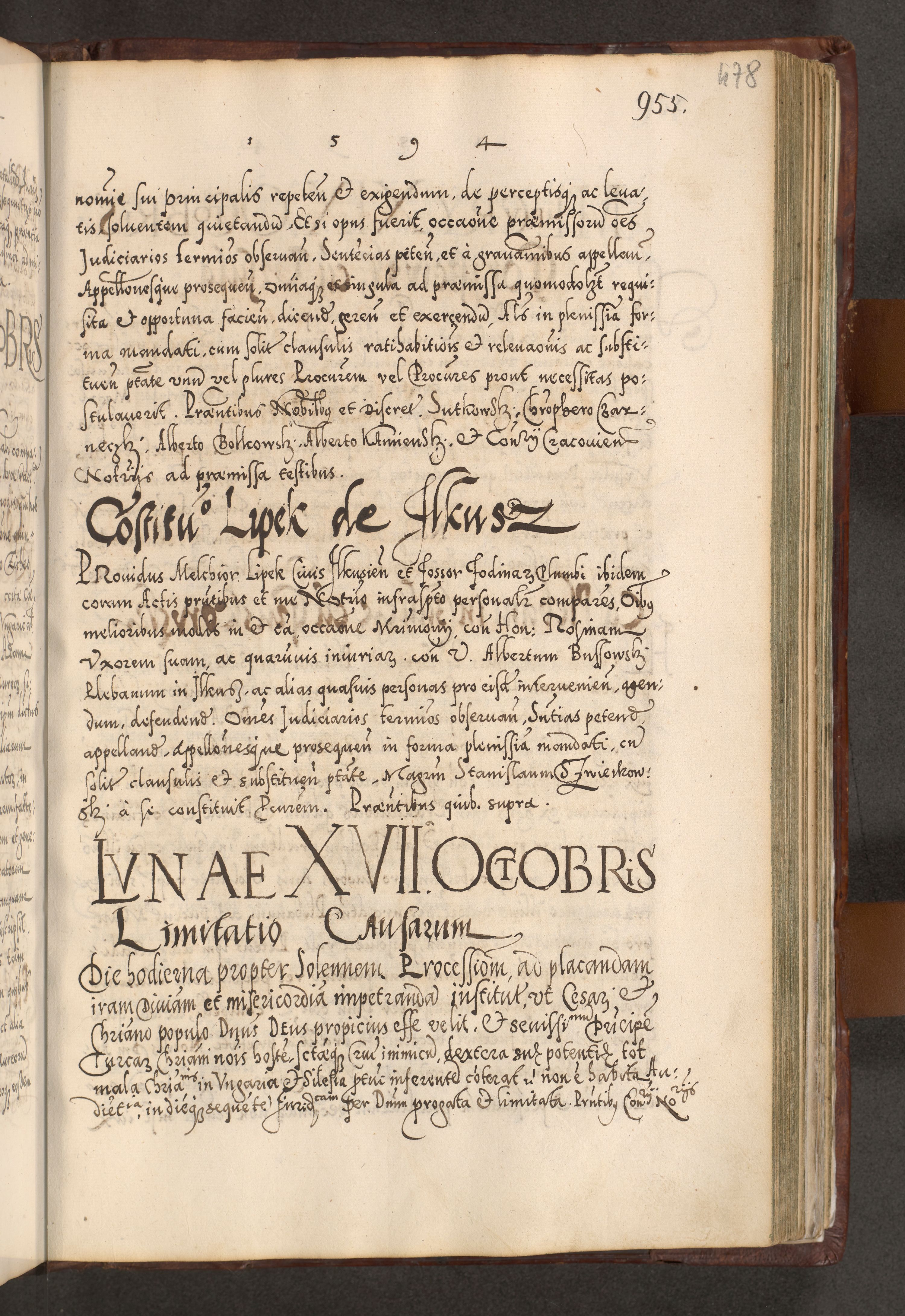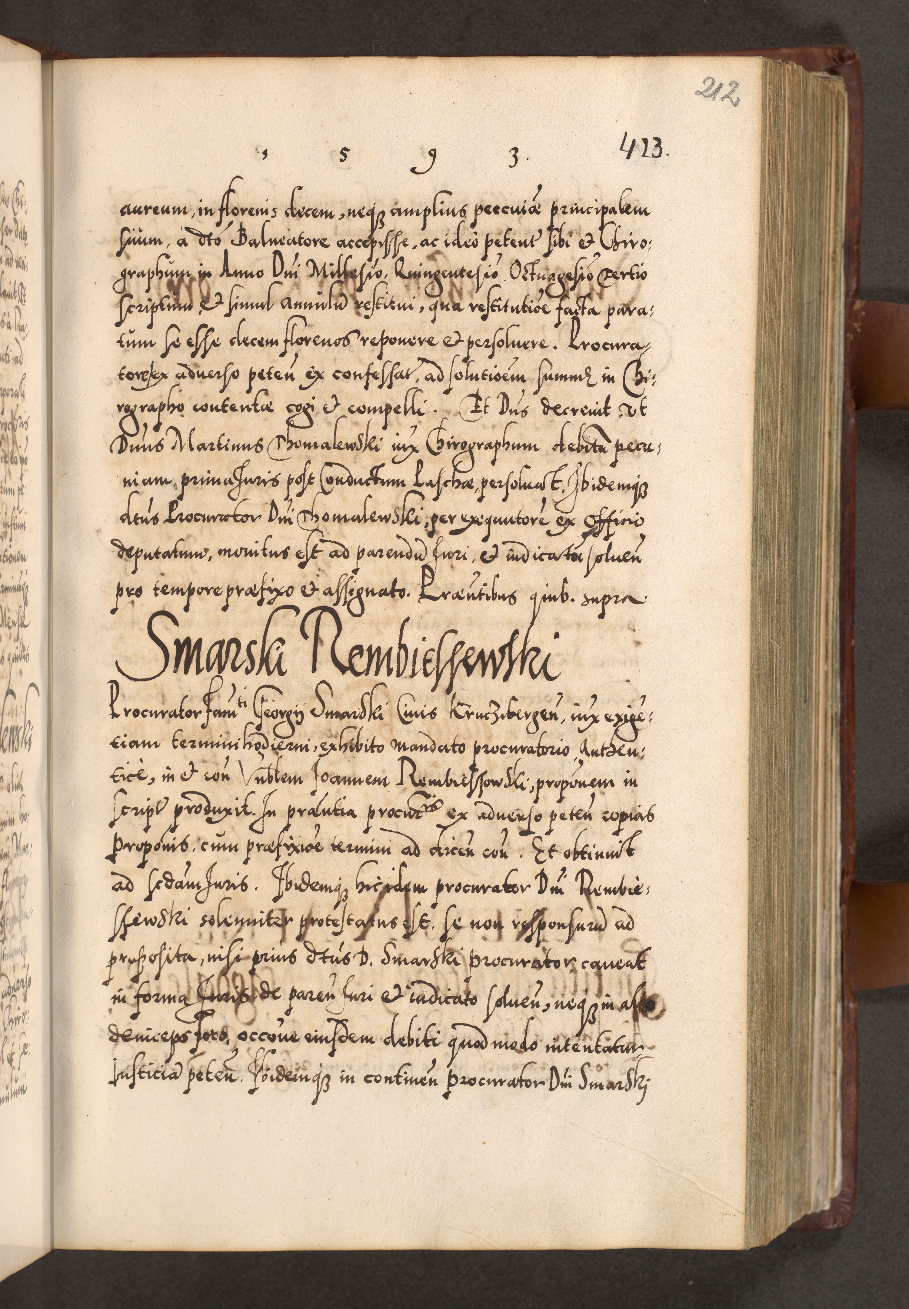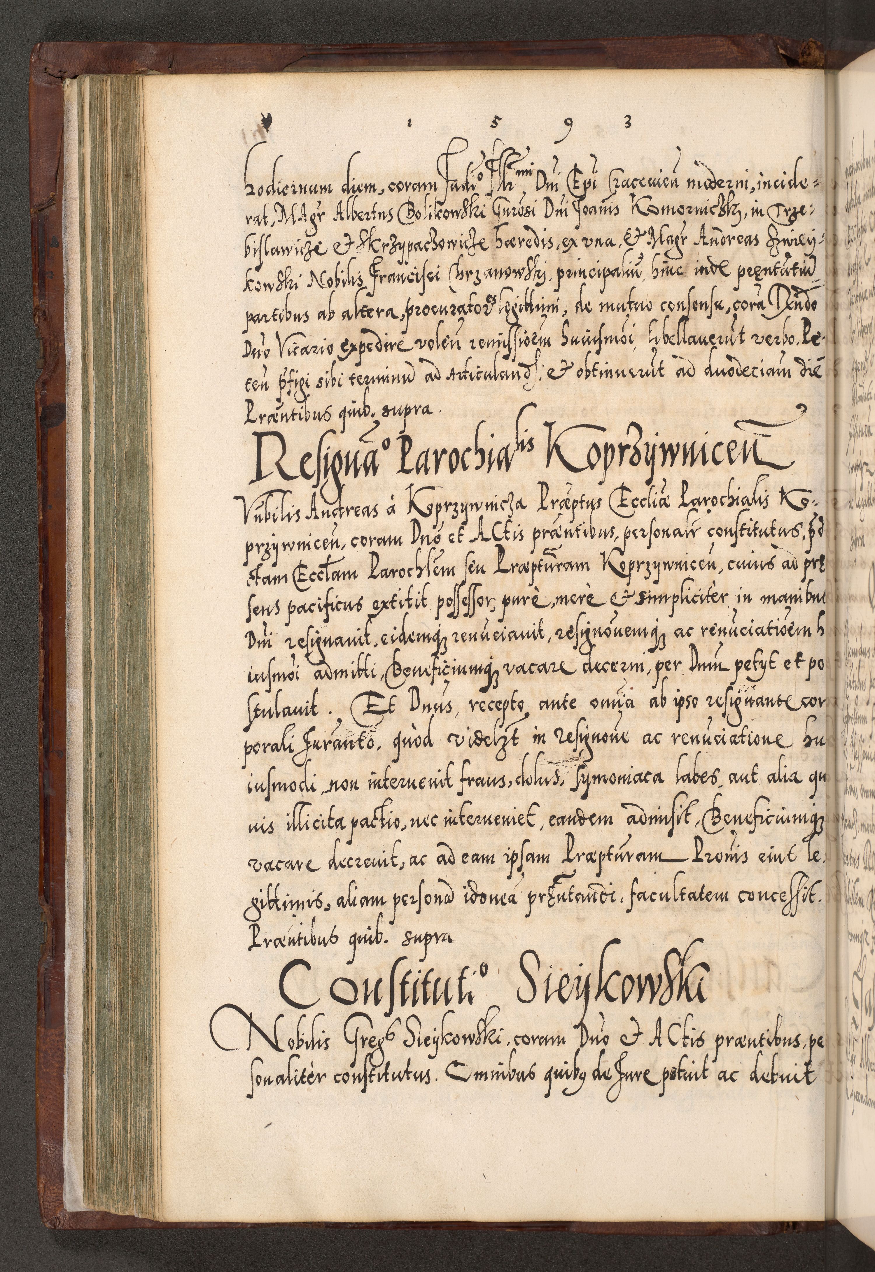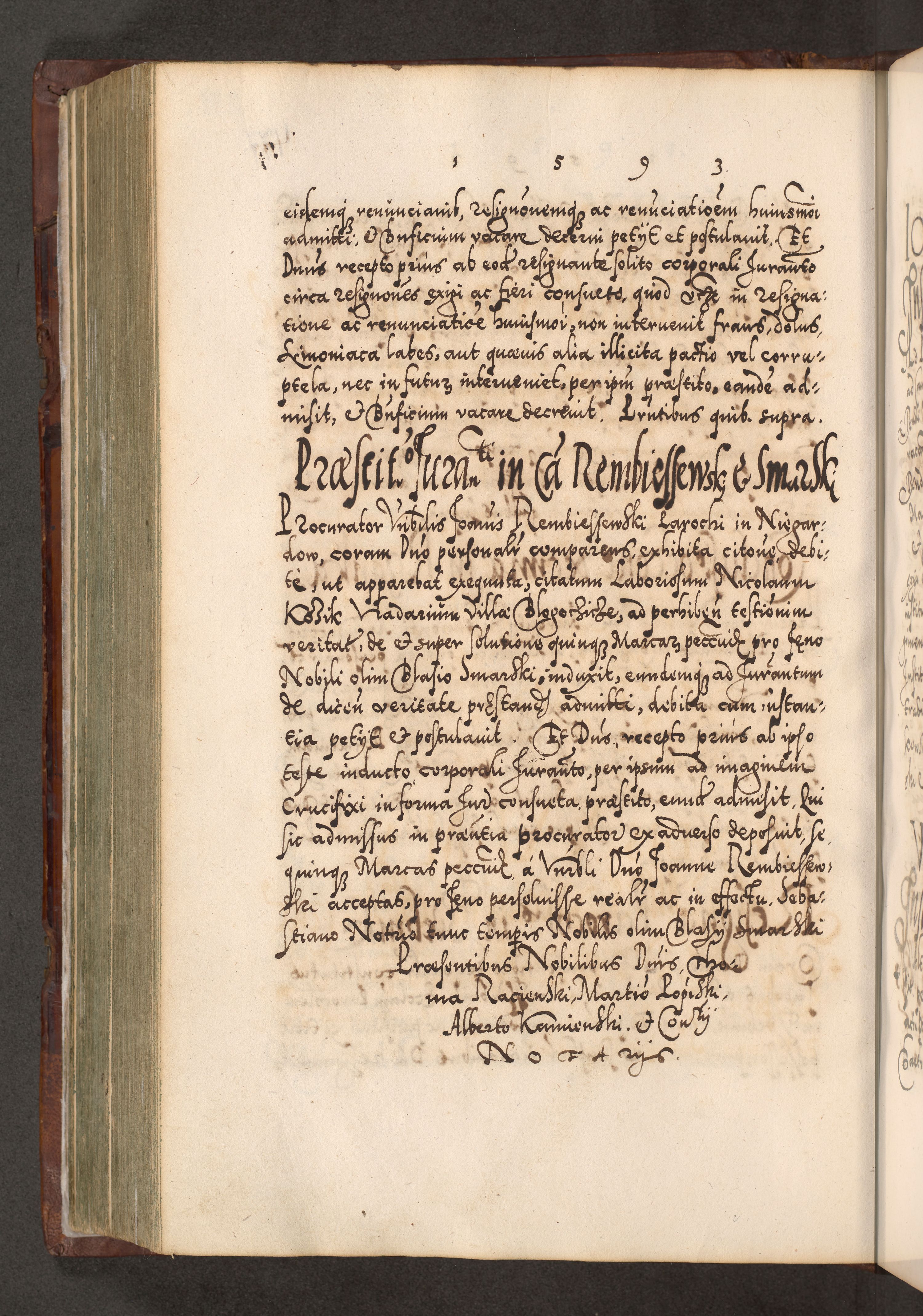 Illistrissimo et revedissimo in Christo Patre Domino Domino Georgio Rzadziwił Miserone Divina Sacrostae R. E. Tituli S. Sixti Presbitero Cardinali Duce in Olyka et Niesswiesz ad Gubernacula Ecclessiae Cracoviensis cuius administratorialem a Sancta Sede Apostolica obtinverat feliciter sedente. Acta actorum, causarum, sententiarum tam deffinitivarum quam interloquutoriarum decretorum, obligationum, quietationum, recognitionum, constitutionum procuratorum etc. coram Reverendo Domino Stanislao Crassinskz de Crasne Archidiacono Cracoviensis, Scholastico Gnesnesis, Custode Plocensis etc. Vicario et Officiali Generali Cracoviensi in Ano Domini Millesimo Quingentesimo Nonagesimo Primo cuius indictio quarta pontificatus SS. Domini Nostri Gregorii XIIII Anno I psius prio feliciter incipiut