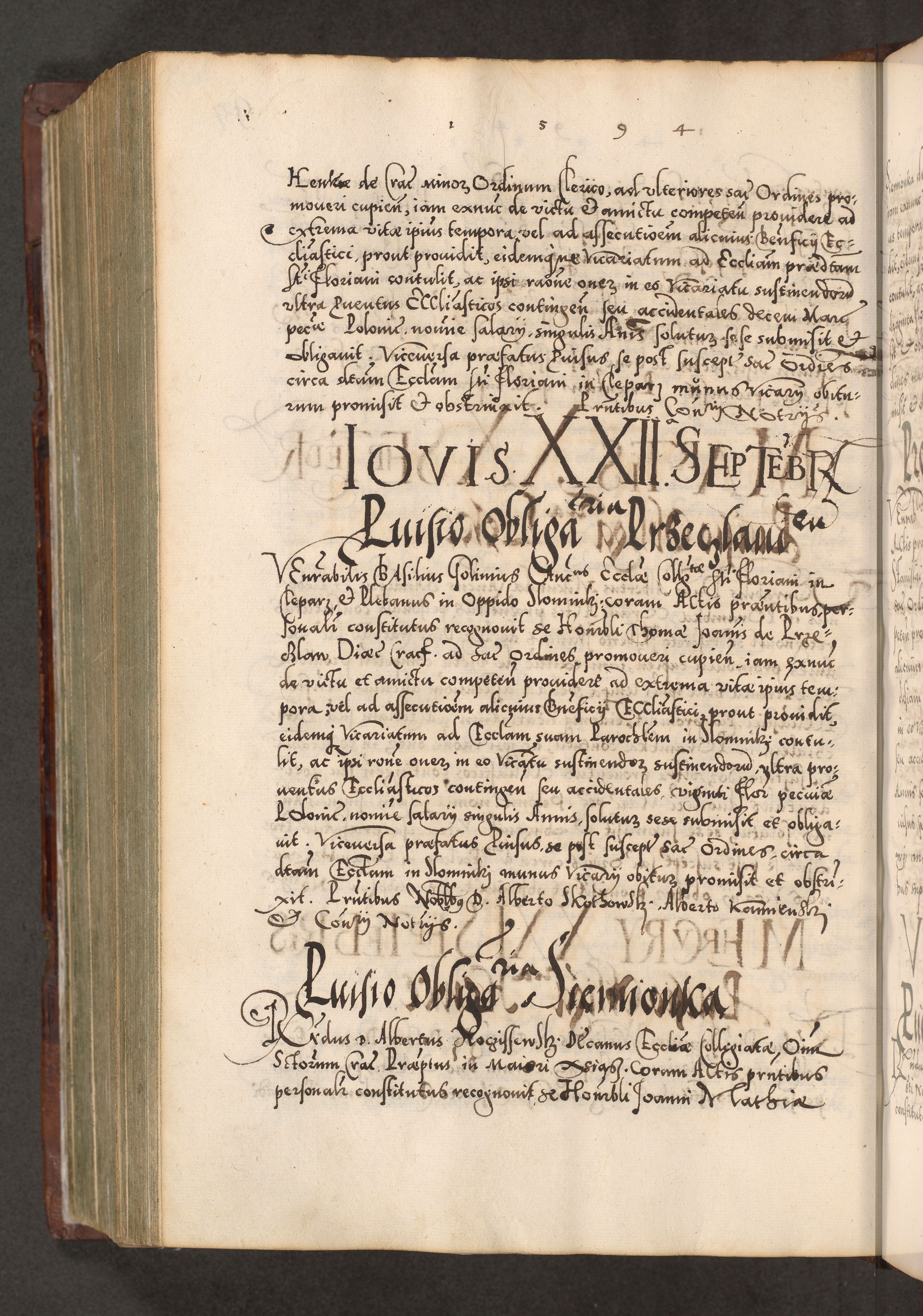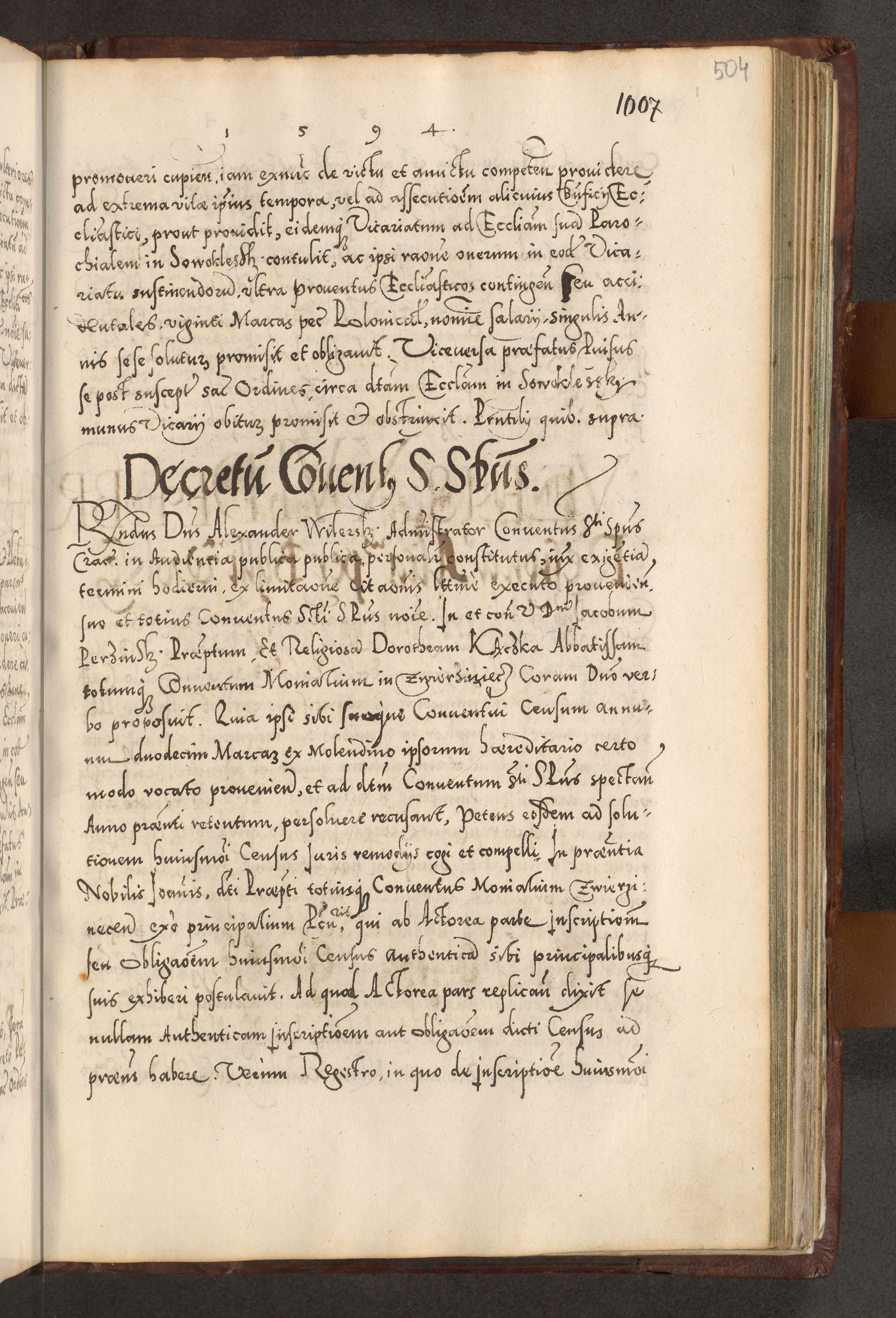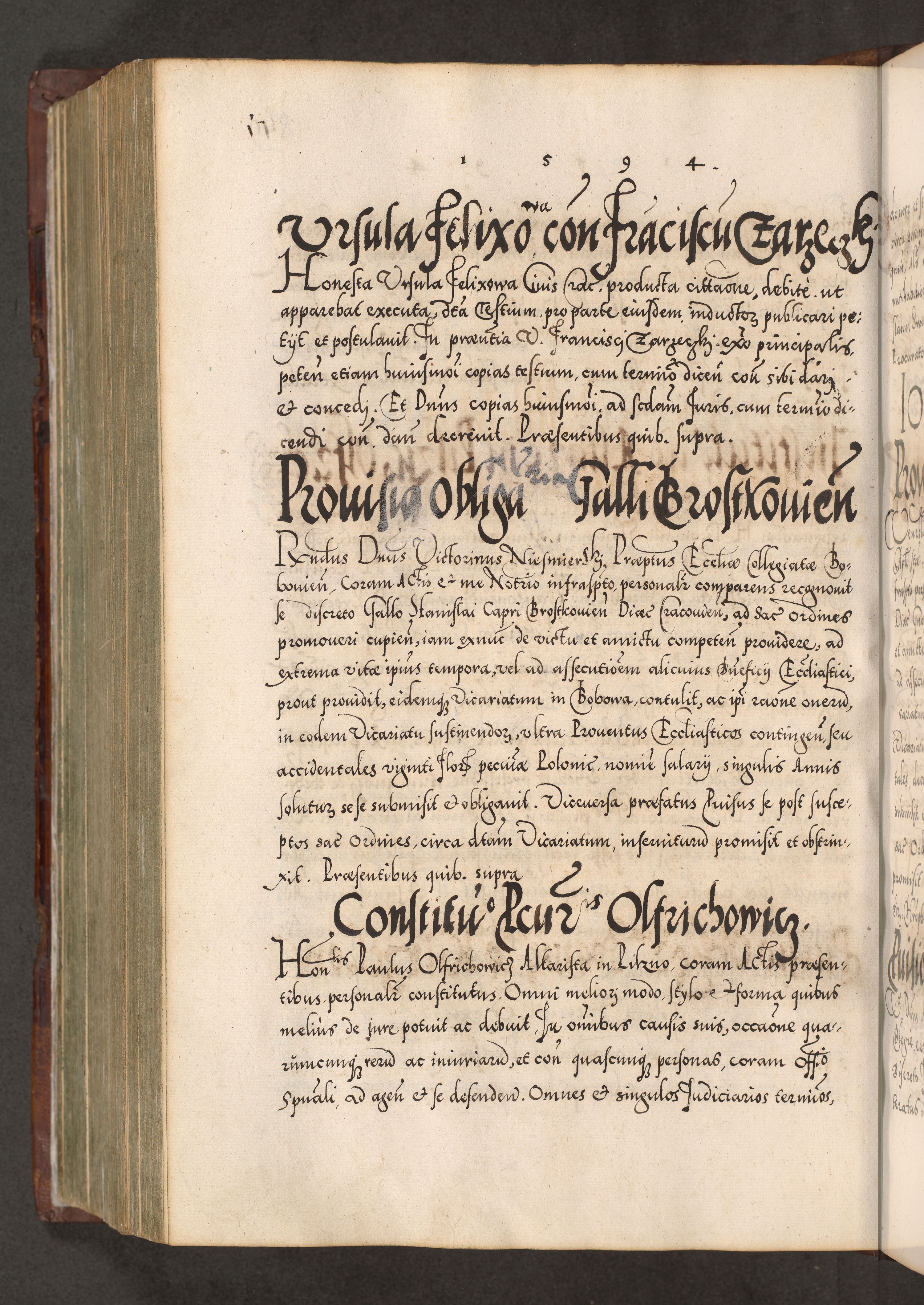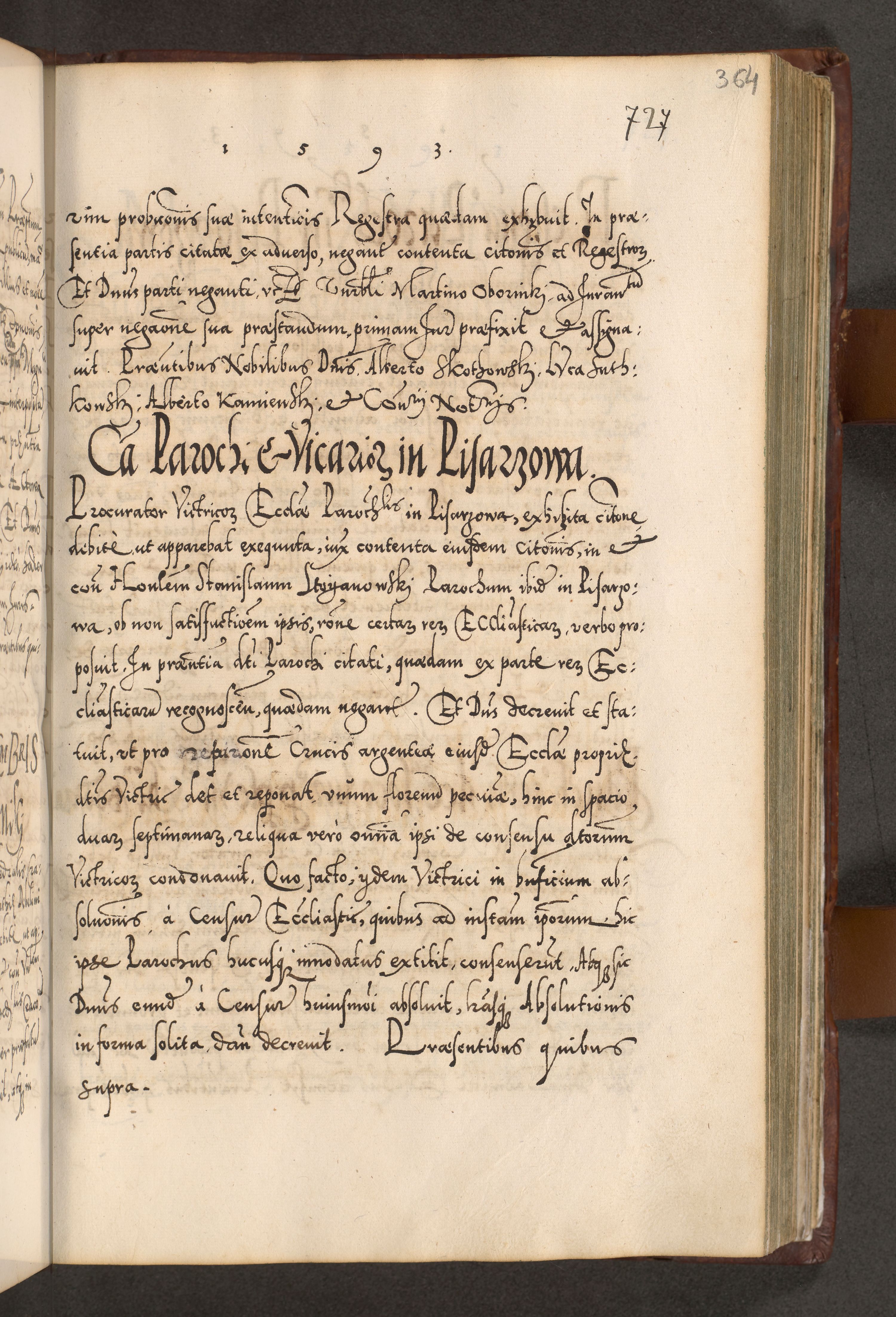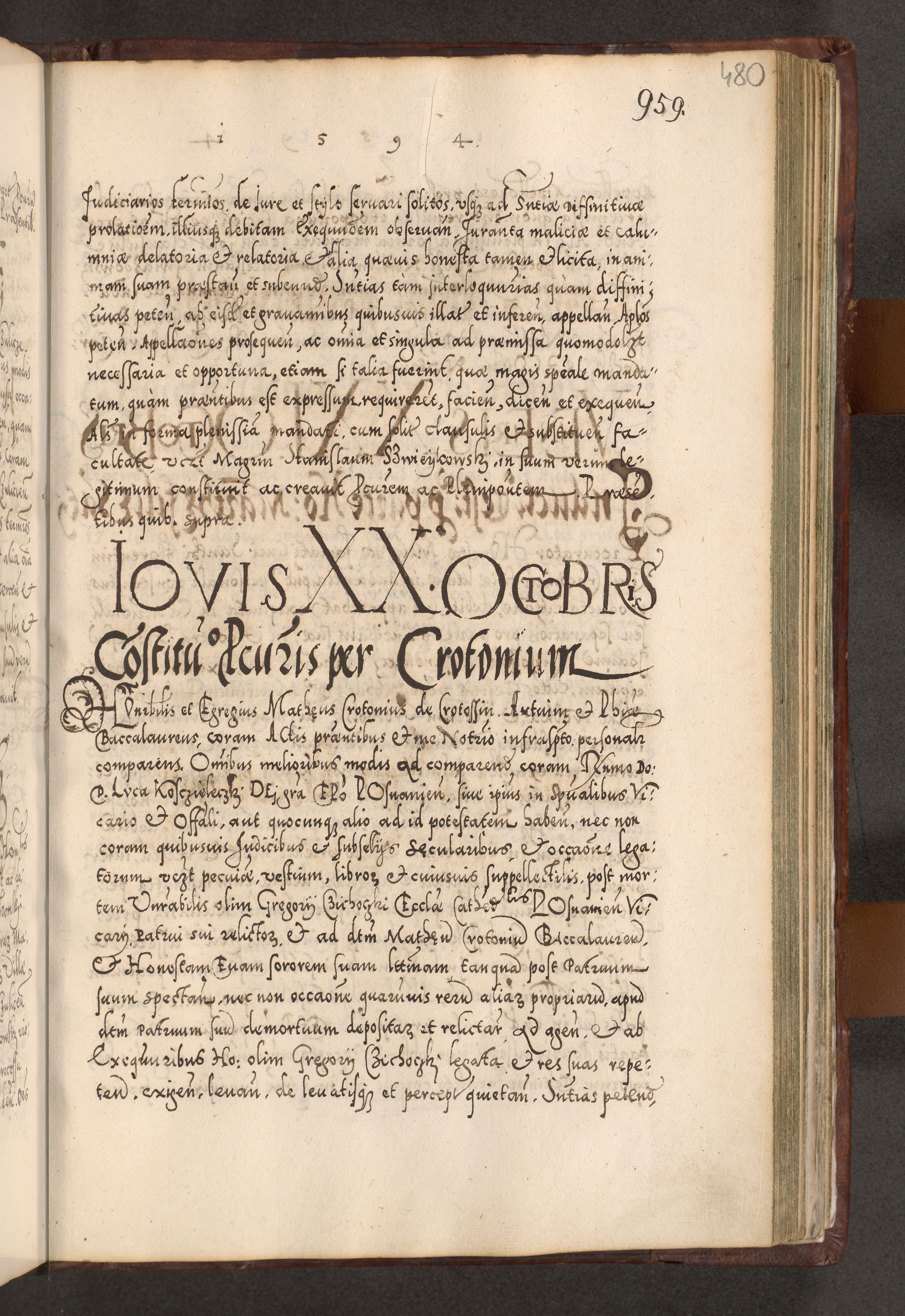 Illistrissimo et revedissimo in Christo Patre Domino Domino Georgio Rzadziwił Miserone Divina Sacrostae R. E. Tituli S. Sixti Presbitero Cardinali Duce in Olyka et Niesswiesz ad Gubernacula Ecclessiae Cracoviensis cuius administratorialem a Sancta Sede Apostolica obtinverat feliciter sedente. Acta actorum, causarum, sententiarum tam deffinitivarum quam interloquutoriarum decretorum, obligationum, quietationum, recognitionum, constitutionum procuratorum etc. coram Reverendo Domino Stanislao Crassinskz de Crasne Archidiacono Cracoviensis, Scholastico Gnesnesis, Custode Plocensis etc. Vicario et Officiali Generali Cracoviensi in Ano Domini Millesimo Quingentesimo Nonagesimo Primo cuius indictio quarta pontificatus SS. Domini Nostri Gregorii XIIII Anno I psius prio feliciter incipiut