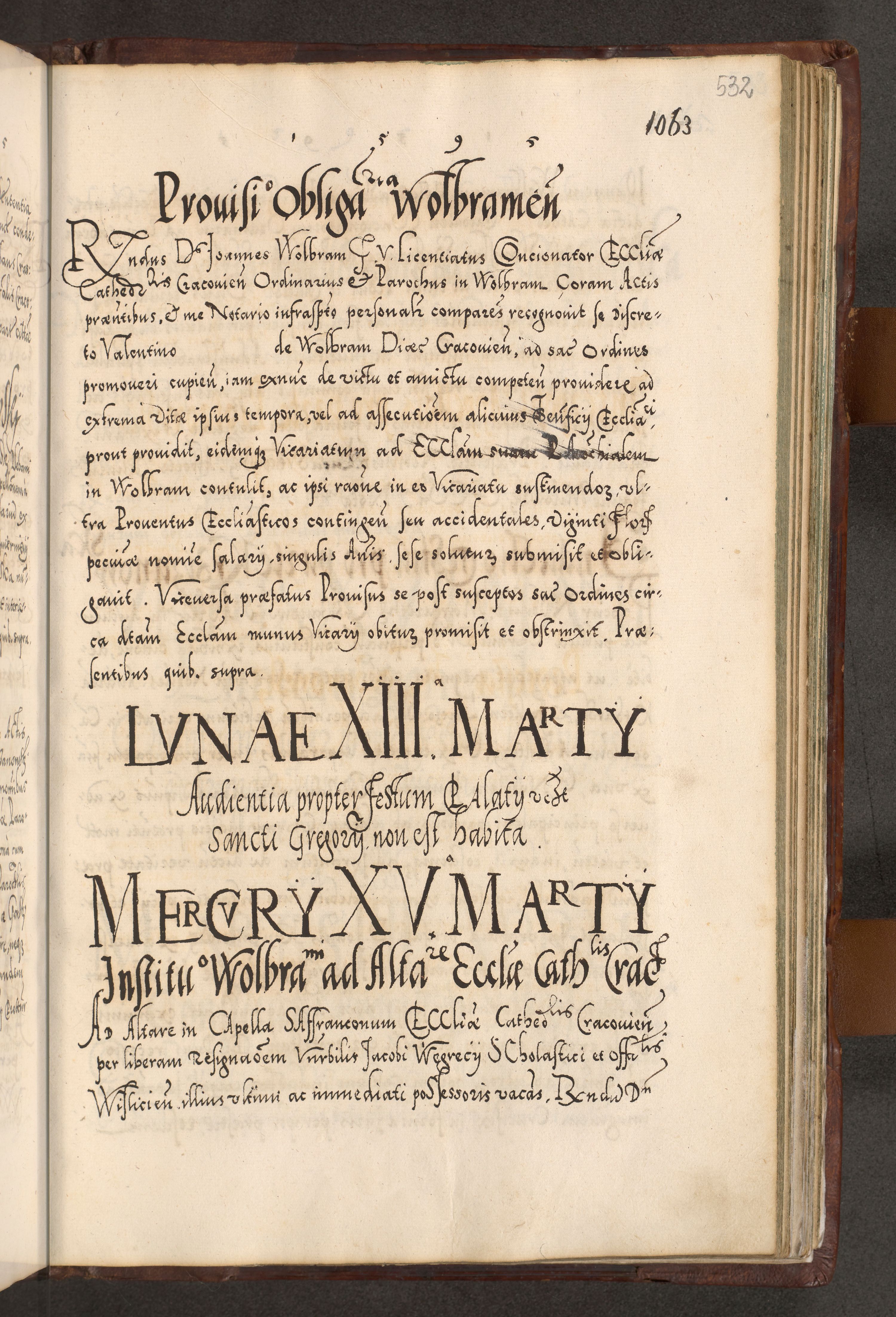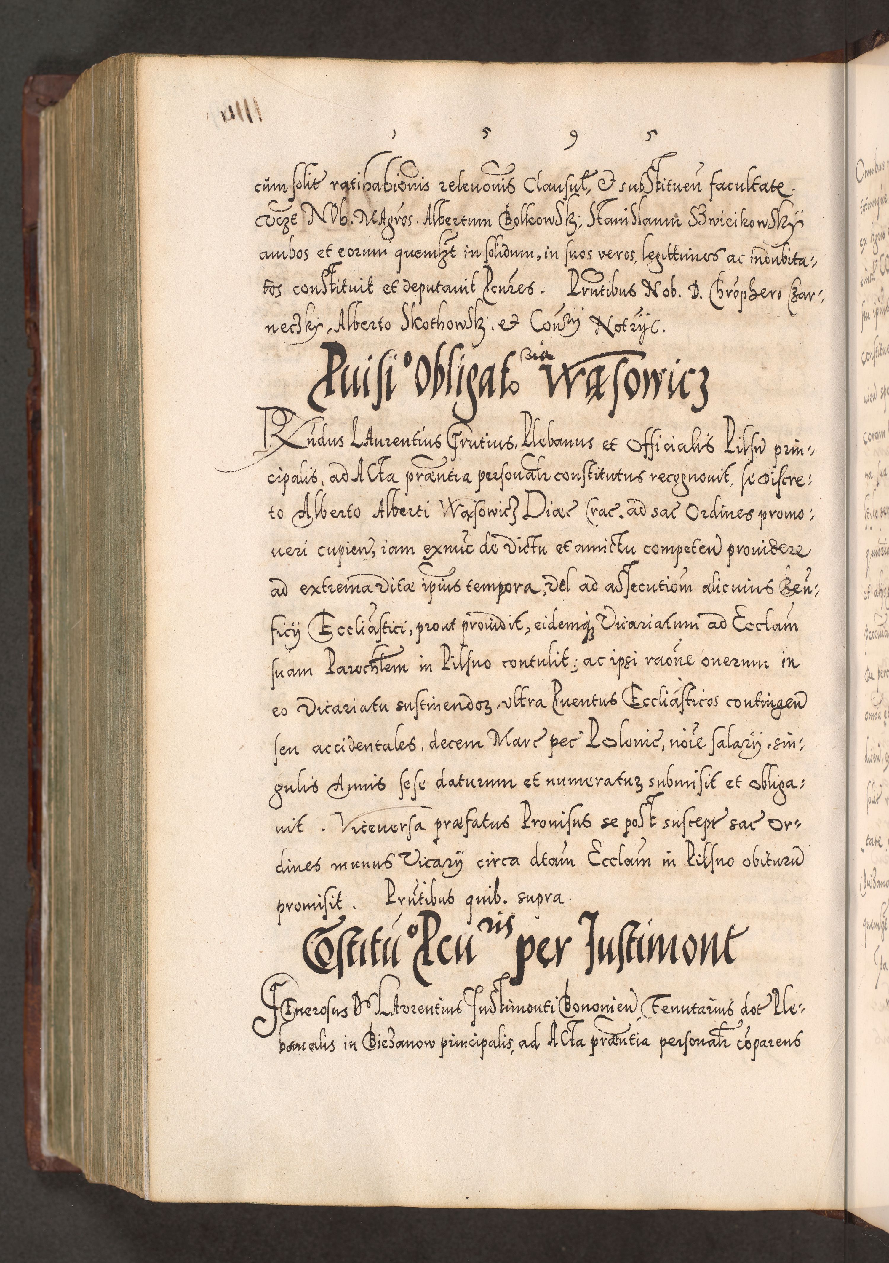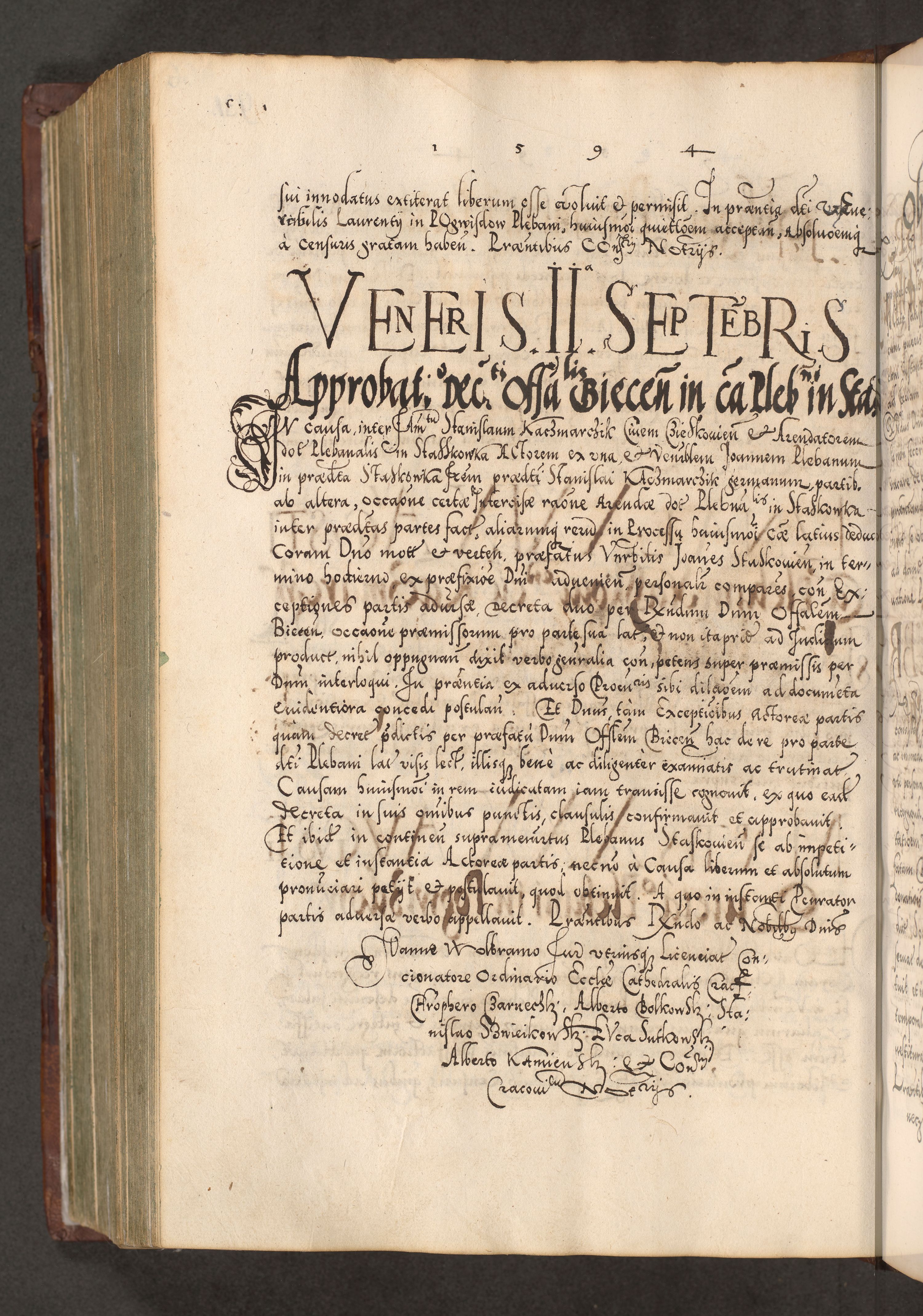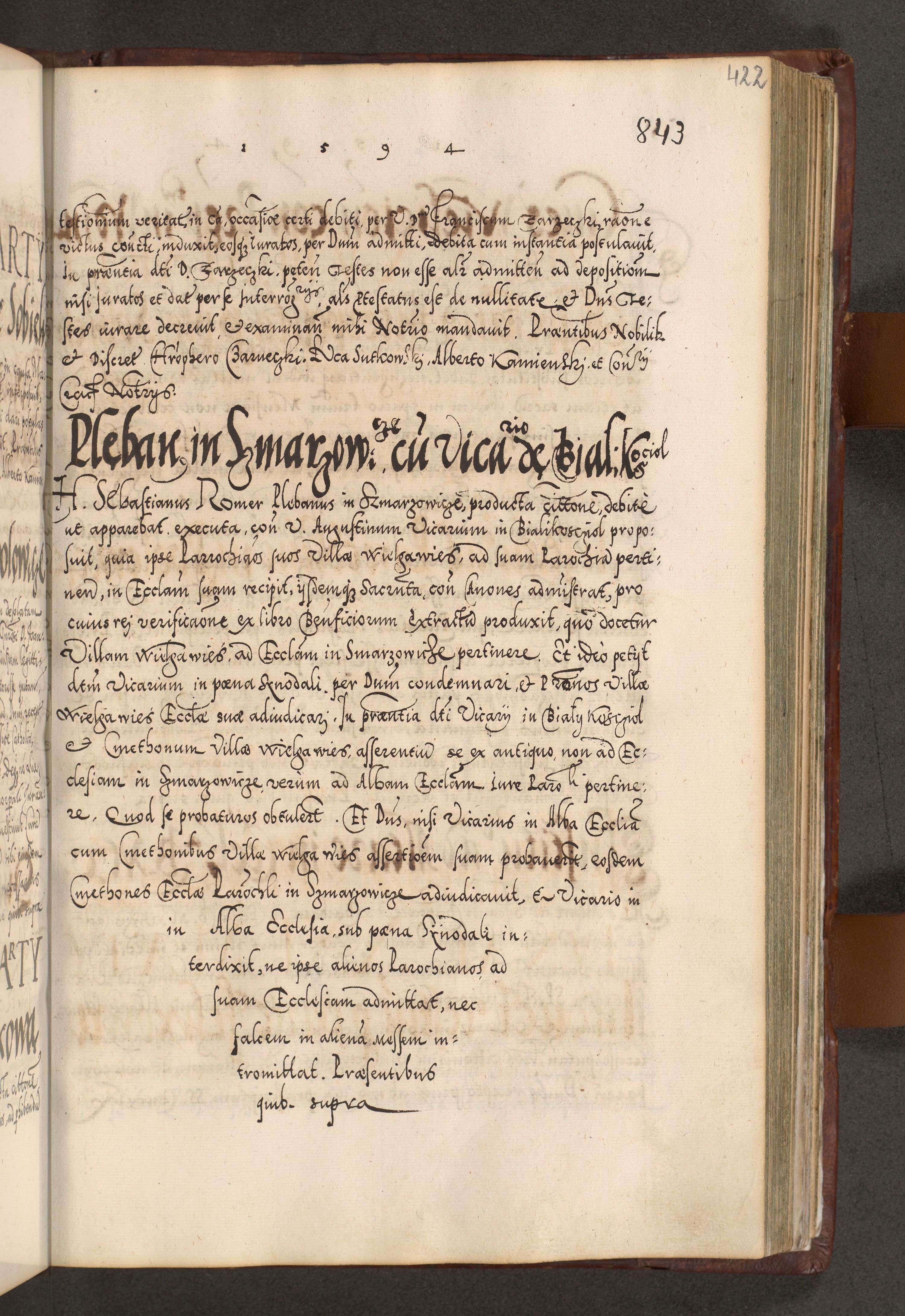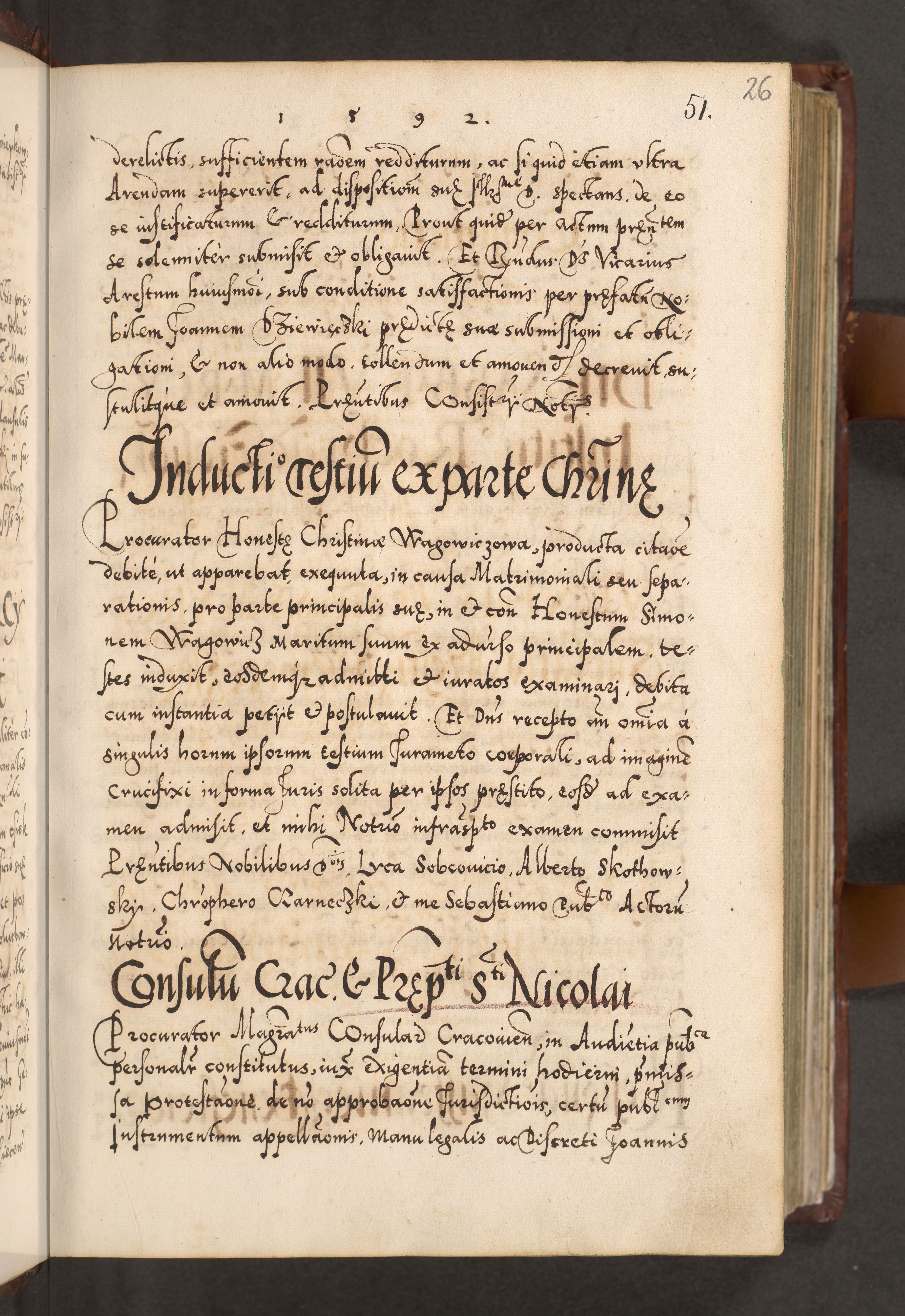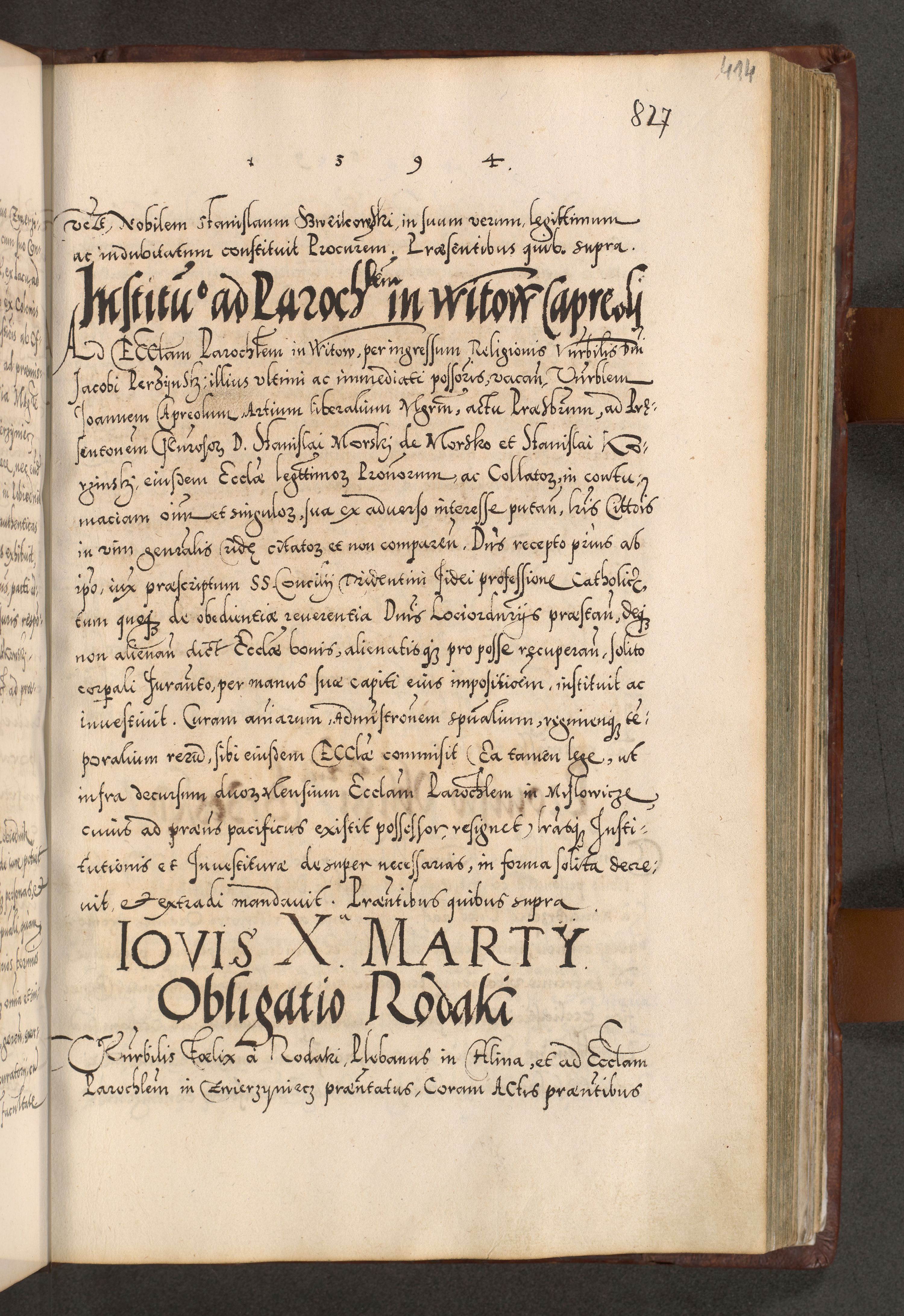 Illistrissimo et revedissimo in Christo Patre Domino Domino Georgio Rzadziwił Miserone Divina Sacrostae R. E. Tituli S. Sixti Presbitero Cardinali Duce in Olyka et Niesswiesz ad Gubernacula Ecclessiae Cracoviensis cuius administratorialem a Sancta Sede Apostolica obtinverat feliciter sedente. Acta actorum, causarum, sententiarum tam deffinitivarum quam interloquutoriarum decretorum, obligationum, quietationum, recognitionum, constitutionum procuratorum etc. coram Reverendo Domino Stanislao Crassinskz de Crasne Archidiacono Cracoviensis, Scholastico Gnesnesis, Custode Plocensis etc. Vicario et Officiali Generali Cracoviensi in Ano Domini Millesimo Quingentesimo Nonagesimo Primo cuius indictio quarta pontificatus SS. Domini Nostri Gregorii XIIII Anno I psius prio feliciter incipiut