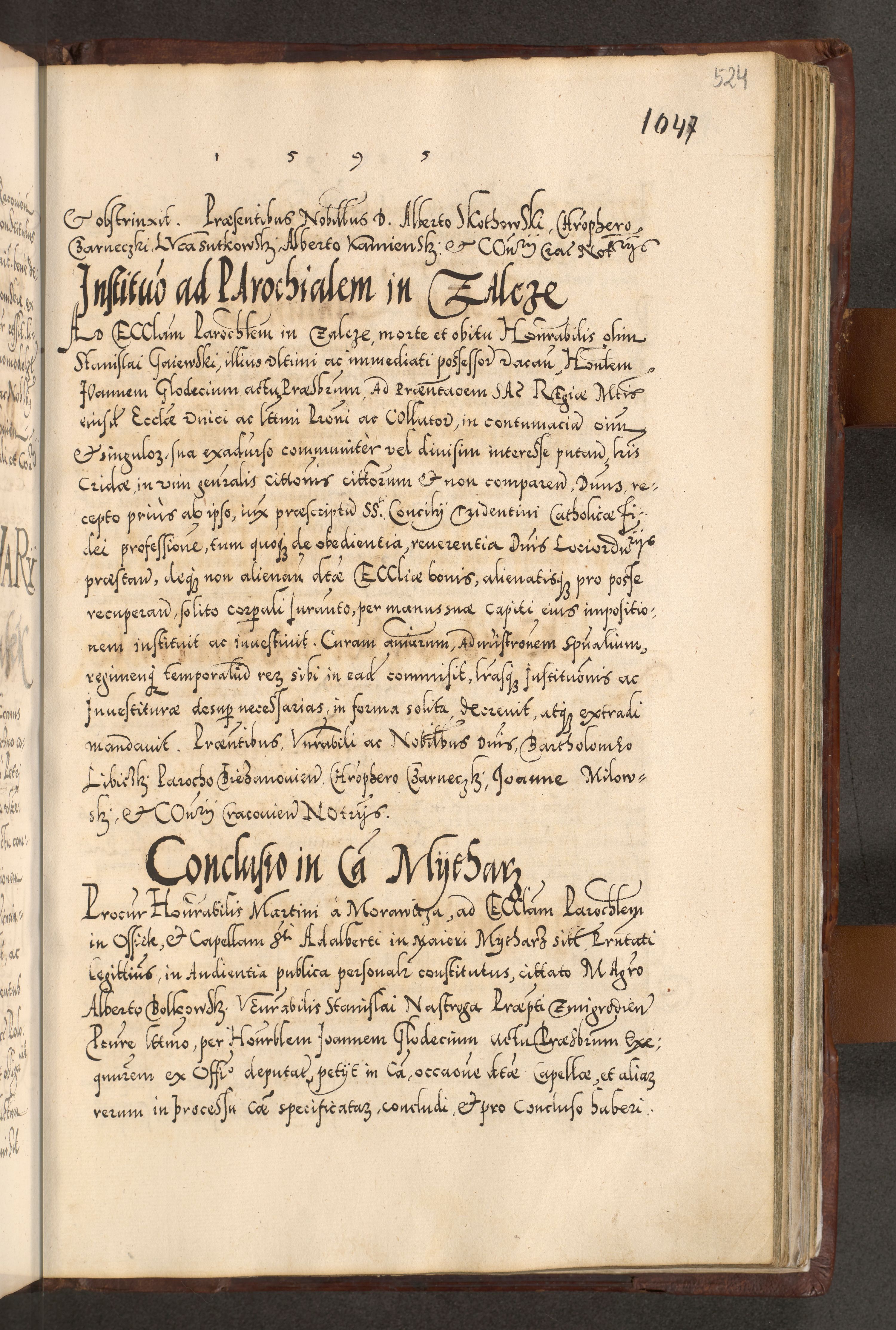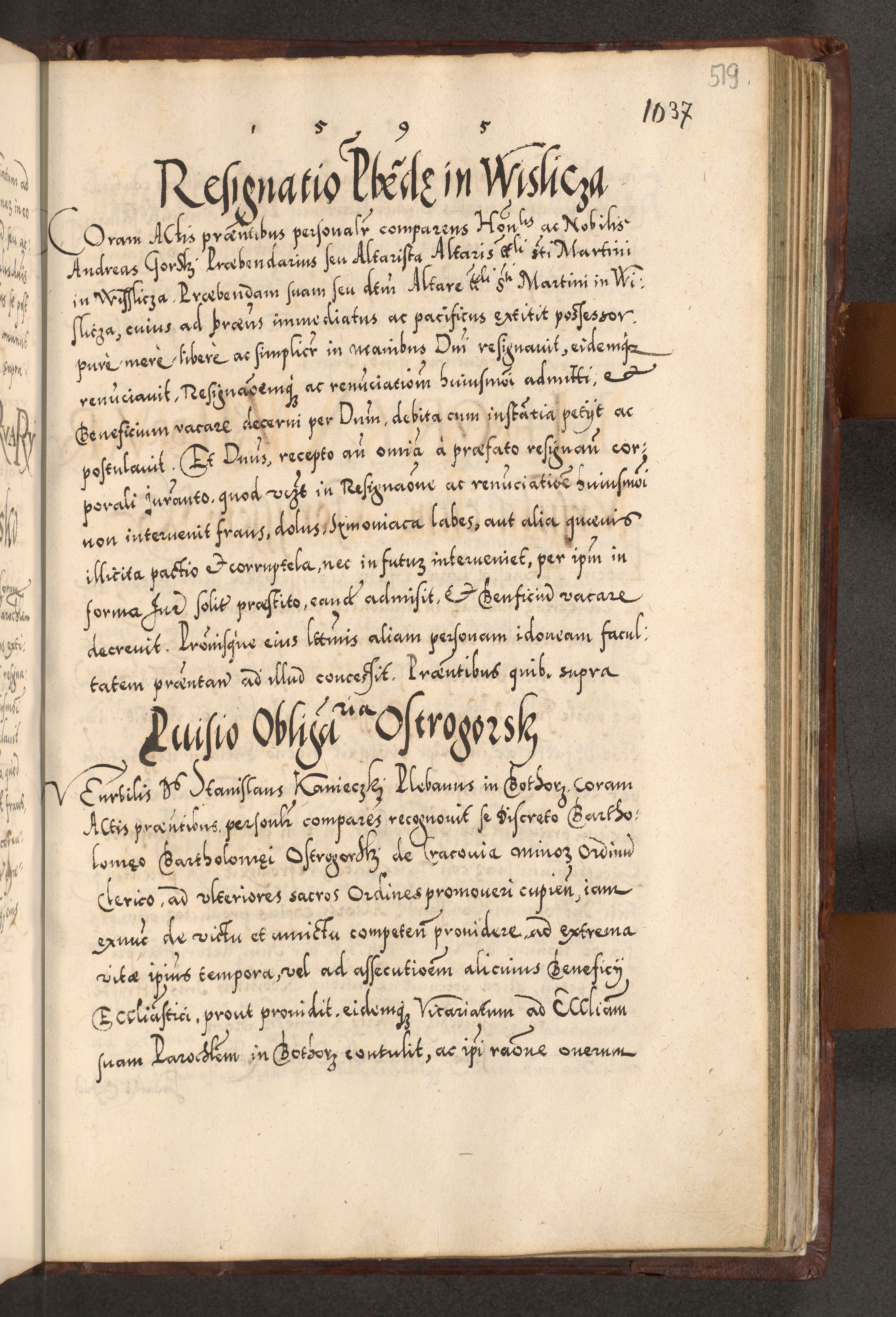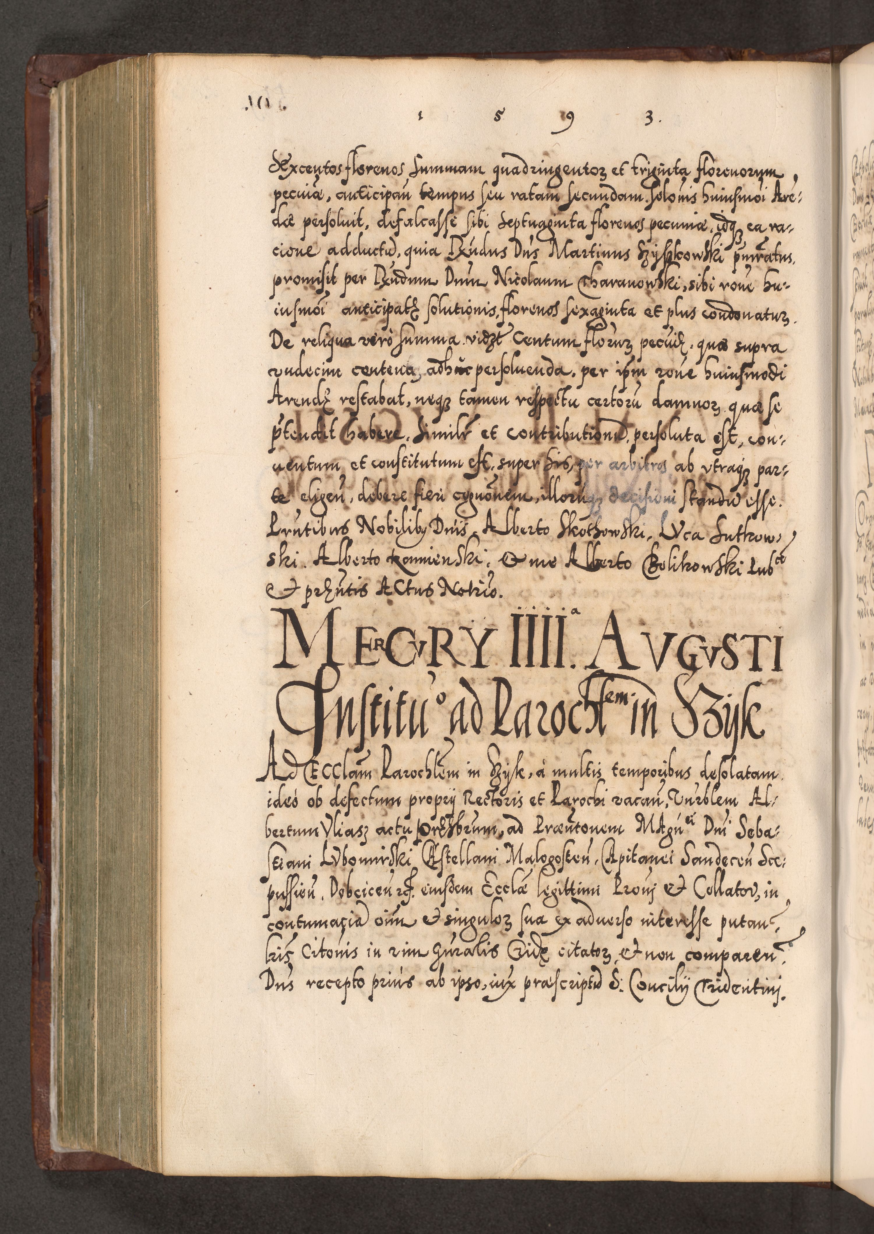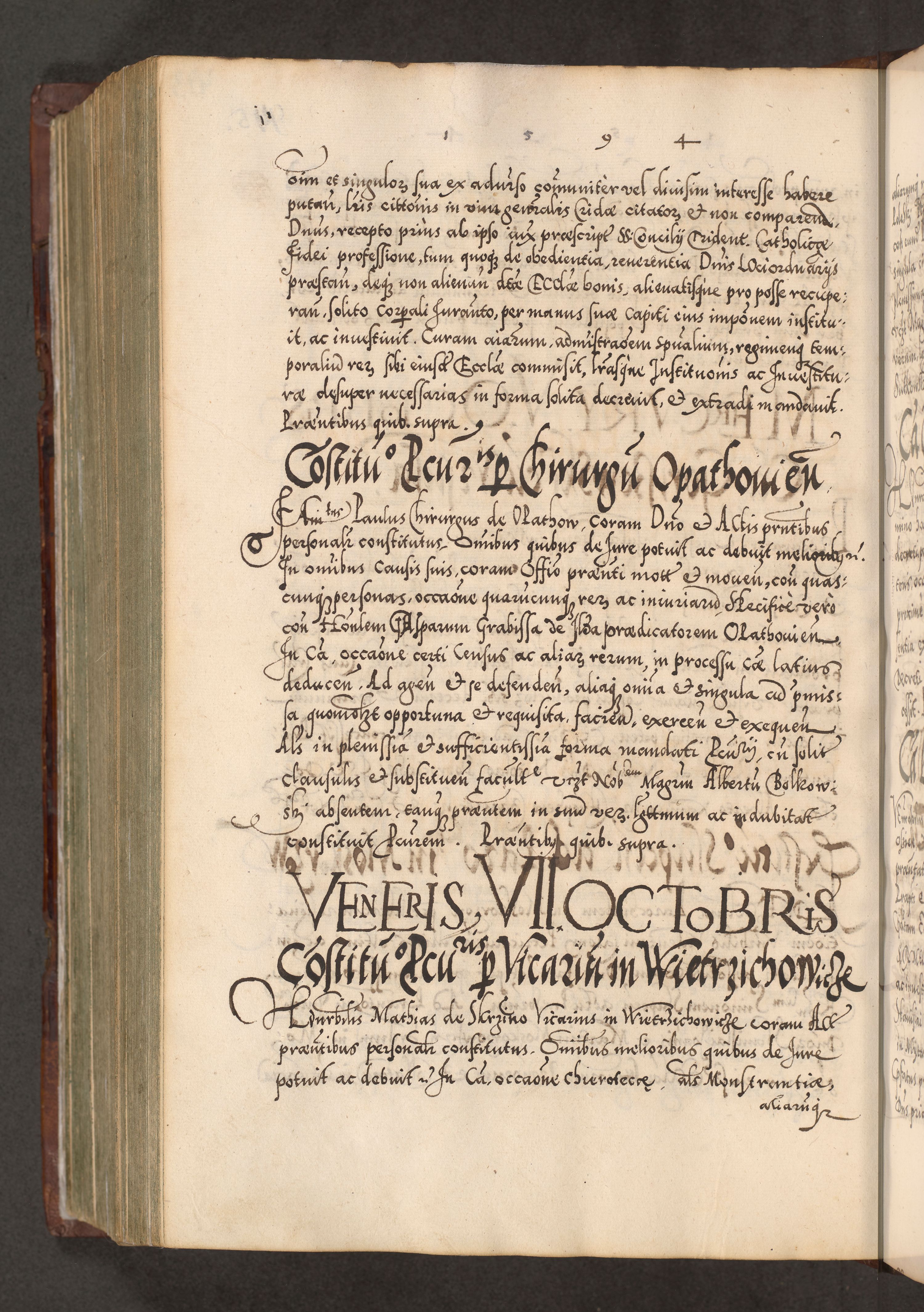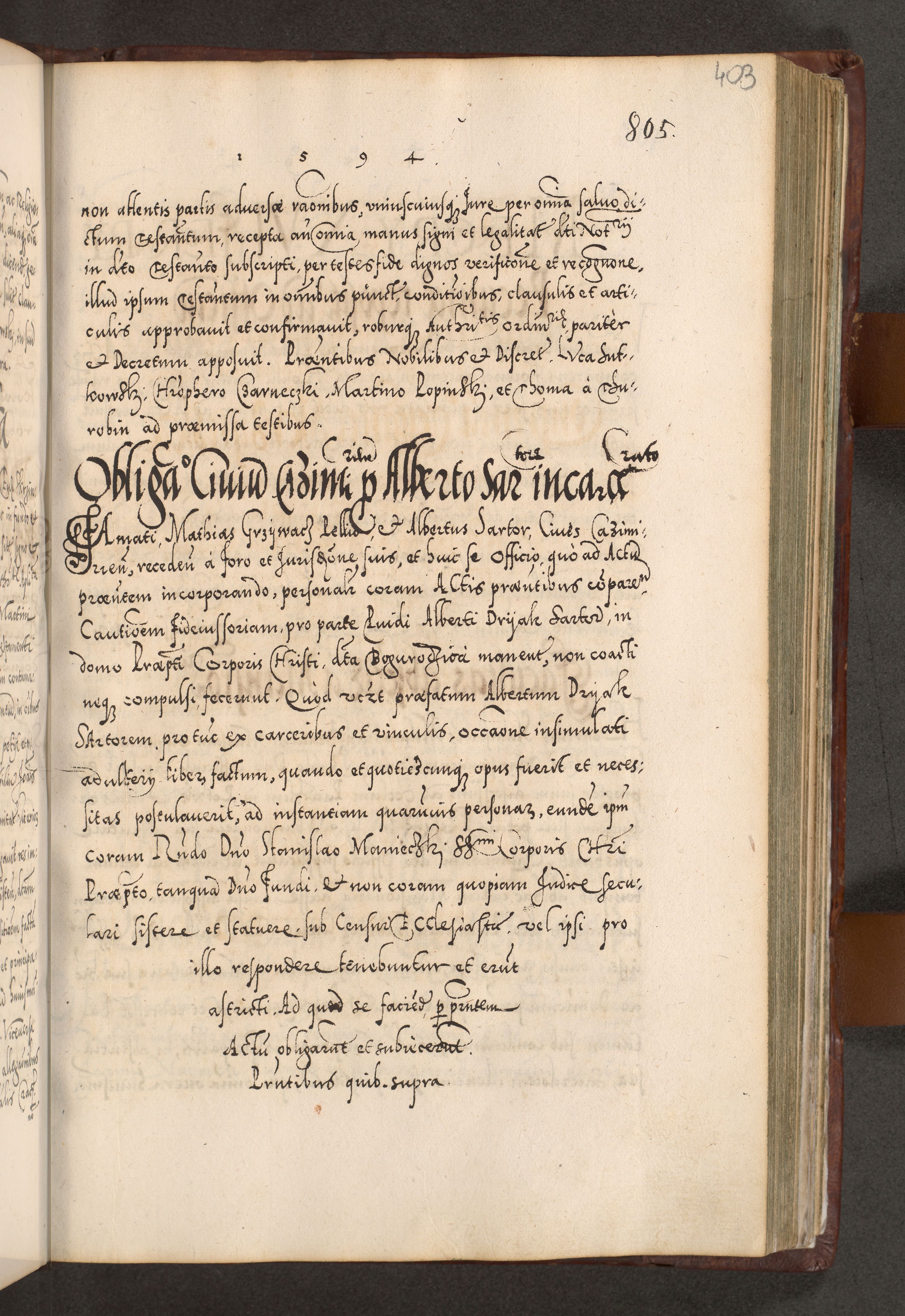 Illistrissimo et revedissimo in Christo Patre Domino Domino Georgio Rzadziwił Miserone Divina Sacrostae R. E. Tituli S. Sixti Presbitero Cardinali Duce in Olyka et Niesswiesz ad Gubernacula Ecclessiae Cracoviensis cuius administratorialem a Sancta Sede Apostolica obtinverat feliciter sedente. Acta actorum, causarum, sententiarum tam deffinitivarum quam interloquutoriarum decretorum, obligationum, quietationum, recognitionum, constitutionum procuratorum etc. coram Reverendo Domino Stanislao Crassinskz de Crasne Archidiacono Cracoviensis, Scholastico Gnesnesis, Custode Plocensis etc. Vicario et Officiali Generali Cracoviensi in Ano Domini Millesimo Quingentesimo Nonagesimo Primo cuius indictio quarta pontificatus SS. Domini Nostri Gregorii XIIII Anno I psius prio feliciter incipiut