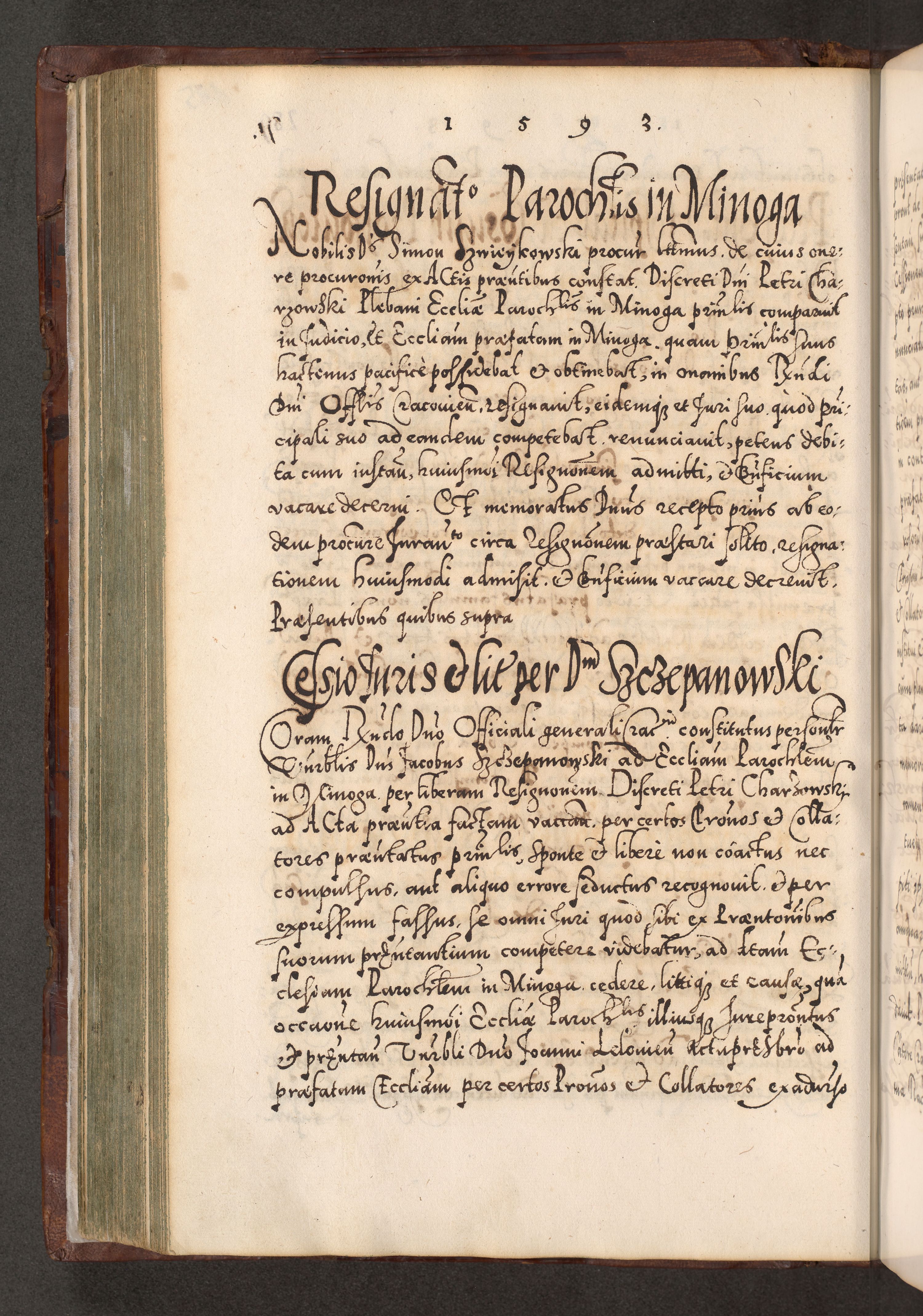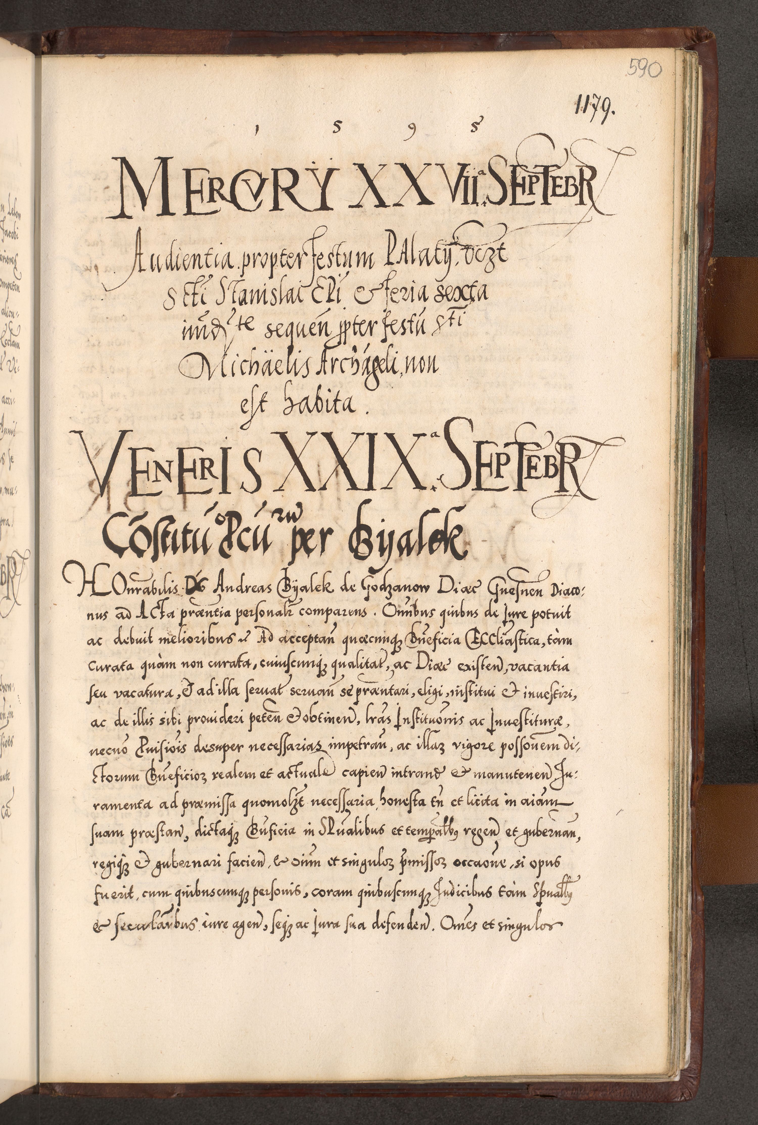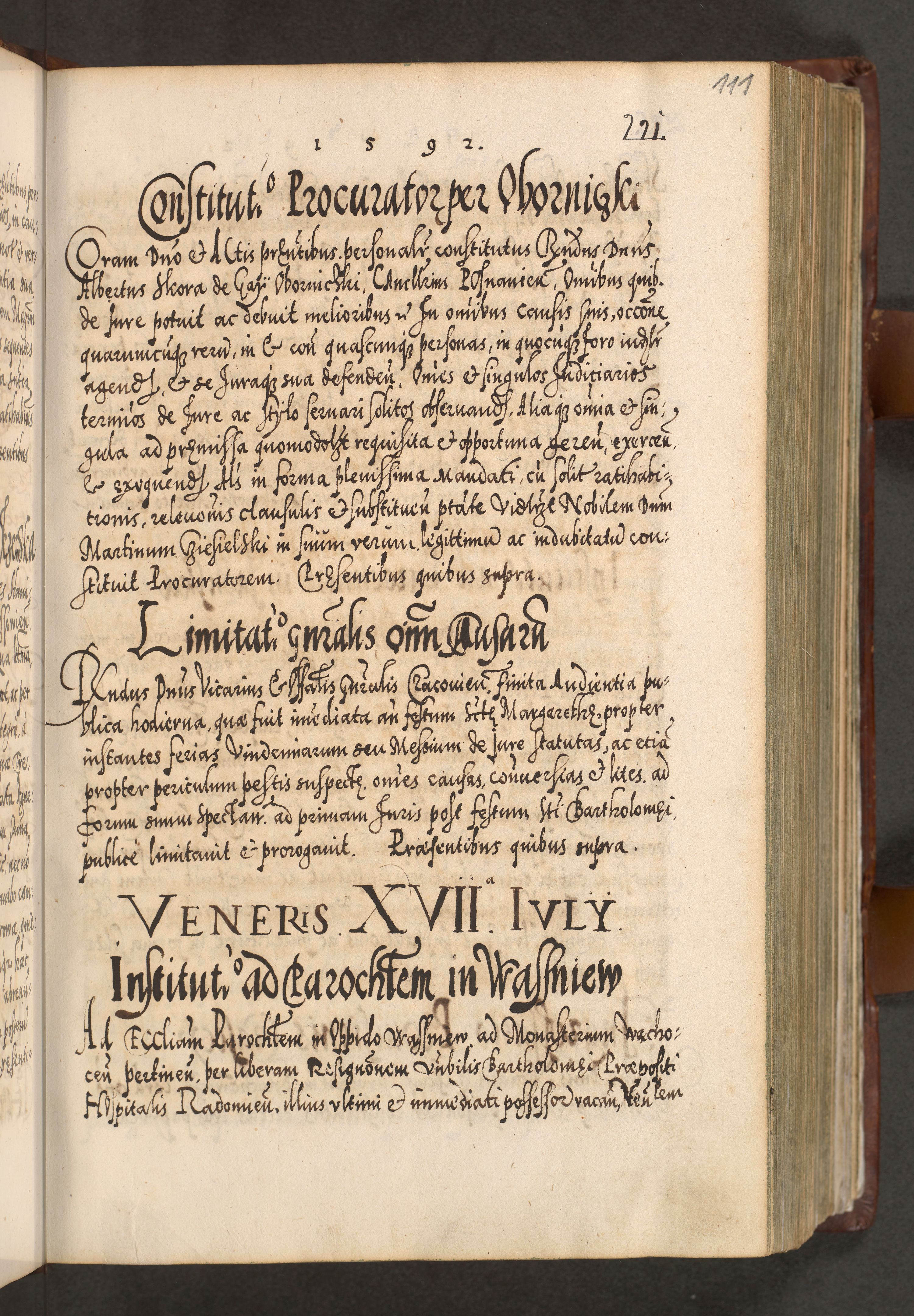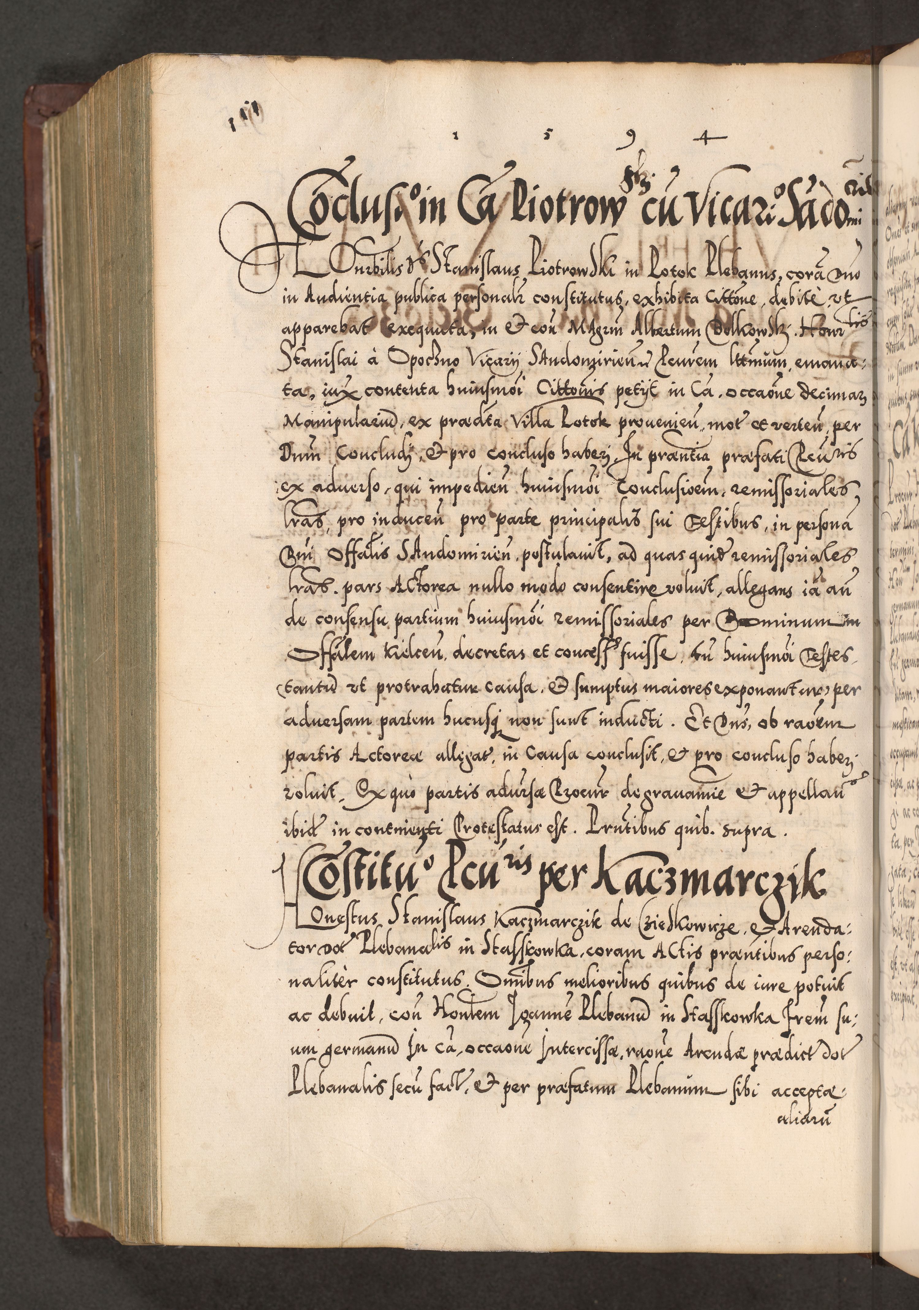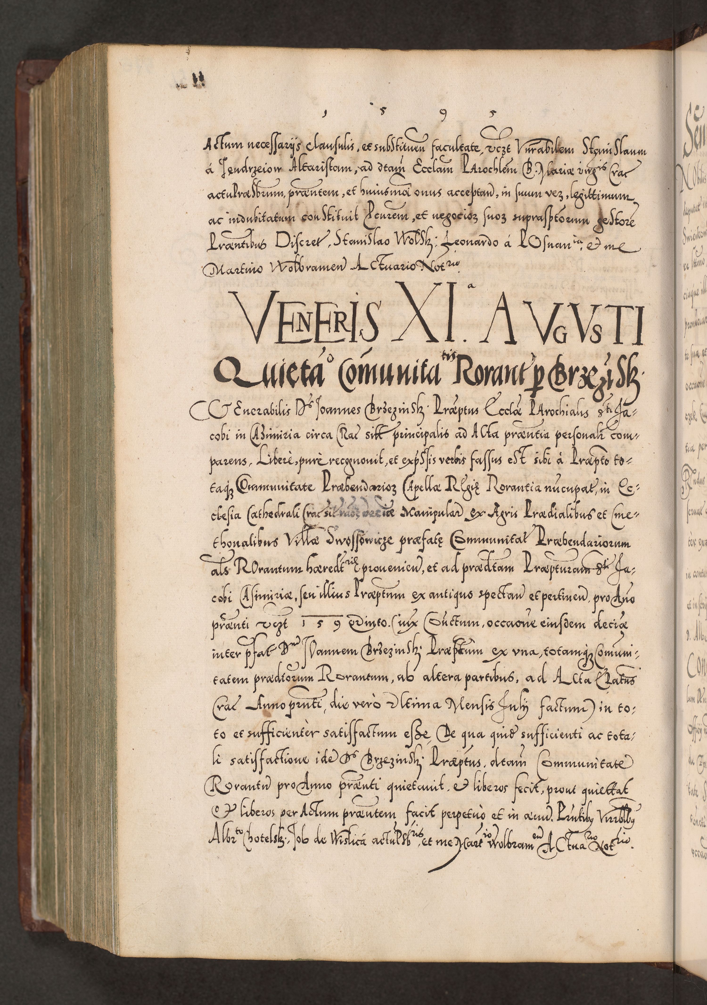 Illistrissimo et revedissimo in Christo Patre Domino Domino Georgio Rzadziwił Miserone Divina Sacrostae R. E. Tituli S. Sixti Presbitero Cardinali Duce in Olyka et Niesswiesz ad Gubernacula Ecclessiae Cracoviensis cuius administratorialem a Sancta Sede Apostolica obtinverat feliciter sedente. Acta actorum, causarum, sententiarum tam deffinitivarum quam interloquutoriarum decretorum, obligationum, quietationum, recognitionum, constitutionum procuratorum etc. coram Reverendo Domino Stanislao Crassinskz de Crasne Archidiacono Cracoviensis, Scholastico Gnesnesis, Custode Plocensis etc. Vicario et Officiali Generali Cracoviensi in Ano Domini Millesimo Quingentesimo Nonagesimo Primo cuius indictio quarta pontificatus SS. Domini Nostri Gregorii XIIII Anno I psius prio feliciter incipiut