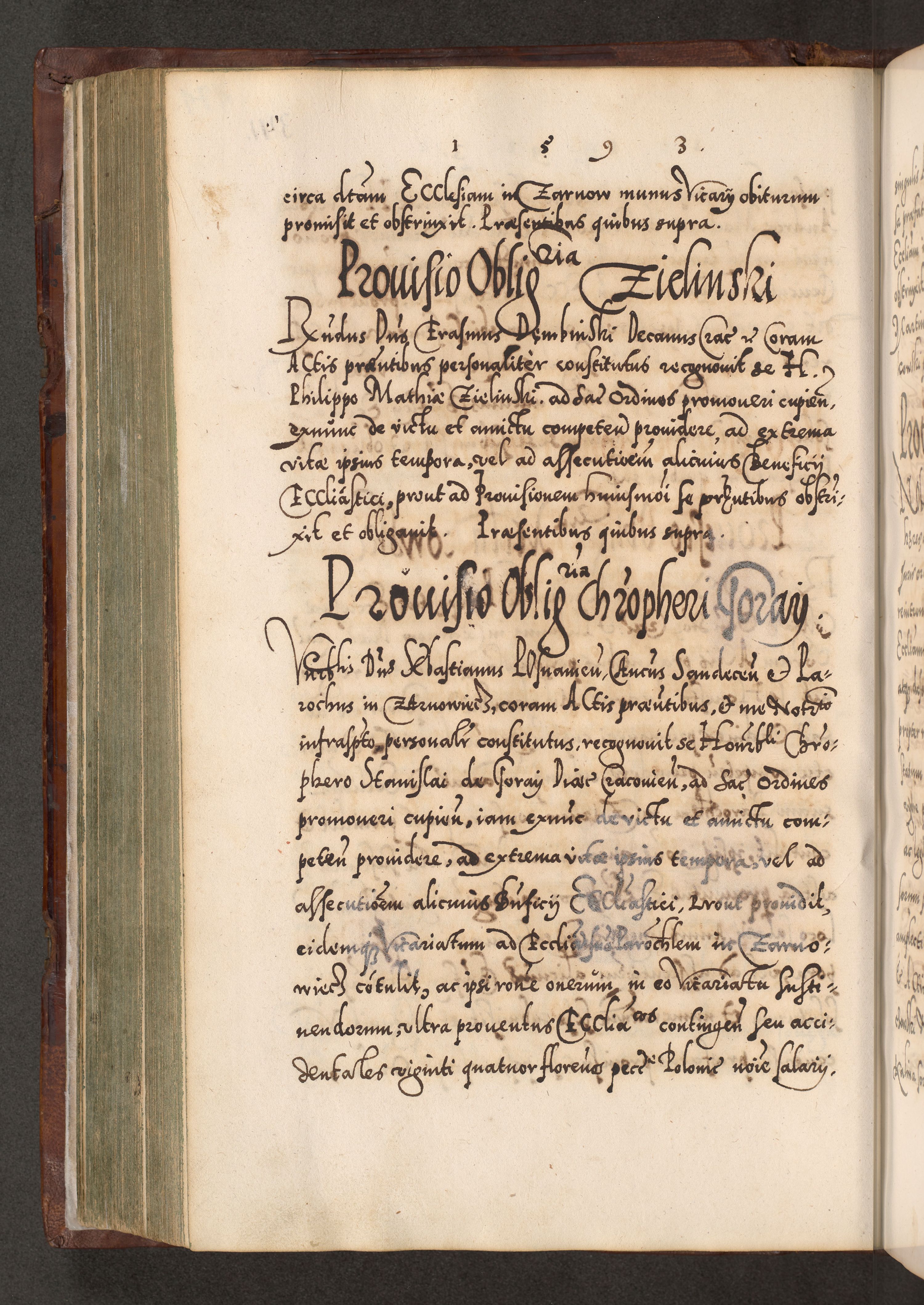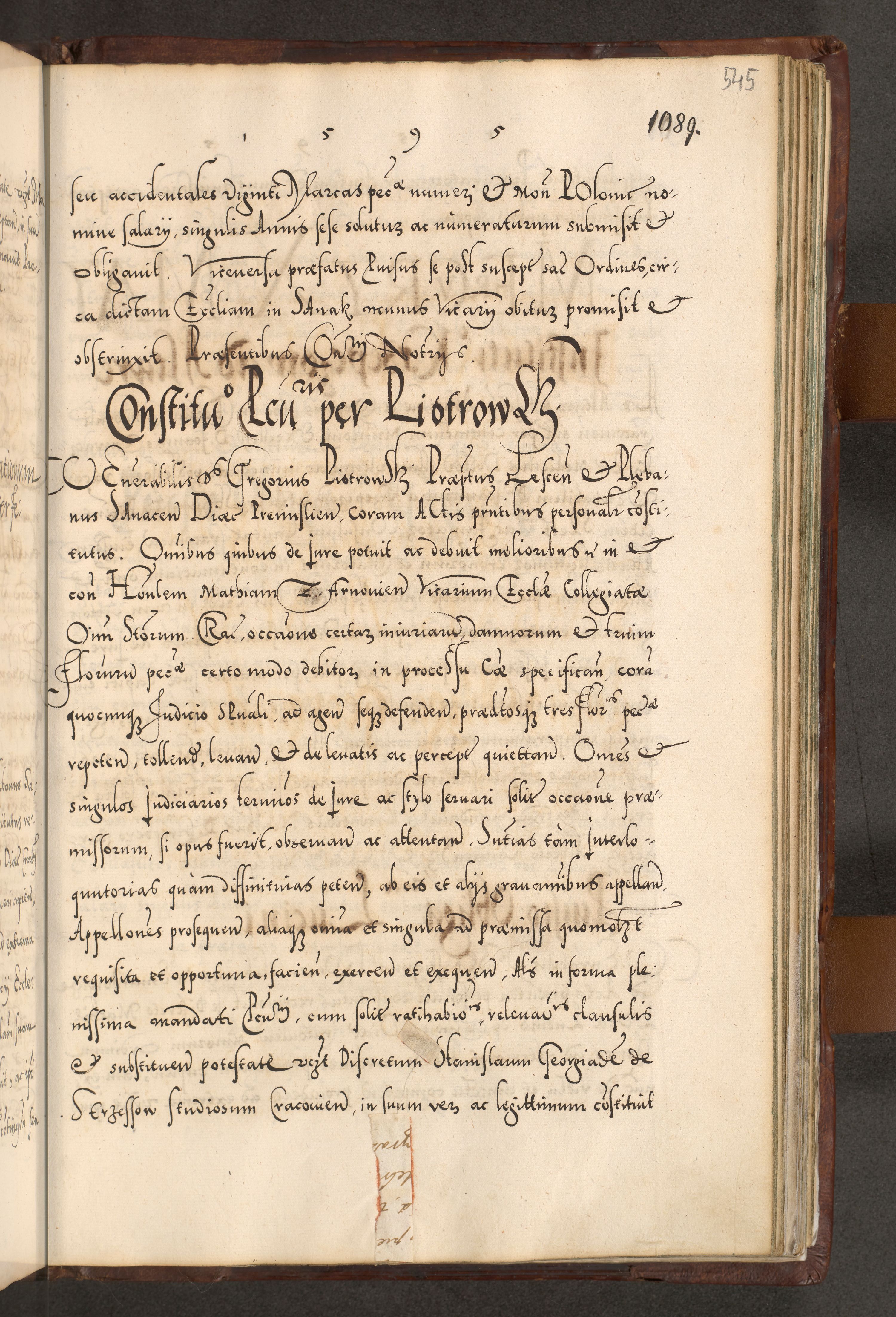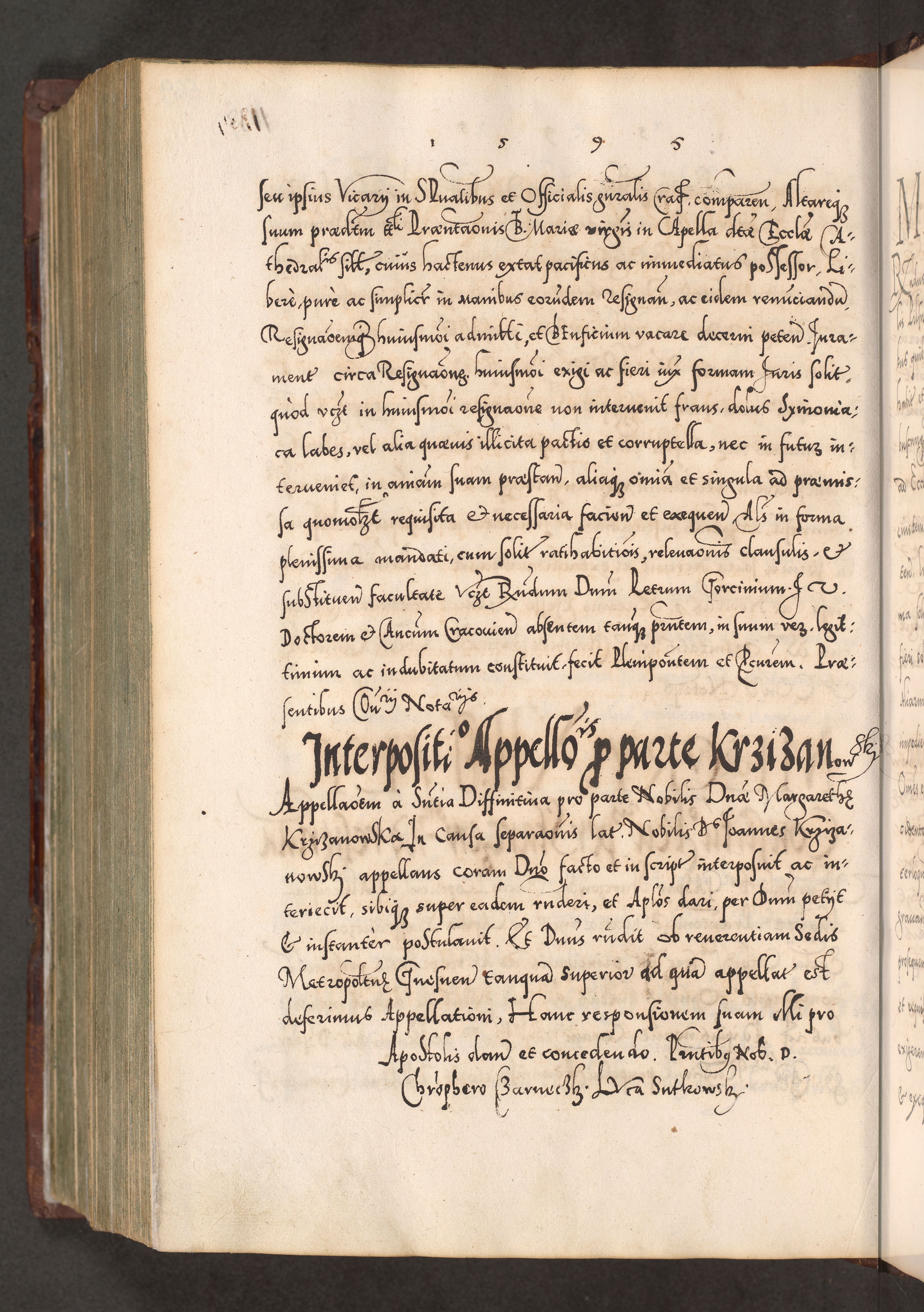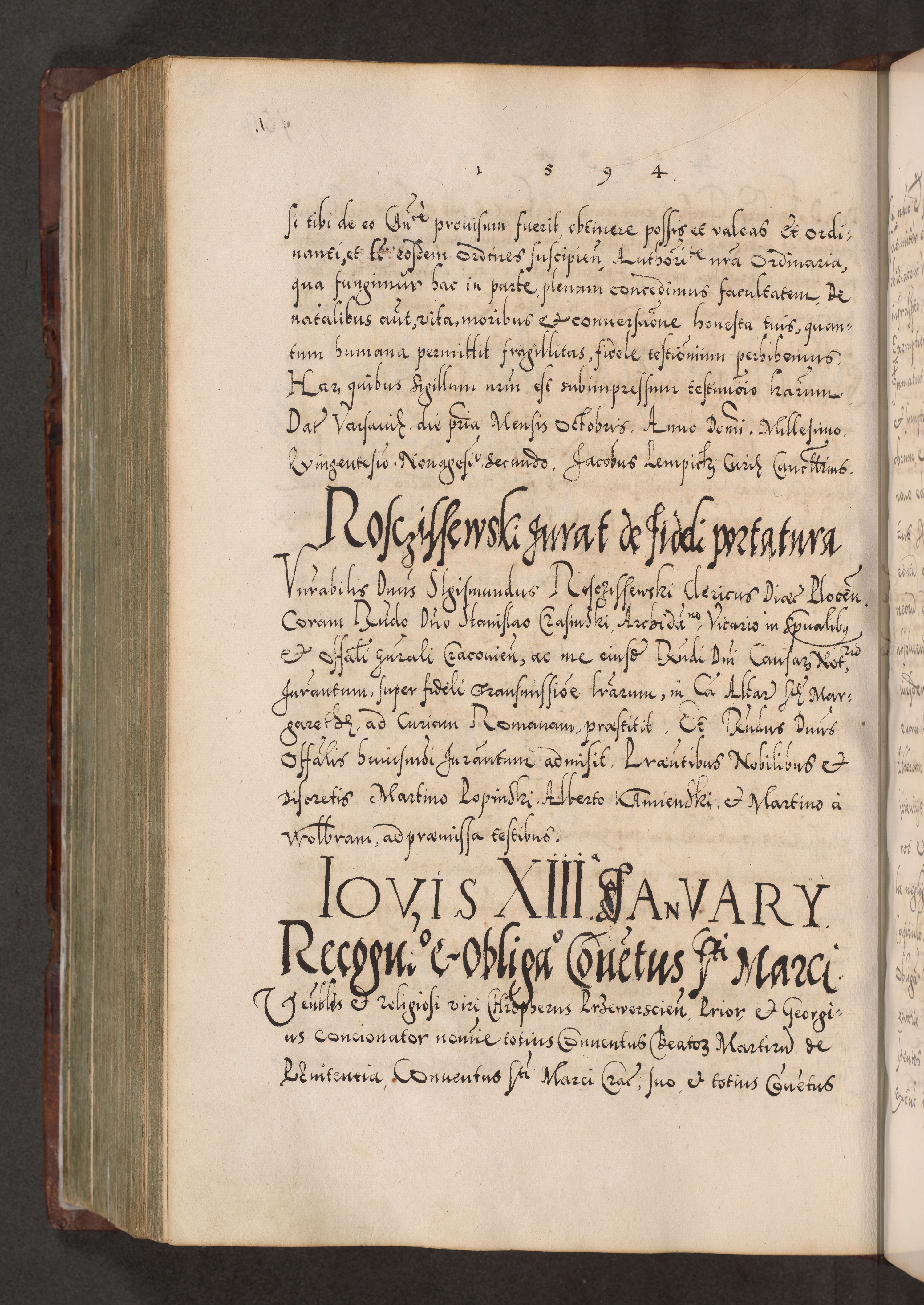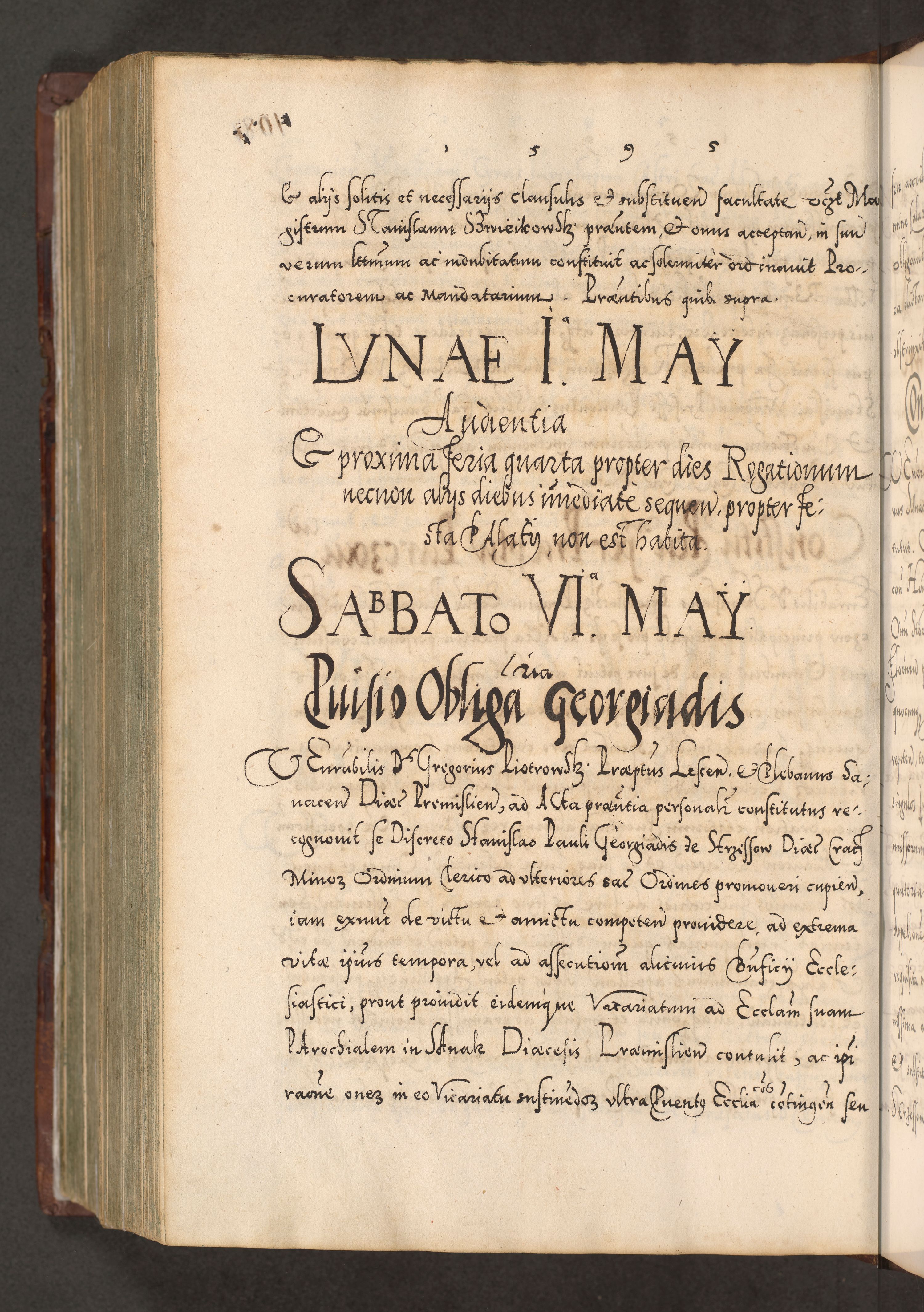 Illistrissimo et revedissimo in Christo Patre Domino Domino Georgio Rzadziwił Miserone Divina Sacrostae R. E. Tituli S. Sixti Presbitero Cardinali Duce in Olyka et Niesswiesz ad Gubernacula Ecclessiae Cracoviensis cuius administratorialem a Sancta Sede Apostolica obtinverat feliciter sedente. Acta actorum, causarum, sententiarum tam deffinitivarum quam interloquutoriarum decretorum, obligationum, quietationum, recognitionum, constitutionum procuratorum etc. coram Reverendo Domino Stanislao Crassinskz de Crasne Archidiacono Cracoviensis, Scholastico Gnesnesis, Custode Plocensis etc. Vicario et Officiali Generali Cracoviensi in Ano Domini Millesimo Quingentesimo Nonagesimo Primo cuius indictio quarta pontificatus SS. Domini Nostri Gregorii XIIII Anno I psius prio feliciter incipiut