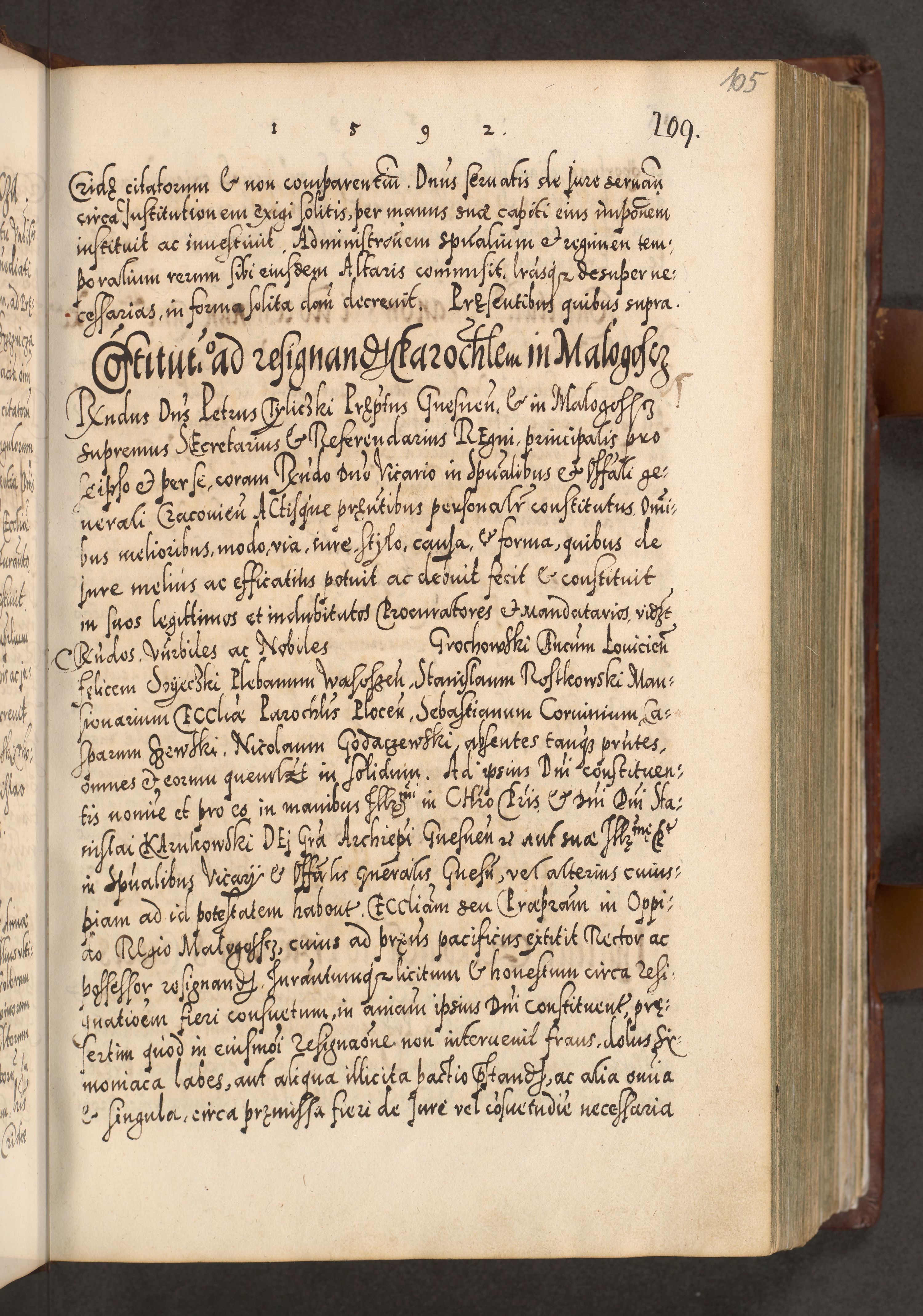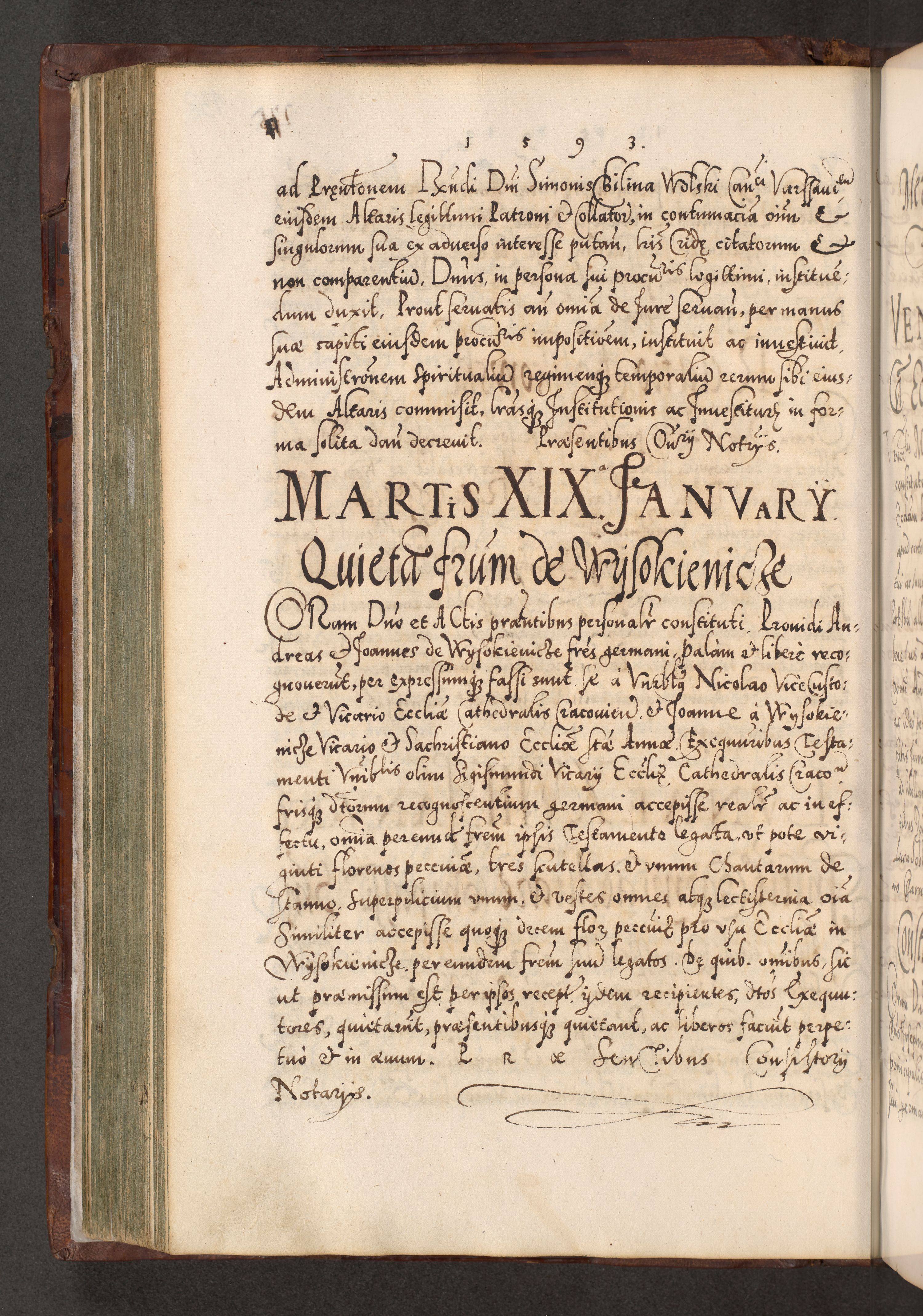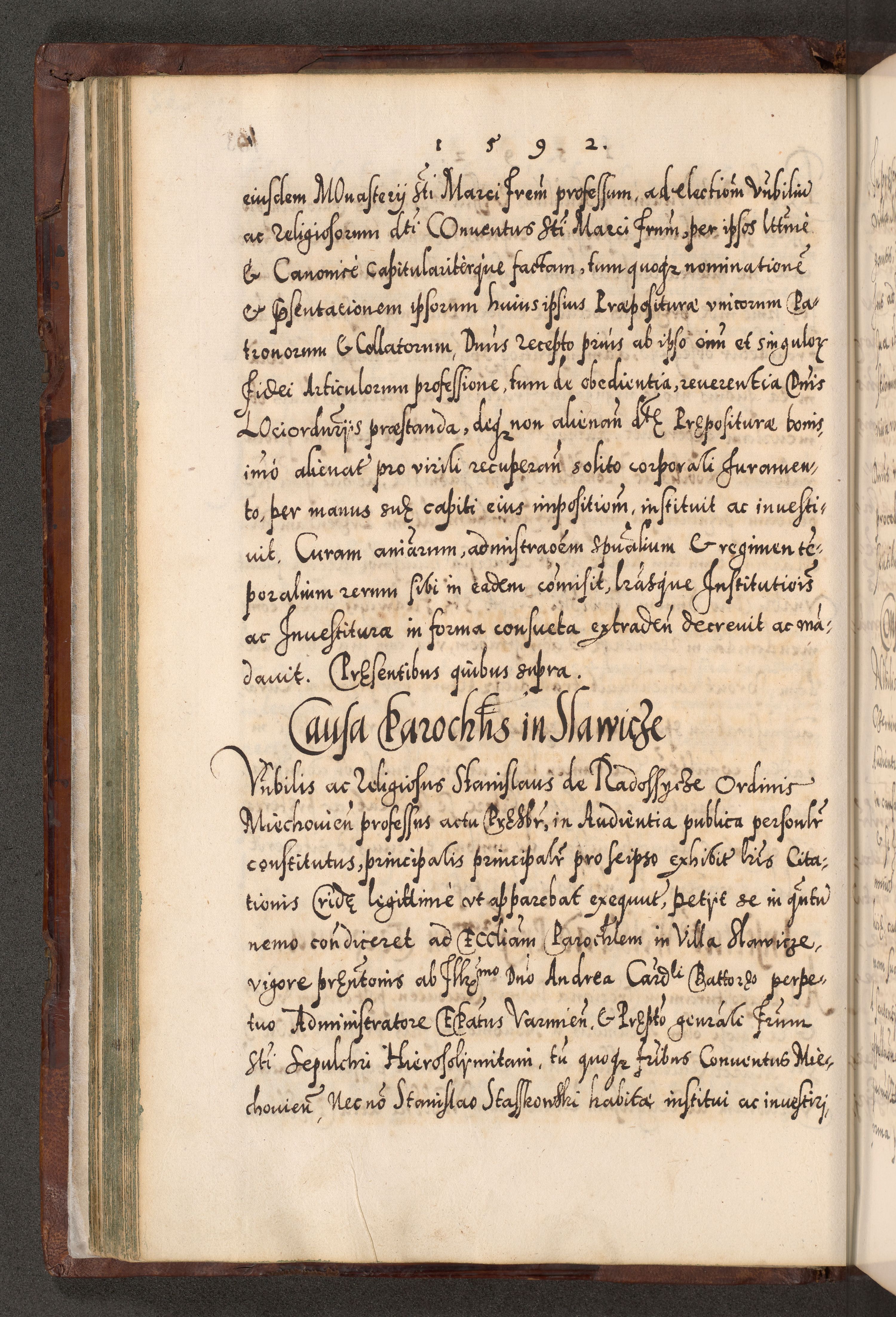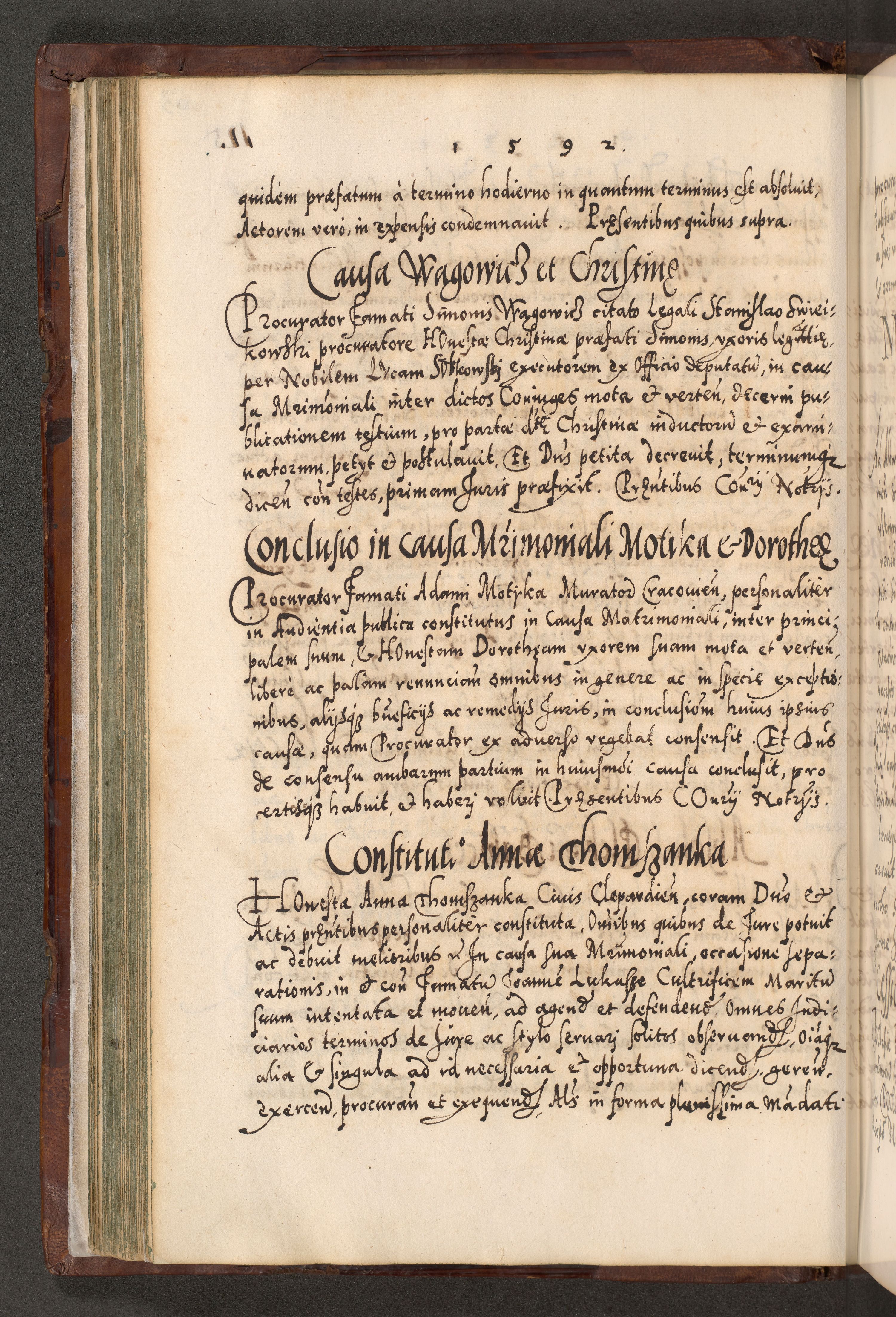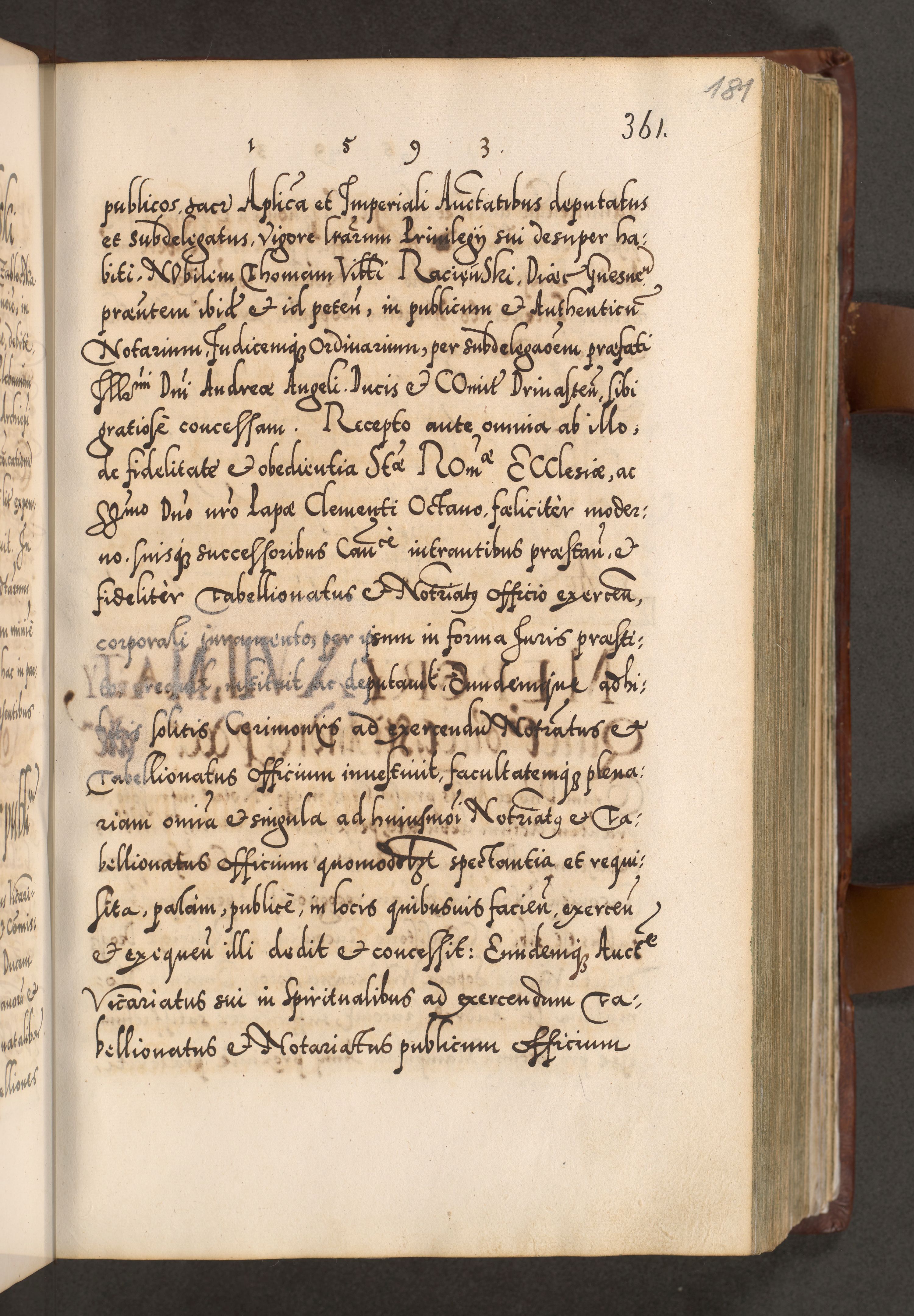 Illistrissimo et revedissimo in Christo Patre Domino Domino Georgio Rzadziwił Miserone Divina Sacrostae R. E. Tituli S. Sixti Presbitero Cardinali Duce in Olyka et Niesswiesz ad Gubernacula Ecclessiae Cracoviensis cuius administratorialem a Sancta Sede Apostolica obtinverat feliciter sedente. Acta actorum, causarum, sententiarum tam deffinitivarum quam interloquutoriarum decretorum, obligationum, quietationum, recognitionum, constitutionum procuratorum etc. coram Reverendo Domino Stanislao Crassinskz de Crasne Archidiacono Cracoviensis, Scholastico Gnesnesis, Custode Plocensis etc. Vicario et Officiali Generali Cracoviensi in Ano Domini Millesimo Quingentesimo Nonagesimo Primo cuius indictio quarta pontificatus SS. Domini Nostri Gregorii XIIII Anno I psius prio feliciter incipiut