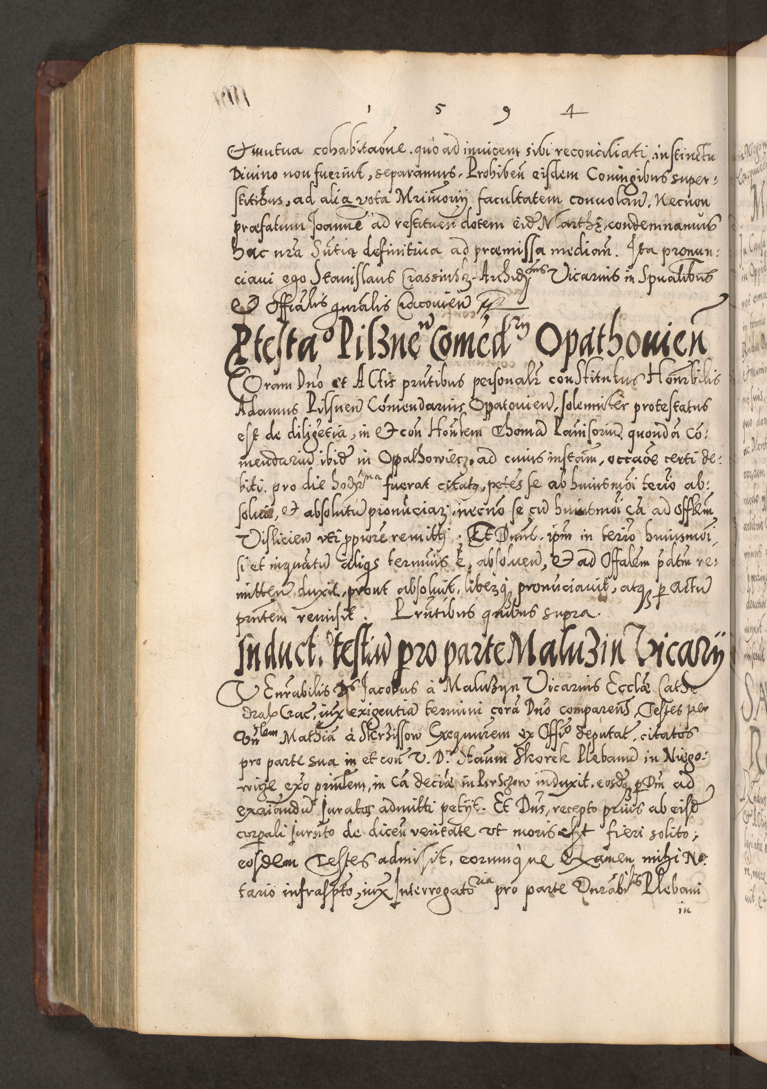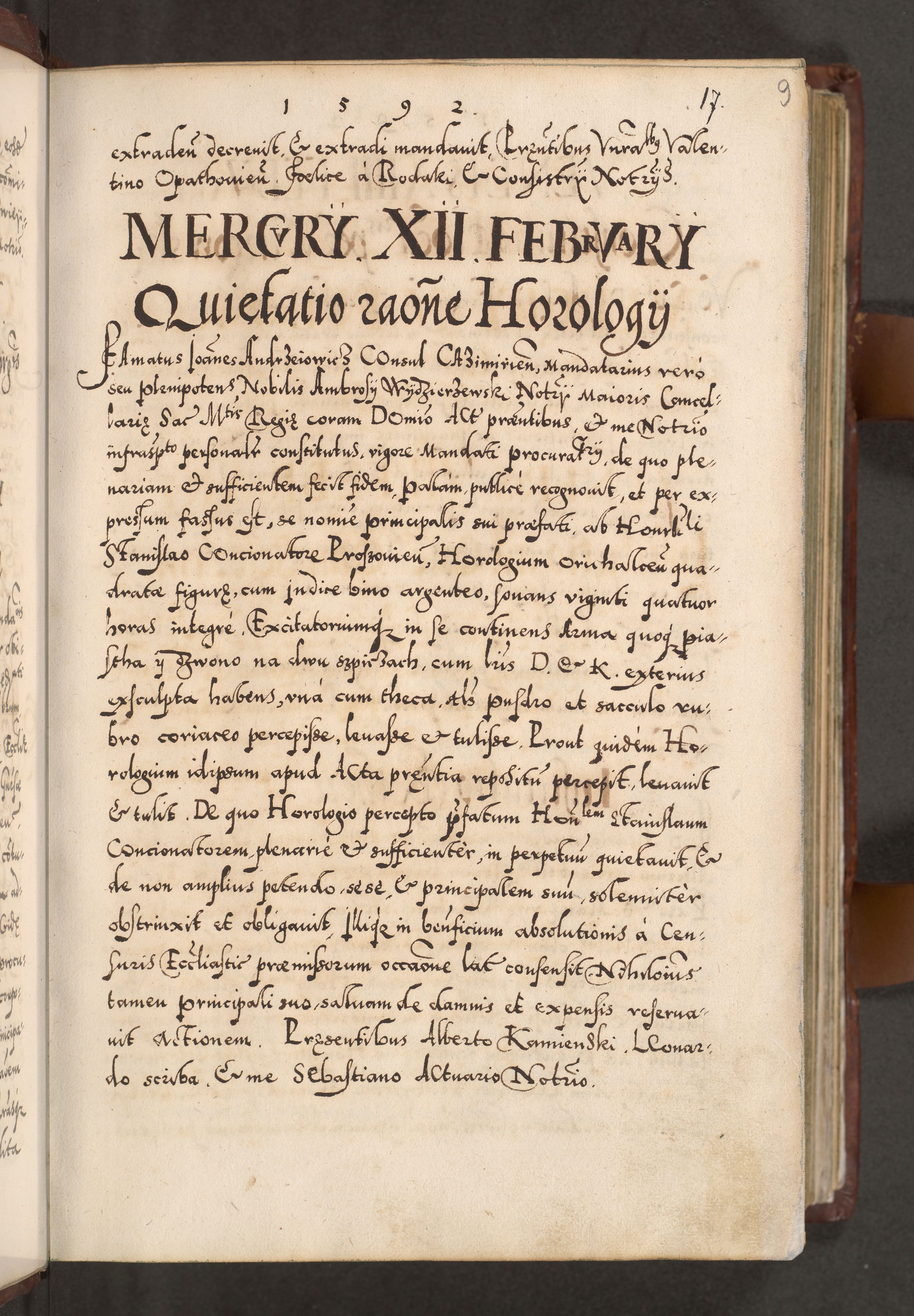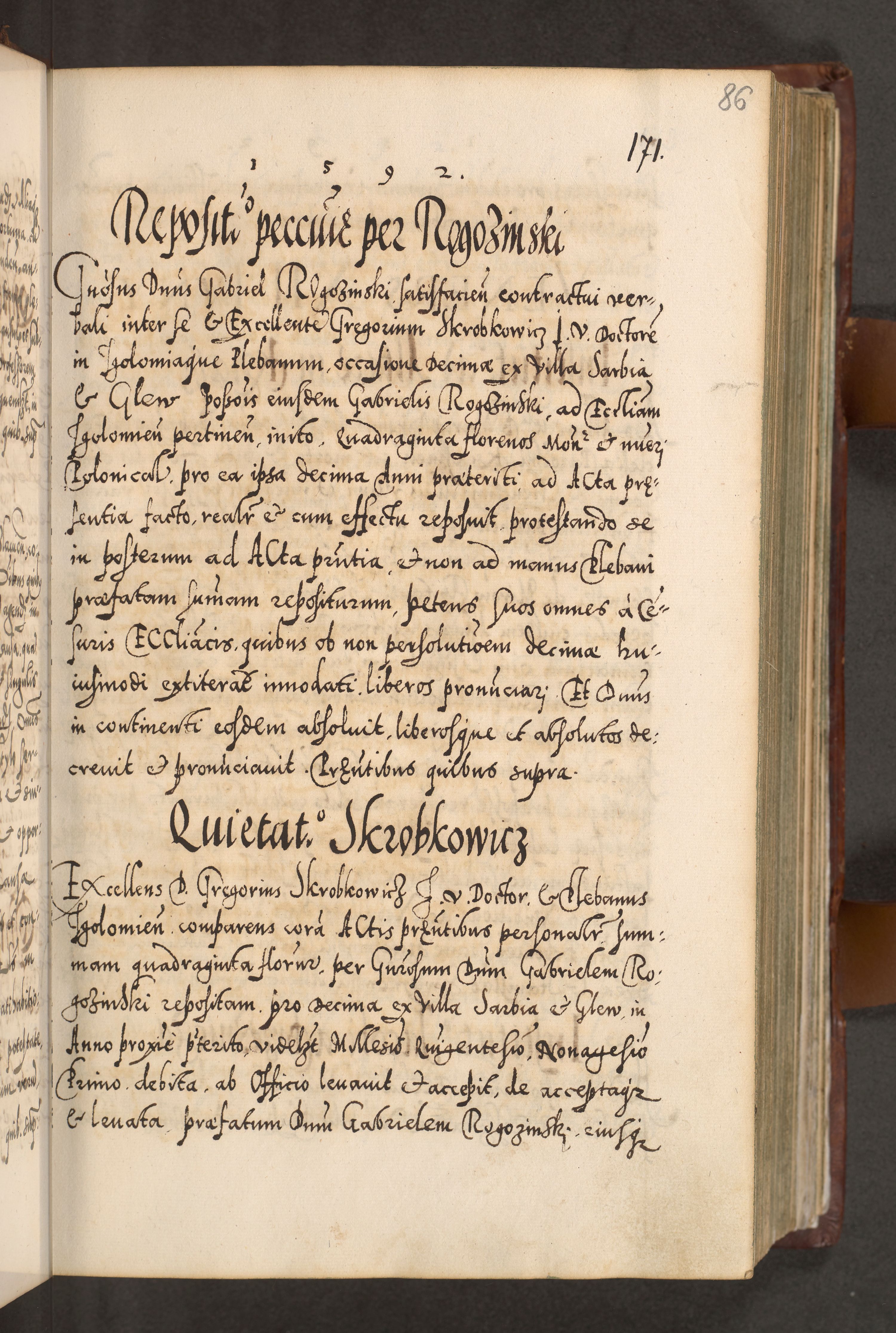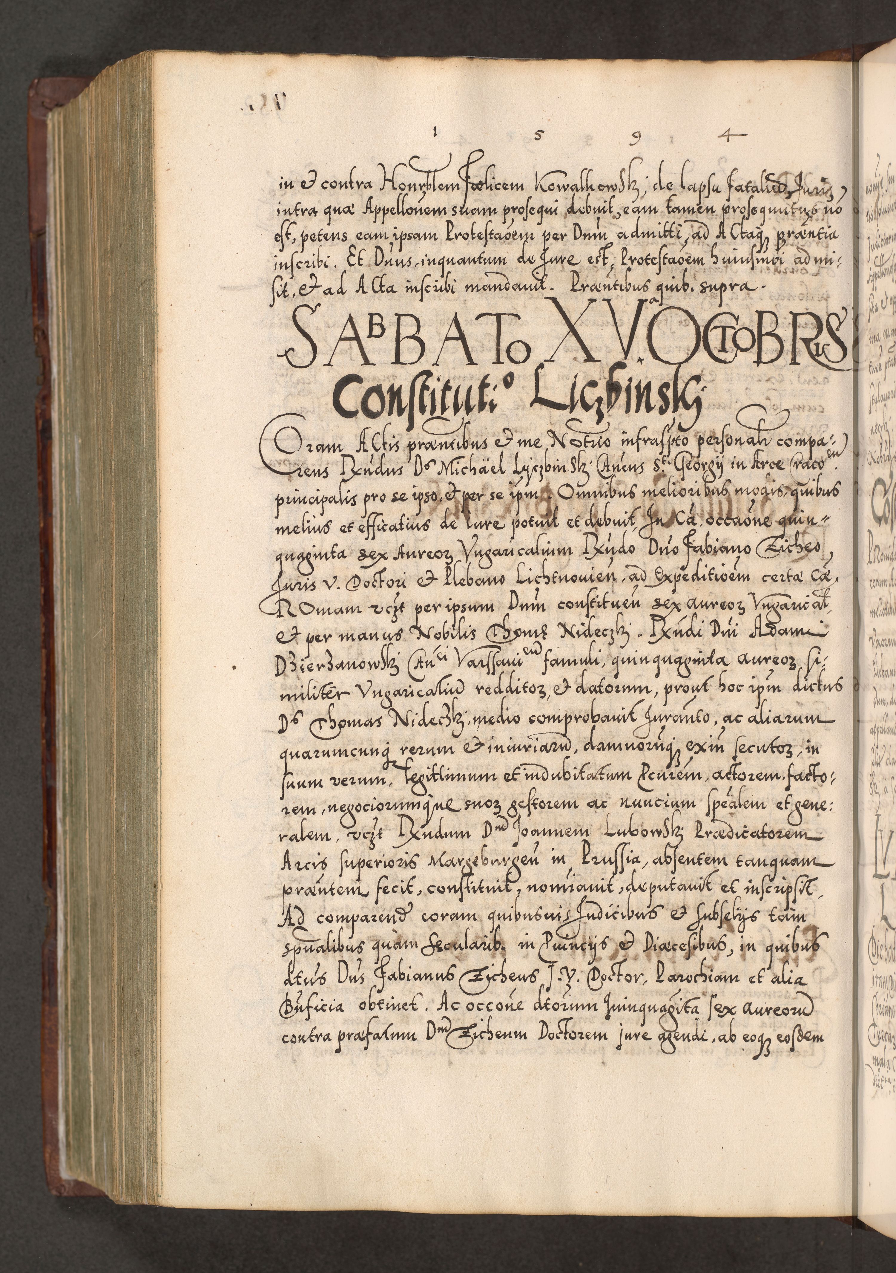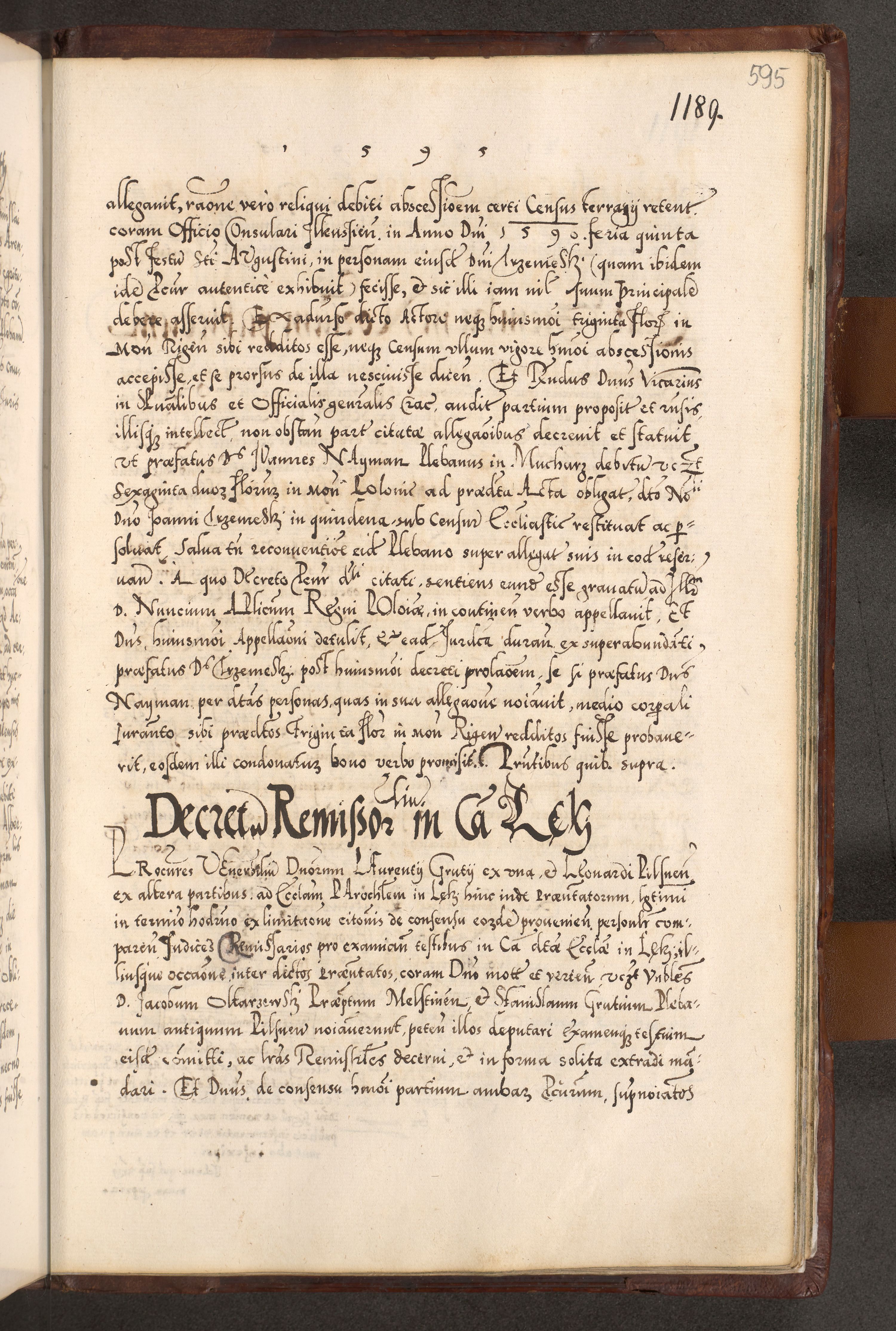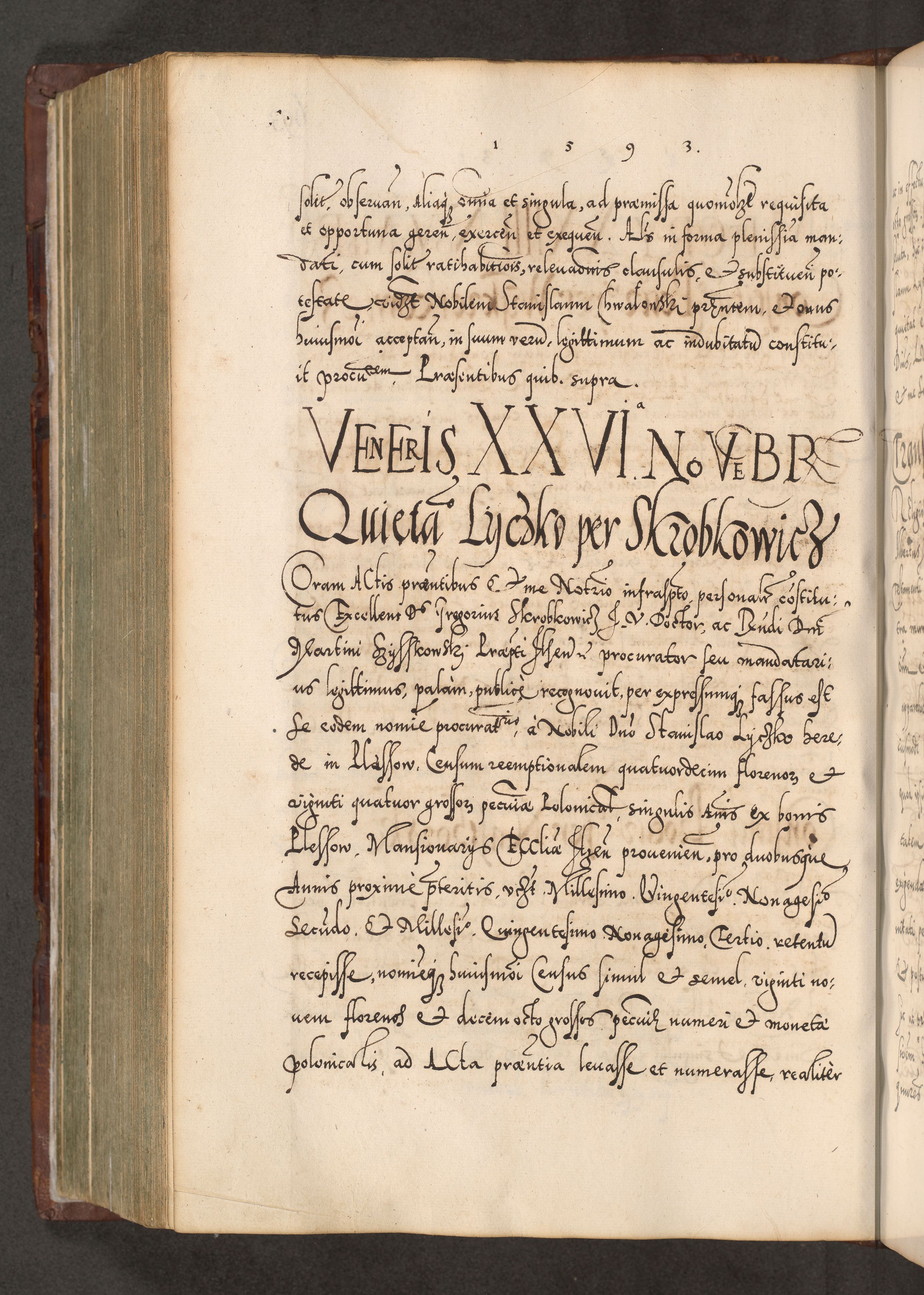 Illistrissimo et revedissimo in Christo Patre Domino Domino Georgio Rzadziwił Miserone Divina Sacrostae R. E. Tituli S. Sixti Presbitero Cardinali Duce in Olyka et Niesswiesz ad Gubernacula Ecclessiae Cracoviensis cuius administratorialem a Sancta Sede Apostolica obtinverat feliciter sedente. Acta actorum, causarum, sententiarum tam deffinitivarum quam interloquutoriarum decretorum, obligationum, quietationum, recognitionum, constitutionum procuratorum etc. coram Reverendo Domino Stanislao Crassinskz de Crasne Archidiacono Cracoviensis, Scholastico Gnesnesis, Custode Plocensis etc. Vicario et Officiali Generali Cracoviensi in Ano Domini Millesimo Quingentesimo Nonagesimo Primo cuius indictio quarta pontificatus SS. Domini Nostri Gregorii XIIII Anno I psius prio feliciter incipiut