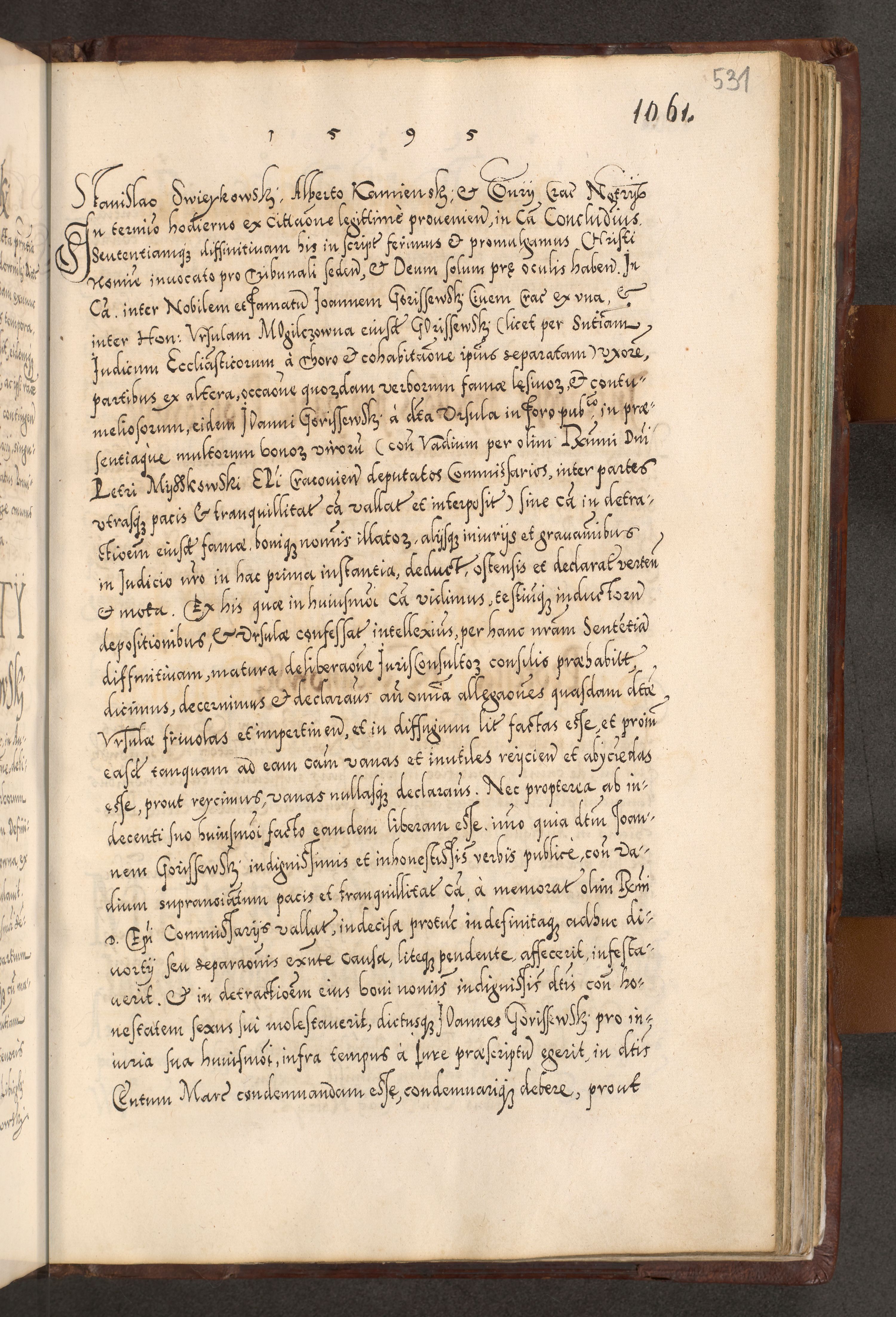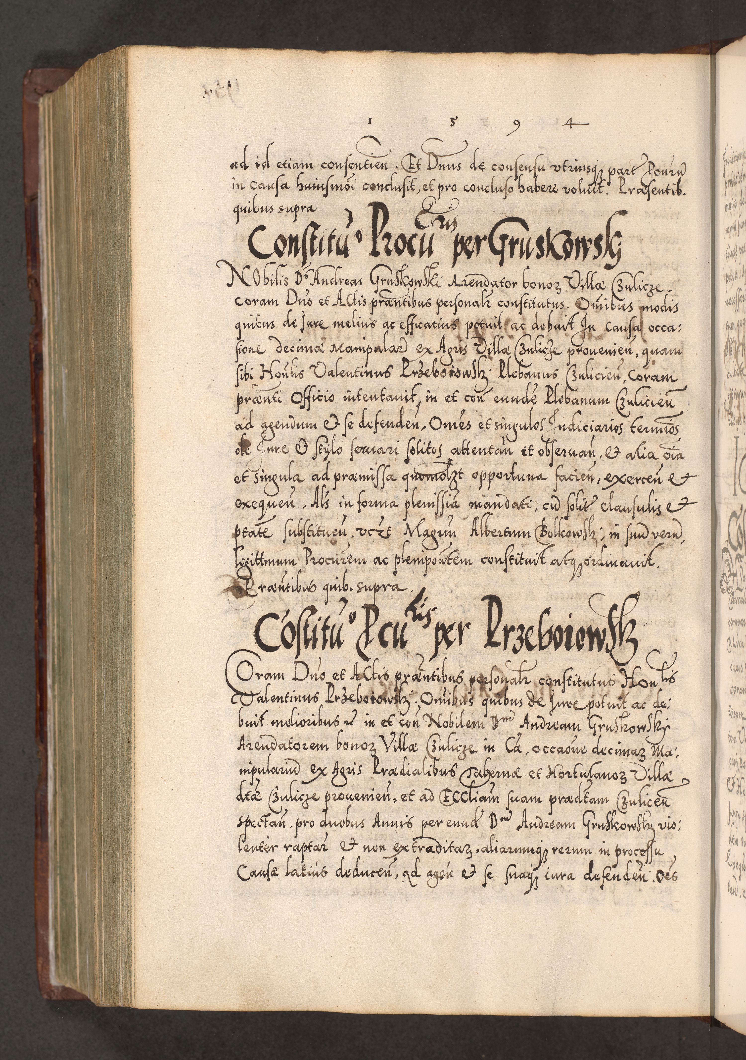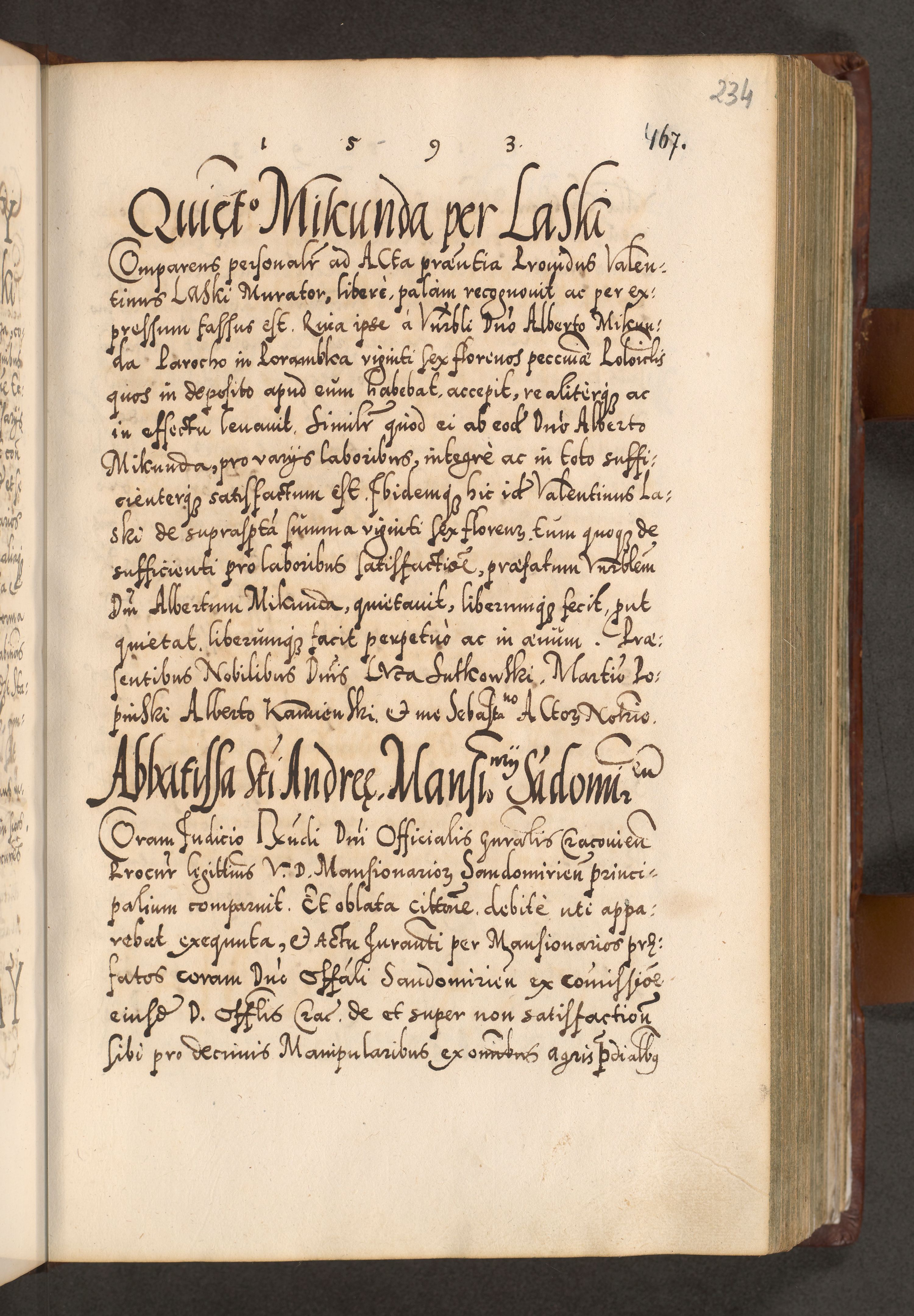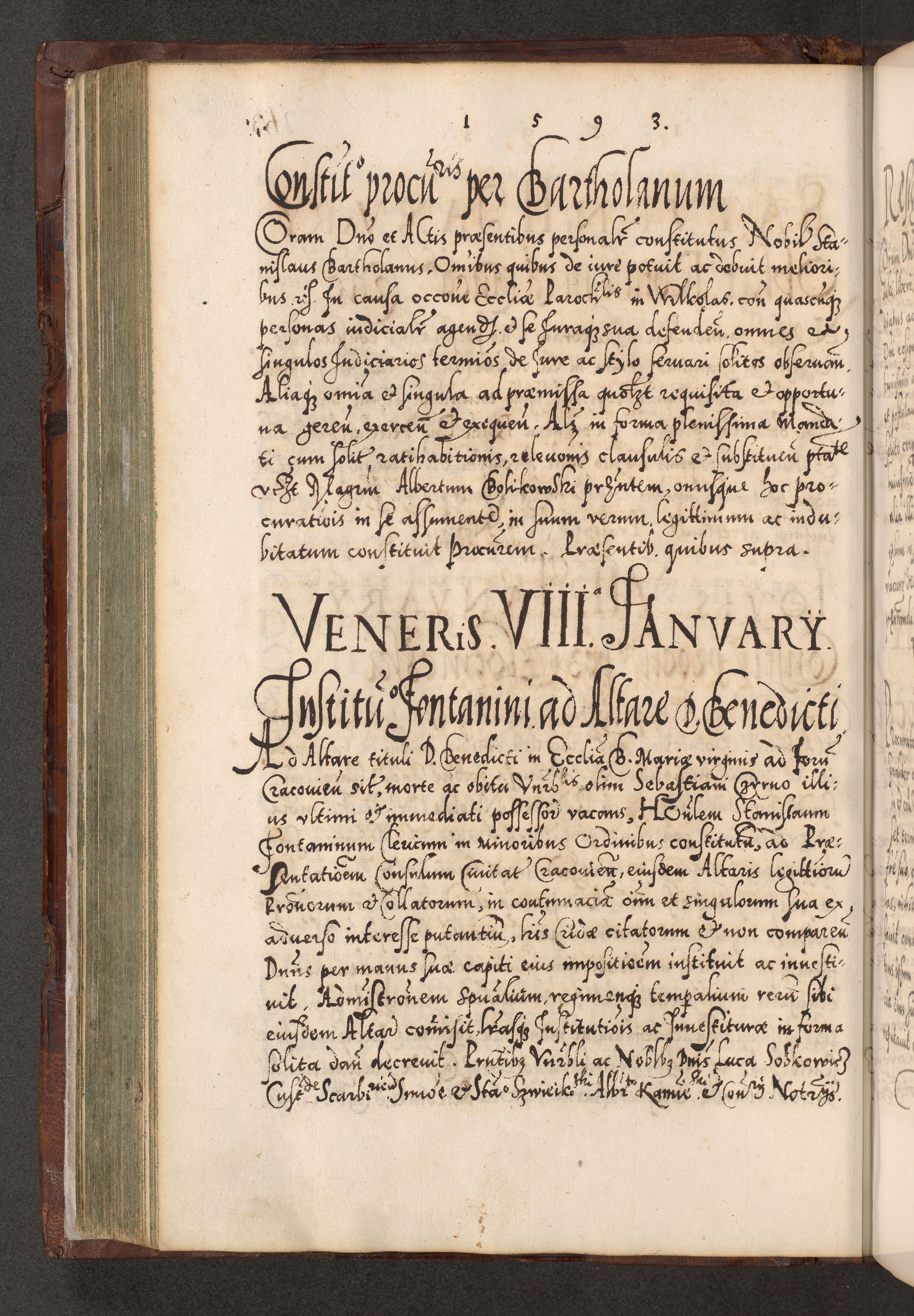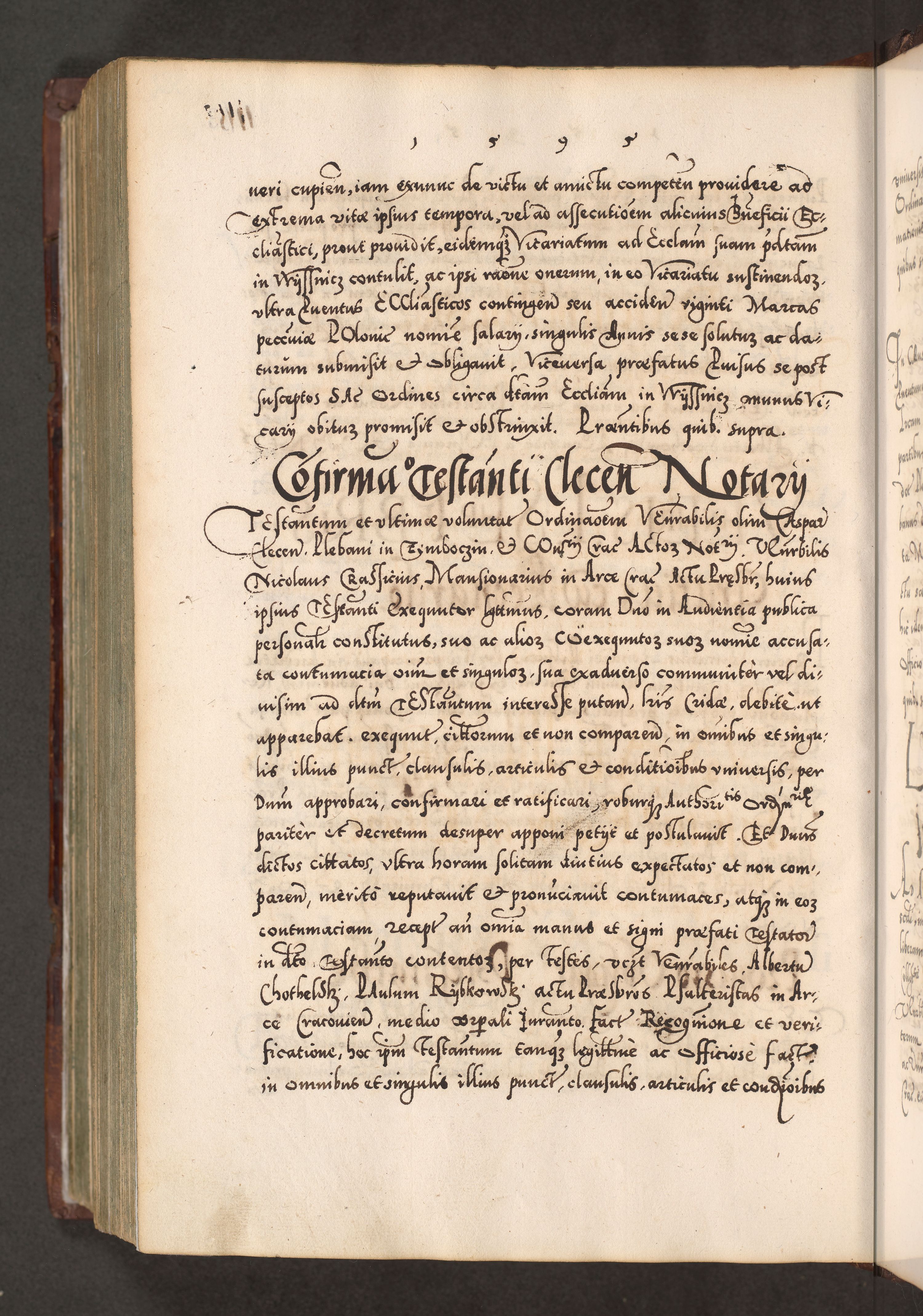 Illistrissimo et revedissimo in Christo Patre Domino Domino Georgio Rzadziwił Miserone Divina Sacrostae R. E. Tituli S. Sixti Presbitero Cardinali Duce in Olyka et Niesswiesz ad Gubernacula Ecclessiae Cracoviensis cuius administratorialem a Sancta Sede Apostolica obtinverat feliciter sedente. Acta actorum, causarum, sententiarum tam deffinitivarum quam interloquutoriarum decretorum, obligationum, quietationum, recognitionum, constitutionum procuratorum etc. coram Reverendo Domino Stanislao Crassinskz de Crasne Archidiacono Cracoviensis, Scholastico Gnesnesis, Custode Plocensis etc. Vicario et Officiali Generali Cracoviensi in Ano Domini Millesimo Quingentesimo Nonagesimo Primo cuius indictio quarta pontificatus SS. Domini Nostri Gregorii XIIII Anno I psius prio feliciter incipiut