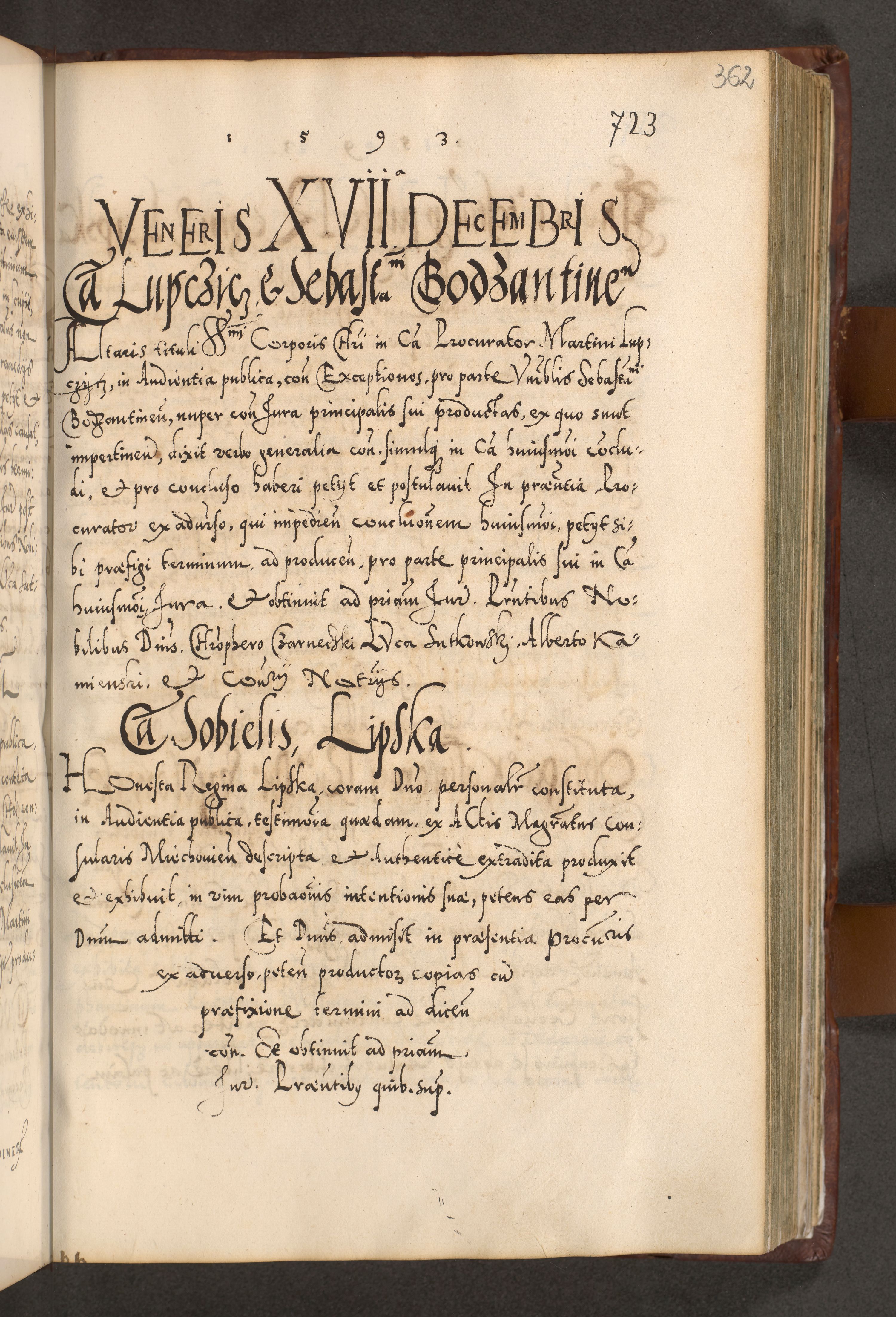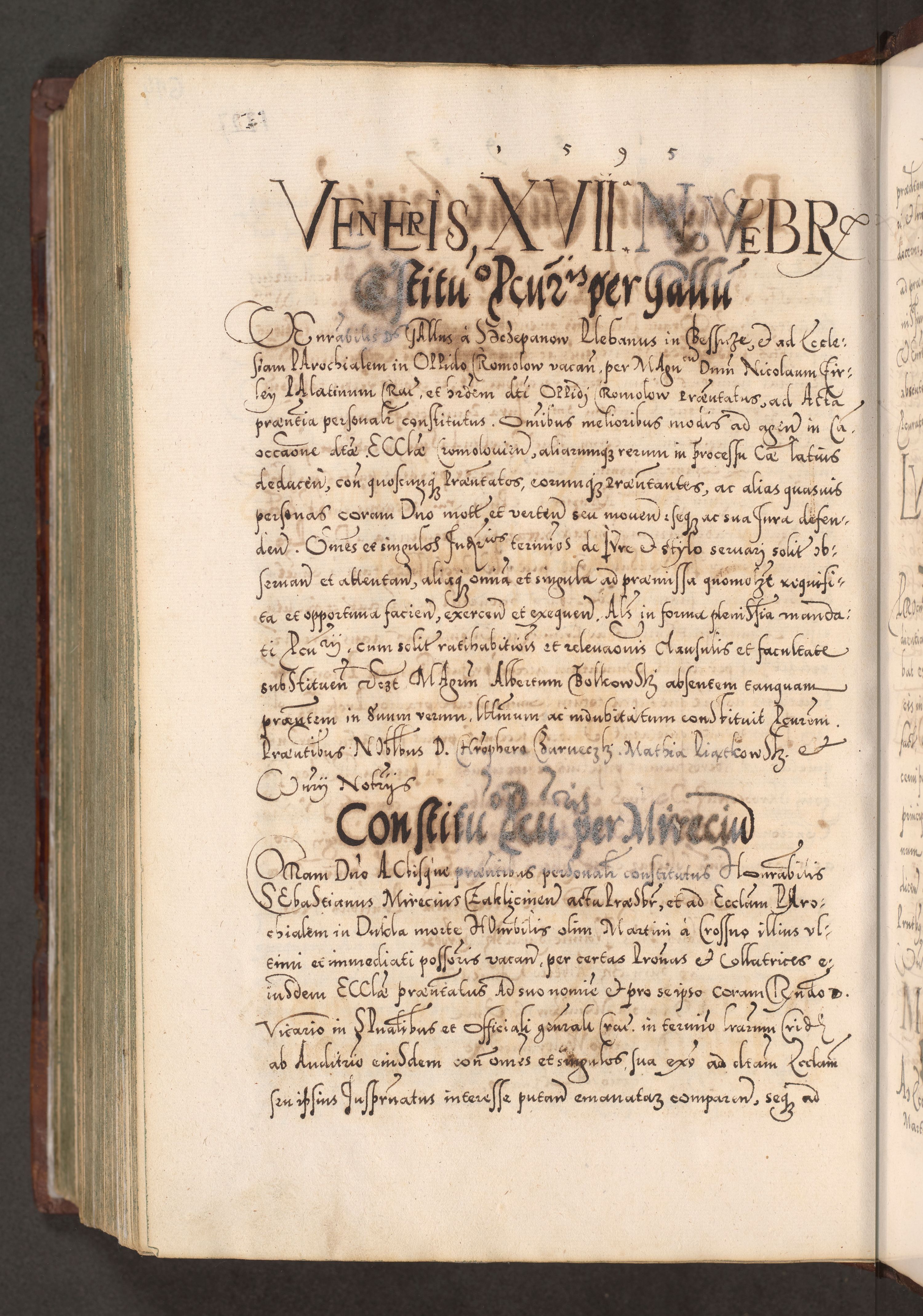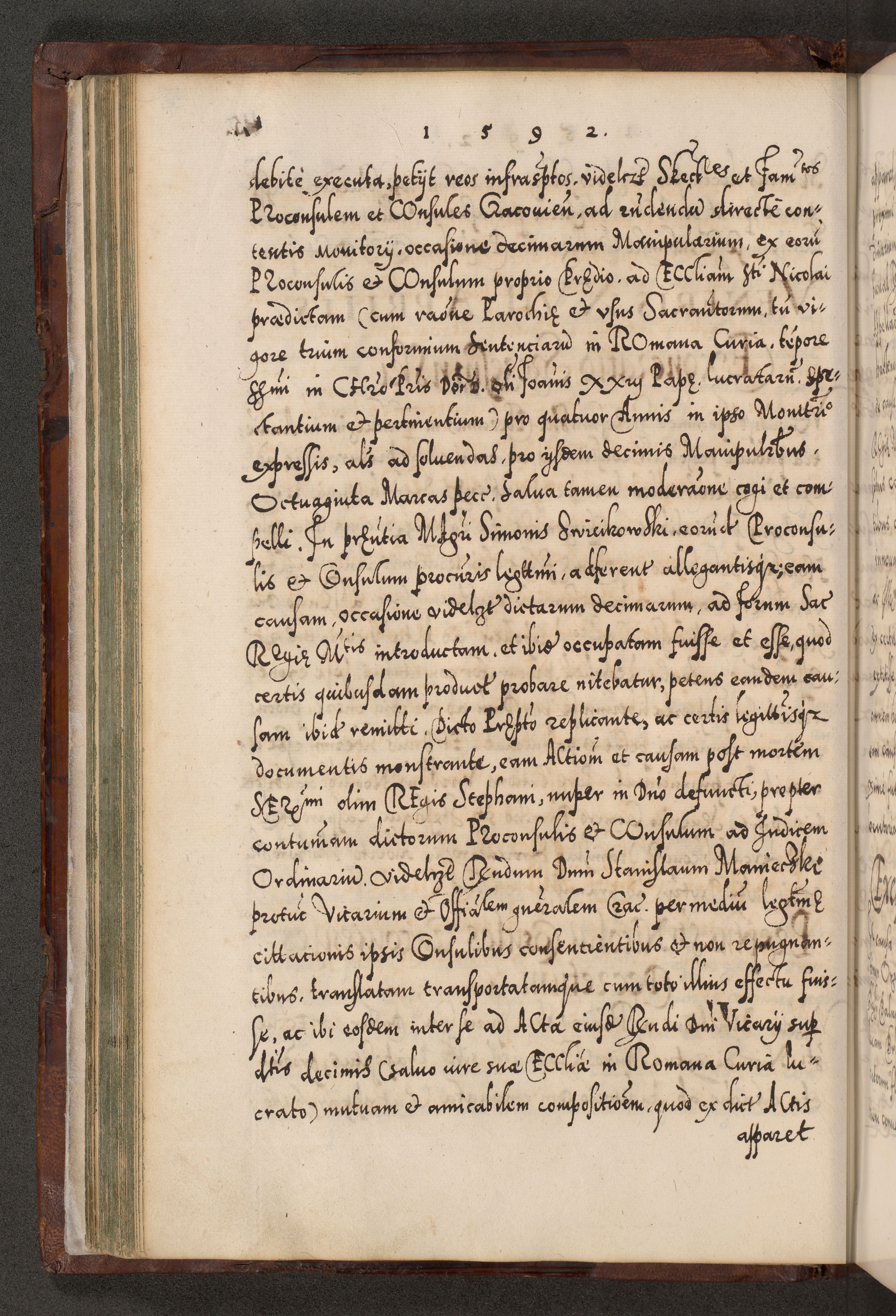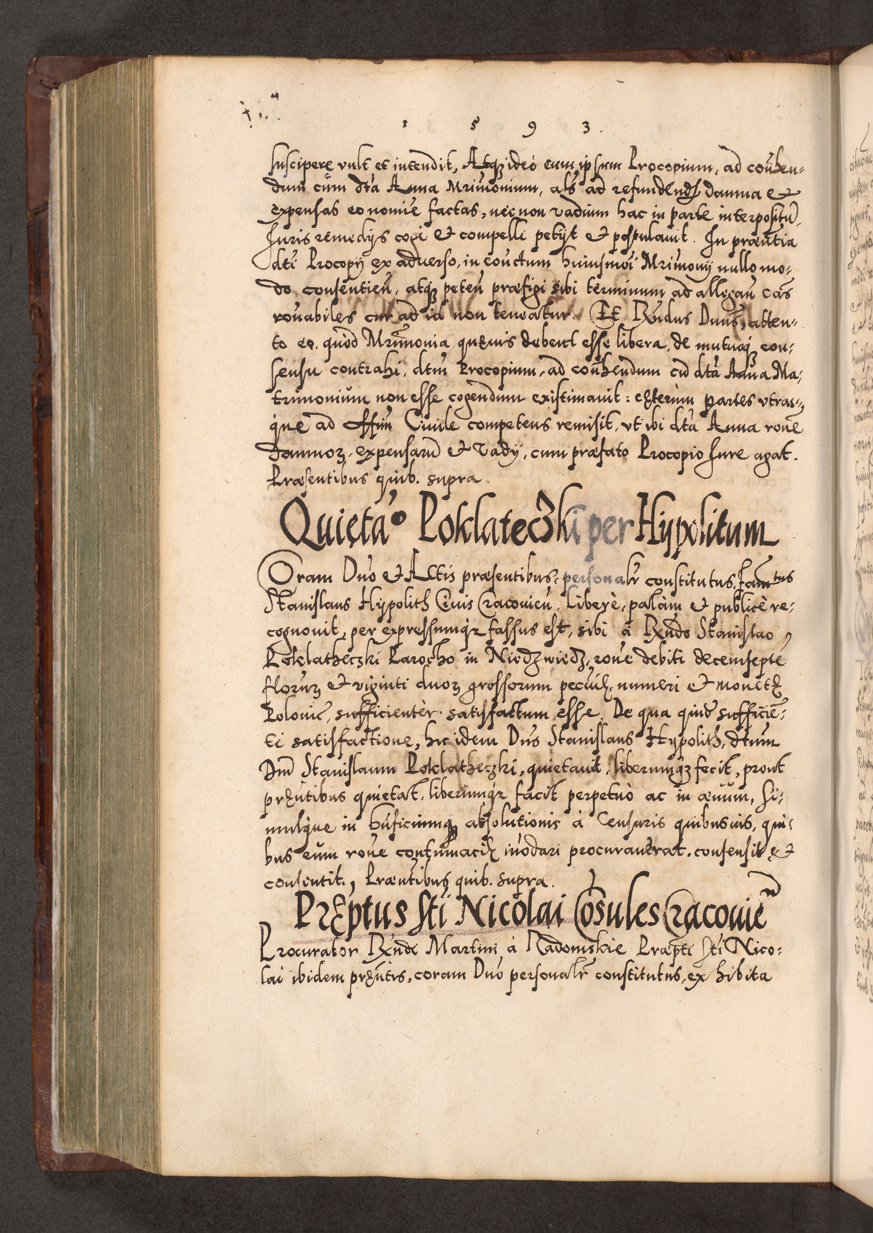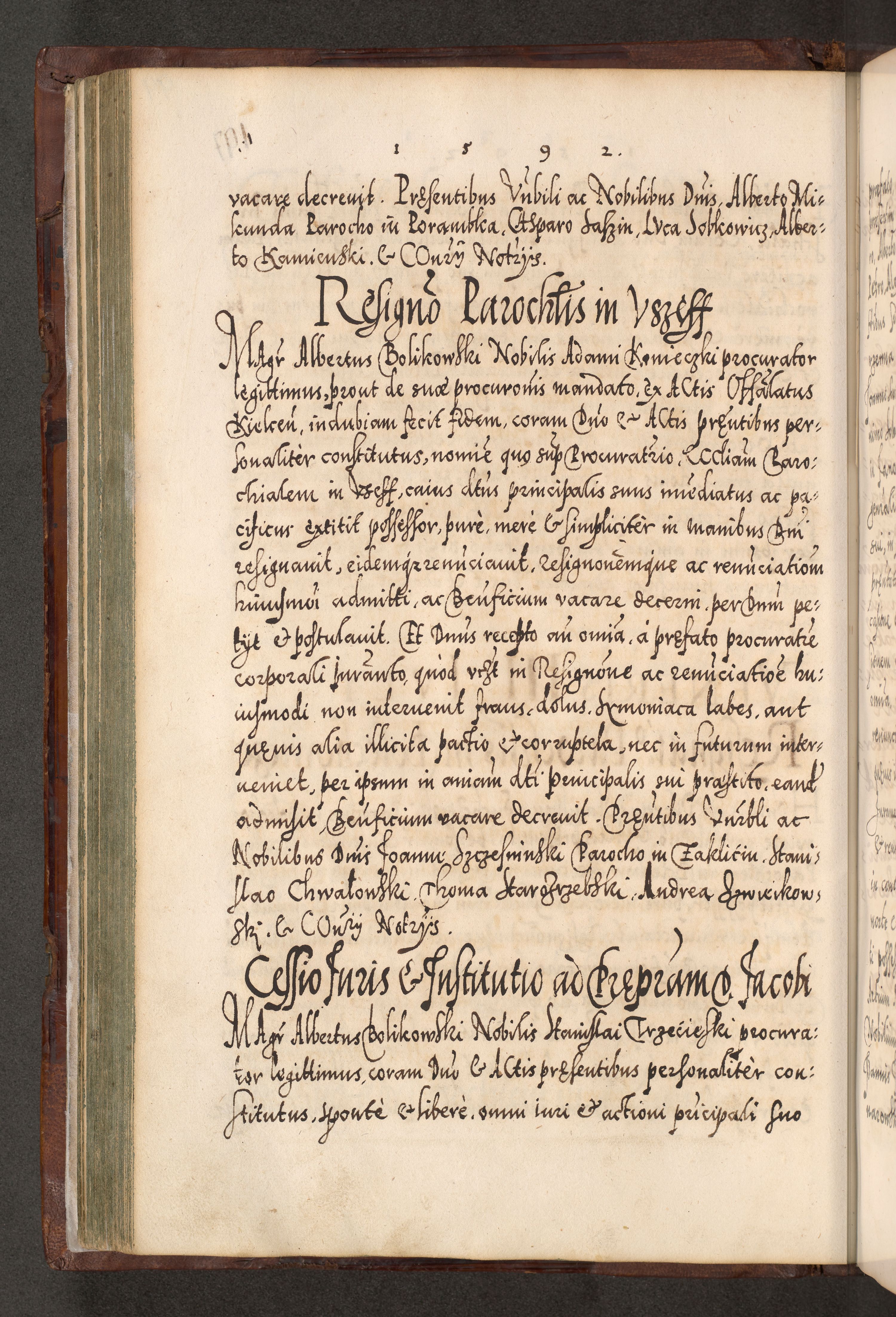 Illistrissimo et revedissimo in Christo Patre Domino Domino Georgio Rzadziwił Miserone Divina Sacrostae R. E. Tituli S. Sixti Presbitero Cardinali Duce in Olyka et Niesswiesz ad Gubernacula Ecclessiae Cracoviensis cuius administratorialem a Sancta Sede Apostolica obtinverat feliciter sedente. Acta actorum, causarum, sententiarum tam deffinitivarum quam interloquutoriarum decretorum, obligationum, quietationum, recognitionum, constitutionum procuratorum etc. coram Reverendo Domino Stanislao Crassinskz de Crasne Archidiacono Cracoviensis, Scholastico Gnesnesis, Custode Plocensis etc. Vicario et Officiali Generali Cracoviensi in Ano Domini Millesimo Quingentesimo Nonagesimo Primo cuius indictio quarta pontificatus SS. Domini Nostri Gregorii XIIII Anno I psius prio feliciter incipiut