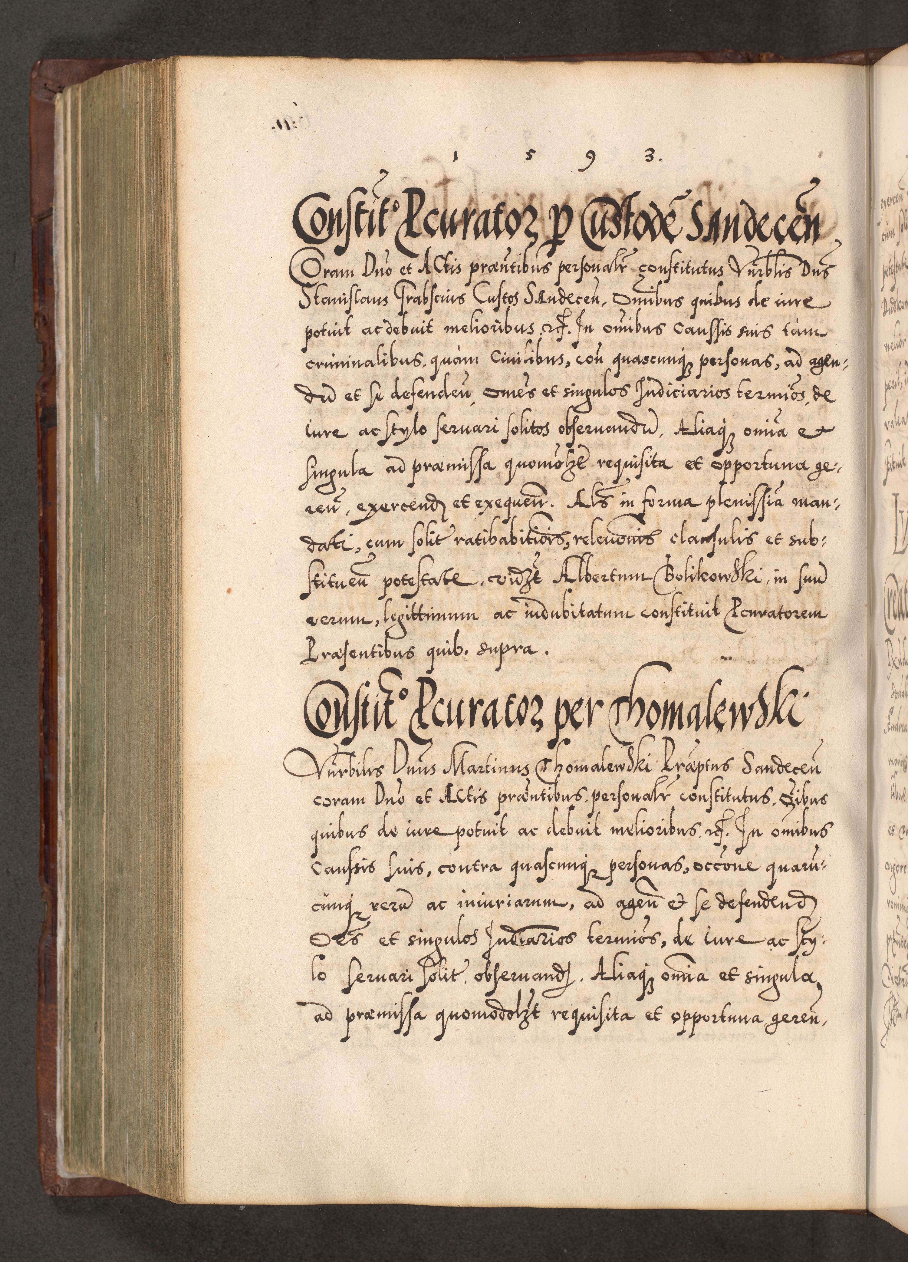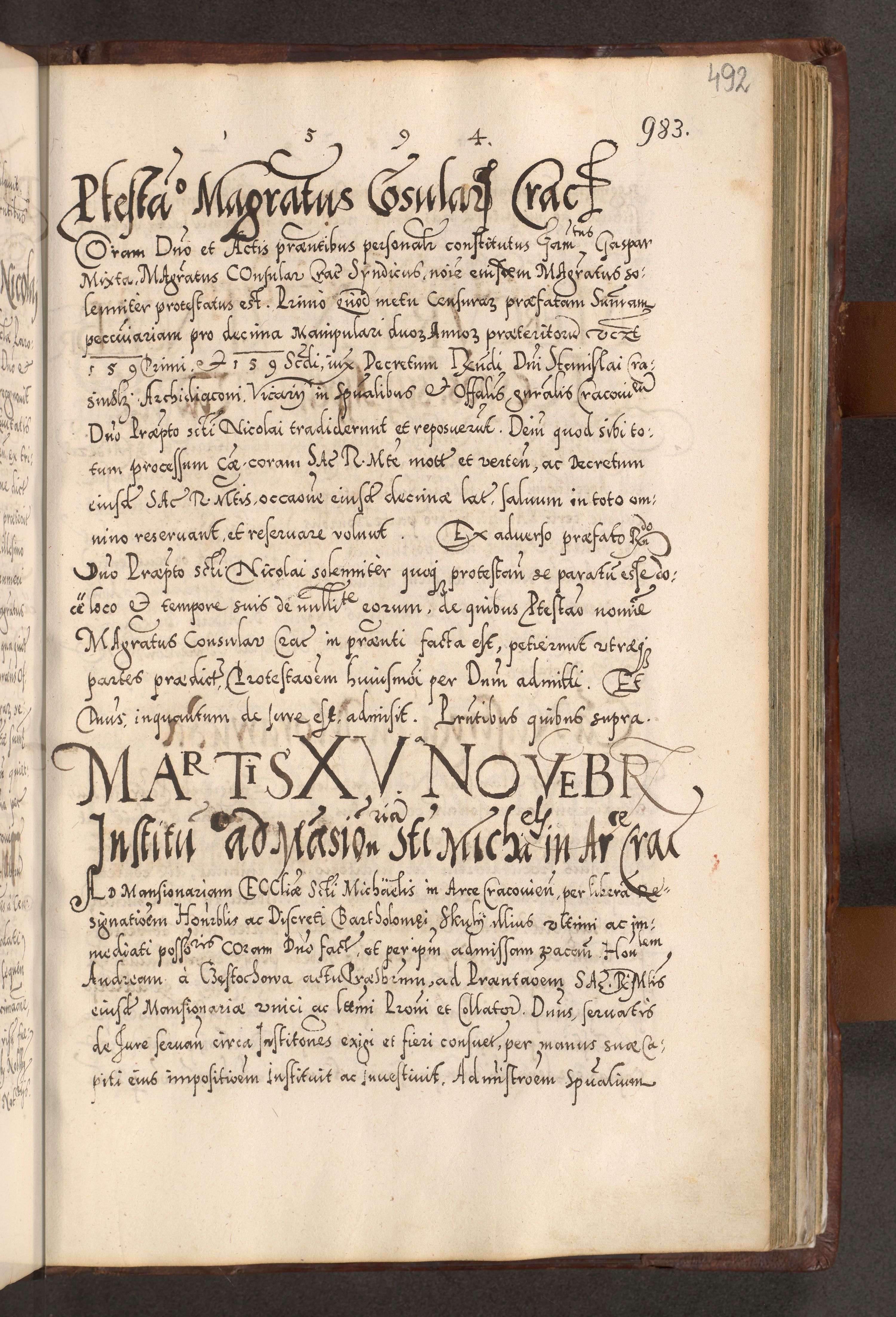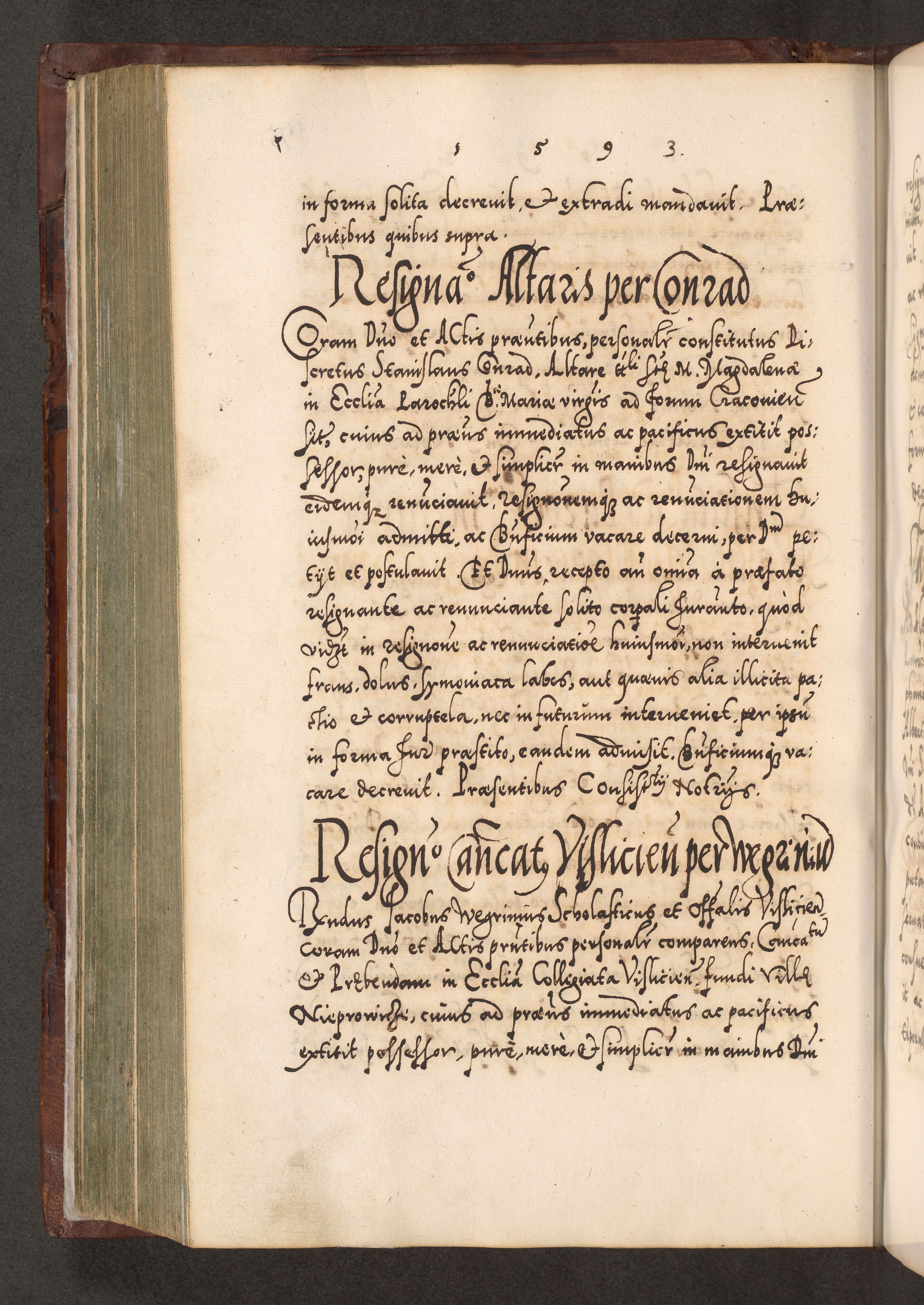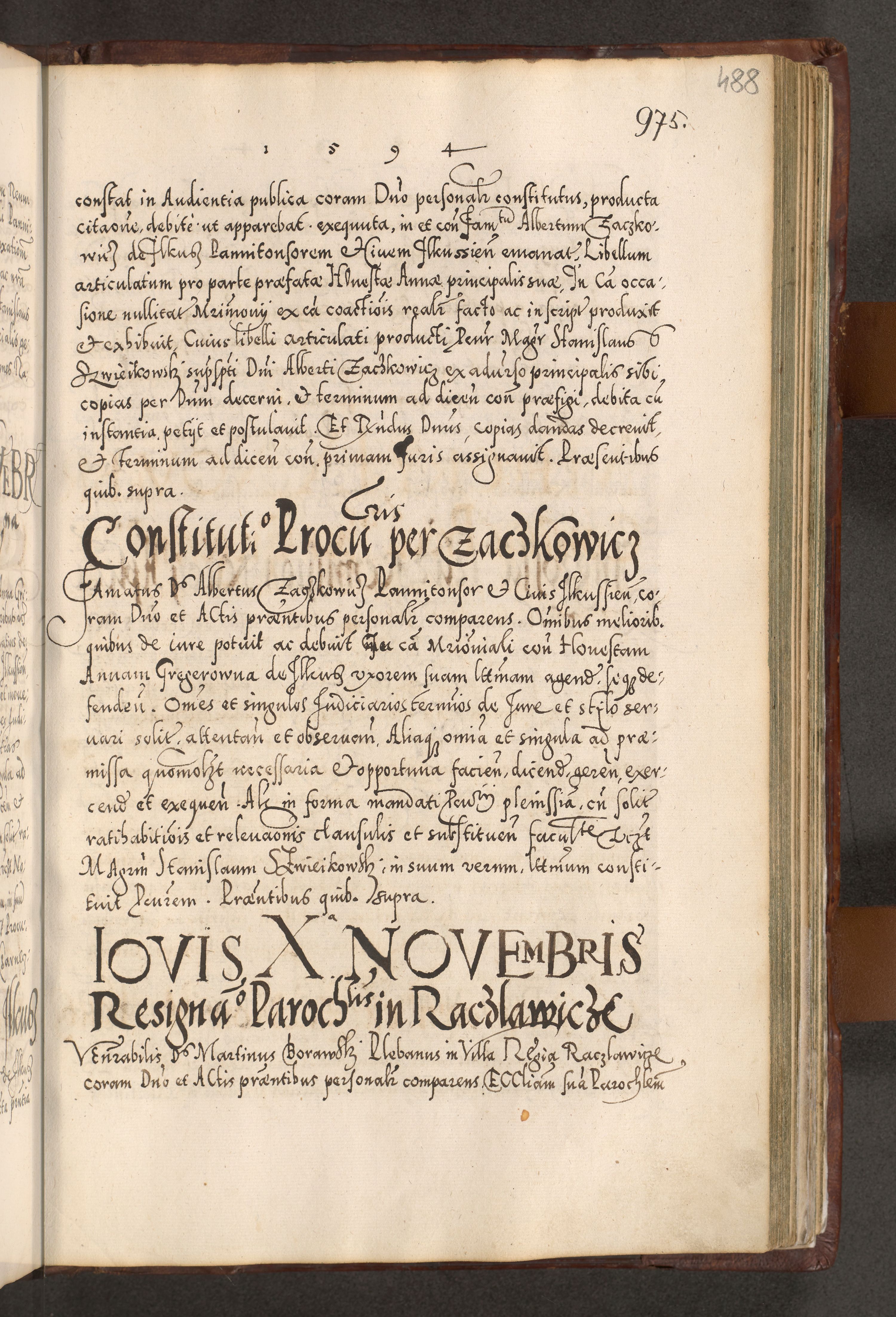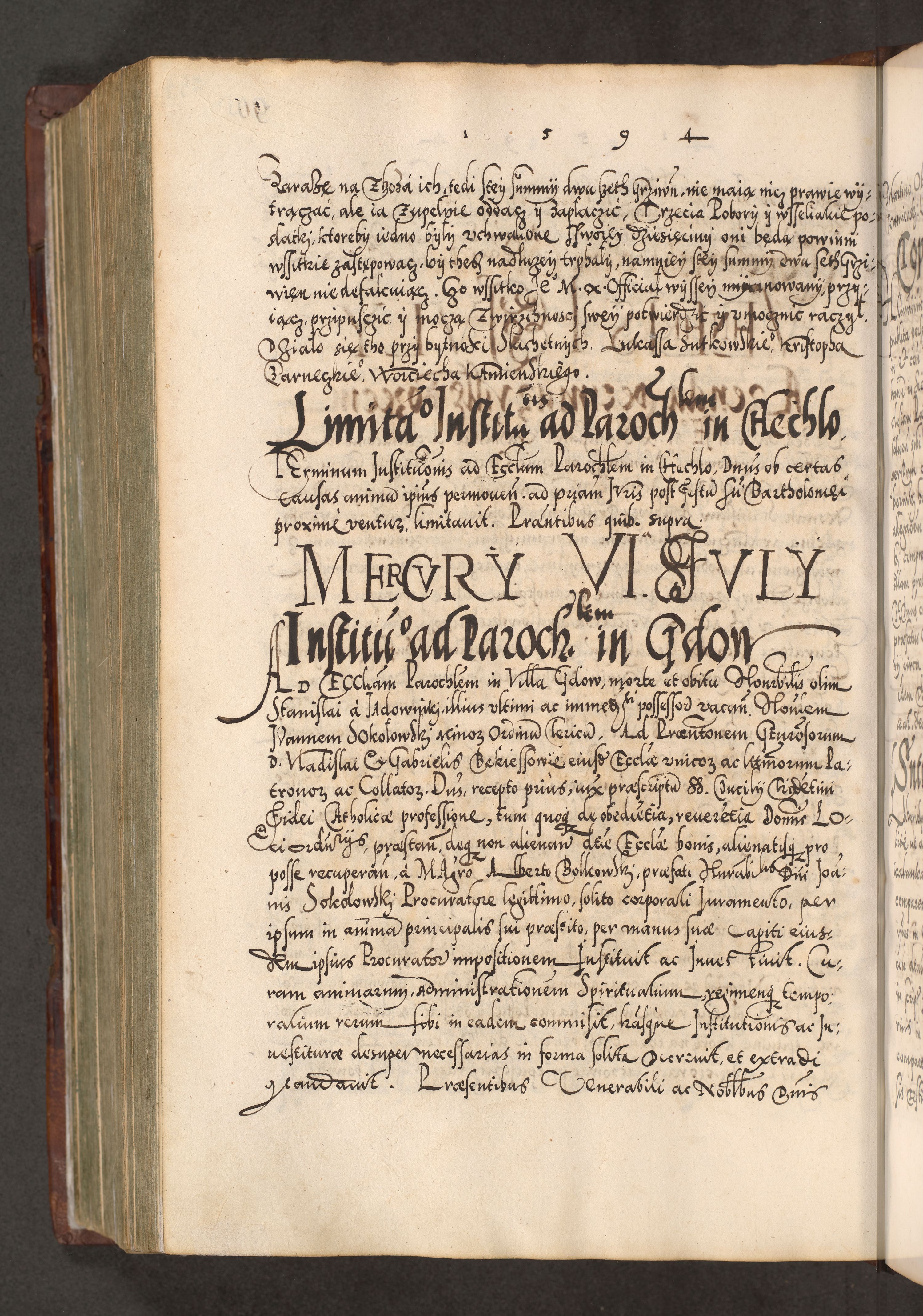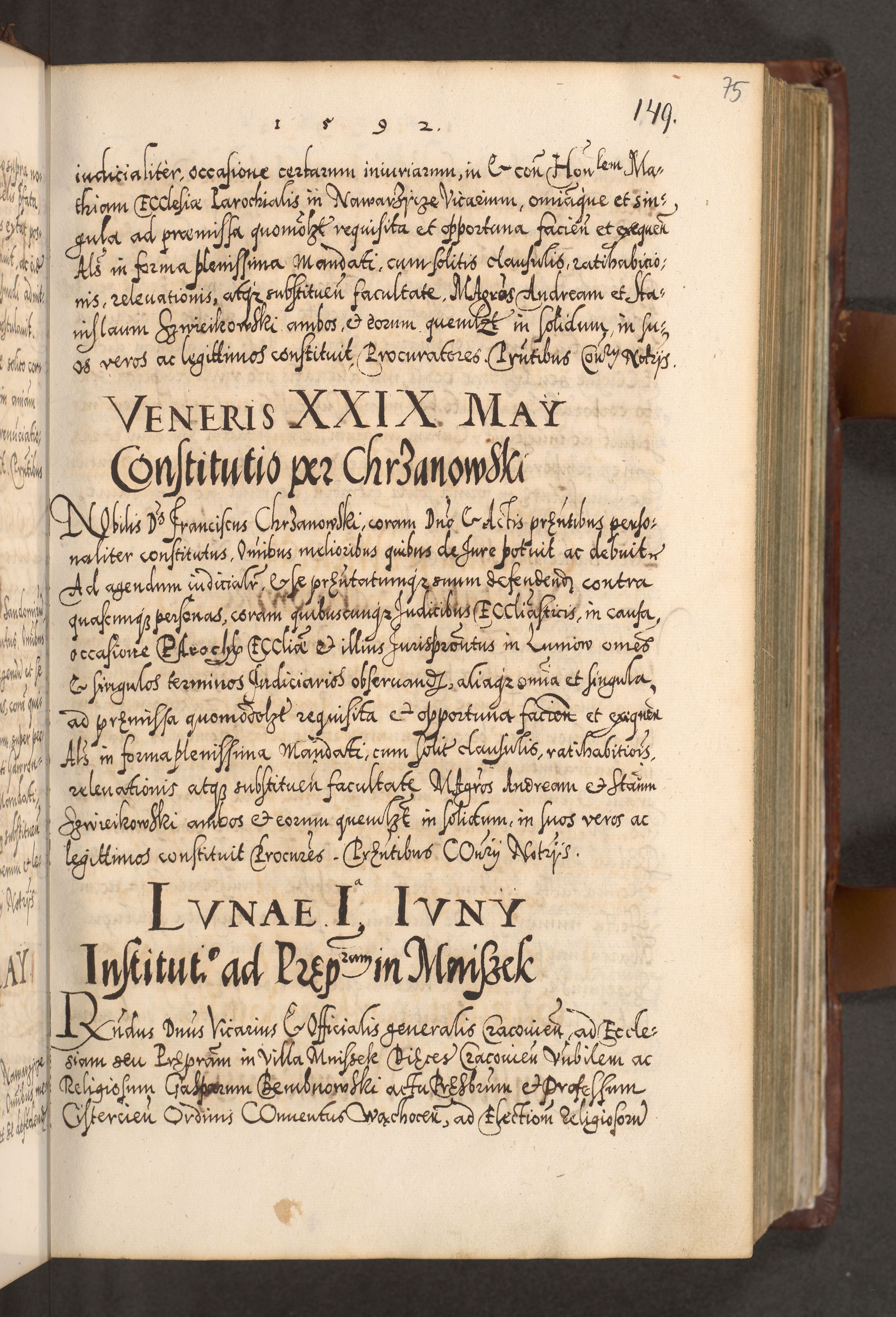 Illistrissimo et revedissimo in Christo Patre Domino Domino Georgio Rzadziwił Miserone Divina Sacrostae R. E. Tituli S. Sixti Presbitero Cardinali Duce in Olyka et Niesswiesz ad Gubernacula Ecclessiae Cracoviensis cuius administratorialem a Sancta Sede Apostolica obtinverat feliciter sedente. Acta actorum, causarum, sententiarum tam deffinitivarum quam interloquutoriarum decretorum, obligationum, quietationum, recognitionum, constitutionum procuratorum etc. coram Reverendo Domino Stanislao Crassinskz de Crasne Archidiacono Cracoviensis, Scholastico Gnesnesis, Custode Plocensis etc. Vicario et Officiali Generali Cracoviensi in Ano Domini Millesimo Quingentesimo Nonagesimo Primo cuius indictio quarta pontificatus SS. Domini Nostri Gregorii XIIII Anno I psius prio feliciter incipiut