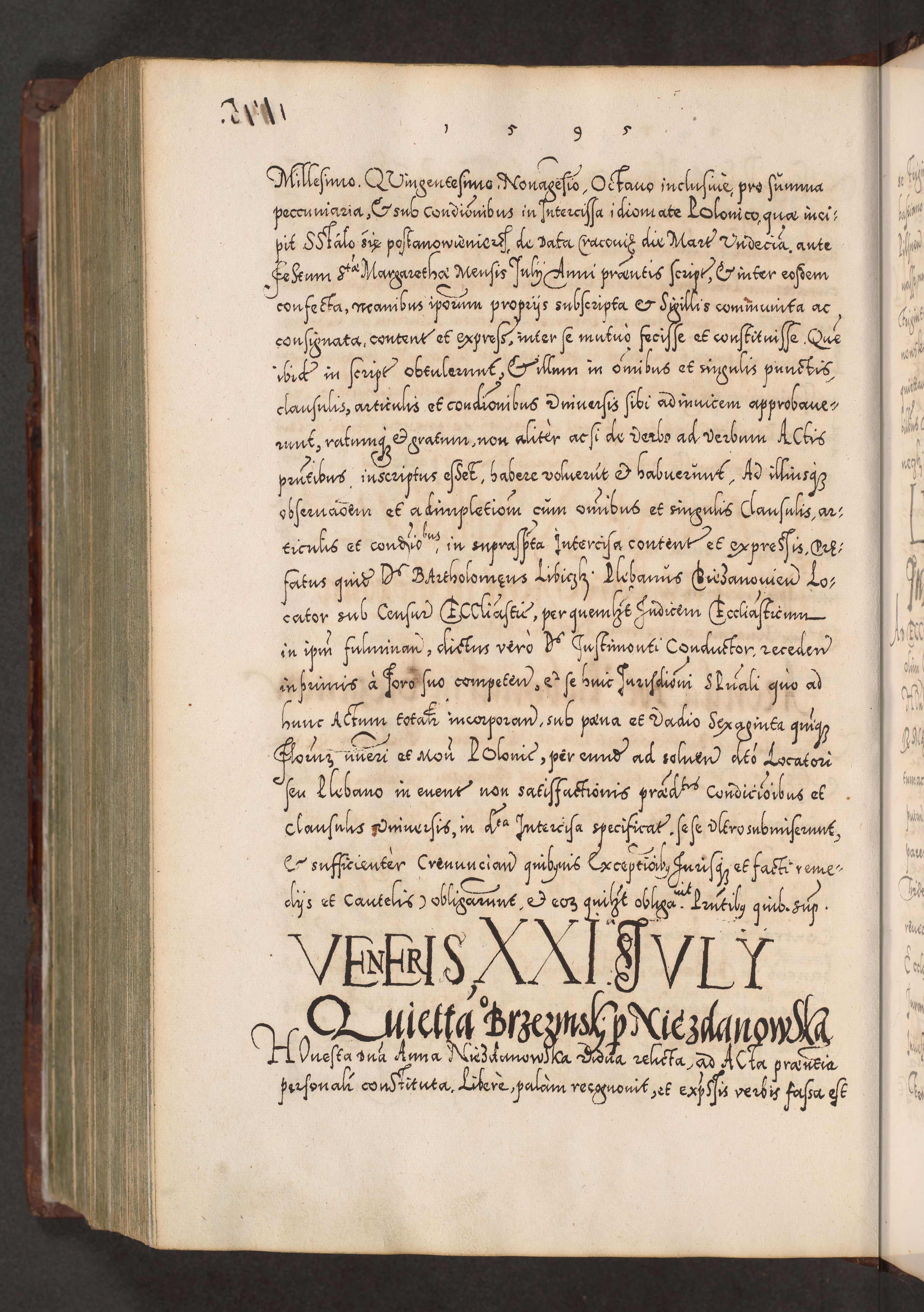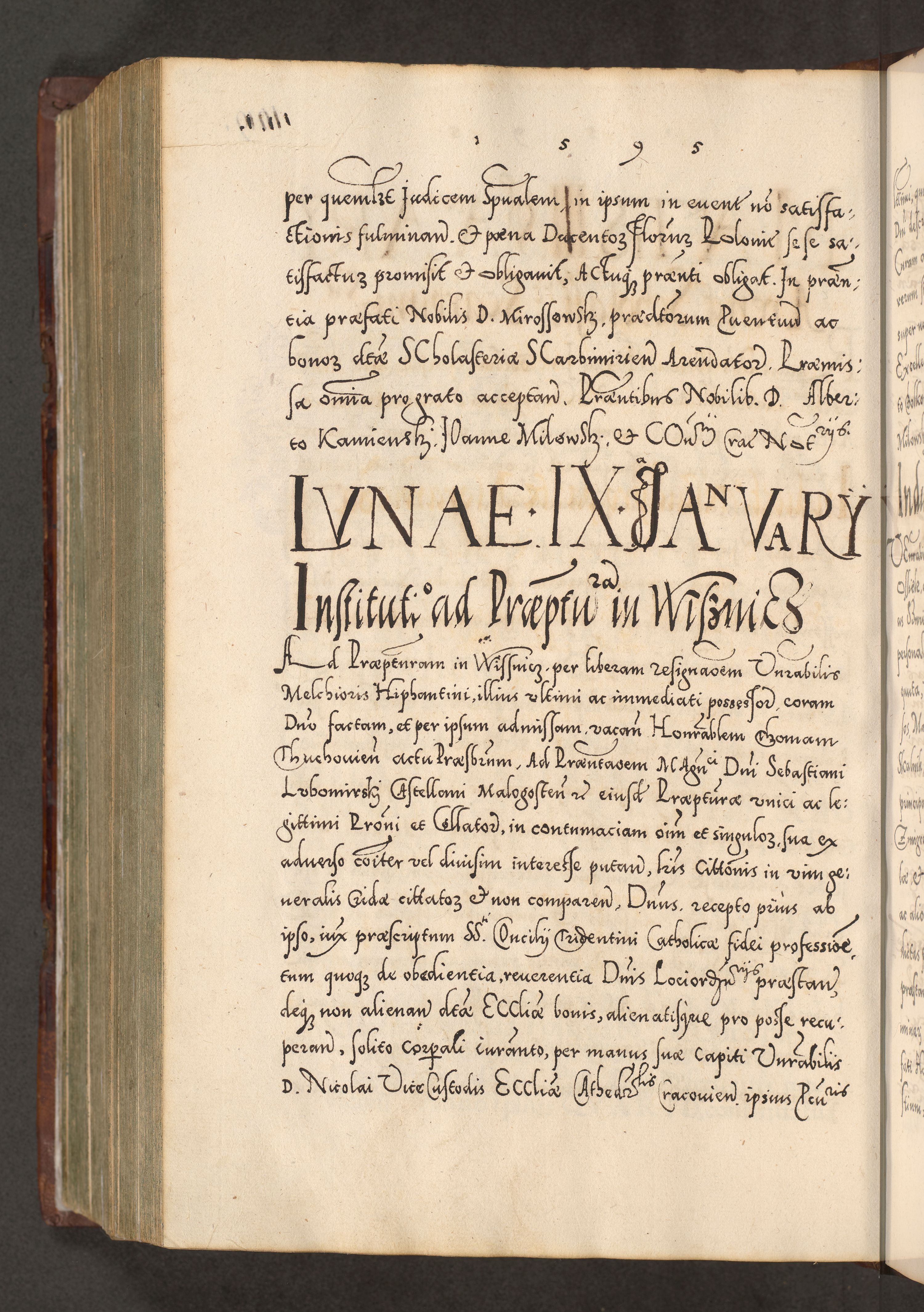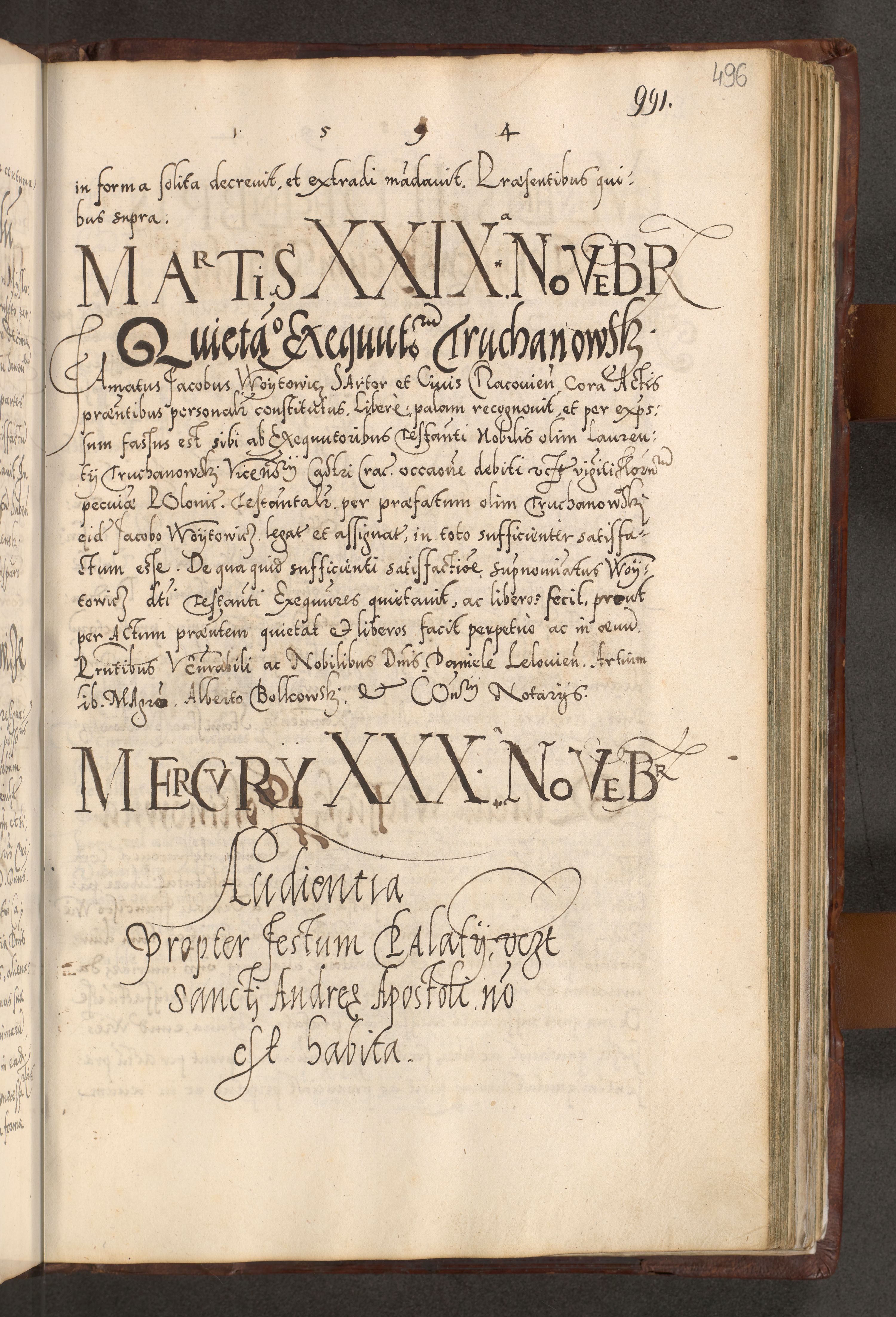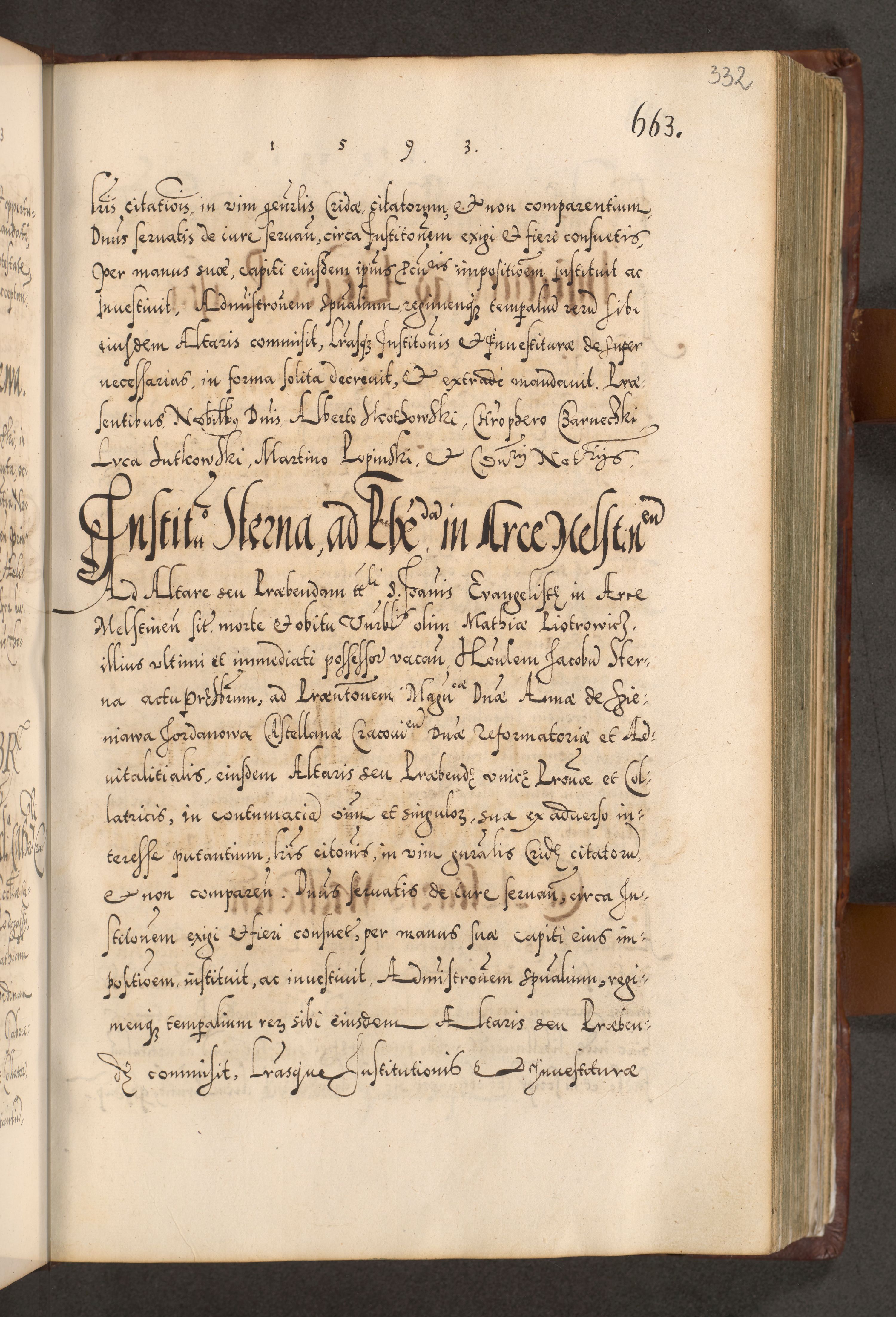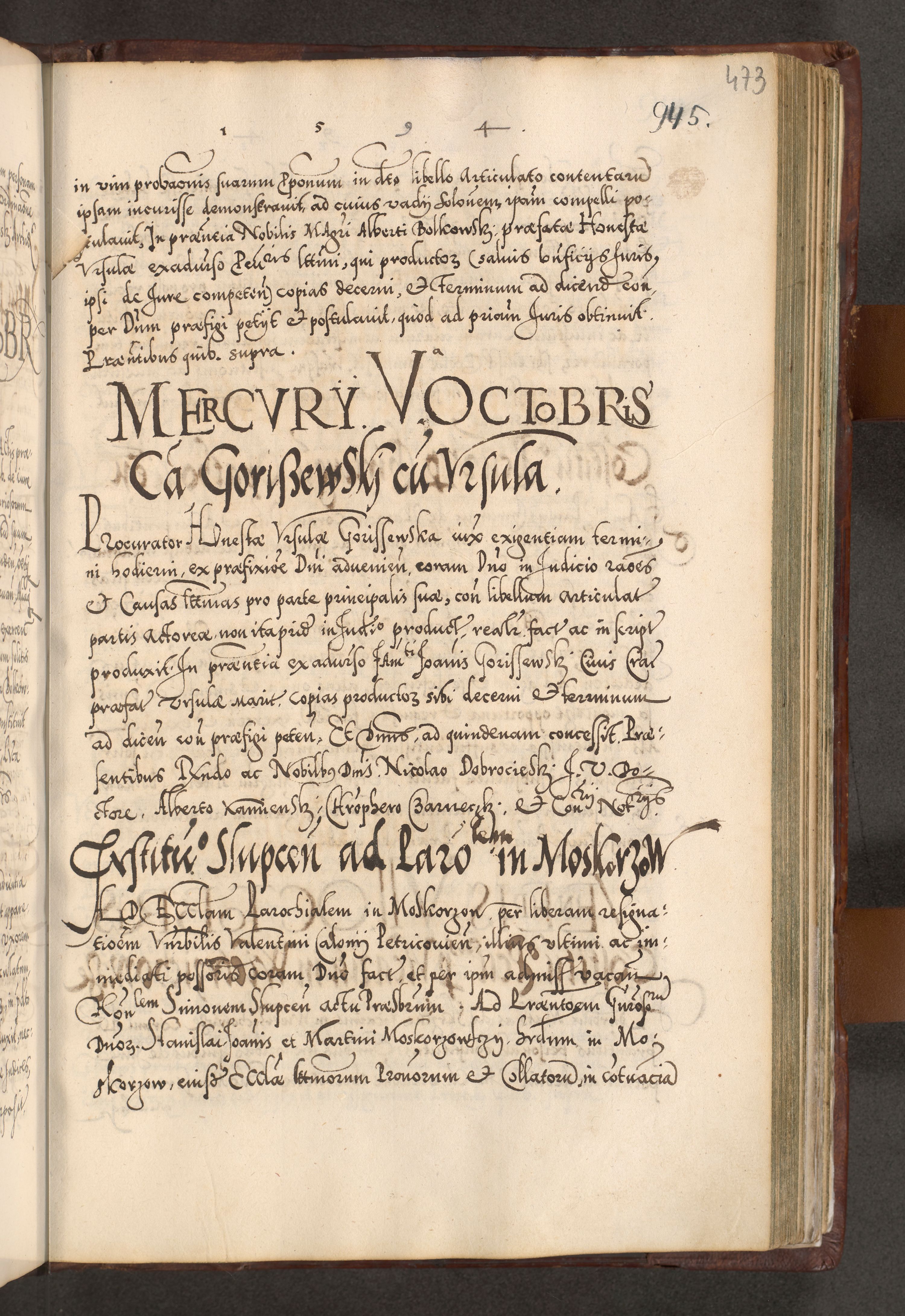 Illistrissimo et revedissimo in Christo Patre Domino Domino Georgio Rzadziwił Miserone Divina Sacrostae R. E. Tituli S. Sixti Presbitero Cardinali Duce in Olyka et Niesswiesz ad Gubernacula Ecclessiae Cracoviensis cuius administratorialem a Sancta Sede Apostolica obtinverat feliciter sedente. Acta actorum, causarum, sententiarum tam deffinitivarum quam interloquutoriarum decretorum, obligationum, quietationum, recognitionum, constitutionum procuratorum etc. coram Reverendo Domino Stanislao Crassinskz de Crasne Archidiacono Cracoviensis, Scholastico Gnesnesis, Custode Plocensis etc. Vicario et Officiali Generali Cracoviensi in Ano Domini Millesimo Quingentesimo Nonagesimo Primo cuius indictio quarta pontificatus SS. Domini Nostri Gregorii XIIII Anno I psius prio feliciter incipiut