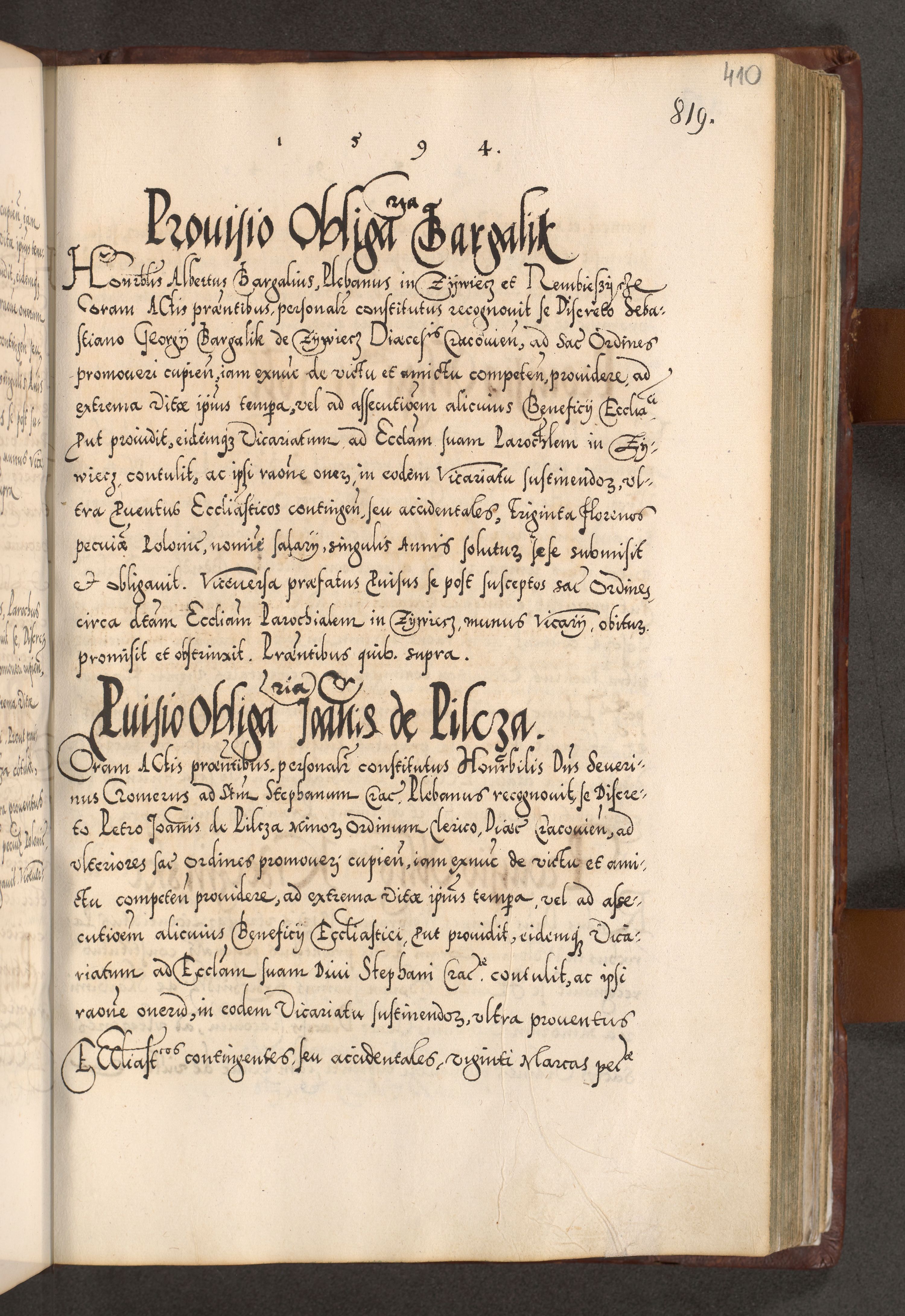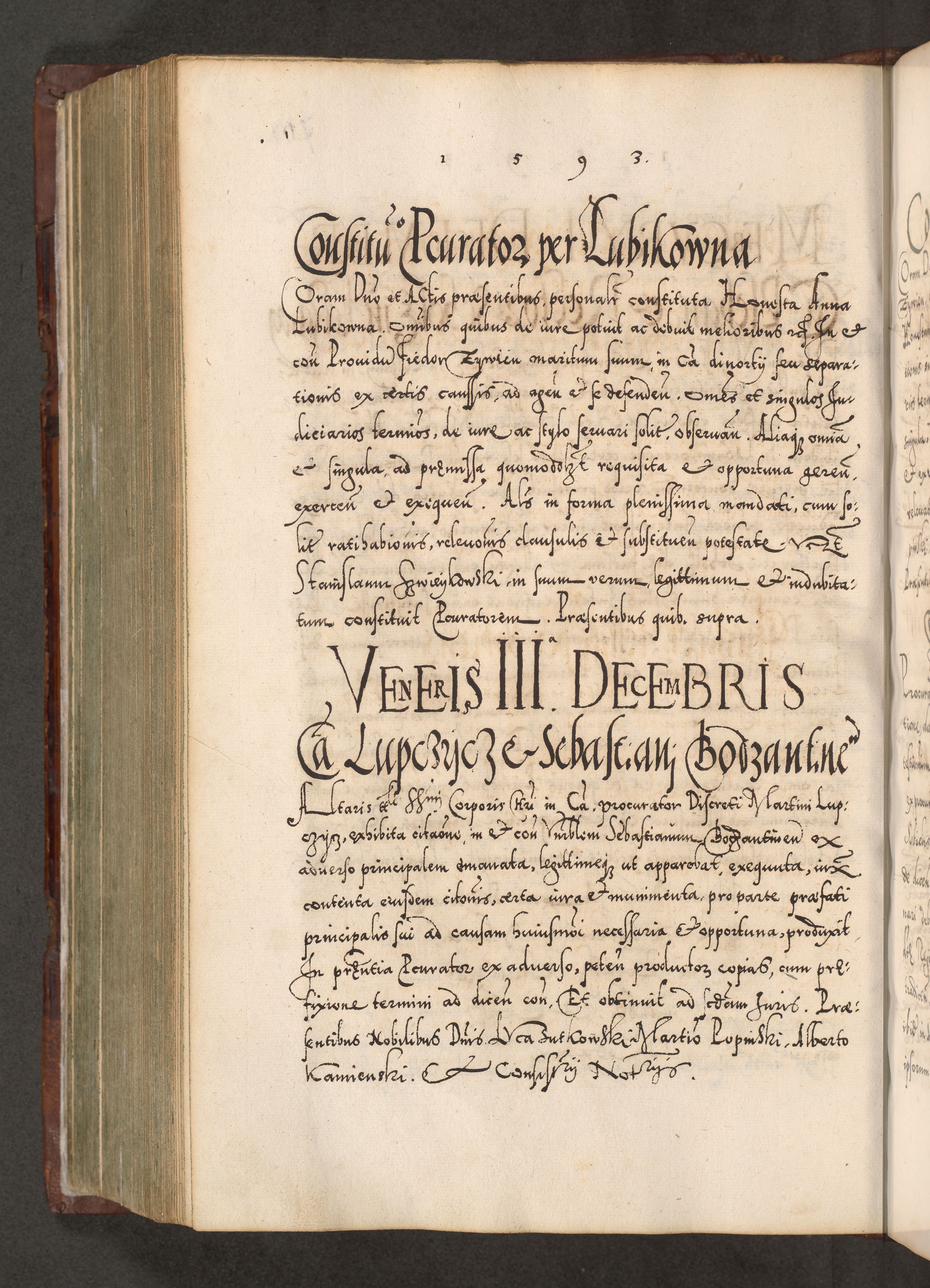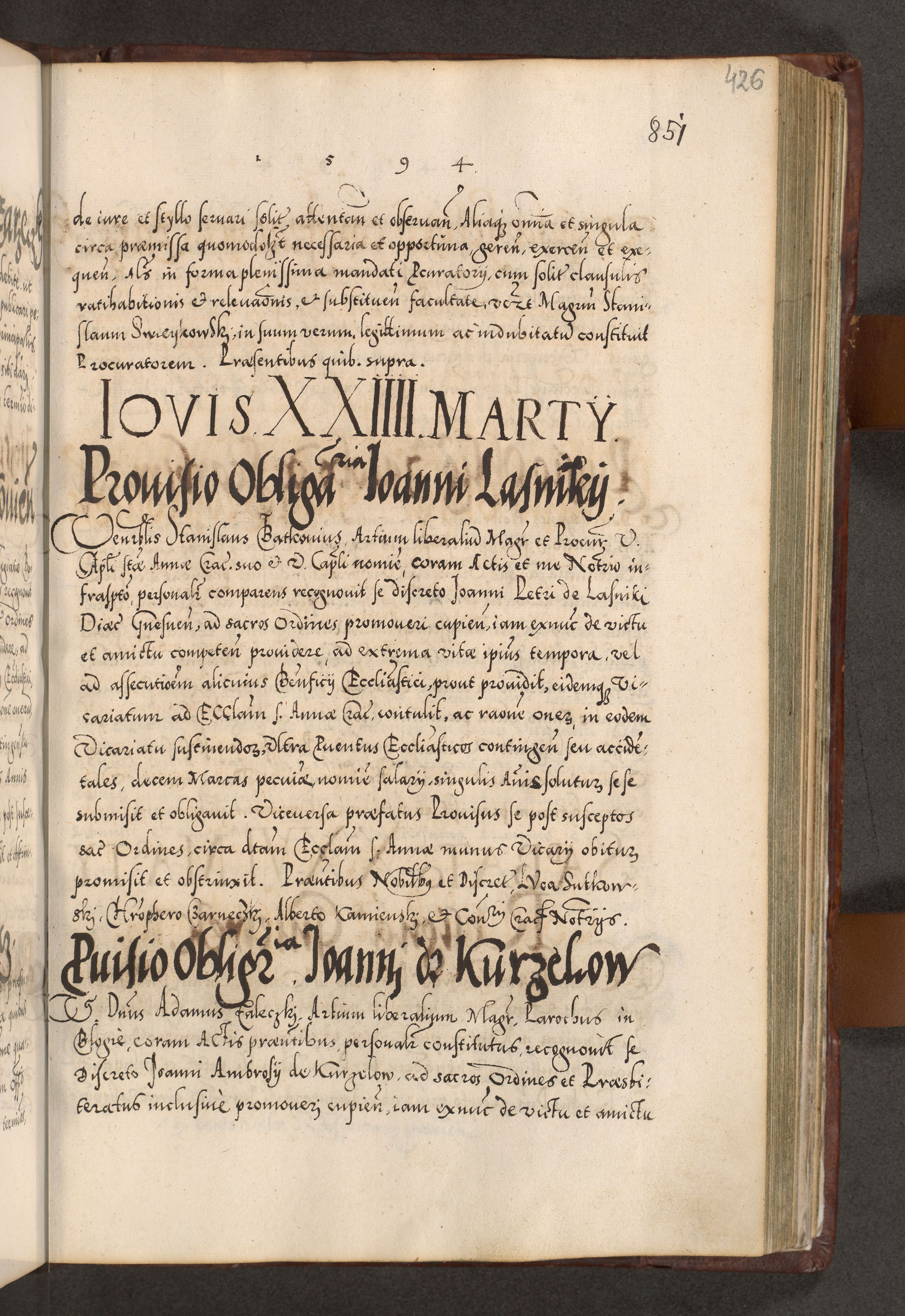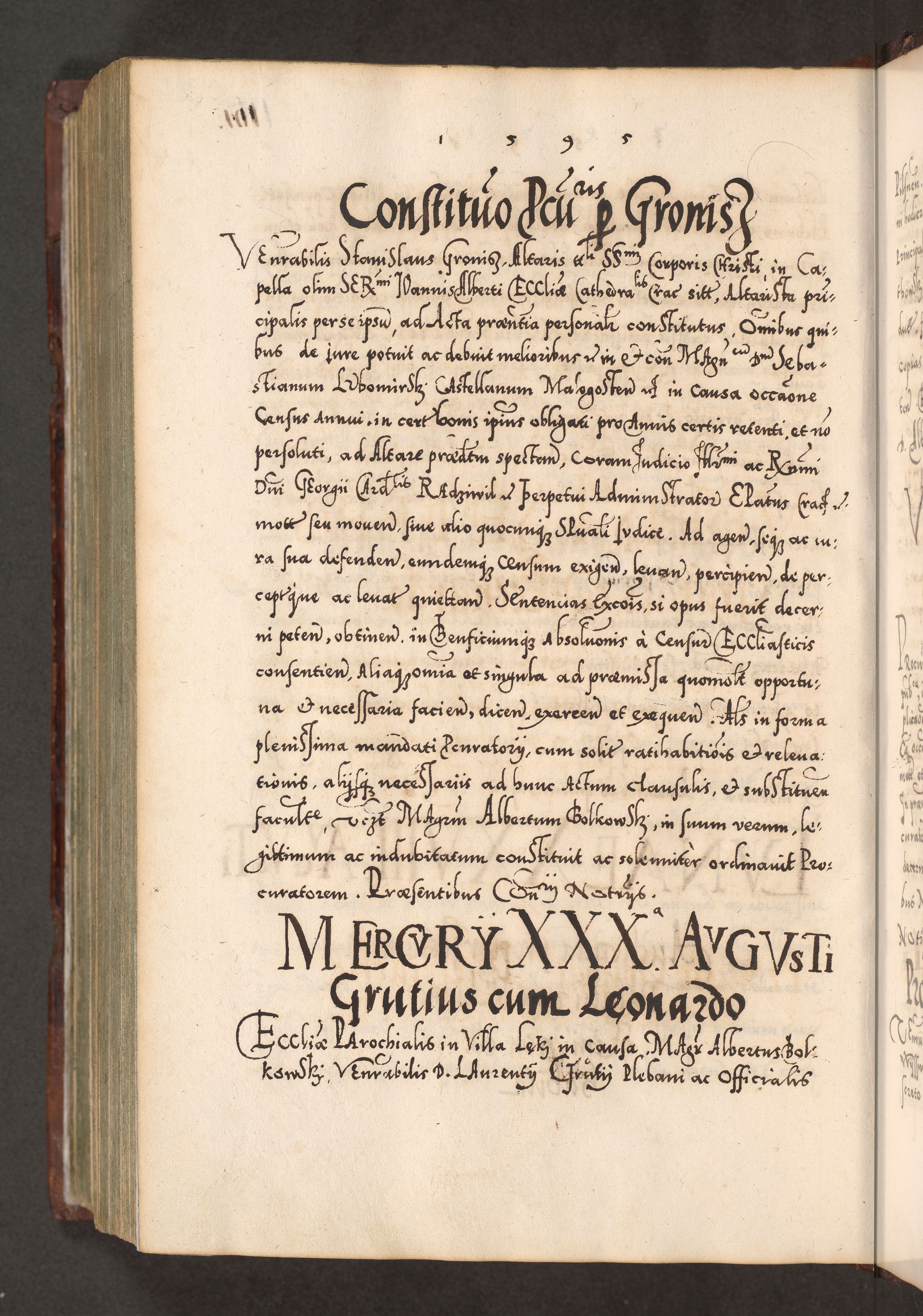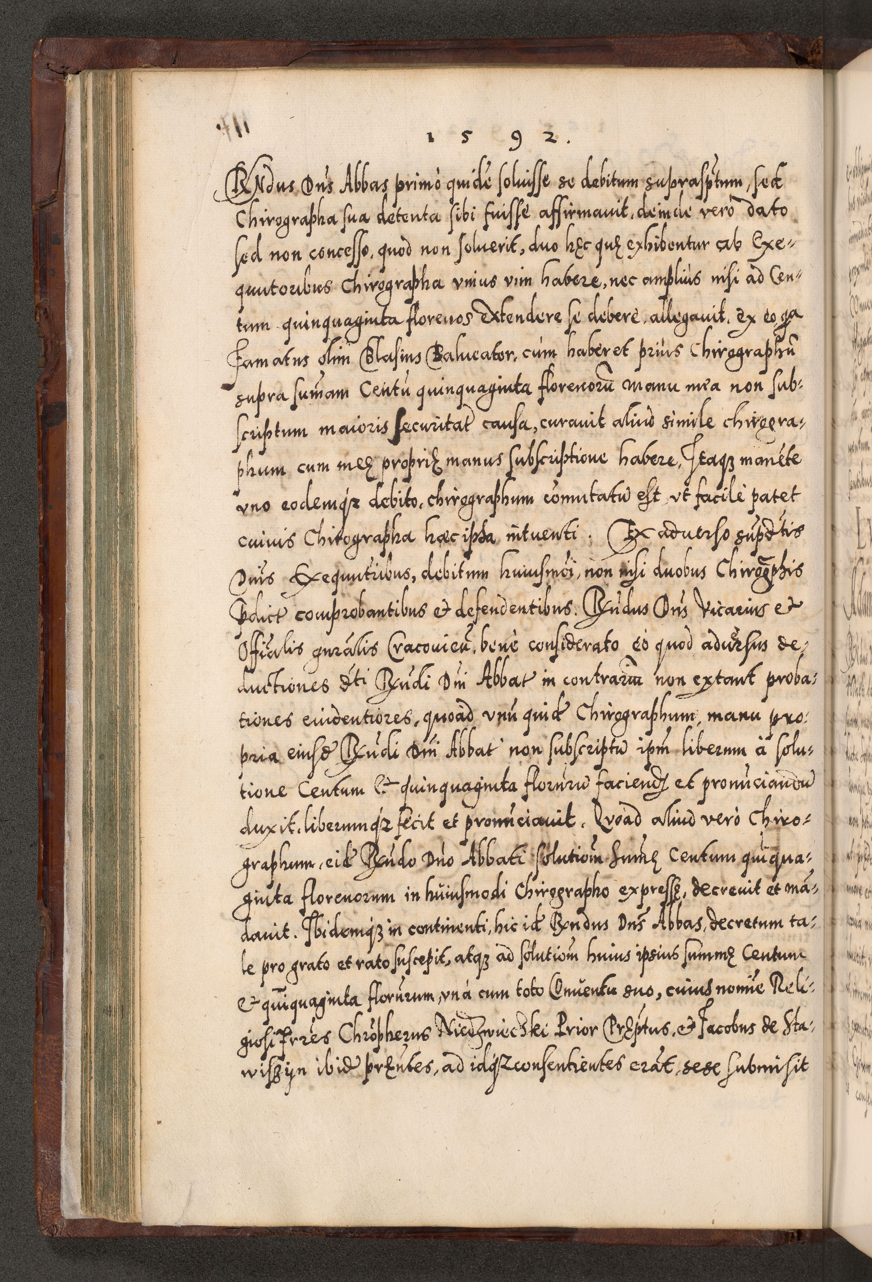 Illistrissimo et revedissimo in Christo Patre Domino Domino Georgio Rzadziwił Miserone Divina Sacrostae R. E. Tituli S. Sixti Presbitero Cardinali Duce in Olyka et Niesswiesz ad Gubernacula Ecclessiae Cracoviensis cuius administratorialem a Sancta Sede Apostolica obtinverat feliciter sedente. Acta actorum, causarum, sententiarum tam deffinitivarum quam interloquutoriarum decretorum, obligationum, quietationum, recognitionum, constitutionum procuratorum etc. coram Reverendo Domino Stanislao Crassinskz de Crasne Archidiacono Cracoviensis, Scholastico Gnesnesis, Custode Plocensis etc. Vicario et Officiali Generali Cracoviensi in Ano Domini Millesimo Quingentesimo Nonagesimo Primo cuius indictio quarta pontificatus SS. Domini Nostri Gregorii XIIII Anno I psius prio feliciter incipiut