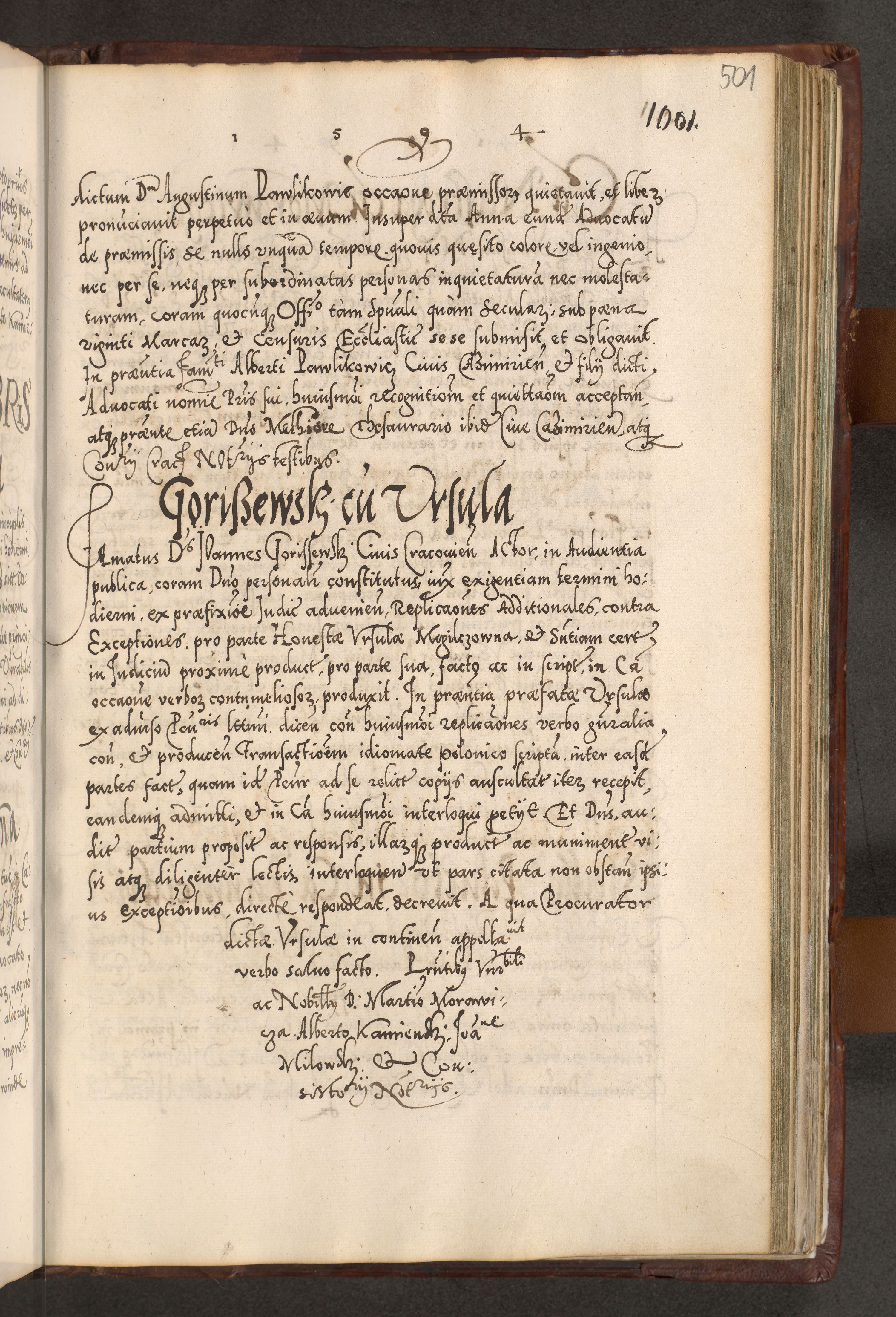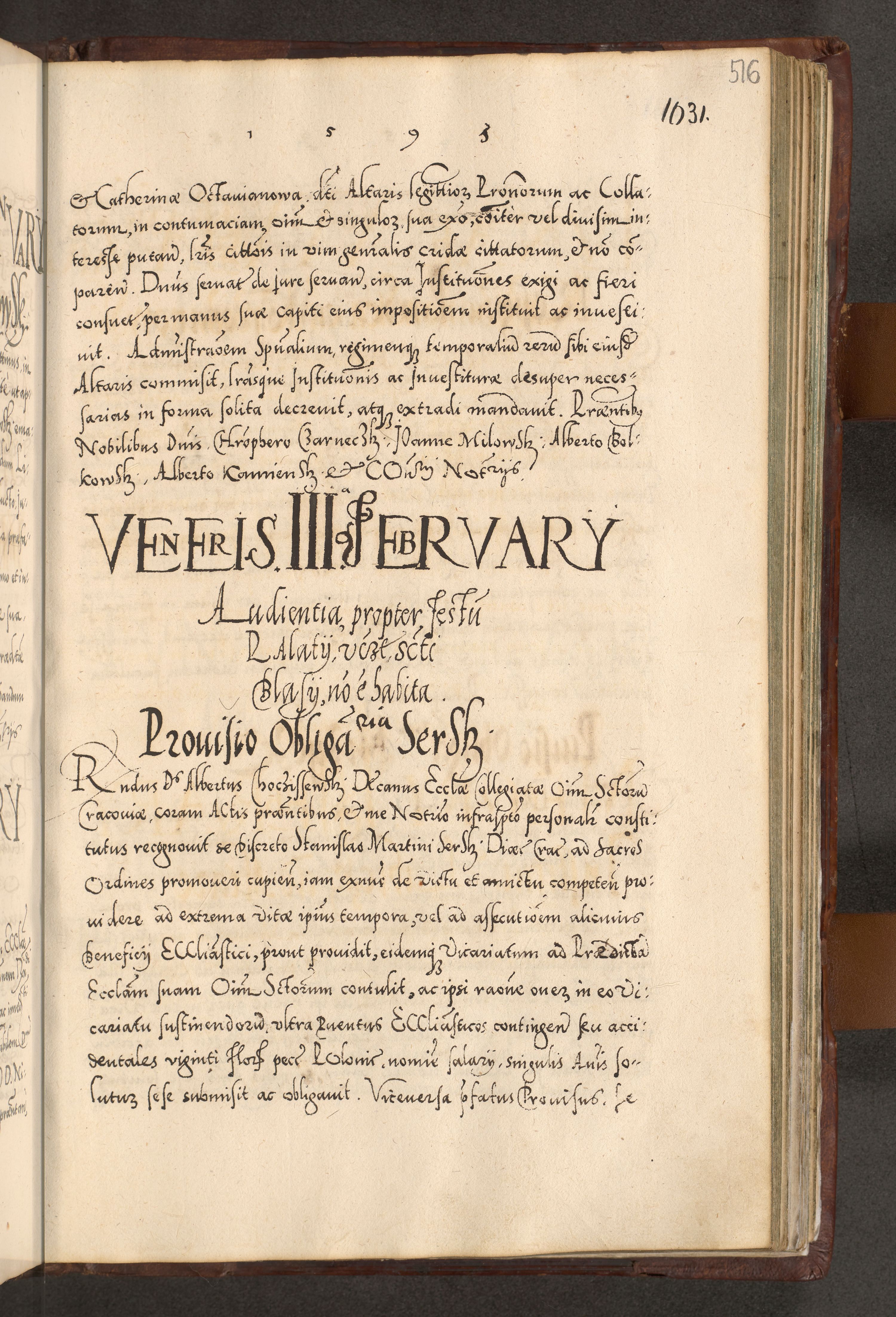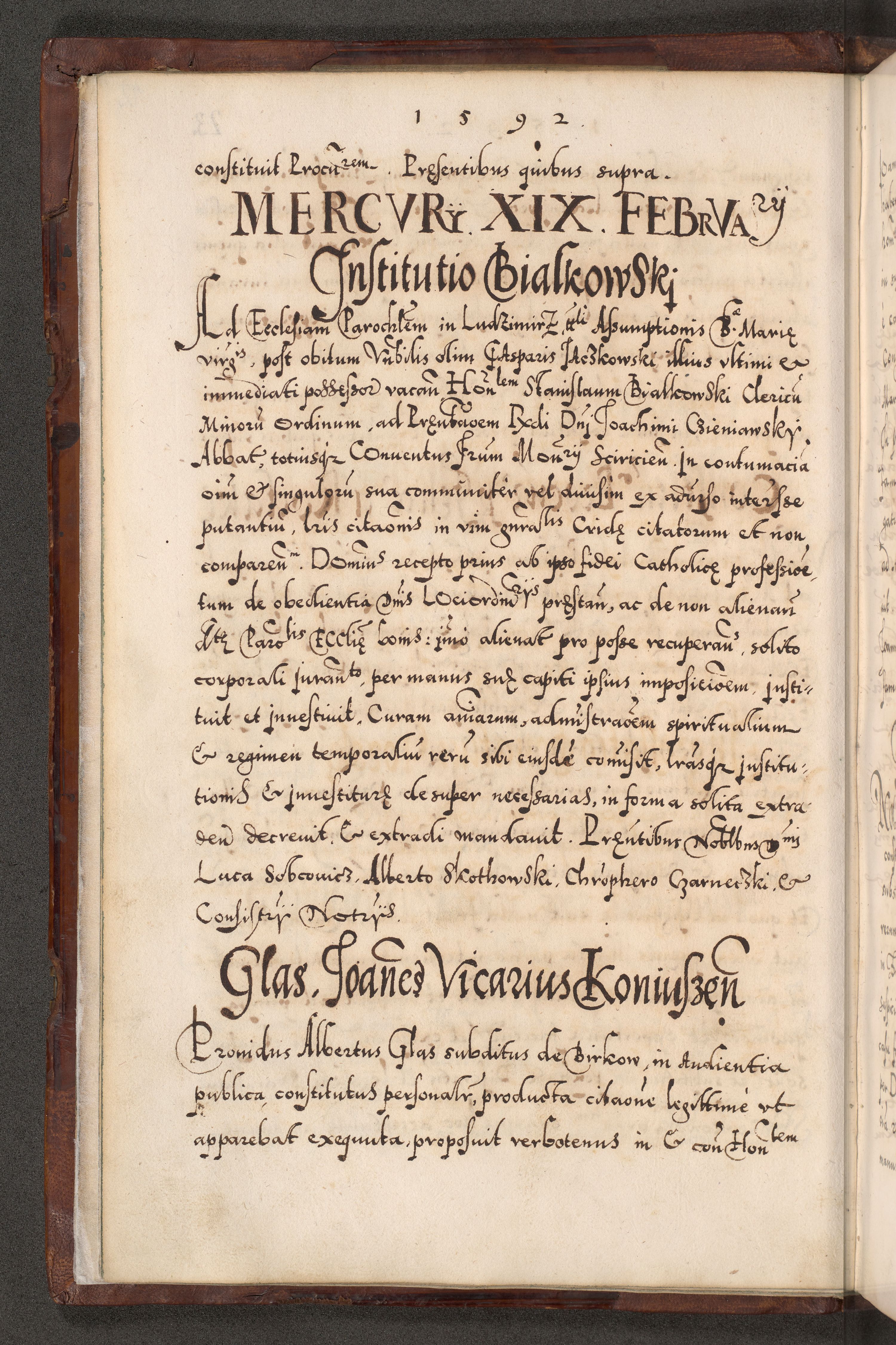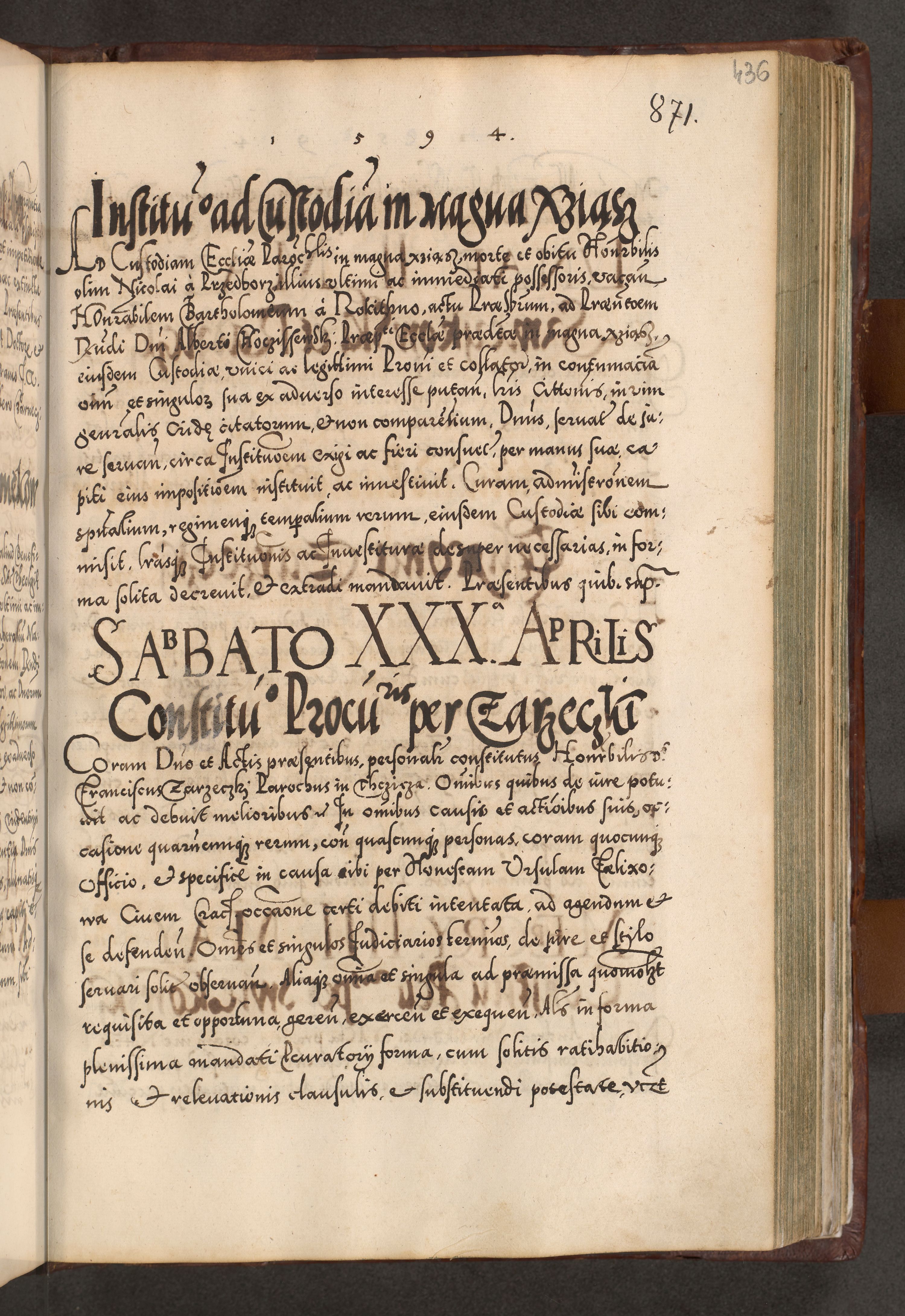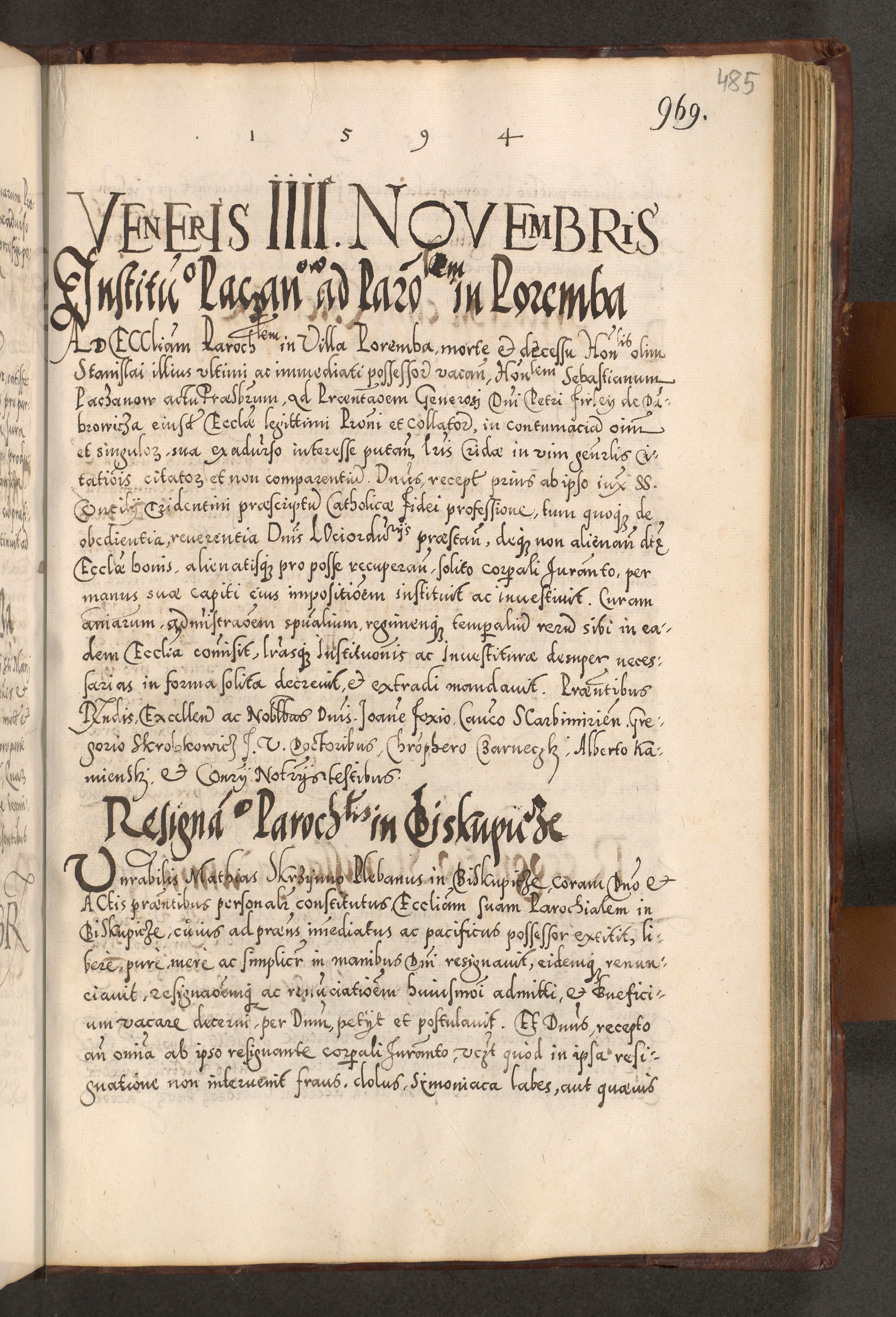 Illistrissimo et revedissimo in Christo Patre Domino Domino Georgio Rzadziwił Miserone Divina Sacrostae R. E. Tituli S. Sixti Presbitero Cardinali Duce in Olyka et Niesswiesz ad Gubernacula Ecclessiae Cracoviensis cuius administratorialem a Sancta Sede Apostolica obtinverat feliciter sedente. Acta actorum, causarum, sententiarum tam deffinitivarum quam interloquutoriarum decretorum, obligationum, quietationum, recognitionum, constitutionum procuratorum etc. coram Reverendo Domino Stanislao Crassinskz de Crasne Archidiacono Cracoviensis, Scholastico Gnesnesis, Custode Plocensis etc. Vicario et Officiali Generali Cracoviensi in Ano Domini Millesimo Quingentesimo Nonagesimo Primo cuius indictio quarta pontificatus SS. Domini Nostri Gregorii XIIII Anno I psius prio feliciter incipiut