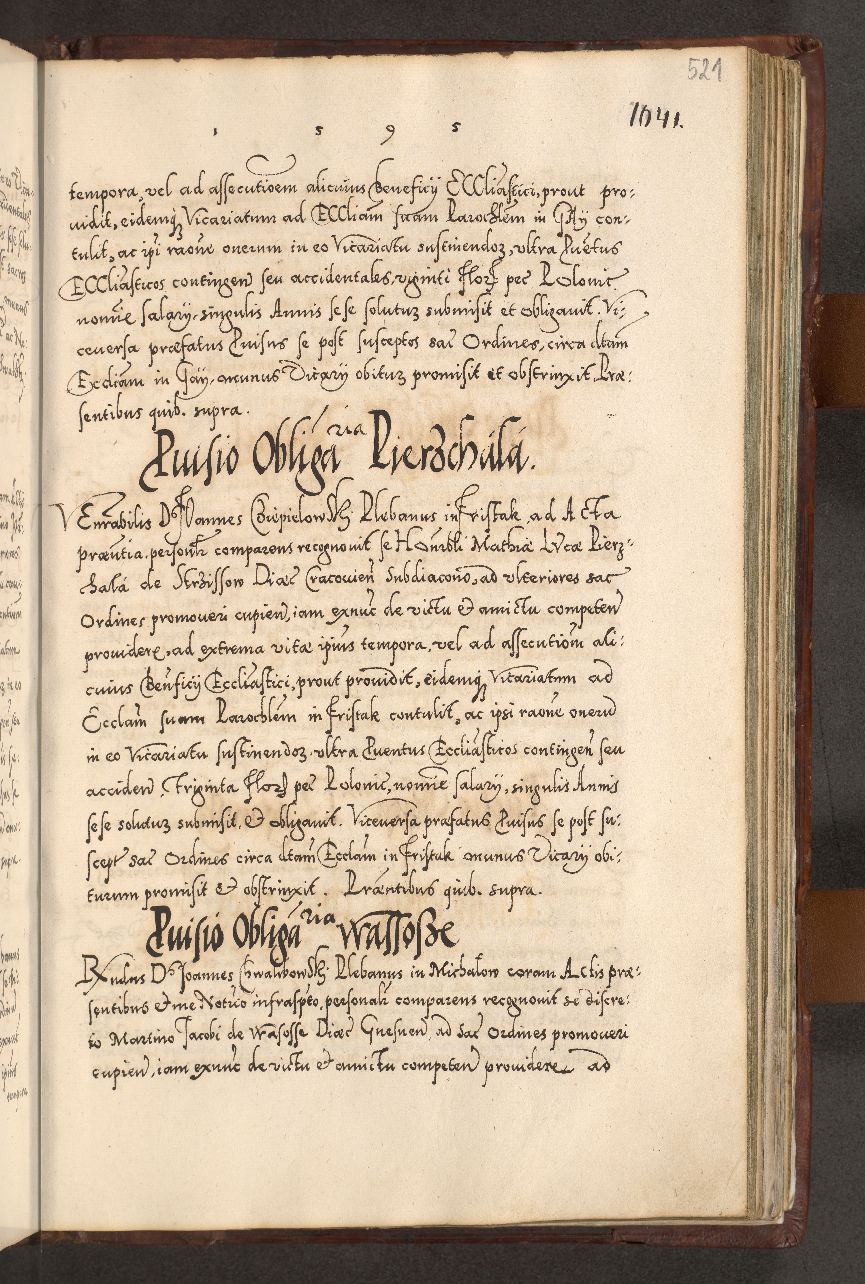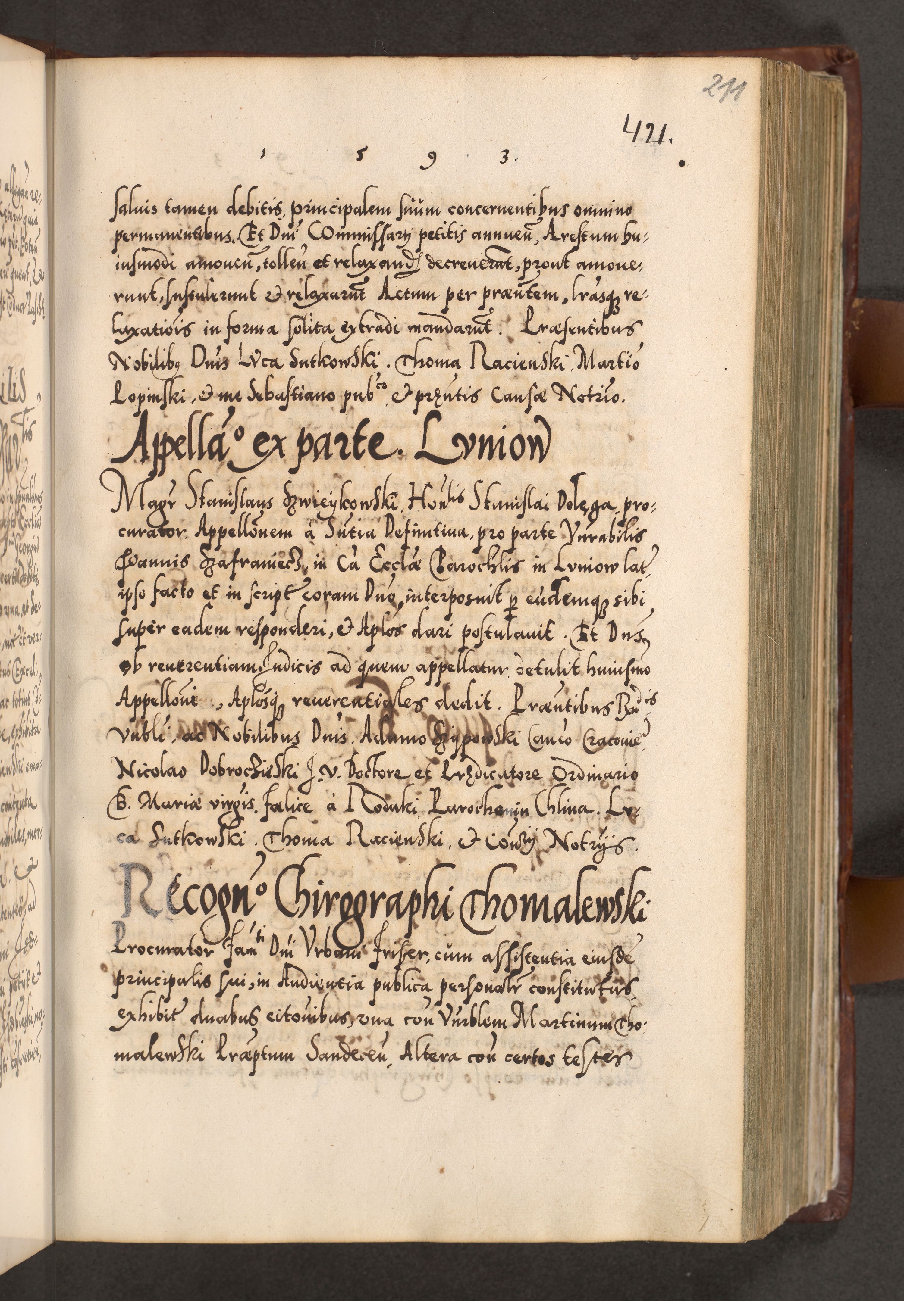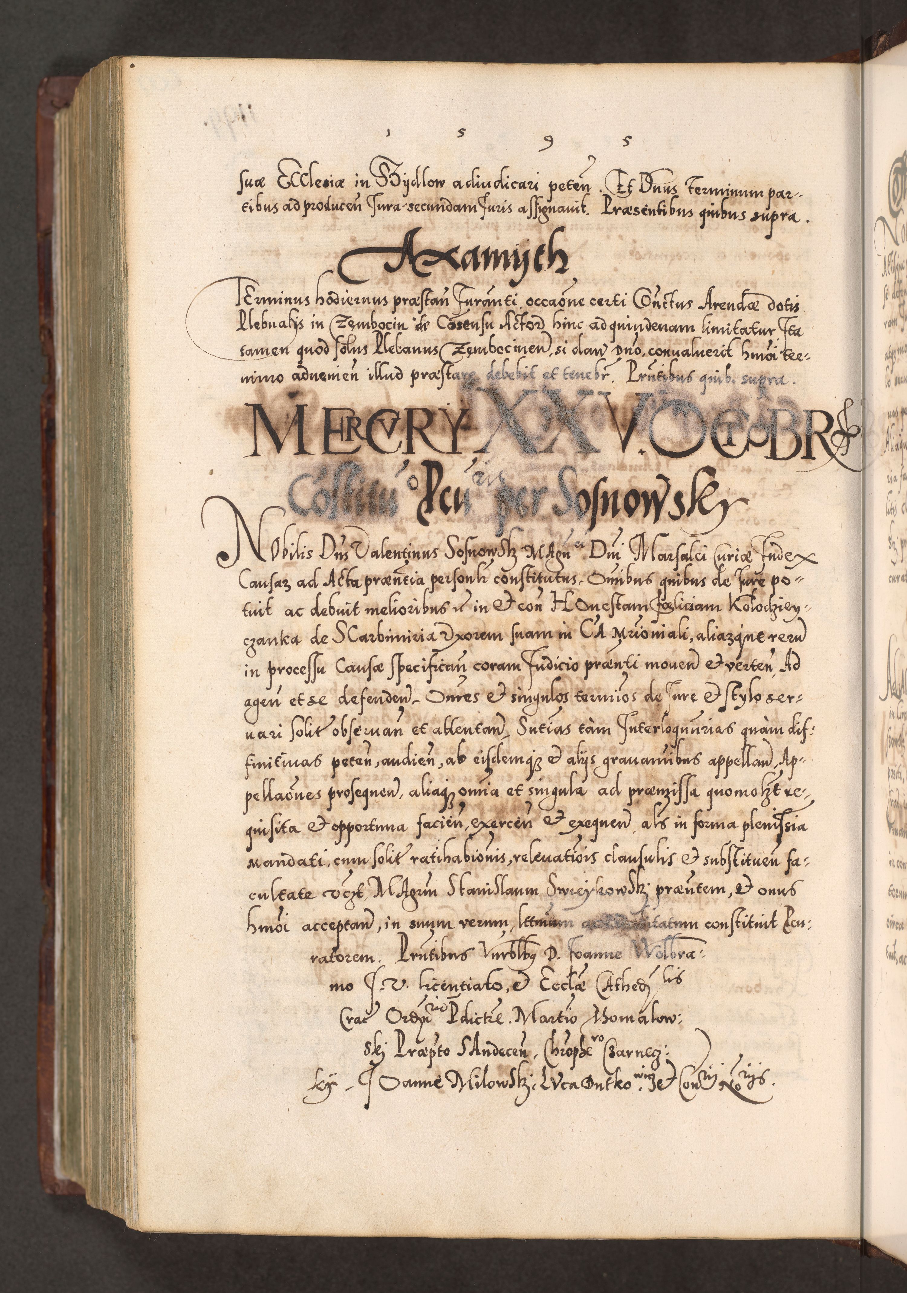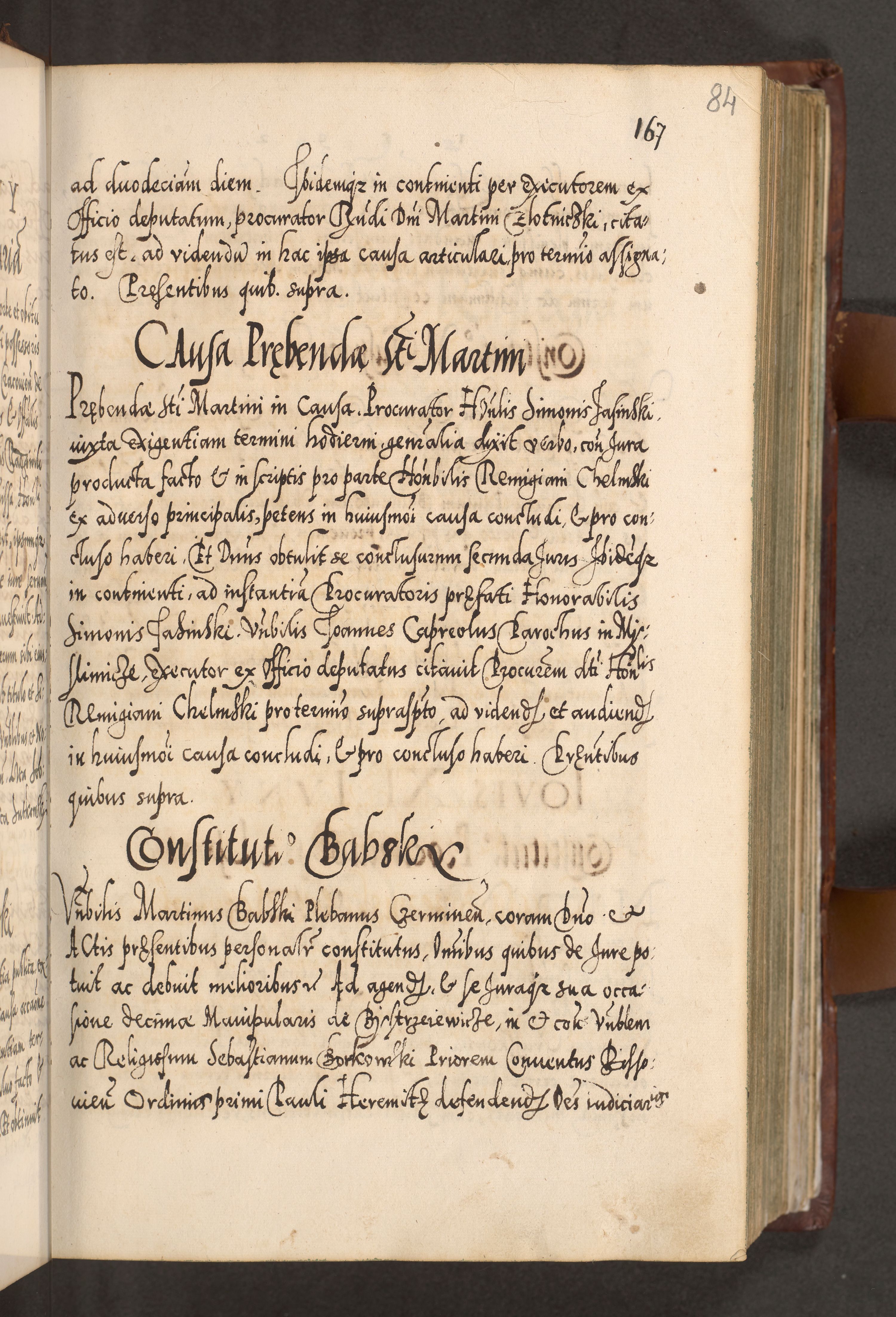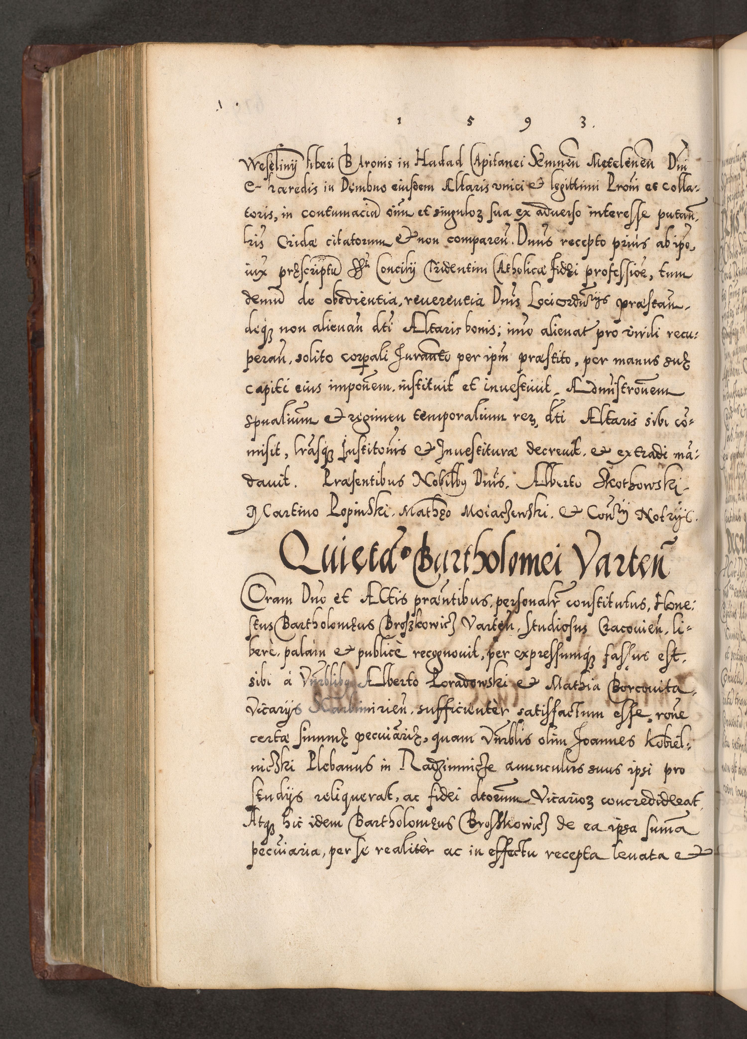 Illistrissimo et revedissimo in Christo Patre Domino Domino Georgio Rzadziwił Miserone Divina Sacrostae R. E. Tituli S. Sixti Presbitero Cardinali Duce in Olyka et Niesswiesz ad Gubernacula Ecclessiae Cracoviensis cuius administratorialem a Sancta Sede Apostolica obtinverat feliciter sedente. Acta actorum, causarum, sententiarum tam deffinitivarum quam interloquutoriarum decretorum, obligationum, quietationum, recognitionum, constitutionum procuratorum etc. coram Reverendo Domino Stanislao Crassinskz de Crasne Archidiacono Cracoviensis, Scholastico Gnesnesis, Custode Plocensis etc. Vicario et Officiali Generali Cracoviensi in Ano Domini Millesimo Quingentesimo Nonagesimo Primo cuius indictio quarta pontificatus SS. Domini Nostri Gregorii XIIII Anno I psius prio feliciter incipiut