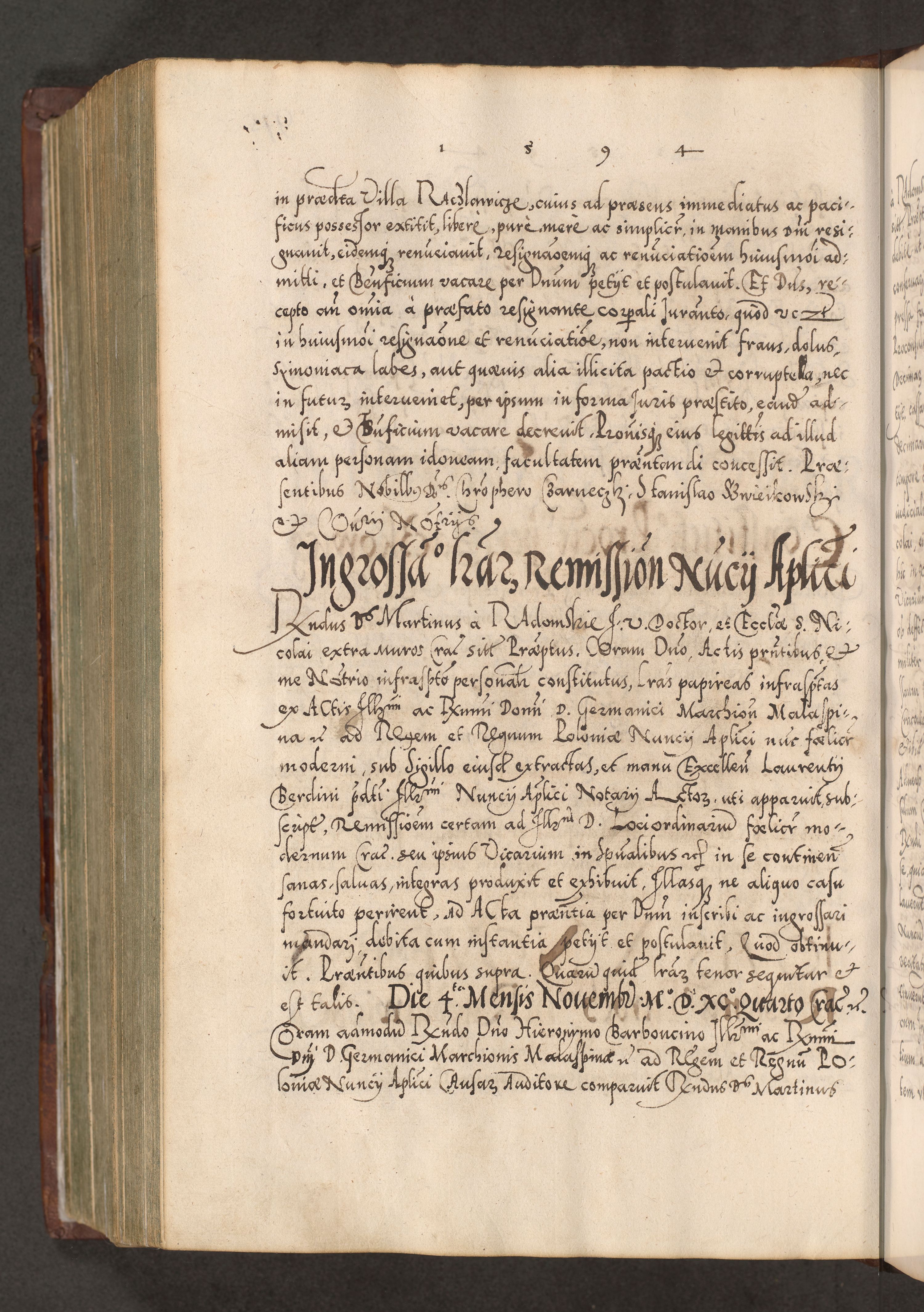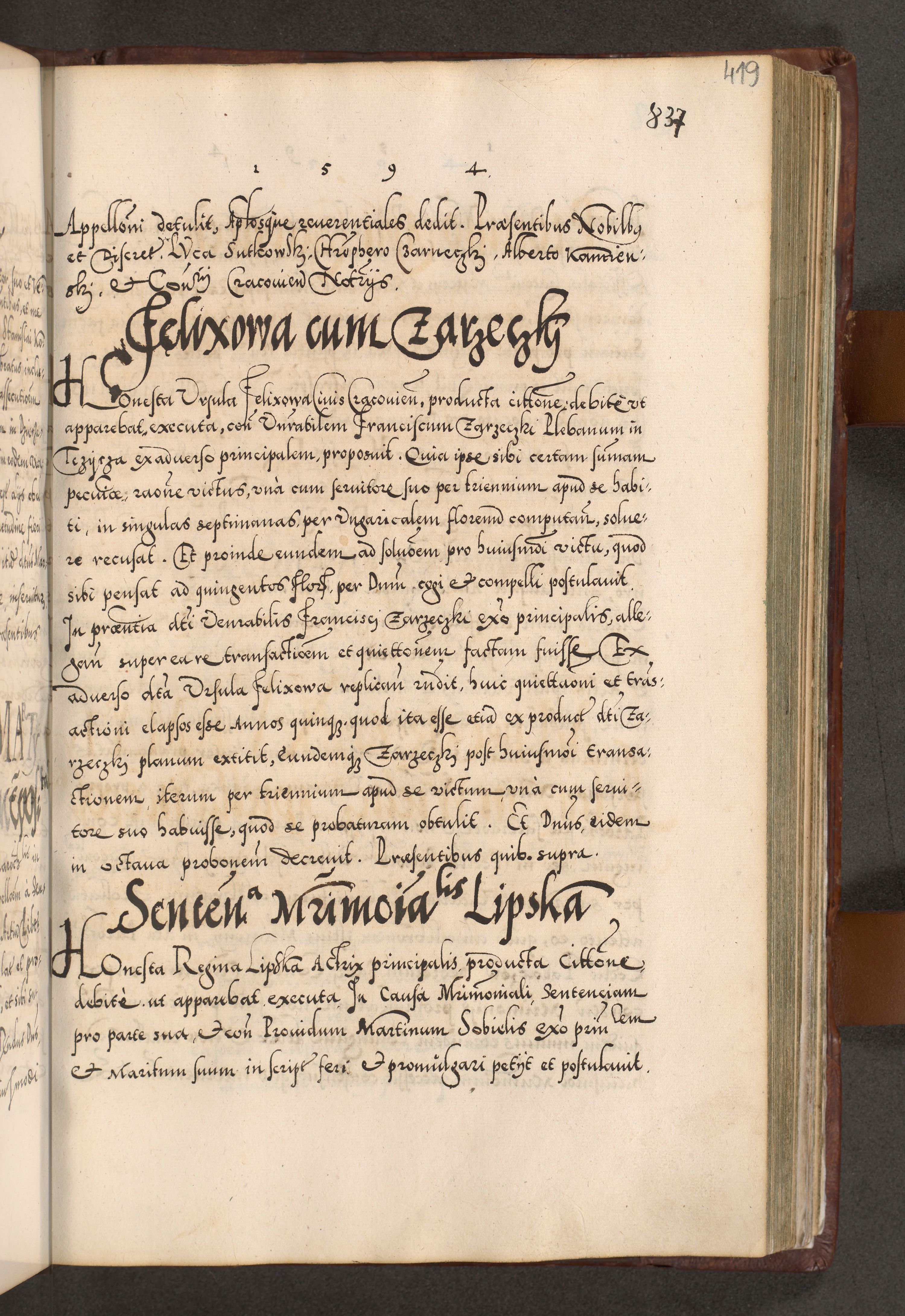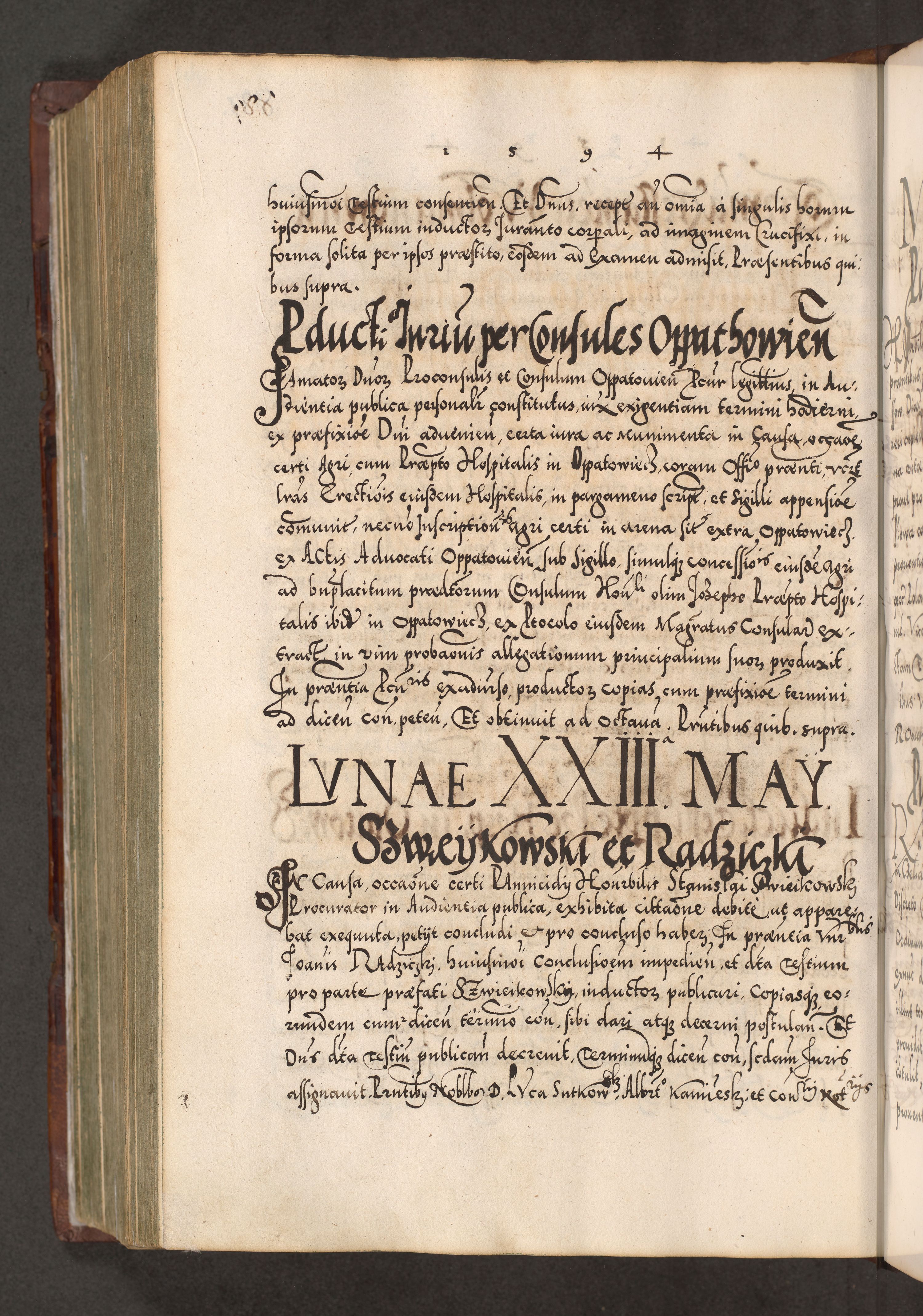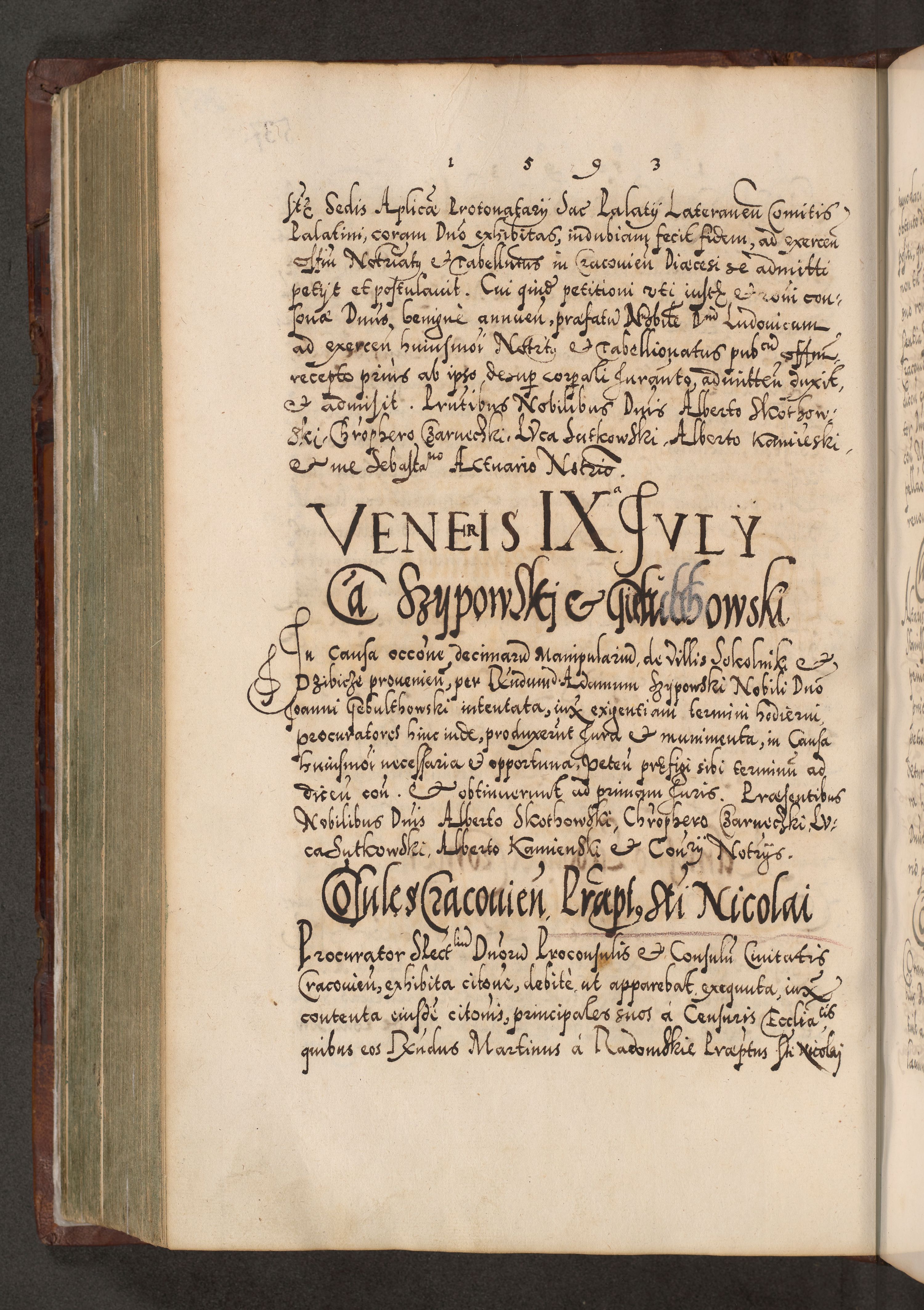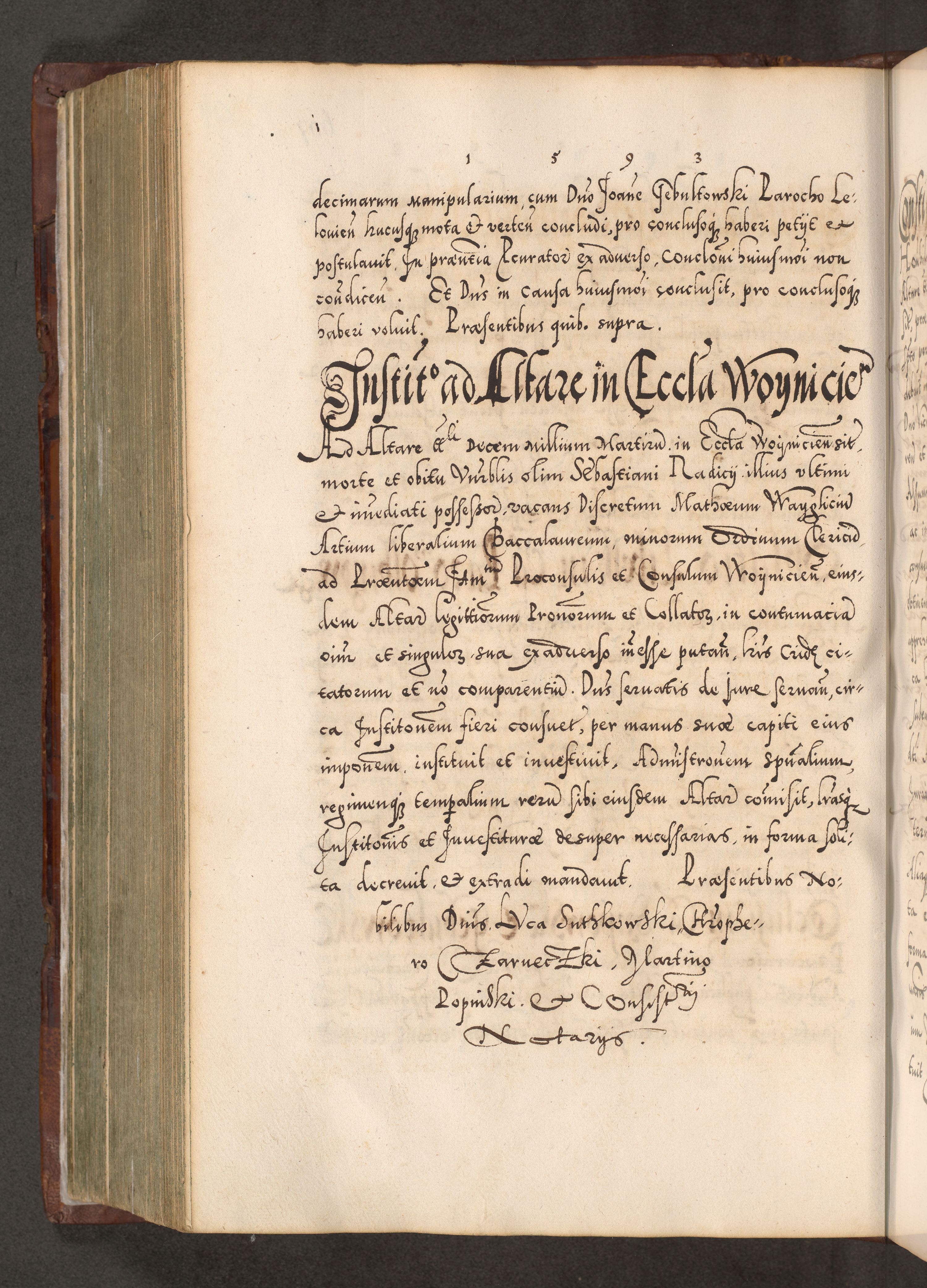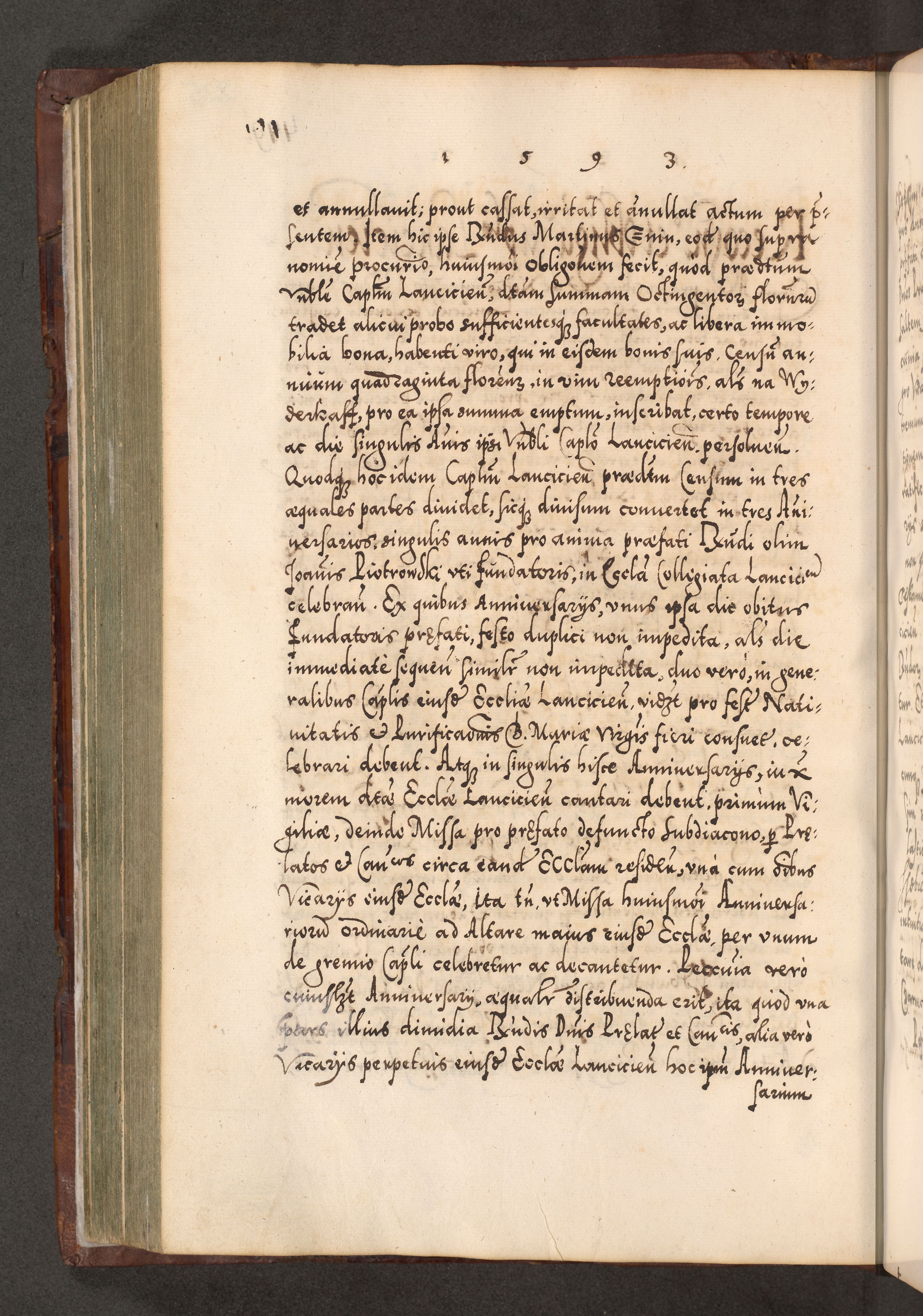 Illistrissimo et revedissimo in Christo Patre Domino Domino Georgio Rzadziwił Miserone Divina Sacrostae R. E. Tituli S. Sixti Presbitero Cardinali Duce in Olyka et Niesswiesz ad Gubernacula Ecclessiae Cracoviensis cuius administratorialem a Sancta Sede Apostolica obtinverat feliciter sedente. Acta actorum, causarum, sententiarum tam deffinitivarum quam interloquutoriarum decretorum, obligationum, quietationum, recognitionum, constitutionum procuratorum etc. coram Reverendo Domino Stanislao Crassinskz de Crasne Archidiacono Cracoviensis, Scholastico Gnesnesis, Custode Plocensis etc. Vicario et Officiali Generali Cracoviensi in Ano Domini Millesimo Quingentesimo Nonagesimo Primo cuius indictio quarta pontificatus SS. Domini Nostri Gregorii XIIII Anno I psius prio feliciter incipiut