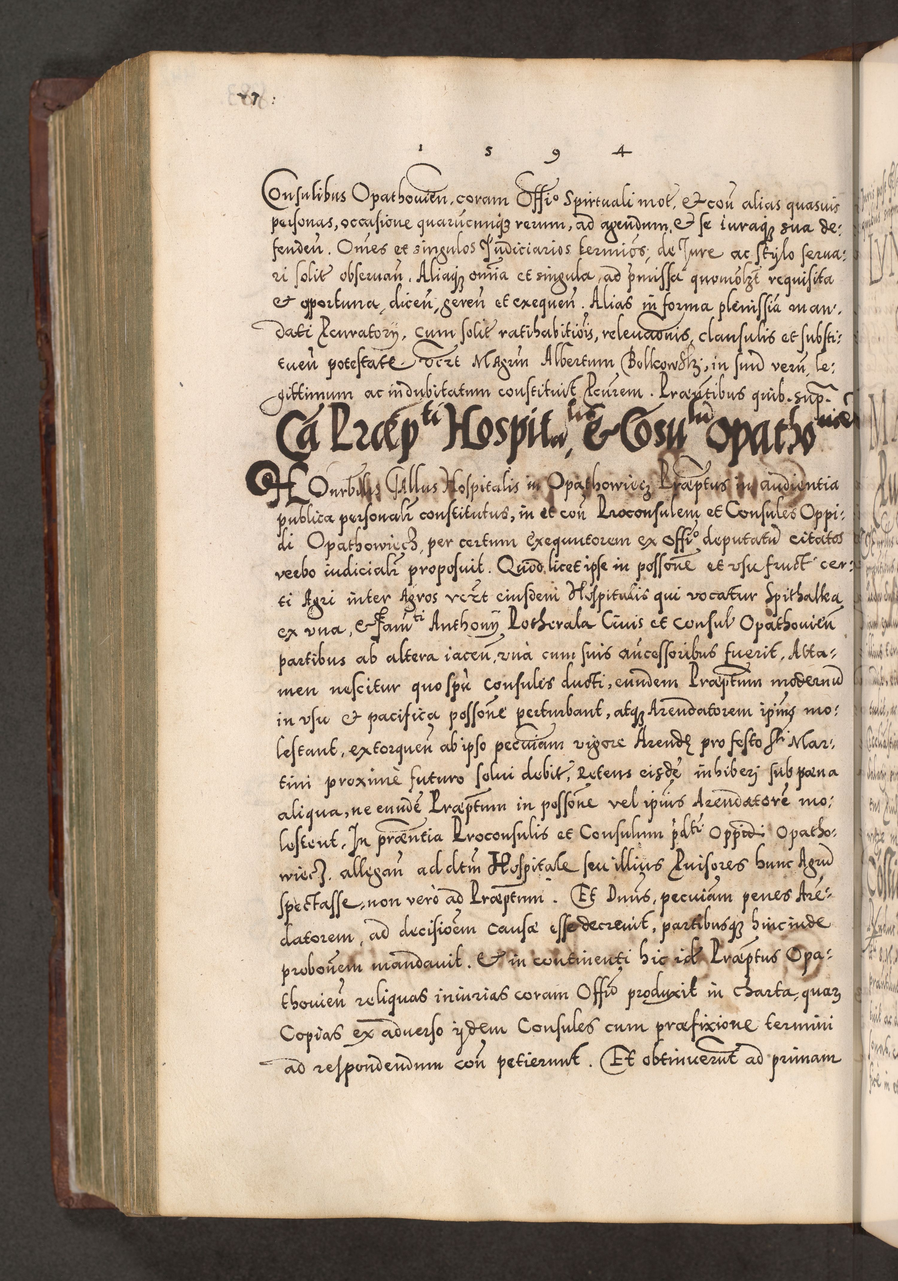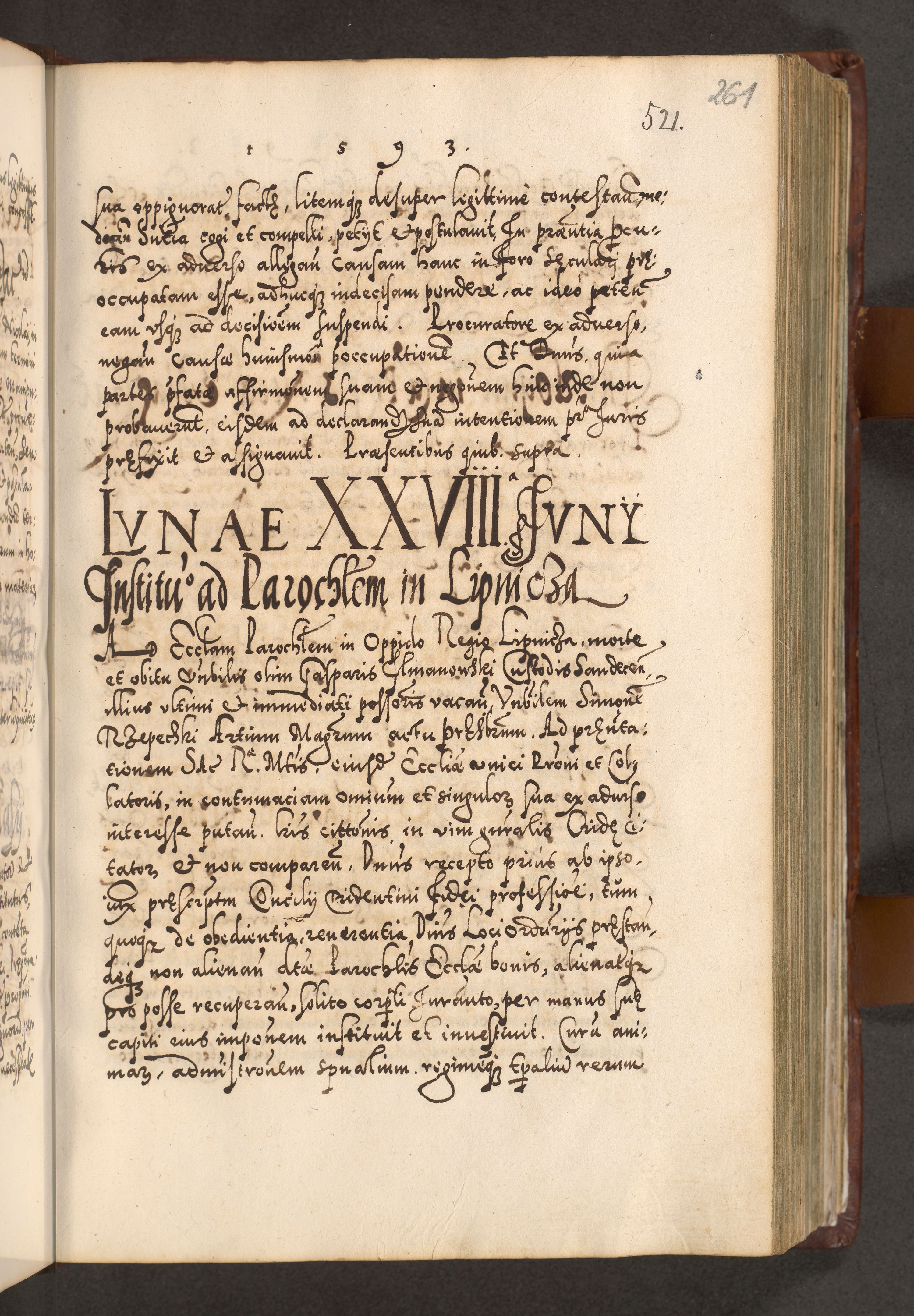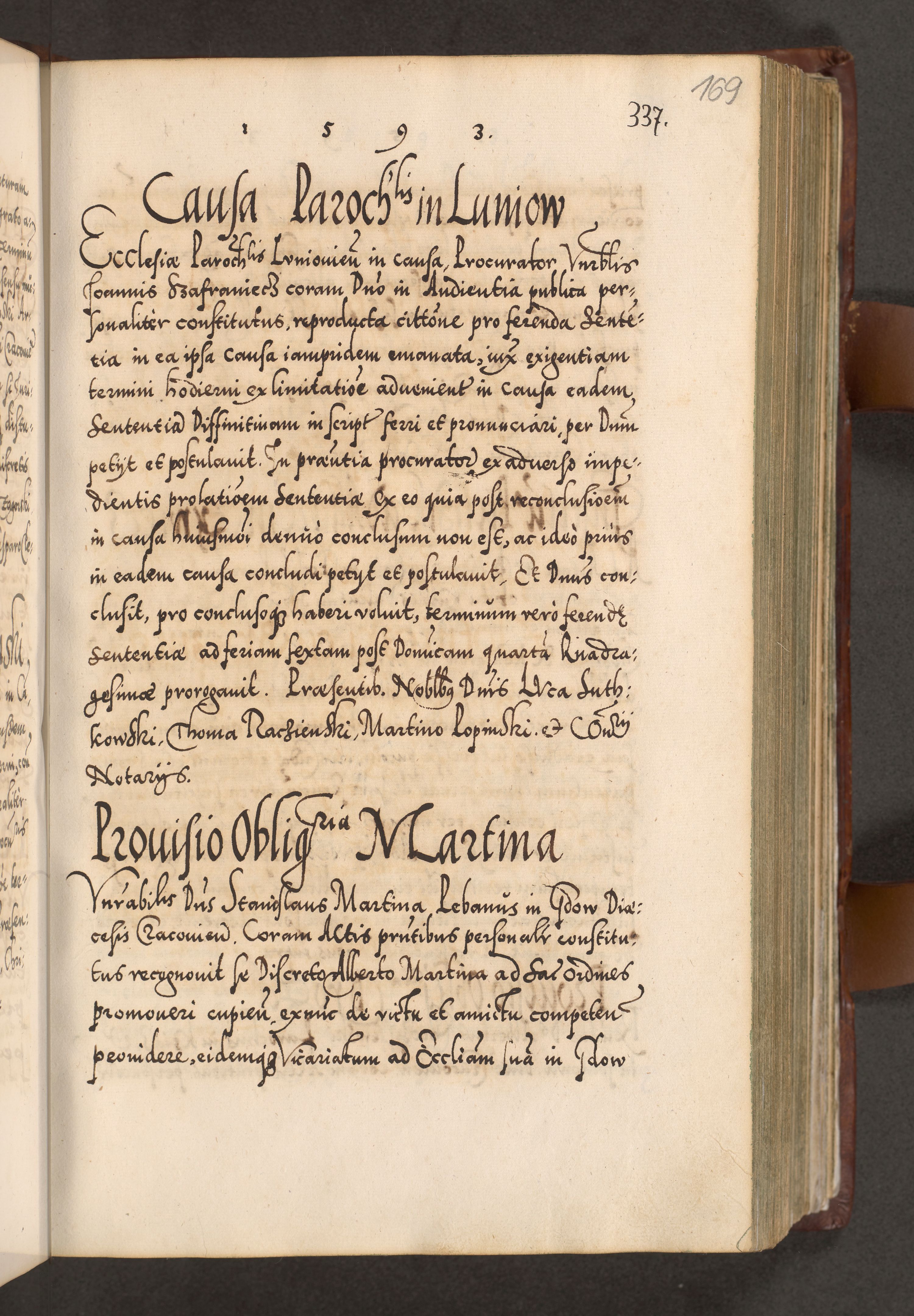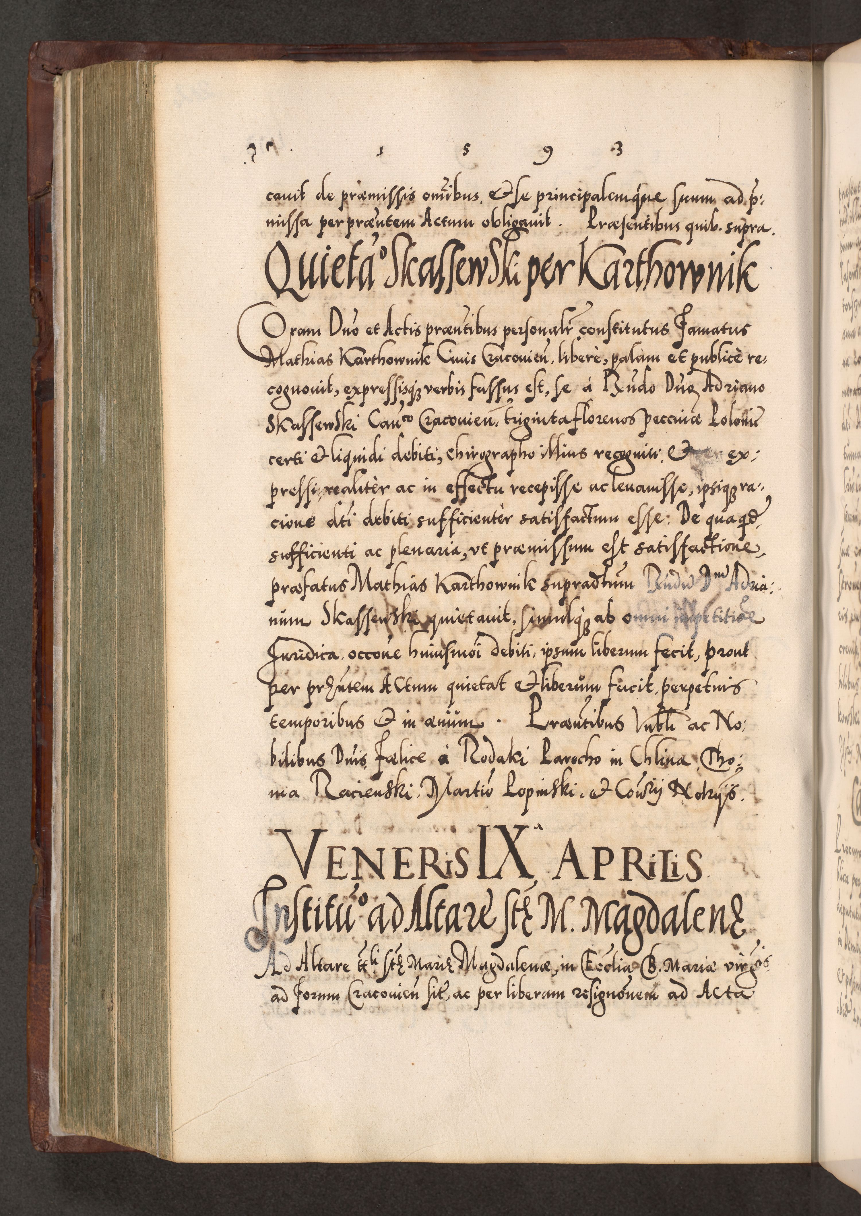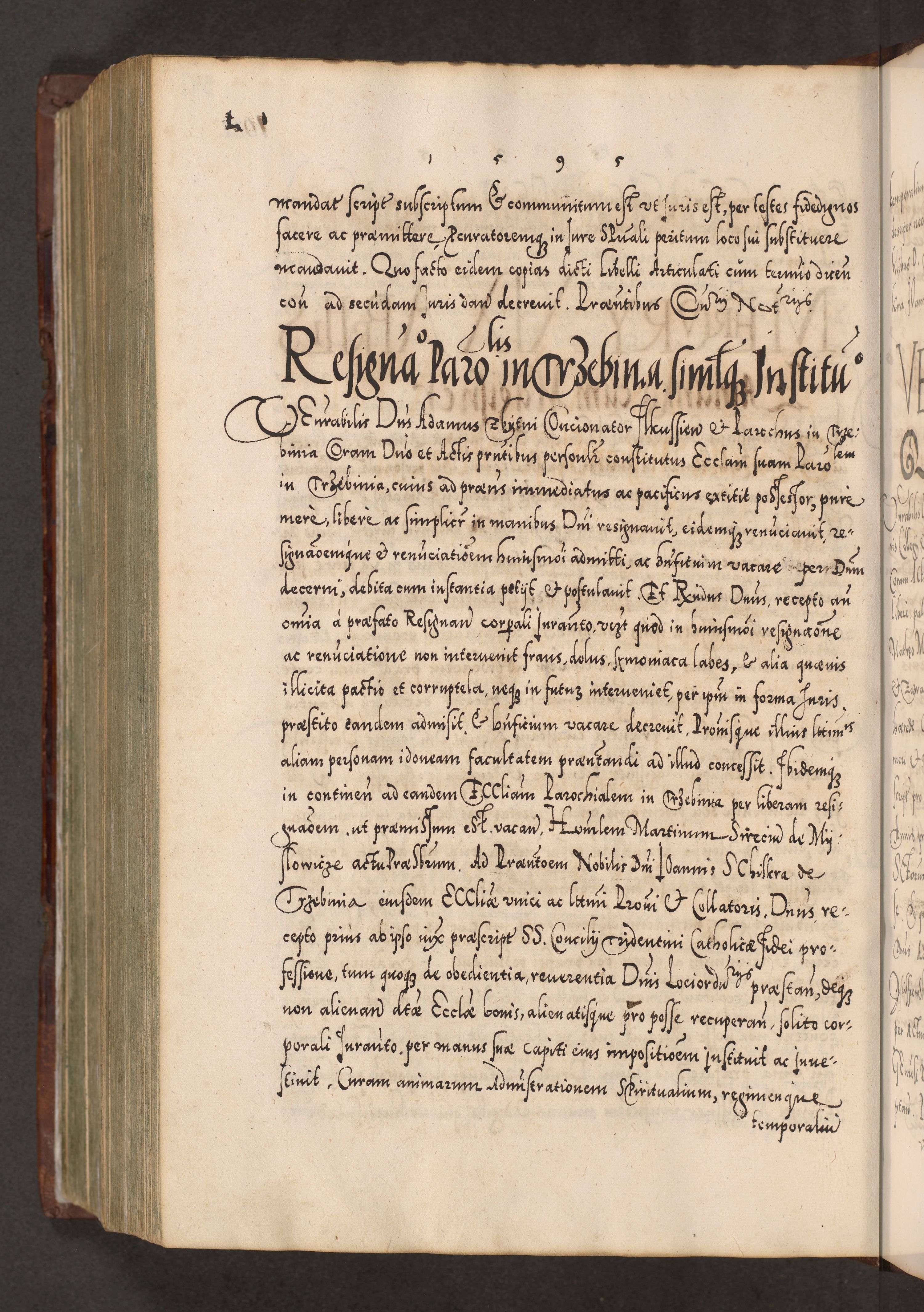 Illistrissimo et revedissimo in Christo Patre Domino Domino Georgio Rzadziwił Miserone Divina Sacrostae R. E. Tituli S. Sixti Presbitero Cardinali Duce in Olyka et Niesswiesz ad Gubernacula Ecclessiae Cracoviensis cuius administratorialem a Sancta Sede Apostolica obtinverat feliciter sedente. Acta actorum, causarum, sententiarum tam deffinitivarum quam interloquutoriarum decretorum, obligationum, quietationum, recognitionum, constitutionum procuratorum etc. coram Reverendo Domino Stanislao Crassinskz de Crasne Archidiacono Cracoviensis, Scholastico Gnesnesis, Custode Plocensis etc. Vicario et Officiali Generali Cracoviensi in Ano Domini Millesimo Quingentesimo Nonagesimo Primo cuius indictio quarta pontificatus SS. Domini Nostri Gregorii XIIII Anno I psius prio feliciter incipiut