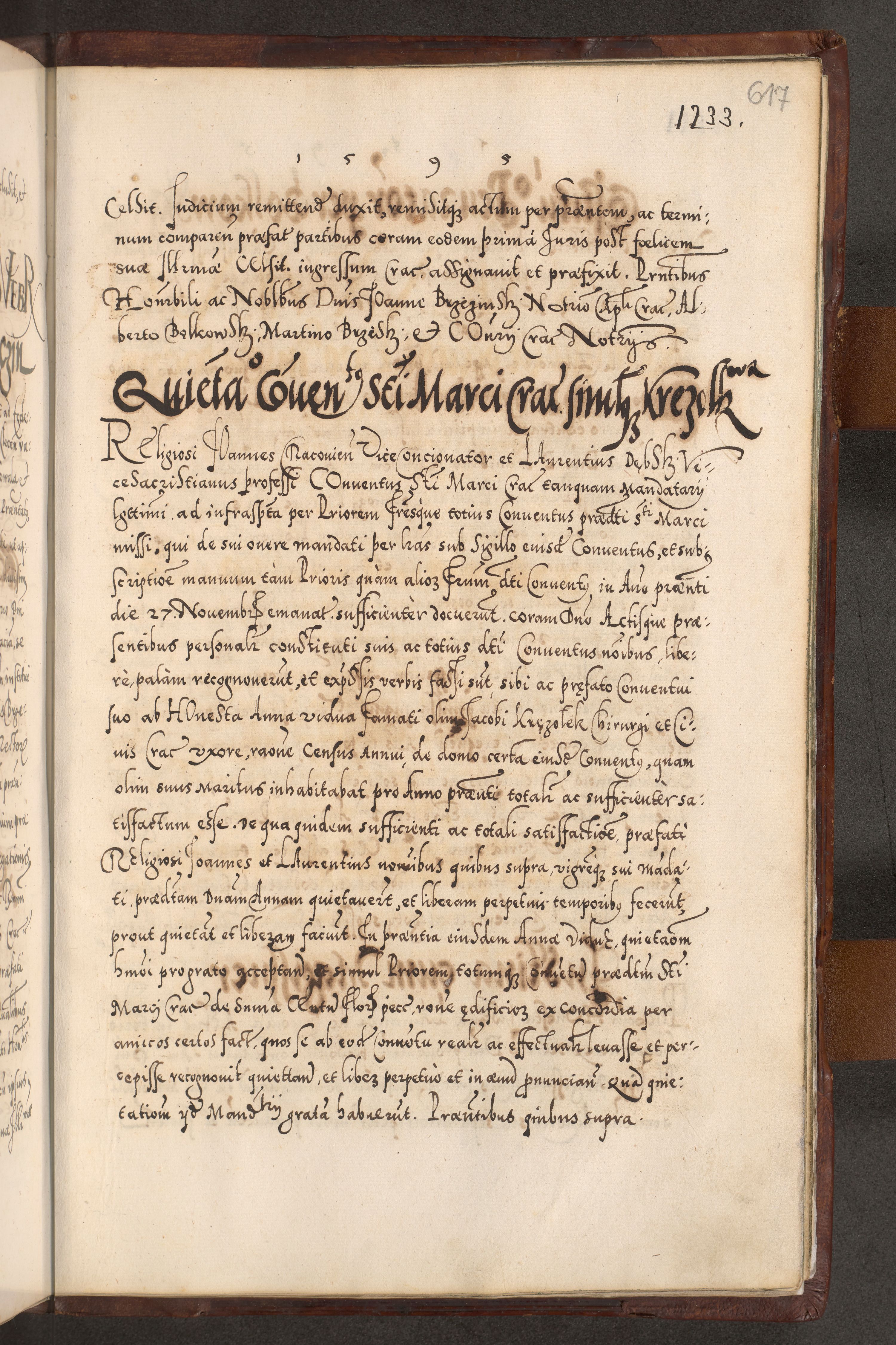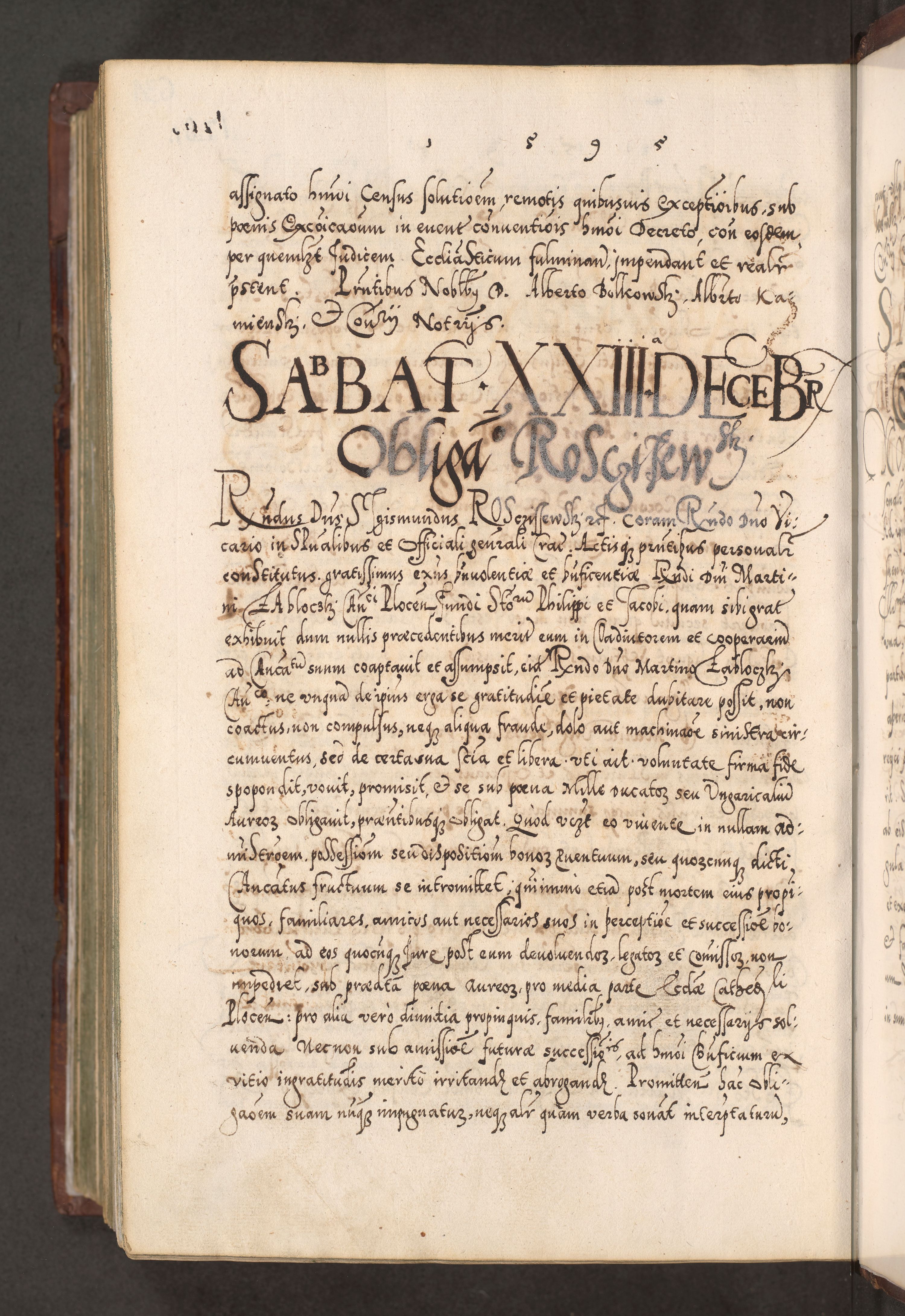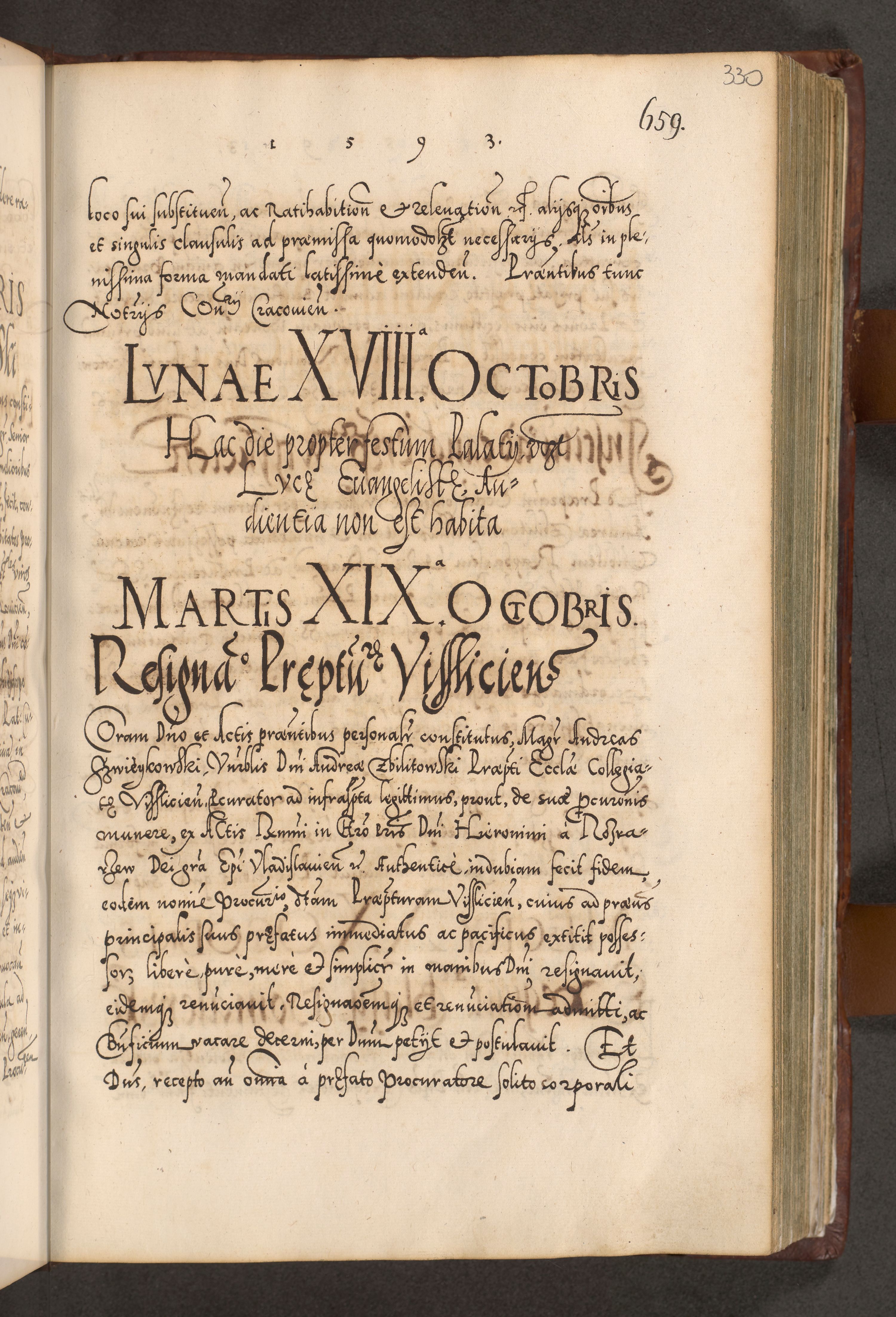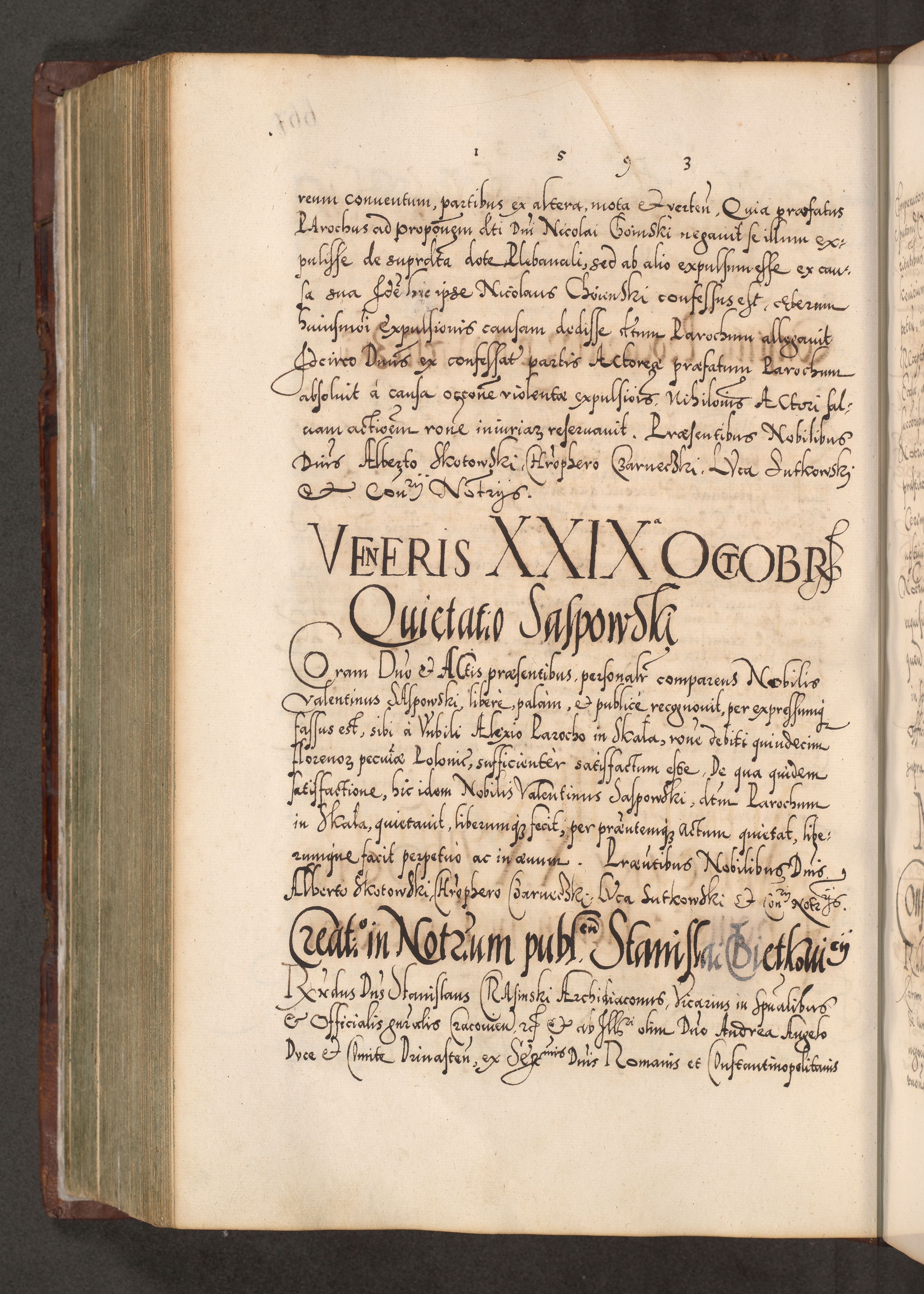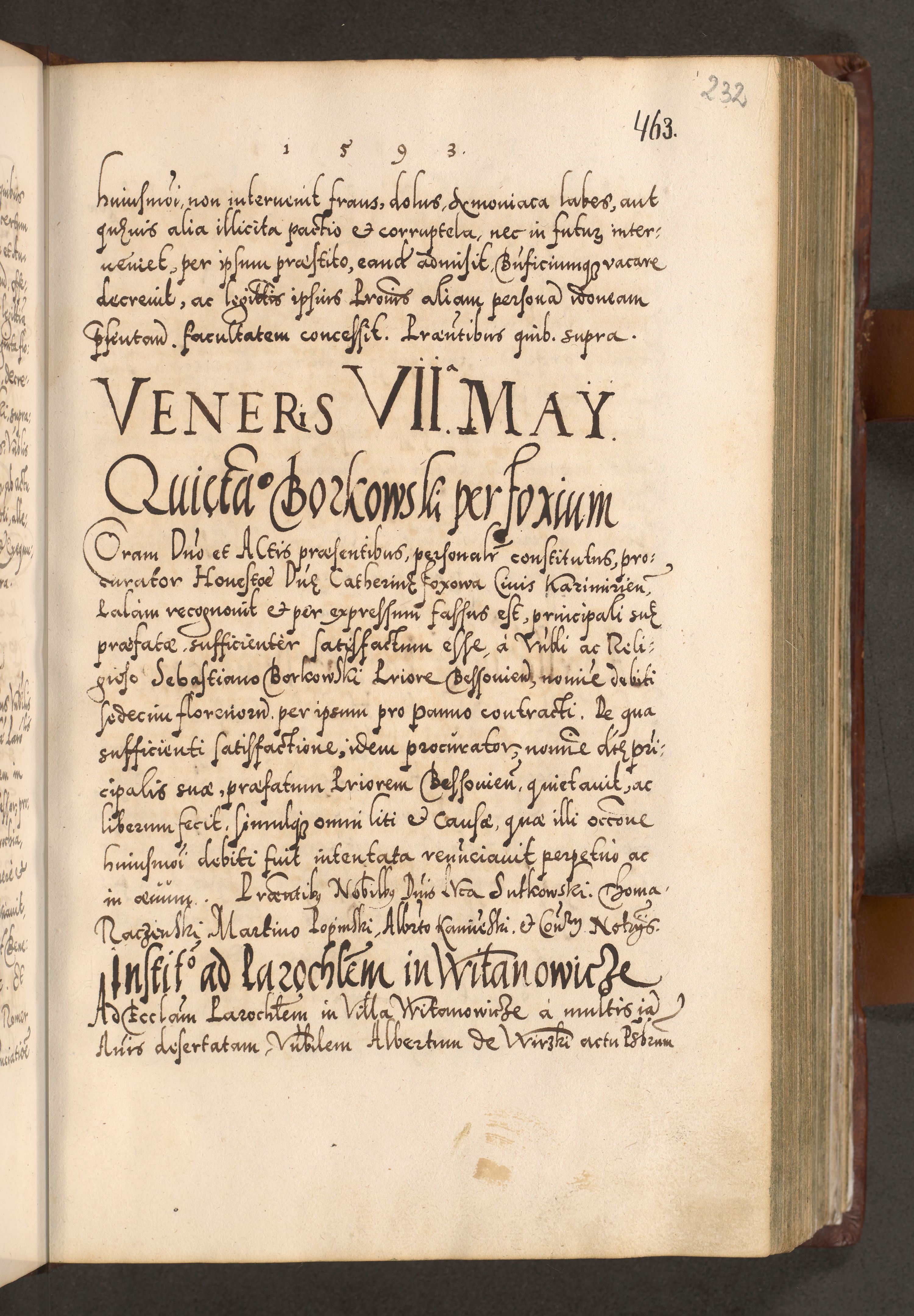 Illistrissimo et revedissimo in Christo Patre Domino Domino Georgio Rzadziwił Miserone Divina Sacrostae R. E. Tituli S. Sixti Presbitero Cardinali Duce in Olyka et Niesswiesz ad Gubernacula Ecclessiae Cracoviensis cuius administratorialem a Sancta Sede Apostolica obtinverat feliciter sedente. Acta actorum, causarum, sententiarum tam deffinitivarum quam interloquutoriarum decretorum, obligationum, quietationum, recognitionum, constitutionum procuratorum etc. coram Reverendo Domino Stanislao Crassinskz de Crasne Archidiacono Cracoviensis, Scholastico Gnesnesis, Custode Plocensis etc. Vicario et Officiali Generali Cracoviensi in Ano Domini Millesimo Quingentesimo Nonagesimo Primo cuius indictio quarta pontificatus SS. Domini Nostri Gregorii XIIII Anno I psius prio feliciter incipiut