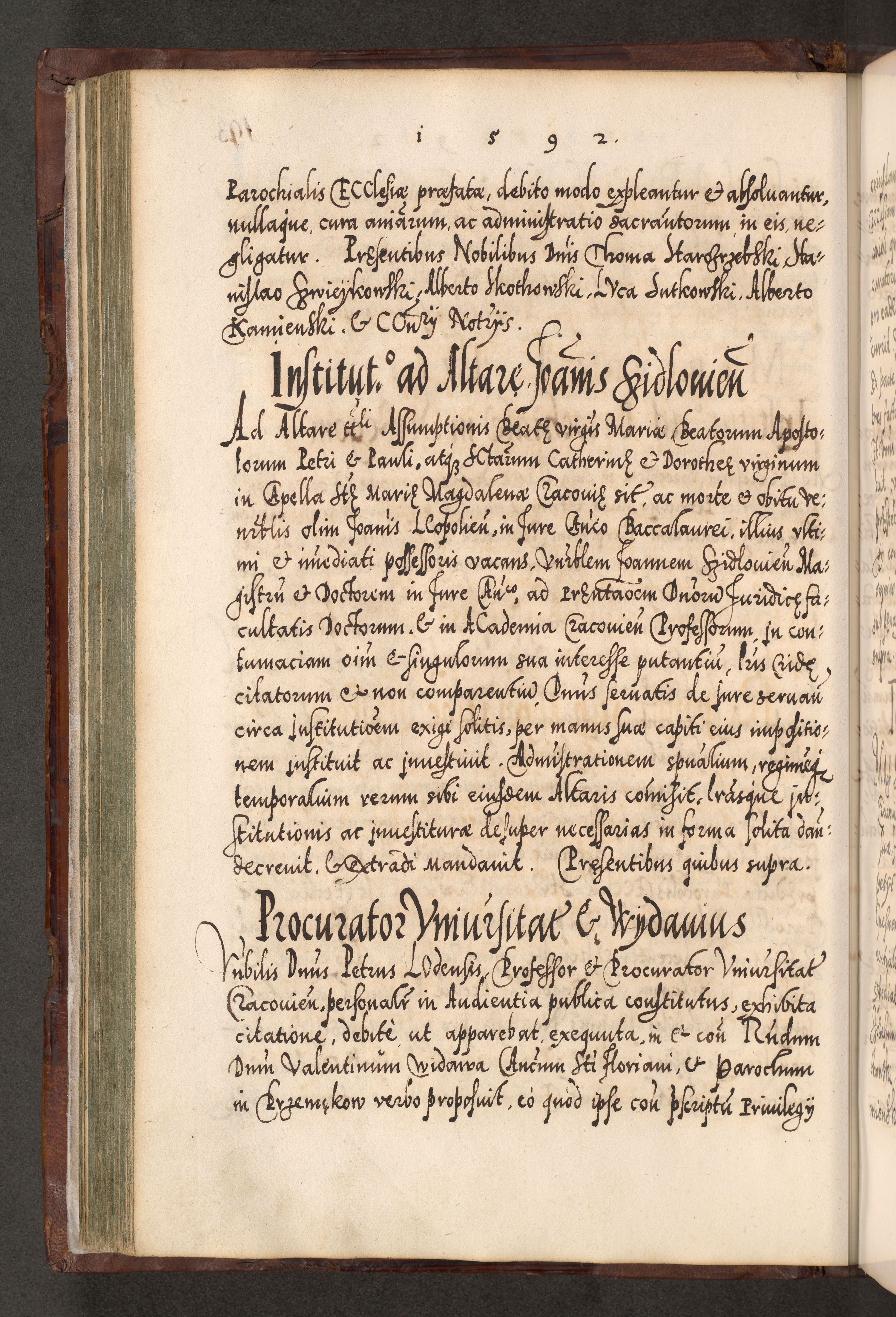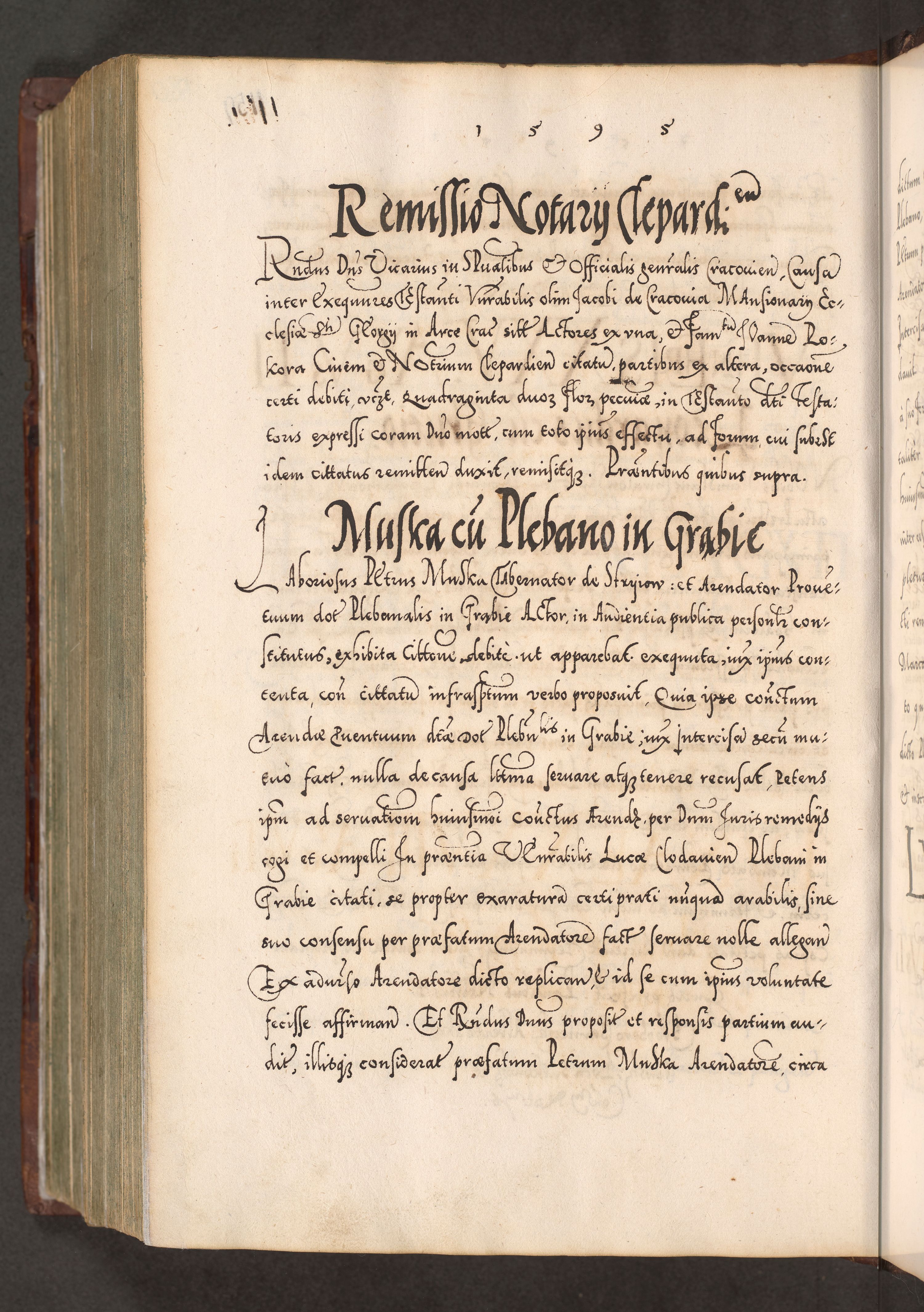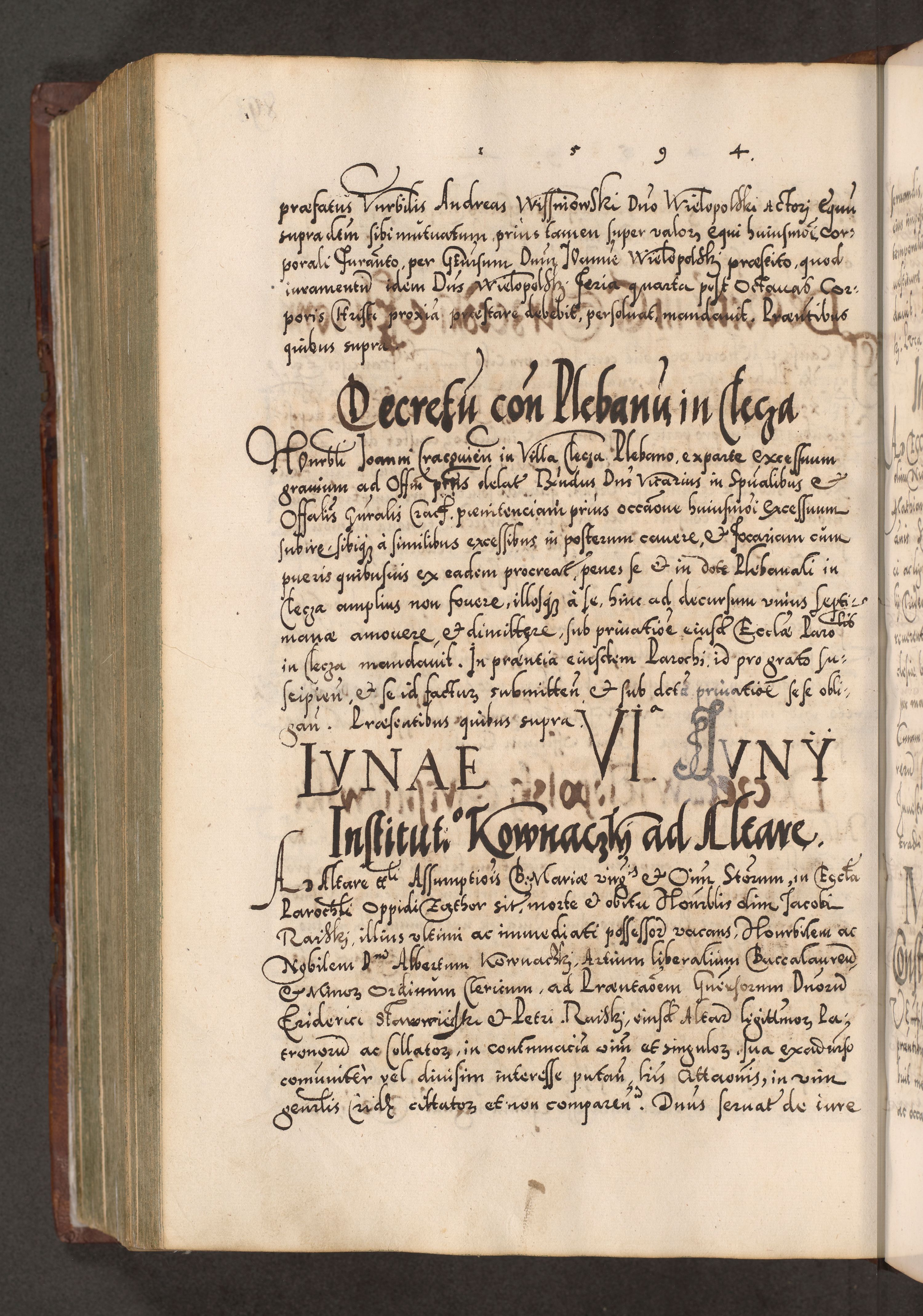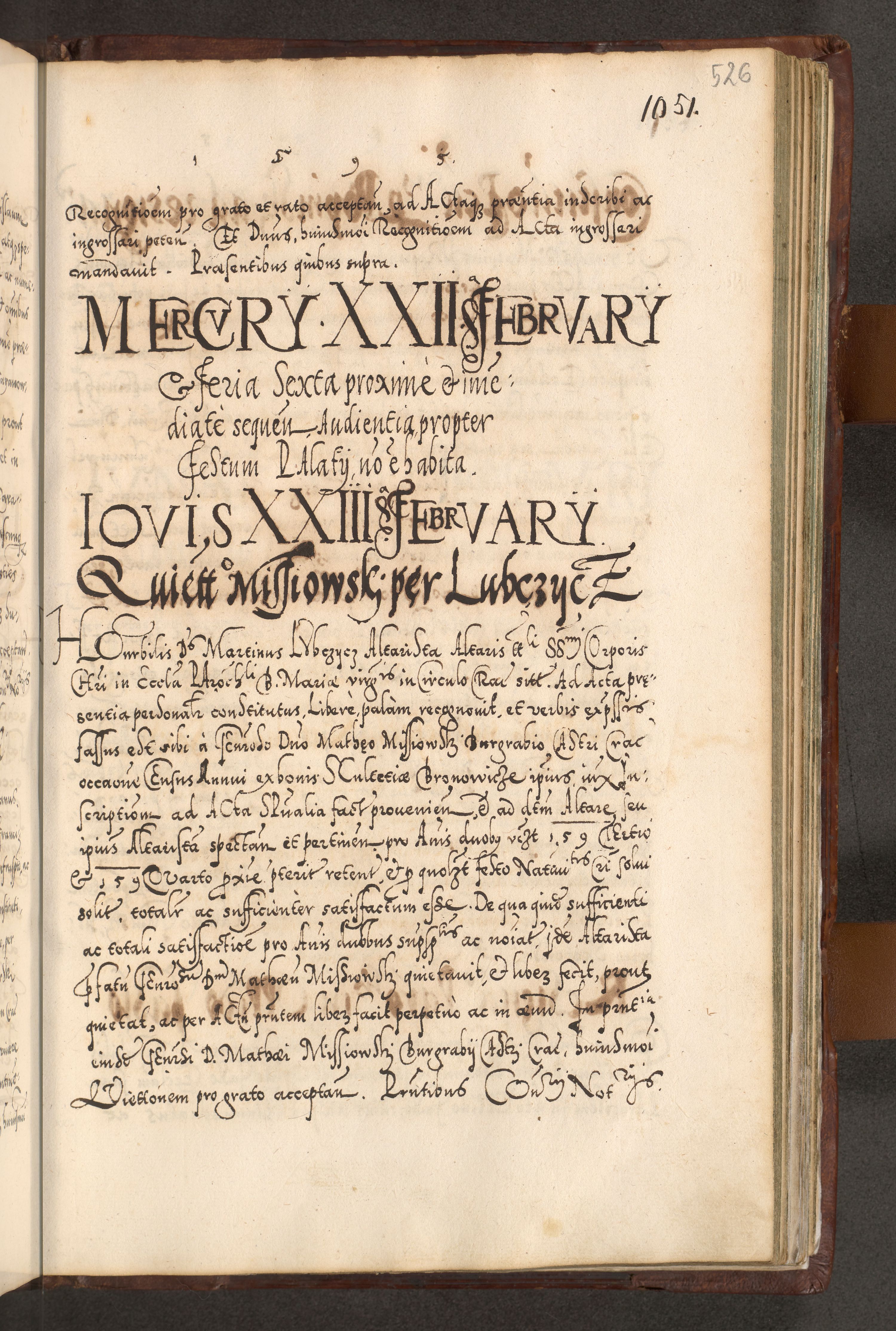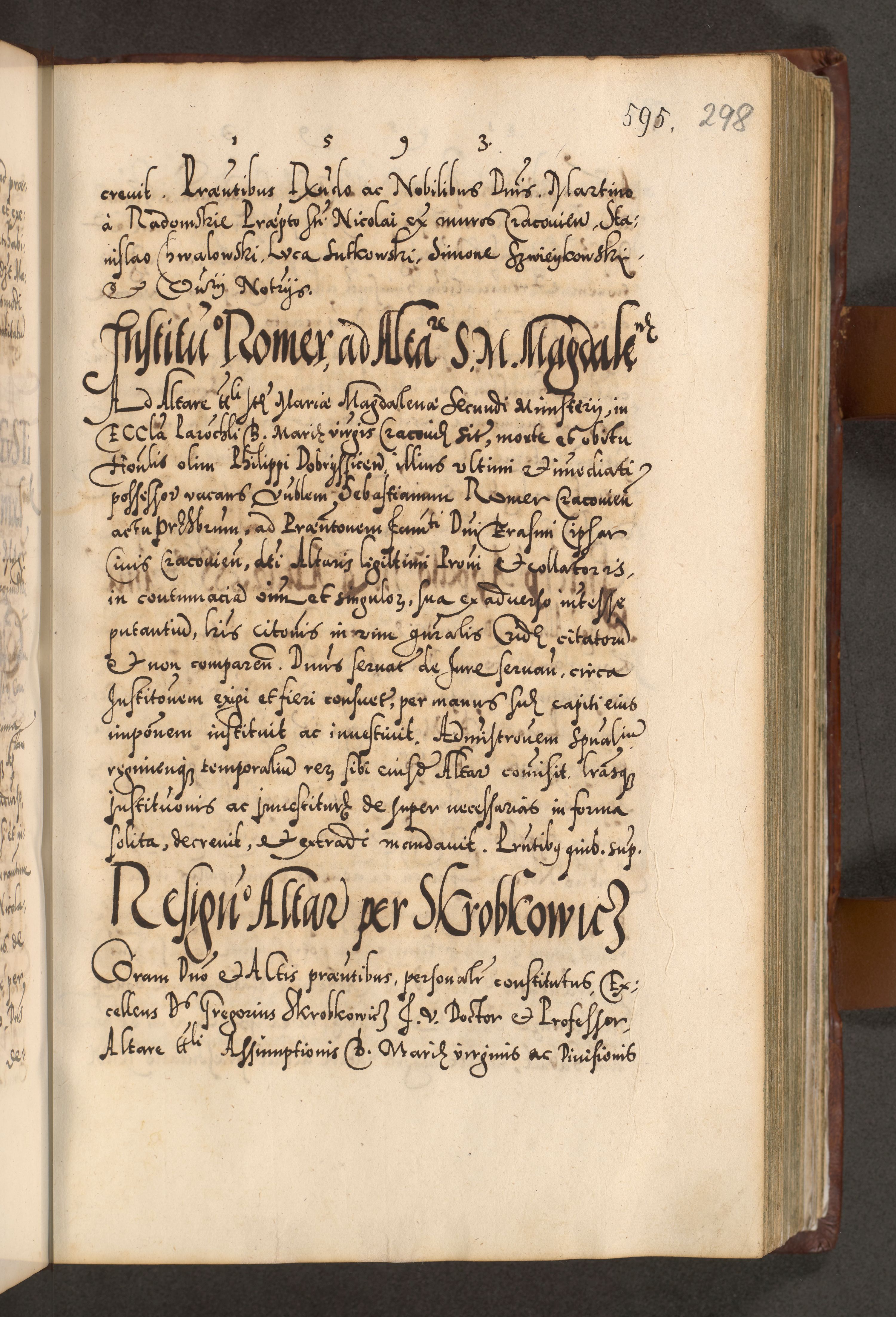Illistrissimo et revedissimo in Christo Patre Domino Domino Georgio Rzadziwił Miserone Divina Sacrostae R. E. Tituli S. Sixti Presbitero Cardinali Duce in Olyka et Niesswiesz ad Gubernacula Ecclessiae Cracoviensis cuius administratorialem a Sancta Sede Apostolica obtinverat feliciter sedente. Acta actorum, causarum, sententiarum tam deffinitivarum quam interloquutoriarum decretorum, obligationum, quietationum, recognitionum, constitutionum procuratorum etc. coram Reverendo Domino Stanislao Crassinskz de Crasne Archidiacono Cracoviensis, Scholastico Gnesnesis, Custode Plocensis etc. Vicario et Officiali Generali Cracoviensi in Ano Domini Millesimo Quingentesimo Nonagesimo Primo cuius indictio quarta pontificatus SS. Domini Nostri Gregorii XIIII Anno I psius prio feliciter incipiut