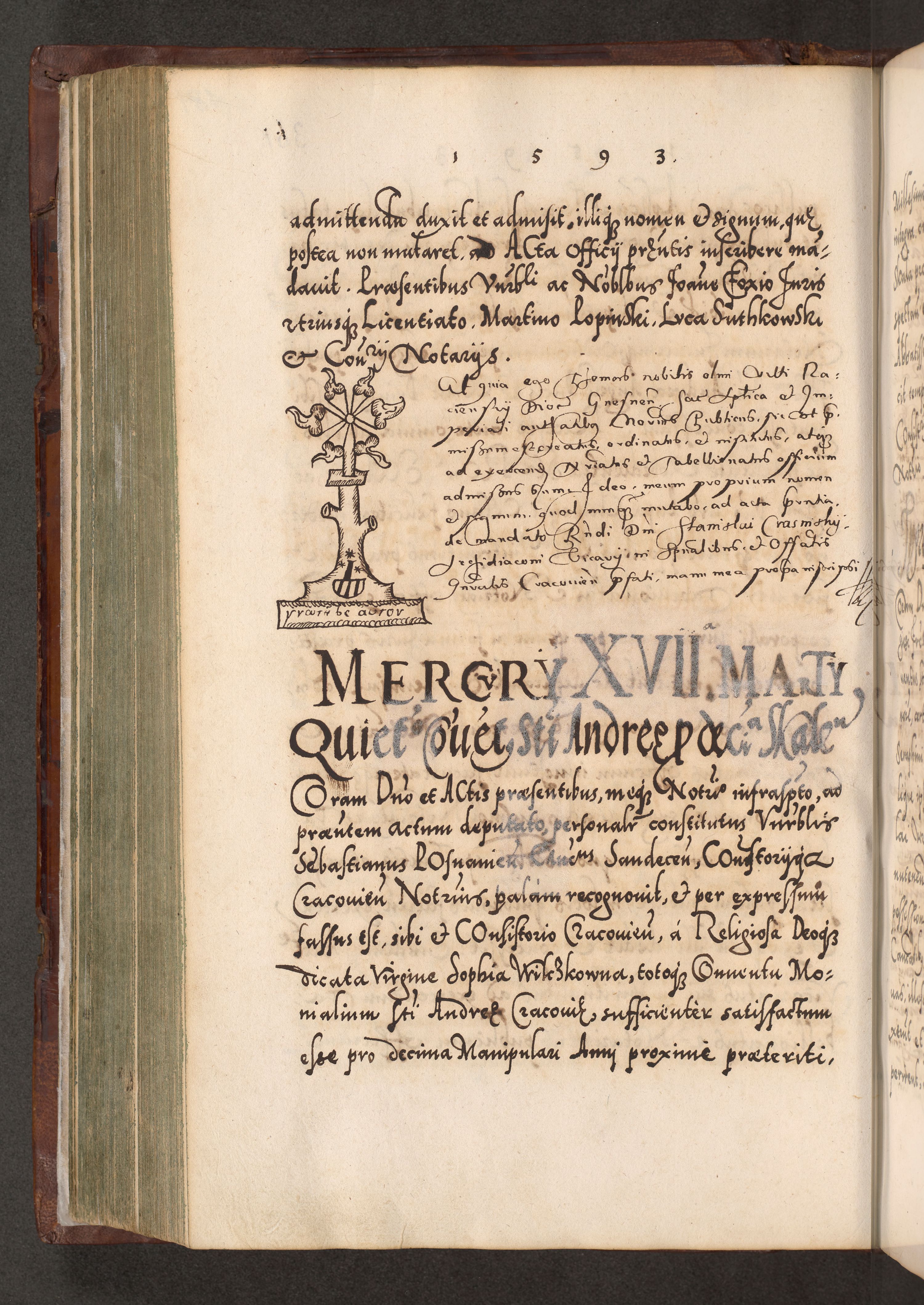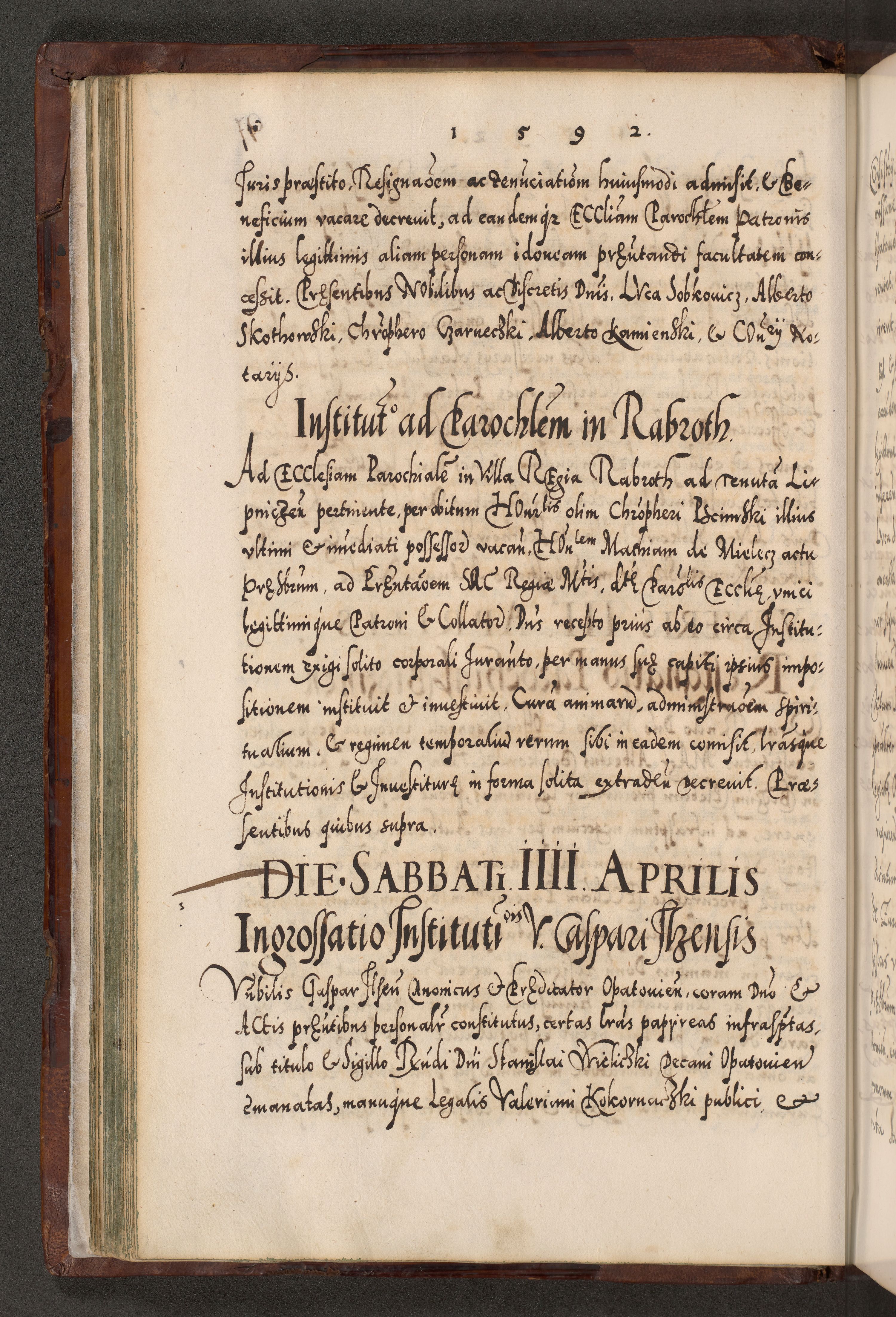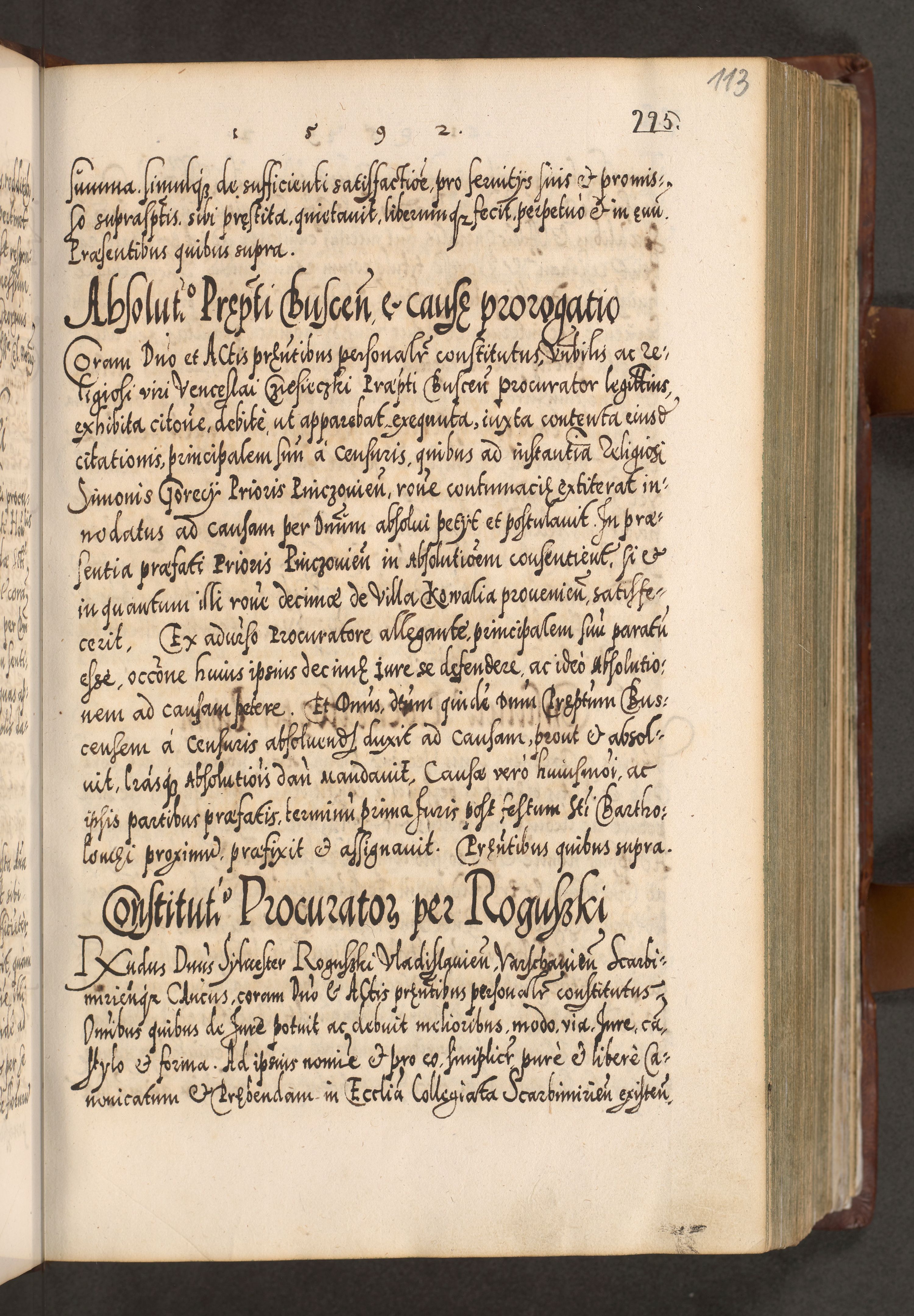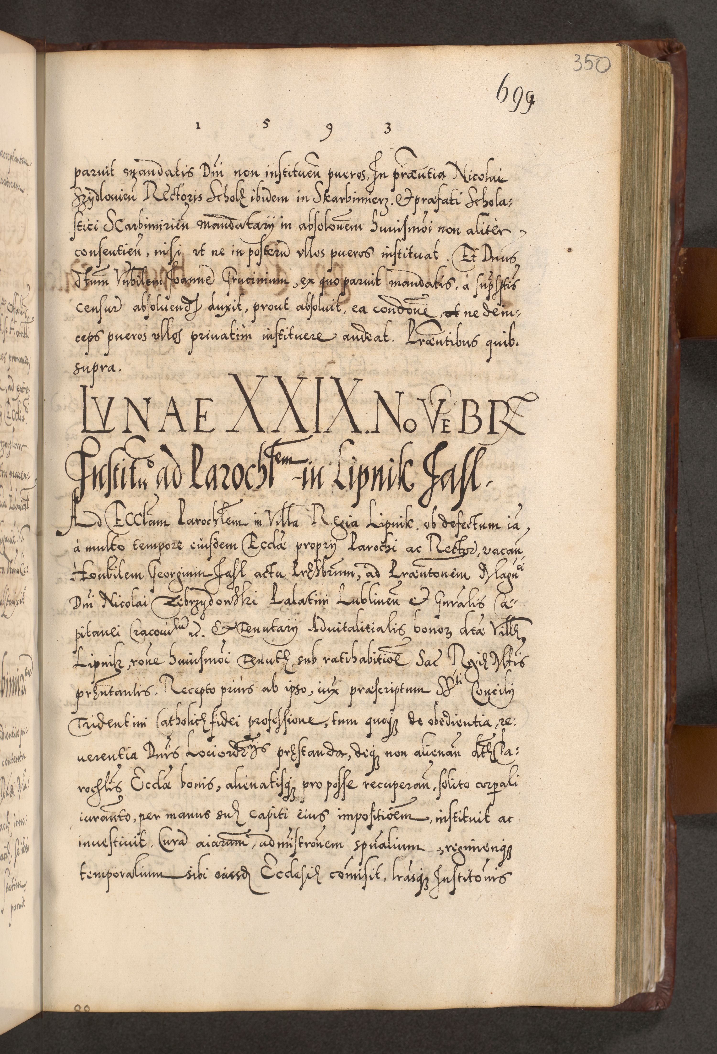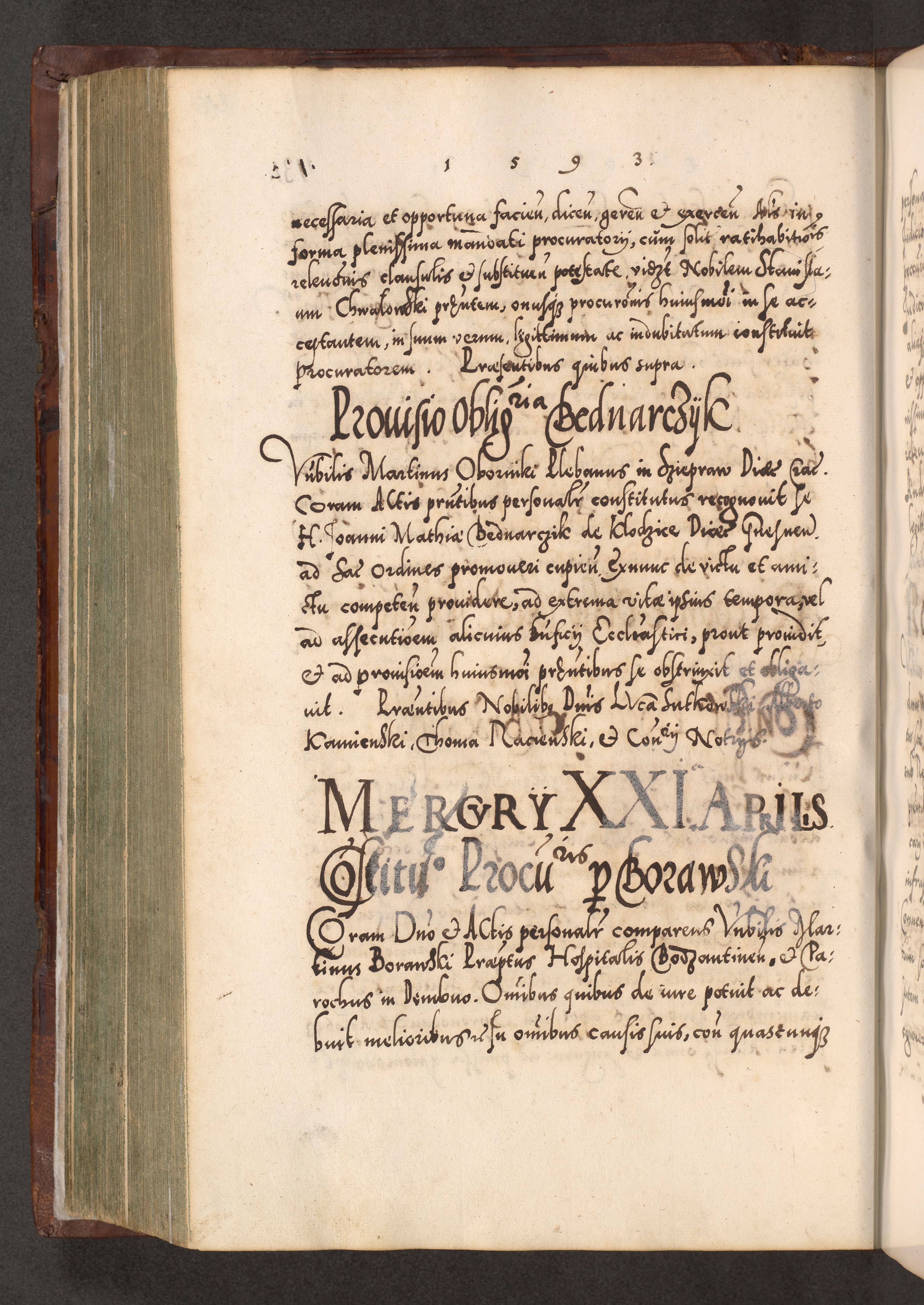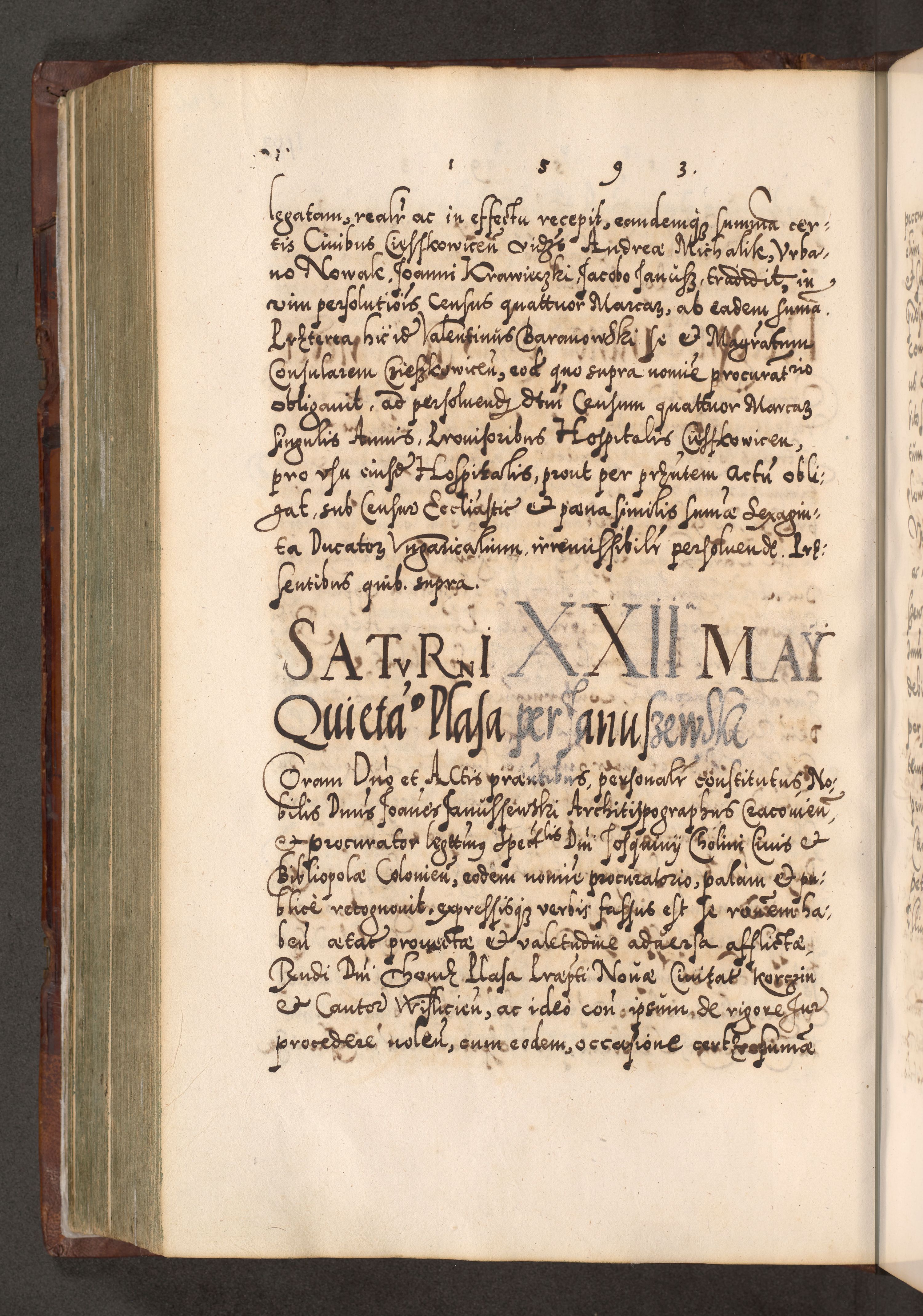 Illistrissimo et revedissimo in Christo Patre Domino Domino Georgio Rzadziwił Miserone Divina Sacrostae R. E. Tituli S. Sixti Presbitero Cardinali Duce in Olyka et Niesswiesz ad Gubernacula Ecclessiae Cracoviensis cuius administratorialem a Sancta Sede Apostolica obtinverat feliciter sedente. Acta actorum, causarum, sententiarum tam deffinitivarum quam interloquutoriarum decretorum, obligationum, quietationum, recognitionum, constitutionum procuratorum etc. coram Reverendo Domino Stanislao Crassinskz de Crasne Archidiacono Cracoviensis, Scholastico Gnesnesis, Custode Plocensis etc. Vicario et Officiali Generali Cracoviensi in Ano Domini Millesimo Quingentesimo Nonagesimo Primo cuius indictio quarta pontificatus SS. Domini Nostri Gregorii XIIII Anno I psius prio feliciter incipiut