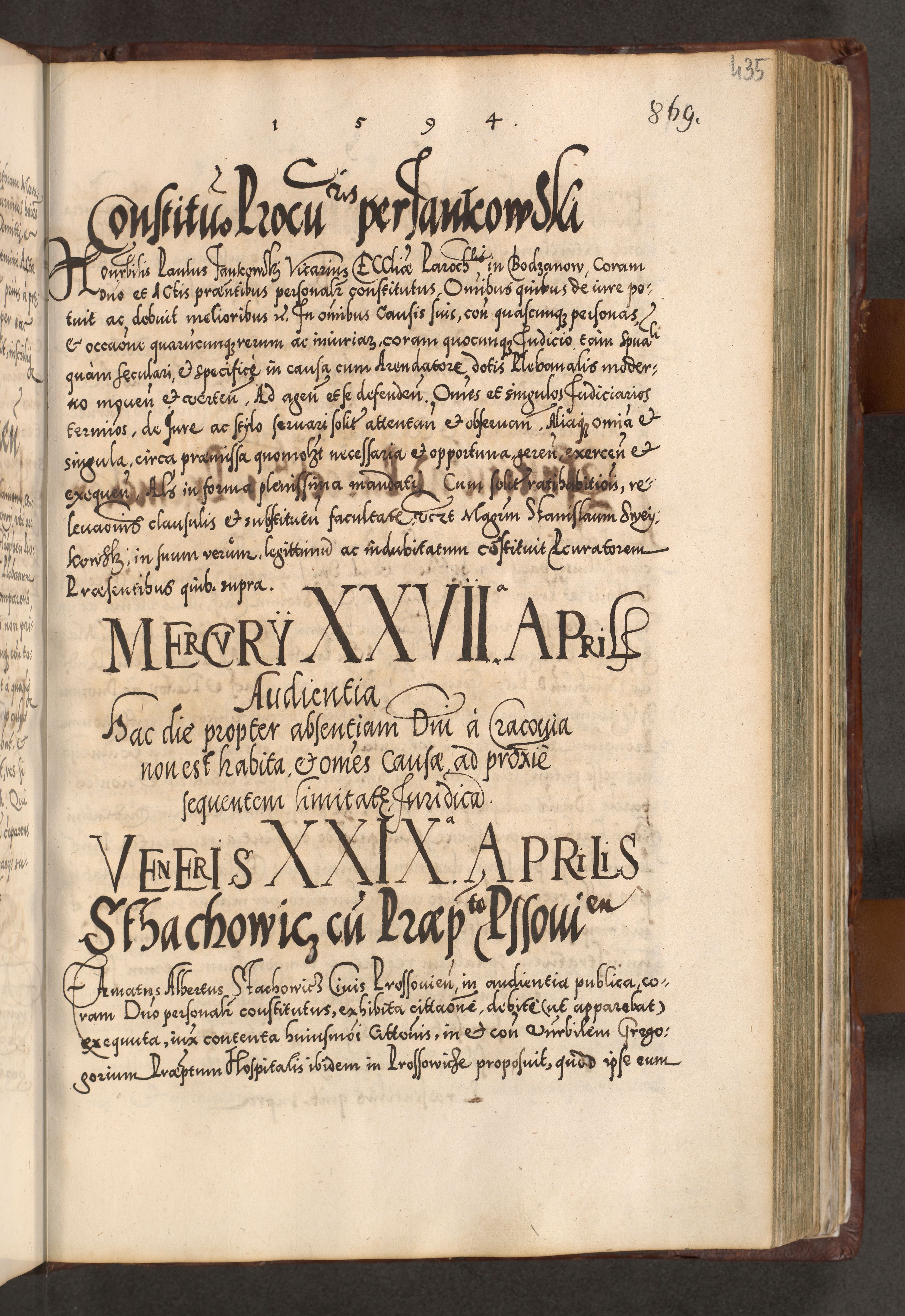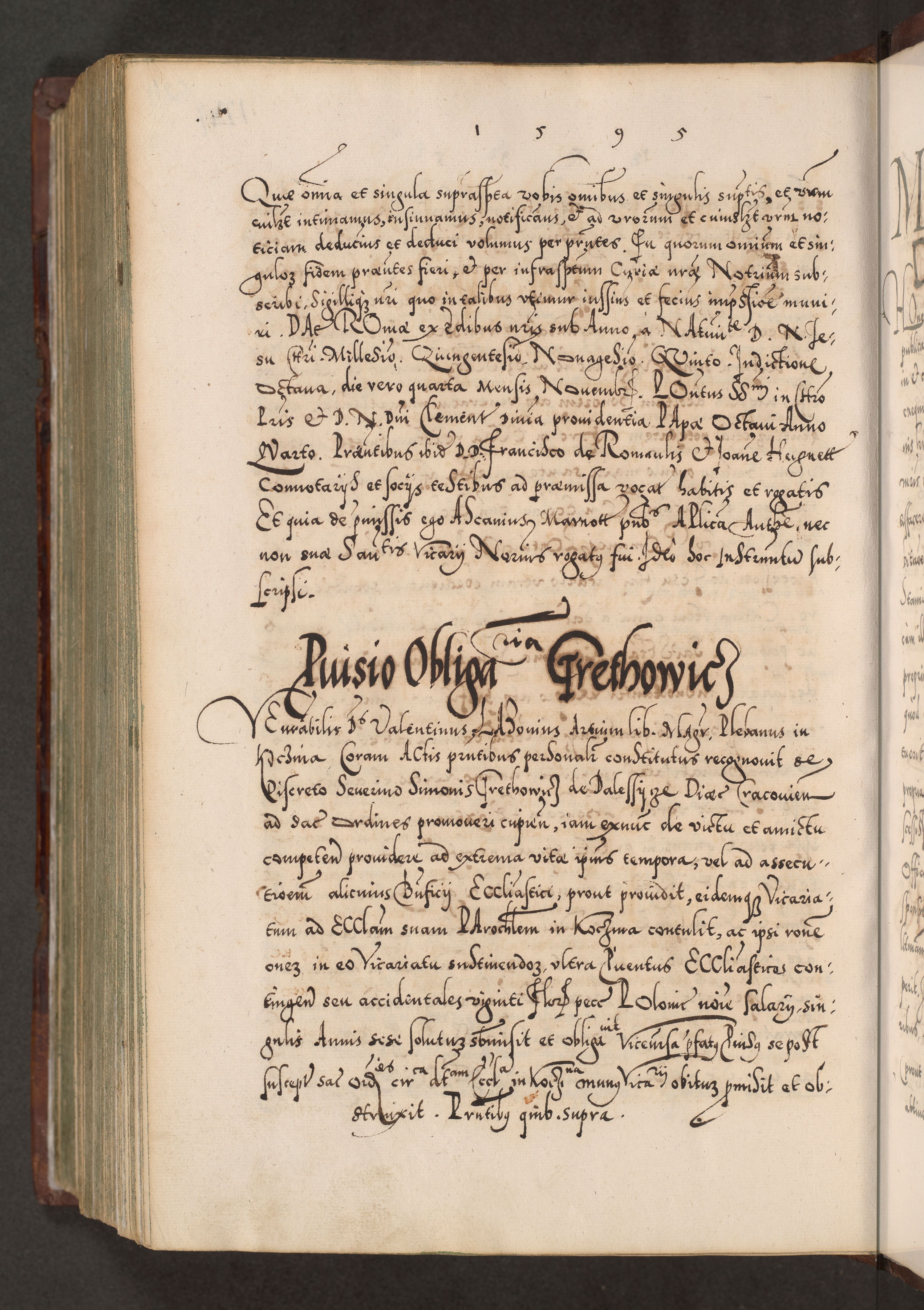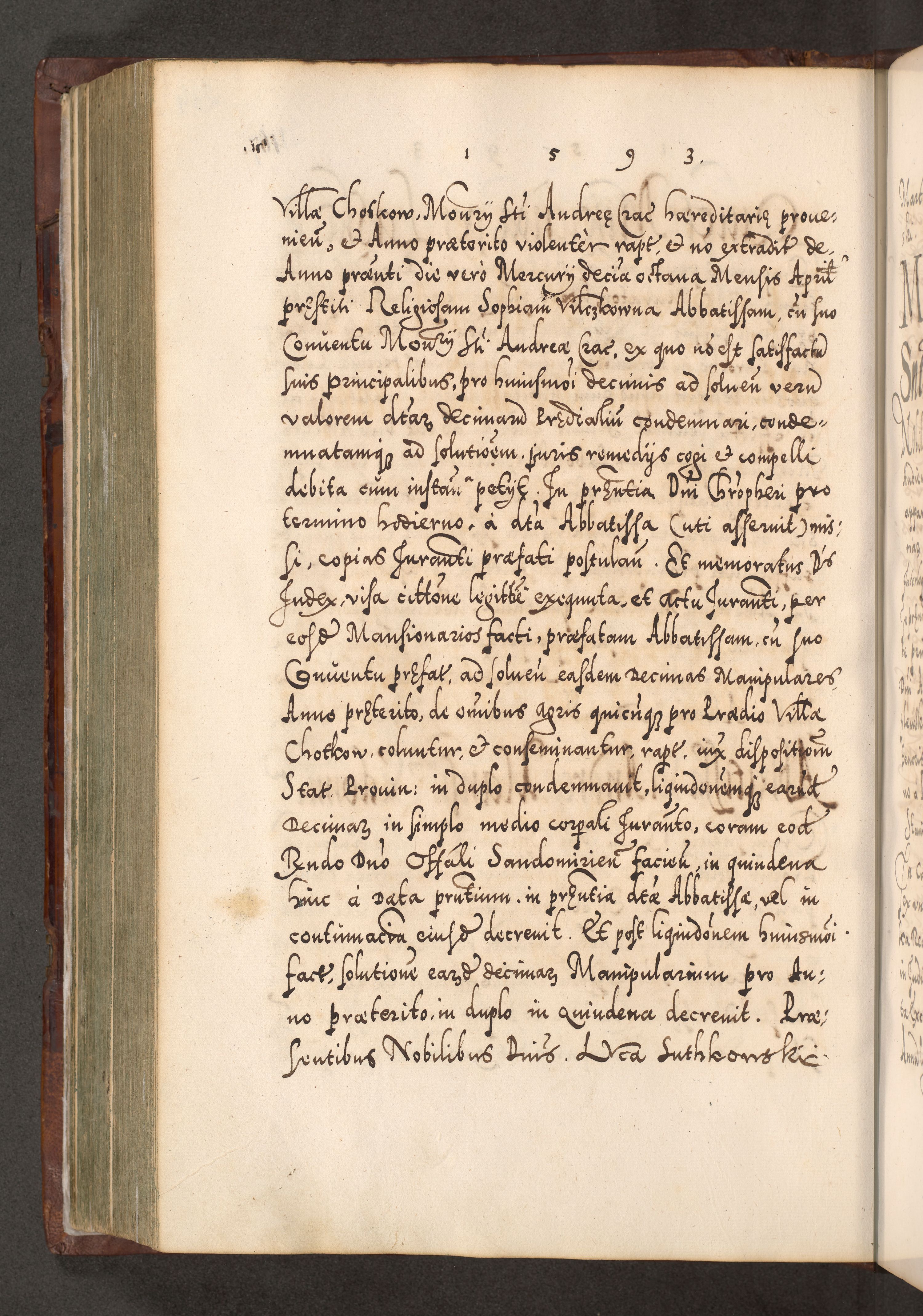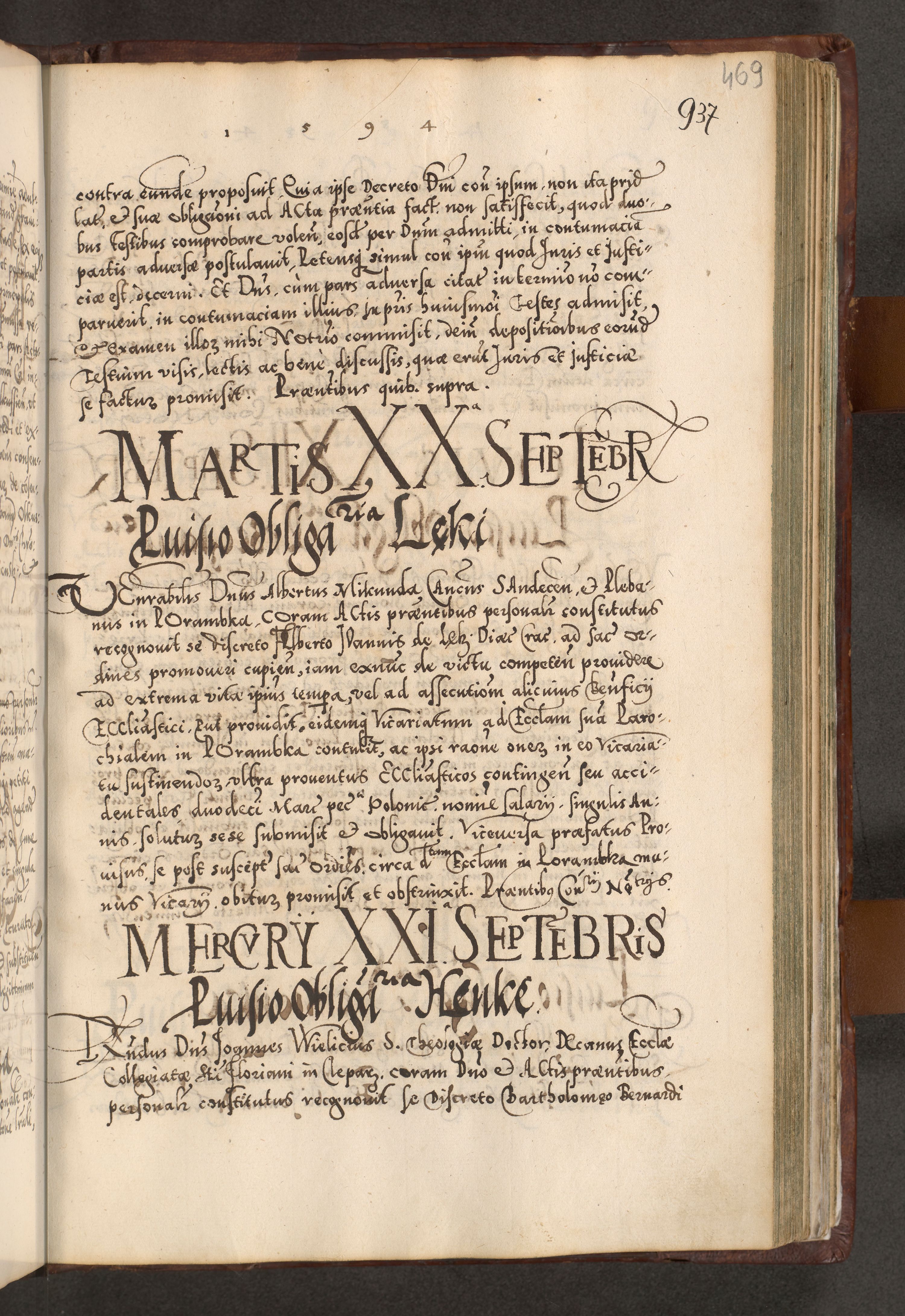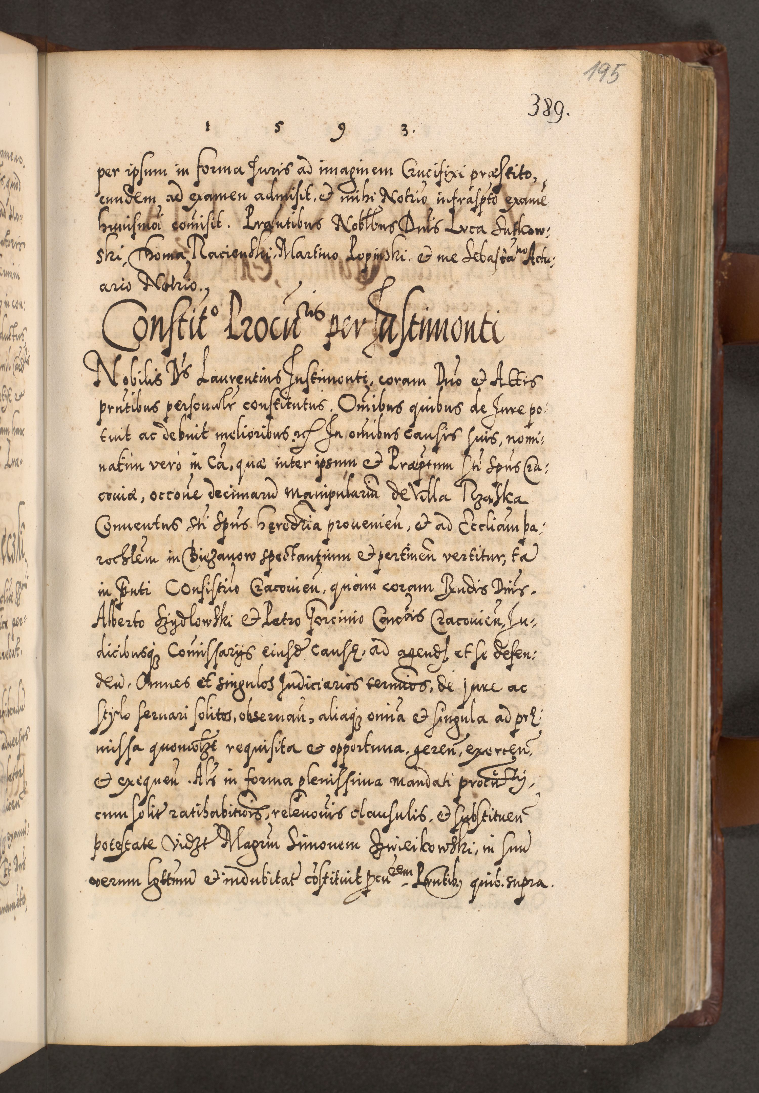 Illistrissimo et revedissimo in Christo Patre Domino Domino Georgio Rzadziwił Miserone Divina Sacrostae R. E. Tituli S. Sixti Presbitero Cardinali Duce in Olyka et Niesswiesz ad Gubernacula Ecclessiae Cracoviensis cuius administratorialem a Sancta Sede Apostolica obtinverat feliciter sedente. Acta actorum, causarum, sententiarum tam deffinitivarum quam interloquutoriarum decretorum, obligationum, quietationum, recognitionum, constitutionum procuratorum etc. coram Reverendo Domino Stanislao Crassinskz de Crasne Archidiacono Cracoviensis, Scholastico Gnesnesis, Custode Plocensis etc. Vicario et Officiali Generali Cracoviensi in Ano Domini Millesimo Quingentesimo Nonagesimo Primo cuius indictio quarta pontificatus SS. Domini Nostri Gregorii XIIII Anno I psius prio feliciter incipiut