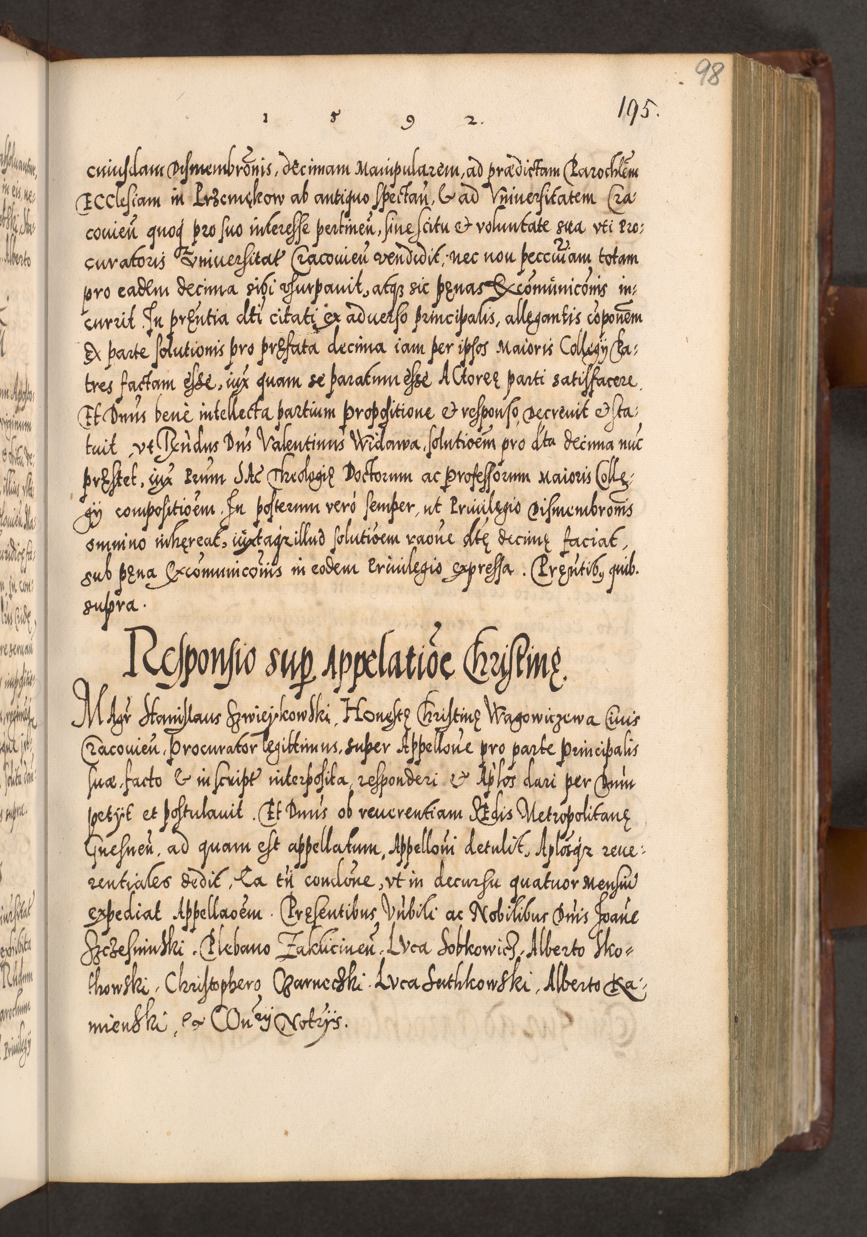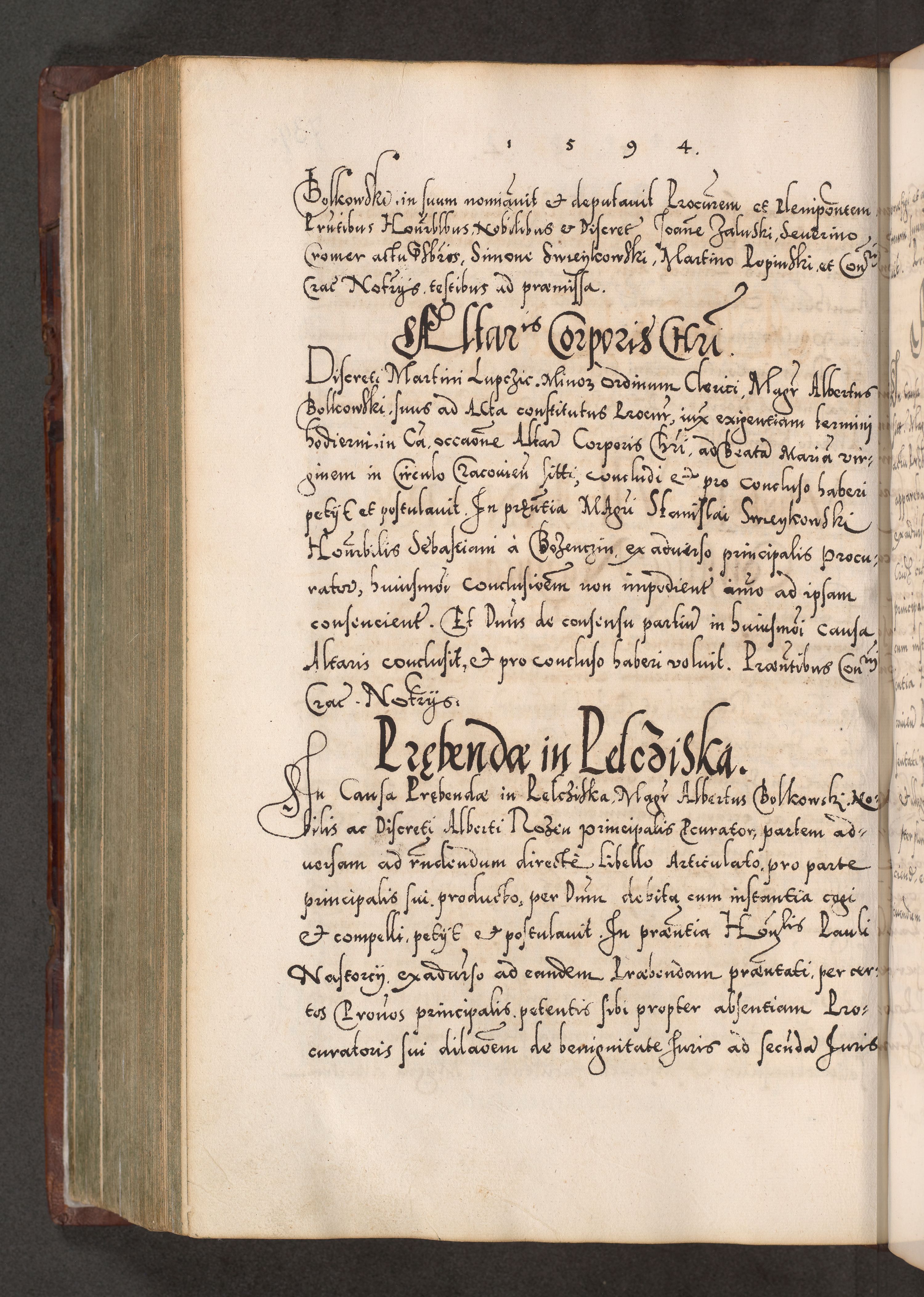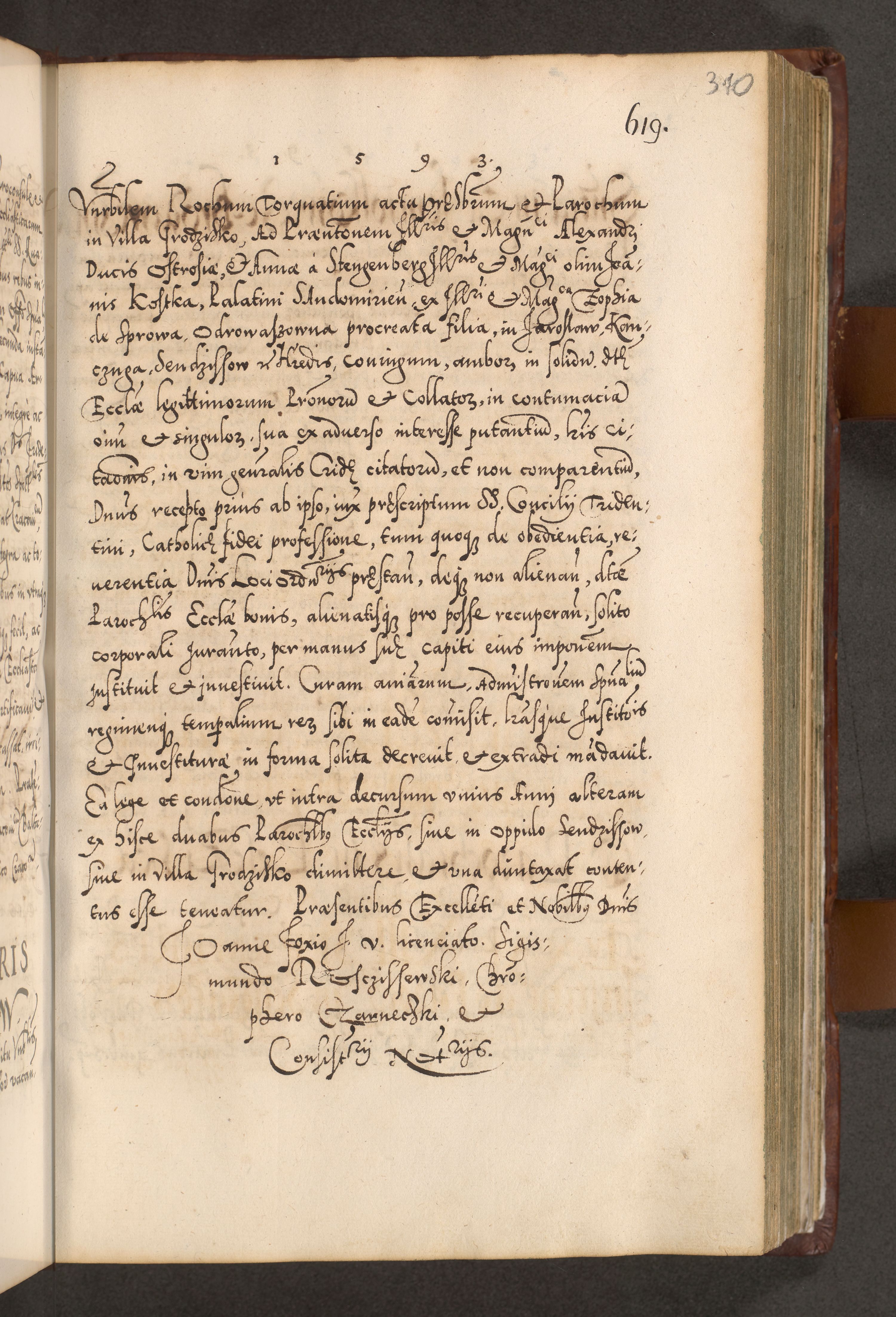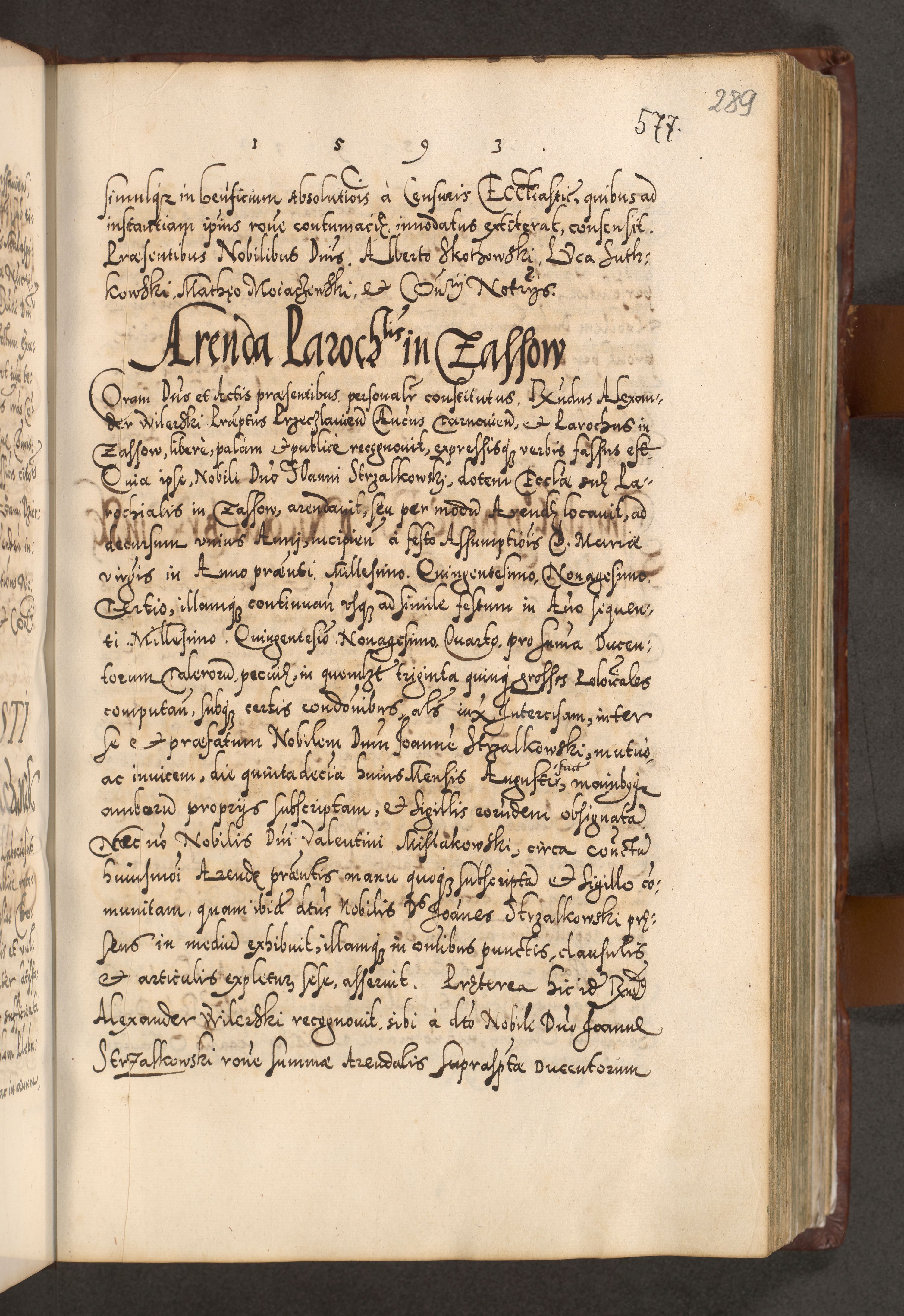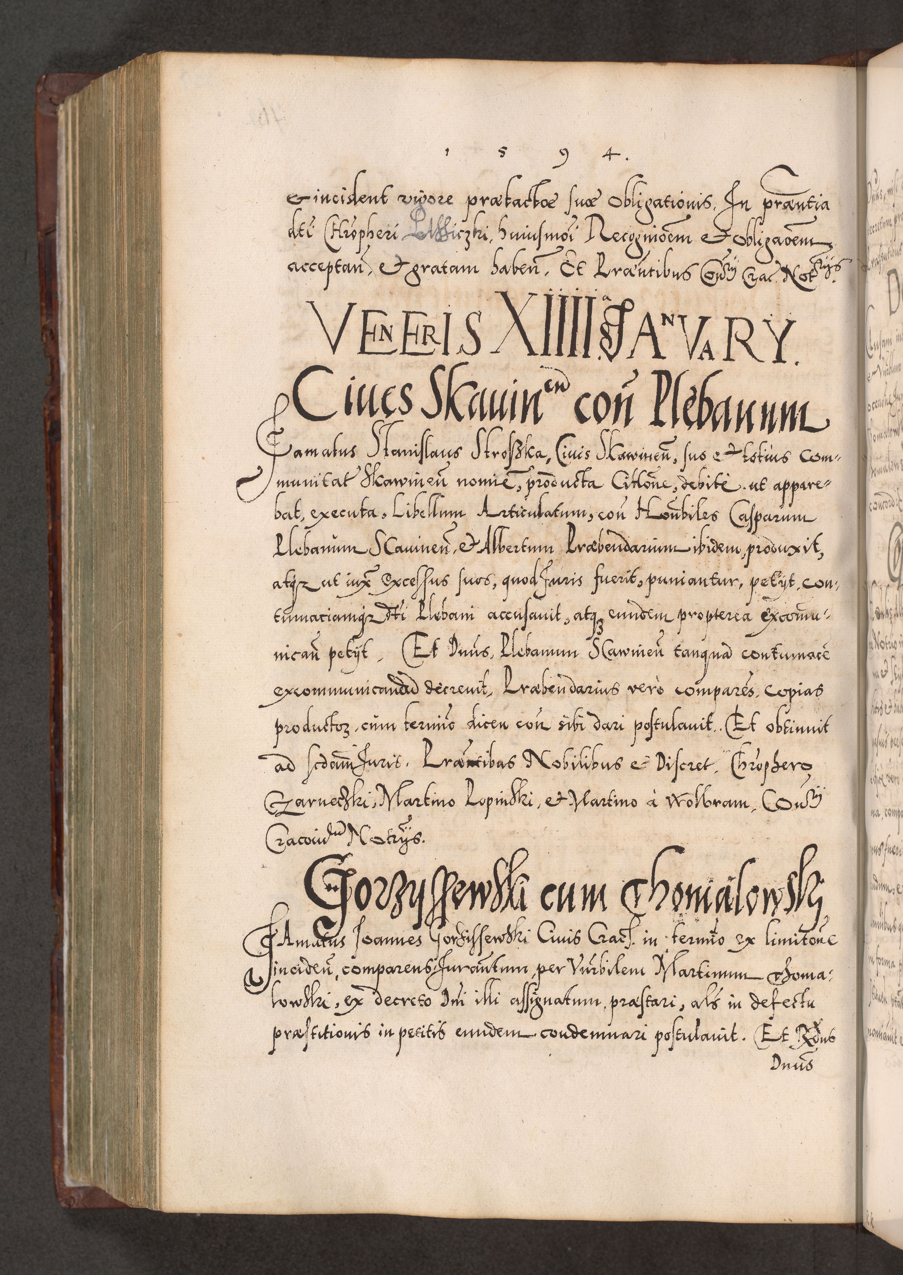 Illistrissimo et revedissimo in Christo Patre Domino Domino Georgio Rzadziwił Miserone Divina Sacrostae R. E. Tituli S. Sixti Presbitero Cardinali Duce in Olyka et Niesswiesz ad Gubernacula Ecclessiae Cracoviensis cuius administratorialem a Sancta Sede Apostolica obtinverat feliciter sedente. Acta actorum, causarum, sententiarum tam deffinitivarum quam interloquutoriarum decretorum, obligationum, quietationum, recognitionum, constitutionum procuratorum etc. coram Reverendo Domino Stanislao Crassinskz de Crasne Archidiacono Cracoviensis, Scholastico Gnesnesis, Custode Plocensis etc. Vicario et Officiali Generali Cracoviensi in Ano Domini Millesimo Quingentesimo Nonagesimo Primo cuius indictio quarta pontificatus SS. Domini Nostri Gregorii XIIII Anno I psius prio feliciter incipiut