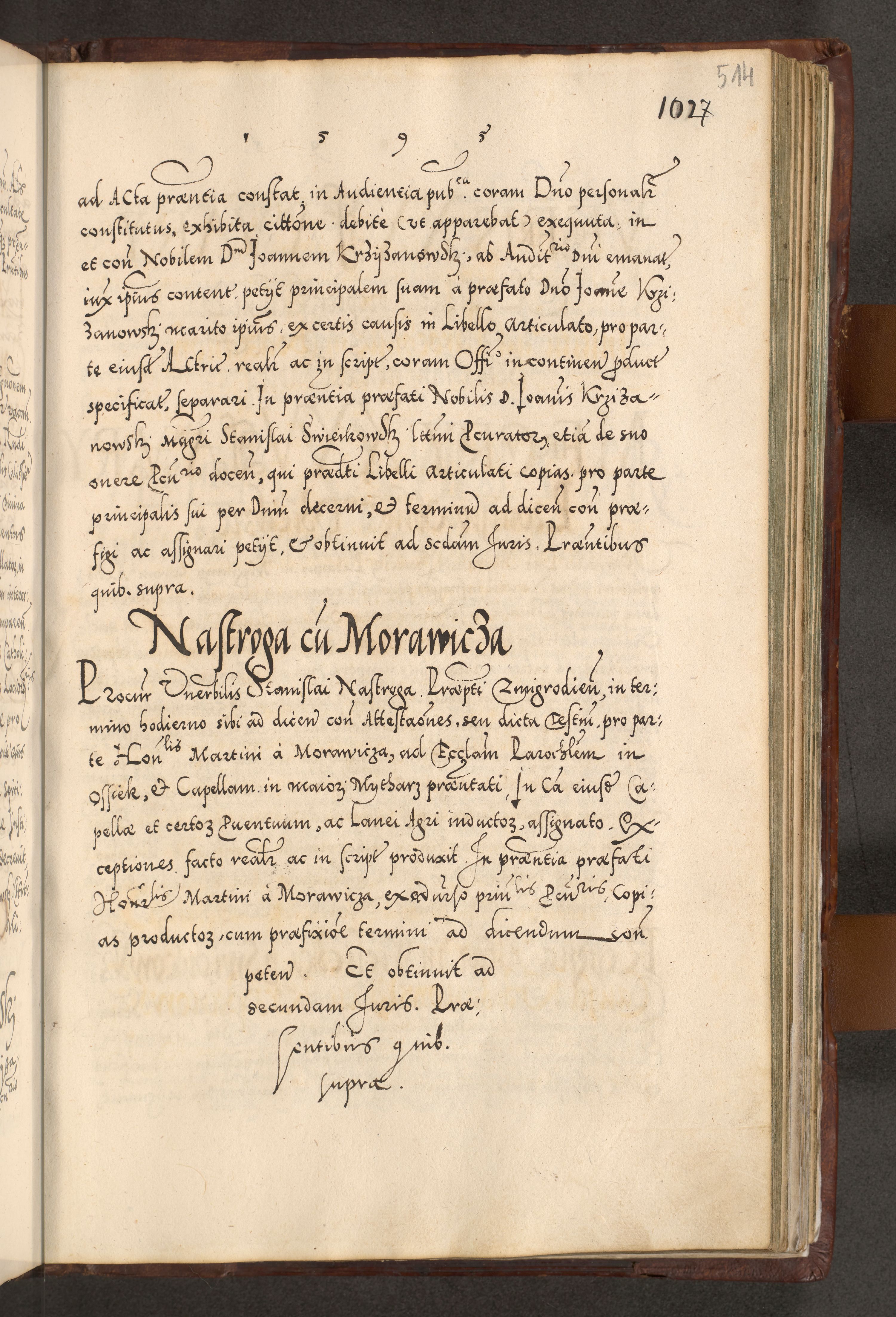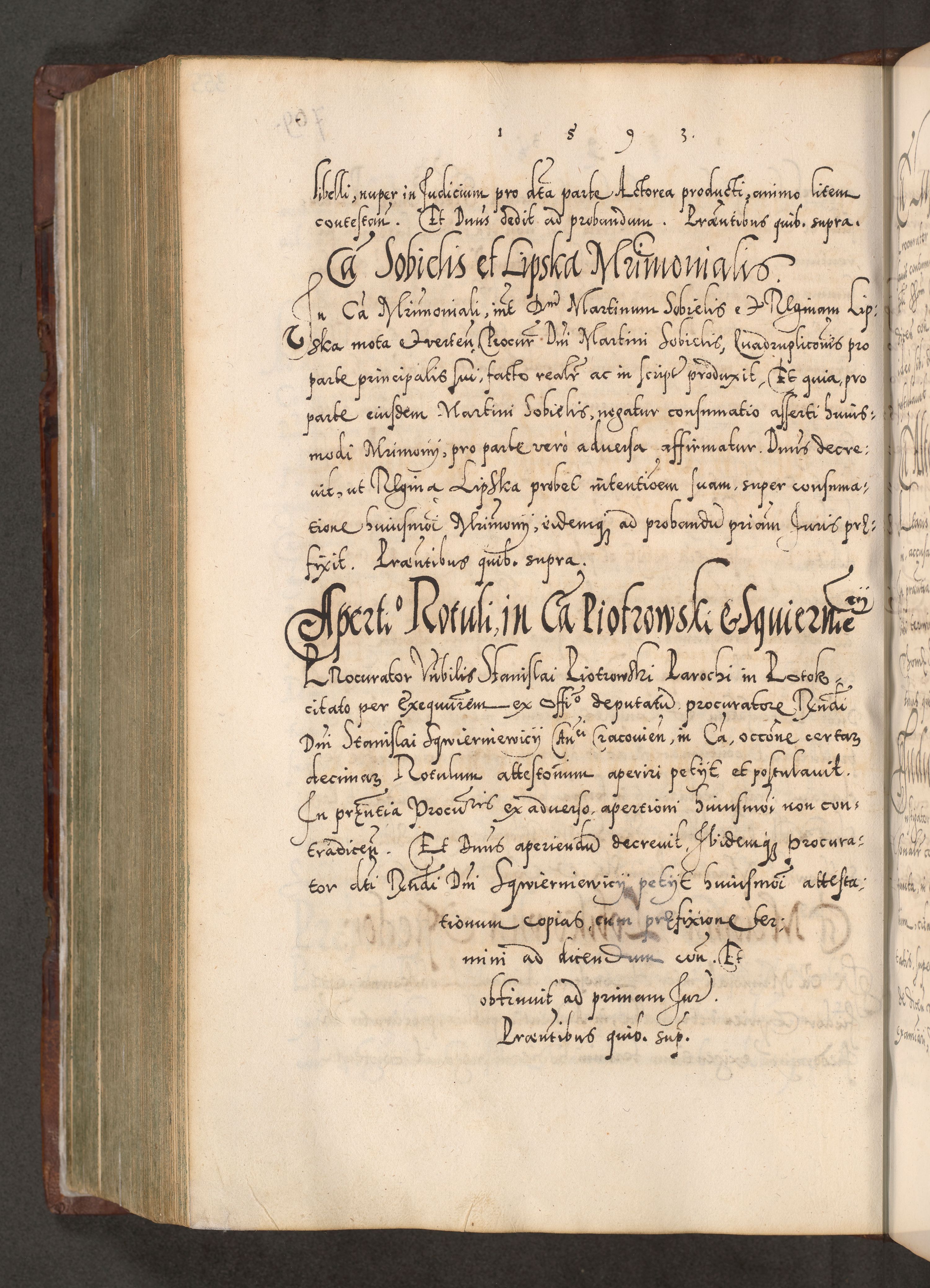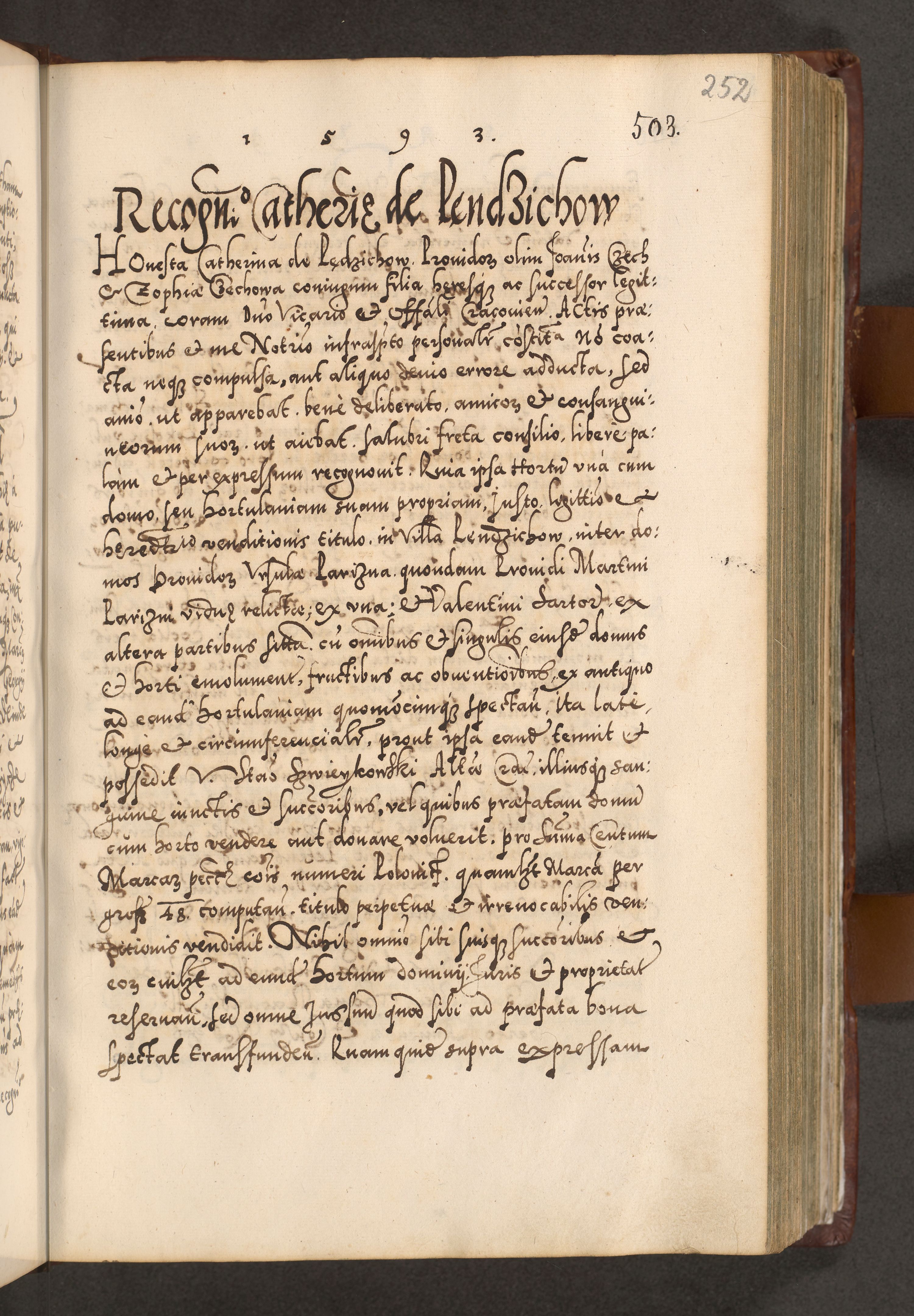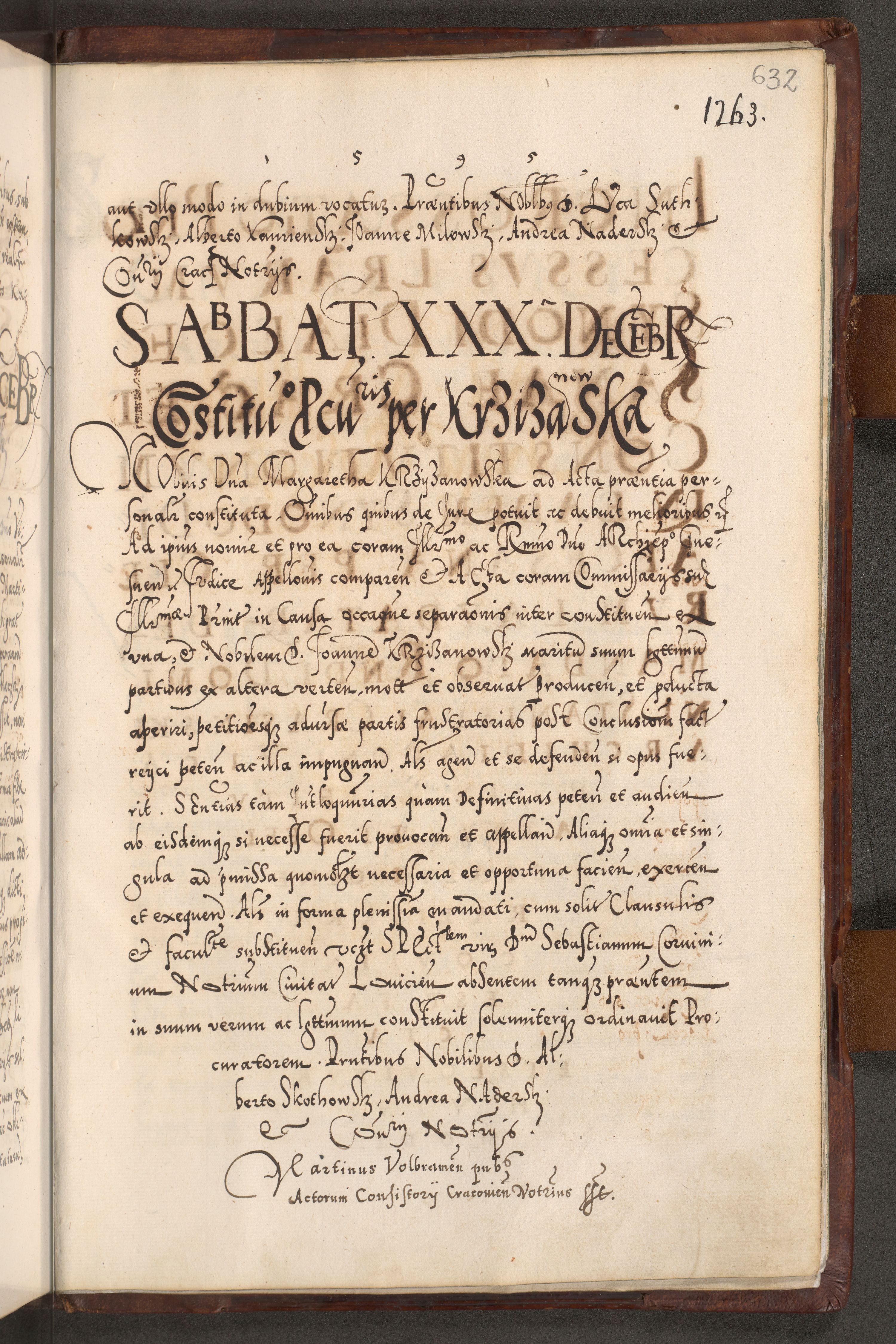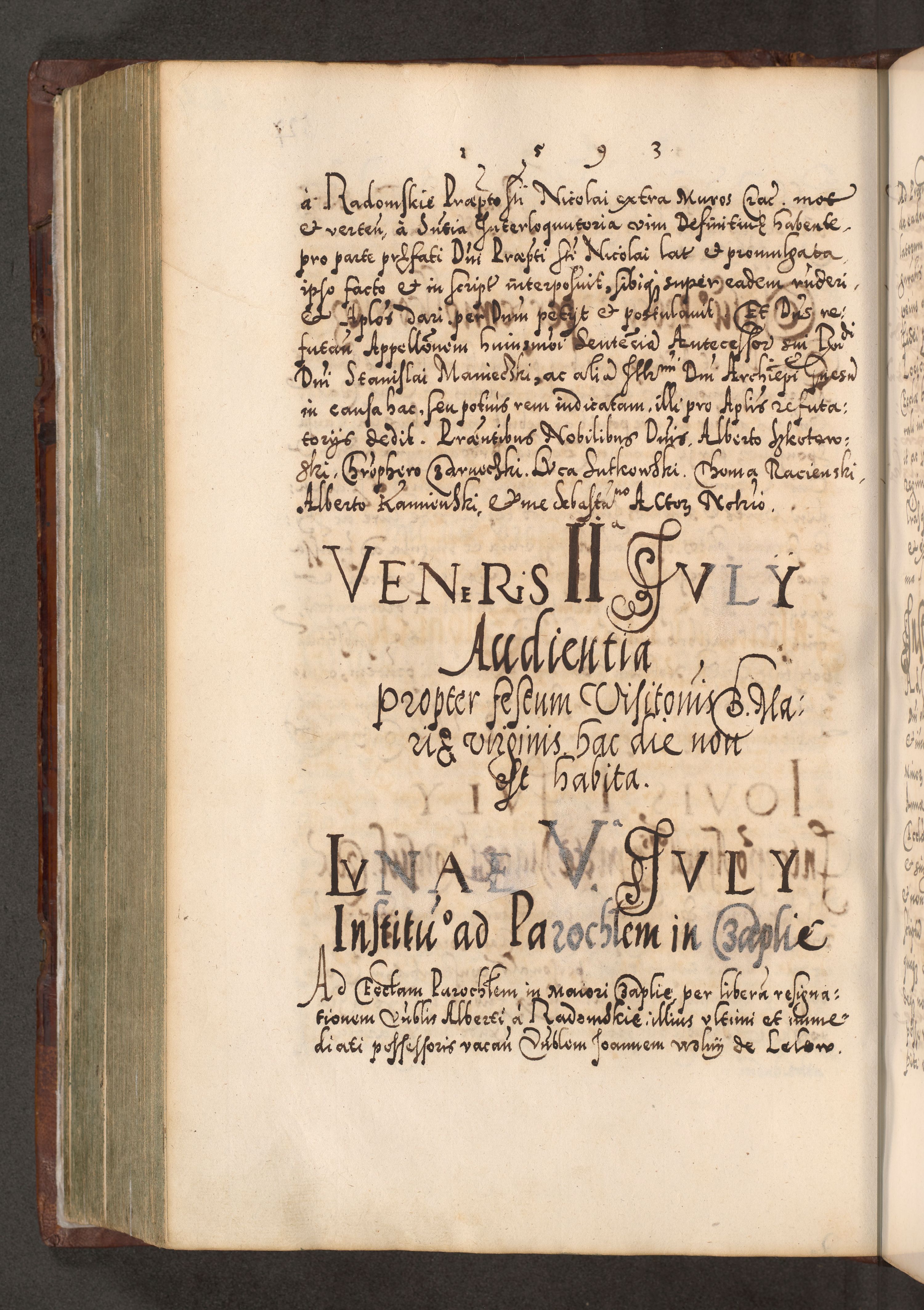 Illistrissimo et revedissimo in Christo Patre Domino Domino Georgio Rzadziwił Miserone Divina Sacrostae R. E. Tituli S. Sixti Presbitero Cardinali Duce in Olyka et Niesswiesz ad Gubernacula Ecclessiae Cracoviensis cuius administratorialem a Sancta Sede Apostolica obtinverat feliciter sedente. Acta actorum, causarum, sententiarum tam deffinitivarum quam interloquutoriarum decretorum, obligationum, quietationum, recognitionum, constitutionum procuratorum etc. coram Reverendo Domino Stanislao Crassinskz de Crasne Archidiacono Cracoviensis, Scholastico Gnesnesis, Custode Plocensis etc. Vicario et Officiali Generali Cracoviensi in Ano Domini Millesimo Quingentesimo Nonagesimo Primo cuius indictio quarta pontificatus SS. Domini Nostri Gregorii XIIII Anno I psius prio feliciter incipiut