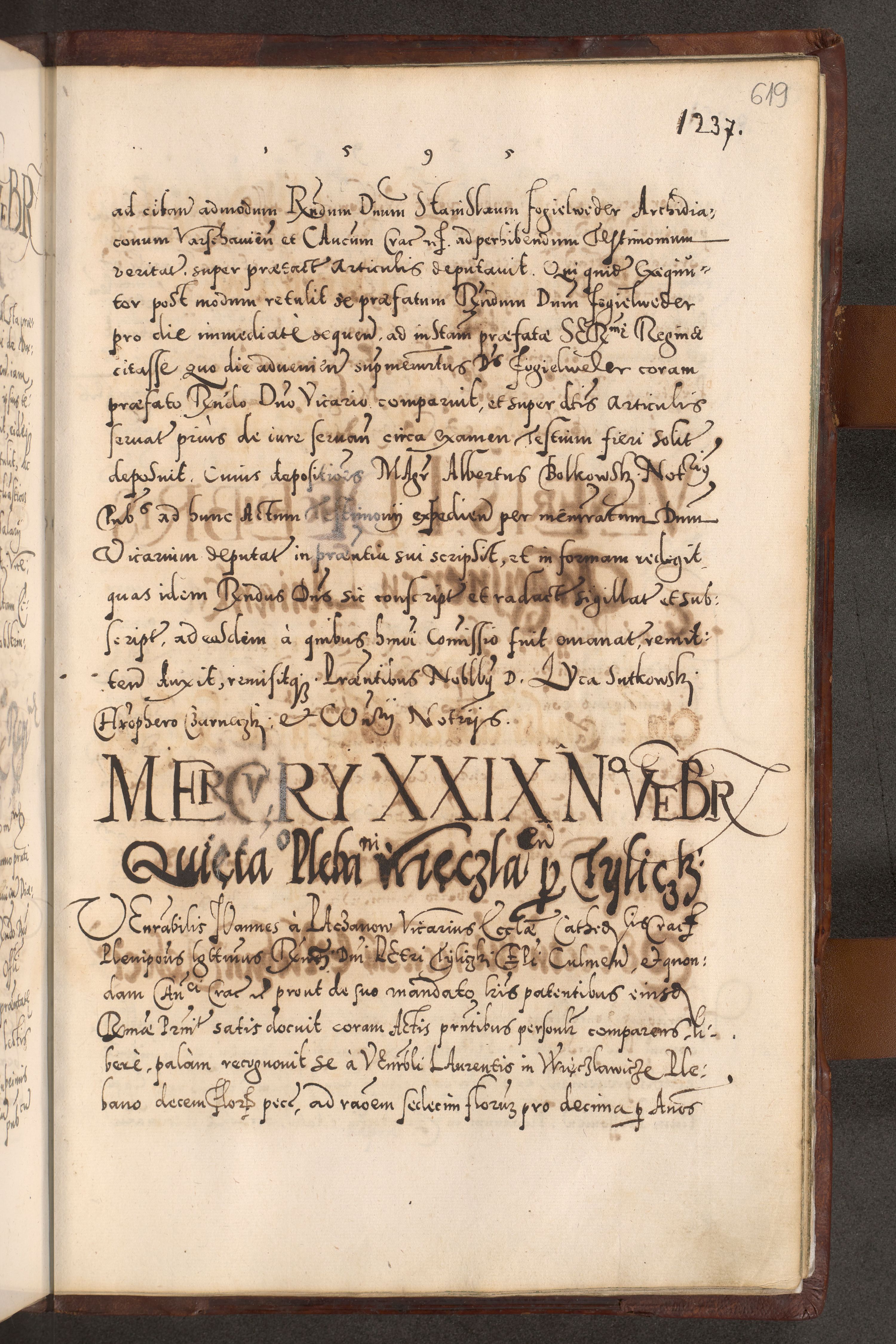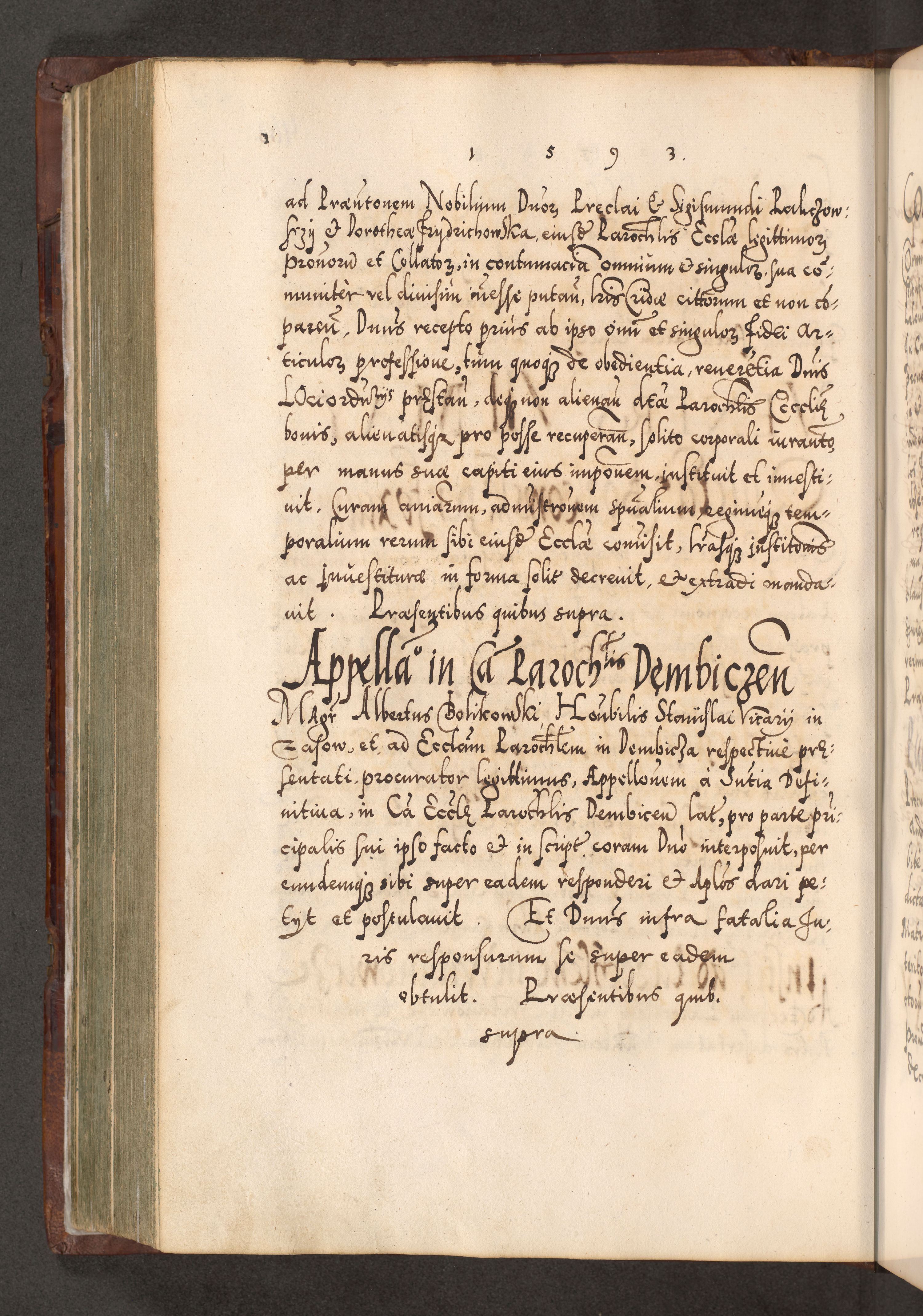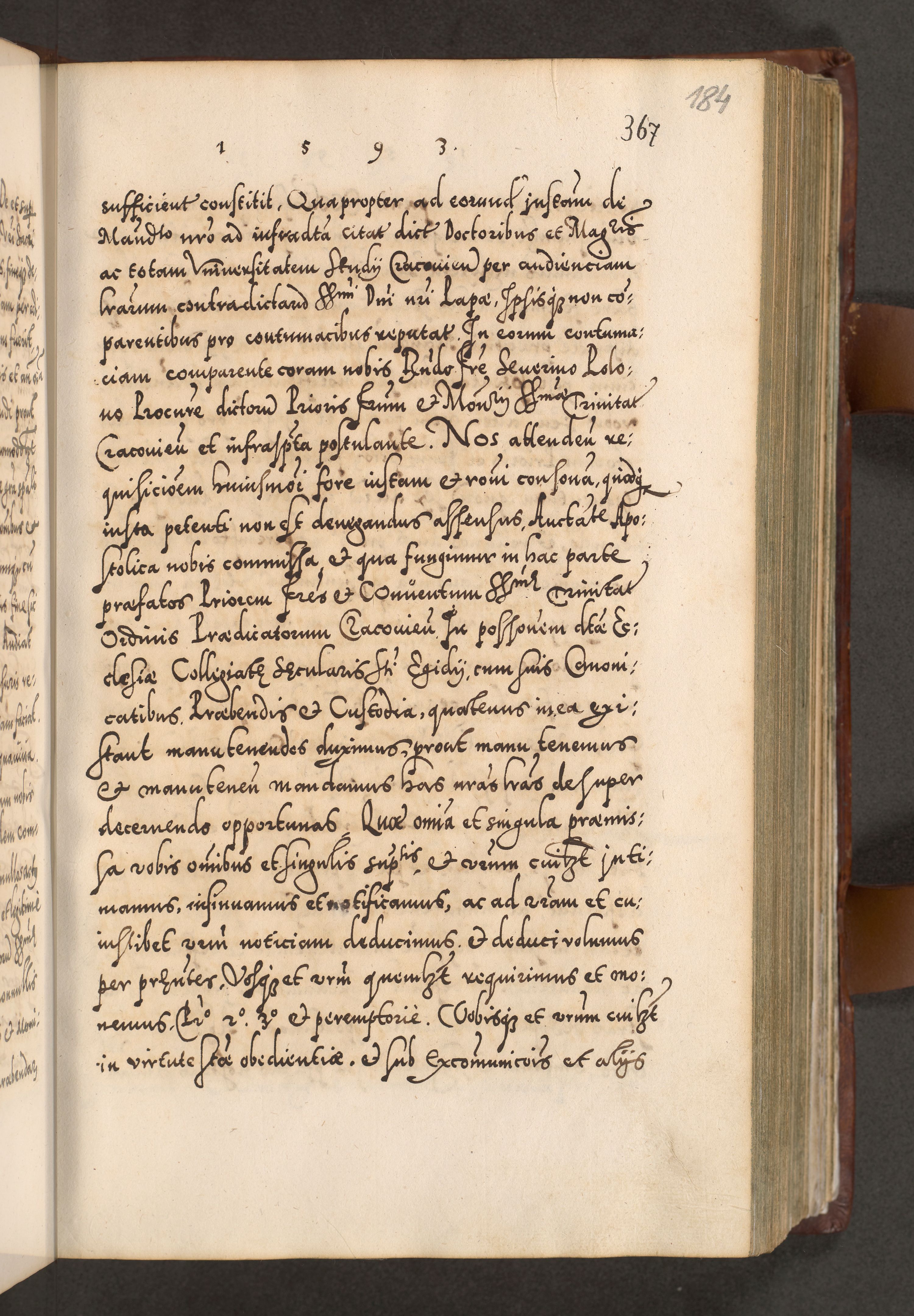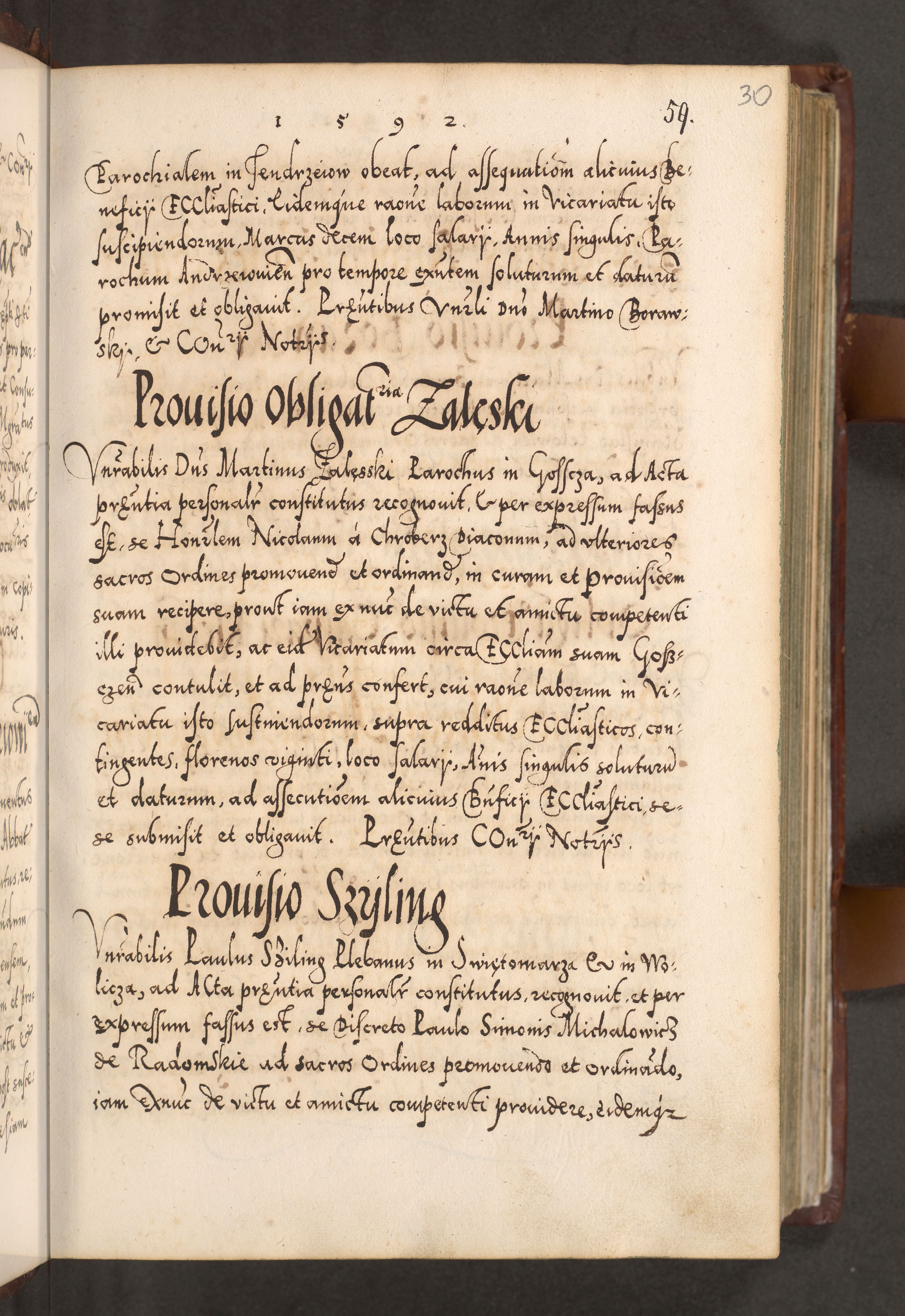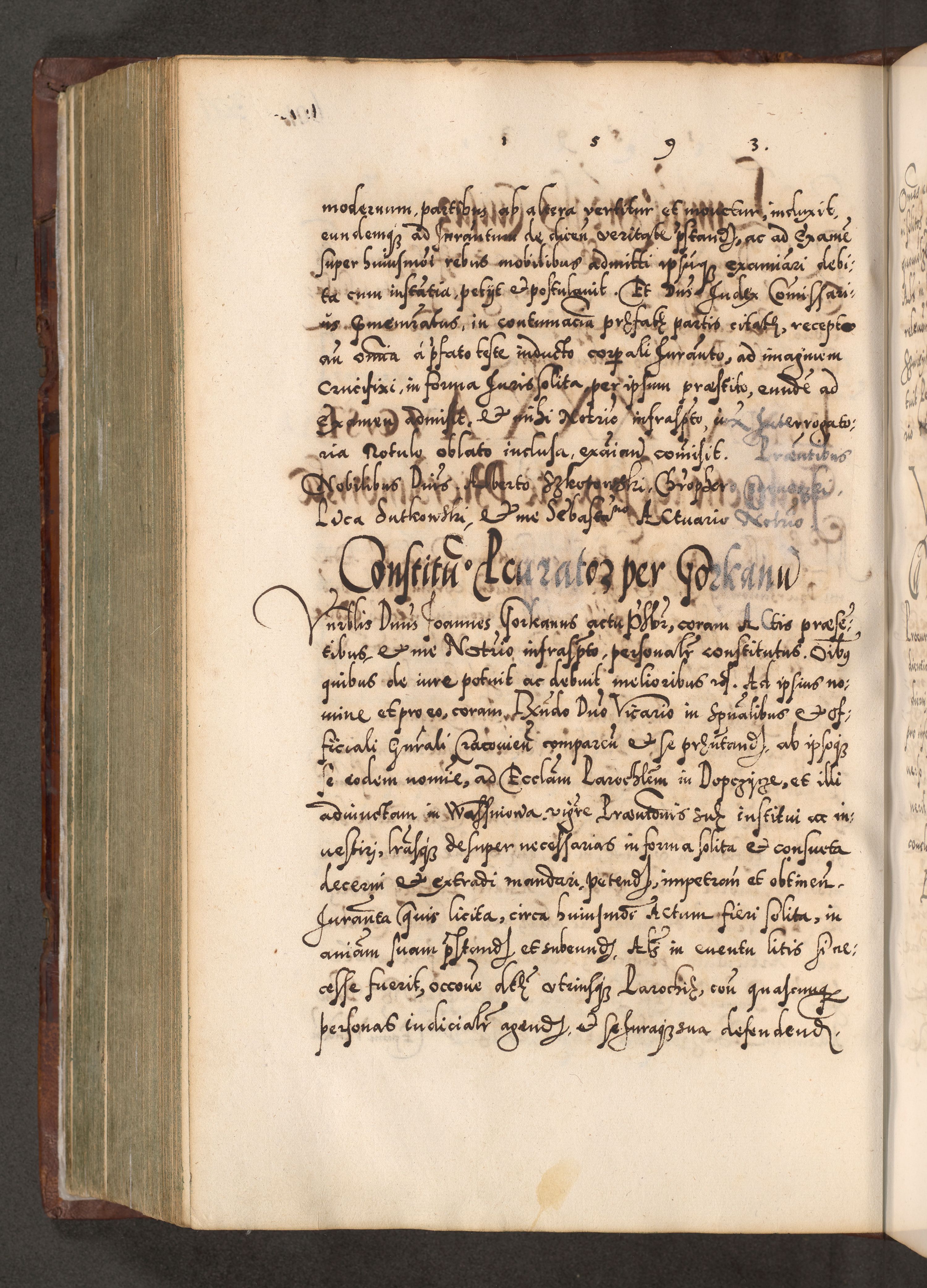 Illistrissimo et revedissimo in Christo Patre Domino Domino Georgio Rzadziwił Miserone Divina Sacrostae R. E. Tituli S. Sixti Presbitero Cardinali Duce in Olyka et Niesswiesz ad Gubernacula Ecclessiae Cracoviensis cuius administratorialem a Sancta Sede Apostolica obtinverat feliciter sedente. Acta actorum, causarum, sententiarum tam deffinitivarum quam interloquutoriarum decretorum, obligationum, quietationum, recognitionum, constitutionum procuratorum etc. coram Reverendo Domino Stanislao Crassinskz de Crasne Archidiacono Cracoviensis, Scholastico Gnesnesis, Custode Plocensis etc. Vicario et Officiali Generali Cracoviensi in Ano Domini Millesimo Quingentesimo Nonagesimo Primo cuius indictio quarta pontificatus SS. Domini Nostri Gregorii XIIII Anno I psius prio feliciter incipiut