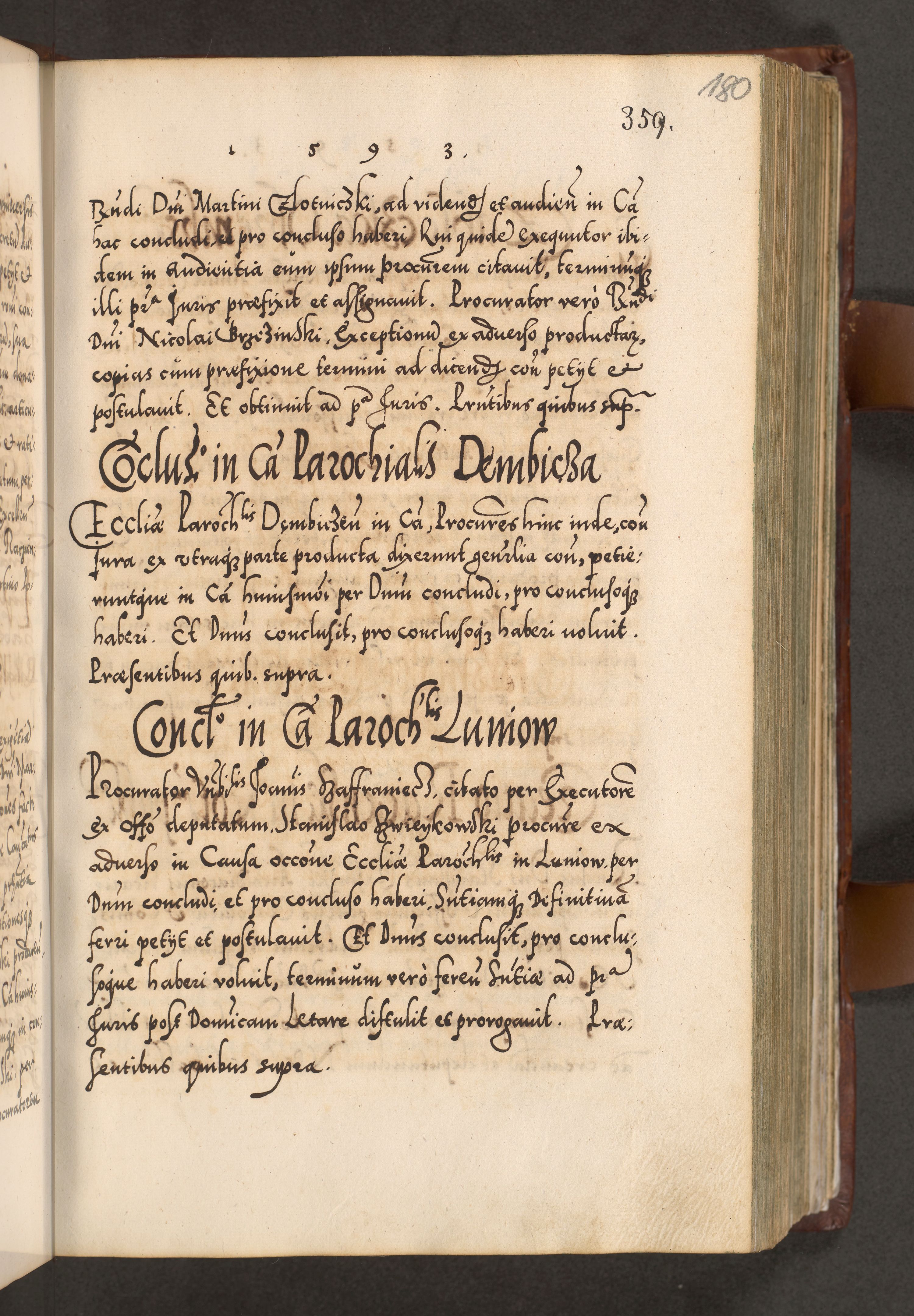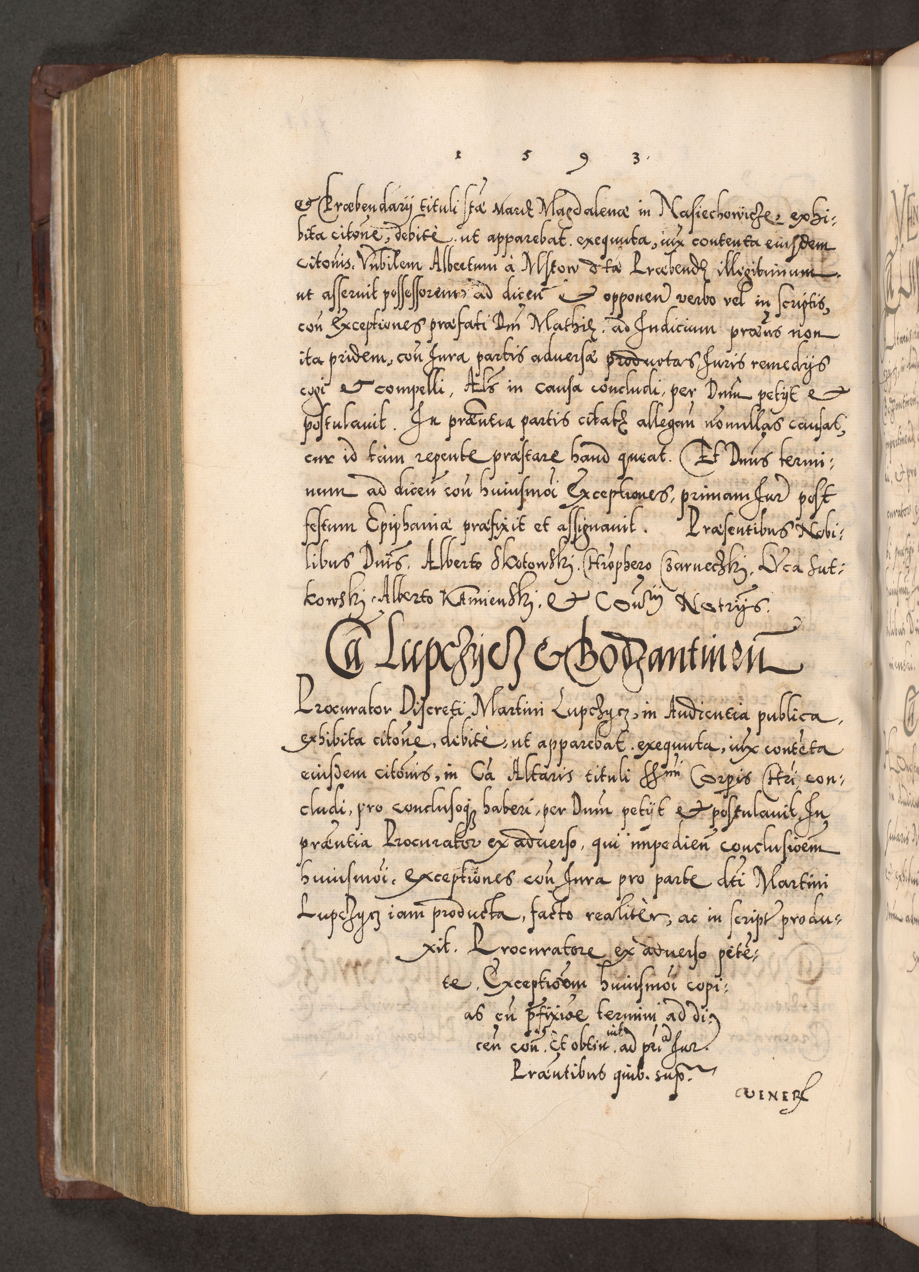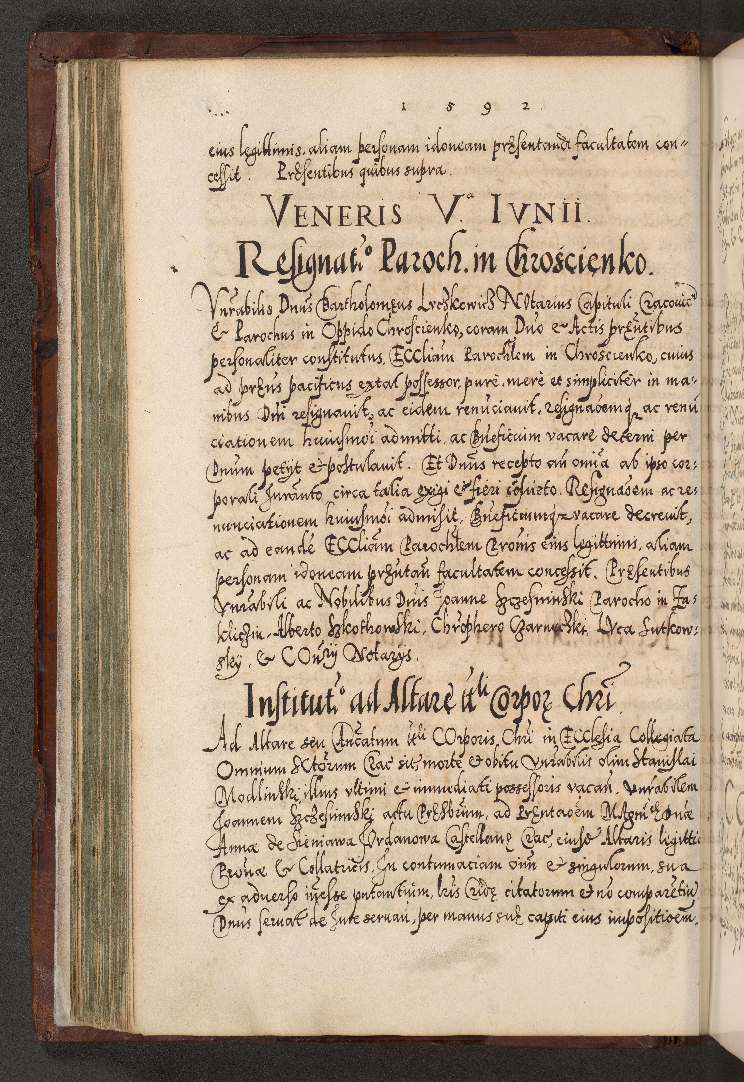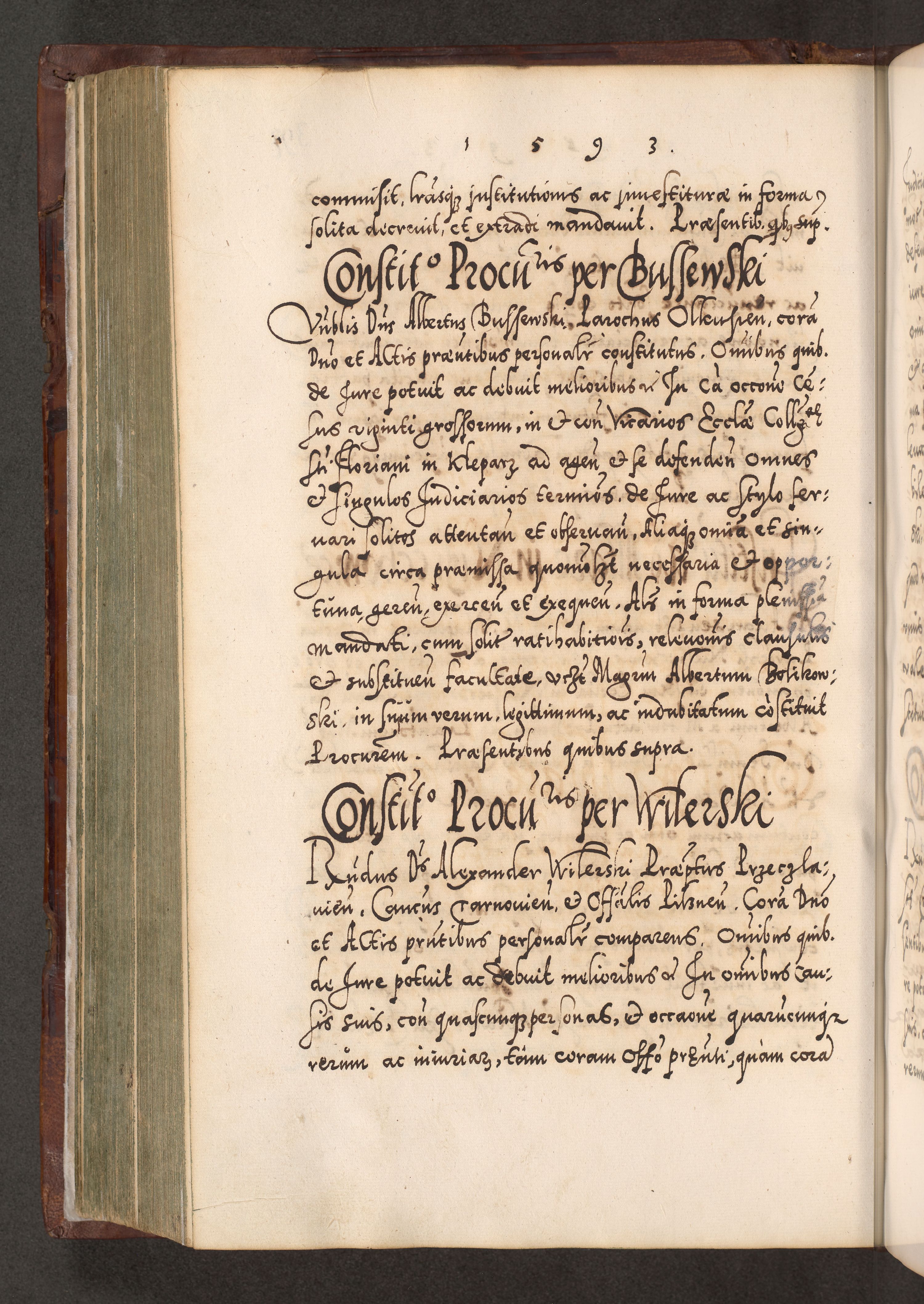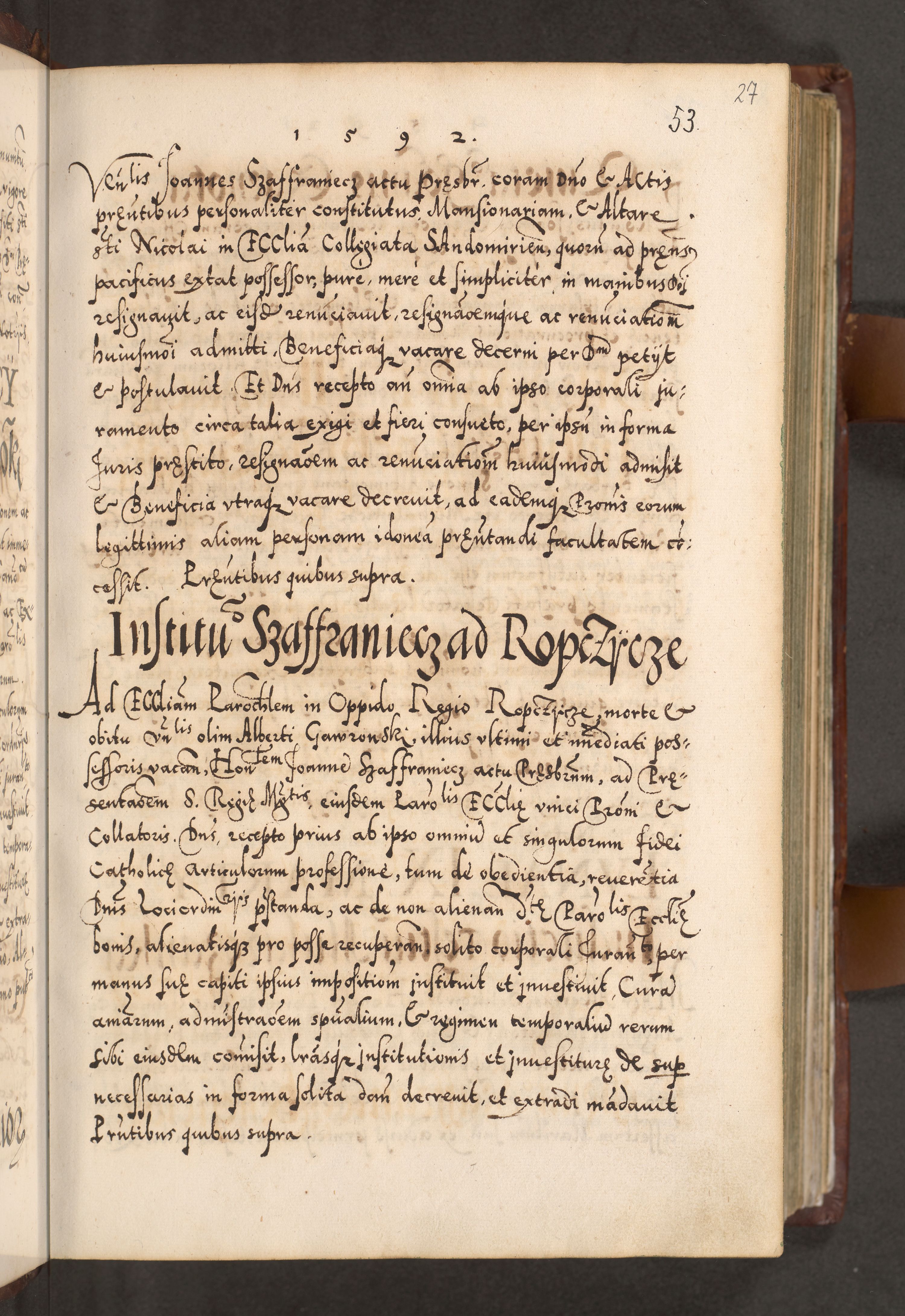 Illistrissimo et revedissimo in Christo Patre Domino Domino Georgio Rzadziwił Miserone Divina Sacrostae R. E. Tituli S. Sixti Presbitero Cardinali Duce in Olyka et Niesswiesz ad Gubernacula Ecclessiae Cracoviensis cuius administratorialem a Sancta Sede Apostolica obtinverat feliciter sedente. Acta actorum, causarum, sententiarum tam deffinitivarum quam interloquutoriarum decretorum, obligationum, quietationum, recognitionum, constitutionum procuratorum etc. coram Reverendo Domino Stanislao Crassinskz de Crasne Archidiacono Cracoviensis, Scholastico Gnesnesis, Custode Plocensis etc. Vicario et Officiali Generali Cracoviensi in Ano Domini Millesimo Quingentesimo Nonagesimo Primo cuius indictio quarta pontificatus SS. Domini Nostri Gregorii XIIII Anno I psius prio feliciter incipiut
