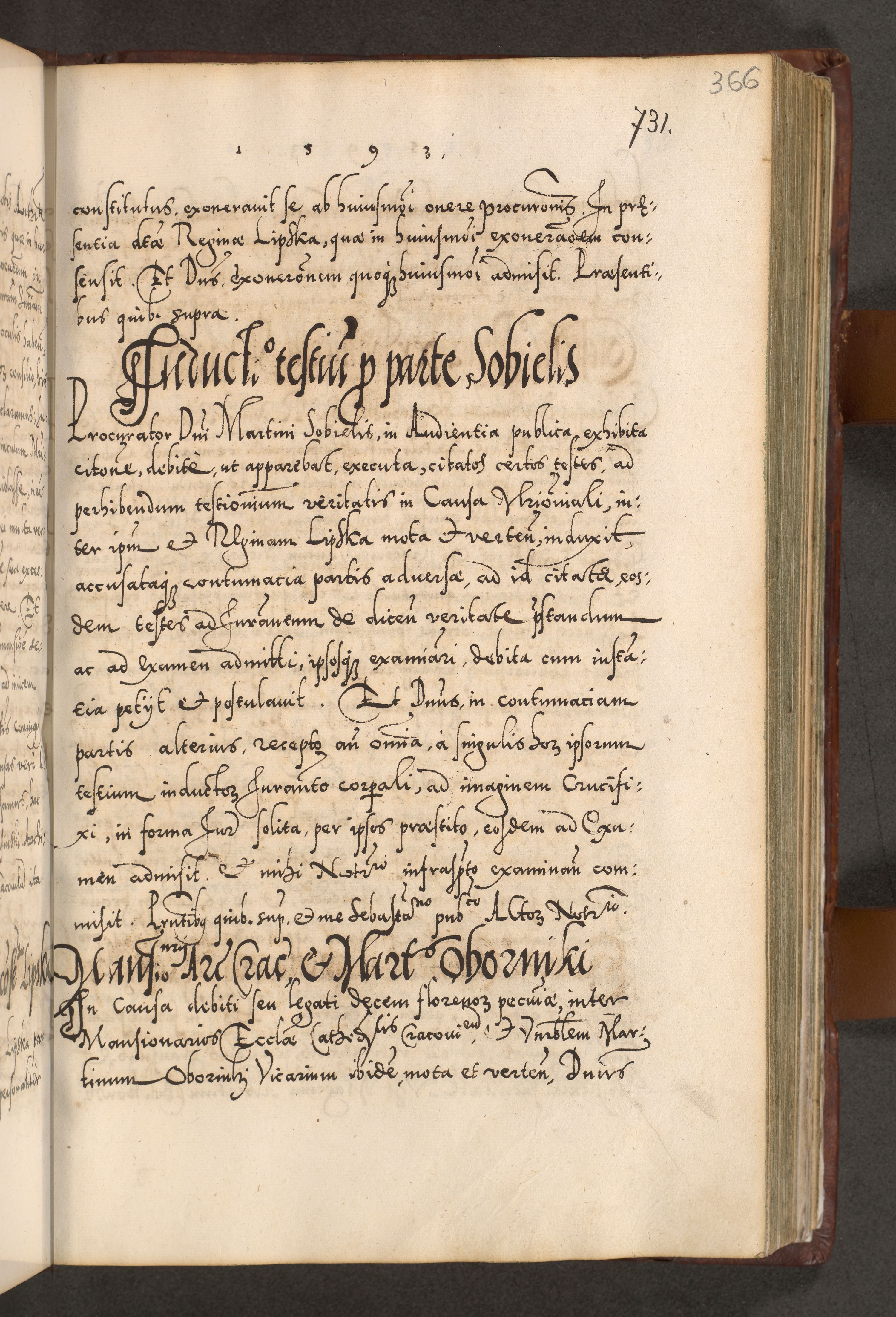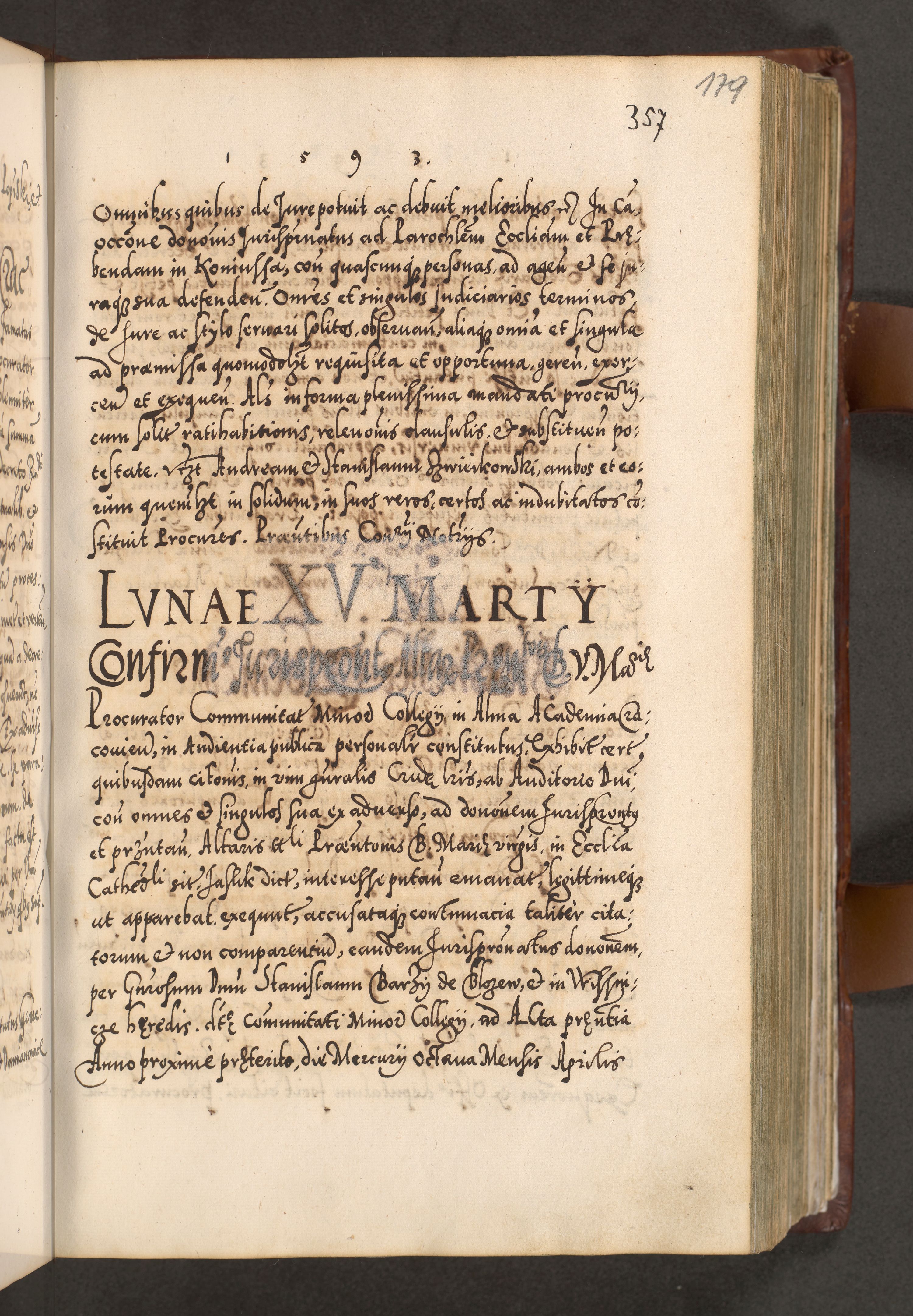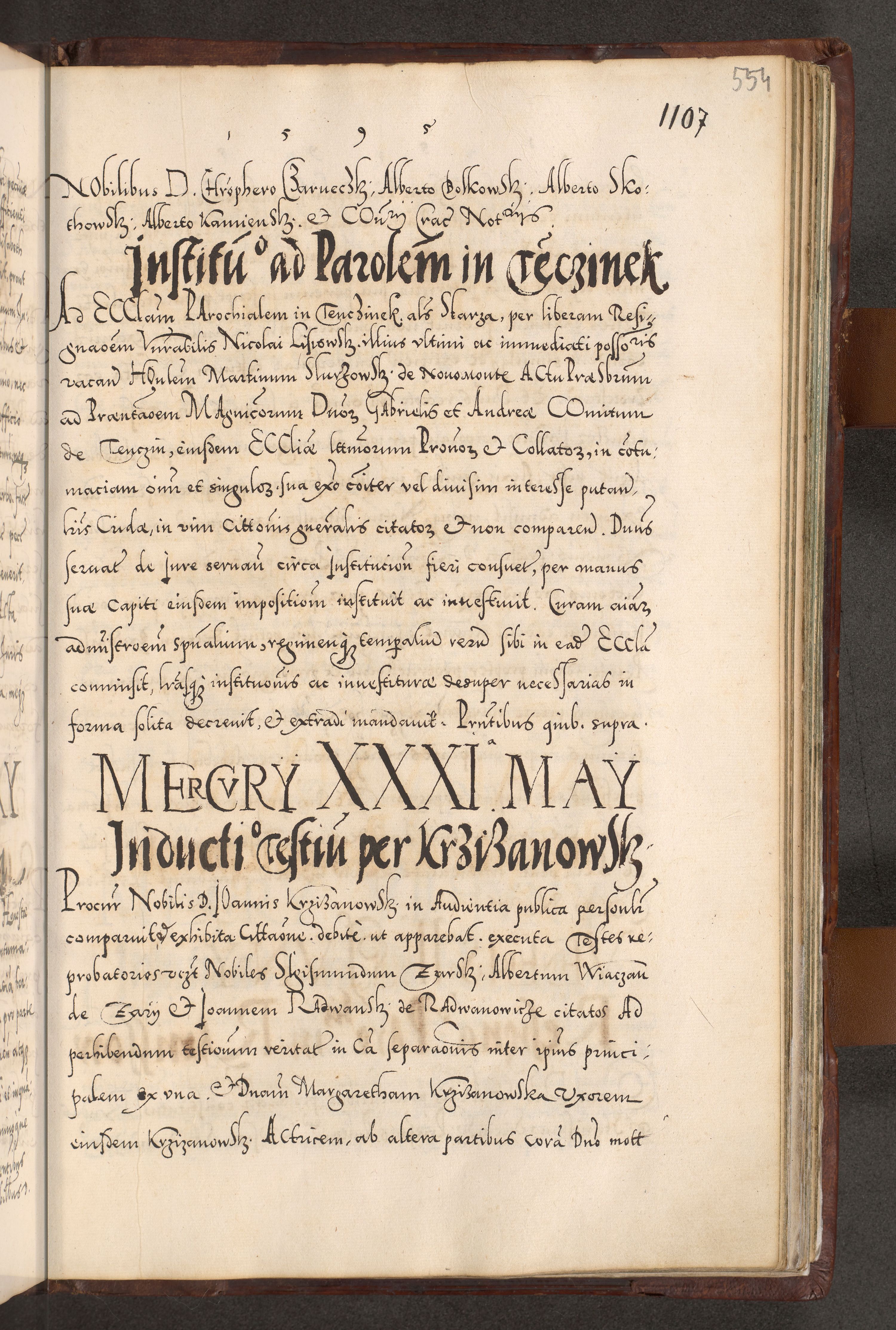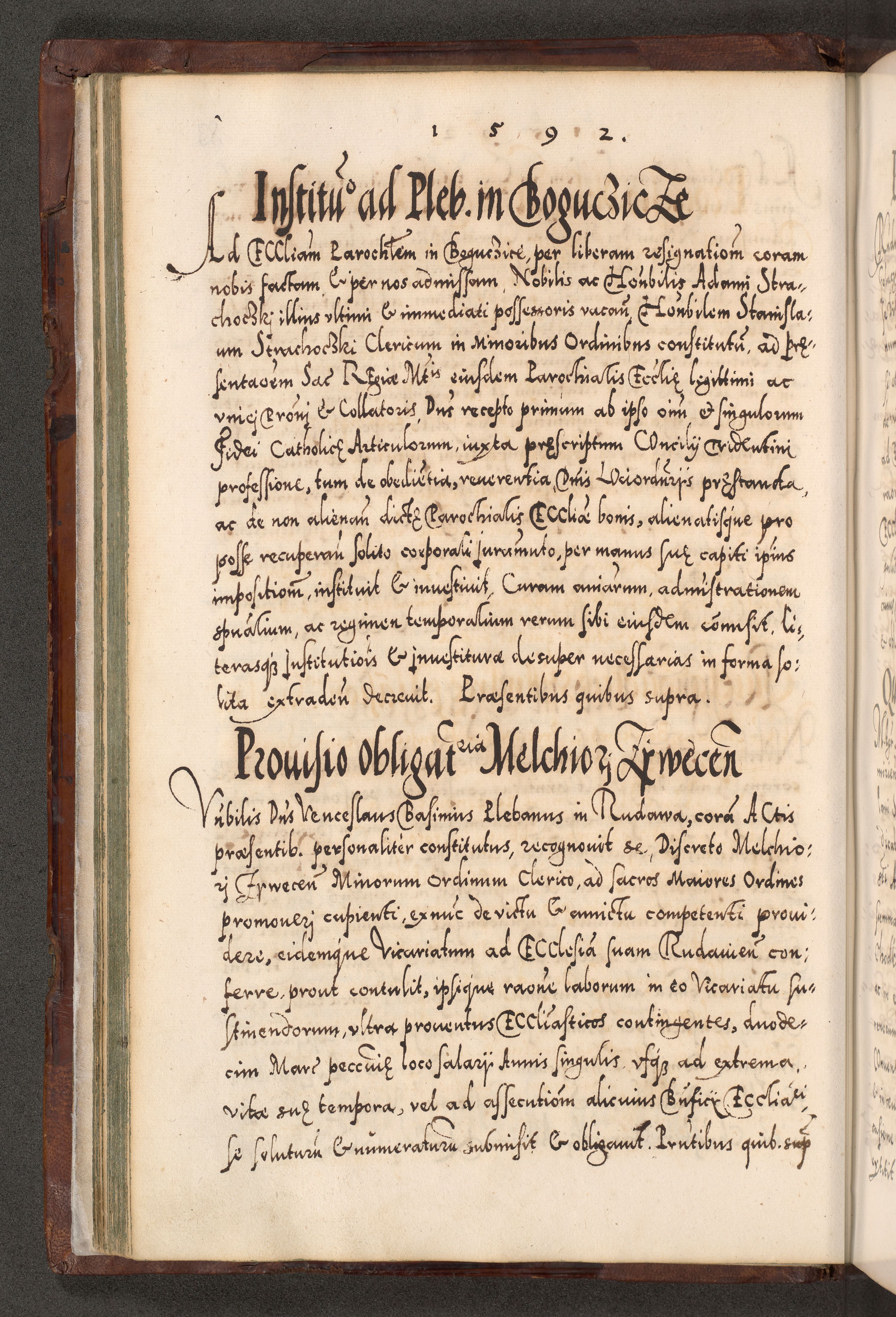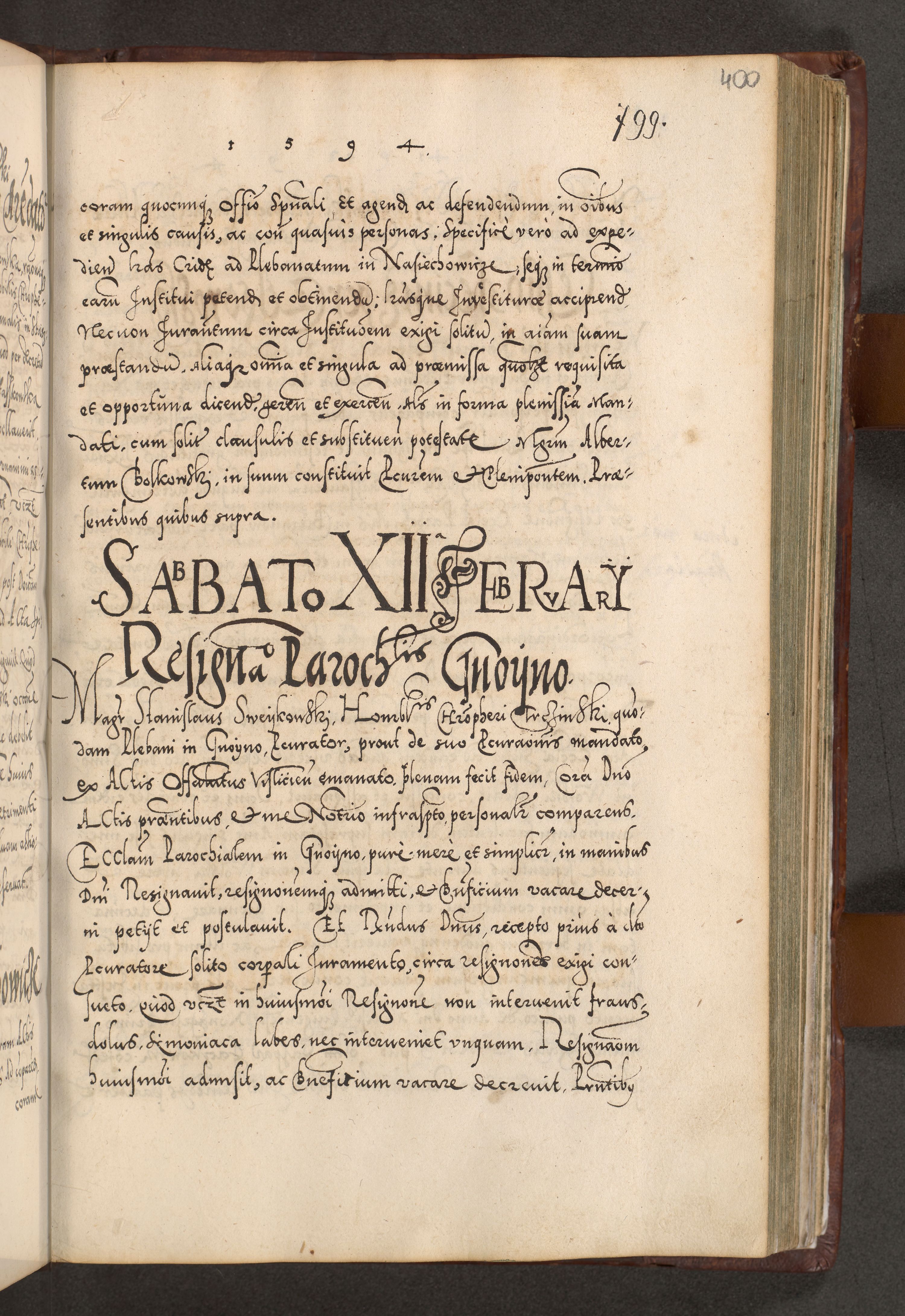 Illistrissimo et revedissimo in Christo Patre Domino Domino Georgio Rzadziwił Miserone Divina Sacrostae R. E. Tituli S. Sixti Presbitero Cardinali Duce in Olyka et Niesswiesz ad Gubernacula Ecclessiae Cracoviensis cuius administratorialem a Sancta Sede Apostolica obtinverat feliciter sedente. Acta actorum, causarum, sententiarum tam deffinitivarum quam interloquutoriarum decretorum, obligationum, quietationum, recognitionum, constitutionum procuratorum etc. coram Reverendo Domino Stanislao Crassinskz de Crasne Archidiacono Cracoviensis, Scholastico Gnesnesis, Custode Plocensis etc. Vicario et Officiali Generali Cracoviensi in Ano Domini Millesimo Quingentesimo Nonagesimo Primo cuius indictio quarta pontificatus SS. Domini Nostri Gregorii XIIII Anno I psius prio feliciter incipiut