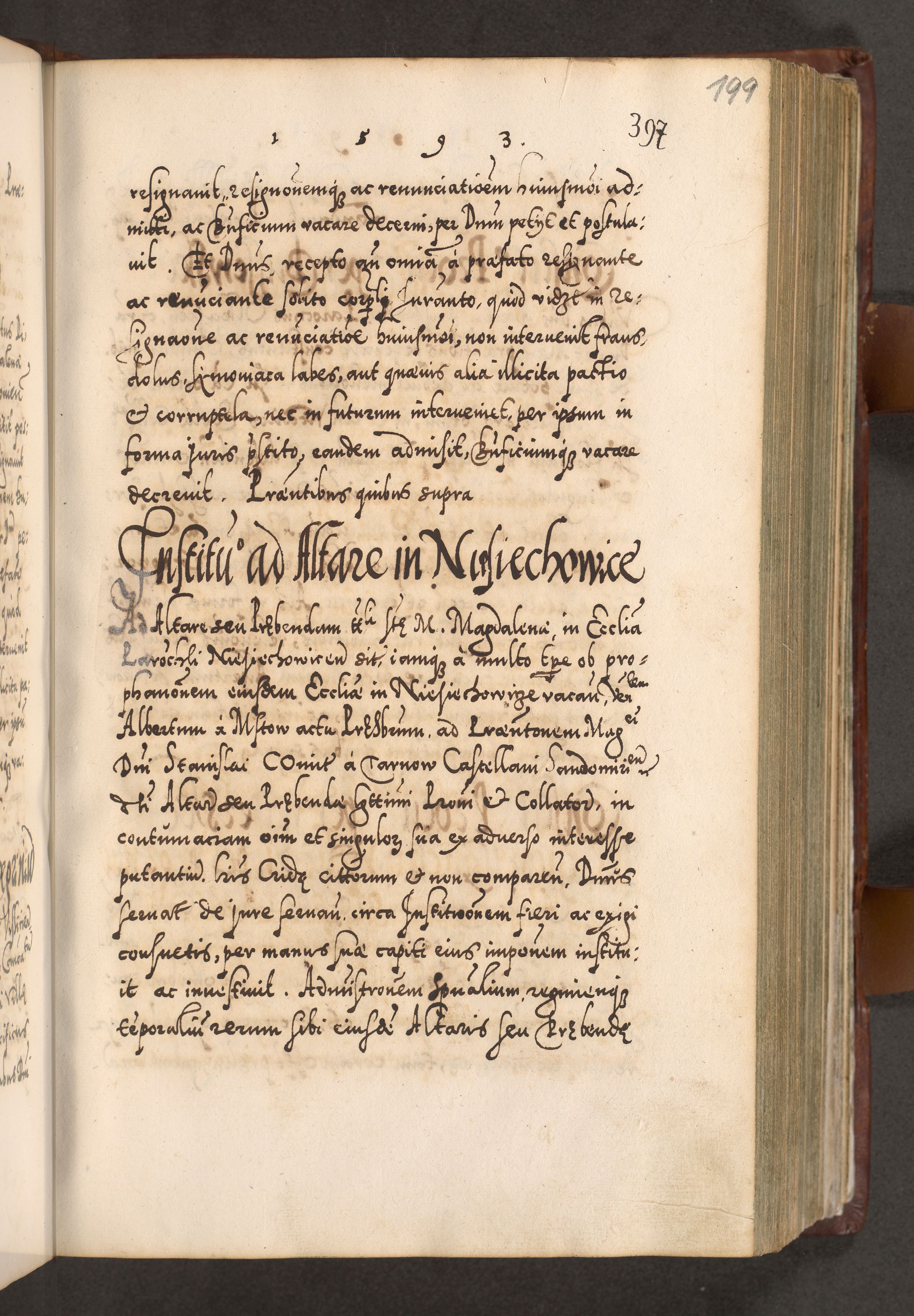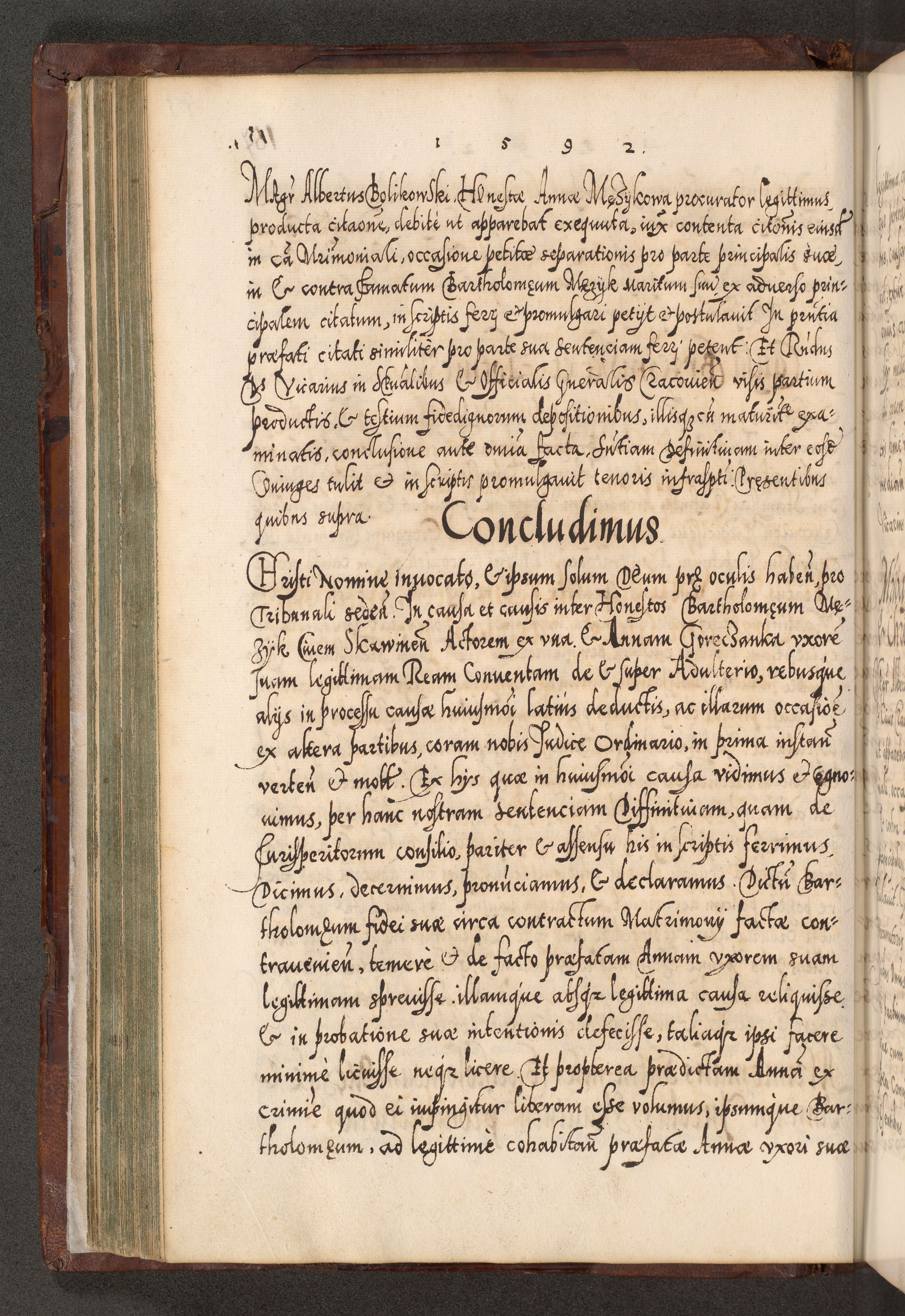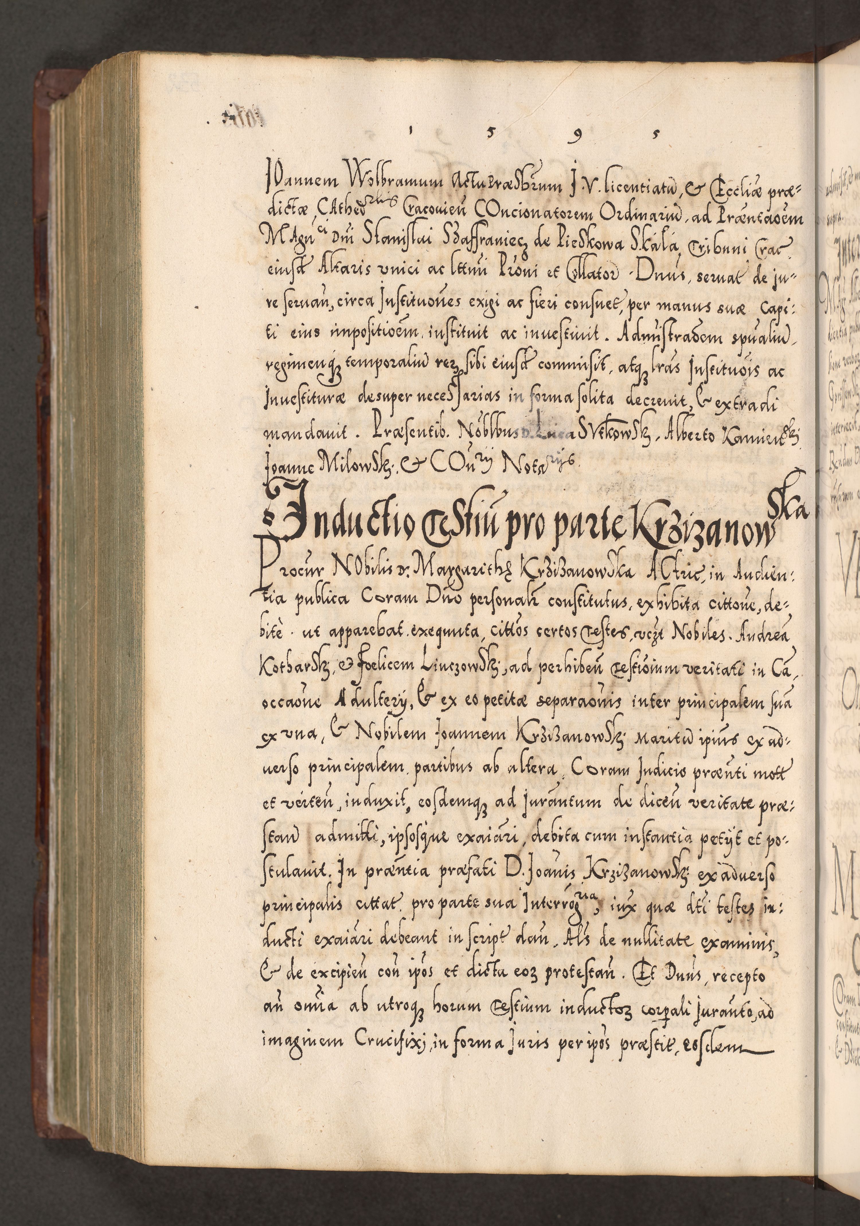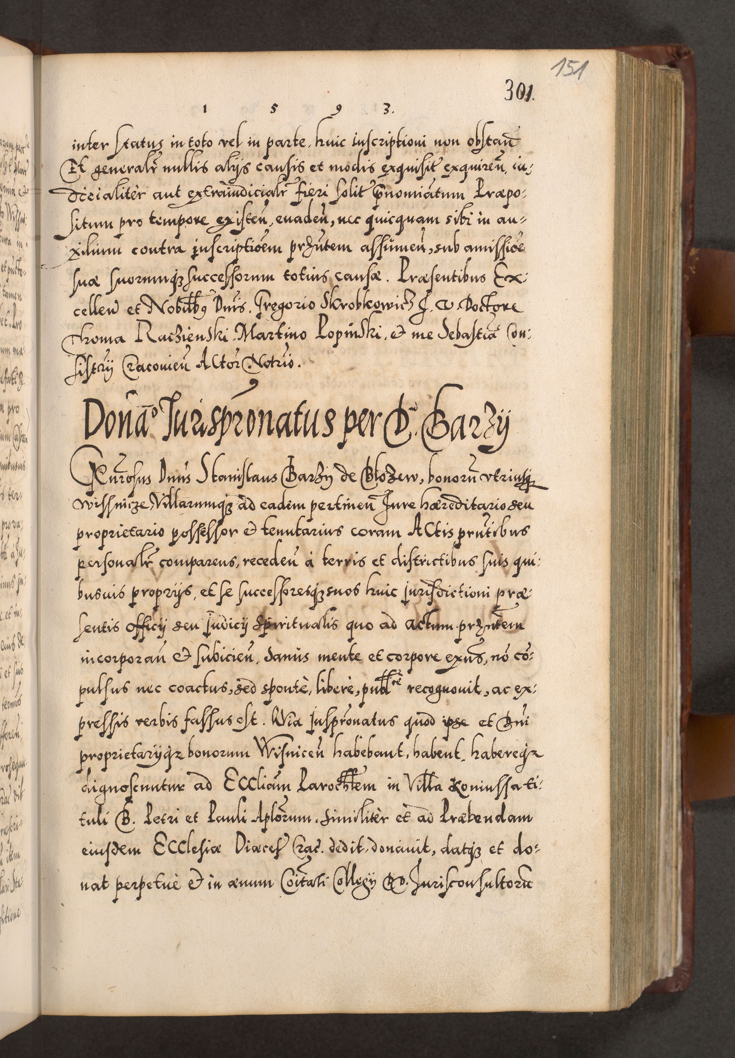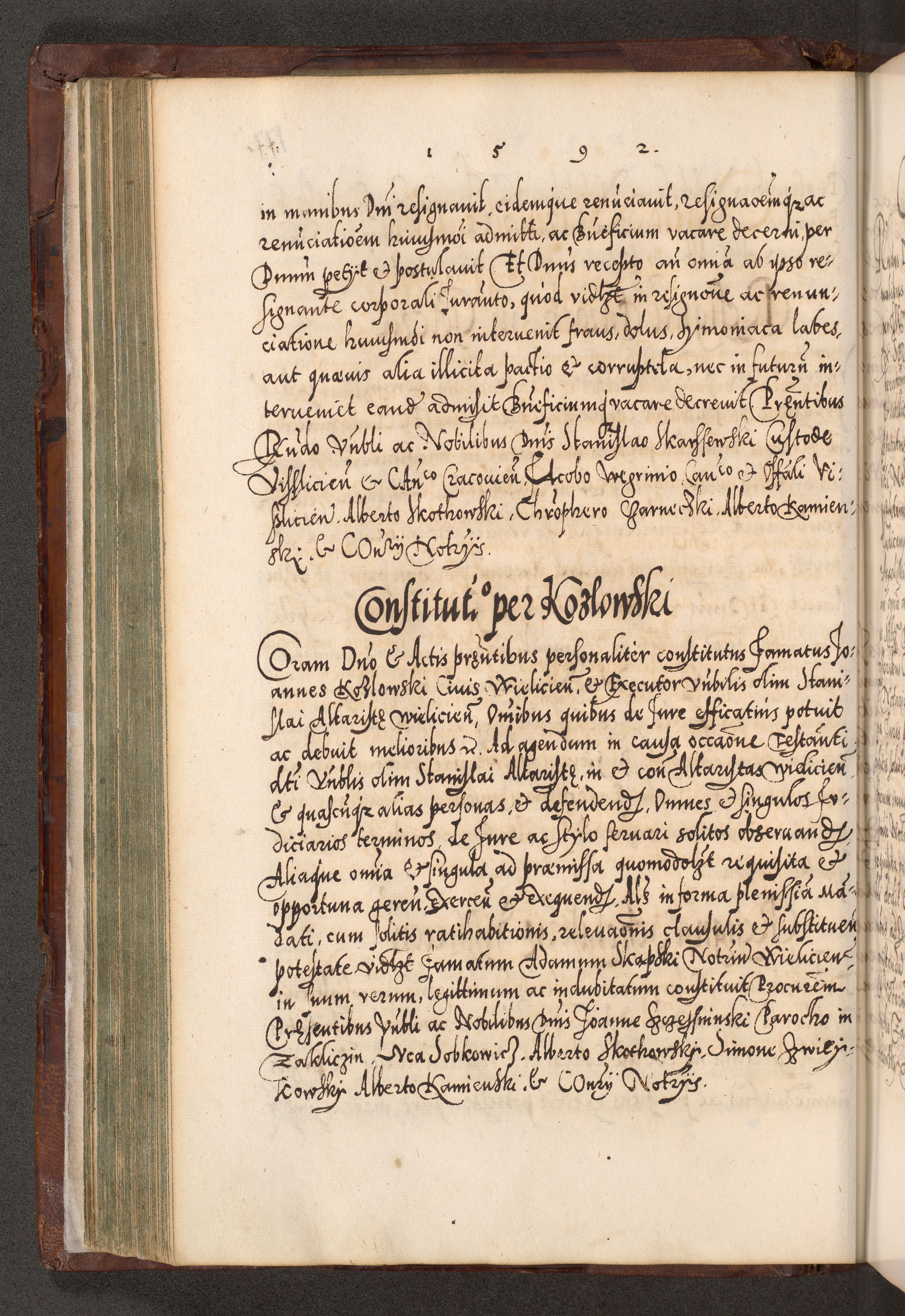 Illistrissimo et revedissimo in Christo Patre Domino Domino Georgio Rzadziwił Miserone Divina Sacrostae R. E. Tituli S. Sixti Presbitero Cardinali Duce in Olyka et Niesswiesz ad Gubernacula Ecclessiae Cracoviensis cuius administratorialem a Sancta Sede Apostolica obtinverat feliciter sedente. Acta actorum, causarum, sententiarum tam deffinitivarum quam interloquutoriarum decretorum, obligationum, quietationum, recognitionum, constitutionum procuratorum etc. coram Reverendo Domino Stanislao Crassinskz de Crasne Archidiacono Cracoviensis, Scholastico Gnesnesis, Custode Plocensis etc. Vicario et Officiali Generali Cracoviensi in Ano Domini Millesimo Quingentesimo Nonagesimo Primo cuius indictio quarta pontificatus SS. Domini Nostri Gregorii XIIII Anno I psius prio feliciter incipiut