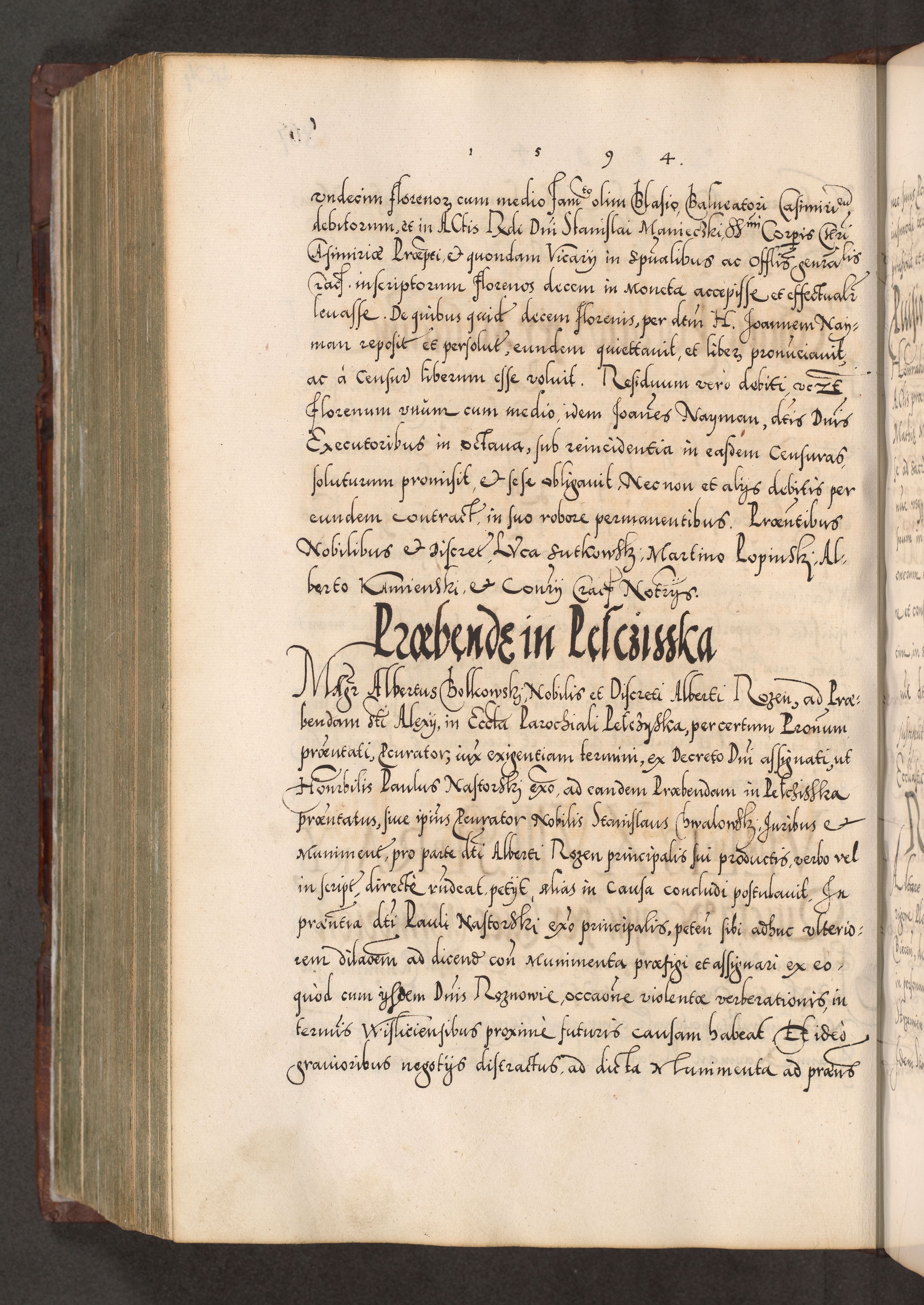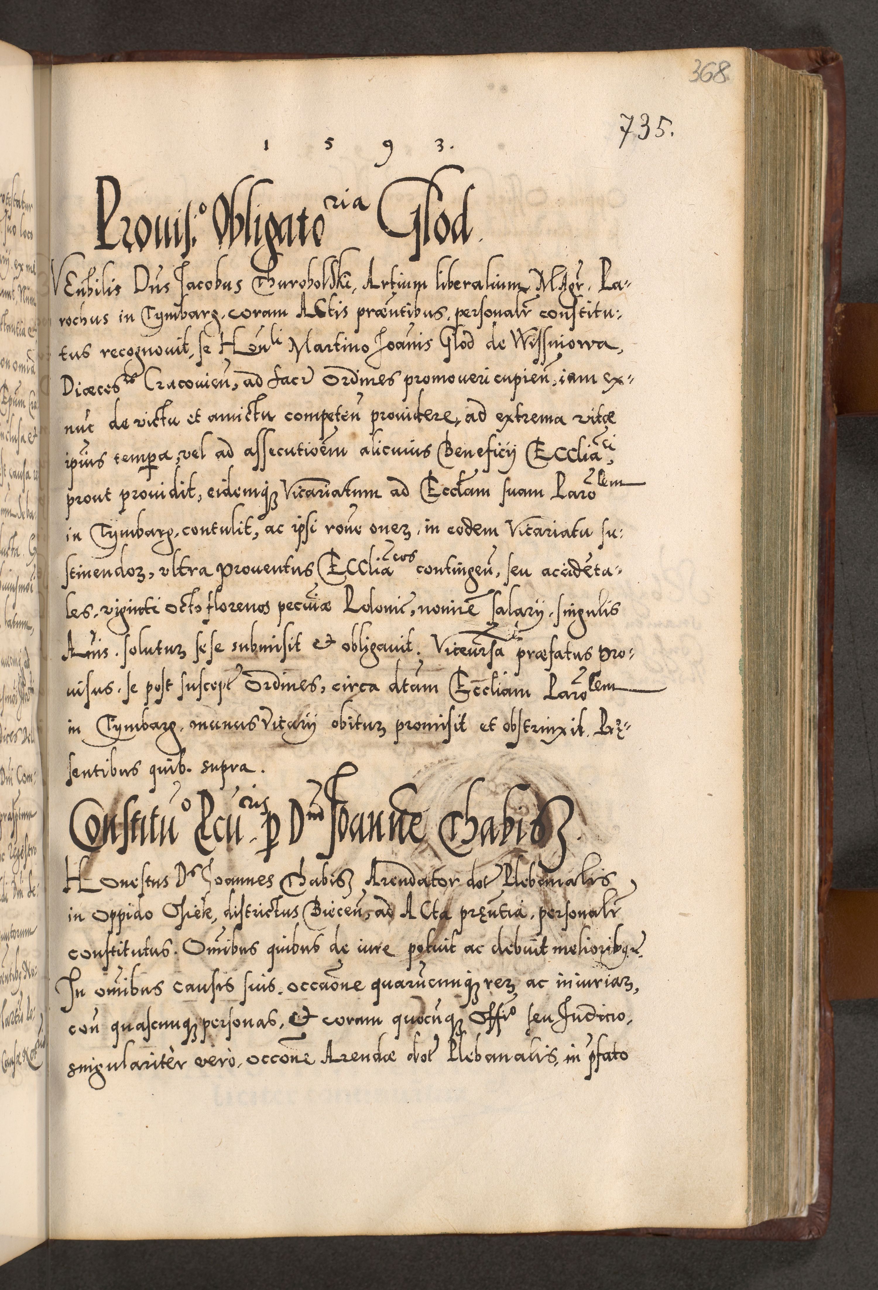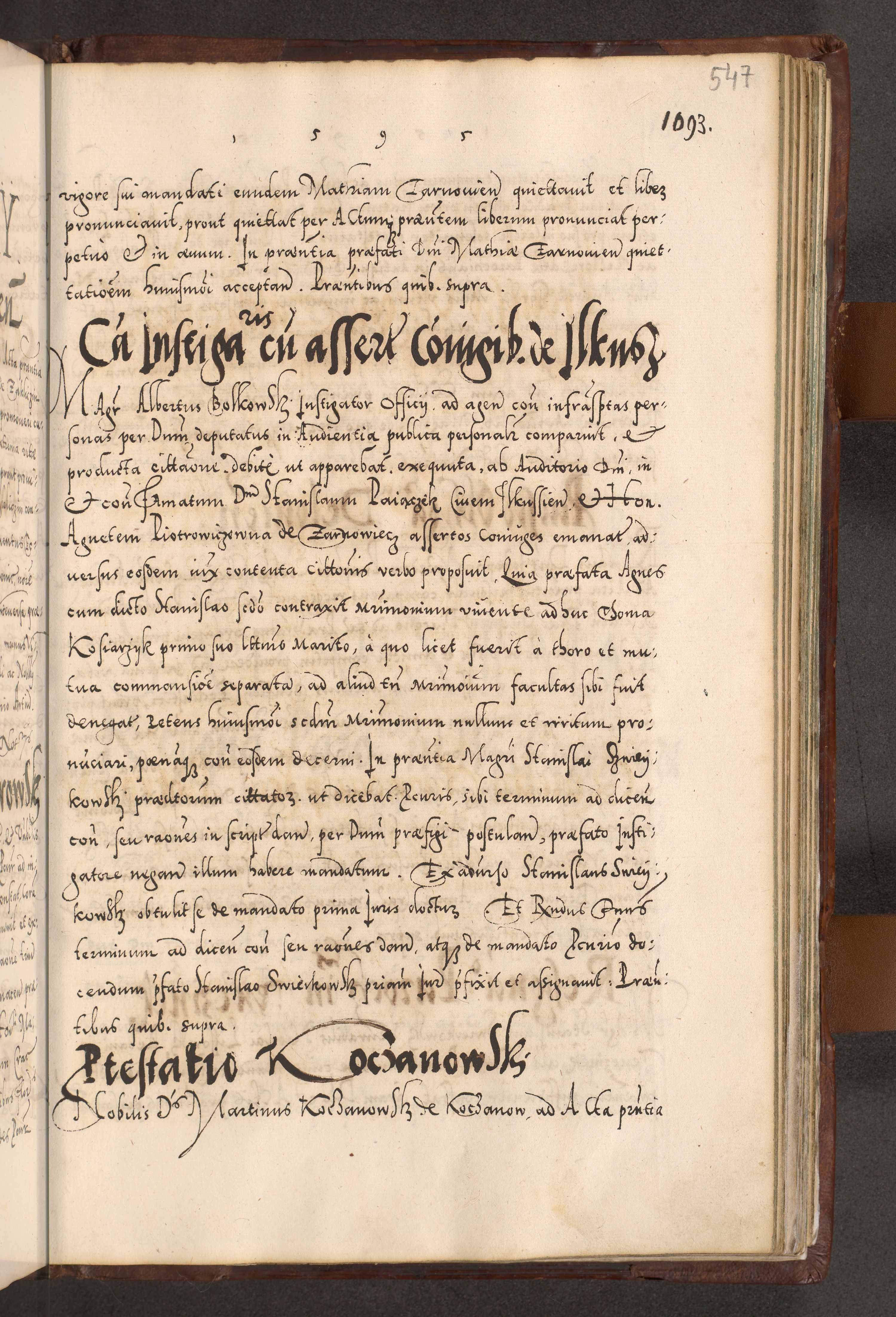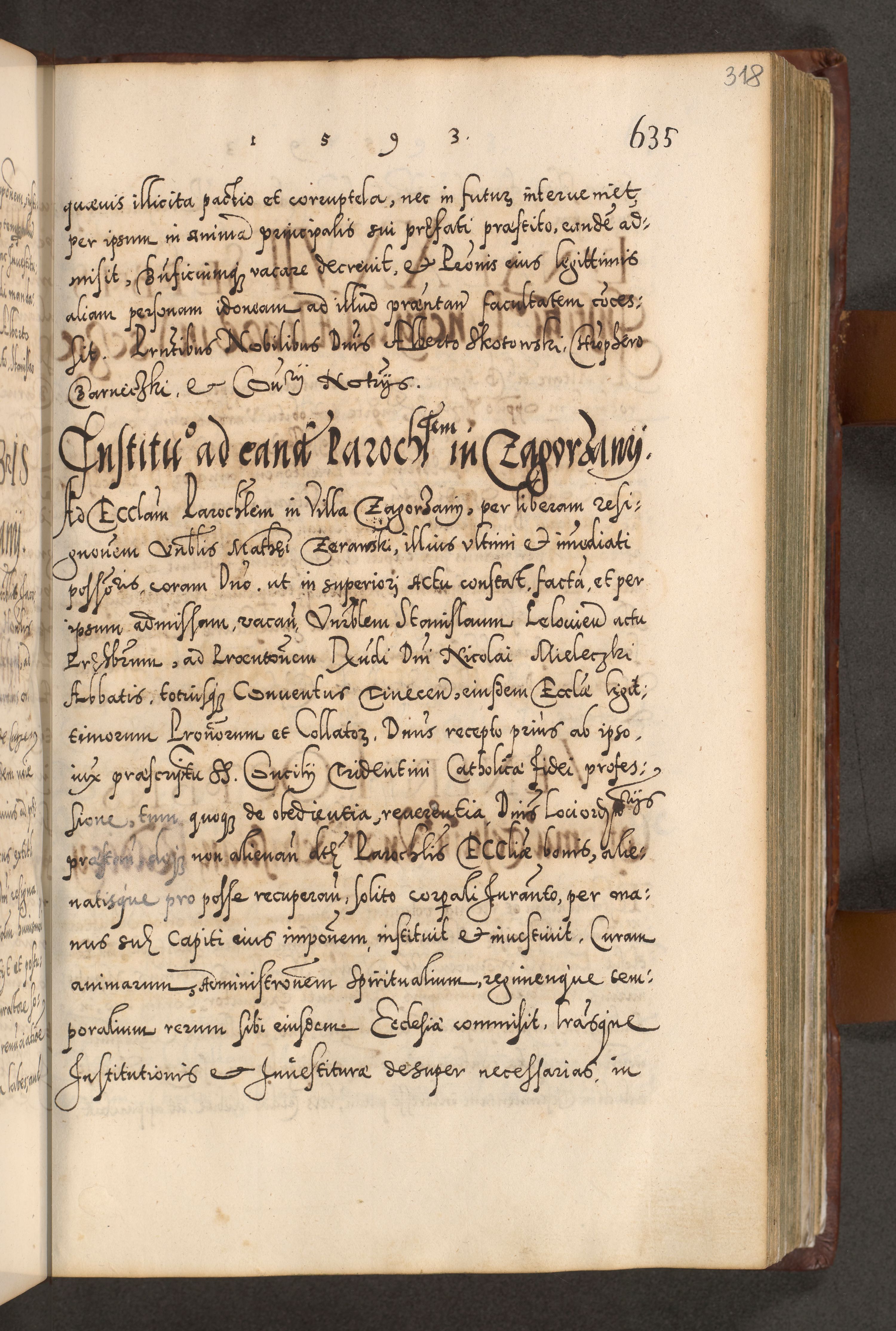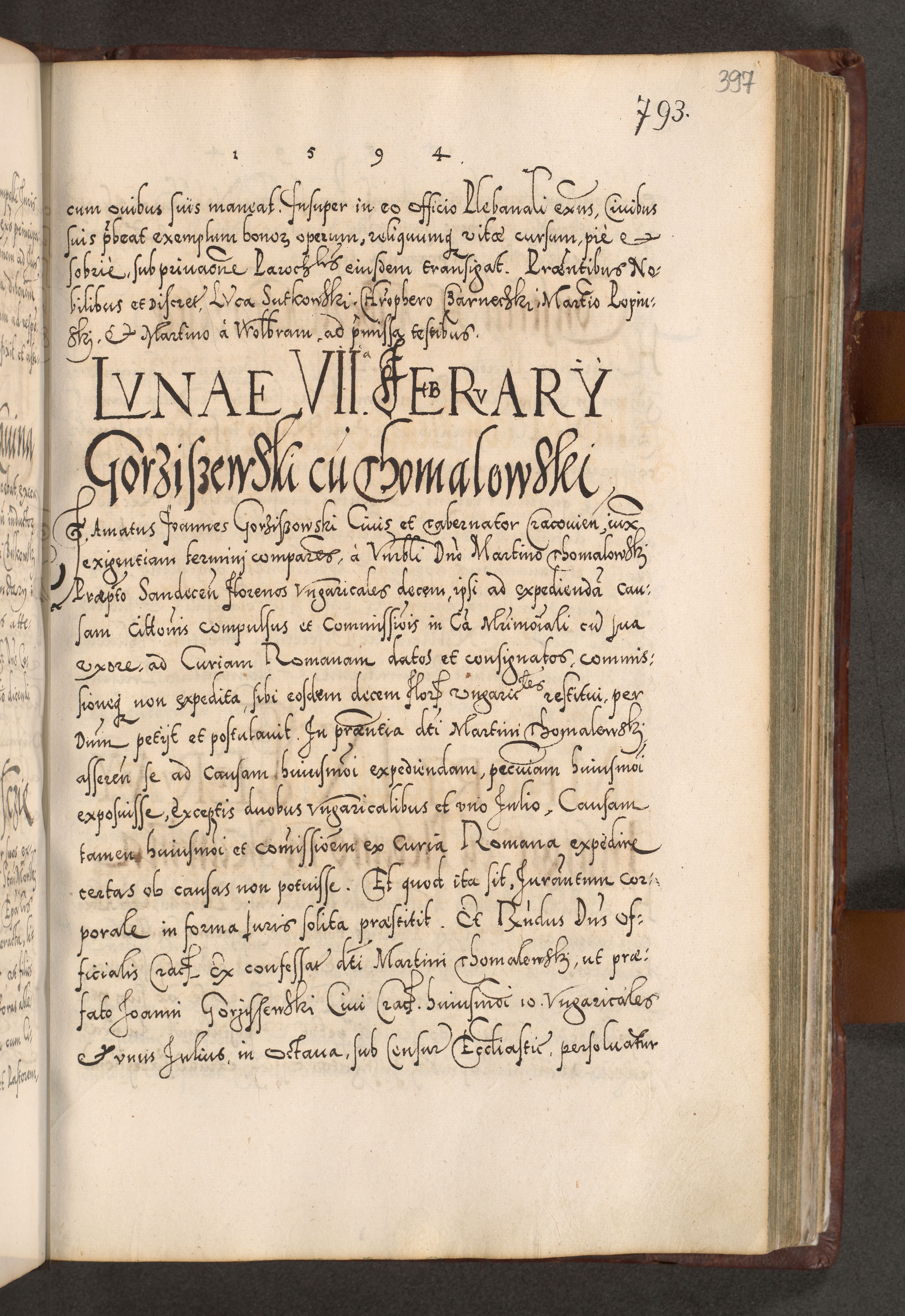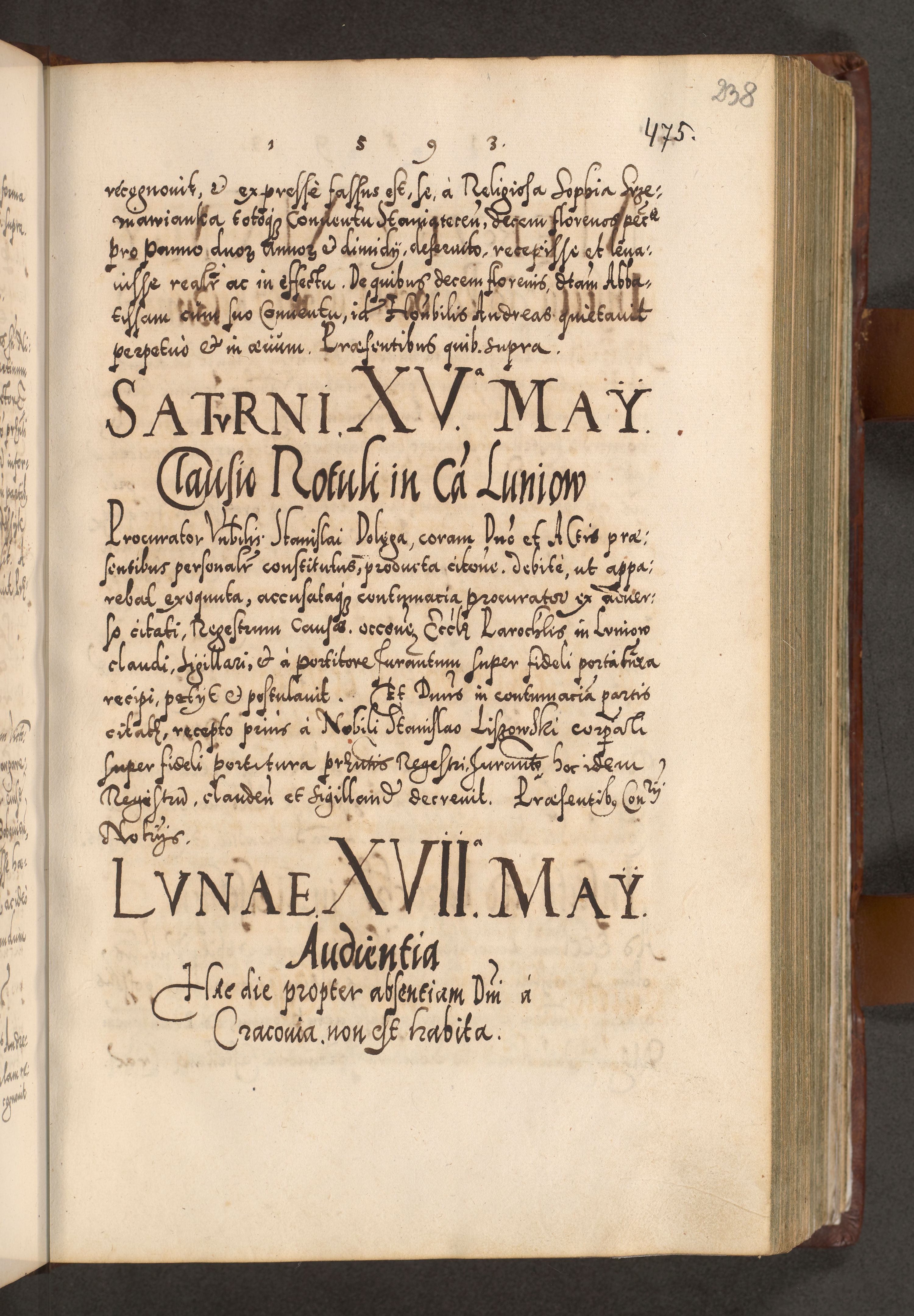 Illistrissimo et revedissimo in Christo Patre Domino Domino Georgio Rzadziwił Miserone Divina Sacrostae R. E. Tituli S. Sixti Presbitero Cardinali Duce in Olyka et Niesswiesz ad Gubernacula Ecclessiae Cracoviensis cuius administratorialem a Sancta Sede Apostolica obtinverat feliciter sedente. Acta actorum, causarum, sententiarum tam deffinitivarum quam interloquutoriarum decretorum, obligationum, quietationum, recognitionum, constitutionum procuratorum etc. coram Reverendo Domino Stanislao Crassinskz de Crasne Archidiacono Cracoviensis, Scholastico Gnesnesis, Custode Plocensis etc. Vicario et Officiali Generali Cracoviensi in Ano Domini Millesimo Quingentesimo Nonagesimo Primo cuius indictio quarta pontificatus SS. Domini Nostri Gregorii XIIII Anno I psius prio feliciter incipiut