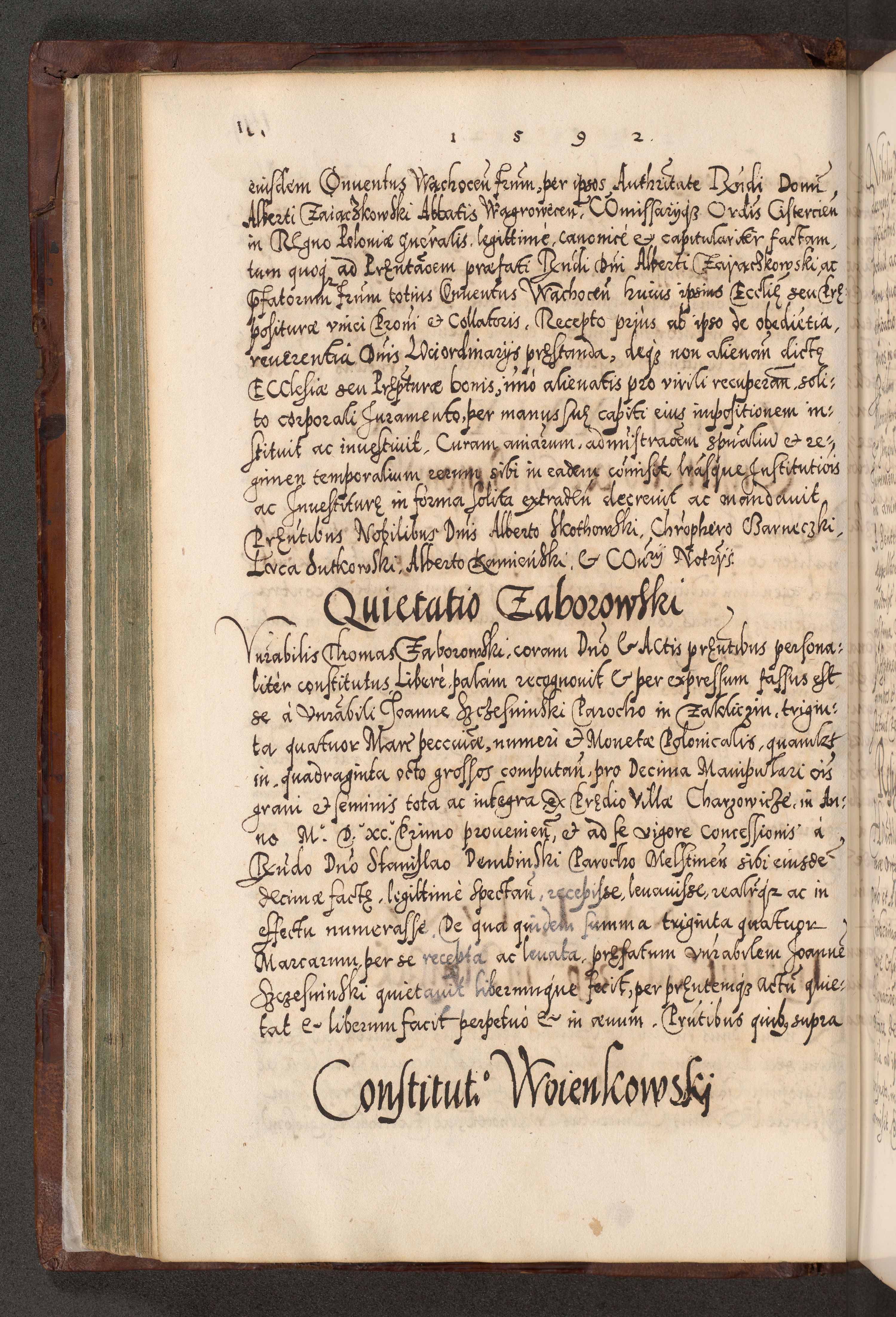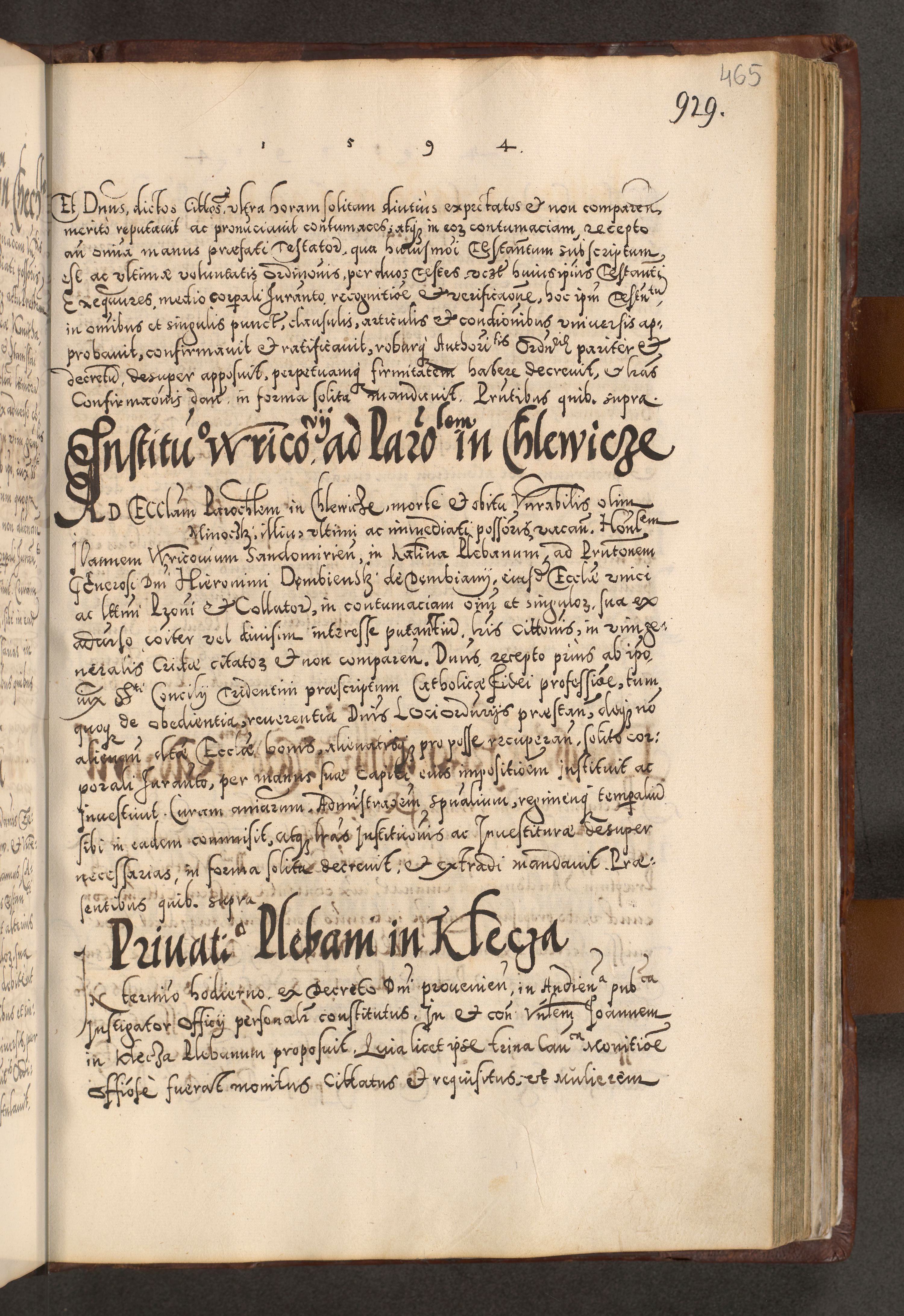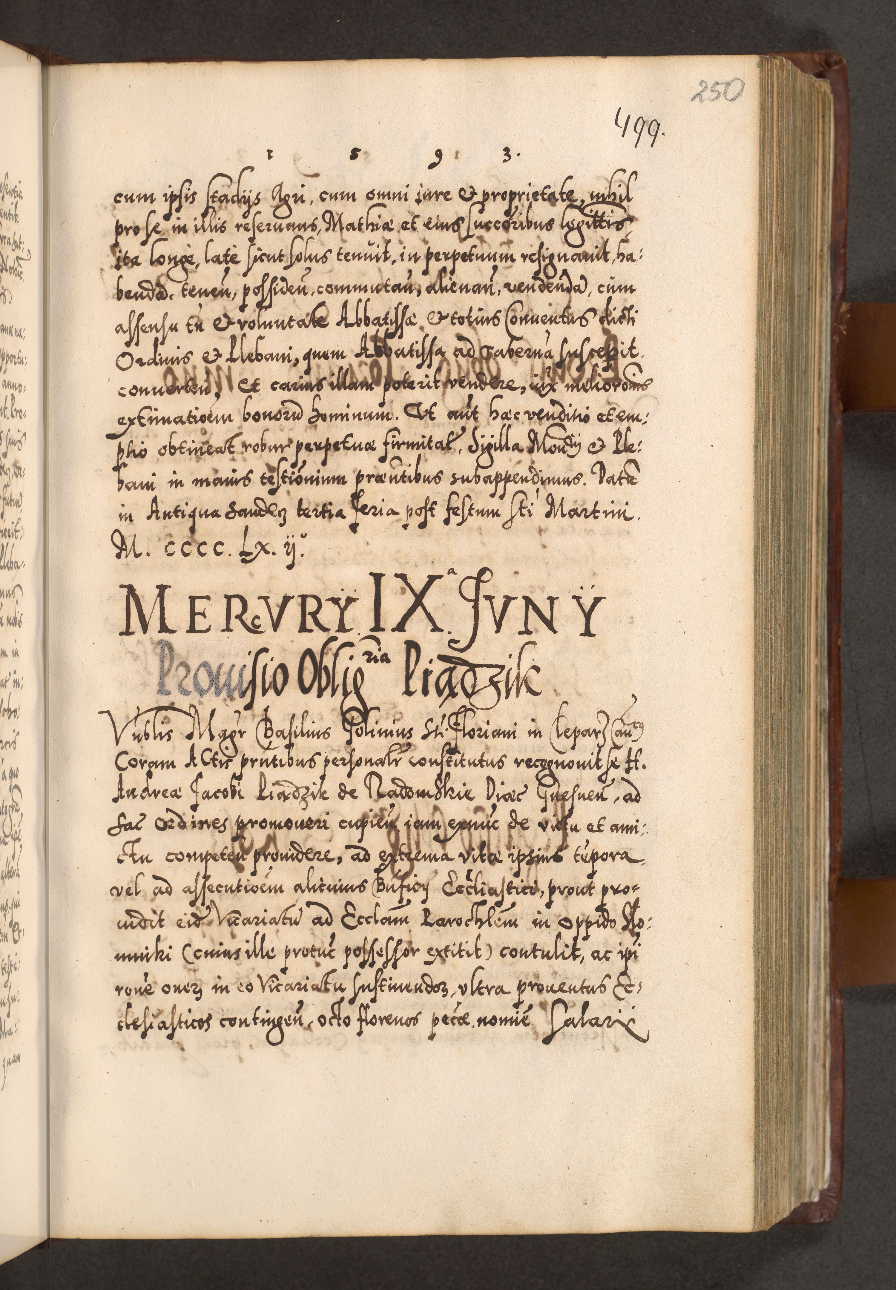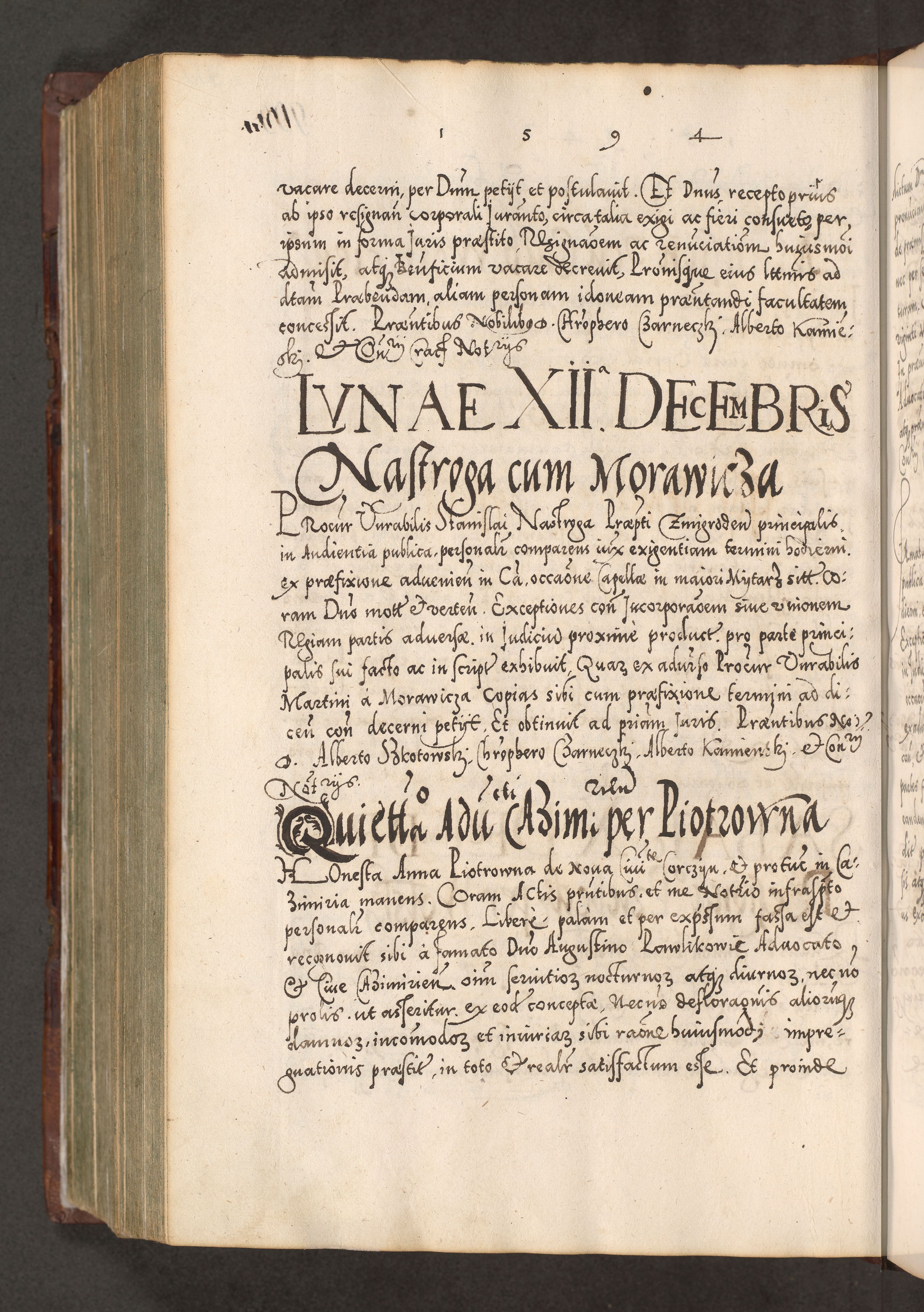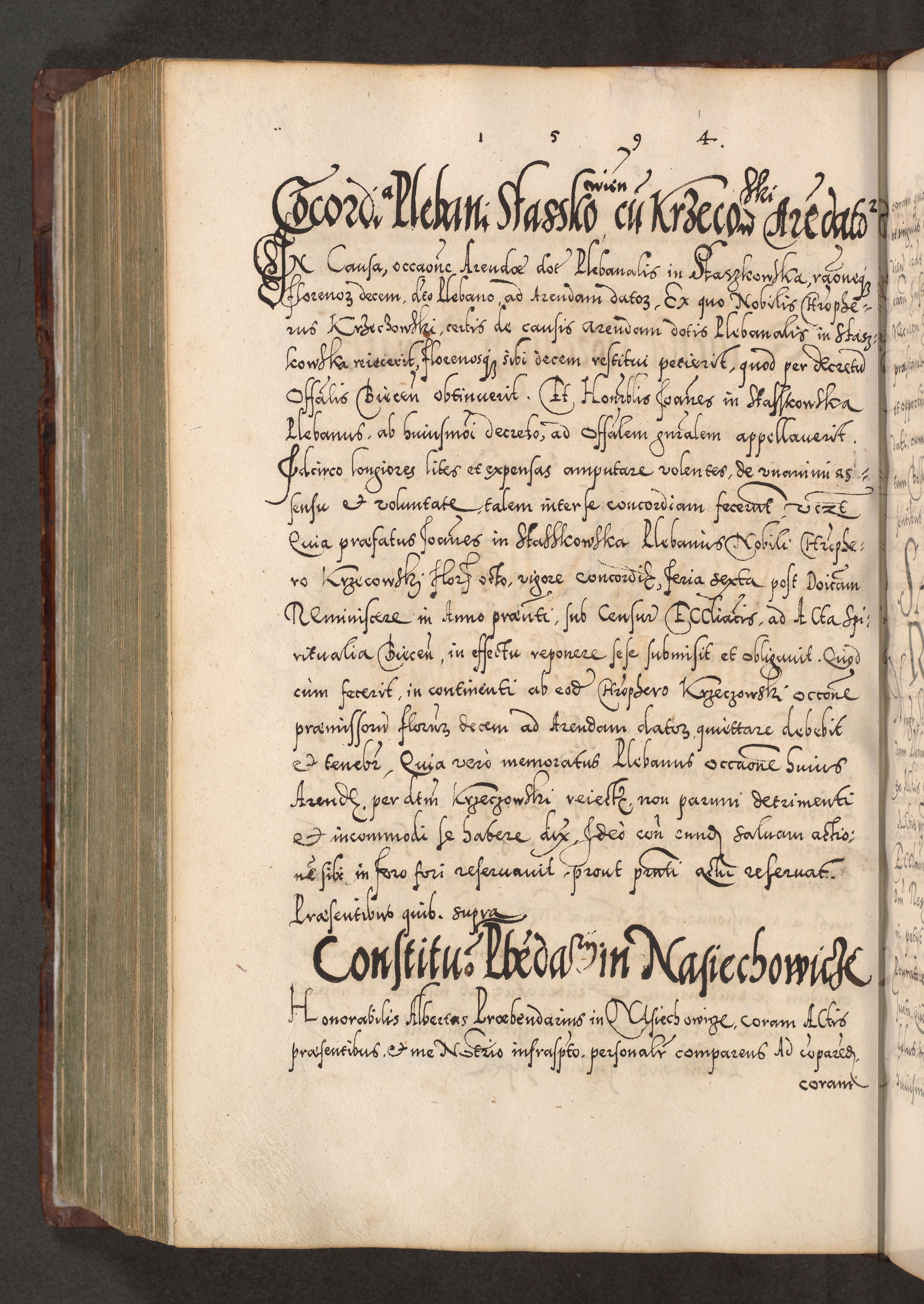 Illistrissimo et revedissimo in Christo Patre Domino Domino Georgio Rzadziwił Miserone Divina Sacrostae R. E. Tituli S. Sixti Presbitero Cardinali Duce in Olyka et Niesswiesz ad Gubernacula Ecclessiae Cracoviensis cuius administratorialem a Sancta Sede Apostolica obtinverat feliciter sedente. Acta actorum, causarum, sententiarum tam deffinitivarum quam interloquutoriarum decretorum, obligationum, quietationum, recognitionum, constitutionum procuratorum etc. coram Reverendo Domino Stanislao Crassinskz de Crasne Archidiacono Cracoviensis, Scholastico Gnesnesis, Custode Plocensis etc. Vicario et Officiali Generali Cracoviensi in Ano Domini Millesimo Quingentesimo Nonagesimo Primo cuius indictio quarta pontificatus SS. Domini Nostri Gregorii XIIII Anno I psius prio feliciter incipiut