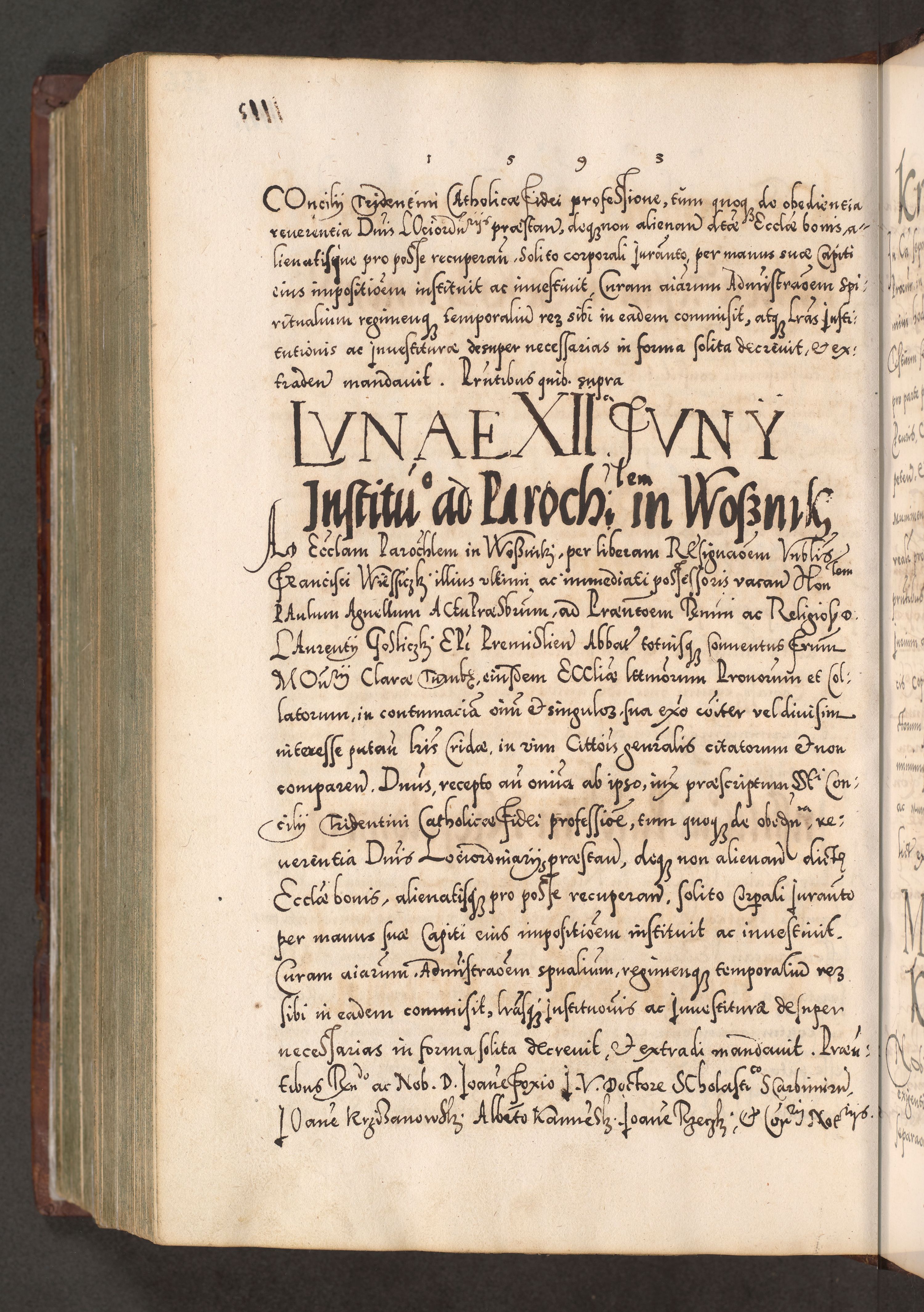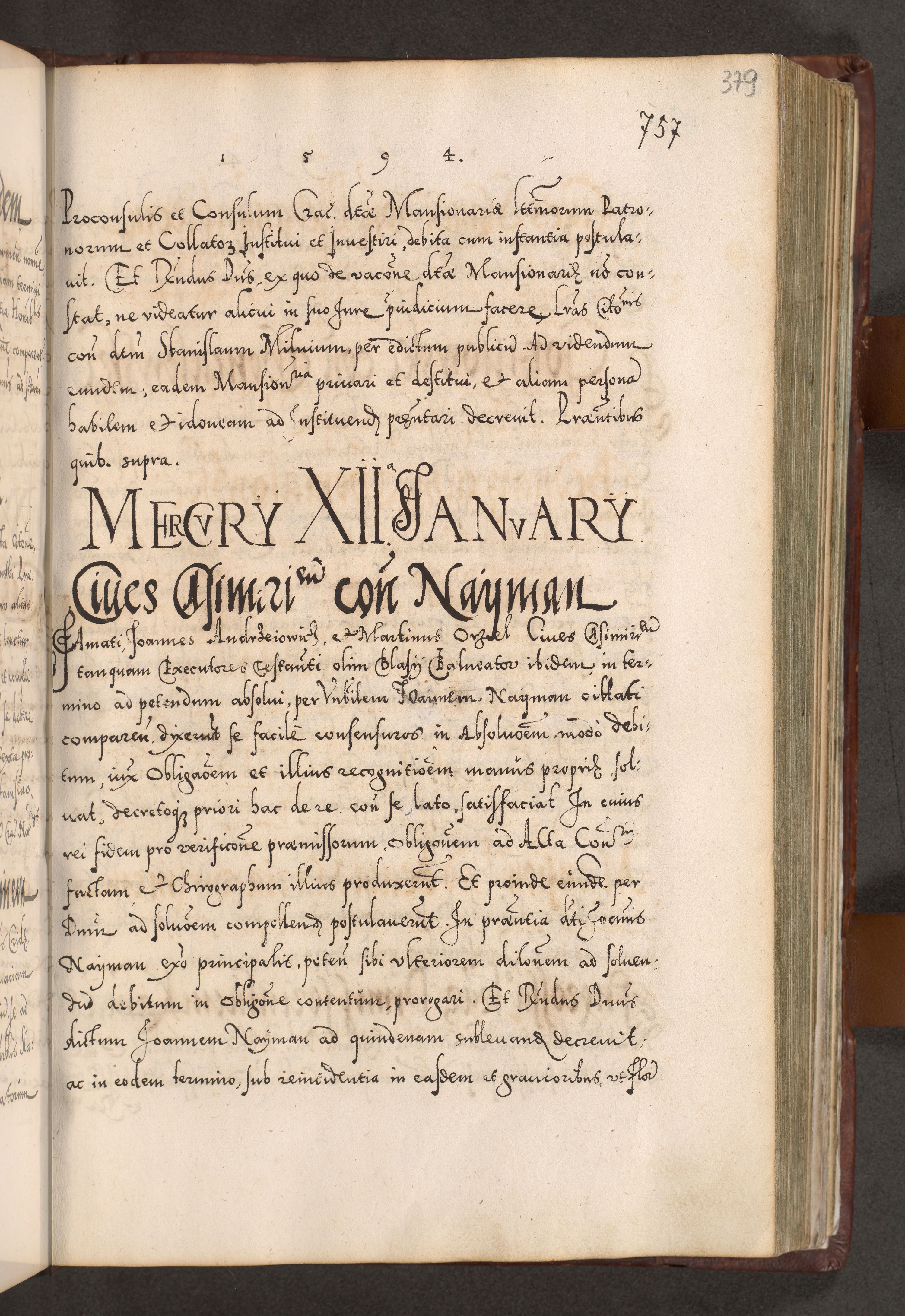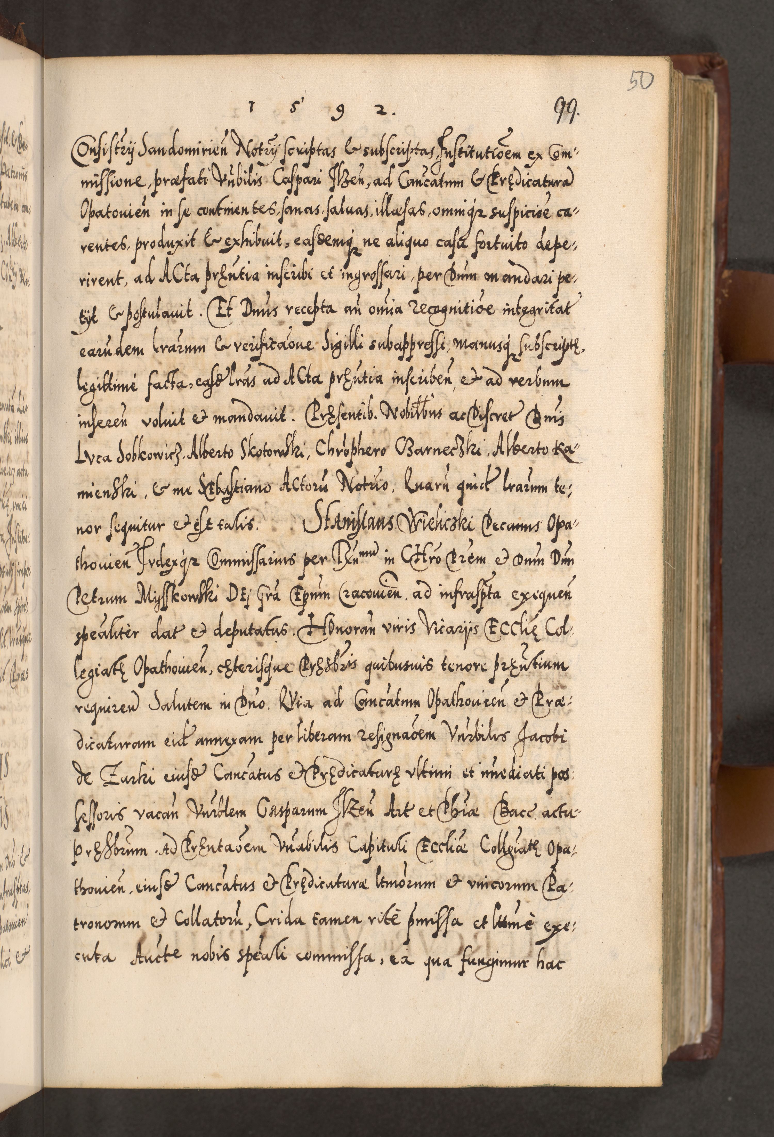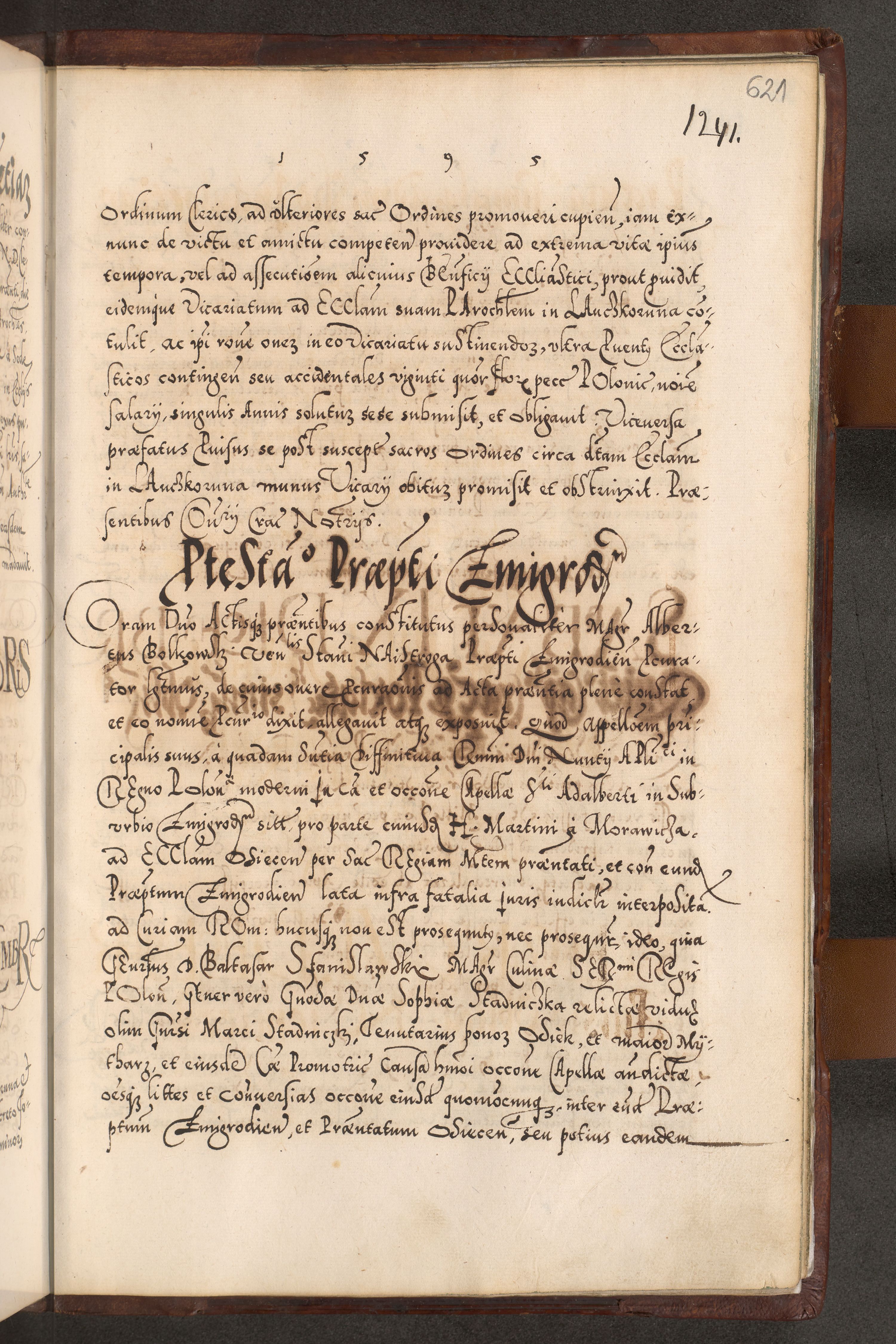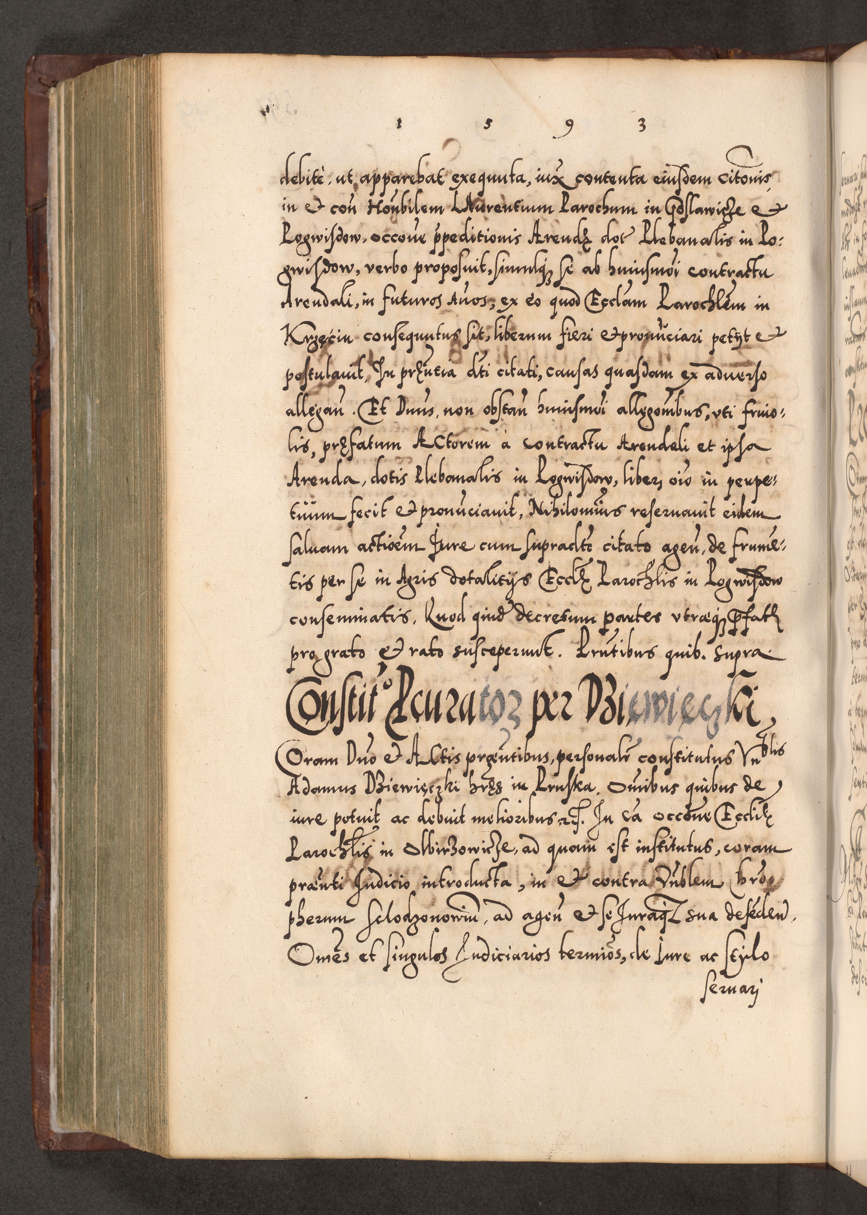 Illistrissimo et revedissimo in Christo Patre Domino Domino Georgio Rzadziwił Miserone Divina Sacrostae R. E. Tituli S. Sixti Presbitero Cardinali Duce in Olyka et Niesswiesz ad Gubernacula Ecclessiae Cracoviensis cuius administratorialem a Sancta Sede Apostolica obtinverat feliciter sedente. Acta actorum, causarum, sententiarum tam deffinitivarum quam interloquutoriarum decretorum, obligationum, quietationum, recognitionum, constitutionum procuratorum etc. coram Reverendo Domino Stanislao Crassinskz de Crasne Archidiacono Cracoviensis, Scholastico Gnesnesis, Custode Plocensis etc. Vicario et Officiali Generali Cracoviensi in Ano Domini Millesimo Quingentesimo Nonagesimo Primo cuius indictio quarta pontificatus SS. Domini Nostri Gregorii XIIII Anno I psius prio feliciter incipiut