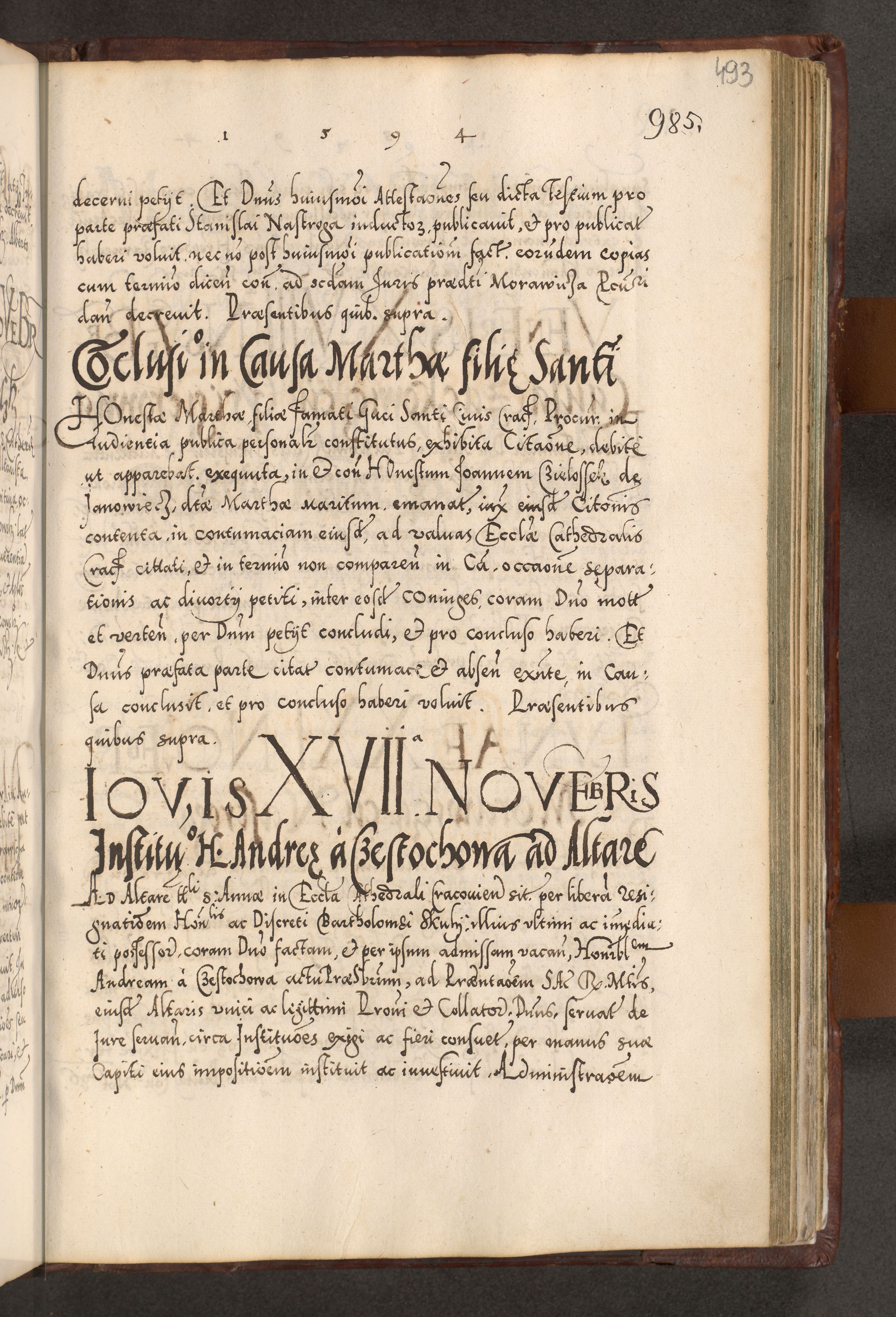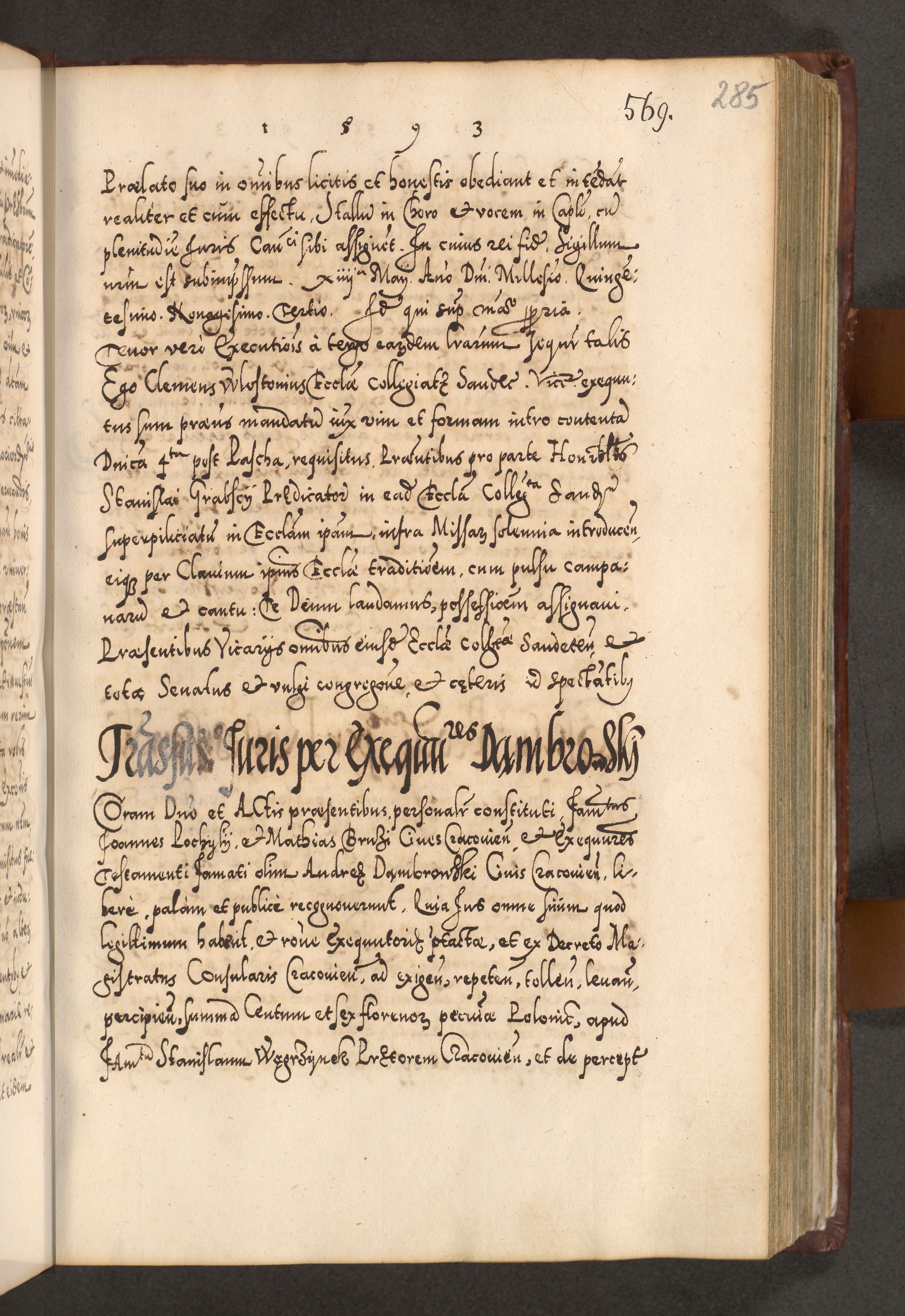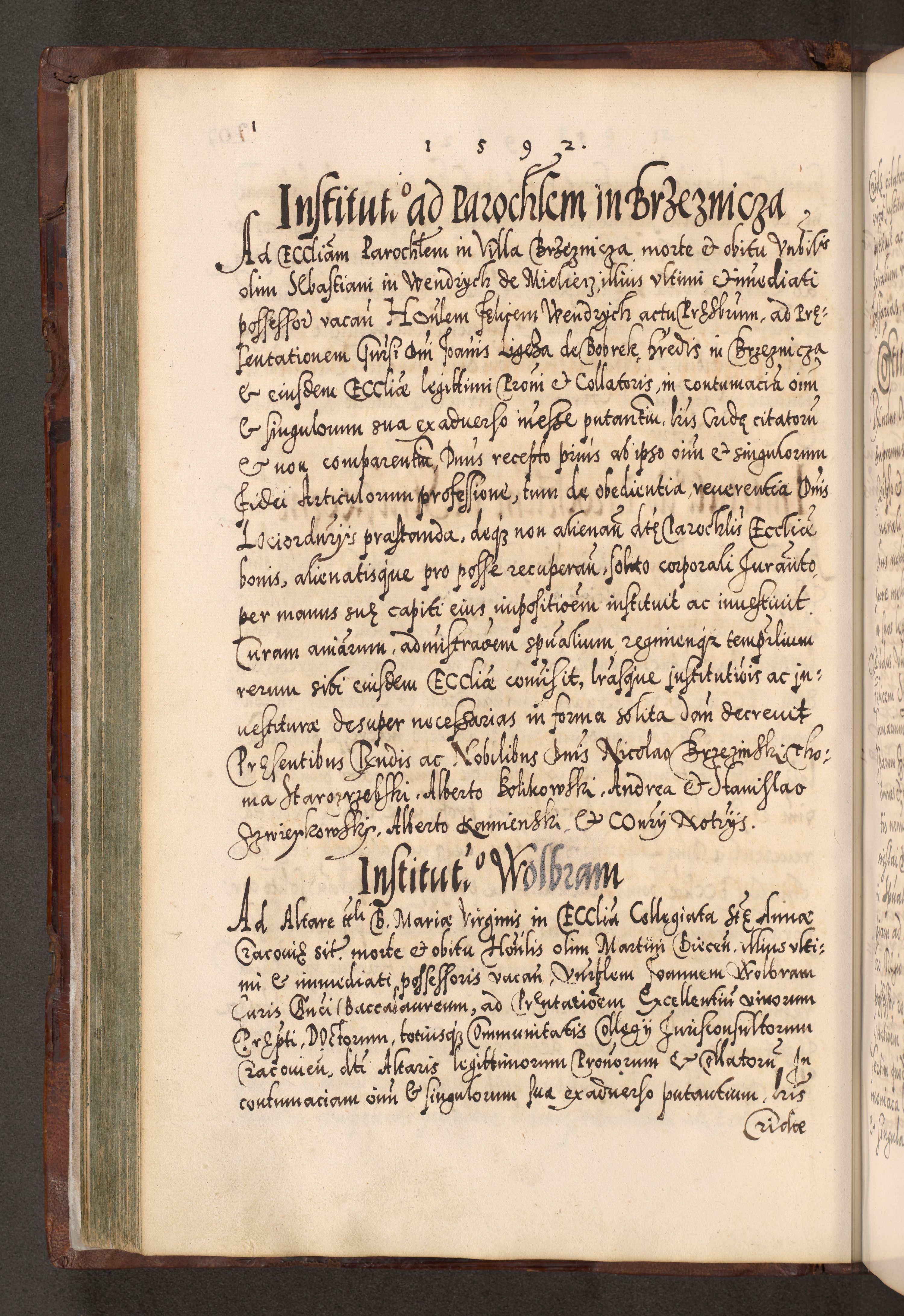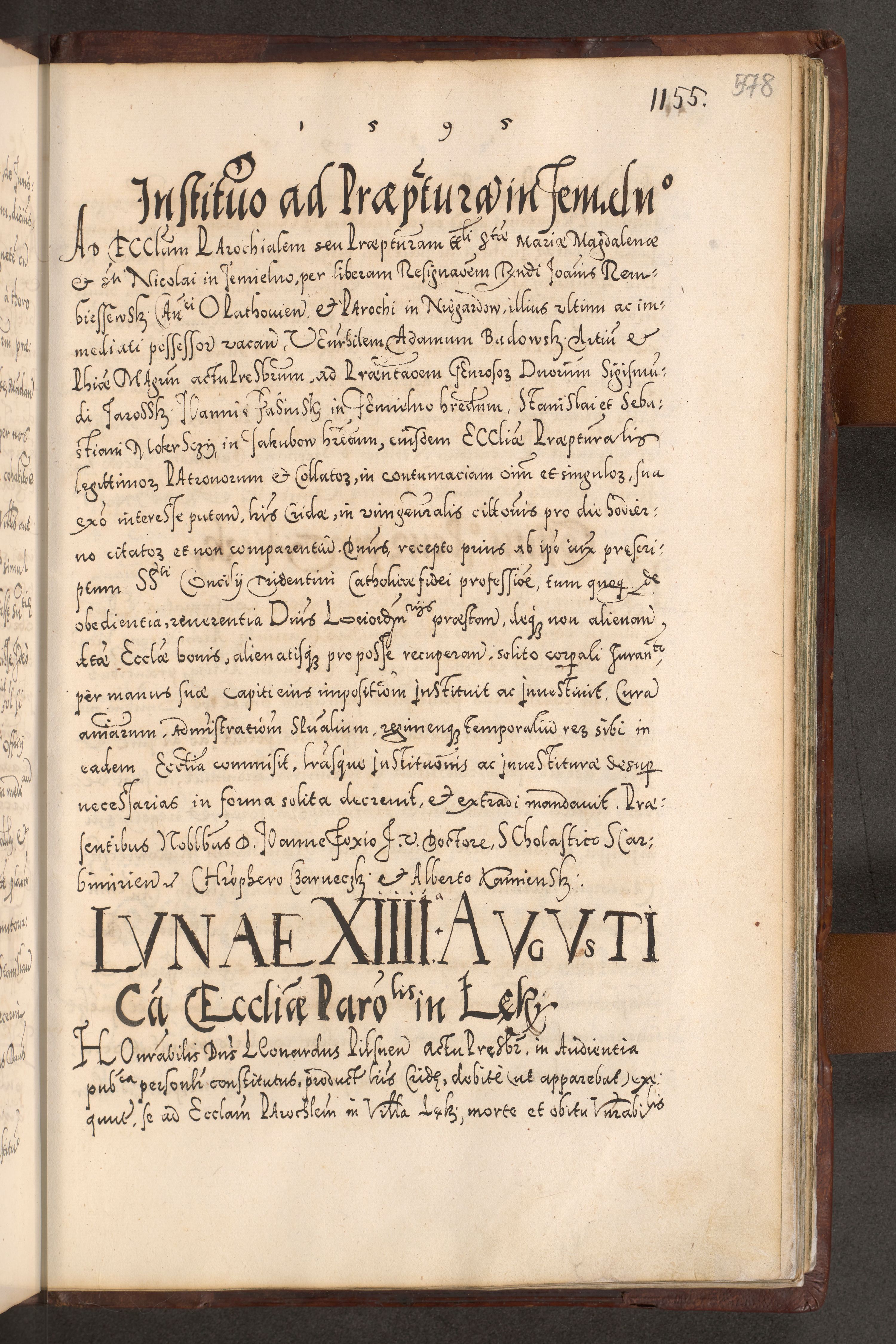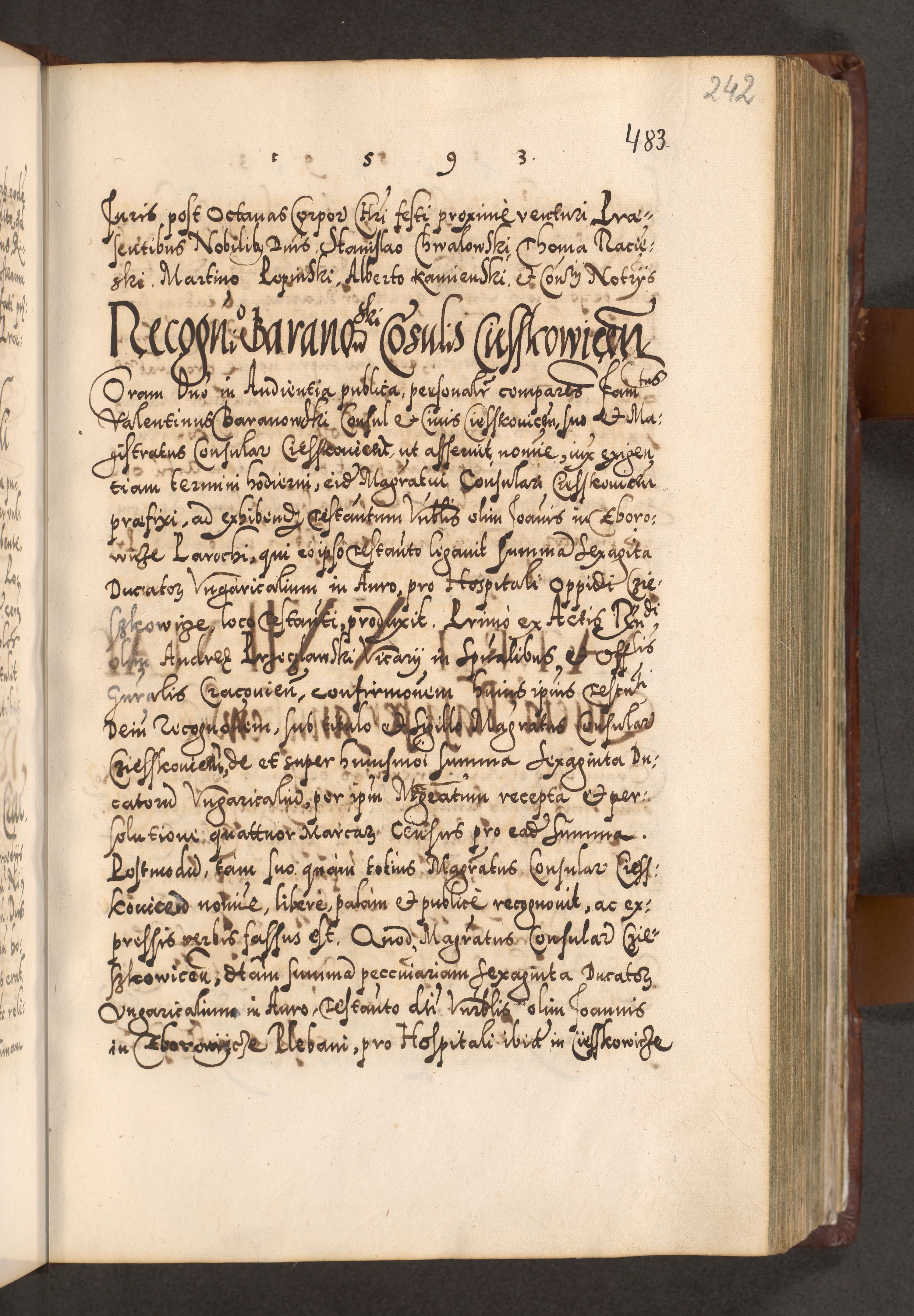 Illistrissimo et revedissimo in Christo Patre Domino Domino Georgio Rzadziwił Miserone Divina Sacrostae R. E. Tituli S. Sixti Presbitero Cardinali Duce in Olyka et Niesswiesz ad Gubernacula Ecclessiae Cracoviensis cuius administratorialem a Sancta Sede Apostolica obtinverat feliciter sedente. Acta actorum, causarum, sententiarum tam deffinitivarum quam interloquutoriarum decretorum, obligationum, quietationum, recognitionum, constitutionum procuratorum etc. coram Reverendo Domino Stanislao Crassinskz de Crasne Archidiacono Cracoviensis, Scholastico Gnesnesis, Custode Plocensis etc. Vicario et Officiali Generali Cracoviensi in Ano Domini Millesimo Quingentesimo Nonagesimo Primo cuius indictio quarta pontificatus SS. Domini Nostri Gregorii XIIII Anno I psius prio feliciter incipiut