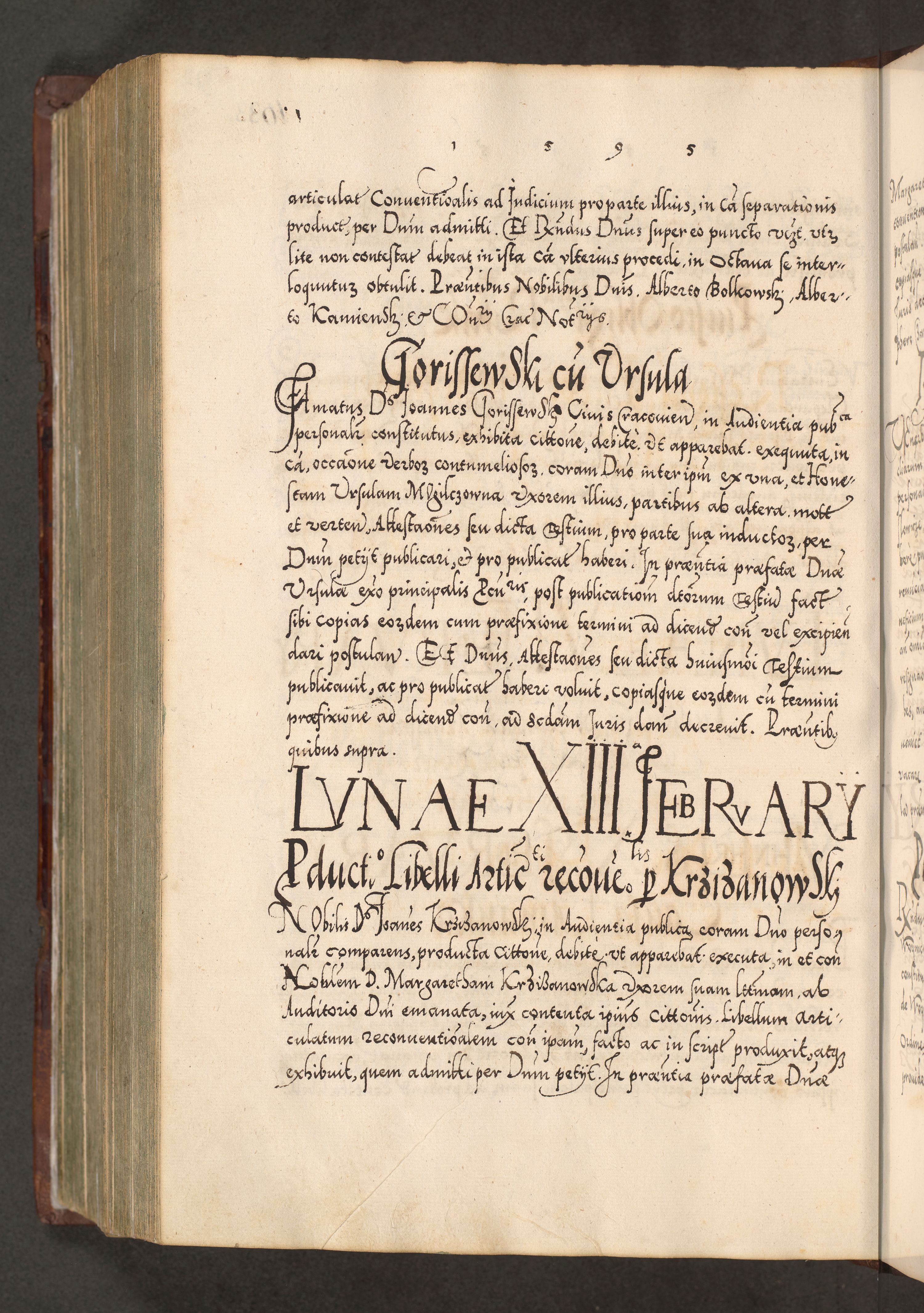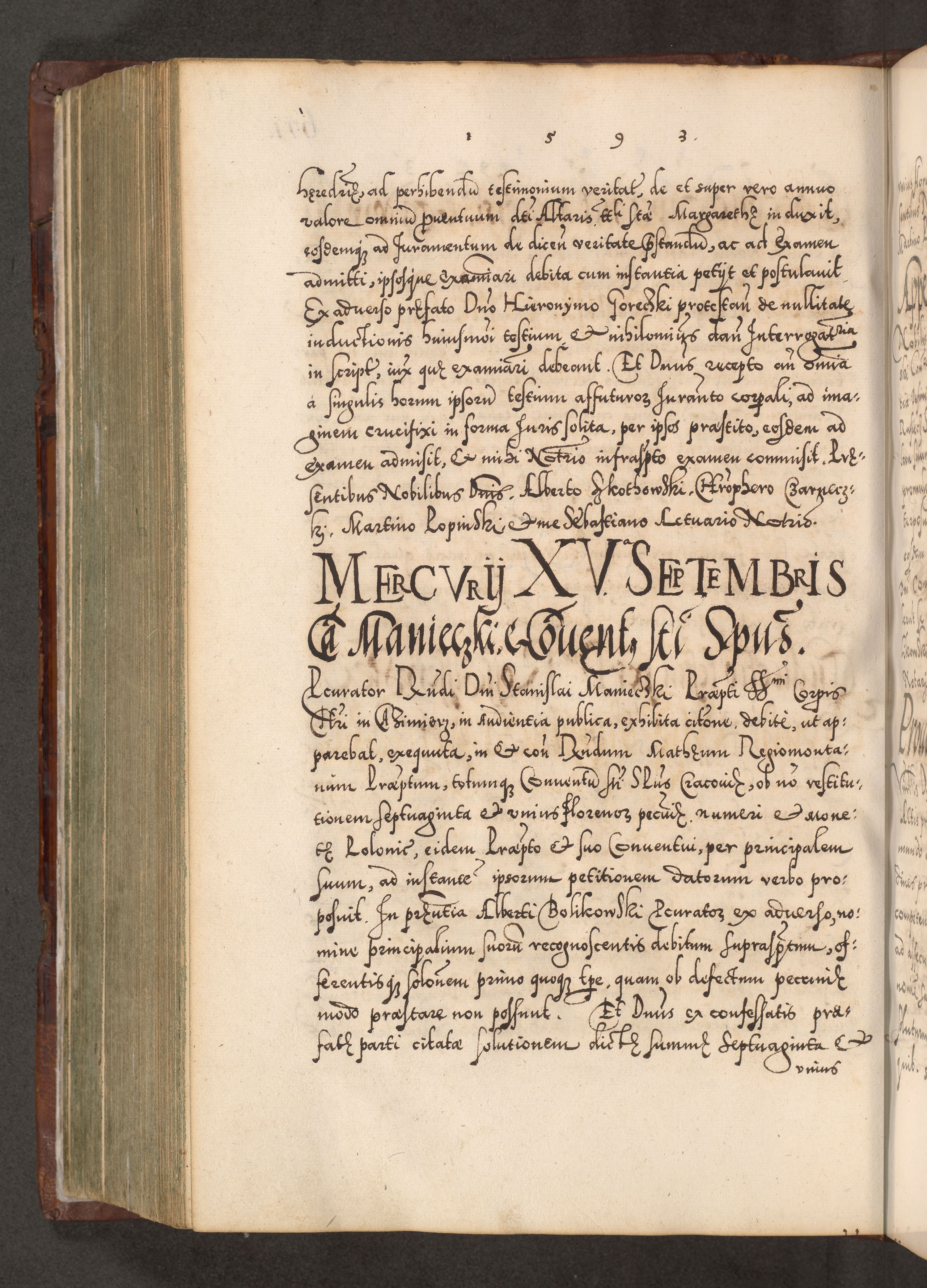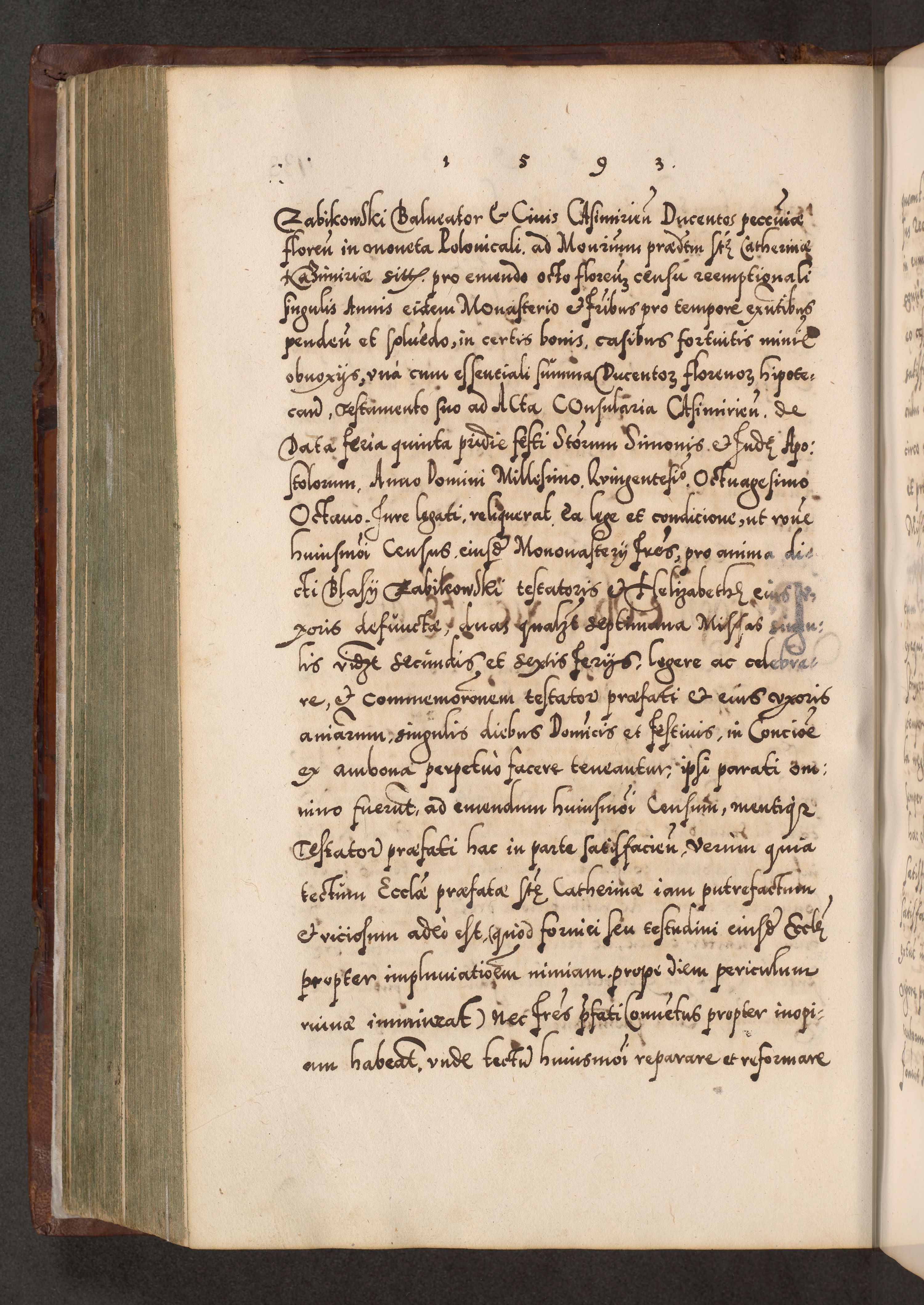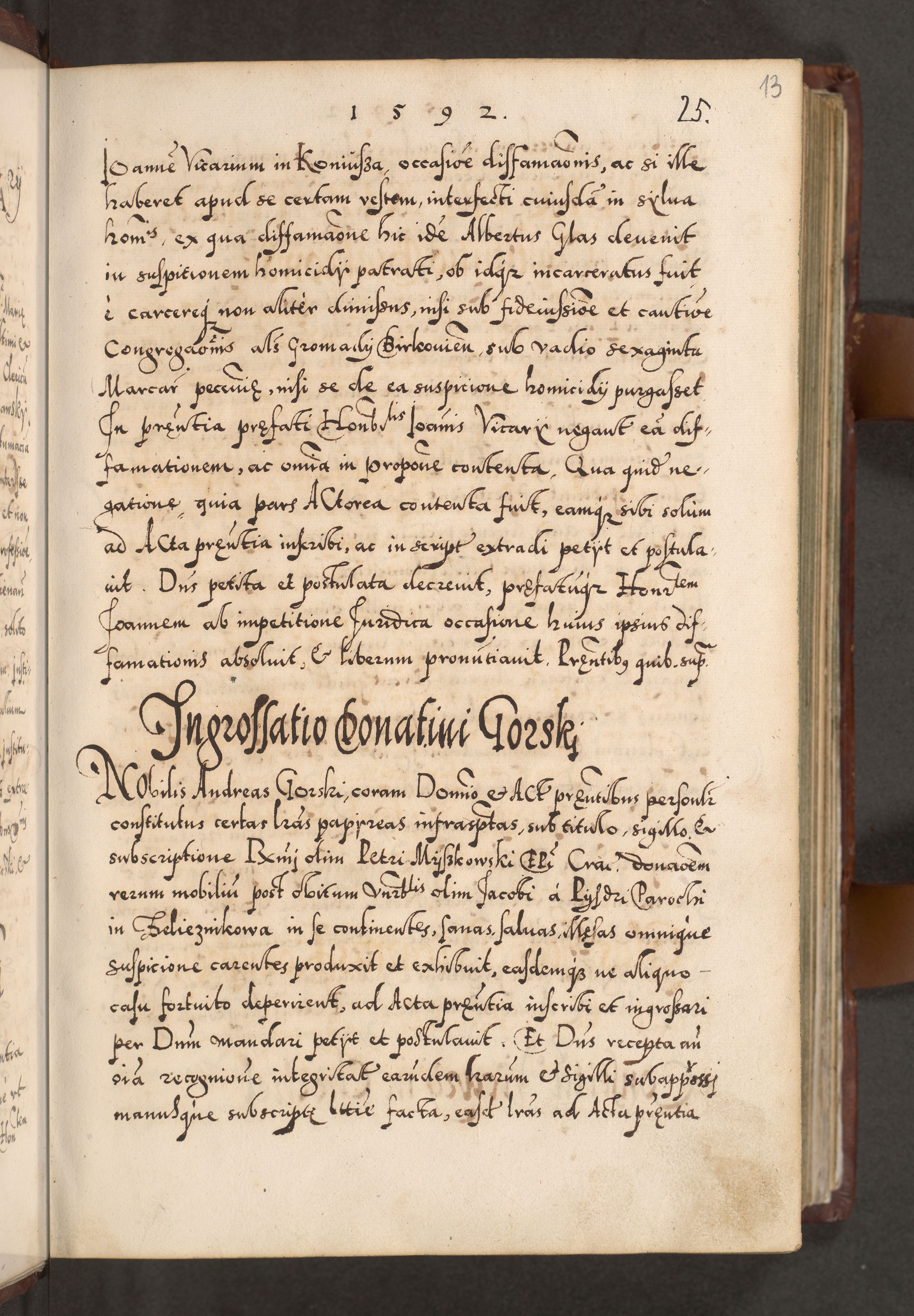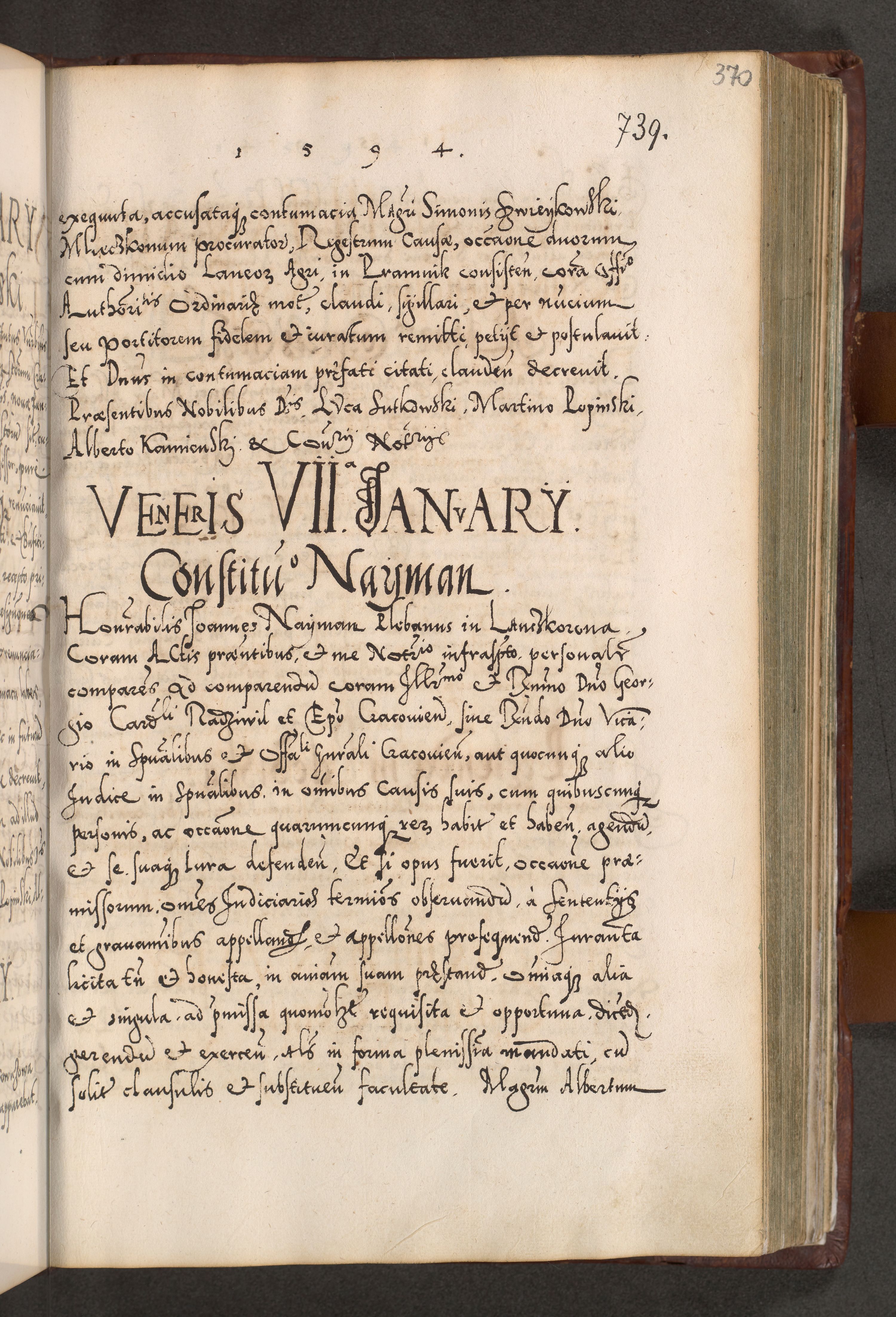Illistrissimo et revedissimo in Christo Patre Domino Domino Georgio Rzadziwił Miserone Divina Sacrostae R. E. Tituli S. Sixti Presbitero Cardinali Duce in Olyka et Niesswiesz ad Gubernacula Ecclessiae Cracoviensis cuius administratorialem a Sancta Sede Apostolica obtinverat feliciter sedente. Acta actorum, causarum, sententiarum tam deffinitivarum quam interloquutoriarum decretorum, obligationum, quietationum, recognitionum, constitutionum procuratorum etc. coram Reverendo Domino Stanislao Crassinskz de Crasne Archidiacono Cracoviensis, Scholastico Gnesnesis, Custode Plocensis etc. Vicario et Officiali Generali Cracoviensi in Ano Domini Millesimo Quingentesimo Nonagesimo Primo cuius indictio quarta pontificatus SS. Domini Nostri Gregorii XIIII Anno I psius prio feliciter incipiut