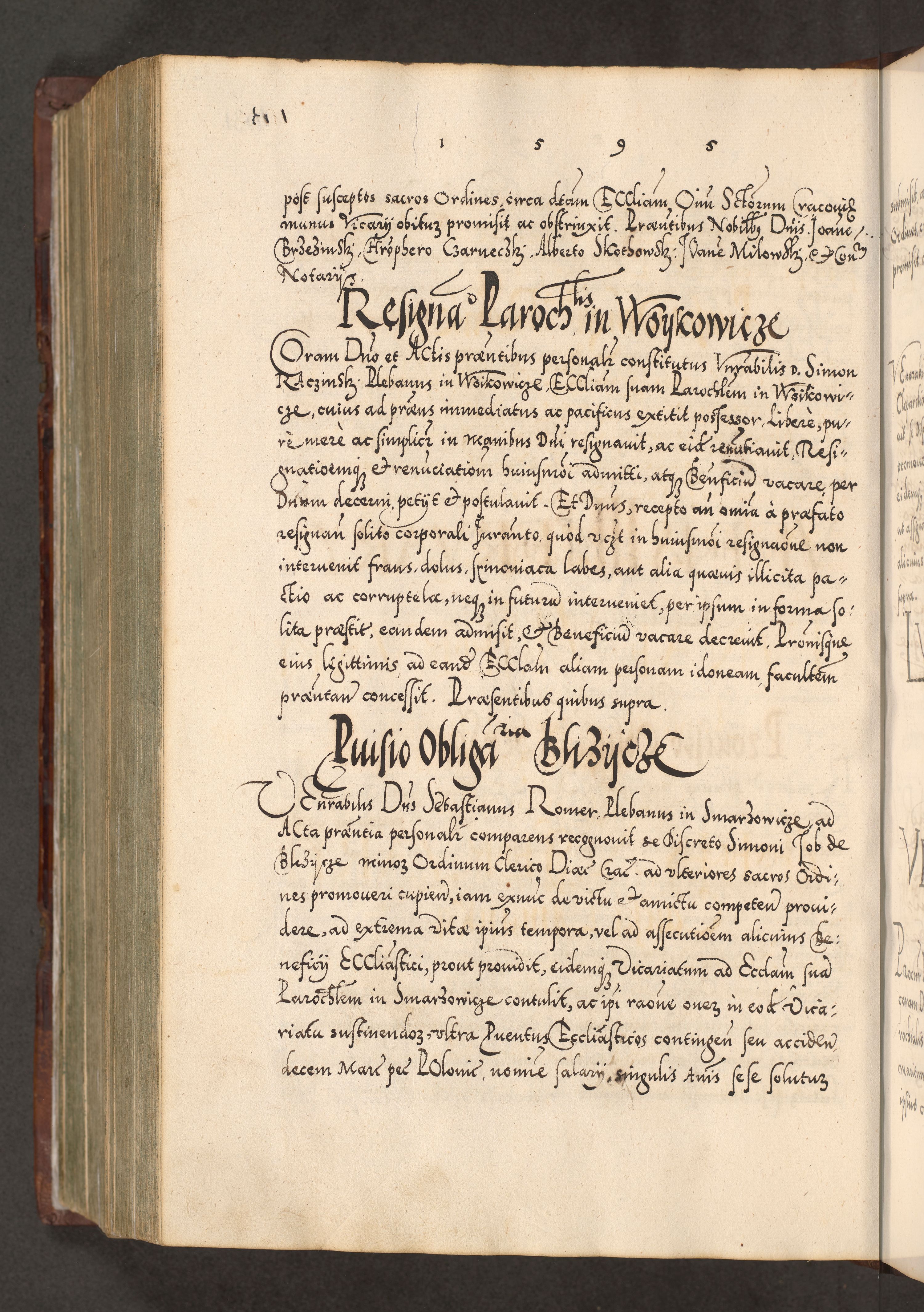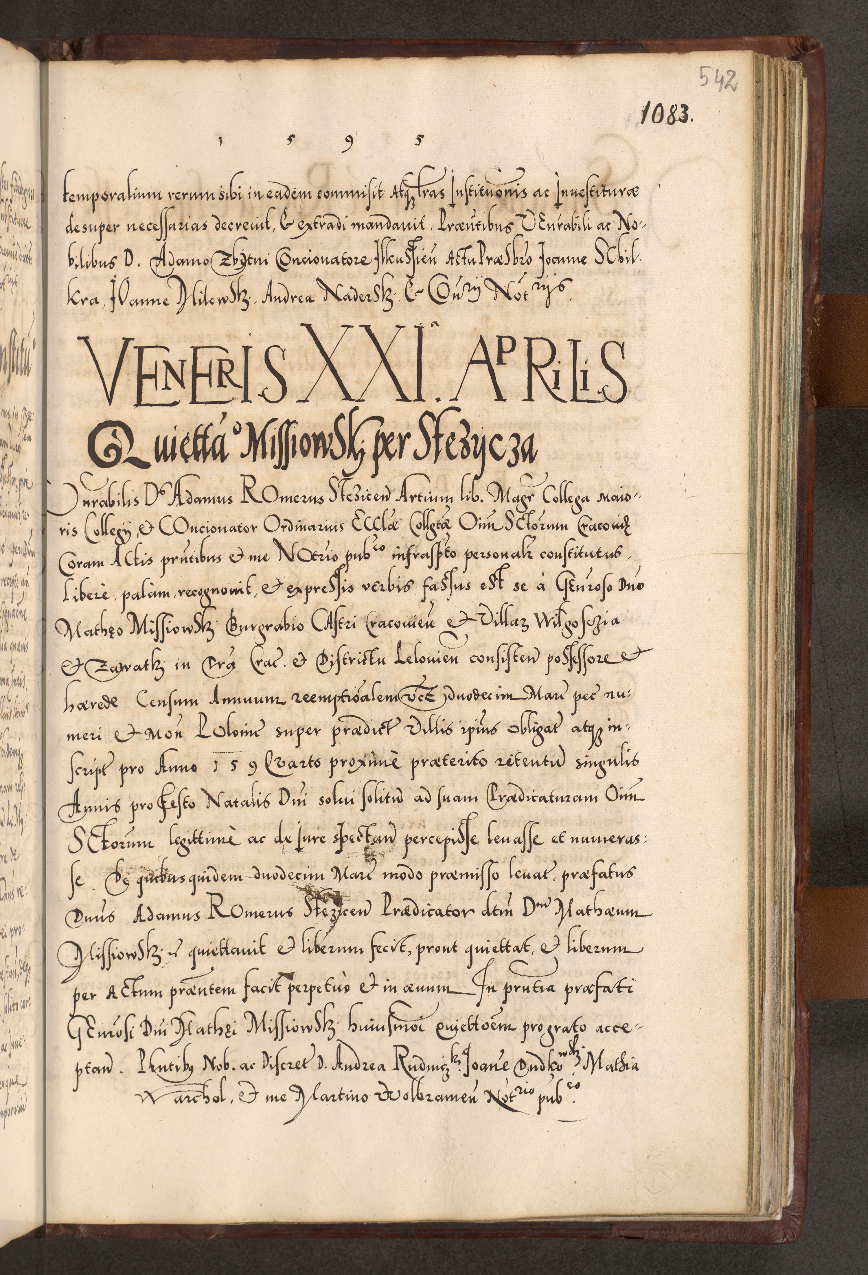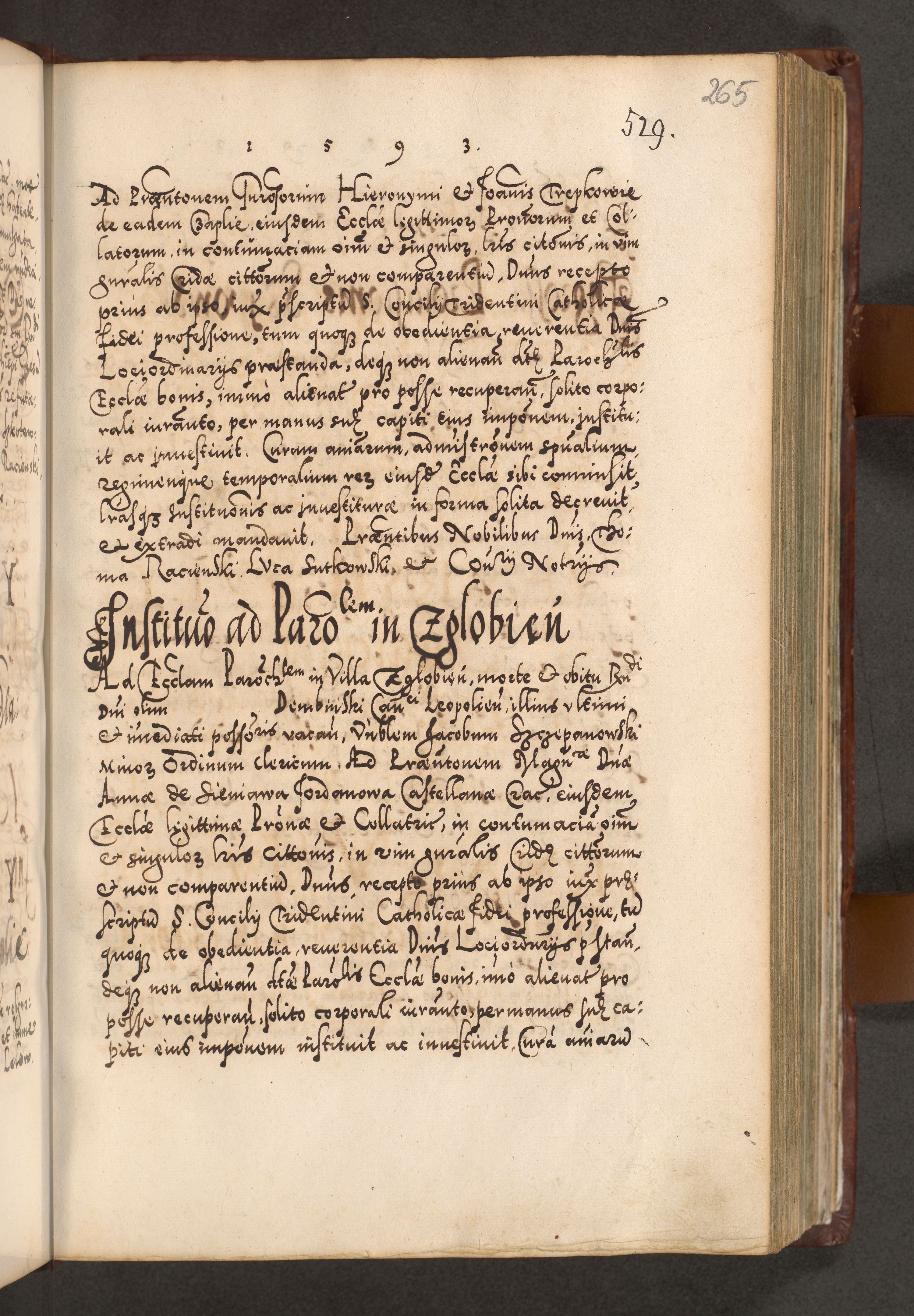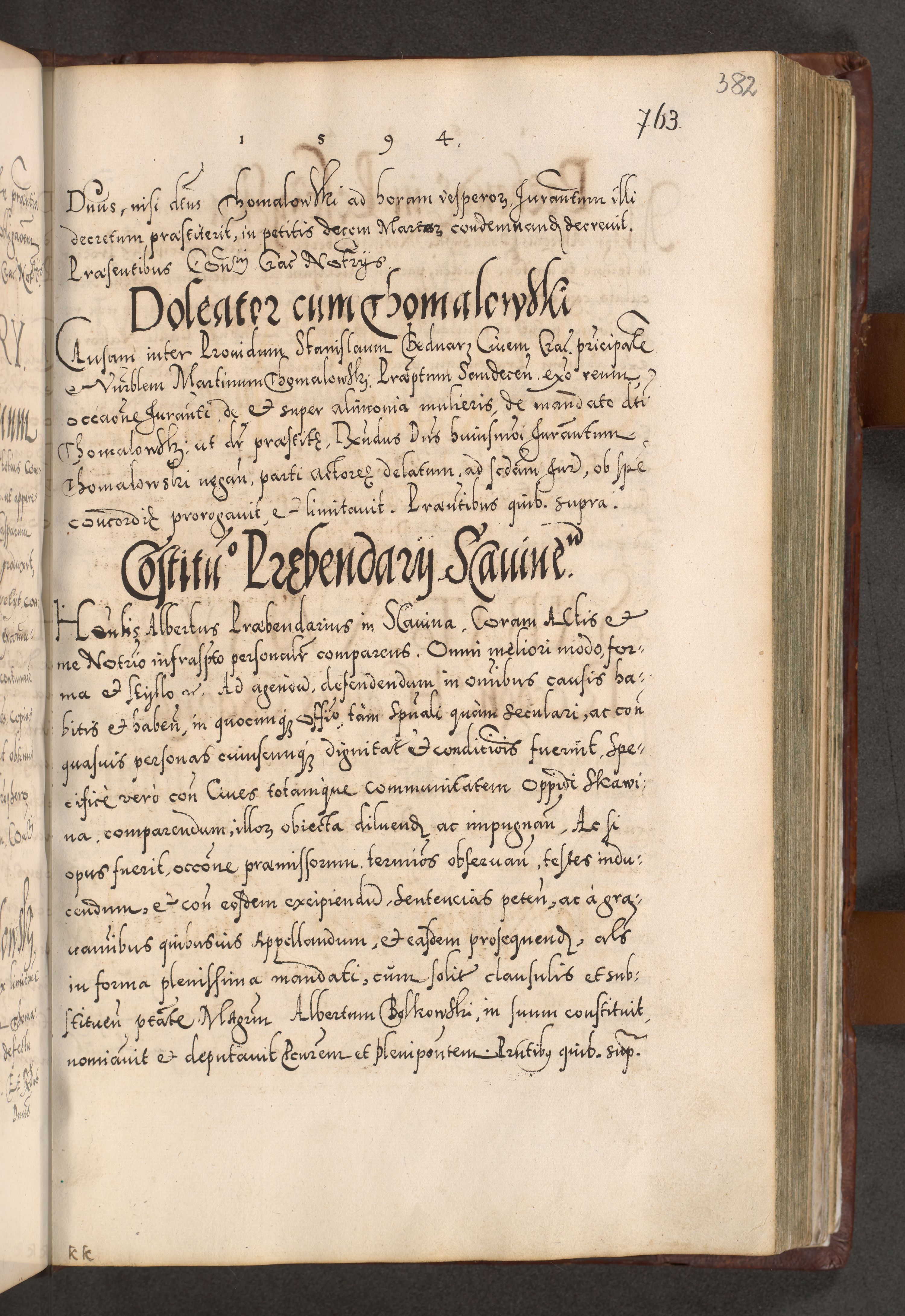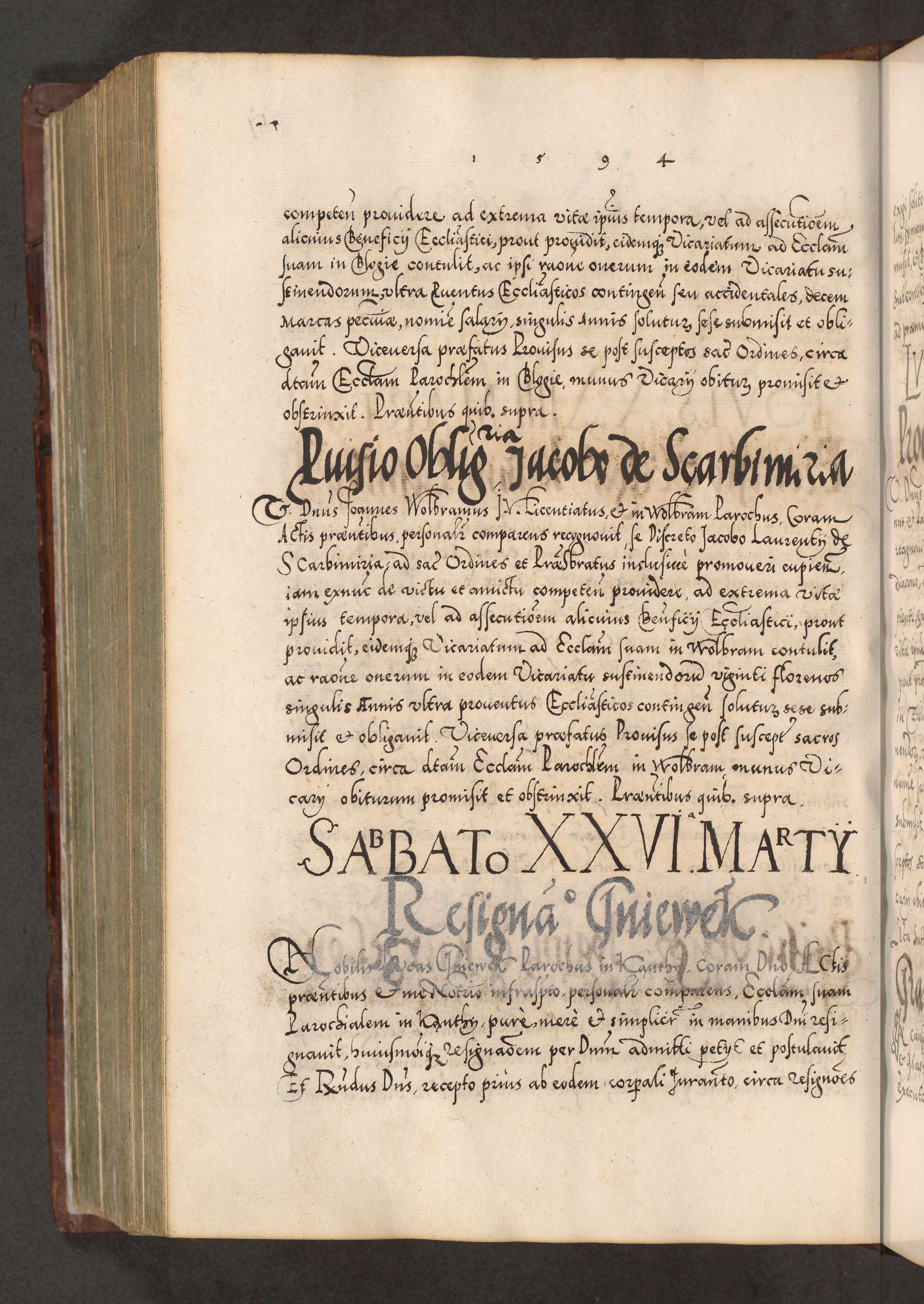 Illistrissimo et revedissimo in Christo Patre Domino Domino Georgio Rzadziwił Miserone Divina Sacrostae R. E. Tituli S. Sixti Presbitero Cardinali Duce in Olyka et Niesswiesz ad Gubernacula Ecclessiae Cracoviensis cuius administratorialem a Sancta Sede Apostolica obtinverat feliciter sedente. Acta actorum, causarum, sententiarum tam deffinitivarum quam interloquutoriarum decretorum, obligationum, quietationum, recognitionum, constitutionum procuratorum etc. coram Reverendo Domino Stanislao Crassinskz de Crasne Archidiacono Cracoviensis, Scholastico Gnesnesis, Custode Plocensis etc. Vicario et Officiali Generali Cracoviensi in Ano Domini Millesimo Quingentesimo Nonagesimo Primo cuius indictio quarta pontificatus SS. Domini Nostri Gregorii XIIII Anno I psius prio feliciter incipiut