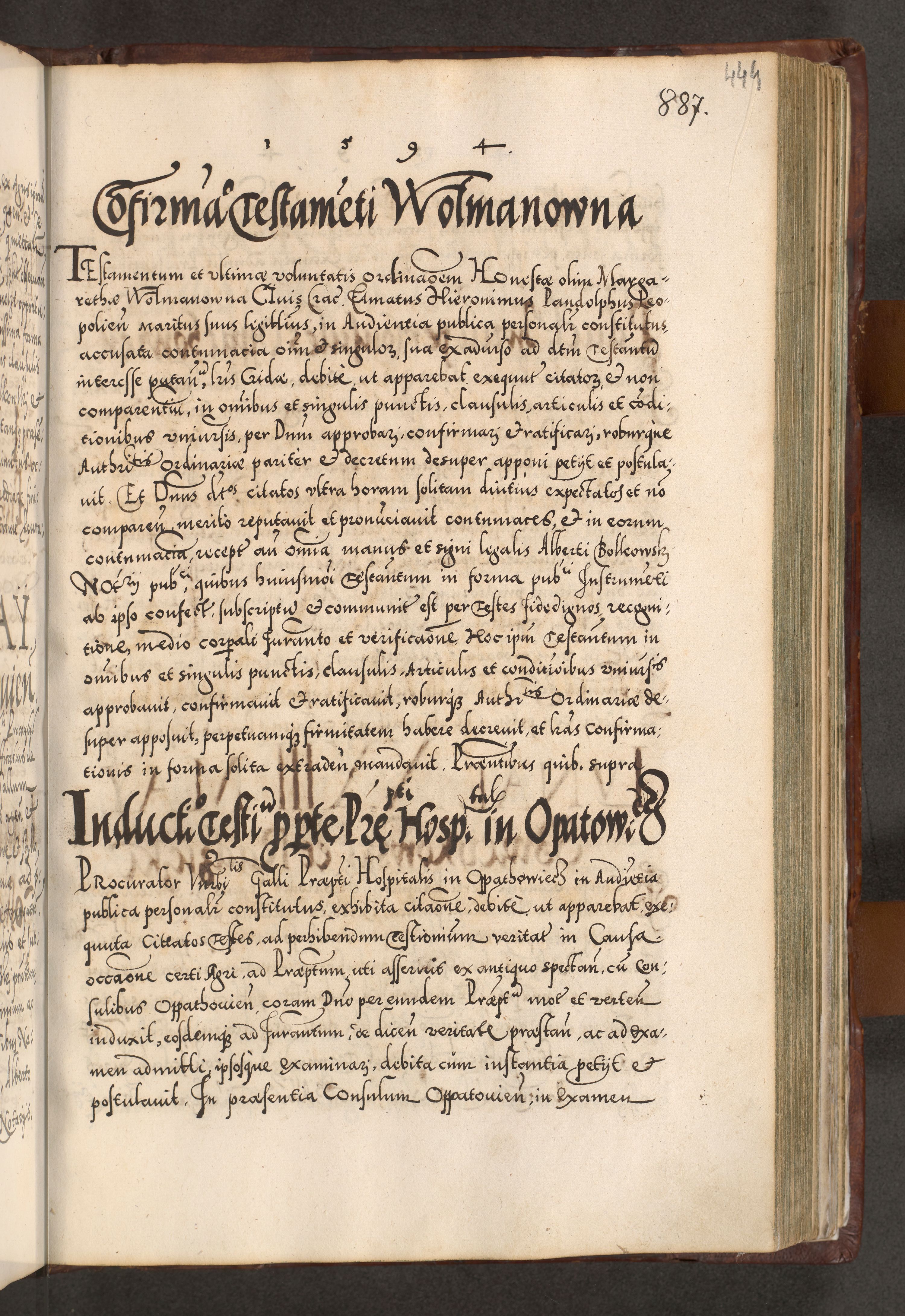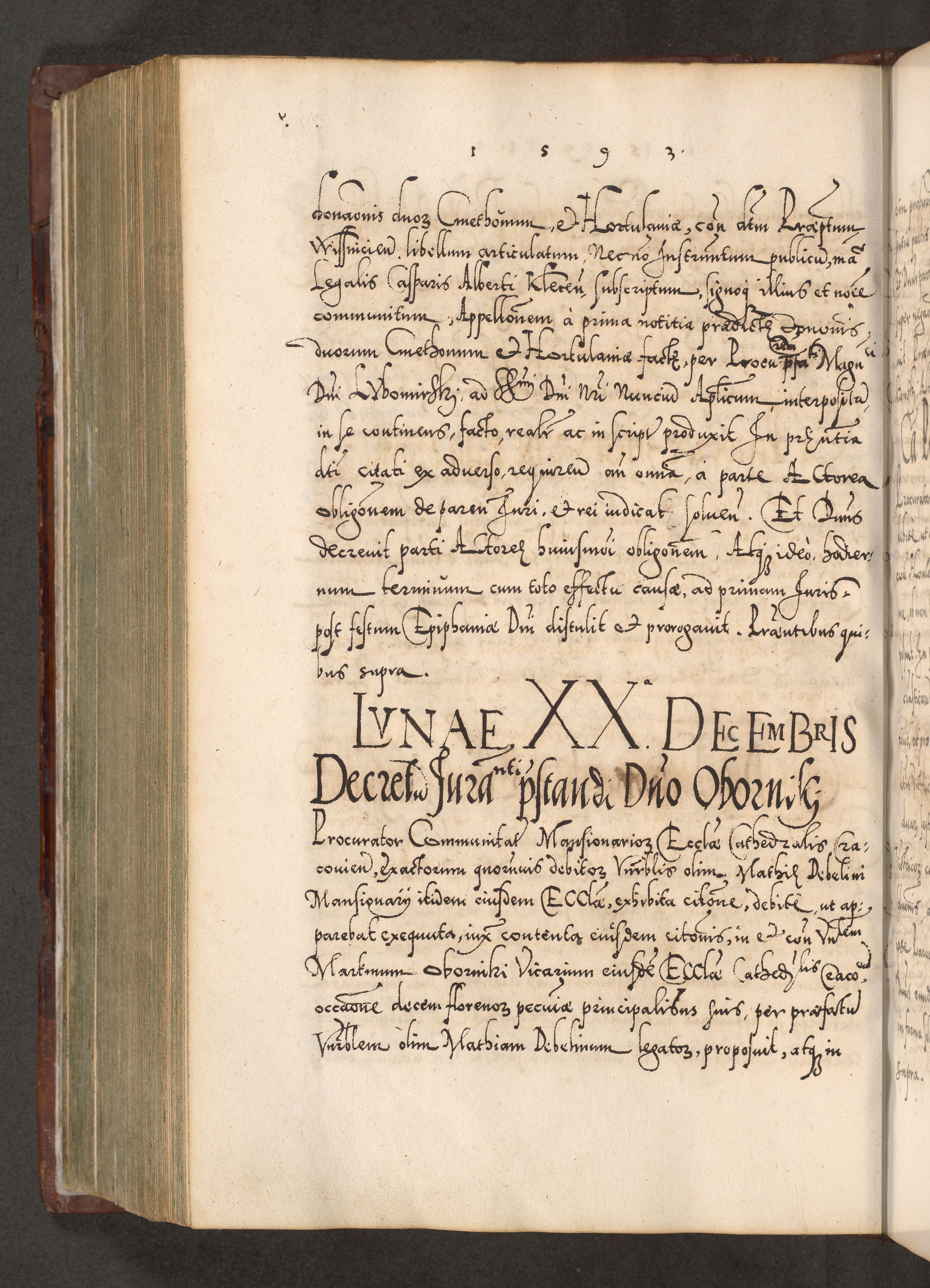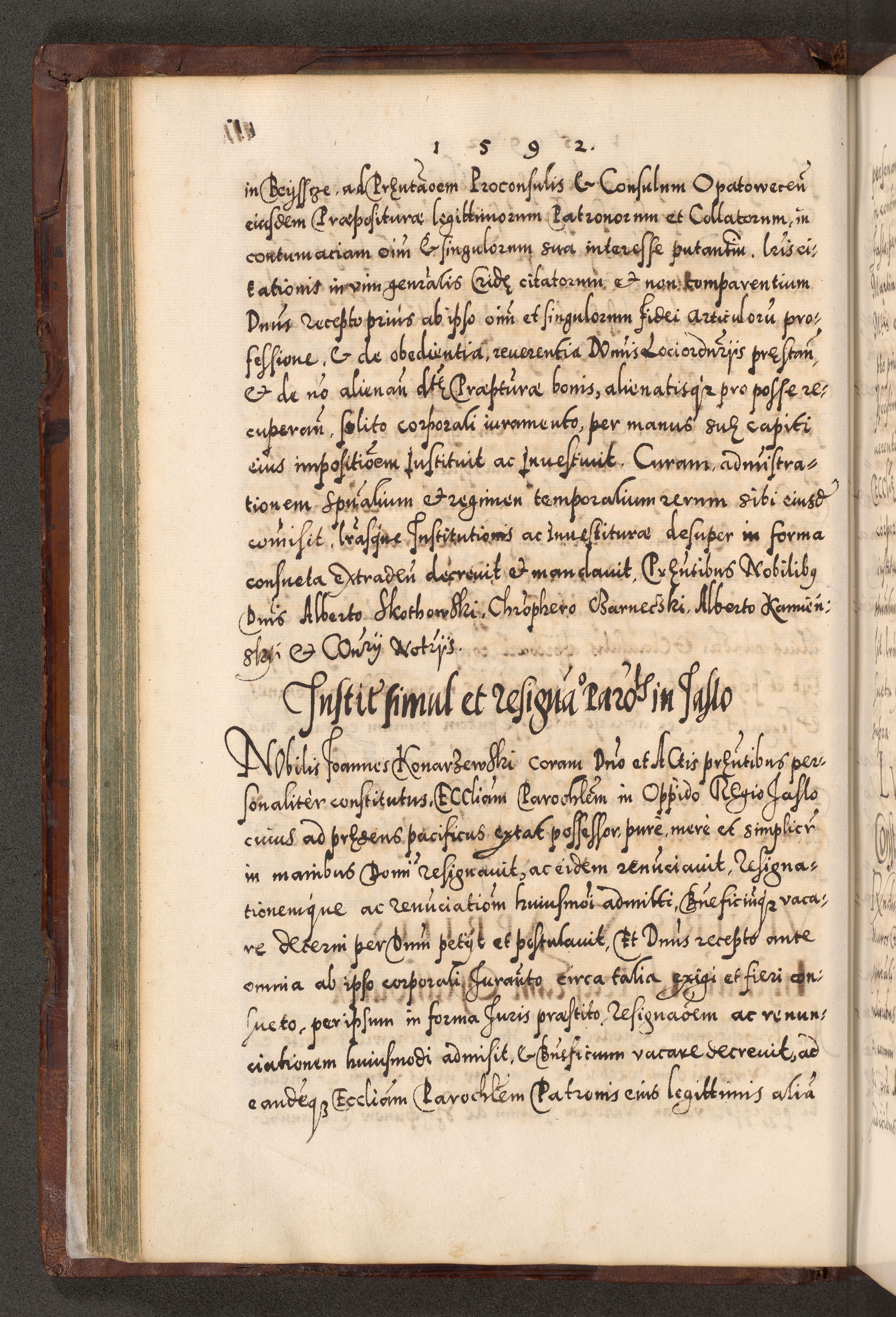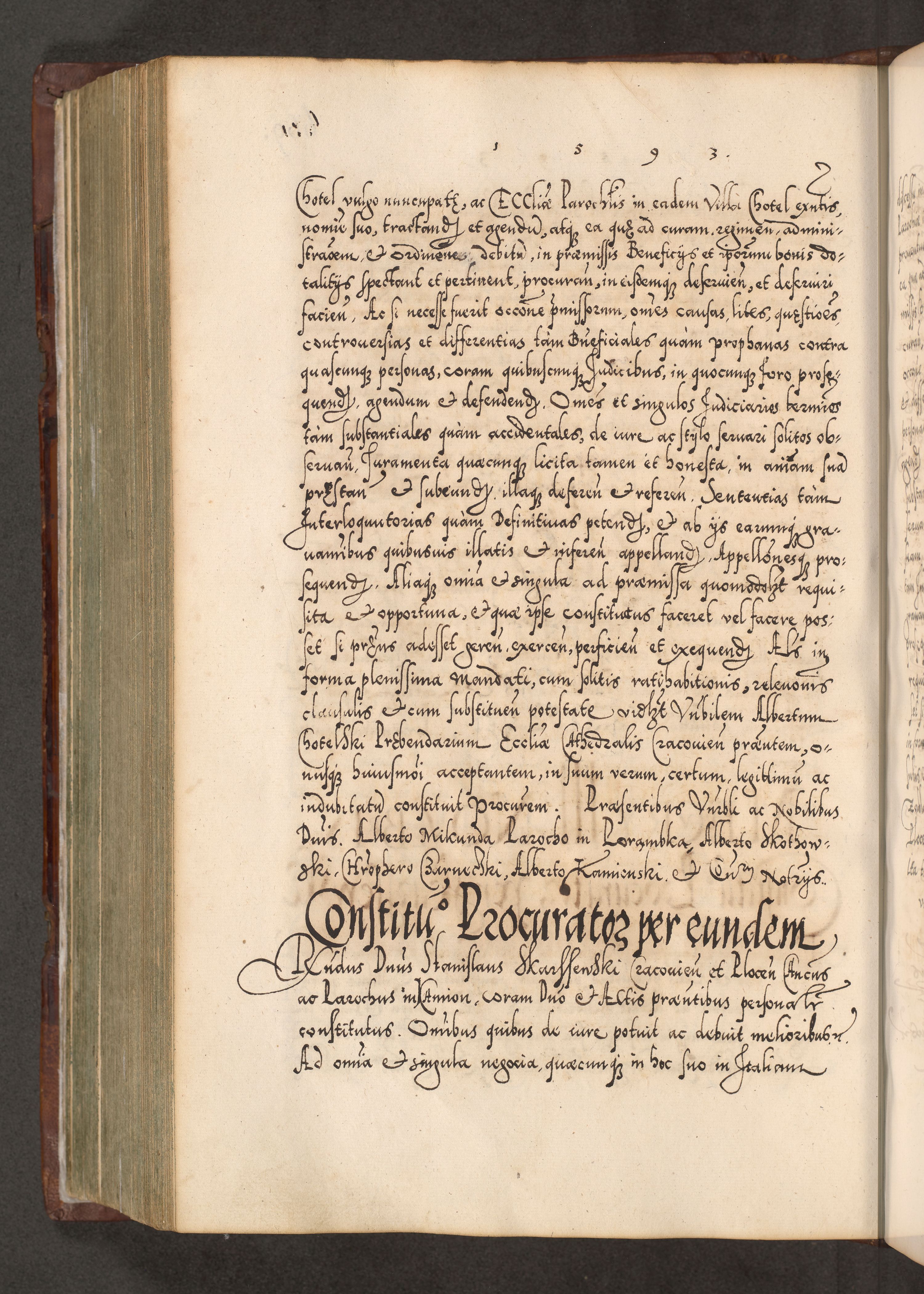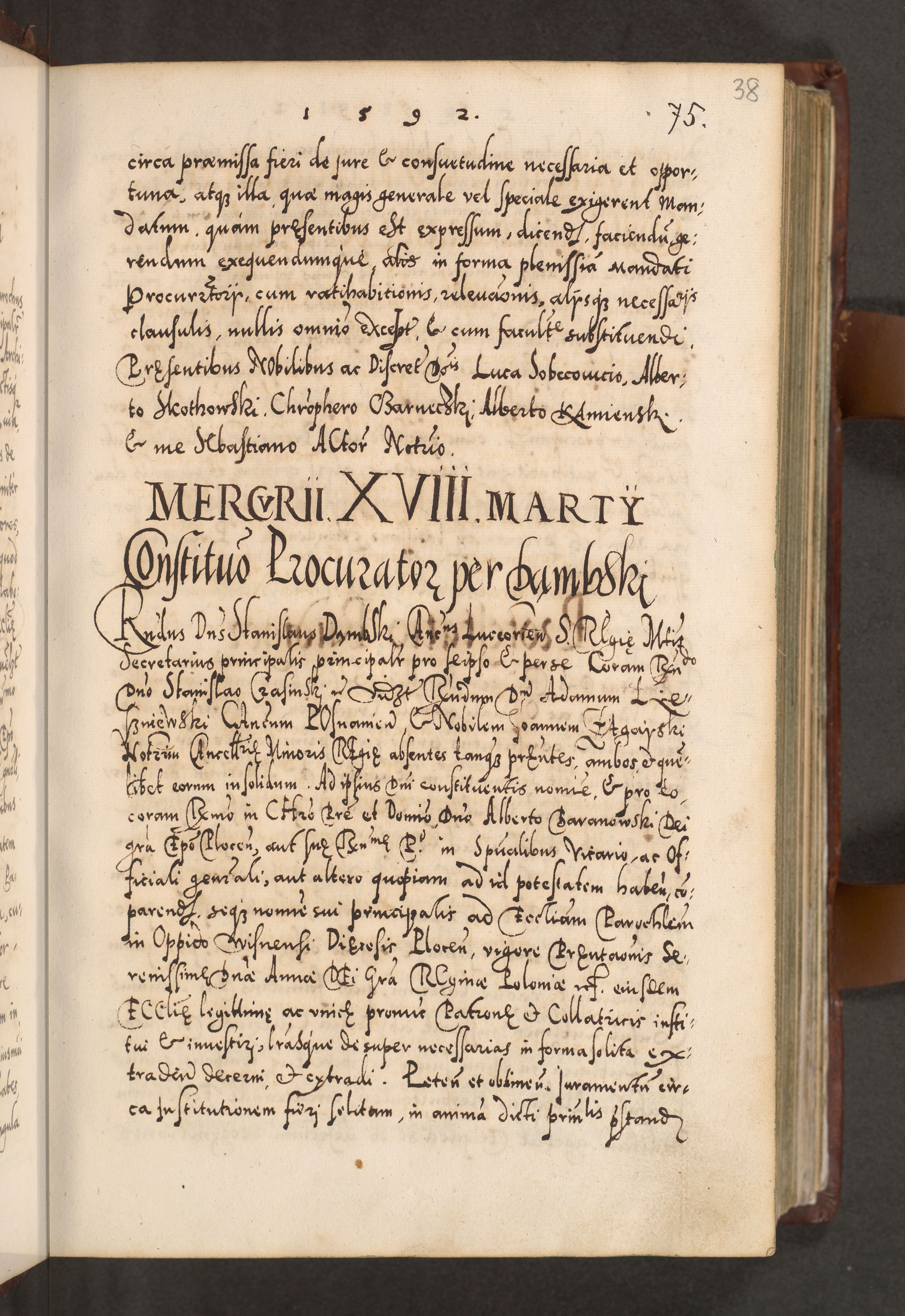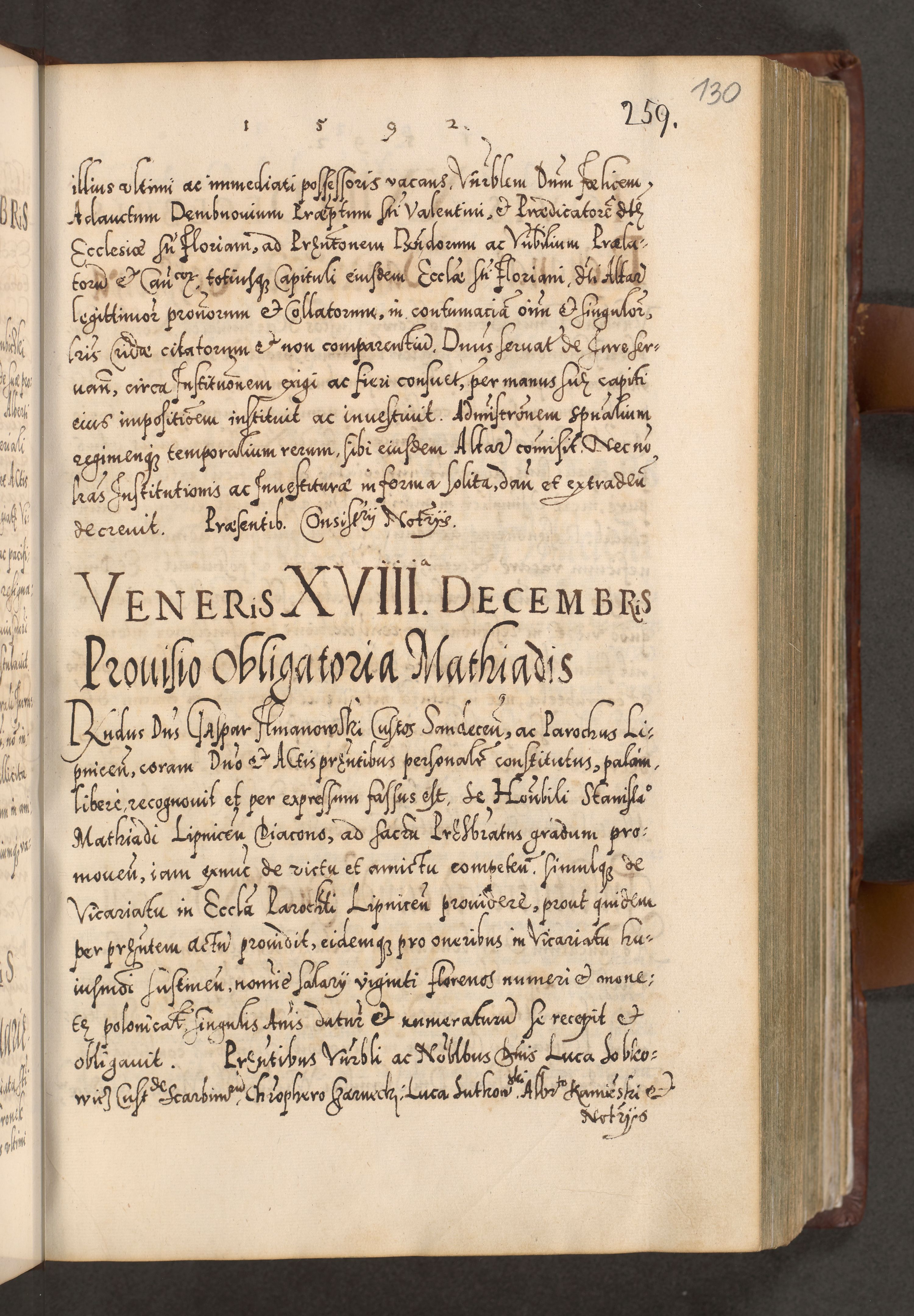 Illistrissimo et revedissimo in Christo Patre Domino Domino Georgio Rzadziwił Miserone Divina Sacrostae R. E. Tituli S. Sixti Presbitero Cardinali Duce in Olyka et Niesswiesz ad Gubernacula Ecclessiae Cracoviensis cuius administratorialem a Sancta Sede Apostolica obtinverat feliciter sedente. Acta actorum, causarum, sententiarum tam deffinitivarum quam interloquutoriarum decretorum, obligationum, quietationum, recognitionum, constitutionum procuratorum etc. coram Reverendo Domino Stanislao Crassinskz de Crasne Archidiacono Cracoviensis, Scholastico Gnesnesis, Custode Plocensis etc. Vicario et Officiali Generali Cracoviensi in Ano Domini Millesimo Quingentesimo Nonagesimo Primo cuius indictio quarta pontificatus SS. Domini Nostri Gregorii XIIII Anno I psius prio feliciter incipiut