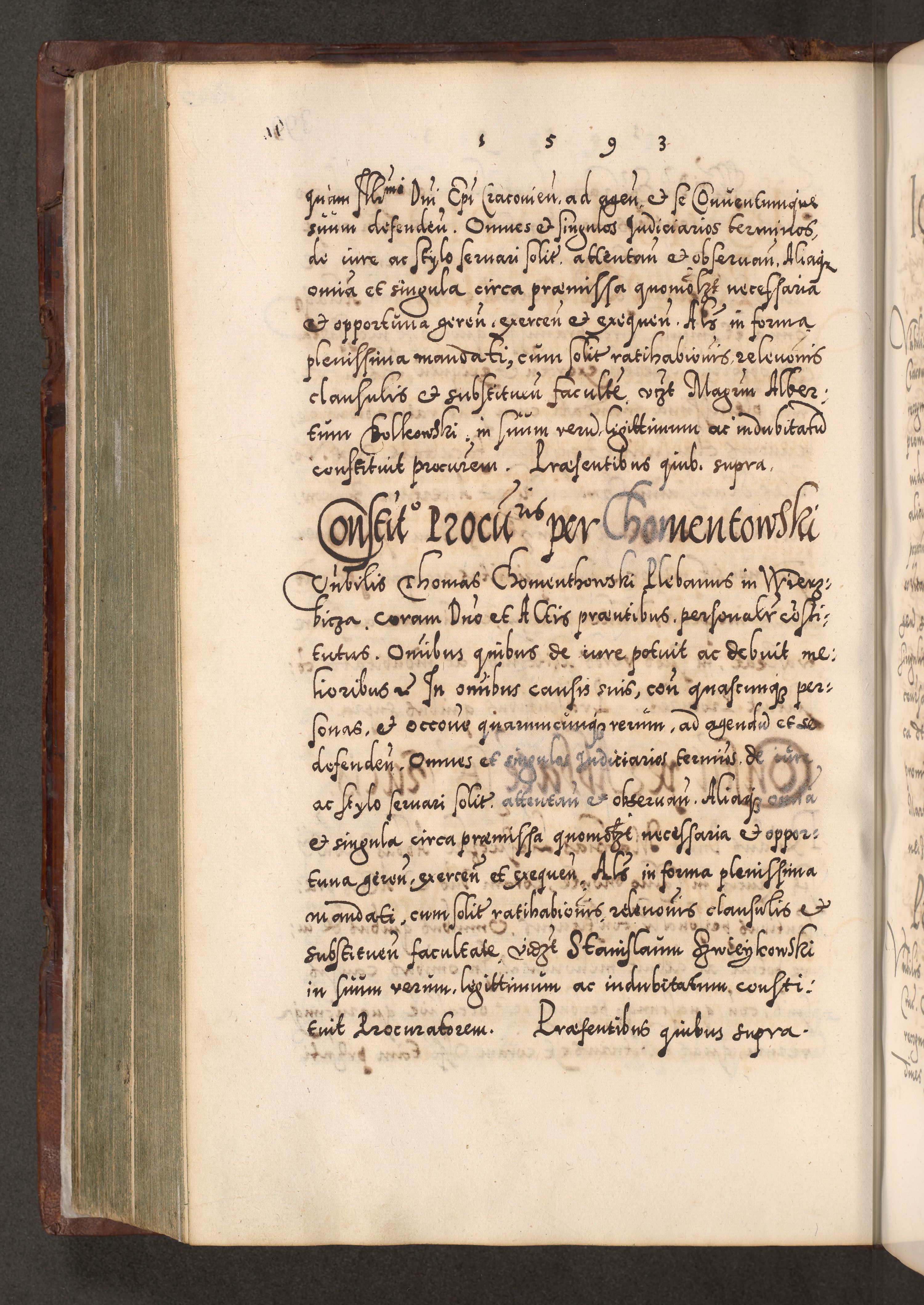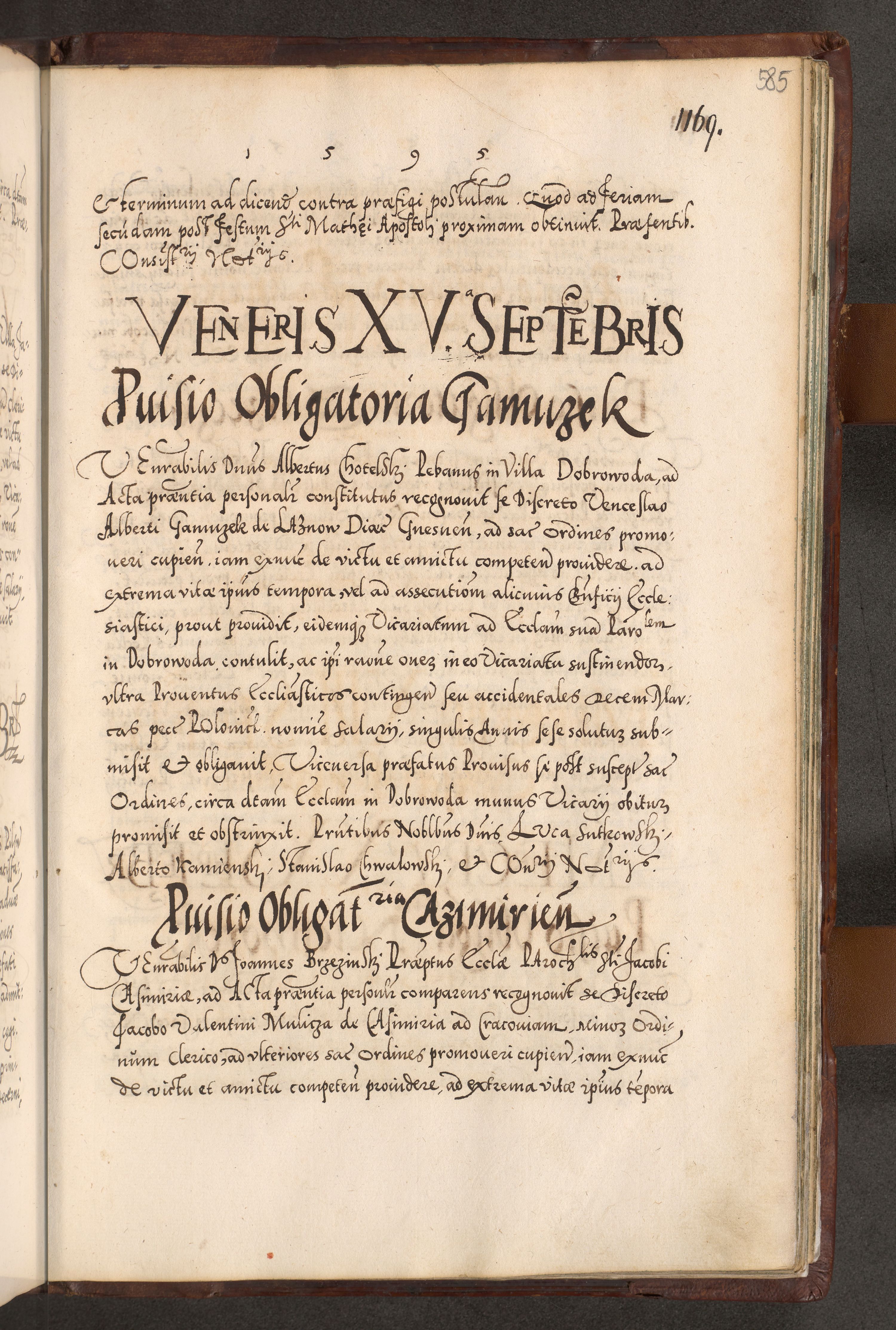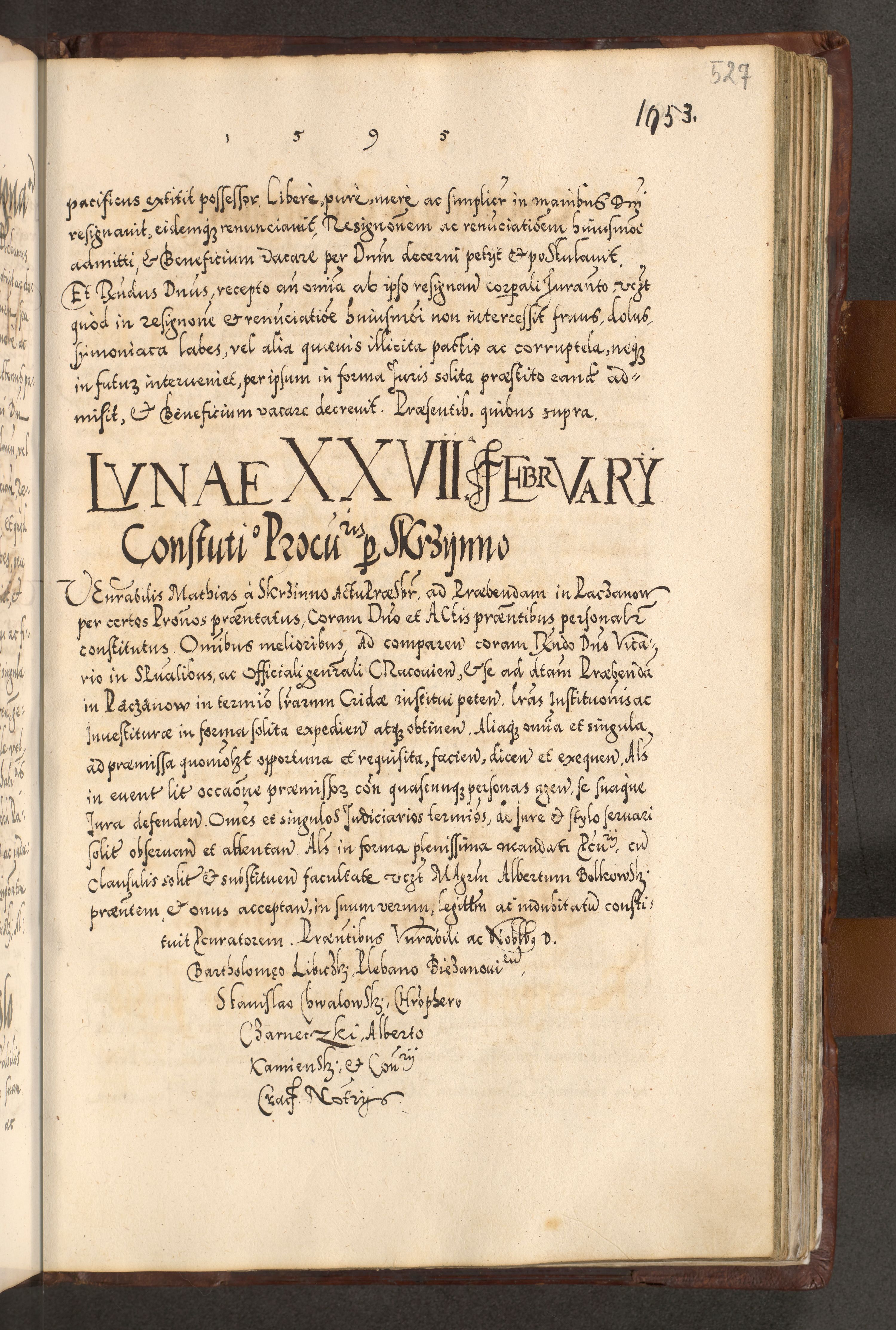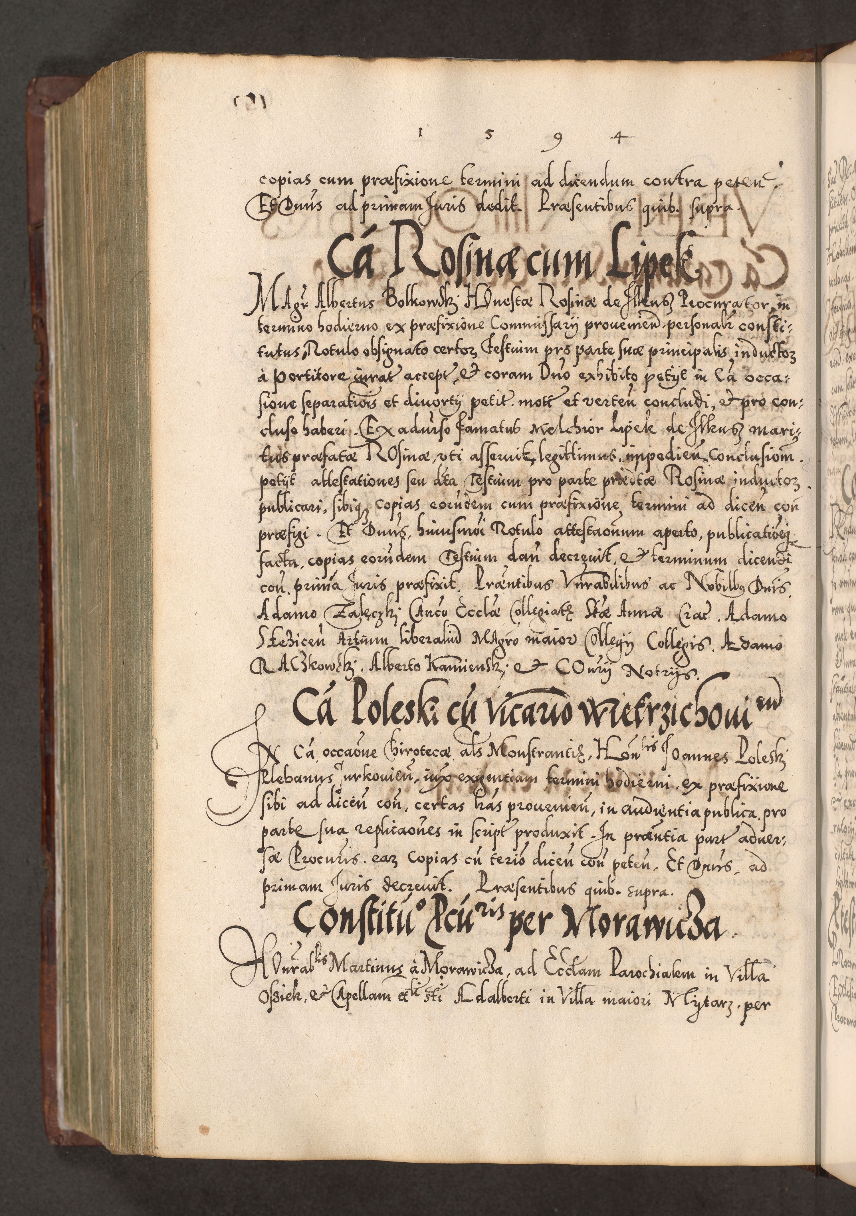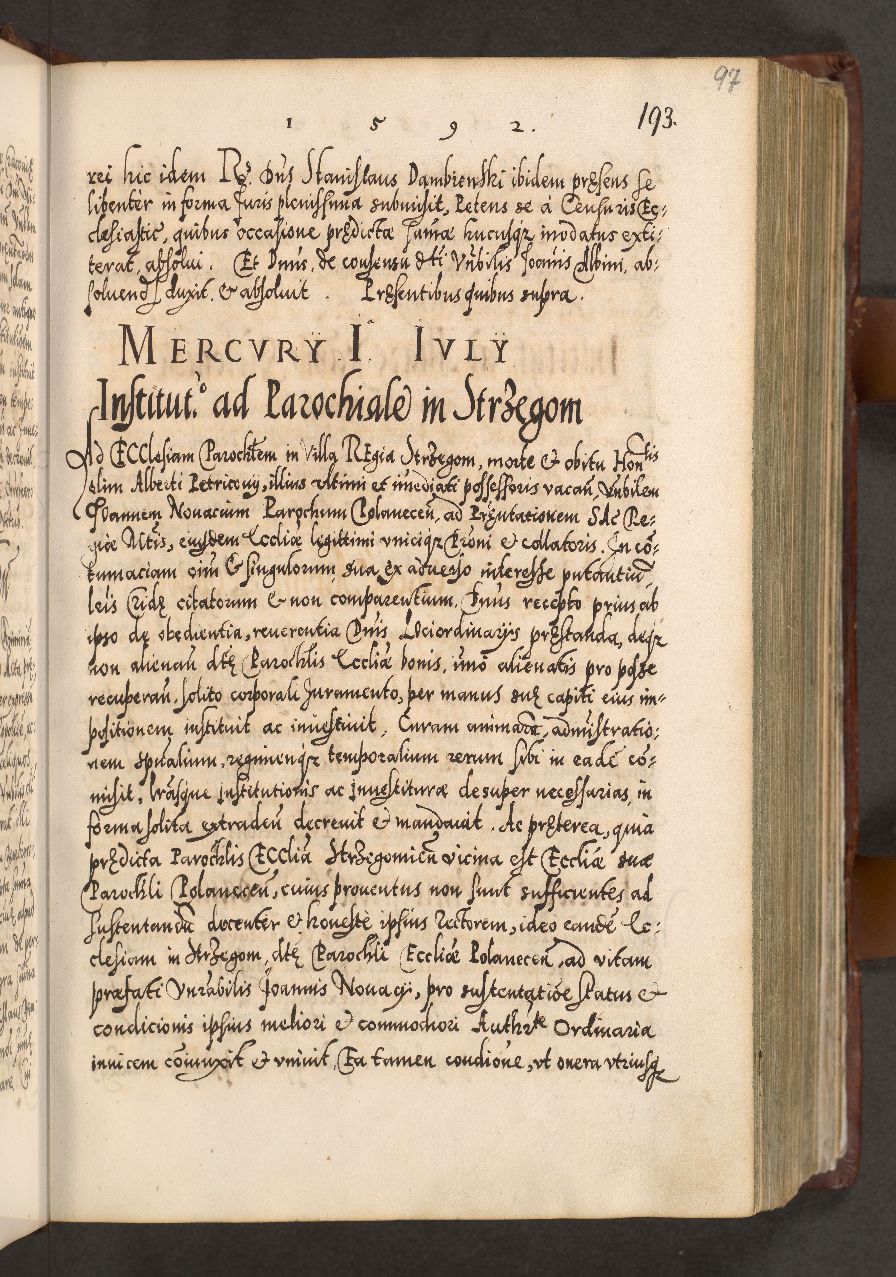Illistrissimo et revedissimo in Christo Patre Domino Domino Georgio Rzadziwił Miserone Divina Sacrostae R. E. Tituli S. Sixti Presbitero Cardinali Duce in Olyka et Niesswiesz ad Gubernacula Ecclessiae Cracoviensis cuius administratorialem a Sancta Sede Apostolica obtinverat feliciter sedente. Acta actorum, causarum, sententiarum tam deffinitivarum quam interloquutoriarum decretorum, obligationum, quietationum, recognitionum, constitutionum procuratorum etc. coram Reverendo Domino Stanislao Crassinskz de Crasne Archidiacono Cracoviensis, Scholastico Gnesnesis, Custode Plocensis etc. Vicario et Officiali Generali Cracoviensi in Ano Domini Millesimo Quingentesimo Nonagesimo Primo cuius indictio quarta pontificatus SS. Domini Nostri Gregorii XIIII Anno I psius prio feliciter incipiut