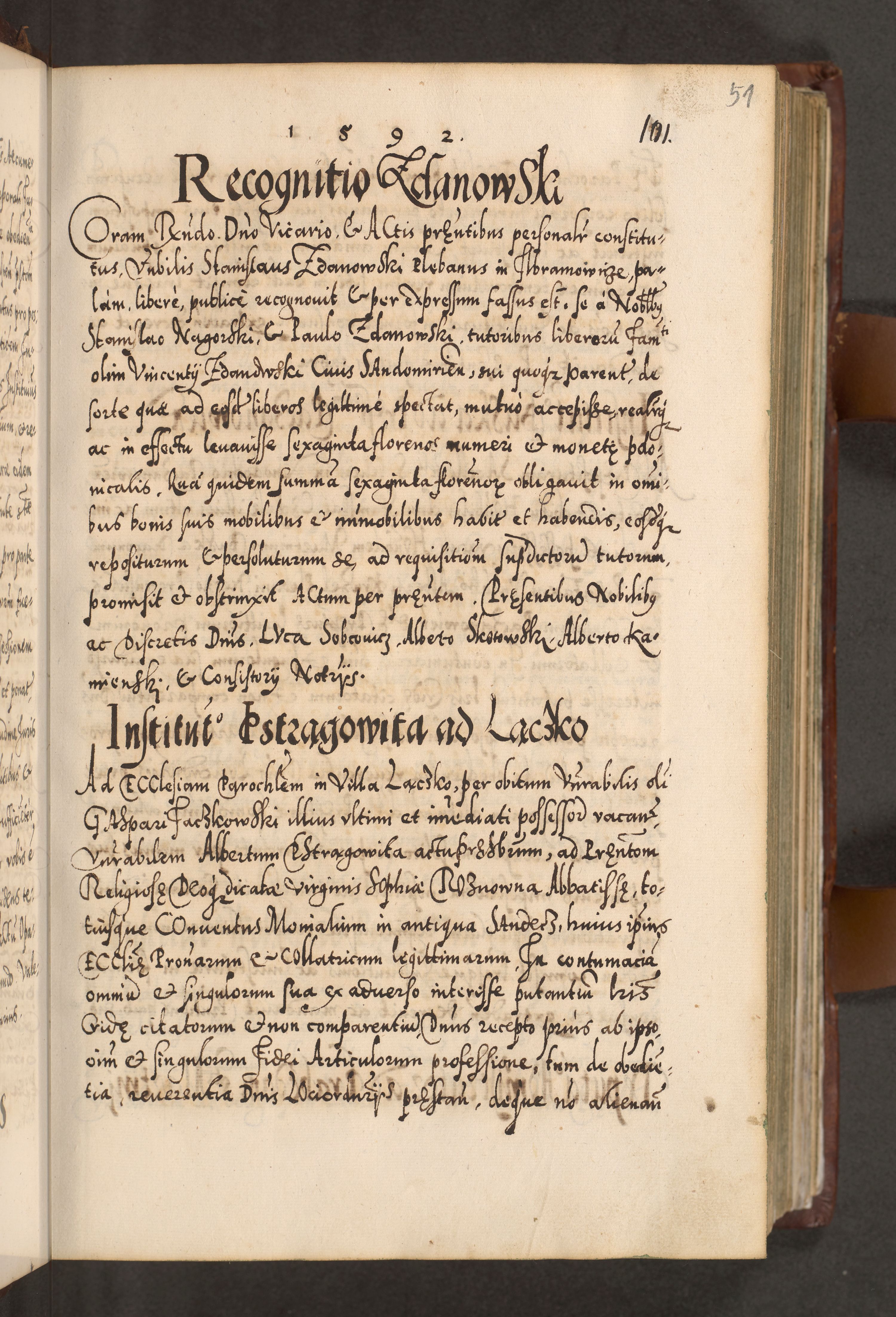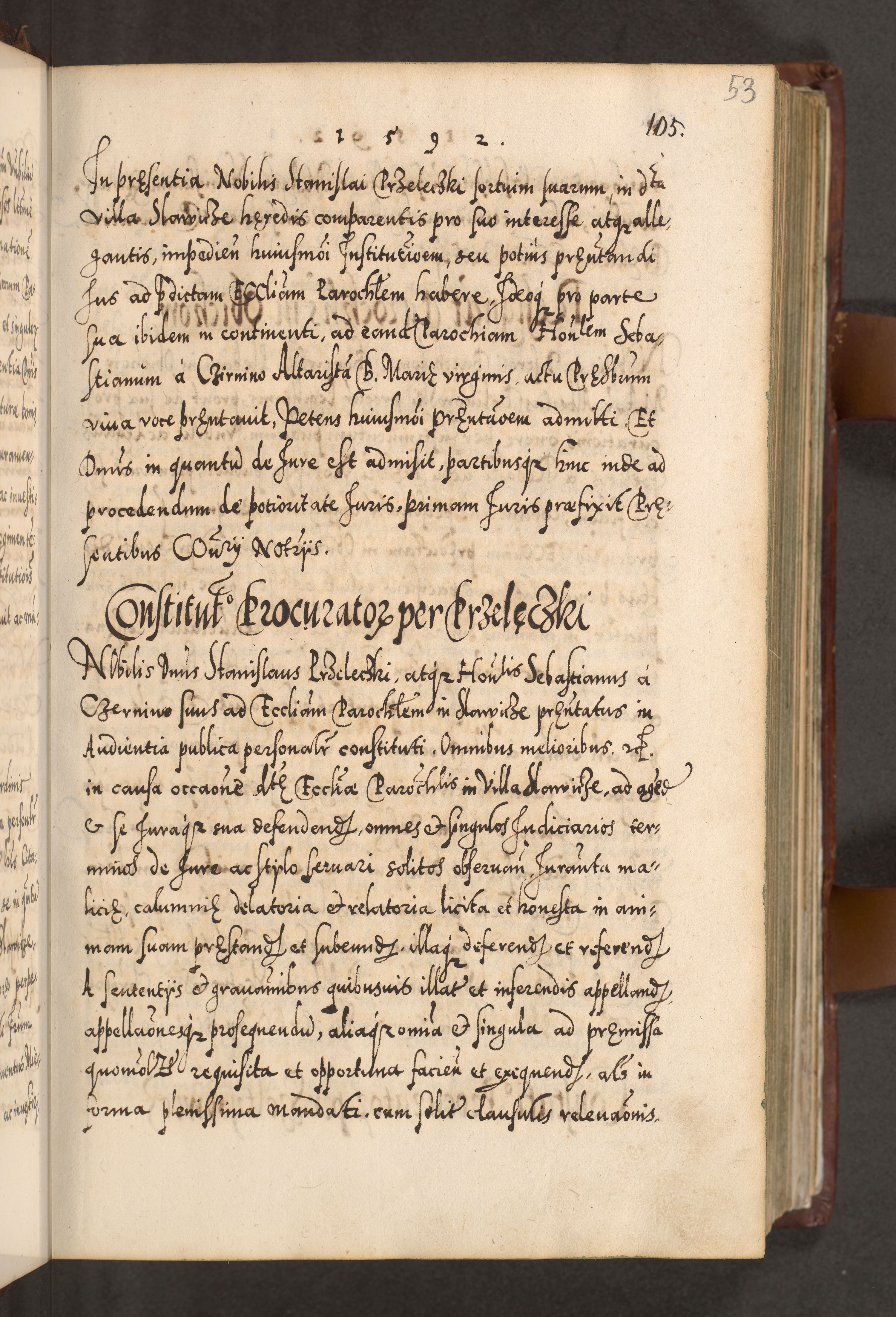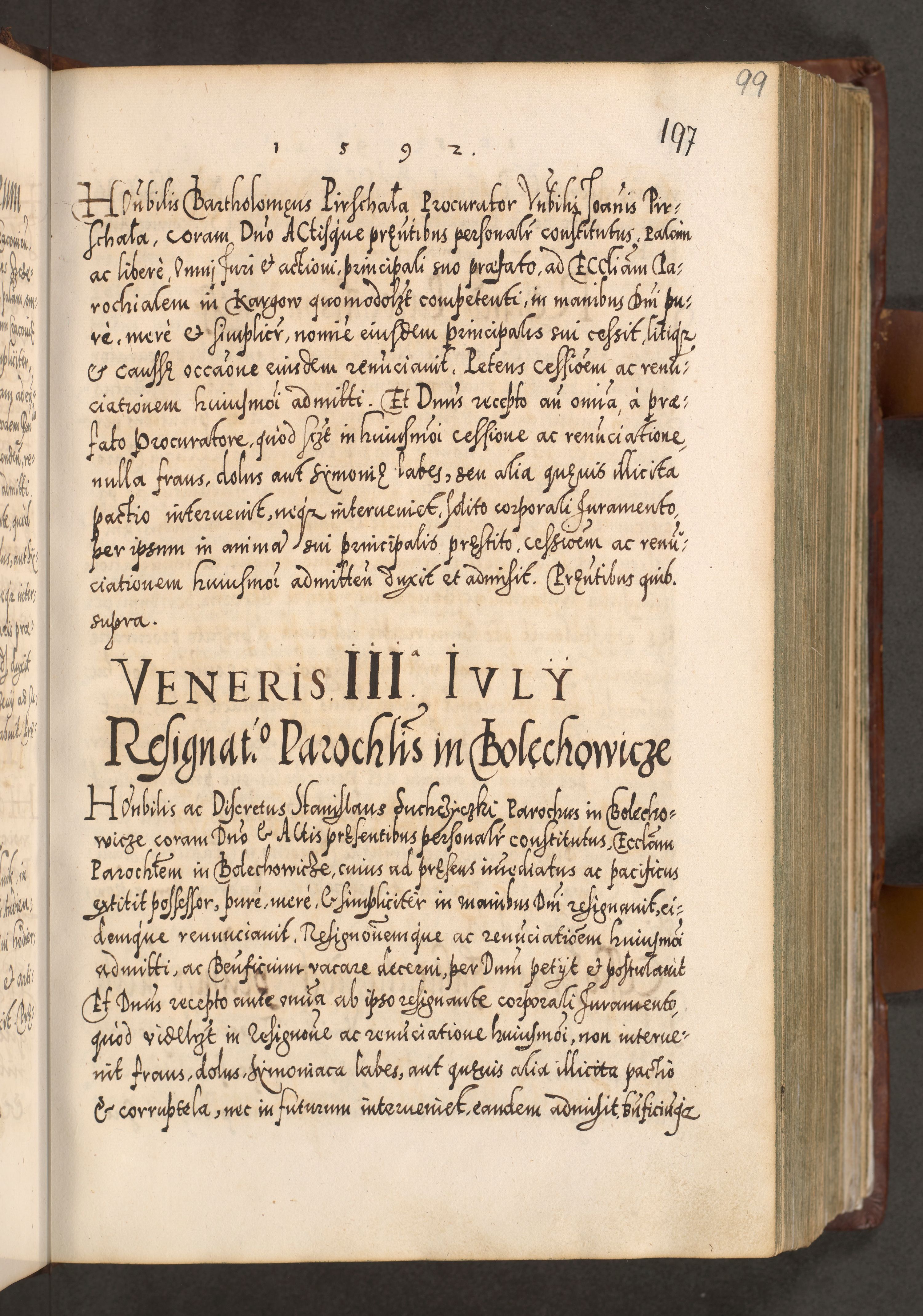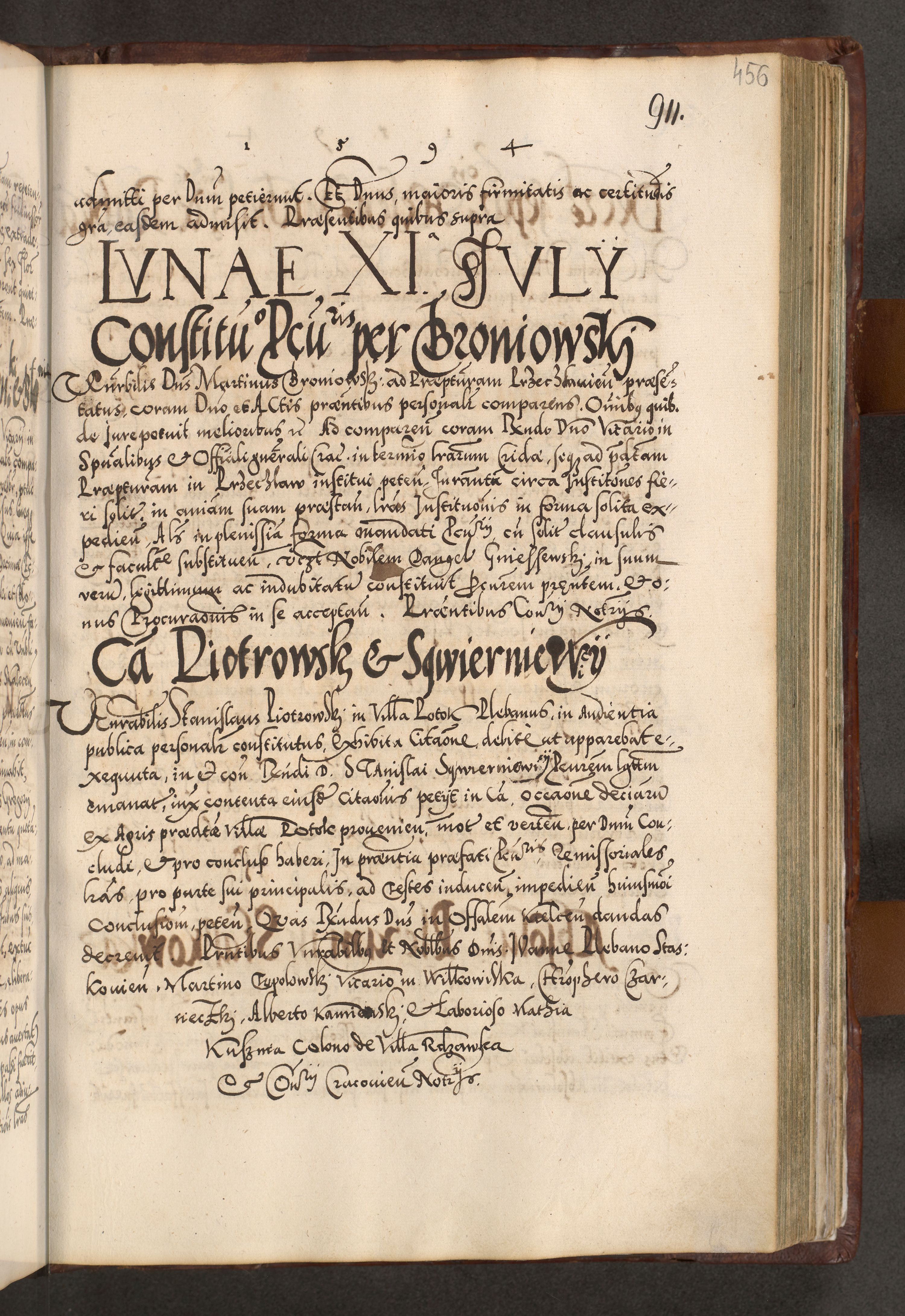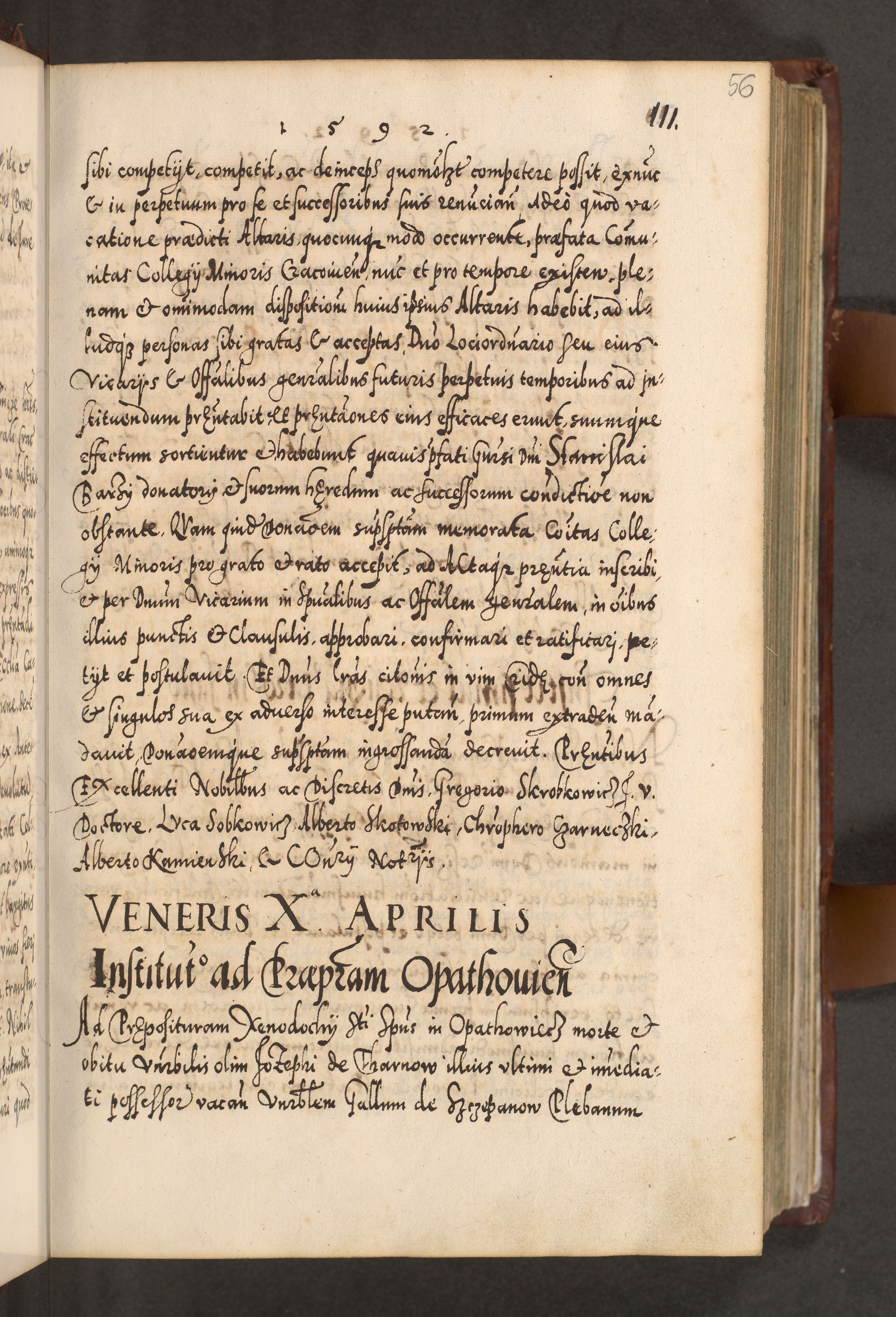 Illistrissimo et revedissimo in Christo Patre Domino Domino Georgio Rzadziwił Miserone Divina Sacrostae R. E. Tituli S. Sixti Presbitero Cardinali Duce in Olyka et Niesswiesz ad Gubernacula Ecclessiae Cracoviensis cuius administratorialem a Sancta Sede Apostolica obtinverat feliciter sedente. Acta actorum, causarum, sententiarum tam deffinitivarum quam interloquutoriarum decretorum, obligationum, quietationum, recognitionum, constitutionum procuratorum etc. coram Reverendo Domino Stanislao Crassinskz de Crasne Archidiacono Cracoviensis, Scholastico Gnesnesis, Custode Plocensis etc. Vicario et Officiali Generali Cracoviensi in Ano Domini Millesimo Quingentesimo Nonagesimo Primo cuius indictio quarta pontificatus SS. Domini Nostri Gregorii XIIII Anno I psius prio feliciter incipiut