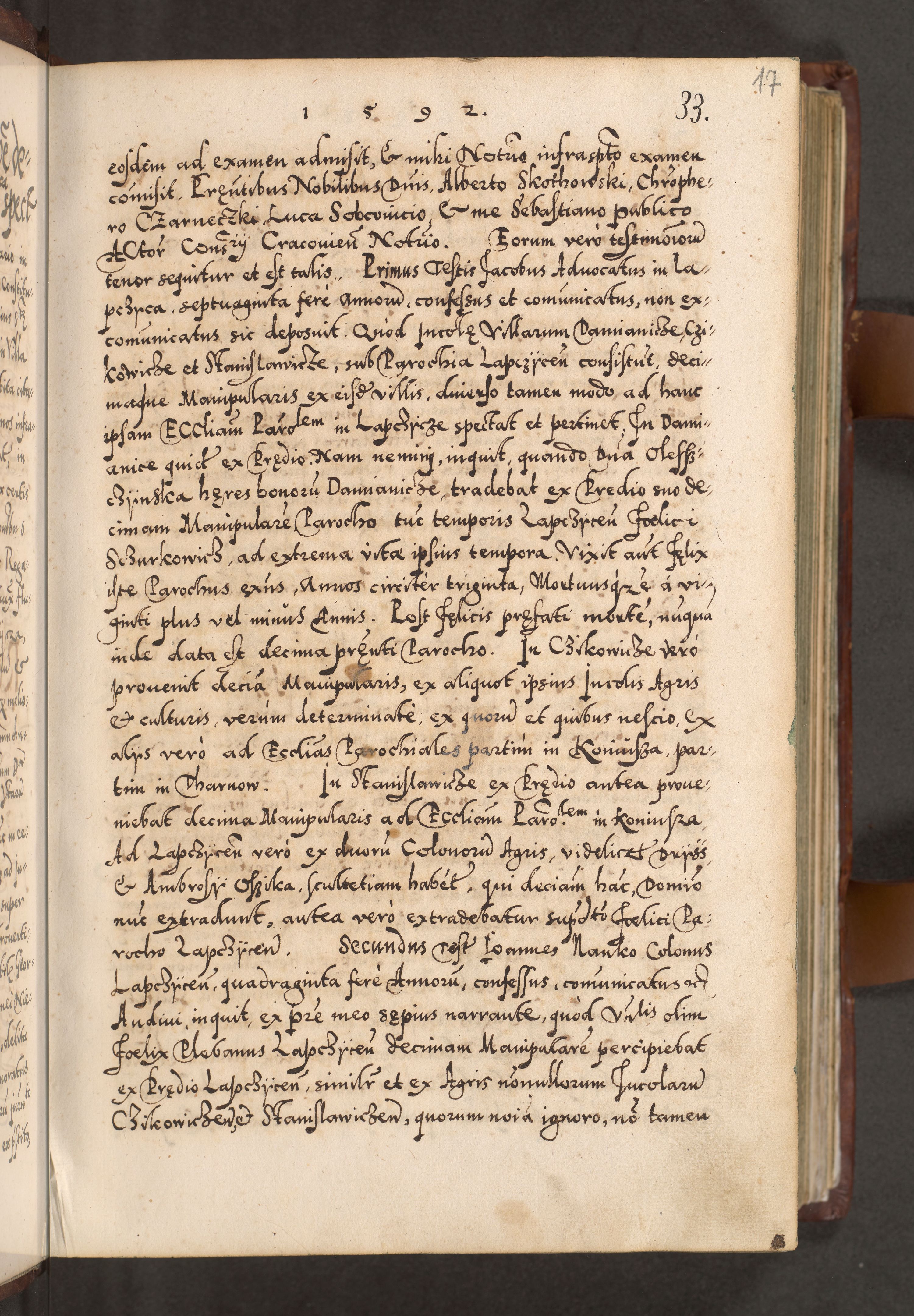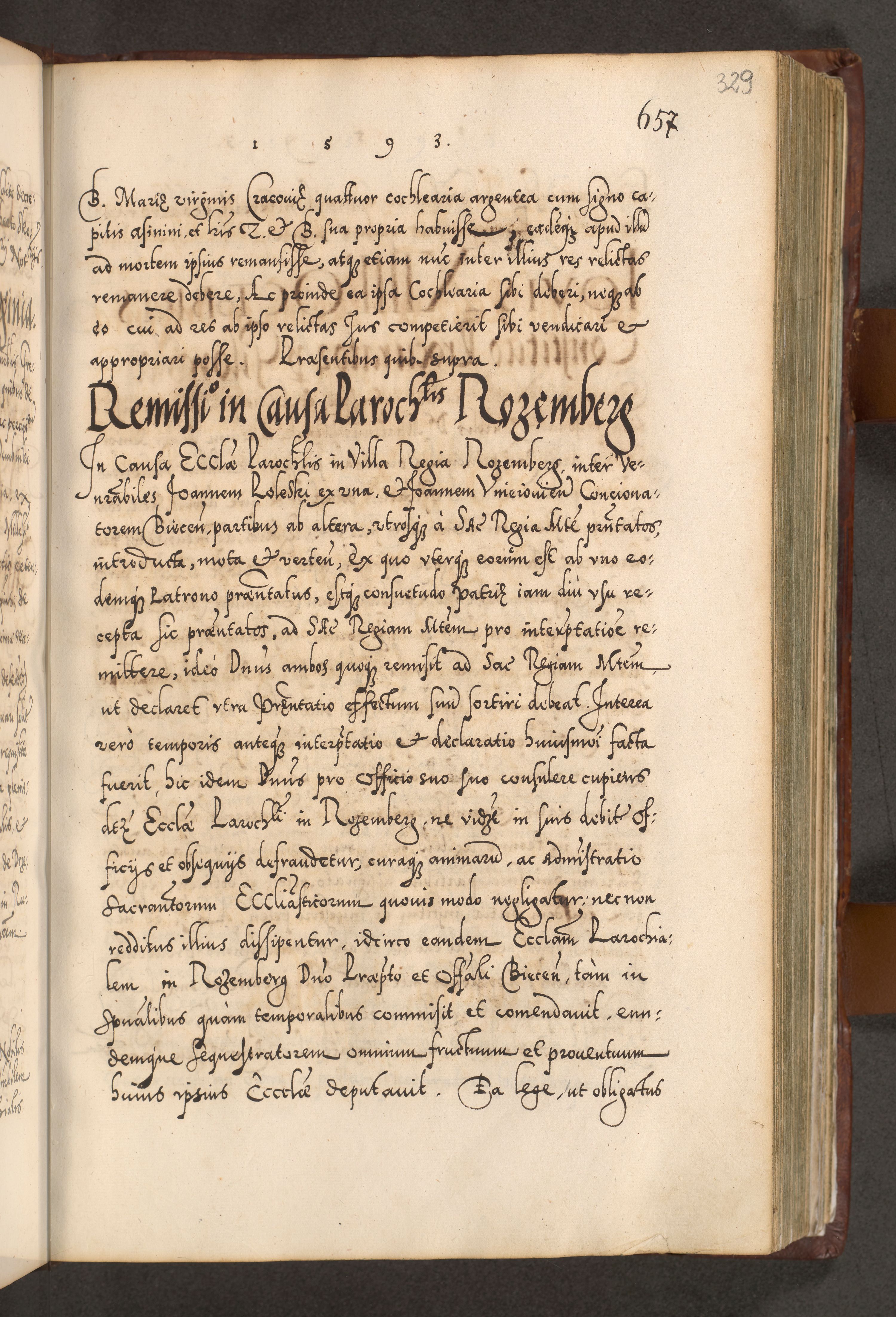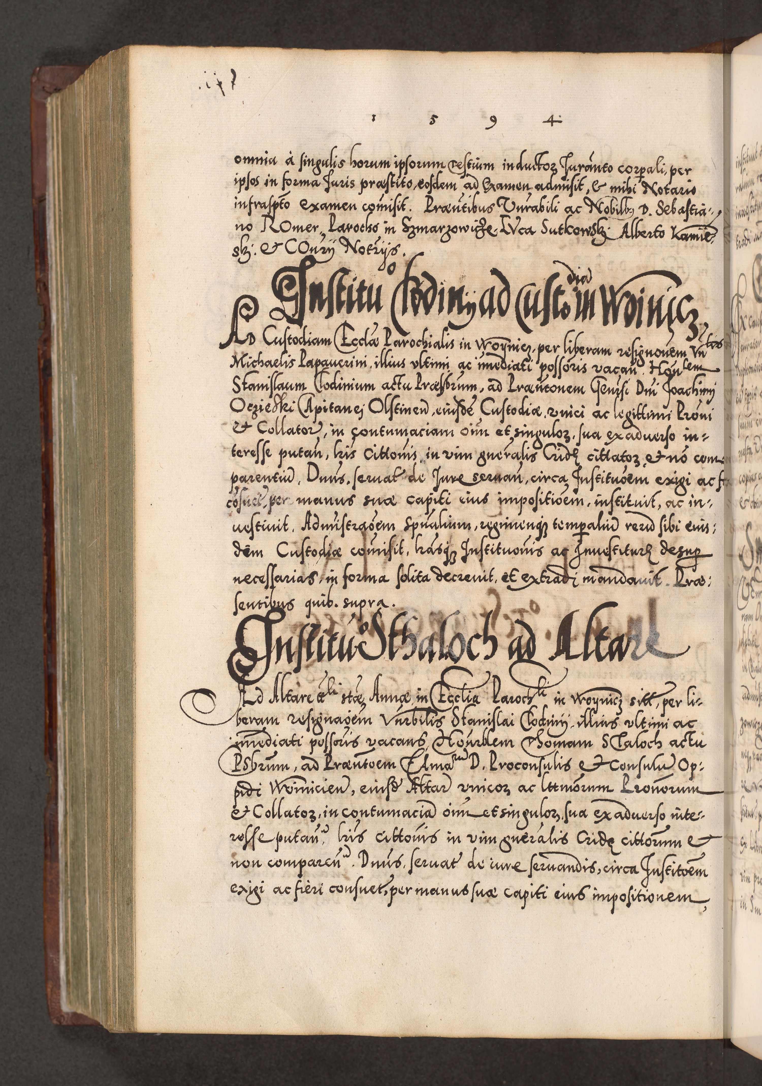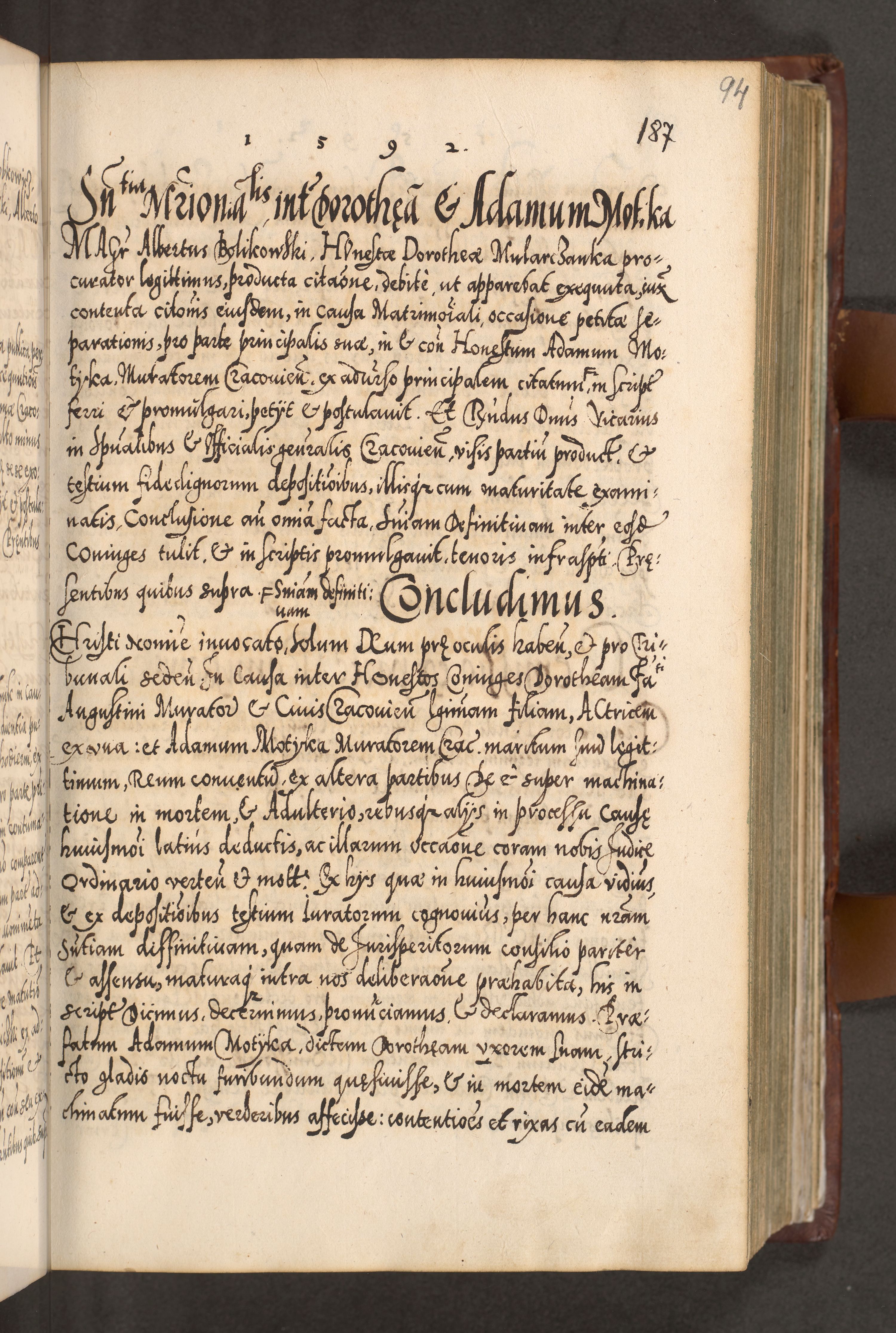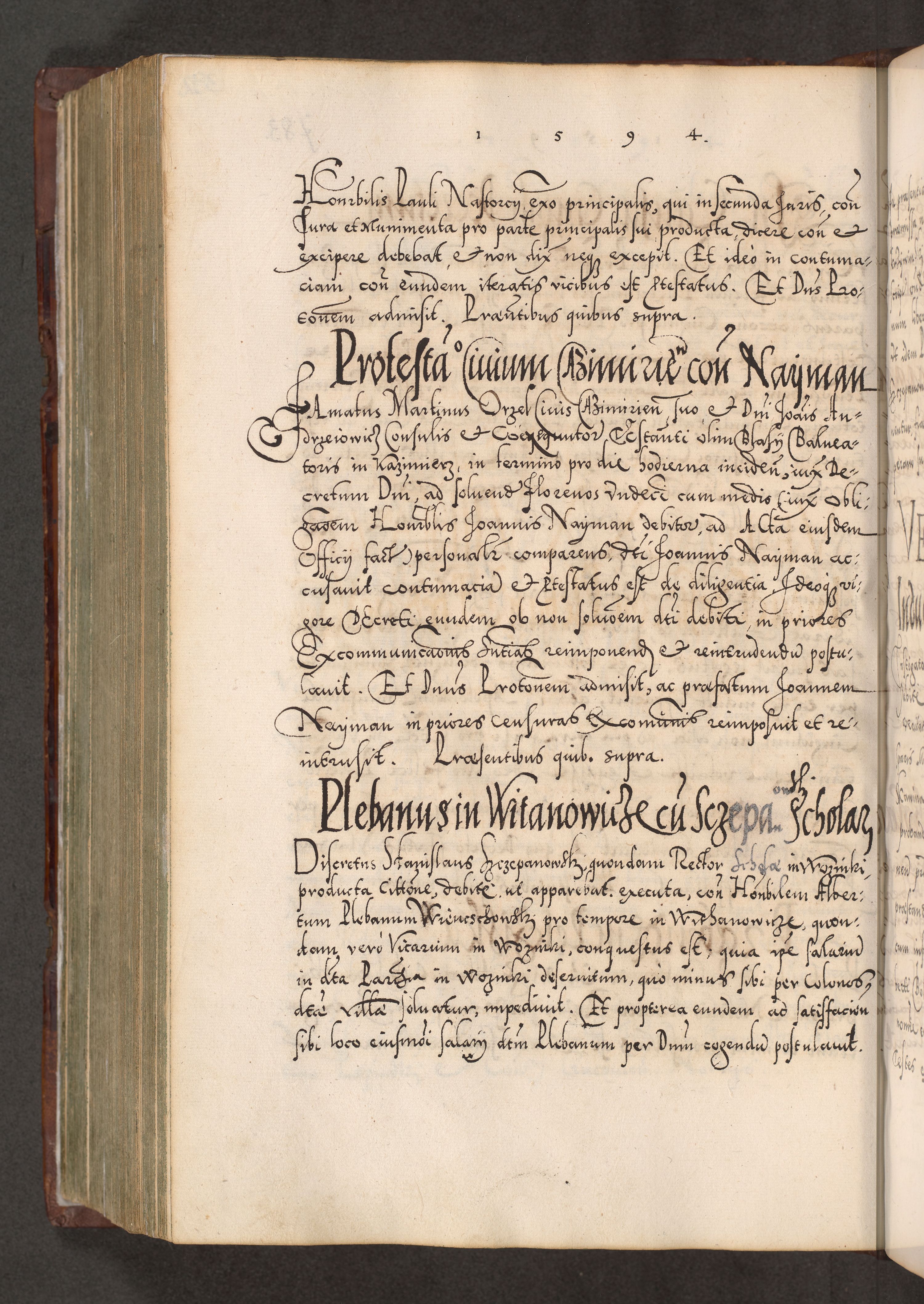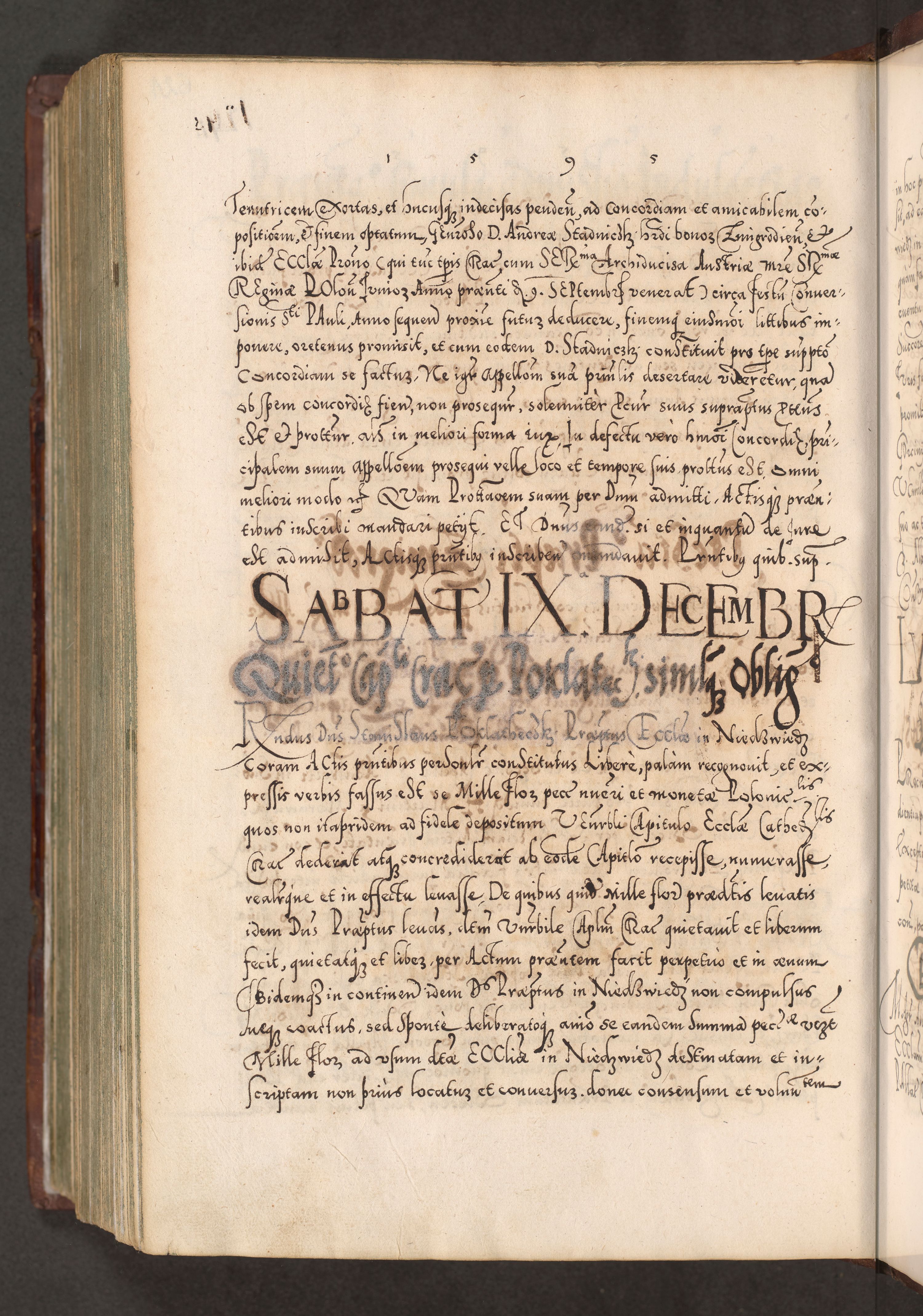Illistrissimo et revedissimo in Christo Patre Domino Domino Georgio Rzadziwił Miserone Divina Sacrostae R. E. Tituli S. Sixti Presbitero Cardinali Duce in Olyka et Niesswiesz ad Gubernacula Ecclessiae Cracoviensis cuius administratorialem a Sancta Sede Apostolica obtinverat feliciter sedente. Acta actorum, causarum, sententiarum tam deffinitivarum quam interloquutoriarum decretorum, obligationum, quietationum, recognitionum, constitutionum procuratorum etc. coram Reverendo Domino Stanislao Crassinskz de Crasne Archidiacono Cracoviensis, Scholastico Gnesnesis, Custode Plocensis etc. Vicario et Officiali Generali Cracoviensi in Ano Domini Millesimo Quingentesimo Nonagesimo Primo cuius indictio quarta pontificatus SS. Domini Nostri Gregorii XIIII Anno I psius prio feliciter incipiut